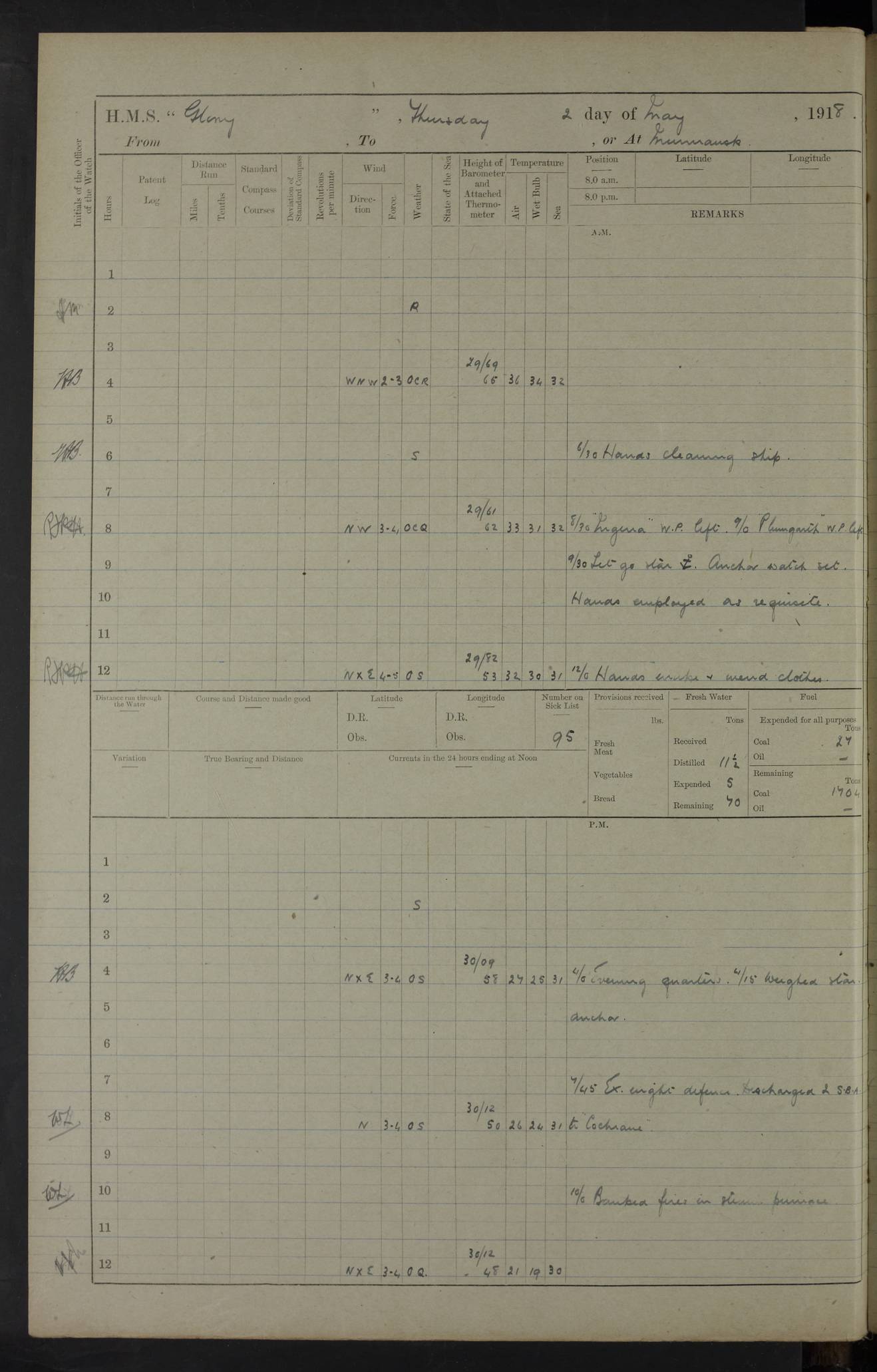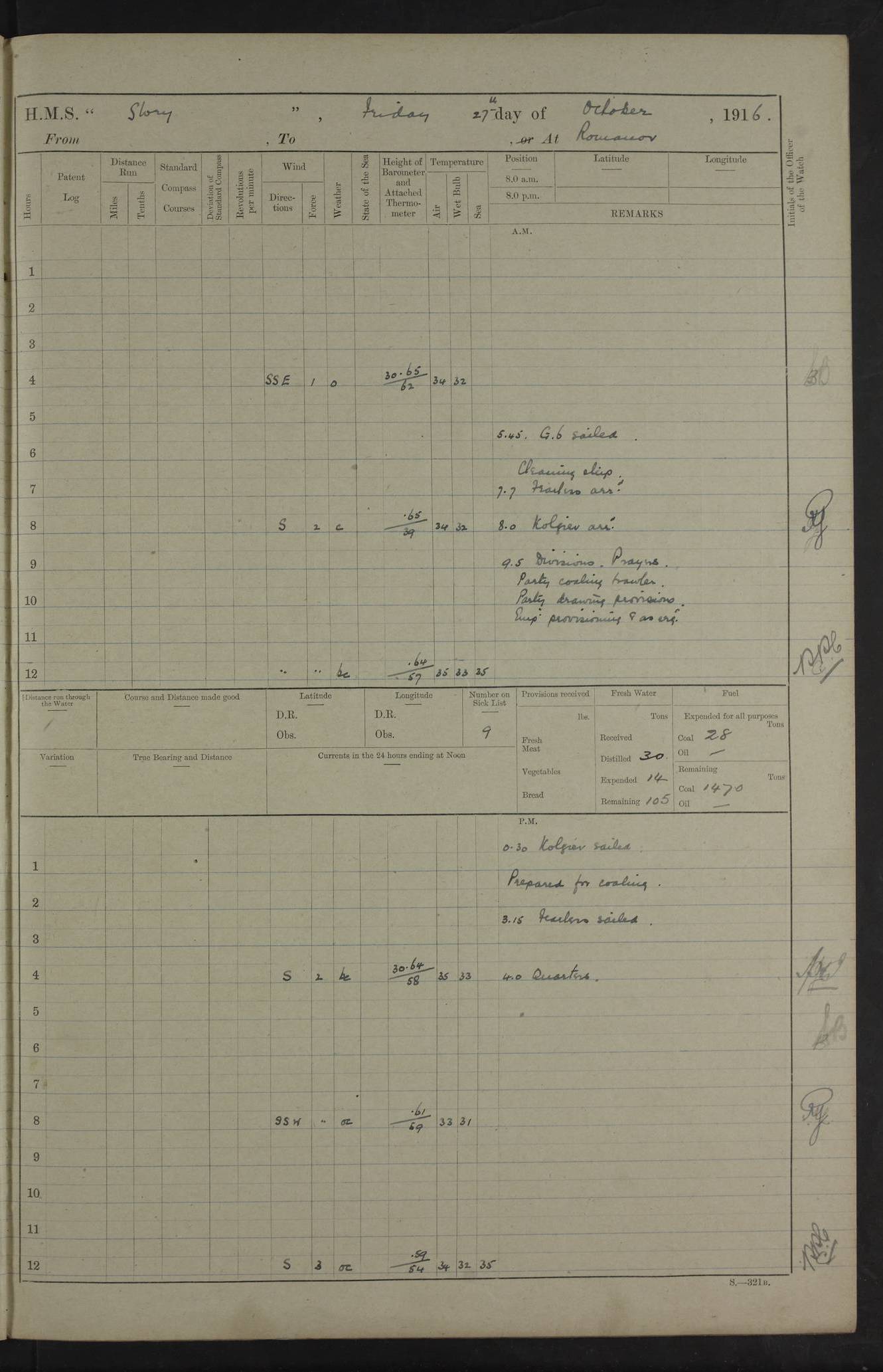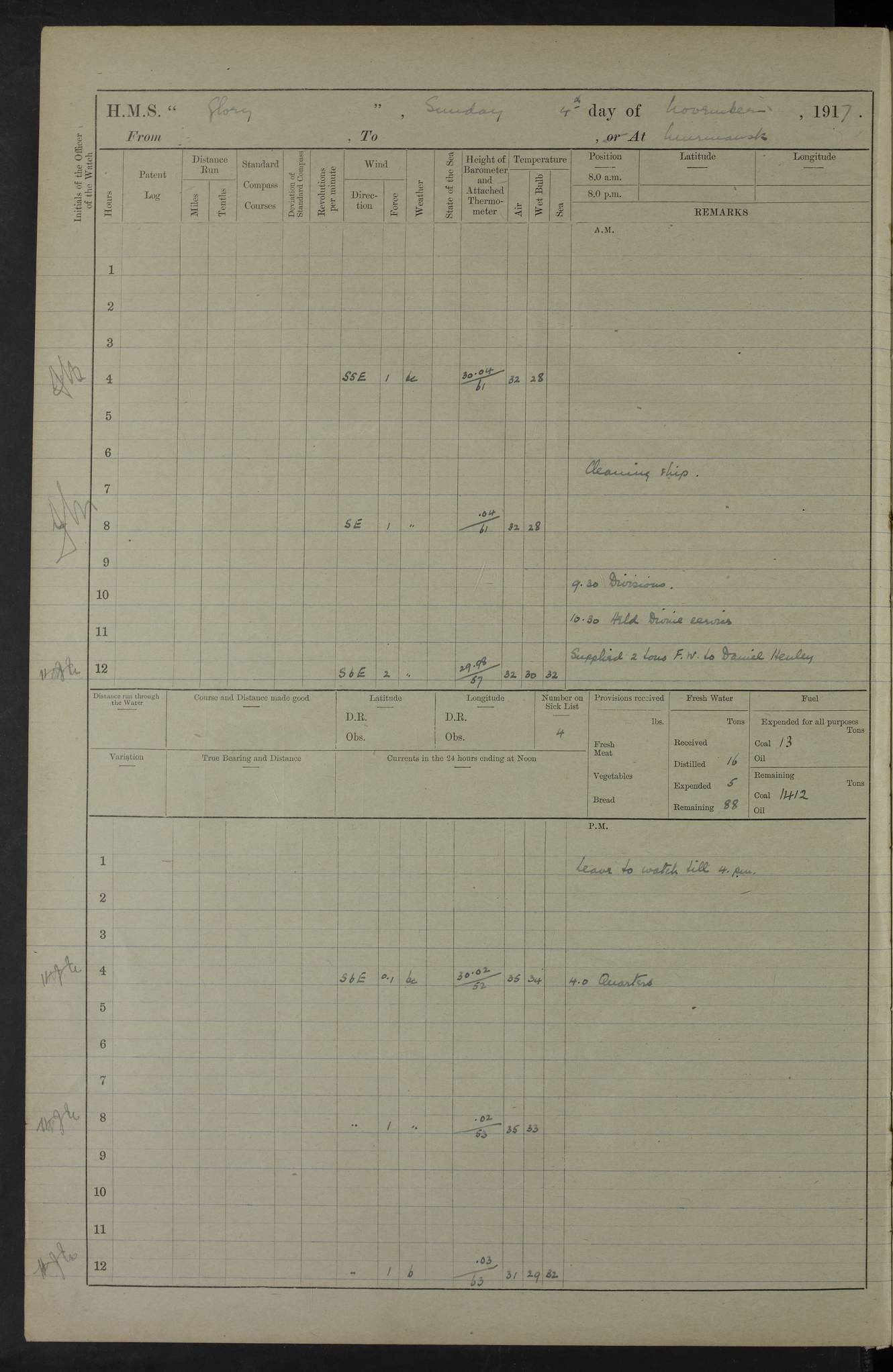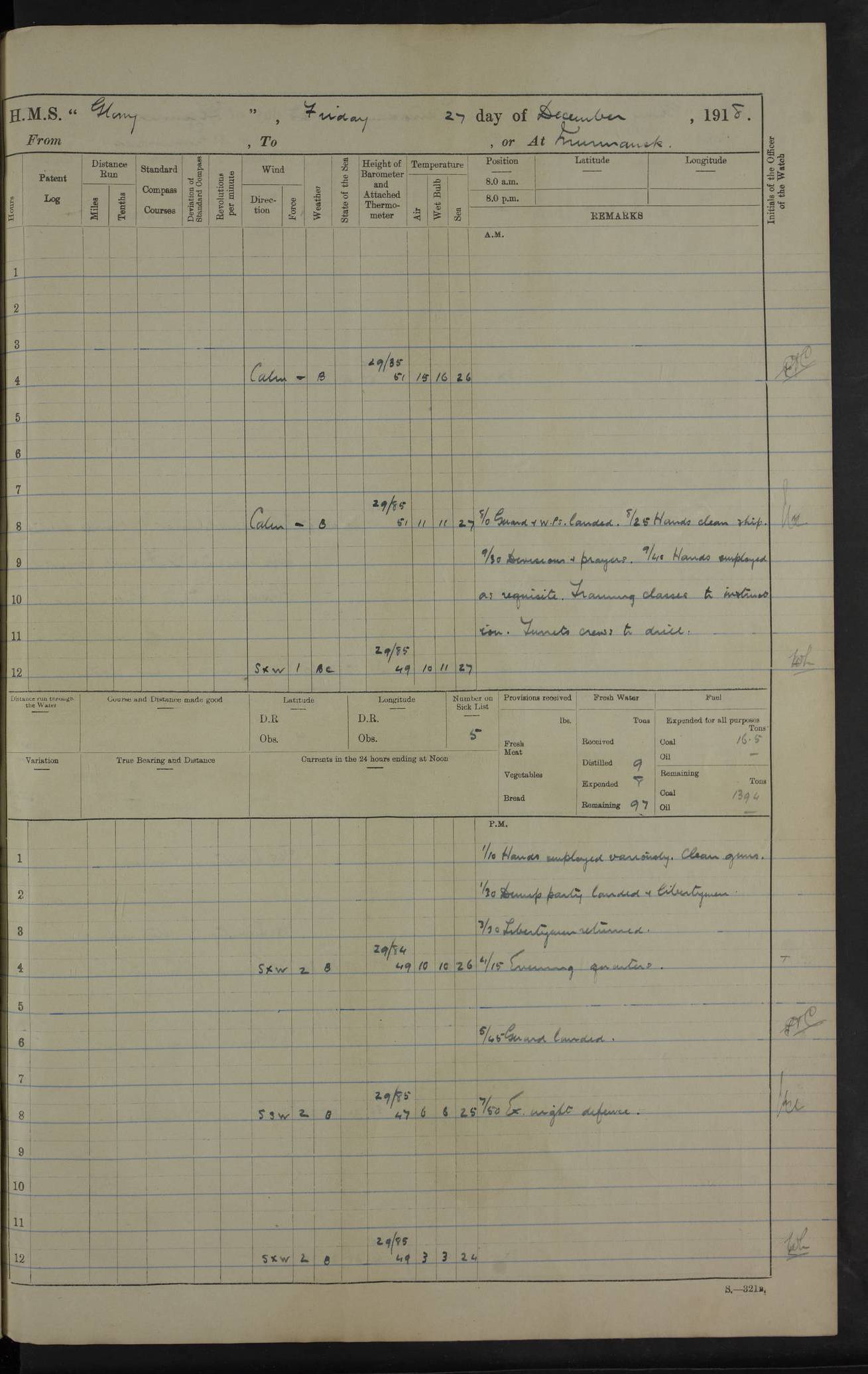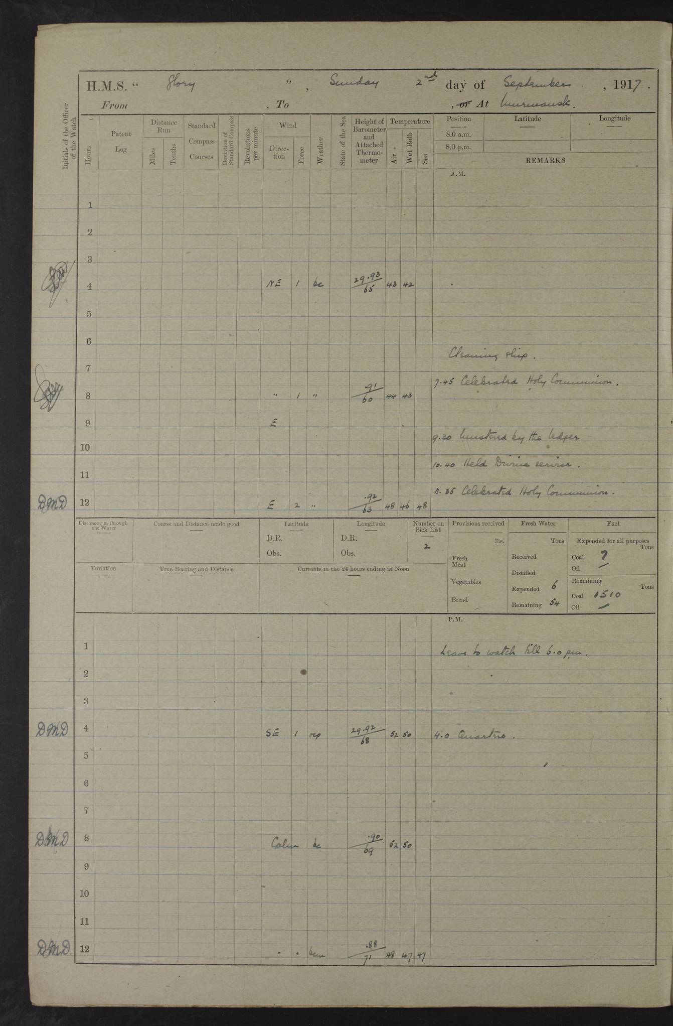 LOGS FOR OCTOBER 1916 For the period covered by the remainder of these logs (1 October, 1916 to 31 December 1918), HMS Glory was based at Murmansk, northern Russia. The city had a variety of names in the early 20th Century – including, Port Murman, Romanov and Murmansk. The location will be given in these pages as Murmansk, the modern name. A history of Murmansk’s names is available at http://en.wikipedia.org/wiki/Murmansk . 4f961482a2fc8e2def0011c7: (http://s3.amazonaws.com/oldweather/ADM53-43026/ADM 53-43026-001_0.jpg) This log is to be kept in a cover in future 4f961482a2fc8e2def0011c8: (http://s3.amazonaws.com/oldweather/ADM53-43026/ADM 53-43026-001_1.jpg) 4f961482a2fc8e2def0011c9: (http://s3.amazonaws.com/oldweather/ADM53-43026/ADM 53-43026-002_0.jpg) 4f961483a2fc8e2def0011ca: (http://s3.amazonaws.com/oldweather/ADM53-43026/ADM 53-43026-002_1.jpg) 4f961483a2fc8e2def0011cb: (http://s3.amazonaws.com/oldweather/ADM53-43026/ADM 53-43026-003_0.jpg) 4f961483a2fc8e2def0011cc: (http://s3.amazonaws.com/oldweather/ADM53-43026/ADM 53-43026-003_1.jpg) 1 October 1916 Murmansk Lat 69.03, Long 33.05 5.40am: Russian auxiliary Kolgiev sailed. Information regarding this vessel (or similar name) has not been found. 7.30am: Celebrated Holy Communion. am: Party working in Earl Essex. Earl Essex was a hired trawler of 225 grt, built, in 1914. Sourced from F.J. Dittmar & J.J. Colledge (1972) – British warships 1914–1919, Ian Allan. 10.45am: Held Divine Service. 11.30am: Celebrated Holy Communion. 4.45pm: Out nets. 4f961484a2fc8e2def0011cd: (http://s3.amazonaws.com/oldweather/ADM53-43026/ADM 53-43026-004_0.jpg) 2 October 1916 Murmansk Lat 69.03, Long 33.05 am: Party working in Earl Essex. 11.30am: Paid quarterly settlement. 6.15pm: Kolgiev arrived. 4f961484a2fc8e2def0011ce: (http://s3.amazonaws.com/oldweather/ADM53-43026/ADM 53-43026-004_1.jpg) 3 October 1916 Murmansk Lat 69.03, Long 33.05 Number on sick list: 9 9.20am: Aft port nets. 11.30am: Russian TBs Goorovoi and Plasteevyi(?) arrived. The first of these TBs is possibly ‘Grosovoi’, built at Le Havre around 1900. Her fate is unclear. The name of the second vessel is possibly incorrect, but no near match has been found. 1.30pm: Out port nets. 4f961484a2fc8e2def0011cf: (http://s3.amazonaws.com/oldweather/ADM53-43026/ADM 53-43026-005_0.jpg) 4 October 1916 Murmansk Lat 69.03, Long 33.05 8.30am: Salvator - broad pendant of Commodore T.W. Kemp arrived. Salvator (ex–Katoomba) was a hired yacht of 684 tons gross, built in 1903. She served as the Heliopolis in WW2. Details at WW1NavyBritishShips-Dittmar4AP.htm . 9.25am: Aft port nets. 11.05am: HE the Minister of Marine visited ship. 11.30am: Out port nets. 11.50am: Russian auxiliary Gotowsci(?) arrived. 12 noon: Kolgiev sailed. pm: HM Tug Blackcock arrived. Blackcock was a hired patrol tug, built in 1886 and wrecked on 18 January, 1918, in the White Sea. Sourced from F.J. Dittmar & J.J. Colledge (1972) – British warships 1914–1919, Ian Allan. 6.50pm: Kolgiev arrived. 4f961485a2fc8e2def0011d0: (http://s3.amazonaws.com/oldweather/ADM53-43026/ADM 53-43026-005_1.jpg) 5 October 1916 Murmansk Lat 69.03, Long 33.05 10.35am: Kolgiev sailed. 1.05pm: Salvator sailed. pm: Read Warrant No. 5. 4f961485a2fc8e2def0011d1: (http://s3.amazonaws.com/oldweather/ADM53-43026/ADM 53-43026-006_0.jpg) 6 October 1916 Murmansk Lat 69.03, Long 33.05 pm: 5 tons of water supplied to Blackcock. 3.30pm: Action. 3.45pm: Secure. Russian T.B's Grosovoi and Plasteevyi sailed. 4f961485a2fc8e2def0011d2: (http://s3.amazonaws.com/oldweather/ADM53-43026/ADM 53-43026-006_1.jpg) 7 October 1916 Murmansk Lat 69.03, Long 33.05 am: Party coaling trawler. am: Tested life buoys – correct. 4f961486a2fc8e2def0011d3: (http://s3.amazonaws.com/oldweather/ADM53-43026/ADM 53-43026-007_0.jpg) 8 October 1916 Murmansk Lat 69.03, Long 33.05 6.45am: Party working in collier. 7.30am: Celebrated Holy Communion. 10.45am: Held Divine service. 5.45pm: Held Divine Service. 4f961486a2fc8e2def0011d4: (http://s3.amazonaws.com/oldweather/ADM53-43026/ADM 53-43026-007_1.jpg) 9 October 1916 Murmansk Lat 69.03, Long 33.05 Number on sick list: 9 am: Exercised fire stations. am: 2nd pinnace patrolling. pm: Landed marines for drill. 4f961486a2fc8e2def0011d5: (http://s3.amazonaws.com/oldweather/ADM53-43026/ADM 53-43026-008_0.jpg) 10 October 1916 Murmansk Lat 69.03, Long 33.05 am: Steam pinnace patrolling. 1.55pm: Kolgiev arrived. 4f961487a2fc8e2def0011d6: (http://s3.amazonaws.com/oldweather/ADM53-43026/ADM 53-43026-008_1.jpg) 11 October 1916 Murmansk Lat 69.03, Long 33.05 am: Party working on boom defence. am: MT and QD men aired bedding. am: Marines at drill. 1.50pm: Kolgiev sailed. 3.15pm: British tug Racia (lighter ES 23 in tow) arrived. Racia was a hired screw tug of 410 grt, built in 1894 and sold on 23 June, 1920. Sourced from F.J. Dittmar & J.J. Colledge (1972) – British warships 1914–1919, Ian Allan. 4f961487a2fc8e2def0011d7: (http://s3.amazonaws.com/oldweather/ADM53-43026/ADM 53-43026-009_0.jpg) 12 October 1916 Murmansk Lat 69.03, Long 33.05 Number on sick list: 6 am: Party working on boom defence. am: Steam pinnace patrolling. pm: Make and mend clothes. 4.15pm: Read warrant No. 6. 6.00pm: Imperator Nicolas arrived. A vessel with this name has not been traced. 4f961487a2fc8e2def0011d8: (http://s3.amazonaws.com/oldweathe/ADM53-43026/ADM 53-43026-009_1.jpg) 13 October 1916 Murmansk Lat 69.03, Long 33.05 am: Steam pinnace patrolling. am: Party working on boom defence. am: Found foc’sle awning and side screens damaged by rats. 4f961488a2fc8e2def0011d9: (http://s3.amazonaws.com/oldweather/ADM53-43026/ADM 53-43026-010_0.jpg) 14 August 1916 (probably should read October) Murmansk Lat 69.03, Long 33.05 Number on sick list: 7 6.45am: Racia (floating crane in tow) sailed. am: Party working on boom defence. am: Tested life buoys – correct. 3.00pm: Vindictive arrived. HMS Vindictive was a protected cruiser of the Arrogant class, launched in 1897 at Chatham Dockyar