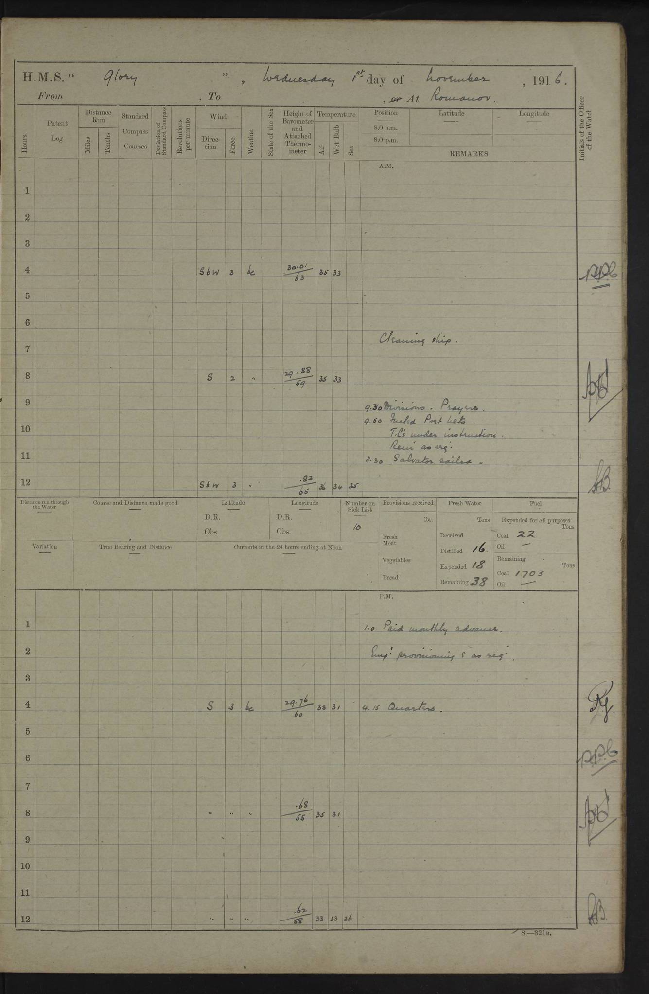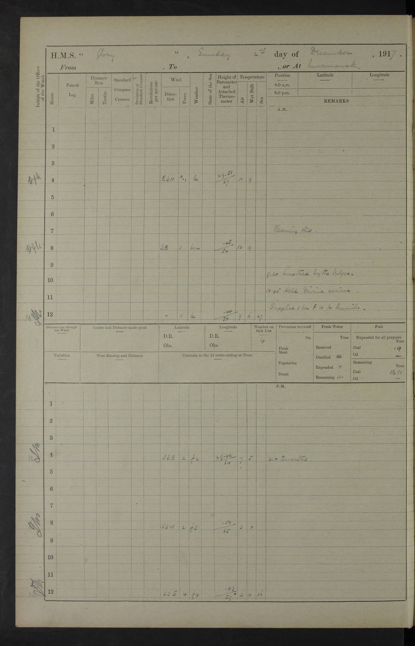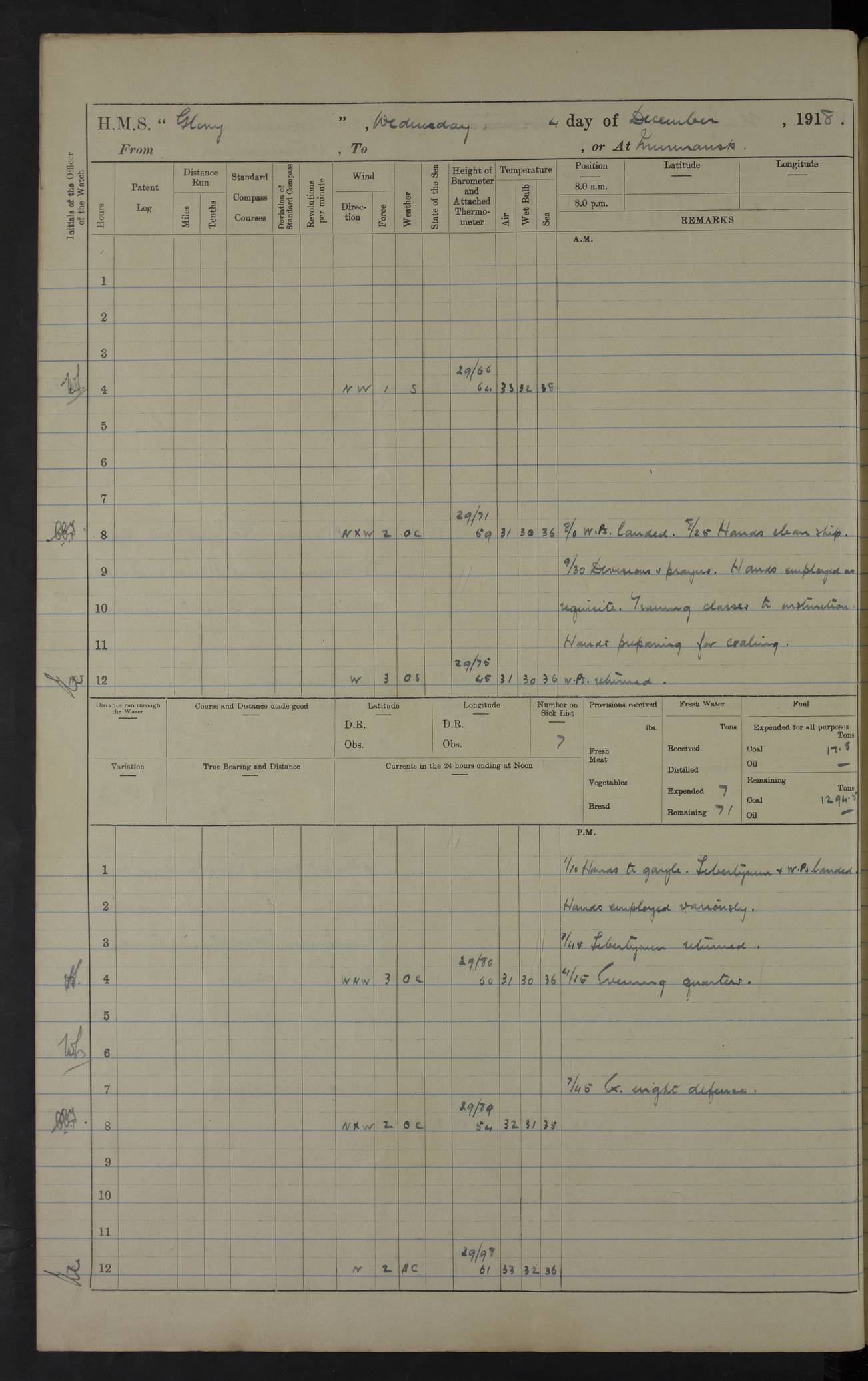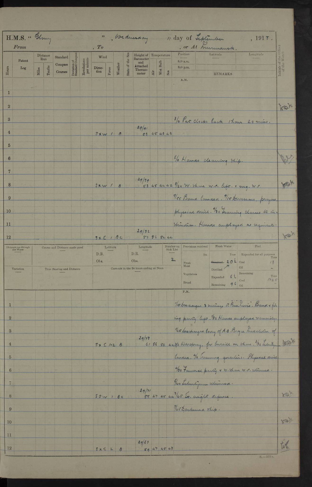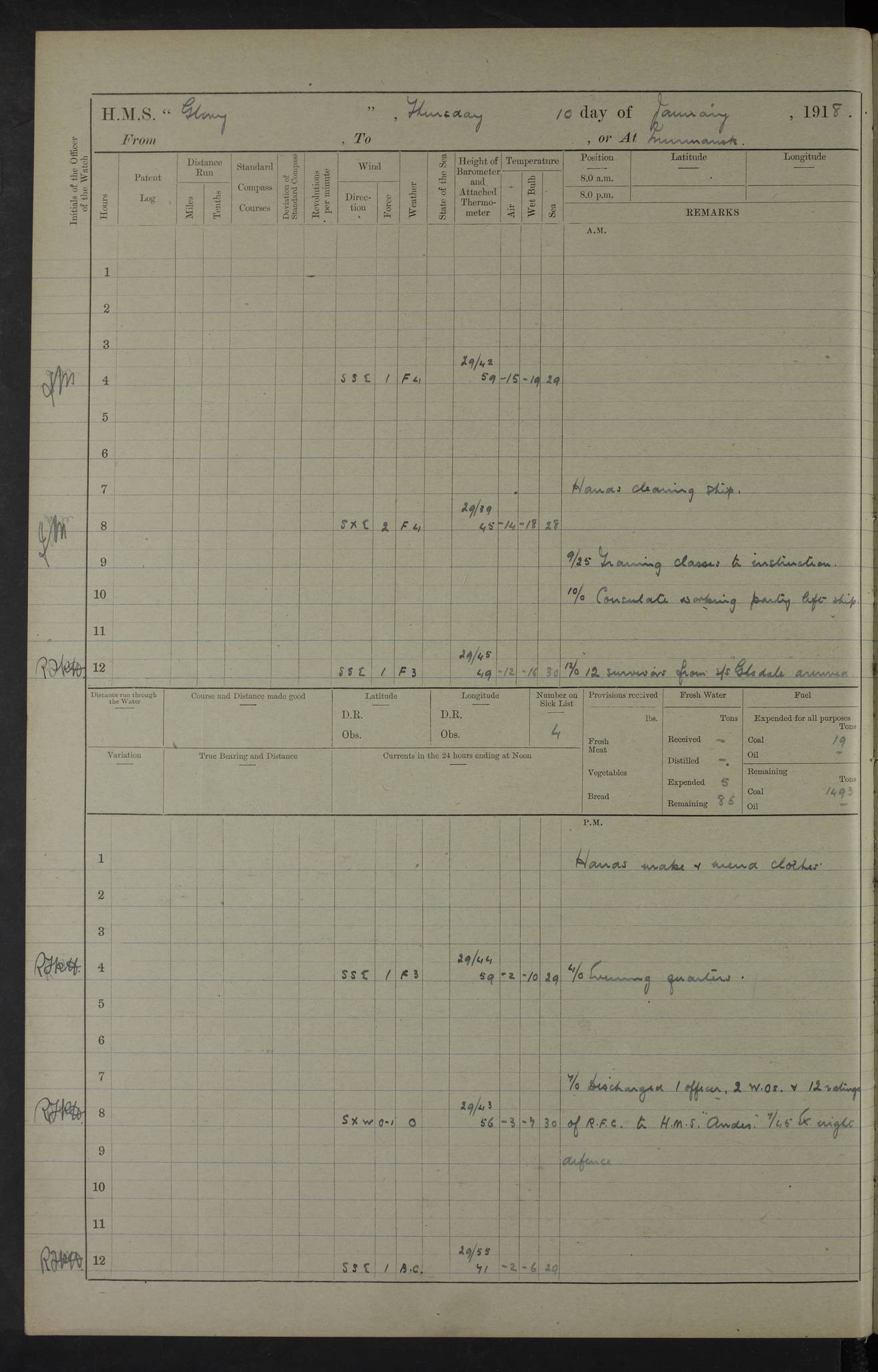 LOGS FOR OCTOBER 1916 For the period covered by the remainder of these logs (1 October, 1916 to 31 December 1918), HMS Glory was based at Murmansk, northern Russia. The city had a variety of names in the early 20th Century – including, Port Murman, Romanov and Murmansk. The location will be given in these pages as Murmansk, the modern name. A history of Murmansk’s names is available at http://en.wikipedia.org/wiki/Murmansk . 4f961482a2fc8e2def0011c7: (http://s3.amazonaws.com/oldweather/ADM53-43026/ADM 53-43026-001_0.jpg) This log is to be kept in a cover in future 4f961482a2fc8e2def0011c8: (http://s3.amazonaws.com/oldweather/ADM53-43026/ADM 53-43026-001_1.jpg) 4f961482a2fc8e2def0011c9: (http://s3.amazonaws.com/oldweather/ADM53-43026/ADM 53-43026-002_0.jpg) 4f961483a2fc8e2def0011ca: (http://s3.amazonaws.com/oldweather/ADM53-43026/ADM 53-43026-002_1.jpg) 4f961483a2fc8e2def0011cb: (http://s3.amazonaws.com/oldweather/ADM53-43026/ADM 53-43026-003_0.jpg) 4f961483a2fc8e2def0011cc: (http://s3.amazonaws.com/oldweather/ADM53-43026/ADM 53-43026-003_1.jpg) 1 October 1916 Murmansk Lat 69.03, Long 33.05 5.40am: Russian auxiliary Kolgiev sailed. Information regarding this vessel (or similar name) has not been found. 7.30am: Celebrated Holy Communion. am: Party working in Earl Essex. Earl Essex was a hired trawler of 225 grt, built, in 1914. Sourced from F.J. Dittmar & J.J. Colledge (1972) – British warships 1914–1919, Ian Allan. 10.45am: Held Divine Service. 11.30am: Celebrated Holy Communion. 4.45pm: Out nets. 4f961484a2fc8e2def0011cd: (http://s3.amazonaws.com/oldweather/ADM53-43026/ADM 53-43026-004_0.jpg) 2 October 1916 Murmansk Lat 69.03, Long 33.05 am: Party working in Earl Essex. 11.30am: Paid quarterly settlement. 6.15pm: Kolgiev arrived. 4f961484a2fc8e2def0011ce: (http://s3.amazonaws.com/oldweather/ADM53-43026/ADM 53-43026-004_1.jpg) 3 October 1916 Murmansk Lat 69.03, Long 33.05 Number on sick list: 9 9.20am: Aft port nets. 11.30am: Russian TBs Goorovoi and Plasteevyi(?) arrived. The first of these TBs is possibly ‘Grosovoi’, built at Le Havre around 1900. Her fate is unclear. The name of the second vessel is possibly incorrect, but no near match has been found. 1.30pm: Out port nets. 4f961484a2fc8e2def0011cf: (http://s3.amazonaws.com/oldweather/ADM53-43026/ADM 53-43026-005_0.jpg) 4 October 1916 Murmansk Lat 69.03, Long 33.05 8.30am: Salvator - broad pendant of Commodore T.W. Kemp arrived. Salvator (ex–Katoomba) was a hired yacht of 684 tons gross, built in 1903. She served as the Heliopolis in WW2. Details at WW1NavyBritishShips-Dittmar4AP.htm . 9.25am: Aft port nets. 11.05am: HE the Minister of Marine visited ship. 11.30am: Out port nets. 11.50am: Russian auxiliary Gotowsci(?) arrived. 12 noon: Kolgiev sailed. pm: HM Tug Blackcock arrived. Blackcock was a hired patrol tug, built in 1886 and wrecked on 18 January, 1918, in the White Sea. Sourced from F.J. Dittmar & J.J. Colledge (1972) – British warships 1914–1919, Ian Allan. 6.50pm: Kolgiev arrived. 4f961485a2fc8e2def0011d0: (http://s3.amazonaws.com/oldweather/ADM53-43026/ADM 53-43026-005_1.jpg) 5 October 1916 Murmansk Lat 69.03, Long 33.05 10.35am: Kolgiev sailed. 1.05pm: Salvator sailed. pm: Read Warrant No. 5. 4f961485a2fc8e2def0011d1: (http://s3.amazonaws.com/oldweather/ADM53-43026/ADM 53-43026-006_0.jpg) 6 October 1916 Murmansk Lat 69.03, Long 33.05 pm: 5 tons of water supplied to Blackcock. 3.30pm: Action. 3.45pm: Secure. Russian T.B's Grosovoi and Plasteevyi sailed. 4f961485a2fc8e2def0011d2: (http://s3.amazonaws.com/oldweather/ADM53-43026/ADM 53-43026-006_1.jpg) 7 October 1916 Murmansk Lat 69.03, Long 33.05 am: Party coaling trawler. am: Tested life buoys – correct. 4f961486a2fc8e2def0011d3: (http://s3.amazonaws.com/oldweather/ADM53-43026/ADM 53-43026-007_0.jpg) 8 October 1916 Murmansk Lat 69.03, Long 33.05 6.45am: Party working in collier. 7.30am: Celebrated Holy Communion. 10.45am: Held Divine service. 5.45pm: Held Divine Service. 4f961486a2fc8e2def0011d4: (http://s3.amazonaws.com/oldweather/ADM53-43026/ADM 53-43026-007_1.jpg) 9 October 1916 Murmansk Lat 69.03, Long 33.05 Number on sick list: 9 am: Exercised fire stations. am: 2nd pinnace patrolling. pm: Landed marines for drill. 4f961486a2fc8e2def0011d5: (http://s3.amazonaws.com/oldweather/ADM53-43026/ADM 53-43026-008_0.jpg) 10 October 1916 Murmansk Lat 69.03, Long 33.05 am: Steam pinnace patrolling. 1.55pm: Kolgiev arrived. 4f961487a2fc8e2def0011d6: (http://s3.amazonaws.com/oldweather/ADM53-43026/ADM 53-43026-008_1.jpg) 11 October 1916 Murmansk Lat 69.03, Long 33.05 am: Party working on boom defence. am: MT and QD men aired bedding. am: Marines at drill. 1.50pm: Kolgiev sailed. 3.15pm: British tug Racia (lighter ES 23 in tow) arrived. Racia was a hired screw tug of 410 grt, built in 1894 and sold on 23 June, 1920. Sourced from F.J. Dittmar & J.J. Colledge (1972) – British warships 1914–1919, Ian Allan. 4f961487a2fc8e2def0011d7: (http://s3.amazonaws.com/oldweather/ADM53-43026/ADM 53-43026-009_0.jpg) 12 October 1916 Murmansk Lat 69.03, Long 33.05 Number on sick list: 6 am: Party working on boom defence. am: Steam pinnace patrolling. pm: Make and mend clothes. 4.15pm: Read warrant No. 6. 6.00pm: Imperator Nicolas arrived. A vessel with this name has not been traced. 4f961487a2fc8e2def0011d8: (http://s3.amazonaws.com/oldweathe/ADM53-43026/ADM 53-43026-009_1.jpg) 13 October 1916 Murmansk Lat 69.03, Long 33.05 am: Steam pinnace patrolling. am: Party working on boom defence. am: Found foc’sle awning and side screens damaged by rats. 4f961488a2fc8e2def0011d9: (http://s3.amazonaws.com/oldweather/ADM53-43026/ADM 53-43026-010_0.jpg) 14 August 1916 (probably should read October) Murmansk Lat 69.03, Long 33.05 Number on sick list: 7 6.45am: Racia (floating crane in tow) sailed. am: Party working on boom defence. am: Tested life buoys – correct. 3.00pm: Vindictive arrived. HMS Vindictive was a protected cruiser of the Arrogant class, launched in 1897 at Chatham Dockyar