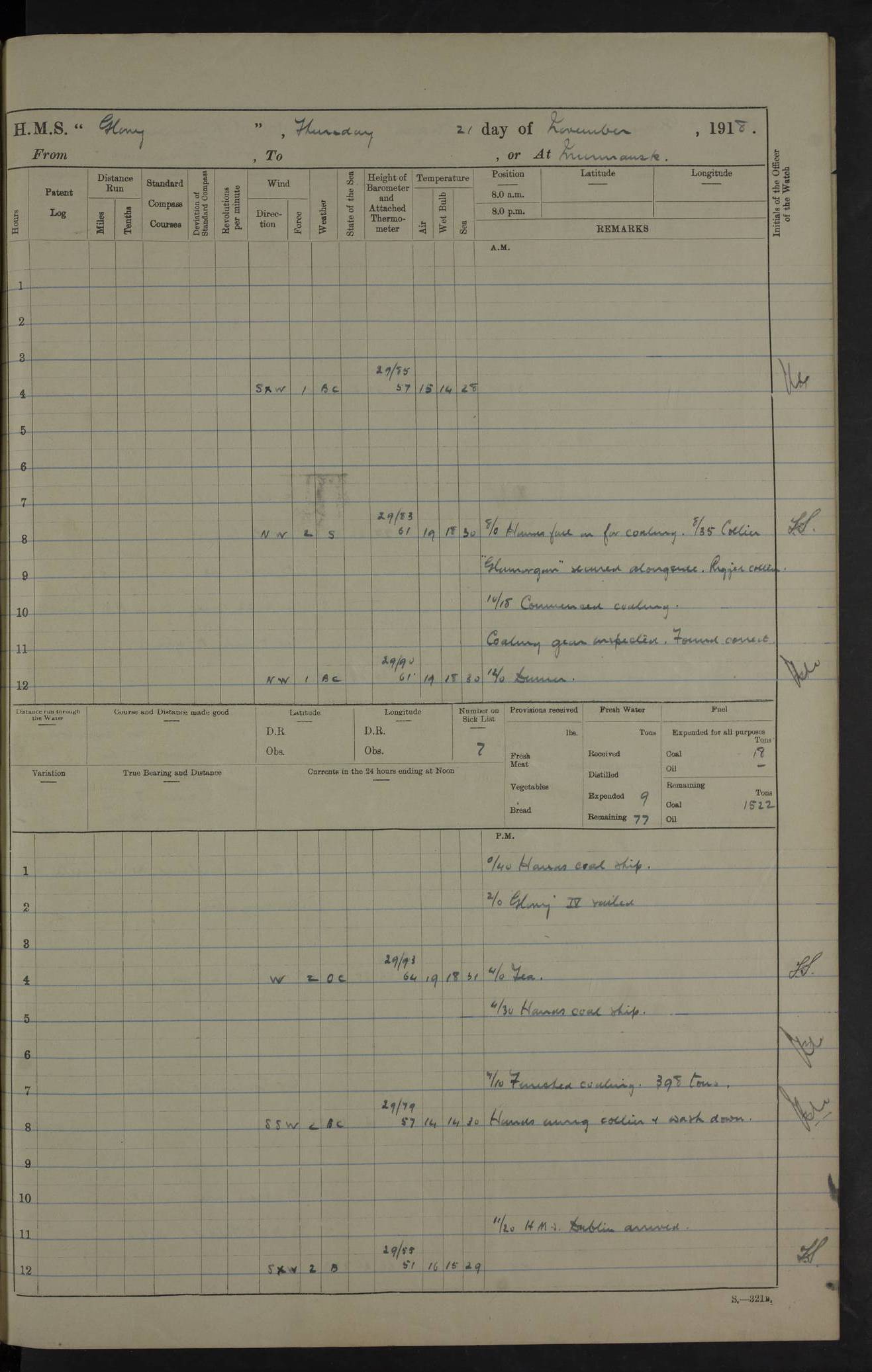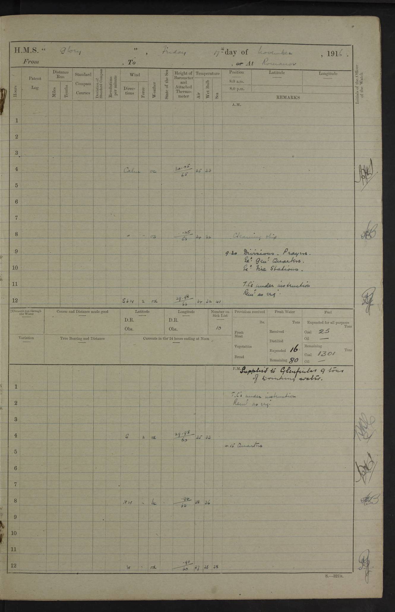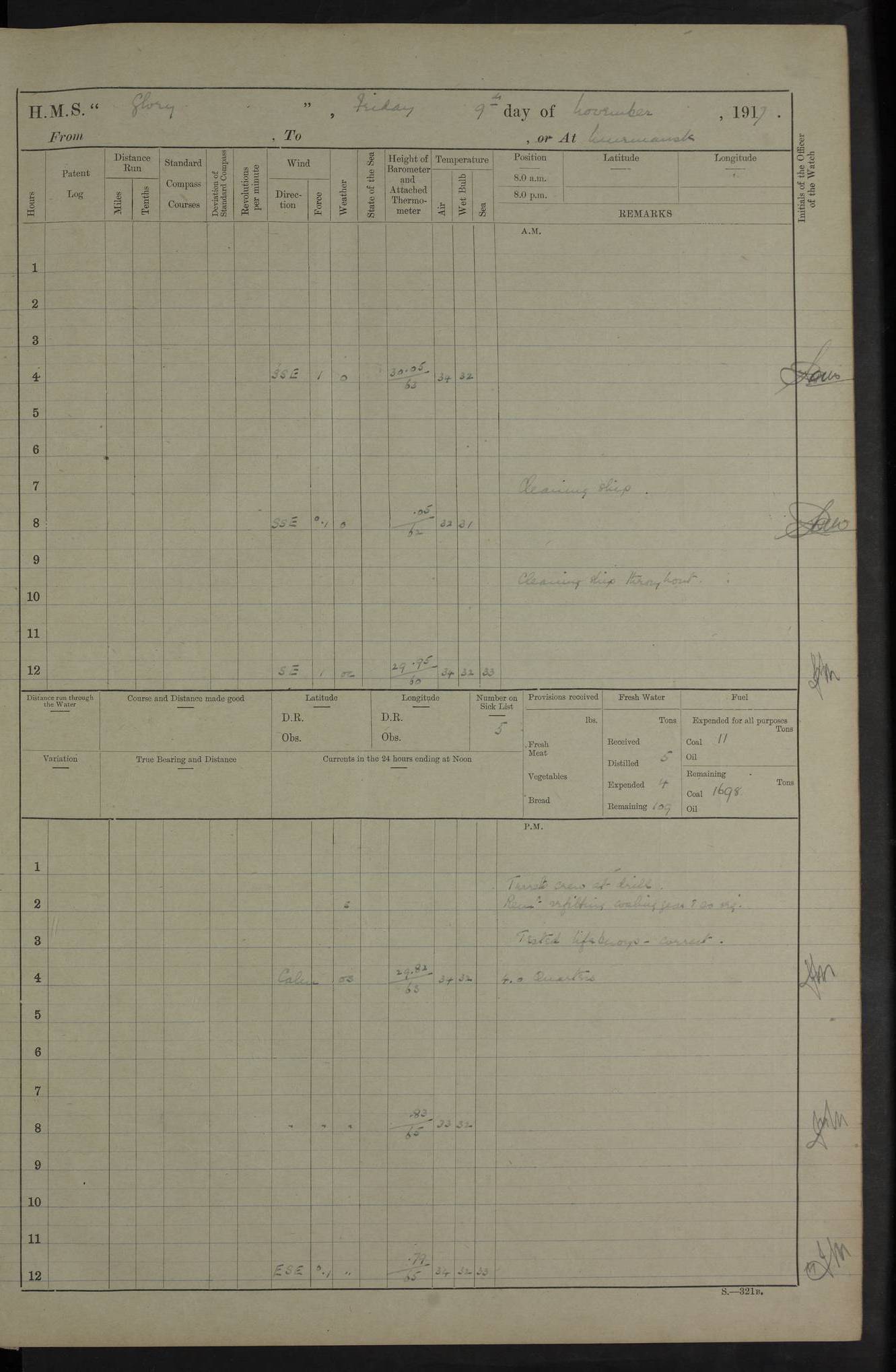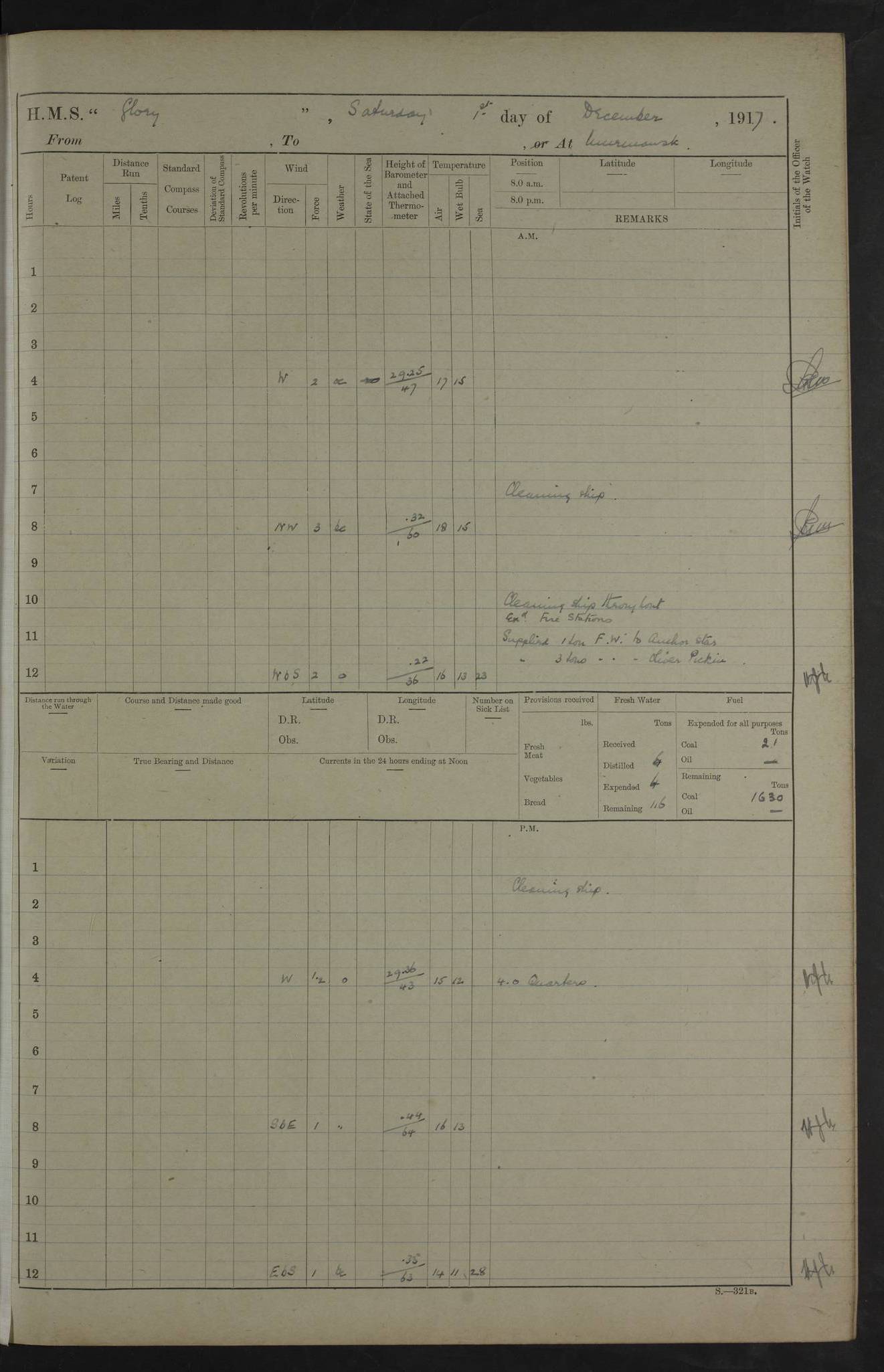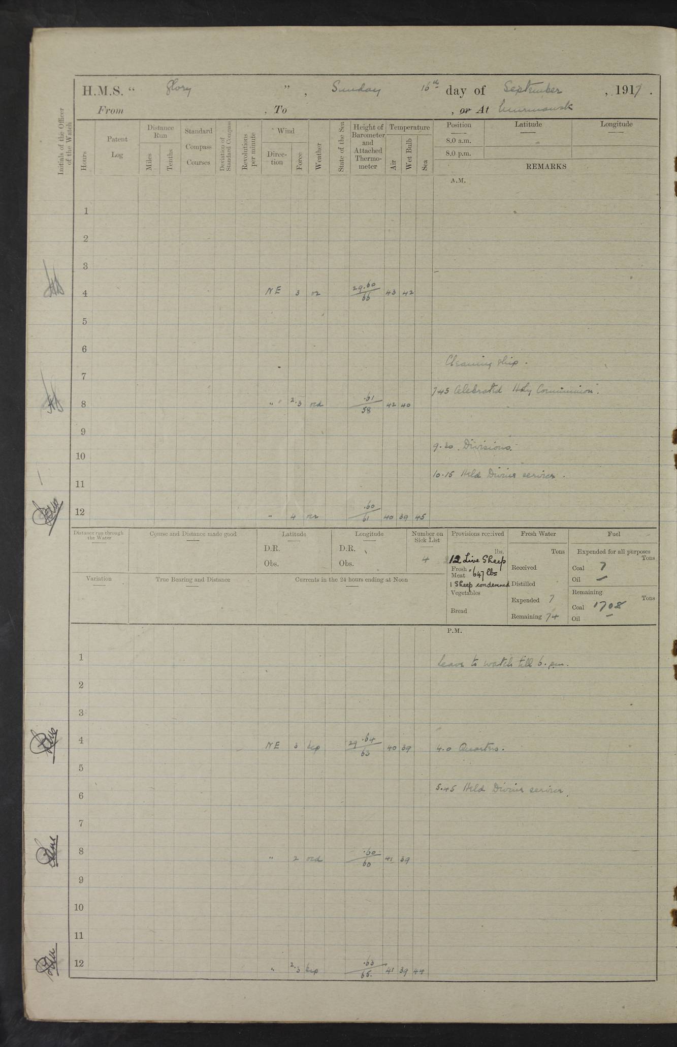 LOGS FOR OCTOBER 1916 For the period covered by the remainder of these logs (1 October, 1916 to 31 December 1918), HMS Glory was based at Murmansk, northern Russia. The city had a variety of names in the early 20th Century – including, Port Murman, Romanov and Murmansk. The location will be given in these pages as Murmansk, the modern name. A history of Murmansk’s names is available at http://en.wikipedia.org/wiki/Murmansk . 4f961482a2fc8e2def0011c7: (http://s3.amazonaws.com/oldweather/ADM53-43026/ADM 53-43026-001_0.jpg) This log is to be kept in a cover in future 4f961482a2fc8e2def0011c8: (http://s3.amazonaws.com/oldweather/ADM53-43026/ADM 53-43026-001_1.jpg) 4f961482a2fc8e2def0011c9: (http://s3.amazonaws.com/oldweather/ADM53-43026/ADM 53-43026-002_0.jpg) 4f961483a2fc8e2def0011ca: (http://s3.amazonaws.com/oldweather/ADM53-43026/ADM 53-43026-002_1.jpg) 4f961483a2fc8e2def0011cb: (http://s3.amazonaws.com/oldweather/ADM53-43026/ADM 53-43026-003_0.jpg) 4f961483a2fc8e2def0011cc: (http://s3.amazonaws.com/oldweather/ADM53-43026/ADM 53-43026-003_1.jpg) 1 October 1916 Murmansk Lat 69.03, Long 33.05 5.40am: Russian auxiliary Kolgiev sailed. Information regarding this vessel (or similar name) has not been found. 7.30am: Celebrated Holy Communion. am: Party working in Earl Essex. Earl Essex was a hired trawler of 225 grt, built, in 1914. Sourced from F.J. Dittmar & J.J. Colledge (1972) – British warships 1914–1919, Ian Allan. 10.45am: Held Divine Service. 11.30am: Celebrated Holy Communion. 4.45pm: Out nets. 4f961484a2fc8e2def0011cd: (http://s3.amazonaws.com/oldweather/ADM53-43026/ADM 53-43026-004_0.jpg) 2 October 1916 Murmansk Lat 69.03, Long 33.05 am: Party working in Earl Essex. 11.30am: Paid quarterly settlement. 6.15pm: Kolgiev arrived. 4f961484a2fc8e2def0011ce: (http://s3.amazonaws.com/oldweather/ADM53-43026/ADM 53-43026-004_1.jpg) 3 October 1916 Murmansk Lat 69.03, Long 33.05 Number on sick list: 9 9.20am: Aft port nets. 11.30am: Russian TBs Goorovoi and Plasteevyi(?) arrived. The first of these TBs is possibly ‘Grosovoi’, built at Le Havre around 1900. Her fate is unclear. The name of the second vessel is possibly incorrect, but no near match has been found. 1.30pm: Out port nets. 4f961484a2fc8e2def0011cf: (http://s3.amazonaws.com/oldweather/ADM53-43026/ADM 53-43026-005_0.jpg) 4 October 1916 Murmansk Lat 69.03, Long 33.05 8.30am: Salvator - broad pendant of Commodore T.W. Kemp arrived. Salvator (ex–Katoomba) was a hired yacht of 684 tons gross, built in 1903. She served as the Heliopolis in WW2. Details at WW1NavyBritishShips-Dittmar4AP.htm . 9.25am: Aft port nets. 11.05am: HE the Minister of Marine visited ship. 11.30am: Out port nets. 11.50am: Russian auxiliary Gotowsci(?) arrived. 12 noon: Kolgiev sailed. pm: HM Tug Blackcock arrived. Blackcock was a hired patrol tug, built in 1886 and wrecked on 18 January, 1918, in the White Sea. Sourced from F.J. Dittmar & J.J. Colledge (1972) – British warships 1914–1919, Ian Allan. 6.50pm: Kolgiev arrived. 4f961485a2fc8e2def0011d0: (http://s3.amazonaws.com/oldweather/ADM53-43026/ADM 53-43026-005_1.jpg) 5 October 1916 Murmansk Lat 69.03, Long 33.05 10.35am: Kolgiev sailed. 1.05pm: Salvator sailed. pm: Read Warrant No. 5. 4f961485a2fc8e2def0011d1: (http://s3.amazonaws.com/oldweather/ADM53-43026/ADM 53-43026-006_0.jpg) 6 October 1916 Murmansk Lat 69.03, Long 33.05 pm: 5 tons of water supplied to Blackcock. 3.30pm: Action. 3.45pm: Secure. Russian T.B's Grosovoi and Plasteevyi sailed. 4f961485a2fc8e2def0011d2: (http://s3.amazonaws.com/oldweather/ADM53-43026/ADM 53-43026-006_1.jpg) 7 October 1916 Murmansk Lat 69.03, Long 33.05 am: Party coaling trawler. am: Tested life buoys – correct. 4f961486a2fc8e2def0011d3: (http://s3.amazonaws.com/oldweather/ADM53-43026/ADM 53-43026-007_0.jpg) 8 October 1916 Murmansk Lat 69.03, Long 33.05 6.45am: Party working in collier. 7.30am: Celebrated Holy Communion. 10.45am: Held Divine service. 5.45pm: Held Divine Service. 4f961486a2fc8e2def0011d4: (http://s3.amazonaws.com/oldweather/ADM53-43026/ADM 53-43026-007_1.jpg) 9 October 1916 Murmansk Lat 69.03, Long 33.05 Number on sick list: 9 am: Exercised fire stations. am: 2nd pinnace patrolling. pm: Landed marines for drill. 4f961486a2fc8e2def0011d5: (http://s3.amazonaws.com/oldweather/ADM53-43026/ADM 53-43026-008_0.jpg) 10 October 1916 Murmansk Lat 69.03, Long 33.05 am: Steam pinnace patrolling. 1.55pm: Kolgiev arrived. 4f961487a2fc8e2def0011d6: (http://s3.amazonaws.com/oldweather/ADM53-43026/ADM 53-43026-008_1.jpg) 11 October 1916 Murmansk Lat 69.03, Long 33.05 am: Party working on boom defence. am: MT and QD men aired bedding. am: Marines at drill. 1.50pm: Kolgiev sailed. 3.15pm: British tug Racia (lighter ES 23 in tow) arrived. Racia was a hired screw tug of 410 grt, built in 1894 and sold on 23 June, 1920. Sourced from F.J. Dittmar & J.J. Colledge (1972) – British warships 1914–1919, Ian Allan. 4f961487a2fc8e2def0011d7: (http://s3.amazonaws.com/oldweather/ADM53-43026/ADM 53-43026-009_0.jpg) 12 October 1916 Murmansk Lat 69.03, Long 33.05 Number on sick list: 6 am: Party working on boom defence. am: Steam pinnace patrolling. pm: Make and mend clothes. 4.15pm: Read warrant No. 6. 6.00pm: Imperator Nicolas arrived. A vessel with this name has not been traced. 4f961487a2fc8e2def0011d8: (http://s3.amazonaws.com/oldweathe/ADM53-43026/ADM 53-43026-009_1.jpg) 13 October 1916 Murmansk Lat 69.03, Long 33.05 am: Steam pinnace patrolling. am: Party working on boom defence. am: Found foc’sle awning and side screens damaged by rats. 4f961488a2fc8e2def0011d9: (http://s3.amazonaws.com/oldweather/ADM53-43026/ADM 53-43026-010_0.jpg) 14 August 1916 (probably should read October) Murmansk Lat 69.03, Long 33.05 Number on sick list: 7 6.45am: Racia (floating crane in tow) sailed. am: Party working on boom defence. am: Tested life buoys – correct. 3.00pm: Vindictive arrived. HMS Vindictive was a protected cruiser of the Arrogant class, launched in 1897 at Chatham Dockyar