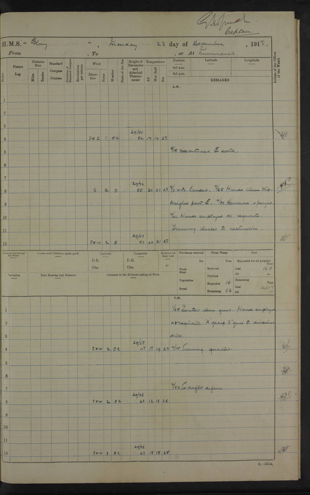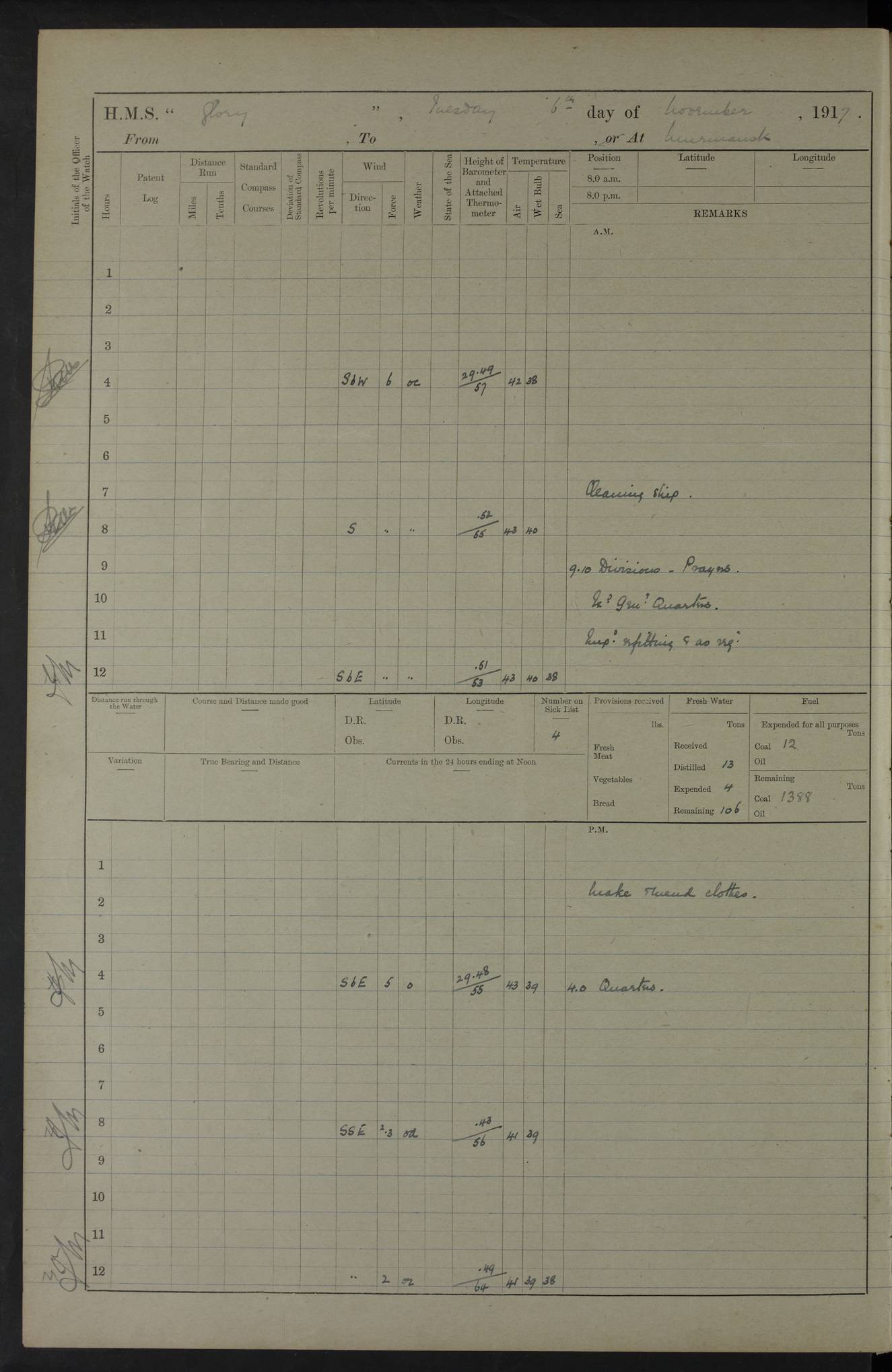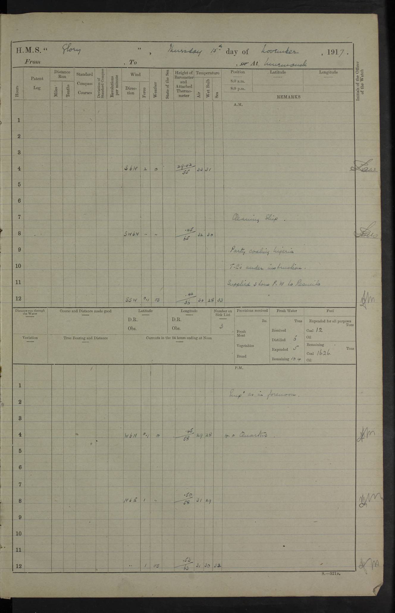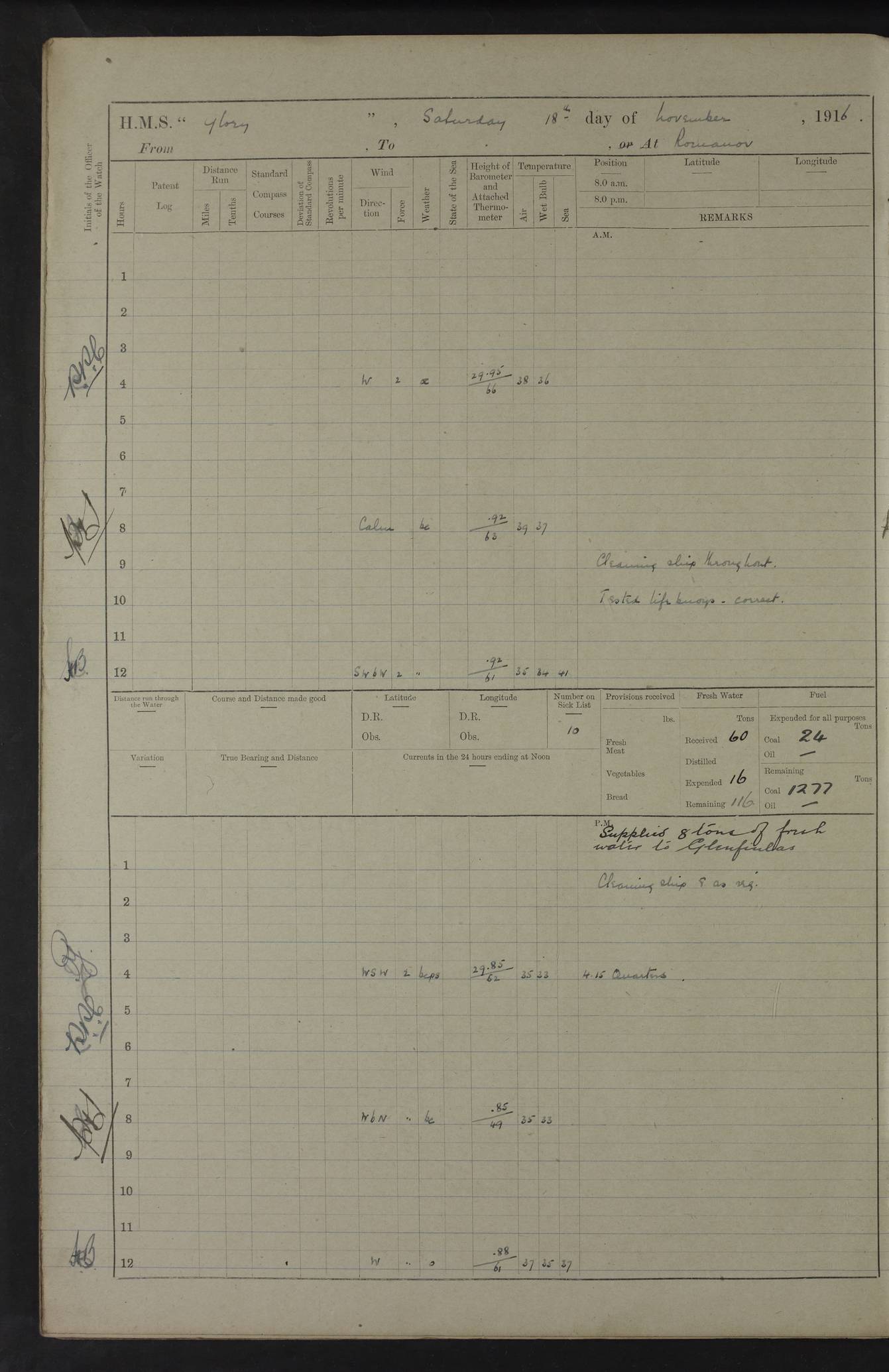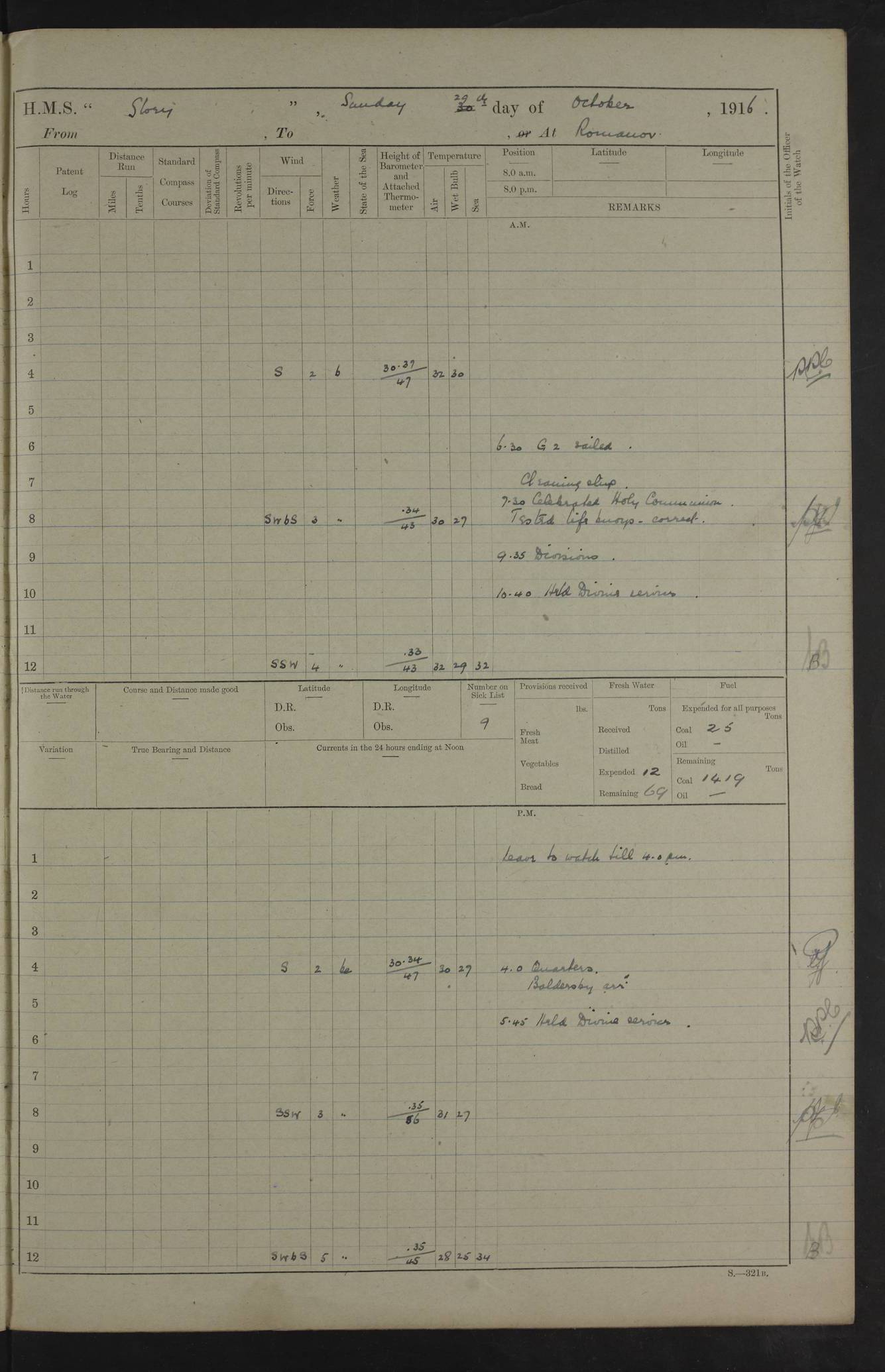 LOGS FOR OCTOBER 1916 For the period covered by the remainder of these logs (1 October, 1916 to 31 December 1918), HMS Glory was based at Murmansk, northern Russia. The city had a variety of names in the early 20th Century – including, Port Murman, Romanov and Murmansk. The location will be given in these pages as Murmansk, the modern name. A history of Murmansk’s names is available at http://en.wikipedia.org/wiki/Murmansk . 4f961482a2fc8e2def0011c7: (http://s3.amazonaws.com/oldweather/ADM53-43026/ADM 53-43026-001_0.jpg) This log is to be kept in a cover in future 4f961482a2fc8e2def0011c8: (http://s3.amazonaws.com/oldweather/ADM53-43026/ADM 53-43026-001_1.jpg) 4f961482a2fc8e2def0011c9: (http://s3.amazonaws.com/oldweather/ADM53-43026/ADM 53-43026-002_0.jpg) 4f961483a2fc8e2def0011ca: (http://s3.amazonaws.com/oldweather/ADM53-43026/ADM 53-43026-002_1.jpg) 4f961483a2fc8e2def0011cb: (http://s3.amazonaws.com/oldweather/ADM53-43026/ADM 53-43026-003_0.jpg) 4f961483a2fc8e2def0011cc: (http://s3.amazonaws.com/oldweather/ADM53-43026/ADM 53-43026-003_1.jpg) 1 October 1916 Murmansk Lat 69.03, Long 33.05 5.40am: Russian auxiliary Kolgiev sailed. Information regarding this vessel (or similar name) has not been found. 7.30am: Celebrated Holy Communion. am: Party working in Earl Essex. Earl Essex was a hired trawler of 225 grt, built, in 1914. Sourced from F.J. Dittmar & J.J. Colledge (1972) – British warships 1914–1919, Ian Allan. 10.45am: Held Divine Service. 11.30am: Celebrated Holy Communion. 4.45pm: Out nets. 4f961484a2fc8e2def0011cd: (http://s3.amazonaws.com/oldweather/ADM53-43026/ADM 53-43026-004_0.jpg) 2 October 1916 Murmansk Lat 69.03, Long 33.05 am: Party working in Earl Essex. 11.30am: Paid quarterly settlement. 6.15pm: Kolgiev arrived. 4f961484a2fc8e2def0011ce: (http://s3.amazonaws.com/oldweather/ADM53-43026/ADM 53-43026-004_1.jpg) 3 October 1916 Murmansk Lat 69.03, Long 33.05 Number on sick list: 9 9.20am: Aft port nets. 11.30am: Russian TBs Goorovoi and Plasteevyi(?) arrived. The first of these TBs is possibly ‘Grosovoi’, built at Le Havre around 1900. Her fate is unclear. The name of the second vessel is possibly incorrect, but no near match has been found. 1.30pm: Out port nets. 4f961484a2fc8e2def0011cf: (http://s3.amazonaws.com/oldweather/ADM53-43026/ADM 53-43026-005_0.jpg) 4 October 1916 Murmansk Lat 69.03, Long 33.05 8.30am: Salvator - broad pendant of Commodore T.W. Kemp arrived. Salvator (ex–Katoomba) was a hired yacht of 684 tons gross, built in 1903. She served as the Heliopolis in WW2. Details at WW1NavyBritishShips-Dittmar4AP.htm . 9.25am: Aft port nets. 11.05am: HE the Minister of Marine visited ship. 11.30am: Out port nets. 11.50am: Russian auxiliary Gotowsci(?) arrived. 12 noon: Kolgiev sailed. pm: HM Tug Blackcock arrived. Blackcock was a hired patrol tug, built in 1886 and wrecked on 18 January, 1918, in the White Sea. Sourced from F.J. Dittmar & J.J. Colledge (1972) – British warships 1914–1919, Ian Allan. 6.50pm: Kolgiev arrived. 4f961485a2fc8e2def0011d0: (http://s3.amazonaws.com/oldweather/ADM53-43026/ADM 53-43026-005_1.jpg) 5 October 1916 Murmansk Lat 69.03, Long 33.05 10.35am: Kolgiev sailed. 1.05pm: Salvator sailed. pm: Read Warrant No. 5. 4f961485a2fc8e2def0011d1: (http://s3.amazonaws.com/oldweather/ADM53-43026/ADM 53-43026-006_0.jpg) 6 October 1916 Murmansk Lat 69.03, Long 33.05 pm: 5 tons of water supplied to Blackcock. 3.30pm: Action. 3.45pm: Secure. Russian T.B's Grosovoi and Plasteevyi sailed. 4f961485a2fc8e2def0011d2: (http://s3.amazonaws.com/oldweather/ADM53-43026/ADM 53-43026-006_1.jpg) 7 October 1916 Murmansk Lat 69.03, Long 33.05 am: Party coaling trawler. am: Tested life buoys – correct. 4f961486a2fc8e2def0011d3: (http://s3.amazonaws.com/oldweather/ADM53-43026/ADM 53-43026-007_0.jpg) 8 October 1916 Murmansk Lat 69.03, Long 33.05 6.45am: Party working in collier. 7.30am: Celebrated Holy Communion. 10.45am: Held Divine service. 5.45pm: Held Divine Service. 4f961486a2fc8e2def0011d4: (http://s3.amazonaws.com/oldweather/ADM53-43026/ADM 53-43026-007_1.jpg) 9 October 1916 Murmansk Lat 69.03, Long 33.05 Number on sick list: 9 am: Exercised fire stations. am: 2nd pinnace patrolling. pm: Landed marines for drill. 4f961486a2fc8e2def0011d5: (http://s3.amazonaws.com/oldweather/ADM53-43026/ADM 53-43026-008_0.jpg) 10 October 1916 Murmansk Lat 69.03, Long 33.05 am: Steam pinnace patrolling. 1.55pm: Kolgiev arrived. 4f961487a2fc8e2def0011d6: (http://s3.amazonaws.com/oldweather/ADM53-43026/ADM 53-43026-008_1.jpg) 11 October 1916 Murmansk Lat 69.03, Long 33.05 am: Party working on boom defence. am: MT and QD men aired bedding. am: Marines at drill. 1.50pm: Kolgiev sailed. 3.15pm: British tug Racia (lighter ES 23 in tow) arrived. Racia was a hired screw tug of 410 grt, built in 1894 and sold on 23 June, 1920. Sourced from F.J. Dittmar & J.J. Colledge (1972) – British warships 1914–1919, Ian Allan. 4f961487a2fc8e2def0011d7: (http://s3.amazonaws.com/oldweather/ADM53-43026/ADM 53-43026-009_0.jpg) 12 October 1916 Murmansk Lat 69.03, Long 33.05 Number on sick list: 6 am: Party working on boom defence. am: Steam pinnace patrolling. pm: Make and mend clothes. 4.15pm: Read warrant No. 6. 6.00pm: Imperator Nicolas arrived. A vessel with this name has not been traced. 4f961487a2fc8e2def0011d8: (http://s3.amazonaws.com/oldweathe/ADM53-43026/ADM 53-43026-009_1.jpg) 13 October 1916 Murmansk Lat 69.03, Long 33.05 am: Steam pinnace patrolling. am: Party working on boom defence. am: Found foc’sle awning and side screens damaged by rats. 4f961488a2fc8e2def0011d9: (http://s3.amazonaws.com/oldweather/ADM53-43026/ADM 53-43026-010_0.jpg) 14 August 1916 (probably should read October) Murmansk Lat 69.03, Long 33.05 Number on sick list: 7 6.45am: Racia (floating crane in tow) sailed. am: Party working on boom defence. am: Tested life buoys – correct. 3.00pm: Vindictive arrived. HMS Vindictive was a protected cruiser of the Arrogant class, launched in 1897 at Chatham Dockyar