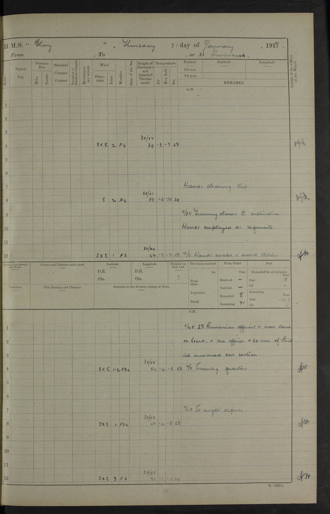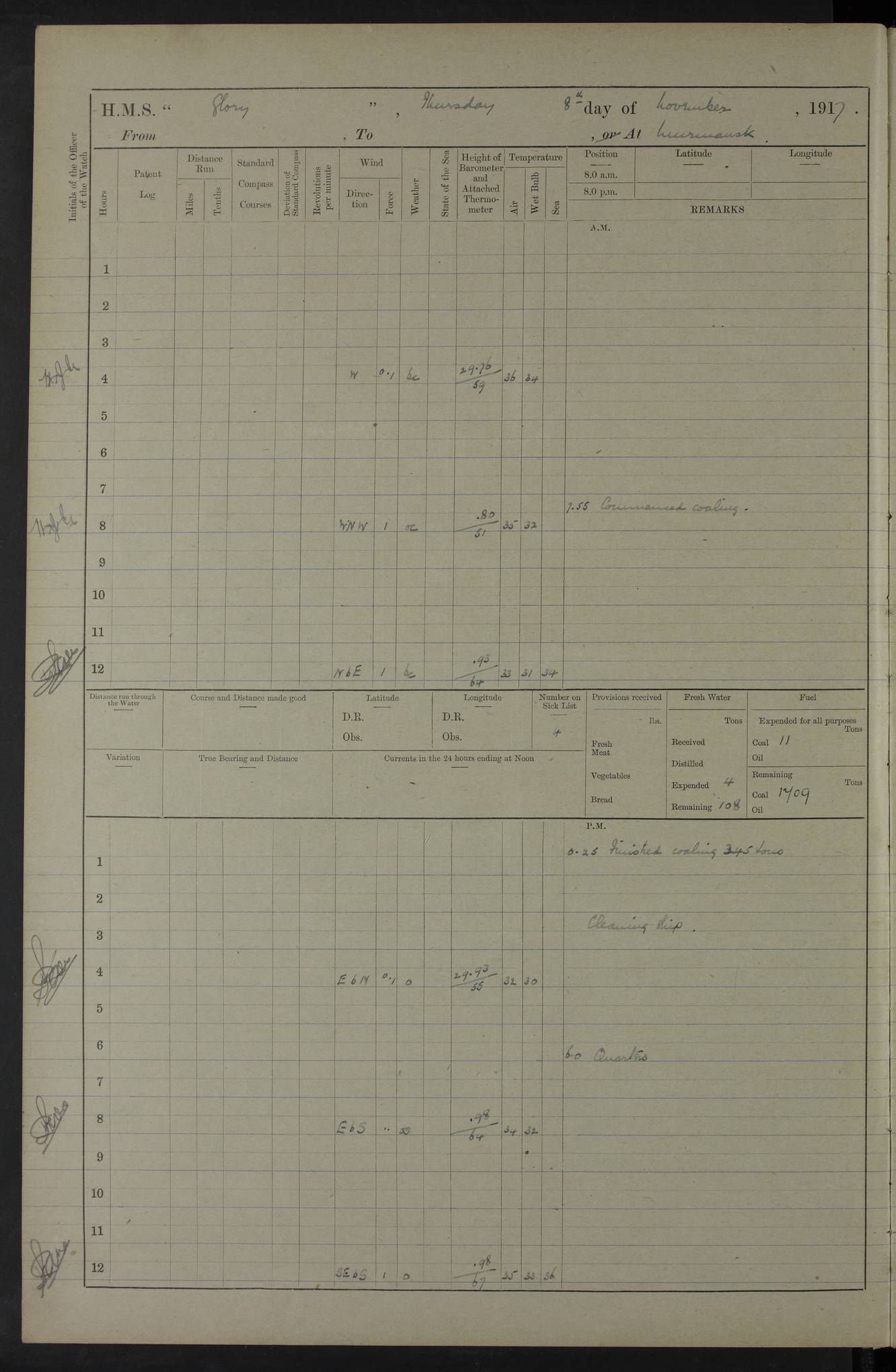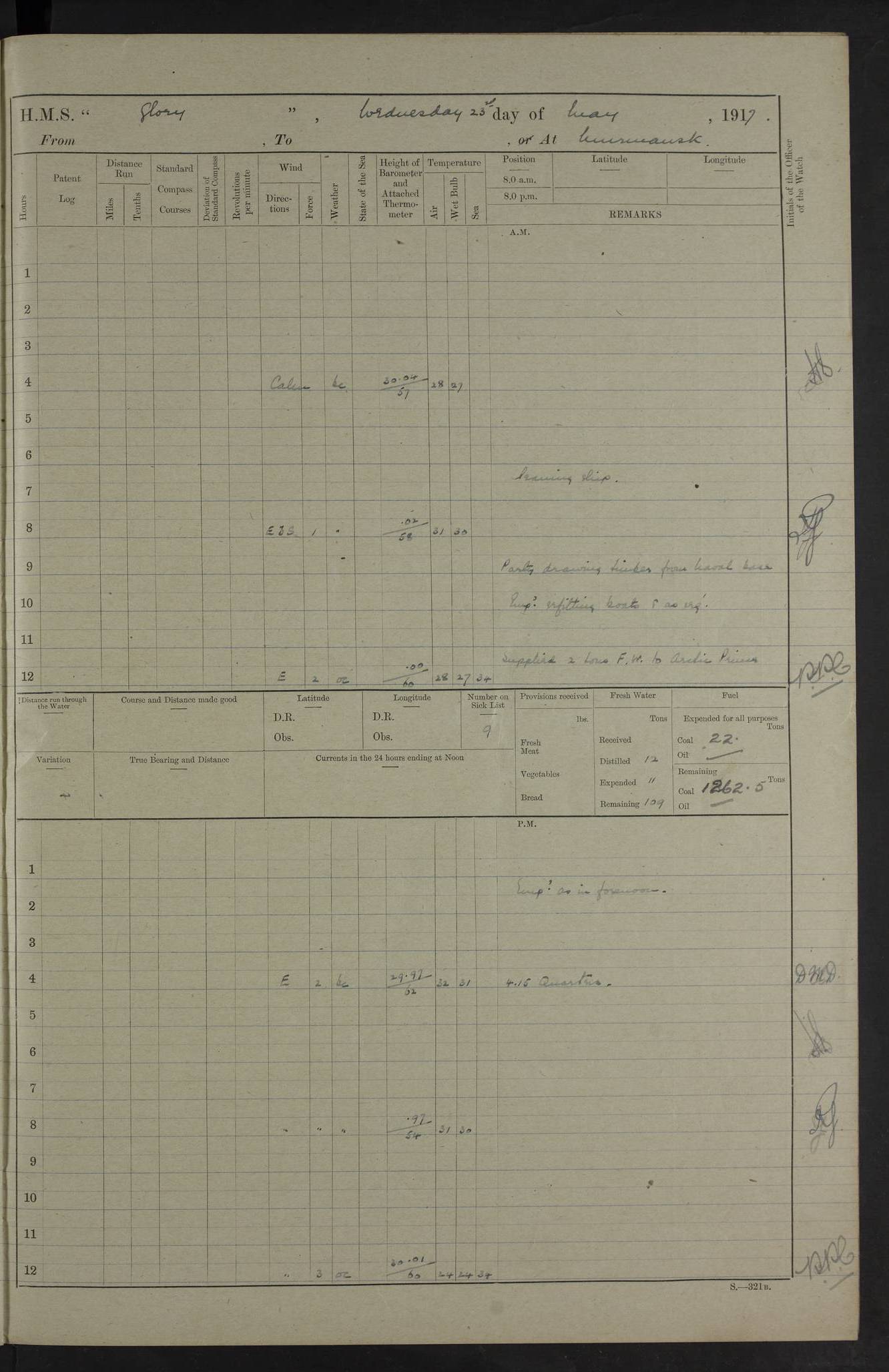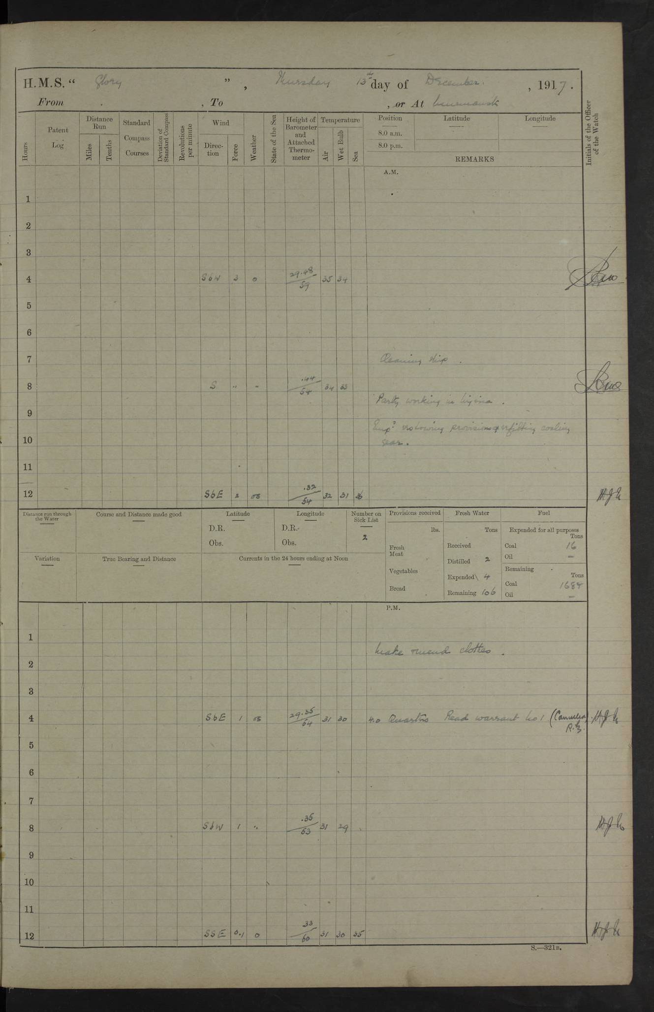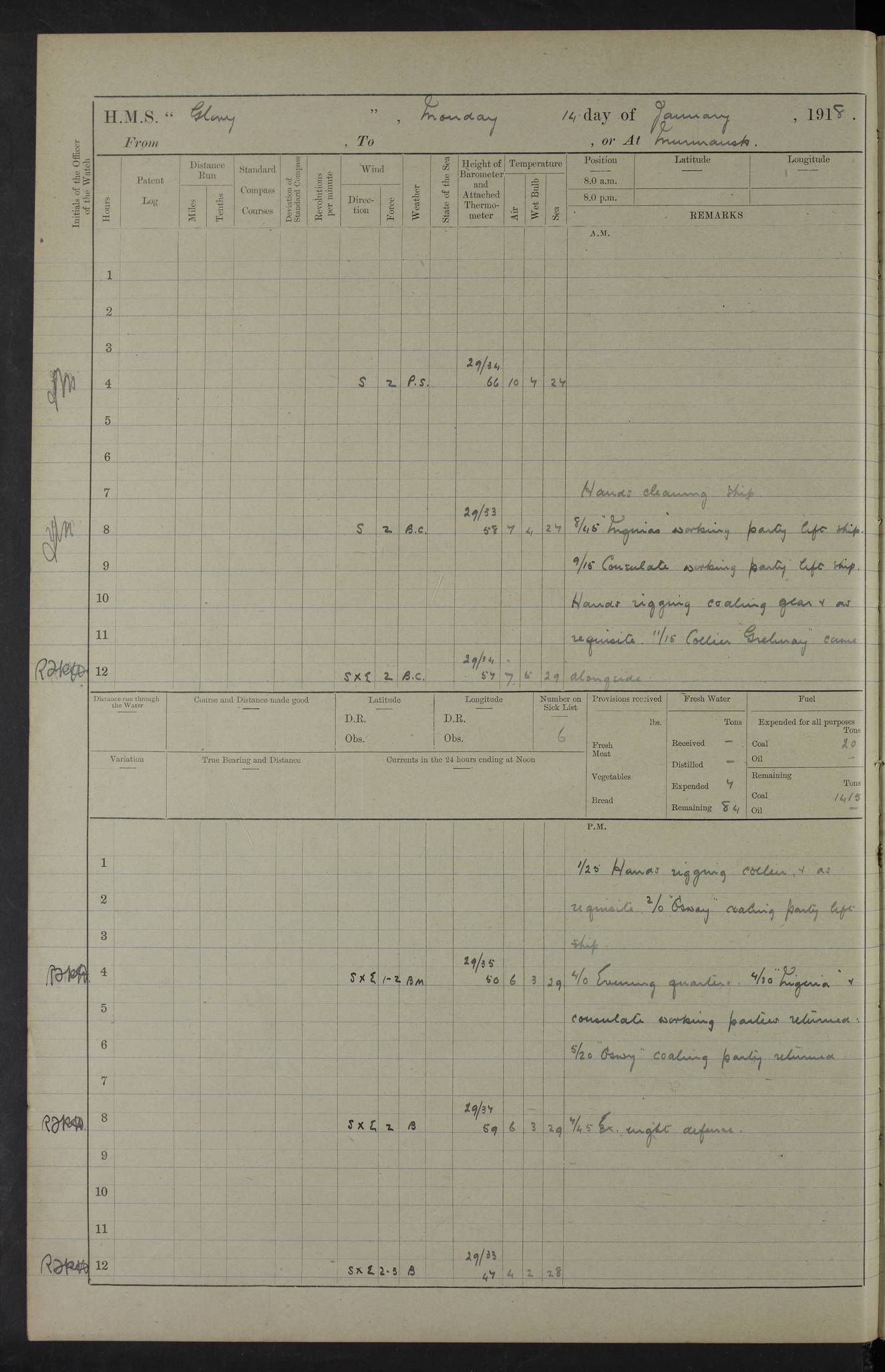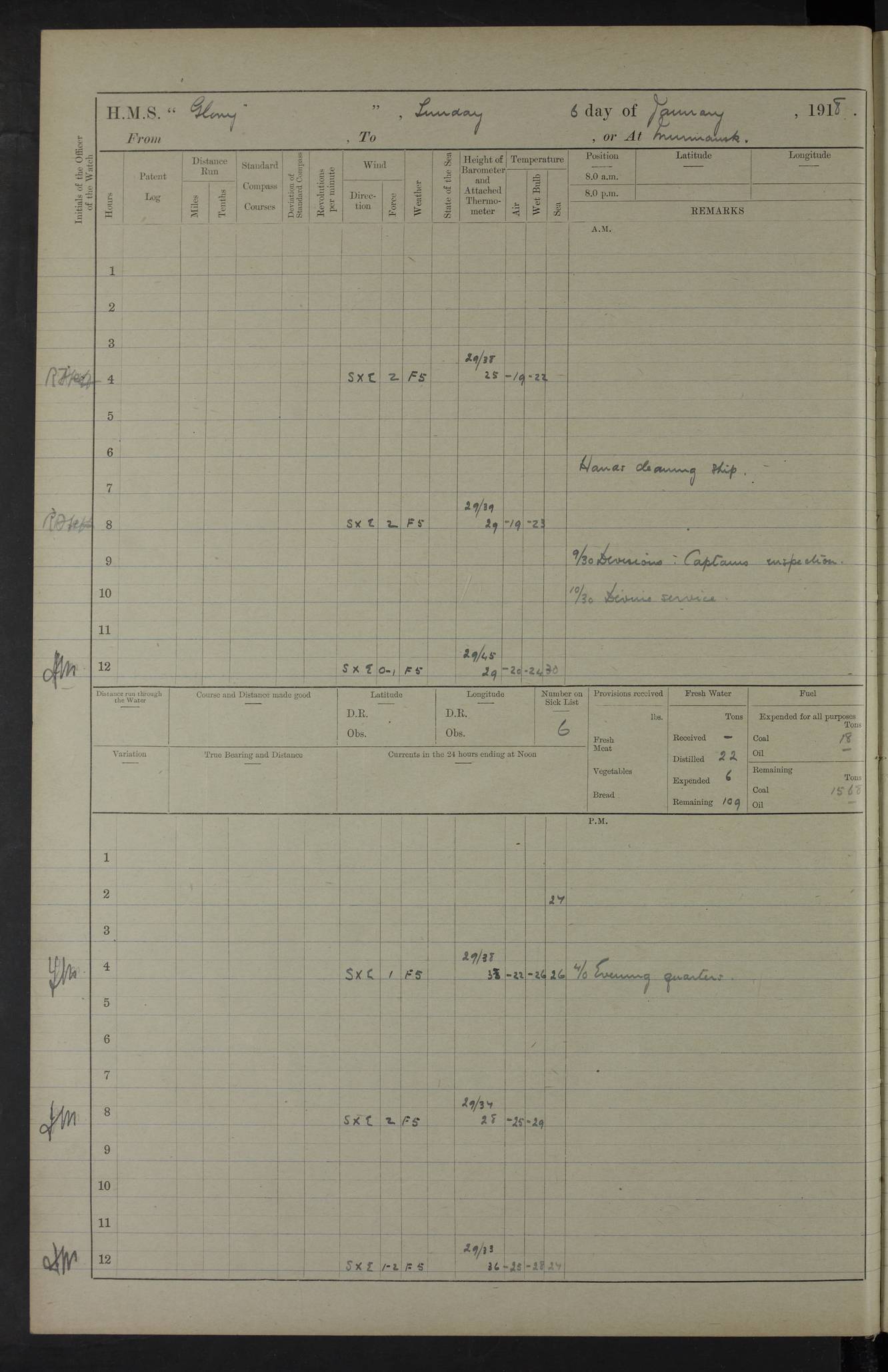 LOGS FOR OCTOBER 1916 For the period covered by the remainder of these logs (1 October, 1916 to 31 December 1918), HMS Glory was based at Murmansk, northern Russia. The city had a variety of names in the early 20th Century – including, Port Murman, Romanov and Murmansk. The location will be given in these pages as Murmansk, the modern name. A history of Murmansk’s names is available at http://en.wikipedia.org/wiki/Murmansk . 4f961482a2fc8e2def0011c7: (http://s3.amazonaws.com/oldweather/ADM53-43026/ADM 53-43026-001_0.jpg) This log is to be kept in a cover in future 4f961482a2fc8e2def0011c8: (http://s3.amazonaws.com/oldweather/ADM53-43026/ADM 53-43026-001_1.jpg) 4f961482a2fc8e2def0011c9: (http://s3.amazonaws.com/oldweather/ADM53-43026/ADM 53-43026-002_0.jpg) 4f961483a2fc8e2def0011ca: (http://s3.amazonaws.com/oldweather/ADM53-43026/ADM 53-43026-002_1.jpg) 4f961483a2fc8e2def0011cb: (http://s3.amazonaws.com/oldweather/ADM53-43026/ADM 53-43026-003_0.jpg) 4f961483a2fc8e2def0011cc: (http://s3.amazonaws.com/oldweather/ADM53-43026/ADM 53-43026-003_1.jpg) 1 October 1916 Murmansk Lat 69.03, Long 33.05 5.40am: Russian auxiliary Kolgiev sailed. Information regarding this vessel (or similar name) has not been found. 7.30am: Celebrated Holy Communion. am: Party working in Earl Essex. Earl Essex was a hired trawler of 225 grt, built, in 1914. Sourced from F.J. Dittmar & J.J. Colledge (1972) – British warships 1914–1919, Ian Allan. 10.45am: Held Divine Service. 11.30am: Celebrated Holy Communion. 4.45pm: Out nets. 4f961484a2fc8e2def0011cd: (http://s3.amazonaws.com/oldweather/ADM53-43026/ADM 53-43026-004_0.jpg) 2 October 1916 Murmansk Lat 69.03, Long 33.05 am: Party working in Earl Essex. 11.30am: Paid quarterly settlement. 6.15pm: Kolgiev arrived. 4f961484a2fc8e2def0011ce: (http://s3.amazonaws.com/oldweather/ADM53-43026/ADM 53-43026-004_1.jpg) 3 October 1916 Murmansk Lat 69.03, Long 33.05 Number on sick list: 9 9.20am: Aft port nets. 11.30am: Russian TBs Goorovoi and Plasteevyi(?) arrived. The first of these TBs is possibly ‘Grosovoi’, built at Le Havre around 1900. Her fate is unclear. The name of the second vessel is possibly incorrect, but no near match has been found. 1.30pm: Out port nets. 4f961484a2fc8e2def0011cf: (http://s3.amazonaws.com/oldweather/ADM53-43026/ADM 53-43026-005_0.jpg) 4 October 1916 Murmansk Lat 69.03, Long 33.05 8.30am: Salvator - broad pendant of Commodore T.W. Kemp arrived. Salvator (ex–Katoomba) was a hired yacht of 684 tons gross, built in 1903. She served as the Heliopolis in WW2. Details at WW1NavyBritishShips-Dittmar4AP.htm . 9.25am: Aft port nets. 11.05am: HE the Minister of Marine visited ship. 11.30am: Out port nets. 11.50am: Russian auxiliary Gotowsci(?) arrived. 12 noon: Kolgiev sailed. pm: HM Tug Blackcock arrived. Blackcock was a hired patrol tug, built in 1886 and wrecked on 18 January, 1918, in the White Sea. Sourced from F.J. Dittmar & J.J. Colledge (1972) – British warships 1914–1919, Ian Allan. 6.50pm: Kolgiev arrived. 4f961485a2fc8e2def0011d0: (http://s3.amazonaws.com/oldweather/ADM53-43026/ADM 53-43026-005_1.jpg) 5 October 1916 Murmansk Lat 69.03, Long 33.05 10.35am: Kolgiev sailed. 1.05pm: Salvator sailed. pm: Read Warrant No. 5. 4f961485a2fc8e2def0011d1: (http://s3.amazonaws.com/oldweather/ADM53-43026/ADM 53-43026-006_0.jpg) 6 October 1916 Murmansk Lat 69.03, Long 33.05 pm: 5 tons of water supplied to Blackcock. 3.30pm: Action. 3.45pm: Secure. Russian T.B's Grosovoi and Plasteevyi sailed. 4f961485a2fc8e2def0011d2: (http://s3.amazonaws.com/oldweather/ADM53-43026/ADM 53-43026-006_1.jpg) 7 October 1916 Murmansk Lat 69.03, Long 33.05 am: Party coaling trawler. am: Tested life buoys – correct. 4f961486a2fc8e2def0011d3: (http://s3.amazonaws.com/oldweather/ADM53-43026/ADM 53-43026-007_0.jpg) 8 October 1916 Murmansk Lat 69.03, Long 33.05 6.45am: Party working in collier. 7.30am: Celebrated Holy Communion. 10.45am: Held Divine service. 5.45pm: Held Divine Service. 4f961486a2fc8e2def0011d4: (http://s3.amazonaws.com/oldweather/ADM53-43026/ADM 53-43026-007_1.jpg) 9 October 1916 Murmansk Lat 69.03, Long 33.05 Number on sick list: 9 am: Exercised fire stations. am: 2nd pinnace patrolling. pm: Landed marines for drill. 4f961486a2fc8e2def0011d5: (http://s3.amazonaws.com/oldweather/ADM53-43026/ADM 53-43026-008_0.jpg) 10 October 1916 Murmansk Lat 69.03, Long 33.05 am: Steam pinnace patrolling. 1.55pm: Kolgiev arrived. 4f961487a2fc8e2def0011d6: (http://s3.amazonaws.com/oldweather/ADM53-43026/ADM 53-43026-008_1.jpg) 11 October 1916 Murmansk Lat 69.03, Long 33.05 am: Party working on boom defence. am: MT and QD men aired bedding. am: Marines at drill. 1.50pm: Kolgiev sailed. 3.15pm: British tug Racia (lighter ES 23 in tow) arrived. Racia was a hired screw tug of 410 grt, built in 1894 and sold on 23 June, 1920. Sourced from F.J. Dittmar & J.J. Colledge (1972) – British warships 1914–1919, Ian Allan. 4f961487a2fc8e2def0011d7: (http://s3.amazonaws.com/oldweather/ADM53-43026/ADM 53-43026-009_0.jpg) 12 October 1916 Murmansk Lat 69.03, Long 33.05 Number on sick list: 6 am: Party working on boom defence. am: Steam pinnace patrolling. pm: Make and mend clothes. 4.15pm: Read warrant No. 6. 6.00pm: Imperator Nicolas arrived. A vessel with this name has not been traced. 4f961487a2fc8e2def0011d8: (http://s3.amazonaws.com/oldweathe/ADM53-43026/ADM 53-43026-009_1.jpg) 13 October 1916 Murmansk Lat 69.03, Long 33.05 am: Steam pinnace patrolling. am: Party working on boom defence. am: Found foc’sle awning and side screens damaged by rats. 4f961488a2fc8e2def0011d9: (http://s3.amazonaws.com/oldweather/ADM53-43026/ADM 53-43026-010_0.jpg) 14 August 1916 (probably should read October) Murmansk Lat 69.03, Long 33.05 Number on sick list: 7 6.45am: Racia (floating crane in tow) sailed. am: Party working on boom defence. am: Tested life buoys – correct. 3.00pm: Vindictive arrived. HMS Vindictive was a protected cruiser of the Arrogant class, launched in 1897 at Chatham Dockyar