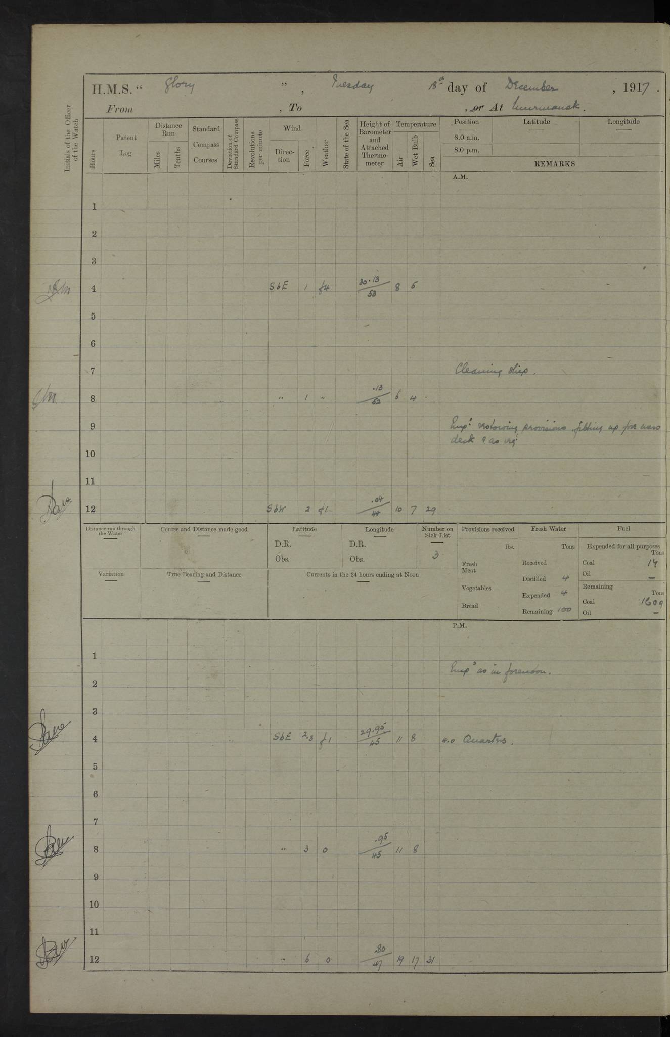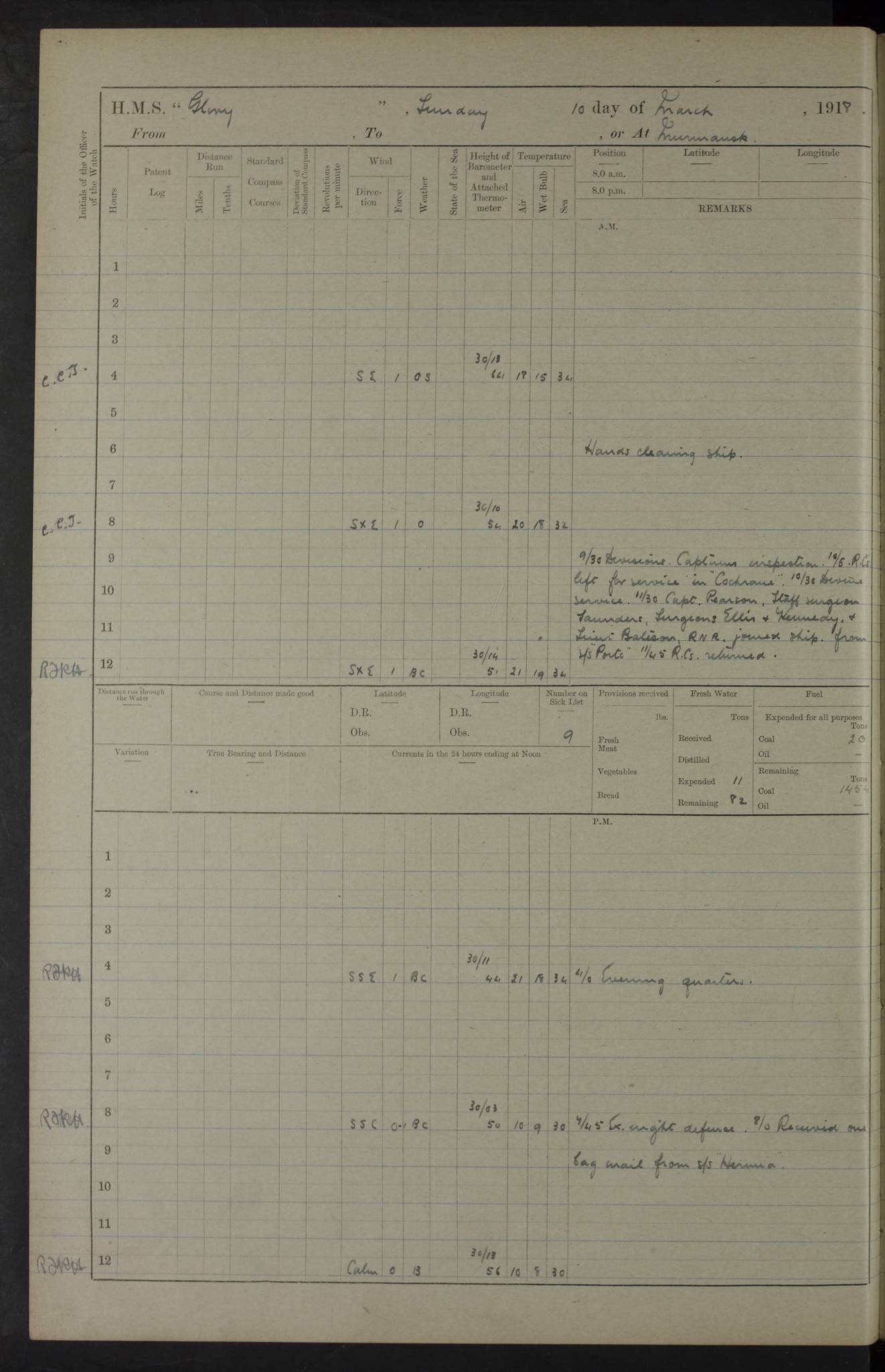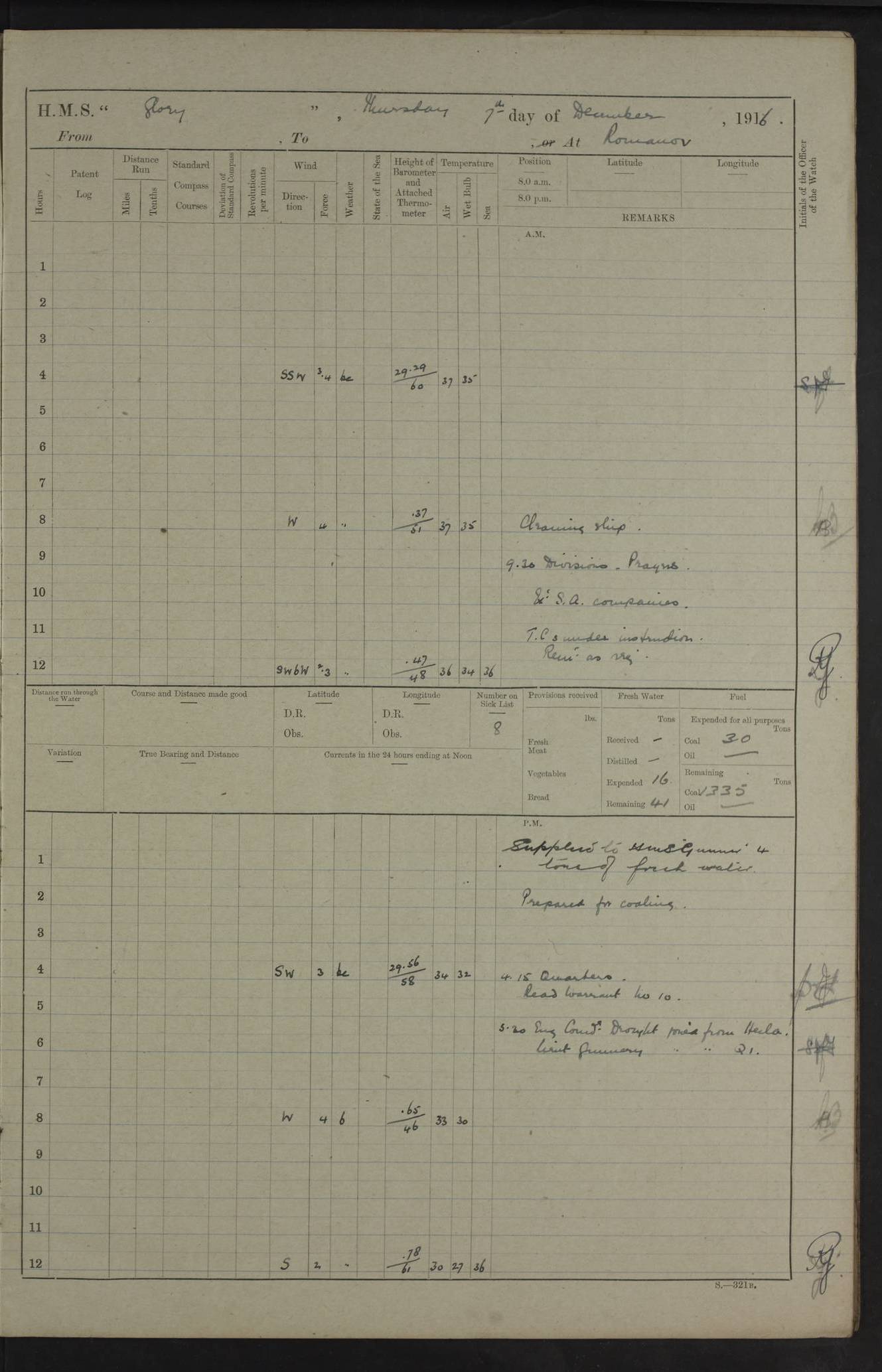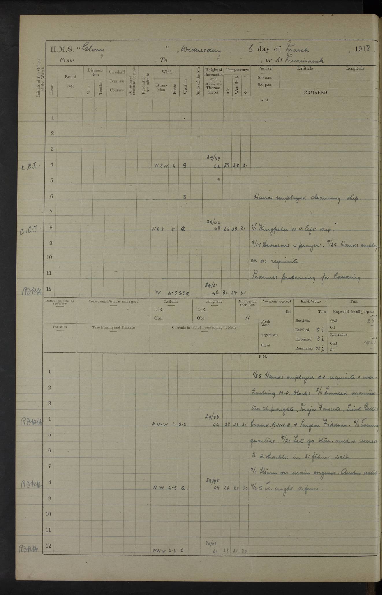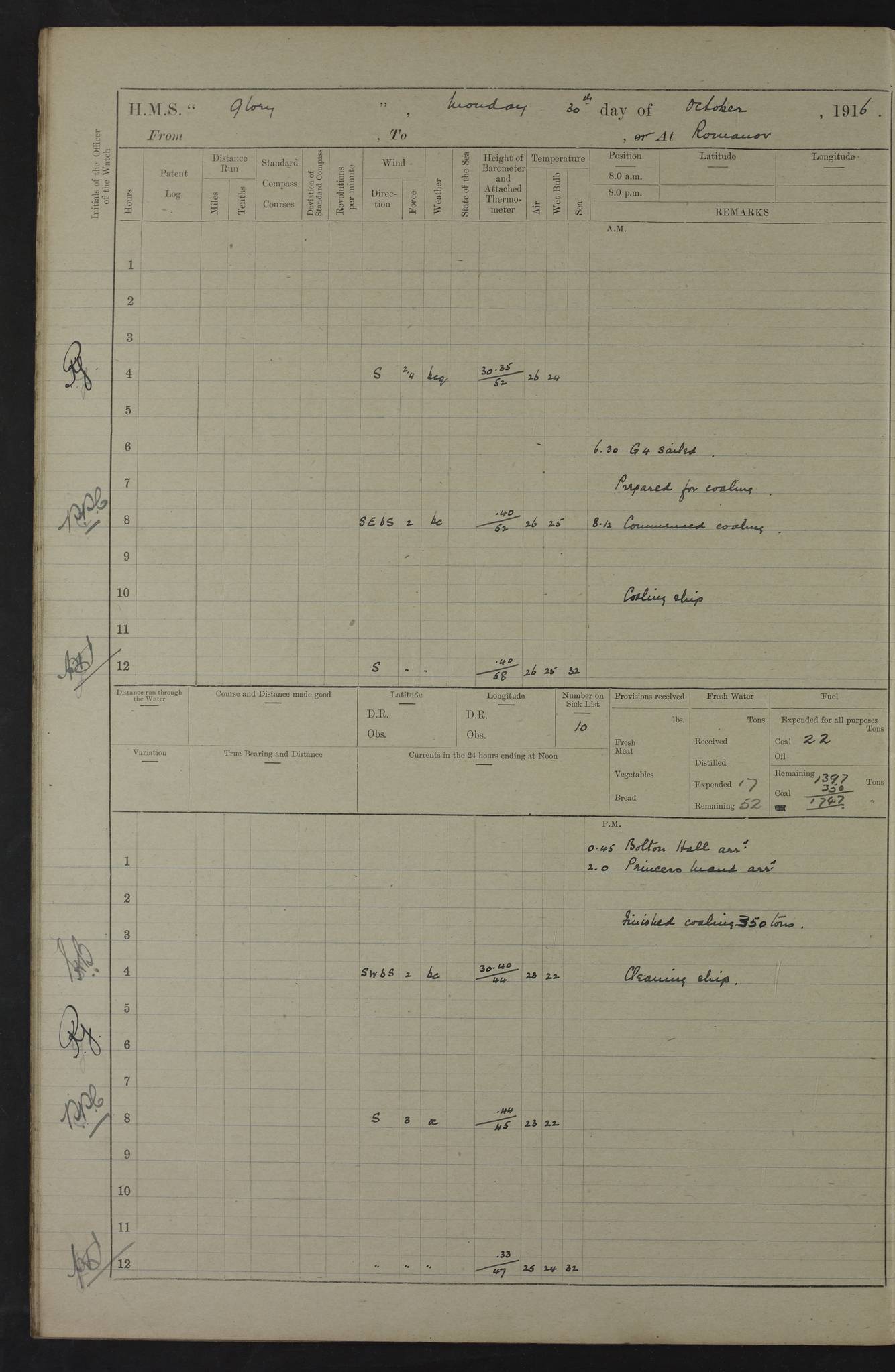 LOGS FOR OCTOBER 1916 For the period covered by the remainder of these logs (1 October, 1916 to 31 December 1918), HMS Glory was based at Murmansk, northern Russia. The city had a variety of names in the early 20th Century – including, Port Murman, Romanov and Murmansk. The location will be given in these pages as Murmansk, the modern name. A history of Murmansk’s names is available at http://en.wikipedia.org/wiki/Murmansk . 4f961482a2fc8e2def0011c7: (http://s3.amazonaws.com/oldweather/ADM53-43026/ADM 53-43026-001_0.jpg) This log is to be kept in a cover in future 4f961482a2fc8e2def0011c8: (http://s3.amazonaws.com/oldweather/ADM53-43026/ADM 53-43026-001_1.jpg) 4f961482a2fc8e2def0011c9: (http://s3.amazonaws.com/oldweather/ADM53-43026/ADM 53-43026-002_0.jpg) 4f961483a2fc8e2def0011ca: (http://s3.amazonaws.com/oldweather/ADM53-43026/ADM 53-43026-002_1.jpg) 4f961483a2fc8e2def0011cb: (http://s3.amazonaws.com/oldweather/ADM53-43026/ADM 53-43026-003_0.jpg) 4f961483a2fc8e2def0011cc: (http://s3.amazonaws.com/oldweather/ADM53-43026/ADM 53-43026-003_1.jpg) 1 October 1916 Murmansk Lat 69.03, Long 33.05 5.40am: Russian auxiliary Kolgiev sailed. Information regarding this vessel (or similar name) has not been found. 7.30am: Celebrated Holy Communion. am: Party working in Earl Essex. Earl Essex was a hired trawler of 225 grt, built, in 1914. Sourced from F.J. Dittmar & J.J. Colledge (1972) – British warships 1914–1919, Ian Allan. 10.45am: Held Divine Service. 11.30am: Celebrated Holy Communion. 4.45pm: Out nets. 4f961484a2fc8e2def0011cd: (http://s3.amazonaws.com/oldweather/ADM53-43026/ADM 53-43026-004_0.jpg) 2 October 1916 Murmansk Lat 69.03, Long 33.05 am: Party working in Earl Essex. 11.30am: Paid quarterly settlement. 6.15pm: Kolgiev arrived. 4f961484a2fc8e2def0011ce: (http://s3.amazonaws.com/oldweather/ADM53-43026/ADM 53-43026-004_1.jpg) 3 October 1916 Murmansk Lat 69.03, Long 33.05 Number on sick list: 9 9.20am: Aft port nets. 11.30am: Russian TBs Goorovoi and Plasteevyi(?) arrived. The first of these TBs is possibly ‘Grosovoi’, built at Le Havre around 1900. Her fate is unclear. The name of the second vessel is possibly incorrect, but no near match has been found. 1.30pm: Out port nets. 4f961484a2fc8e2def0011cf: (http://s3.amazonaws.com/oldweather/ADM53-43026/ADM 53-43026-005_0.jpg) 4 October 1916 Murmansk Lat 69.03, Long 33.05 8.30am: Salvator - broad pendant of Commodore T.W. Kemp arrived. Salvator (ex–Katoomba) was a hired yacht of 684 tons gross, built in 1903. She served as the Heliopolis in WW2. Details at WW1NavyBritishShips-Dittmar4AP.htm . 9.25am: Aft port nets. 11.05am: HE the Minister of Marine visited ship. 11.30am: Out port nets. 11.50am: Russian auxiliary Gotowsci(?) arrived. 12 noon: Kolgiev sailed. pm: HM Tug Blackcock arrived. Blackcock was a hired patrol tug, built in 1886 and wrecked on 18 January, 1918, in the White Sea. Sourced from F.J. Dittmar & J.J. Colledge (1972) – British warships 1914–1919, Ian Allan. 6.50pm: Kolgiev arrived. 4f961485a2fc8e2def0011d0: (http://s3.amazonaws.com/oldweather/ADM53-43026/ADM 53-43026-005_1.jpg) 5 October 1916 Murmansk Lat 69.03, Long 33.05 10.35am: Kolgiev sailed. 1.05pm: Salvator sailed. pm: Read Warrant No. 5. 4f961485a2fc8e2def0011d1: (http://s3.amazonaws.com/oldweather/ADM53-43026/ADM 53-43026-006_0.jpg) 6 October 1916 Murmansk Lat 69.03, Long 33.05 pm: 5 tons of water supplied to Blackcock. 3.30pm: Action. 3.45pm: Secure. Russian T.B's Grosovoi and Plasteevyi sailed. 4f961485a2fc8e2def0011d2: (http://s3.amazonaws.com/oldweather/ADM53-43026/ADM 53-43026-006_1.jpg) 7 October 1916 Murmansk Lat 69.03, Long 33.05 am: Party coaling trawler. am: Tested life buoys – correct. 4f961486a2fc8e2def0011d3: (http://s3.amazonaws.com/oldweather/ADM53-43026/ADM 53-43026-007_0.jpg) 8 October 1916 Murmansk Lat 69.03, Long 33.05 6.45am: Party working in collier. 7.30am: Celebrated Holy Communion. 10.45am: Held Divine service. 5.45pm: Held Divine Service. 4f961486a2fc8e2def0011d4: (http://s3.amazonaws.com/oldweather/ADM53-43026/ADM 53-43026-007_1.jpg) 9 October 1916 Murmansk Lat 69.03, Long 33.05 Number on sick list: 9 am: Exercised fire stations. am: 2nd pinnace patrolling. pm: Landed marines for drill. 4f961486a2fc8e2def0011d5: (http://s3.amazonaws.com/oldweather/ADM53-43026/ADM 53-43026-008_0.jpg) 10 October 1916 Murmansk Lat 69.03, Long 33.05 am: Steam pinnace patrolling. 1.55pm: Kolgiev arrived. 4f961487a2fc8e2def0011d6: (http://s3.amazonaws.com/oldweather/ADM53-43026/ADM 53-43026-008_1.jpg) 11 October 1916 Murmansk Lat 69.03, Long 33.05 am: Party working on boom defence. am: MT and QD men aired bedding. am: Marines at drill. 1.50pm: Kolgiev sailed. 3.15pm: British tug Racia (lighter ES 23 in tow) arrived. Racia was a hired screw tug of 410 grt, built in 1894 and sold on 23 June, 1920. Sourced from F.J. Dittmar & J.J. Colledge (1972) – British warships 1914–1919, Ian Allan. 4f961487a2fc8e2def0011d7: (http://s3.amazonaws.com/oldweather/ADM53-43026/ADM 53-43026-009_0.jpg) 12 October 1916 Murmansk Lat 69.03, Long 33.05 Number on sick list: 6 am: Party working on boom defence. am: Steam pinnace patrolling. pm: Make and mend clothes. 4.15pm: Read warrant No. 6. 6.00pm: Imperator Nicolas arrived. A vessel with this name has not been traced. 4f961487a2fc8e2def0011d8: (http://s3.amazonaws.com/oldweathe/ADM53-43026/ADM 53-43026-009_1.jpg) 13 October 1916 Murmansk Lat 69.03, Long 33.05 am: Steam pinnace patrolling. am: Party working on boom defence. am: Found foc’sle awning and side screens damaged by rats. 4f961488a2fc8e2def0011d9: (http://s3.amazonaws.com/oldweather/ADM53-43026/ADM 53-43026-010_0.jpg) 14 August 1916 (probably should read October) Murmansk Lat 69.03, Long 33.05 Number on sick list: 7 6.45am: Racia (floating crane in tow) sailed. am: Party working on boom defence. am: Tested life buoys – correct. 3.00pm: Vindictive arrived. HMS Vindictive was a protected cruiser of the Arrogant class, launched in 1897 at Chatham Dockyar