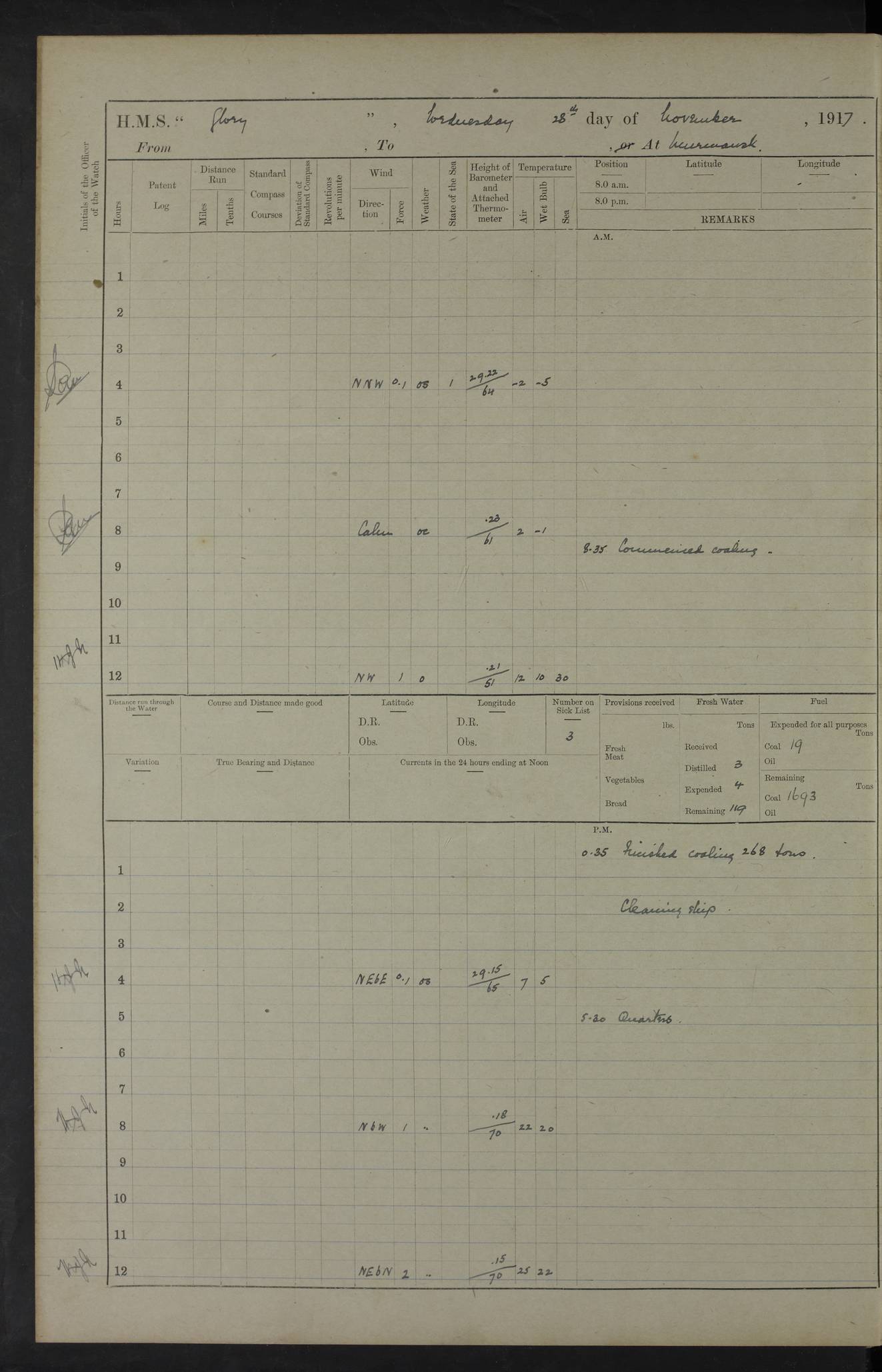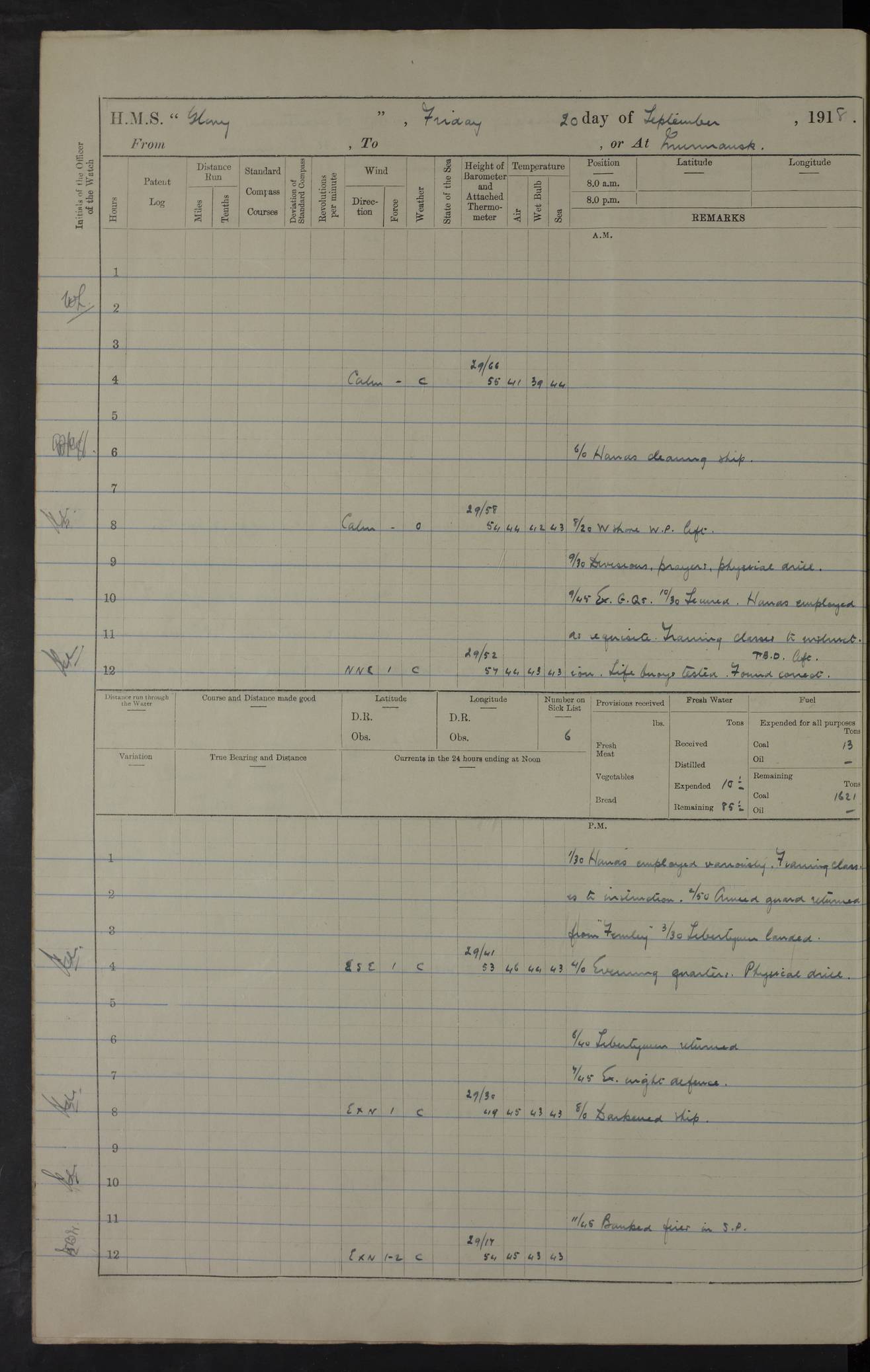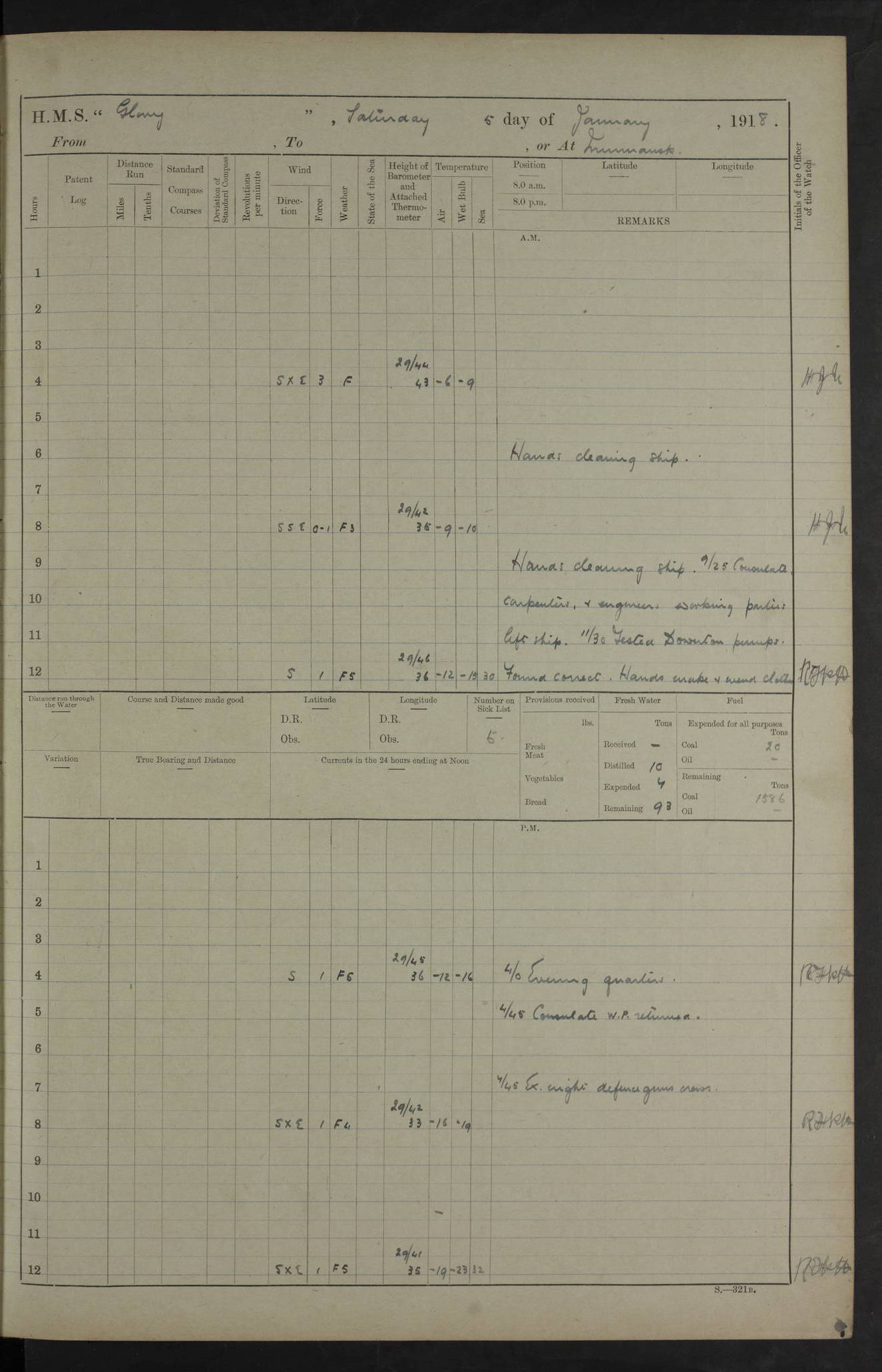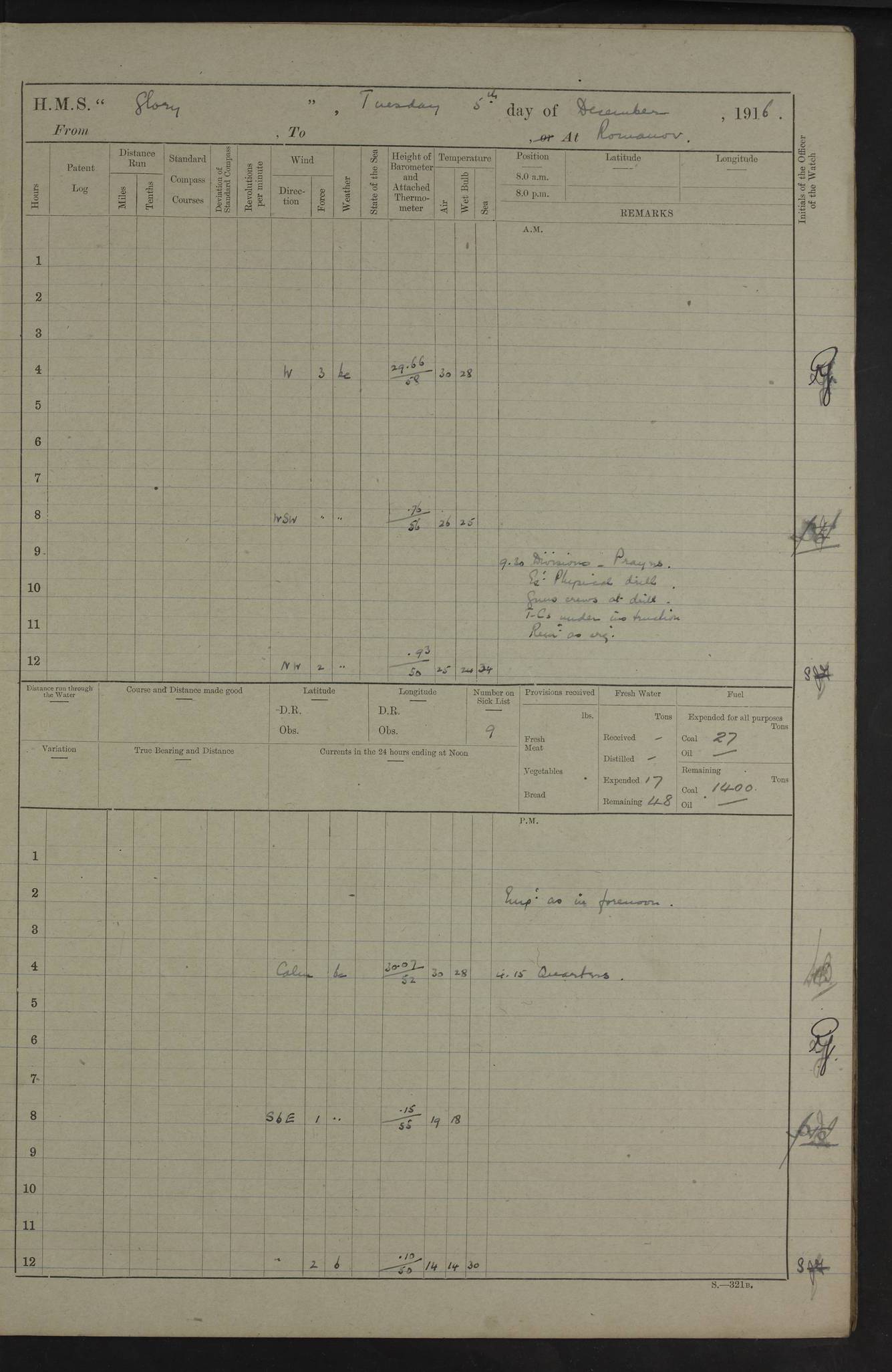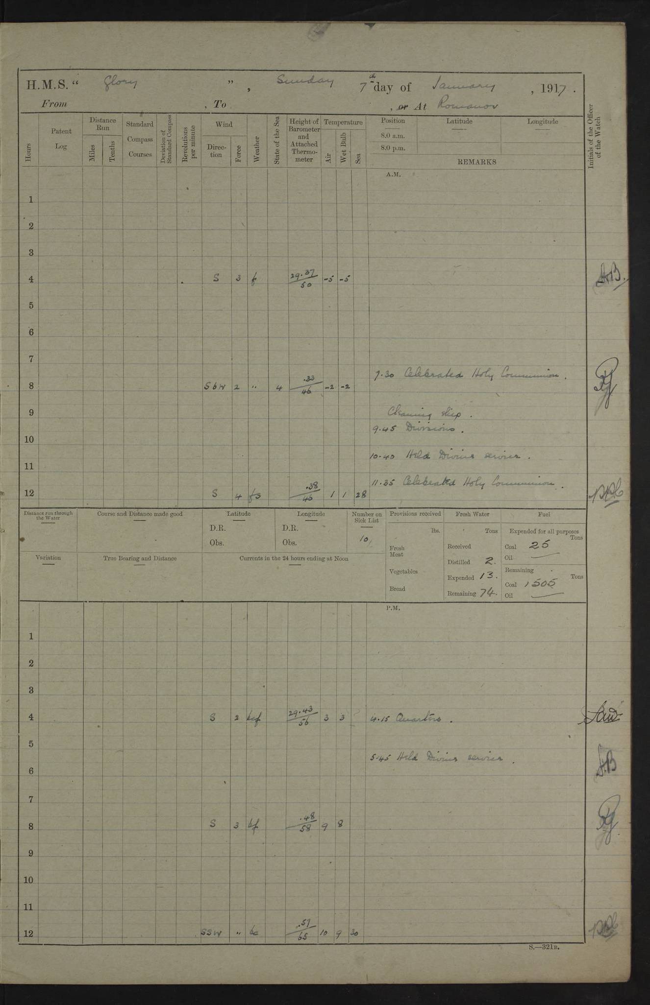 LOGS FOR OCTOBER 1916 For the period covered by the remainder of these logs (1 October, 1916 to 31 December 1918), HMS Glory was based at Murmansk, northern Russia. The city had a variety of names in the early 20th Century – including, Port Murman, Romanov and Murmansk. The location will be given in these pages as Murmansk, the modern name. A history of Murmansk’s names is available at http://en.wikipedia.org/wiki/Murmansk . 4f961482a2fc8e2def0011c7: (http://s3.amazonaws.com/oldweather/ADM53-43026/ADM 53-43026-001_0.jpg) This log is to be kept in a cover in future 4f961482a2fc8e2def0011c8: (http://s3.amazonaws.com/oldweather/ADM53-43026/ADM 53-43026-001_1.jpg) 4f961482a2fc8e2def0011c9: (http://s3.amazonaws.com/oldweather/ADM53-43026/ADM 53-43026-002_0.jpg) 4f961483a2fc8e2def0011ca: (http://s3.amazonaws.com/oldweather/ADM53-43026/ADM 53-43026-002_1.jpg) 4f961483a2fc8e2def0011cb: (http://s3.amazonaws.com/oldweather/ADM53-43026/ADM 53-43026-003_0.jpg) 4f961483a2fc8e2def0011cc: (http://s3.amazonaws.com/oldweather/ADM53-43026/ADM 53-43026-003_1.jpg) 1 October 1916 Murmansk Lat 69.03, Long 33.05 5.40am: Russian auxiliary Kolgiev sailed. Information regarding this vessel (or similar name) has not been found. 7.30am: Celebrated Holy Communion. am: Party working in Earl Essex. Earl Essex was a hired trawler of 225 grt, built, in 1914. Sourced from F.J. Dittmar & J.J. Colledge (1972) – British warships 1914–1919, Ian Allan. 10.45am: Held Divine Service. 11.30am: Celebrated Holy Communion. 4.45pm: Out nets. 4f961484a2fc8e2def0011cd: (http://s3.amazonaws.com/oldweather/ADM53-43026/ADM 53-43026-004_0.jpg) 2 October 1916 Murmansk Lat 69.03, Long 33.05 am: Party working in Earl Essex. 11.30am: Paid quarterly settlement. 6.15pm: Kolgiev arrived. 4f961484a2fc8e2def0011ce: (http://s3.amazonaws.com/oldweather/ADM53-43026/ADM 53-43026-004_1.jpg) 3 October 1916 Murmansk Lat 69.03, Long 33.05 Number on sick list: 9 9.20am: Aft port nets. 11.30am: Russian TBs Goorovoi and Plasteevyi(?) arrived. The first of these TBs is possibly ‘Grosovoi’, built at Le Havre around 1900. Her fate is unclear. The name of the second vessel is possibly incorrect, but no near match has been found. 1.30pm: Out port nets. 4f961484a2fc8e2def0011cf: (http://s3.amazonaws.com/oldweather/ADM53-43026/ADM 53-43026-005_0.jpg) 4 October 1916 Murmansk Lat 69.03, Long 33.05 8.30am: Salvator - broad pendant of Commodore T.W. Kemp arrived. Salvator (ex–Katoomba) was a hired yacht of 684 tons gross, built in 1903. She served as the Heliopolis in WW2. Details at WW1NavyBritishShips-Dittmar4AP.htm . 9.25am: Aft port nets. 11.05am: HE the Minister of Marine visited ship. 11.30am: Out port nets. 11.50am: Russian auxiliary Gotowsci(?) arrived. 12 noon: Kolgiev sailed. pm: HM Tug Blackcock arrived. Blackcock was a hired patrol tug, built in 1886 and wrecked on 18 January, 1918, in the White Sea. Sourced from F.J. Dittmar & J.J. Colledge (1972) – British warships 1914–1919, Ian Allan. 6.50pm: Kolgiev arrived. 4f961485a2fc8e2def0011d0: (http://s3.amazonaws.com/oldweather/ADM53-43026/ADM 53-43026-005_1.jpg) 5 October 1916 Murmansk Lat 69.03, Long 33.05 10.35am: Kolgiev sailed. 1.05pm: Salvator sailed. pm: Read Warrant No. 5. 4f961485a2fc8e2def0011d1: (http://s3.amazonaws.com/oldweather/ADM53-43026/ADM 53-43026-006_0.jpg) 6 October 1916 Murmansk Lat 69.03, Long 33.05 pm: 5 tons of water supplied to Blackcock. 3.30pm: Action. 3.45pm: Secure. Russian T.B's Grosovoi and Plasteevyi sailed. 4f961485a2fc8e2def0011d2: (http://s3.amazonaws.com/oldweather/ADM53-43026/ADM 53-43026-006_1.jpg) 7 October 1916 Murmansk Lat 69.03, Long 33.05 am: Party coaling trawler. am: Tested life buoys – correct. 4f961486a2fc8e2def0011d3: (http://s3.amazonaws.com/oldweather/ADM53-43026/ADM 53-43026-007_0.jpg) 8 October 1916 Murmansk Lat 69.03, Long 33.05 6.45am: Party working in collier. 7.30am: Celebrated Holy Communion. 10.45am: Held Divine service. 5.45pm: Held Divine Service. 4f961486a2fc8e2def0011d4: (http://s3.amazonaws.com/oldweather/ADM53-43026/ADM 53-43026-007_1.jpg) 9 October 1916 Murmansk Lat 69.03, Long 33.05 Number on sick list: 9 am: Exercised fire stations. am: 2nd pinnace patrolling. pm: Landed marines for drill. 4f961486a2fc8e2def0011d5: (http://s3.amazonaws.com/oldweather/ADM53-43026/ADM 53-43026-008_0.jpg) 10 October 1916 Murmansk Lat 69.03, Long 33.05 am: Steam pinnace patrolling. 1.55pm: Kolgiev arrived. 4f961487a2fc8e2def0011d6: (http://s3.amazonaws.com/oldweather/ADM53-43026/ADM 53-43026-008_1.jpg) 11 October 1916 Murmansk Lat 69.03, Long 33.05 am: Party working on boom defence. am: MT and QD men aired bedding. am: Marines at drill. 1.50pm: Kolgiev sailed. 3.15pm: British tug Racia (lighter ES 23 in tow) arrived. Racia was a hired screw tug of 410 grt, built in 1894 and sold on 23 June, 1920. Sourced from F.J. Dittmar & J.J. Colledge (1972) – British warships 1914–1919, Ian Allan. 4f961487a2fc8e2def0011d7: (http://s3.amazonaws.com/oldweather/ADM53-43026/ADM 53-43026-009_0.jpg) 12 October 1916 Murmansk Lat 69.03, Long 33.05 Number on sick list: 6 am: Party working on boom defence. am: Steam pinnace patrolling. pm: Make and mend clothes. 4.15pm: Read warrant No. 6. 6.00pm: Imperator Nicolas arrived. A vessel with this name has not been traced. 4f961487a2fc8e2def0011d8: (http://s3.amazonaws.com/oldweathe/ADM53-43026/ADM 53-43026-009_1.jpg) 13 October 1916 Murmansk Lat 69.03, Long 33.05 am: Steam pinnace patrolling. am: Party working on boom defence. am: Found foc’sle awning and side screens damaged by rats. 4f961488a2fc8e2def0011d9: (http://s3.amazonaws.com/oldweather/ADM53-43026/ADM 53-43026-010_0.jpg) 14 August 1916 (probably should read October) Murmansk Lat 69.03, Long 33.05 Number on sick list: 7 6.45am: Racia (floating crane in tow) sailed. am: Party working on boom defence. am: Tested life buoys – correct. 3.00pm: Vindictive arrived. HMS Vindictive was a protected cruiser of the Arrogant class, launched in 1897 at Chatham Dockyar