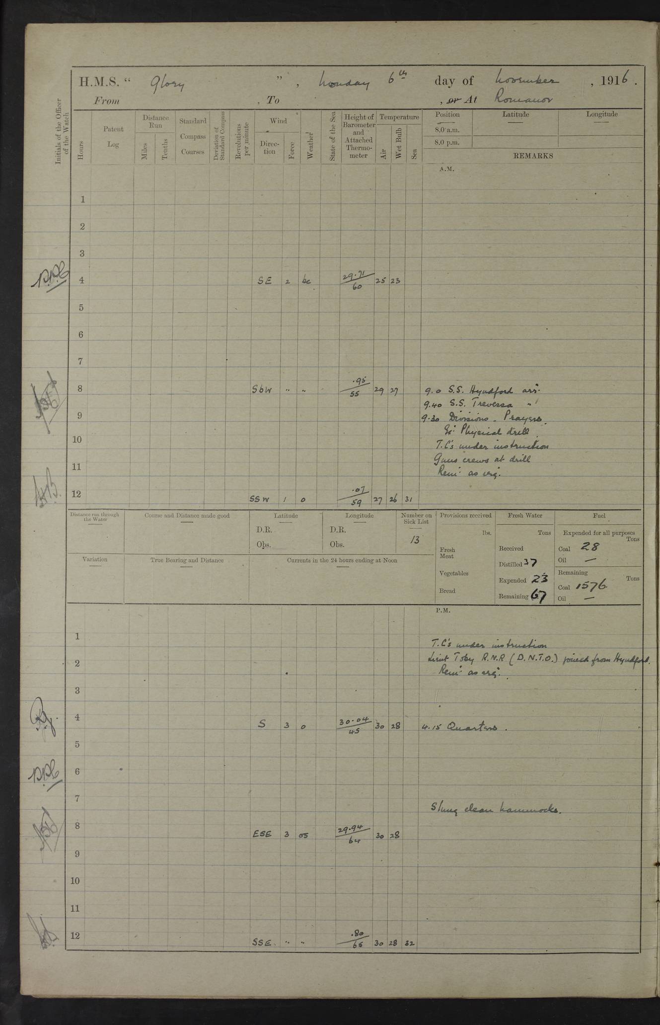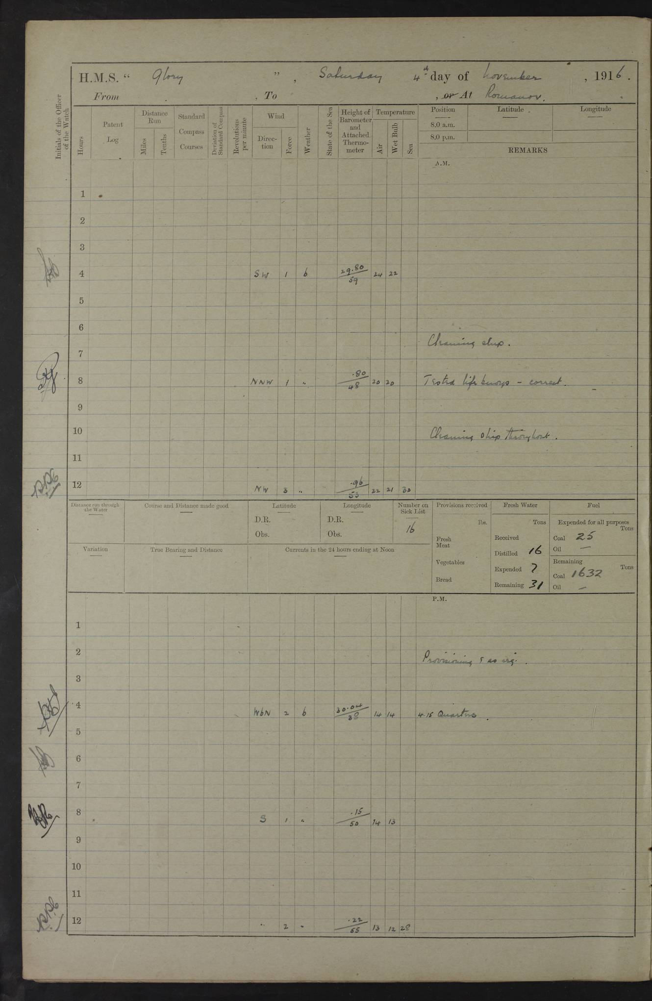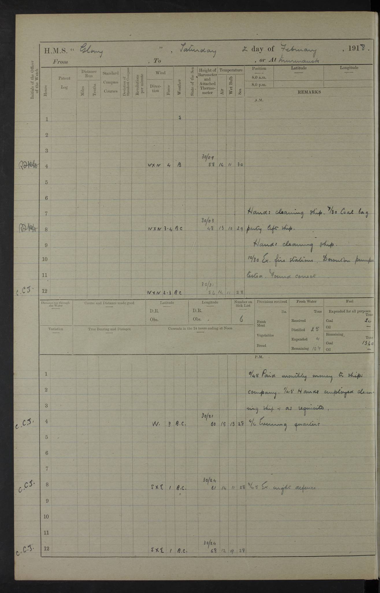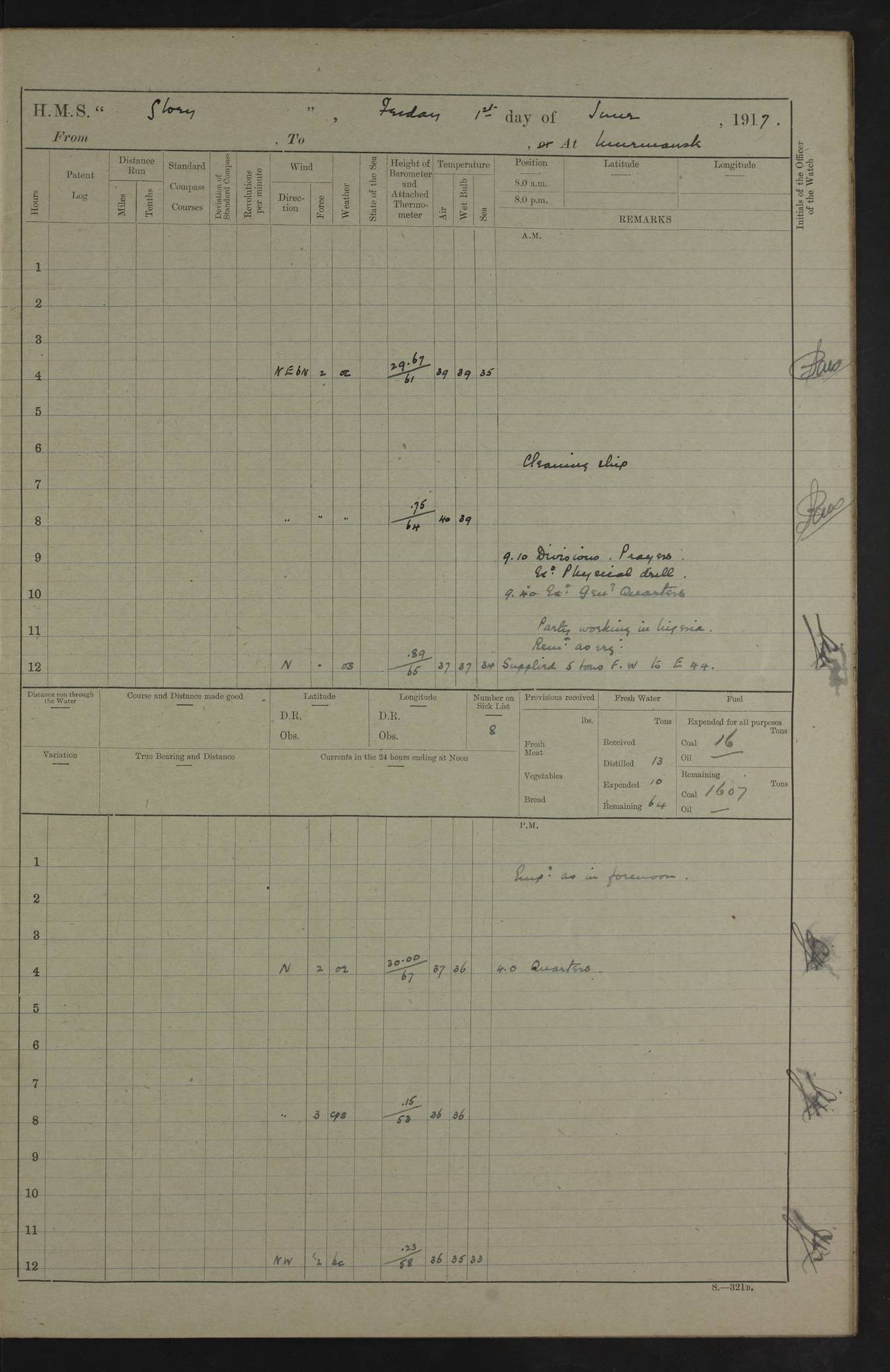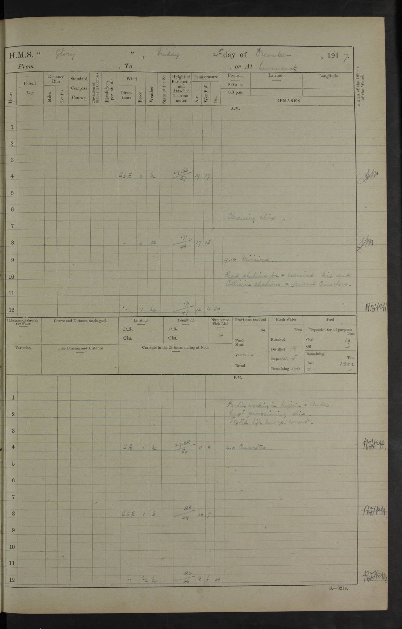 LOGS FOR OCTOBER 1916 For the period covered by the remainder of these logs (1 October, 1916 to 31 December 1918), HMS Glory was based at Murmansk, northern Russia. The city had a variety of names in the early 20th Century – including, Port Murman, Romanov and Murmansk. The location will be given in these pages as Murmansk, the modern name. A history of Murmansk’s names is available at http://en.wikipedia.org/wiki/Murmansk . 4f961482a2fc8e2def0011c7: (http://s3.amazonaws.com/oldweather/ADM53-43026/ADM 53-43026-001_0.jpg) This log is to be kept in a cover in future 4f961482a2fc8e2def0011c8: (http://s3.amazonaws.com/oldweather/ADM53-43026/ADM 53-43026-001_1.jpg) 4f961482a2fc8e2def0011c9: (http://s3.amazonaws.com/oldweather/ADM53-43026/ADM 53-43026-002_0.jpg) 4f961483a2fc8e2def0011ca: (http://s3.amazonaws.com/oldweather/ADM53-43026/ADM 53-43026-002_1.jpg) 4f961483a2fc8e2def0011cb: (http://s3.amazonaws.com/oldweather/ADM53-43026/ADM 53-43026-003_0.jpg) 4f961483a2fc8e2def0011cc: (http://s3.amazonaws.com/oldweather/ADM53-43026/ADM 53-43026-003_1.jpg) 1 October 1916 Murmansk Lat 69.03, Long 33.05 5.40am: Russian auxiliary Kolgiev sailed. Information regarding this vessel (or similar name) has not been found. 7.30am: Celebrated Holy Communion. am: Party working in Earl Essex. Earl Essex was a hired trawler of 225 grt, built, in 1914. Sourced from F.J. Dittmar & J.J. Colledge (1972) – British warships 1914–1919, Ian Allan. 10.45am: Held Divine Service. 11.30am: Celebrated Holy Communion. 4.45pm: Out nets. 4f961484a2fc8e2def0011cd: (http://s3.amazonaws.com/oldweather/ADM53-43026/ADM 53-43026-004_0.jpg) 2 October 1916 Murmansk Lat 69.03, Long 33.05 am: Party working in Earl Essex. 11.30am: Paid quarterly settlement. 6.15pm: Kolgiev arrived. 4f961484a2fc8e2def0011ce: (http://s3.amazonaws.com/oldweather/ADM53-43026/ADM 53-43026-004_1.jpg) 3 October 1916 Murmansk Lat 69.03, Long 33.05 Number on sick list: 9 9.20am: Aft port nets. 11.30am: Russian TBs Goorovoi and Plasteevyi(?) arrived. The first of these TBs is possibly ‘Grosovoi’, built at Le Havre around 1900. Her fate is unclear. The name of the second vessel is possibly incorrect, but no near match has been found. 1.30pm: Out port nets. 4f961484a2fc8e2def0011cf: (http://s3.amazonaws.com/oldweather/ADM53-43026/ADM 53-43026-005_0.jpg) 4 October 1916 Murmansk Lat 69.03, Long 33.05 8.30am: Salvator - broad pendant of Commodore T.W. Kemp arrived. Salvator (ex–Katoomba) was a hired yacht of 684 tons gross, built in 1903. She served as the Heliopolis in WW2. Details at WW1NavyBritishShips-Dittmar4AP.htm . 9.25am: Aft port nets. 11.05am: HE the Minister of Marine visited ship. 11.30am: Out port nets. 11.50am: Russian auxiliary Gotowsci(?) arrived. 12 noon: Kolgiev sailed. pm: HM Tug Blackcock arrived. Blackcock was a hired patrol tug, built in 1886 and wrecked on 18 January, 1918, in the White Sea. Sourced from F.J. Dittmar & J.J. Colledge (1972) – British warships 1914–1919, Ian Allan. 6.50pm: Kolgiev arrived. 4f961485a2fc8e2def0011d0: (http://s3.amazonaws.com/oldweather/ADM53-43026/ADM 53-43026-005_1.jpg) 5 October 1916 Murmansk Lat 69.03, Long 33.05 10.35am: Kolgiev sailed. 1.05pm: Salvator sailed. pm: Read Warrant No. 5. 4f961485a2fc8e2def0011d1: (http://s3.amazonaws.com/oldweather/ADM53-43026/ADM 53-43026-006_0.jpg) 6 October 1916 Murmansk Lat 69.03, Long 33.05 pm: 5 tons of water supplied to Blackcock. 3.30pm: Action. 3.45pm: Secure. Russian T.B's Grosovoi and Plasteevyi sailed. 4f961485a2fc8e2def0011d2: (http://s3.amazonaws.com/oldweather/ADM53-43026/ADM 53-43026-006_1.jpg) 7 October 1916 Murmansk Lat 69.03, Long 33.05 am: Party coaling trawler. am: Tested life buoys – correct. 4f961486a2fc8e2def0011d3: (http://s3.amazonaws.com/oldweather/ADM53-43026/ADM 53-43026-007_0.jpg) 8 October 1916 Murmansk Lat 69.03, Long 33.05 6.45am: Party working in collier. 7.30am: Celebrated Holy Communion. 10.45am: Held Divine service. 5.45pm: Held Divine Service. 4f961486a2fc8e2def0011d4: (http://s3.amazonaws.com/oldweather/ADM53-43026/ADM 53-43026-007_1.jpg) 9 October 1916 Murmansk Lat 69.03, Long 33.05 Number on sick list: 9 am: Exercised fire stations. am: 2nd pinnace patrolling. pm: Landed marines for drill. 4f961486a2fc8e2def0011d5: (http://s3.amazonaws.com/oldweather/ADM53-43026/ADM 53-43026-008_0.jpg) 10 October 1916 Murmansk Lat 69.03, Long 33.05 am: Steam pinnace patrolling. 1.55pm: Kolgiev arrived. 4f961487a2fc8e2def0011d6: (http://s3.amazonaws.com/oldweather/ADM53-43026/ADM 53-43026-008_1.jpg) 11 October 1916 Murmansk Lat 69.03, Long 33.05 am: Party working on boom defence. am: MT and QD men aired bedding. am: Marines at drill. 1.50pm: Kolgiev sailed. 3.15pm: British tug Racia (lighter ES 23 in tow) arrived. Racia was a hired screw tug of 410 grt, built in 1894 and sold on 23 June, 1920. Sourced from F.J. Dittmar & J.J. Colledge (1972) – British warships 1914–1919, Ian Allan. 4f961487a2fc8e2def0011d7: (http://s3.amazonaws.com/oldweather/ADM53-43026/ADM 53-43026-009_0.jpg) 12 October 1916 Murmansk Lat 69.03, Long 33.05 Number on sick list: 6 am: Party working on boom defence. am: Steam pinnace patrolling. pm: Make and mend clothes. 4.15pm: Read warrant No. 6. 6.00pm: Imperator Nicolas arrived. A vessel with this name has not been traced. 4f961487a2fc8e2def0011d8: (http://s3.amazonaws.com/oldweathe/ADM53-43026/ADM 53-43026-009_1.jpg) 13 October 1916 Murmansk Lat 69.03, Long 33.05 am: Steam pinnace patrolling. am: Party working on boom defence. am: Found foc’sle awning and side screens damaged by rats. 4f961488a2fc8e2def0011d9: (http://s3.amazonaws.com/oldweather/ADM53-43026/ADM 53-43026-010_0.jpg) 14 August 1916 (probably should read October) Murmansk Lat 69.03, Long 33.05 Number on sick list: 7 6.45am: Racia (floating crane in tow) sailed. am: Party working on boom defence. am: Tested life buoys – correct. 3.00pm: Vindictive arrived. HMS Vindictive was a protected cruiser of the Arrogant class, launched in 1897 at Chatham Dockyar