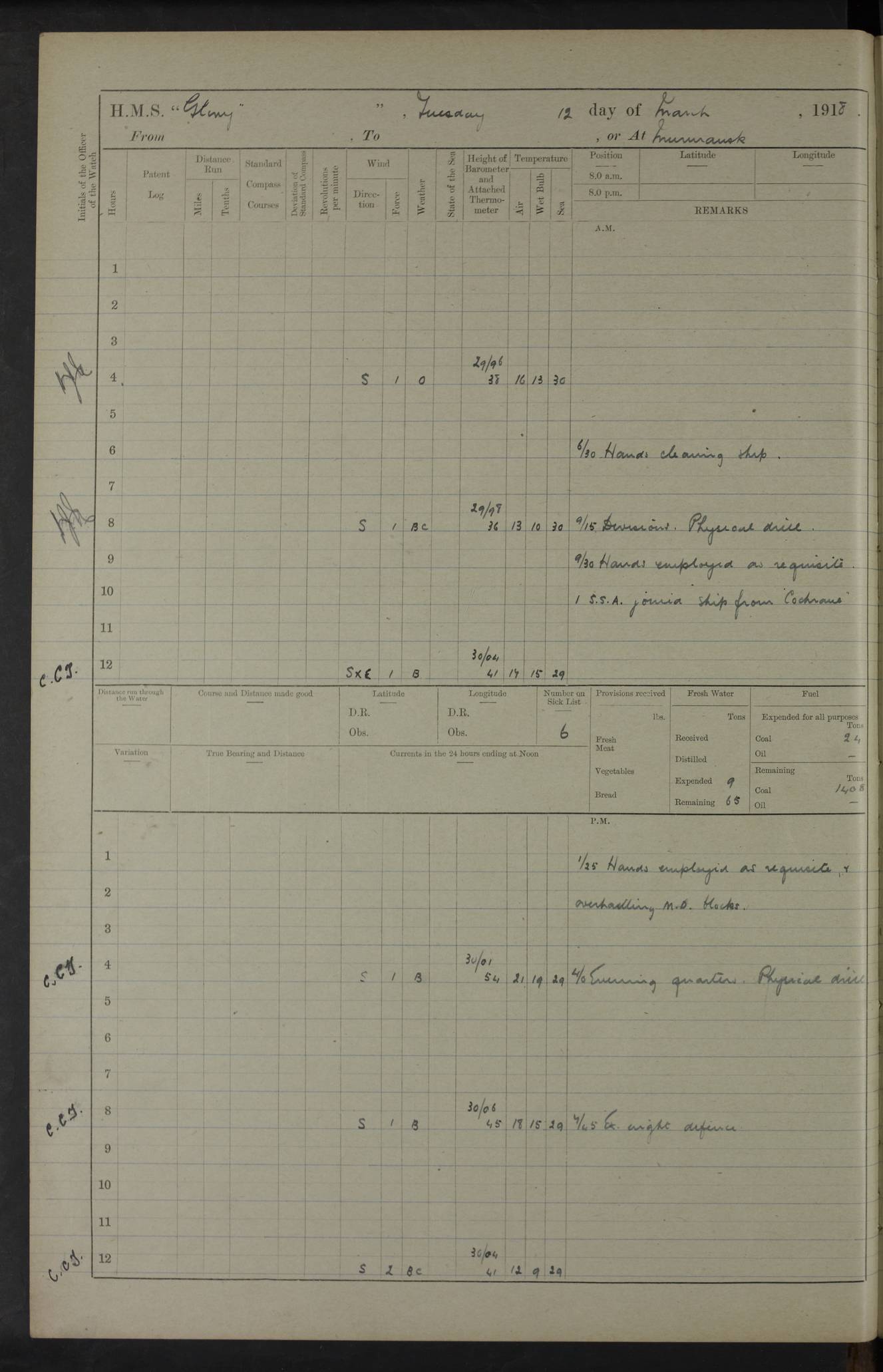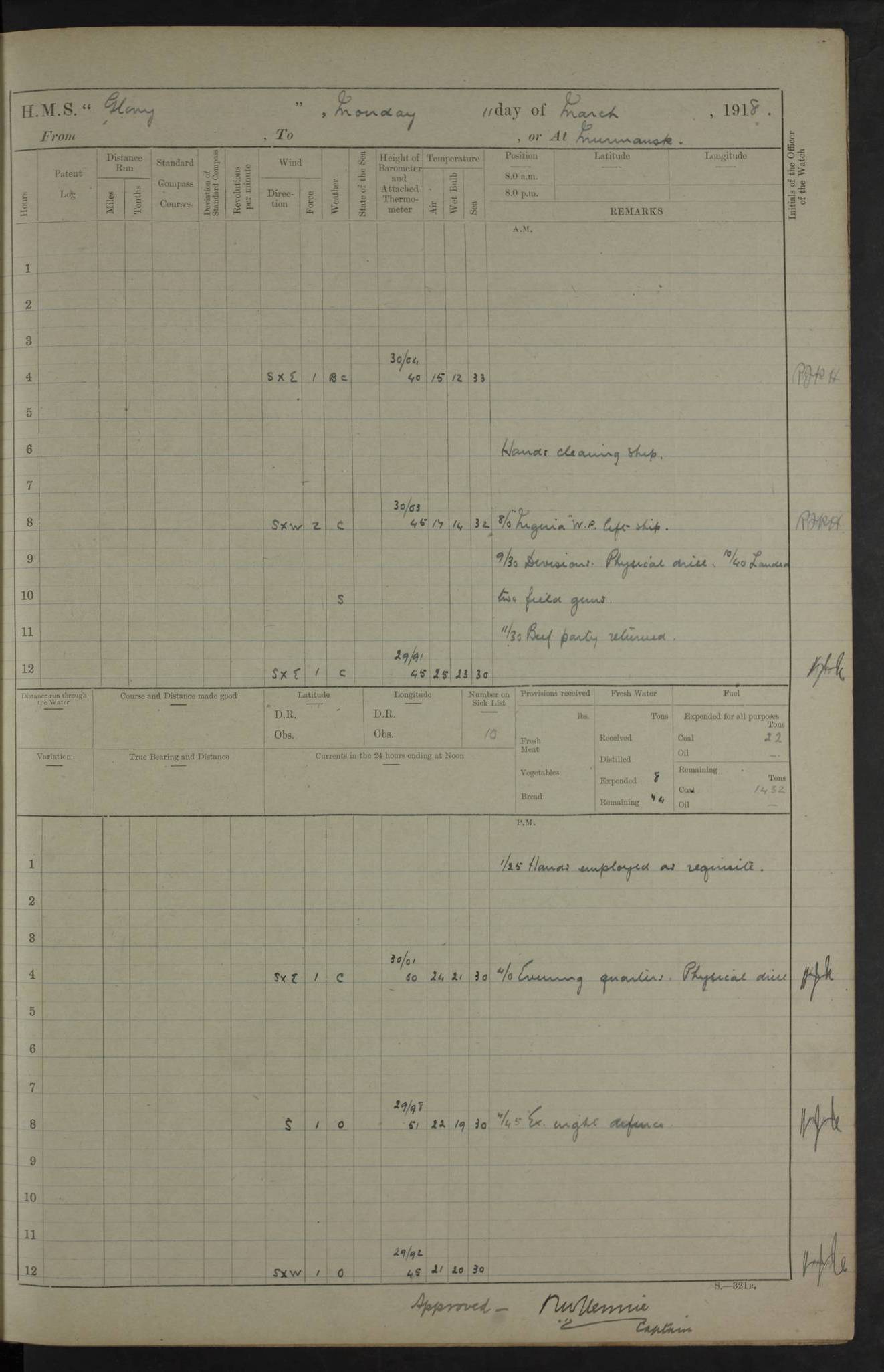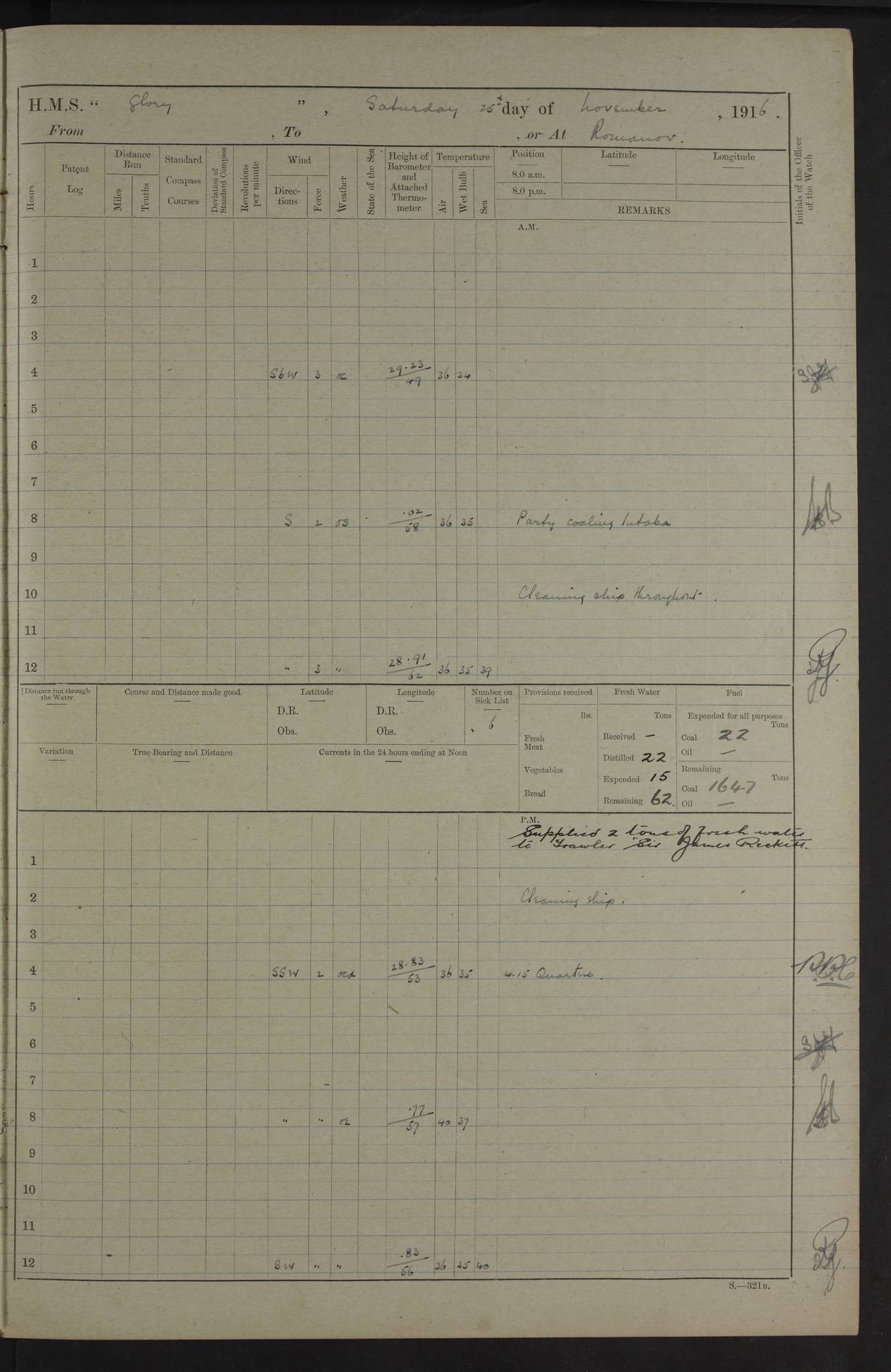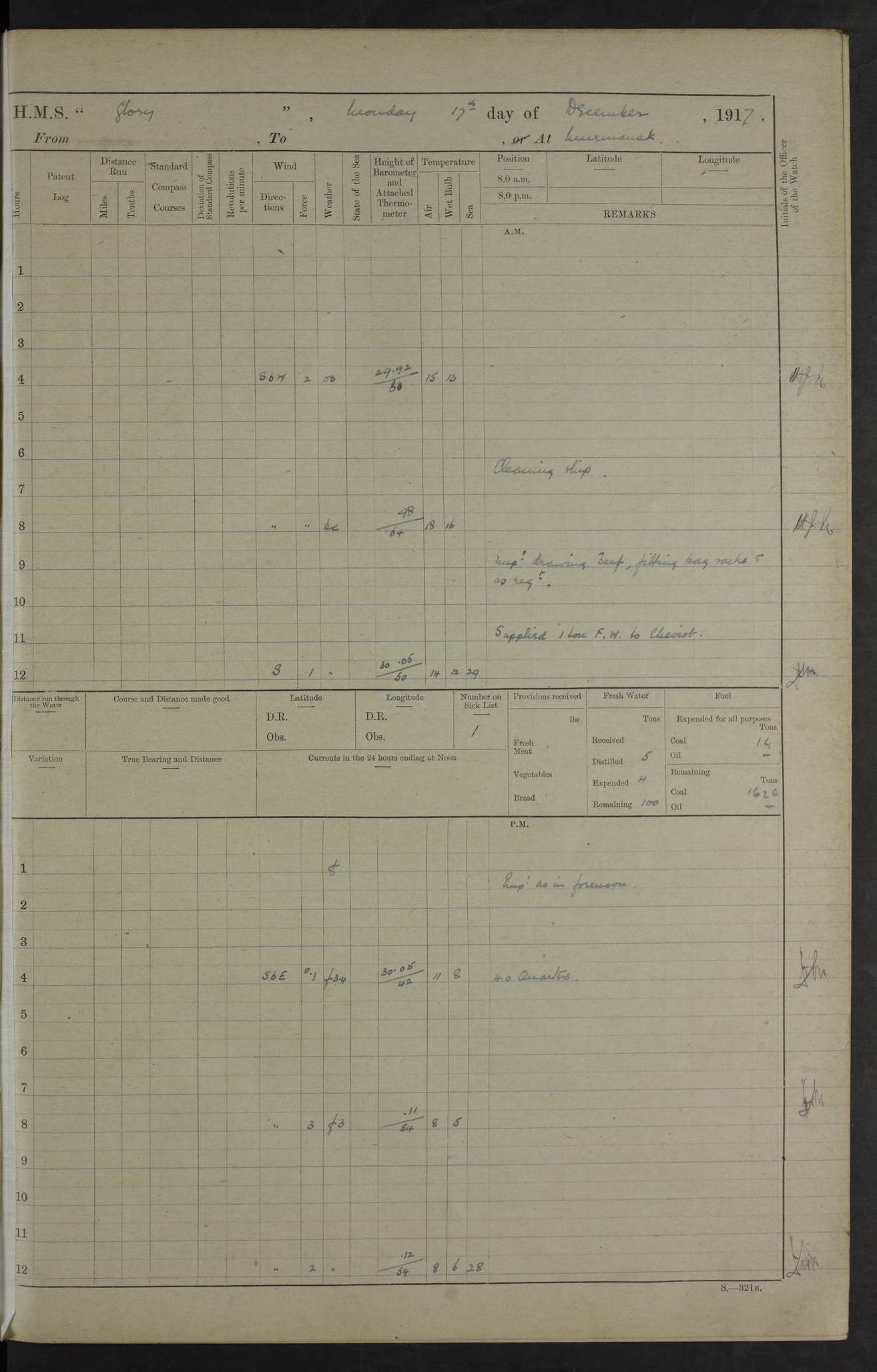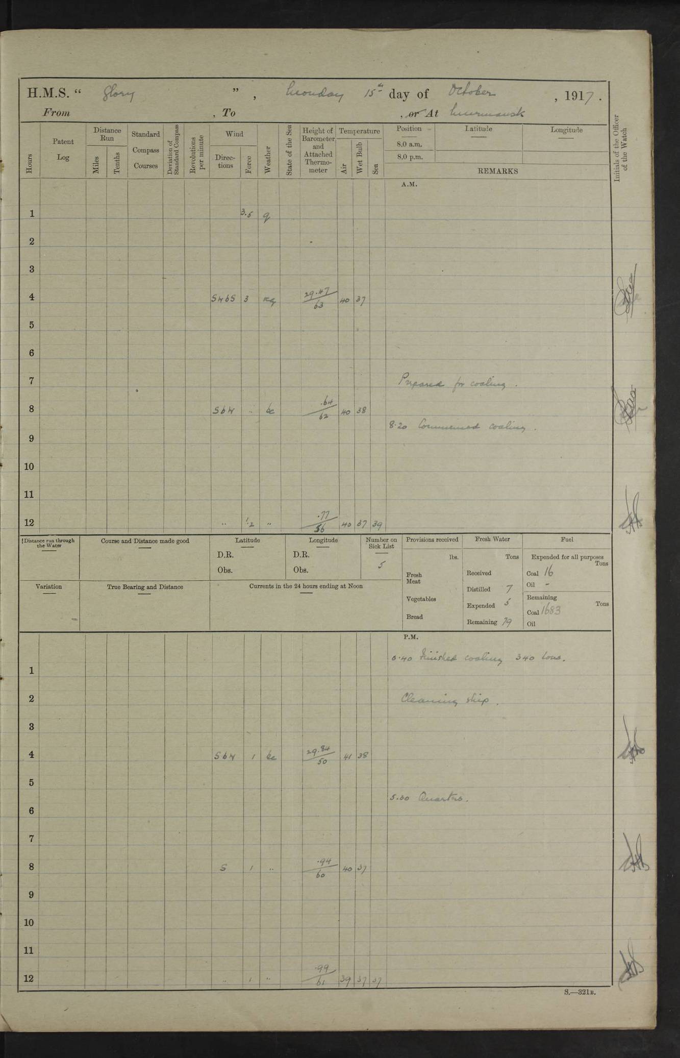LOGS FOR OCTOBER 1916 For the period covered by the remainder of these logs (1 October, 1916 to 31 December 1918), HMS Glory was based at Murmansk, northern Russia. The city had a variety of names in the early 20th Century – including, Port Murman, Romanov and Murmansk. The location will be given in these pages as Murmansk, the modern name. A history of Murmansk’s names is available at http://en.wikipedia.org/wiki/Murmansk . 4f961482a2fc8e2def0011c7: (http://s3.amazonaws.com/oldweather/ADM53-43026/ADM 53-43026-001_0.jpg) This log is to be kept in a cover in future 4f961482a2fc8e2def0011c8: (http://s3.amazonaws.com/oldweather/ADM53-43026/ADM 53-43026-001_1.jpg) 4f961482a2fc8e2def0011c9: (http://s3.amazonaws.com/oldweather/ADM53-43026/ADM 53-43026-002_0.jpg) 4f961483a2fc8e2def0011ca: (http://s3.amazonaws.com/oldweather/ADM53-43026/ADM 53-43026-002_1.jpg) 4f961483a2fc8e2def0011cb: (http://s3.amazonaws.com/oldweather/ADM53-43026/ADM 53-43026-003_0.jpg) 4f961483a2fc8e2def0011cc: (http://s3.amazonaws.com/oldweather/ADM53-43026/ADM 53-43026-003_1.jpg) 1 October 1916 Murmansk Lat 69.03, Long 33.05 5.40am: Russian auxiliary Kolgiev sailed. Information regarding this vessel (or similar name) has not been found. 7.30am: Celebrated Holy Communion. am: Party working in Earl Essex. Earl Essex was a hired trawler of 225 grt, built, in 1914. Sourced from F.J. Dittmar & J.J. Colledge (1972) – British warships 1914–1919, Ian Allan. 10.45am: Held Divine Service. 11.30am: Celebrated Holy Communion. 4.45pm: Out nets. 4f961484a2fc8e2def0011cd: (http://s3.amazonaws.com/oldweather/ADM53-43026/ADM 53-43026-004_0.jpg) 2 October 1916 Murmansk Lat 69.03, Long 33.05 am: Party working in Earl Essex. 11.30am: Paid quarterly settlement. 6.15pm: Kolgiev arrived. 4f961484a2fc8e2def0011ce: (http://s3.amazonaws.com/oldweather/ADM53-43026/ADM 53-43026-004_1.jpg) 3 October 1916 Murmansk Lat 69.03, Long 33.05 Number on sick list: 9 9.20am: Aft port nets. 11.30am: Russian TBs Goorovoi and Plasteevyi(?) arrived. The first of these TBs is possibly ‘Grosovoi’, built at Le Havre around 1900. Her fate is unclear. The name of the second vessel is possibly incorrect, but no near match has been found. 1.30pm: Out port nets. 4f961484a2fc8e2def0011cf: (http://s3.amazonaws.com/oldweather/ADM53-43026/ADM 53-43026-005_0.jpg) 4 October 1916 Murmansk Lat 69.03, Long 33.05 8.30am: Salvator - broad pendant of Commodore T.W. Kemp arrived. Salvator (ex–Katoomba) was a hired yacht of 684 tons gross, built in 1903. She served as the Heliopolis in WW2. Details at WW1NavyBritishShips-Dittmar4AP.htm . 9.25am: Aft port nets. 11.05am: HE the Minister of Marine visited ship. 11.30am: Out port nets. 11.50am: Russian auxiliary Gotowsci(?) arrived. 12 noon: Kolgiev sailed. pm: HM Tug Blackcock arrived. Blackcock was a hired patrol tug, built in 1886 and wrecked on 18 January, 1918, in the White Sea. Sourced from F.J. Dittmar & J.J. Colledge (1972) – British warships 1914–1919, Ian Allan. 6.50pm: Kolgiev arrived. 4f961485a2fc8e2def0011d0: (http://s3.amazonaws.com/oldweather/ADM53-43026/ADM 53-43026-005_1.jpg) 5 October 1916 Murmansk Lat 69.03, Long 33.05 10.35am: Kolgiev sailed. 1.05pm: Salvator sailed. pm: Read Warrant No. 5. 4f961485a2fc8e2def0011d1: (http://s3.amazonaws.com/oldweather/ADM53-43026/ADM 53-43026-006_0.jpg) 6 October 1916 Murmansk Lat 69.03, Long 33.05 pm: 5 tons of water supplied to Blackcock. 3.30pm: Action. 3.45pm: Secure. Russian T.B's Grosovoi and Plasteevyi sailed. 4f961485a2fc8e2def0011d2: (http://s3.amazonaws.com/oldweather/ADM53-43026/ADM 53-43026-006_1.jpg) 7 October 1916 Murmansk Lat 69.03, Long 33.05 am: Party coaling trawler. am: Tested life buoys – correct. 4f961486a2fc8e2def0011d3: (http://s3.amazonaws.com/oldweather/ADM53-43026/ADM 53-43026-007_0.jpg) 8 October 1916 Murmansk Lat 69.03, Long 33.05 6.45am: Party working in collier. 7.30am: Celebrated Holy Communion. 10.45am: Held Divine service. 5.45pm: Held Divine Service. 4f961486a2fc8e2def0011d4: (http://s3.amazonaws.com/oldweather/ADM53-43026/ADM 53-43026-007_1.jpg) 9 October 1916 Murmansk Lat 69.03, Long 33.05 Number on sick list: 9 am: Exercised fire stations. am: 2nd pinnace patrolling. pm: Landed marines for drill. 4f961486a2fc8e2def0011d5: (http://s3.amazonaws.com/oldweather/ADM53-43026/ADM 53-43026-008_0.jpg) 10 October 1916 Murmansk Lat 69.03, Long 33.05 am: Steam pinnace patrolling. 1.55pm: Kolgiev arrived. 4f961487a2fc8e2def0011d6: (http://s3.amazonaws.com/oldweather/ADM53-43026/ADM 53-43026-008_1.jpg) 11 October 1916 Murmansk Lat 69.03, Long 33.05 am: Party working on boom defence. am: MT and QD men aired bedding. am: Marines at drill. 1.50pm: Kolgiev sailed. 3.15pm: British tug Racia (lighter ES 23 in tow) arrived. Racia was a hired screw tug of 410 grt, built in 1894 and sold on 23 June, 1920. Sourced from F.J. Dittmar & J.J. Colledge (1972) – British warships 1914–1919, Ian Allan. 4f961487a2fc8e2def0011d7: (http://s3.amazonaws.com/oldweather/ADM53-43026/ADM 53-43026-009_0.jpg) 12 October 1916 Murmansk Lat 69.03, Long 33.05 Number on sick list: 6 am: Party working on boom defence. am: Steam pinnace patrolling. pm: Make and mend clothes. 4.15pm: Read warrant No. 6. 6.00pm: Imperator Nicolas arrived. A vessel with this name has not been traced. 4f961487a2fc8e2def0011d8: (http://s3.amazonaws.com/oldweathe/ADM53-43026/ADM 53-43026-009_1.jpg) 13 October 1916 Murmansk Lat 69.03, Long 33.05 am: Steam pinnace patrolling. am: Party working on boom defence. am: Found foc’sle awning and side screens damaged by rats. 4f961488a2fc8e2def0011d9: (http://s3.amazonaws.com/oldweather/ADM53-43026/ADM 53-43026-010_0.jpg) 14 August 1916 (probably should read October) Murmansk Lat 69.03, Long 33.05 Number on sick list: 7 6.45am: Racia (floating crane in tow) sailed. am: Party working on boom defence. am: Tested life buoys – correct. 3.00pm: Vindictive arrived. HMS Vindictive was a protected cruiser of the Arrogant class, launched in 1897 at Chatham Dockyar