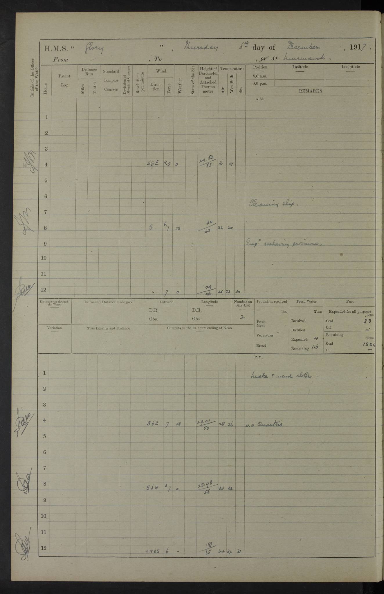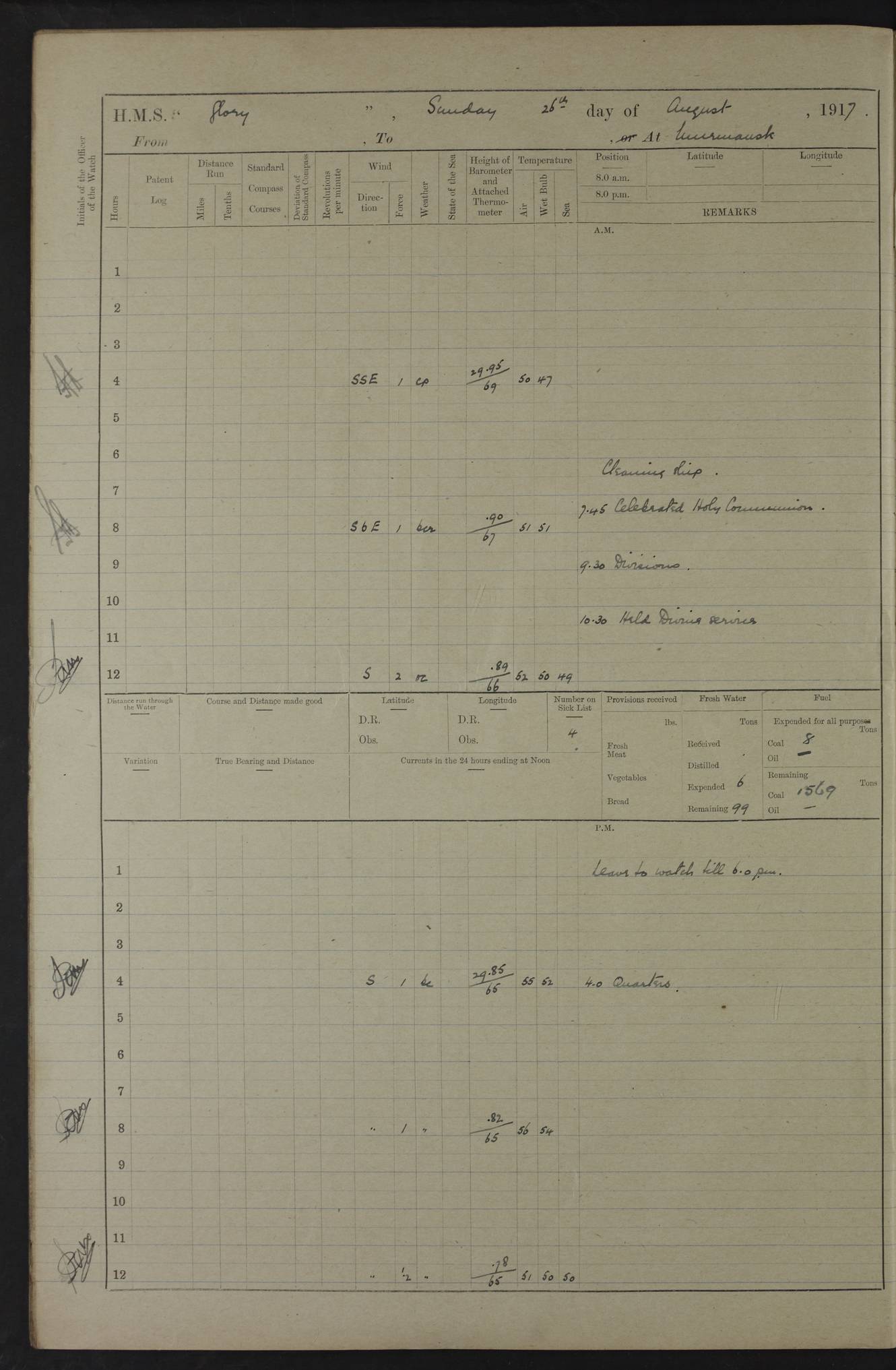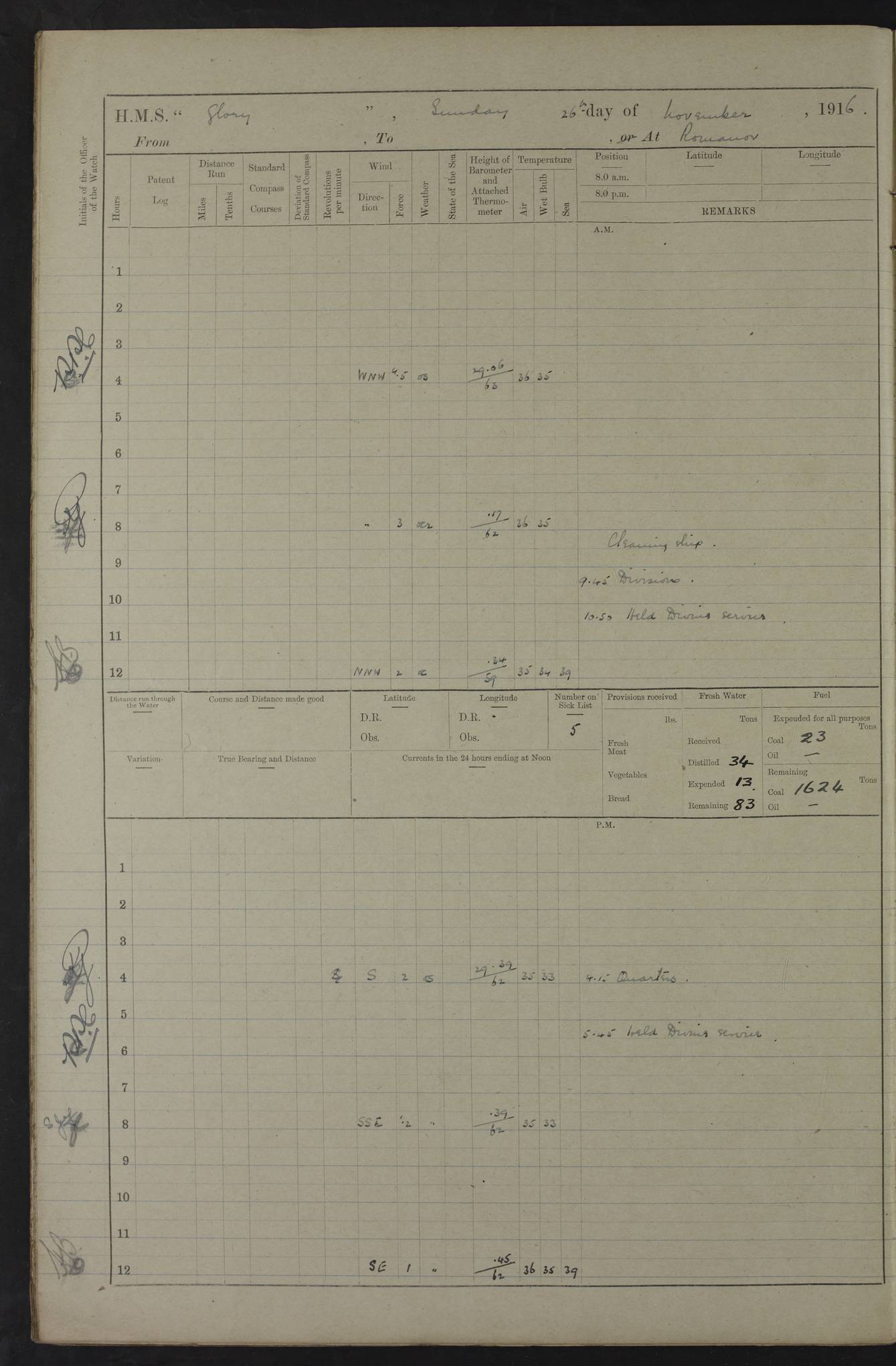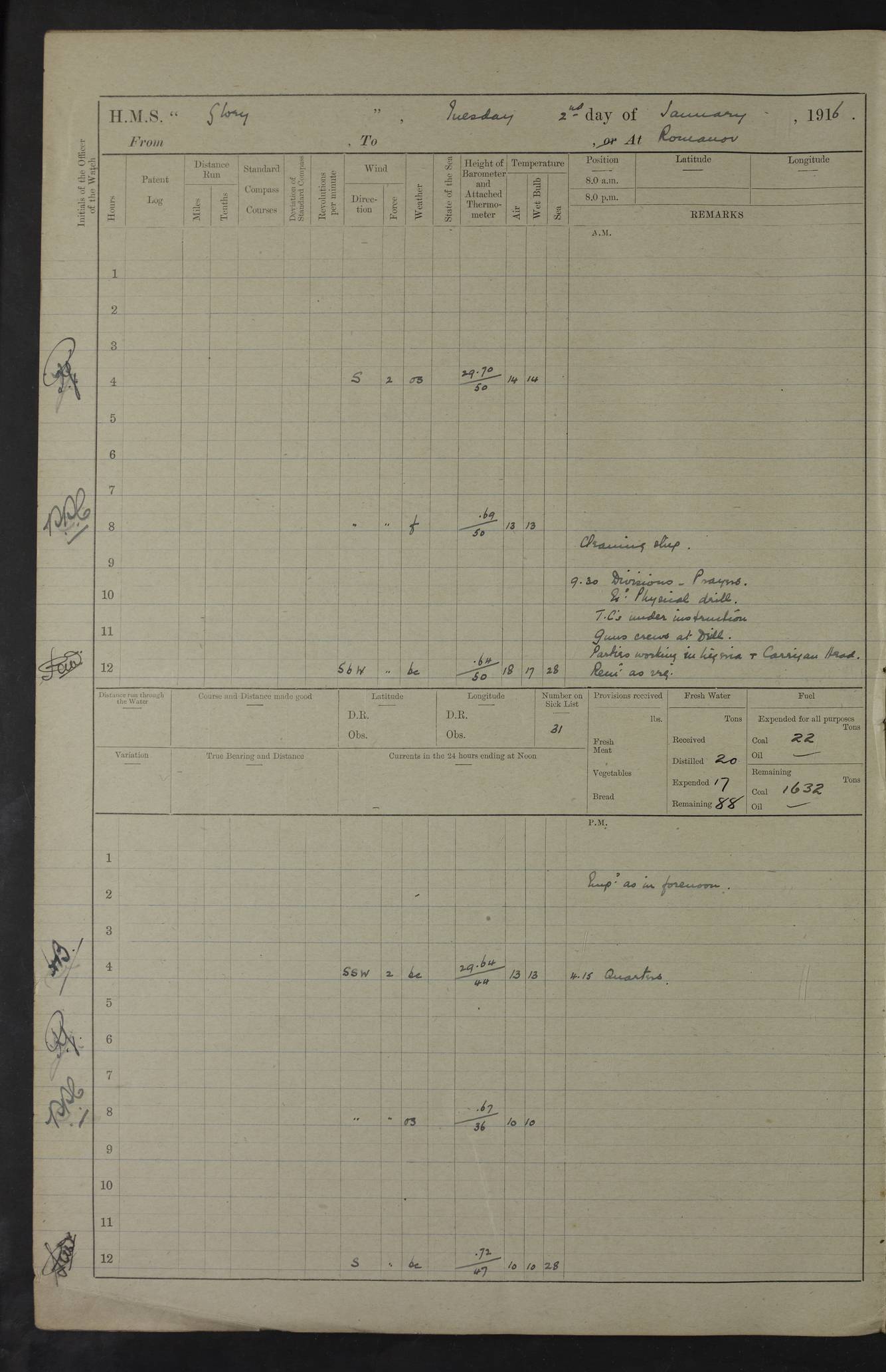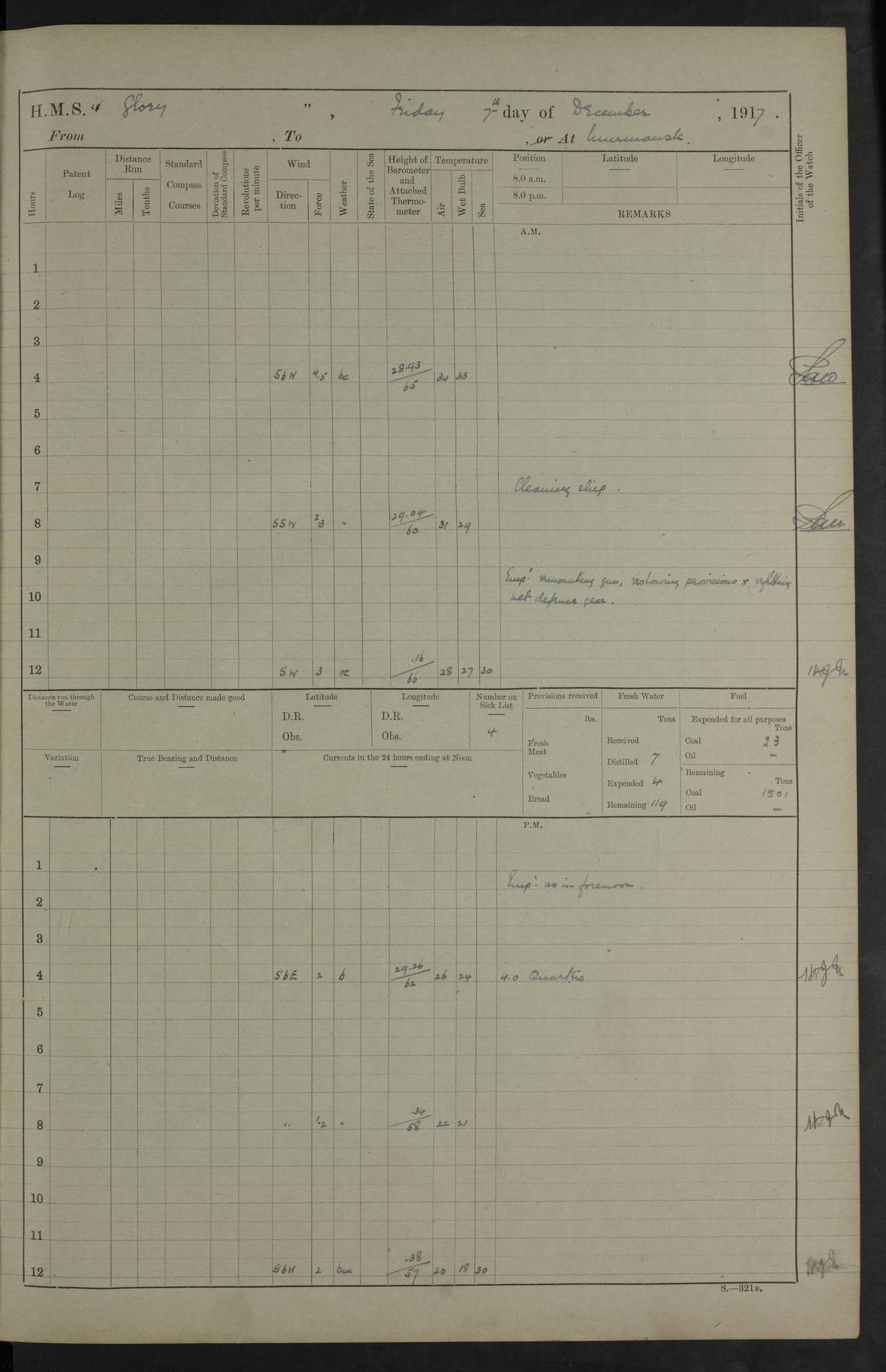 LOGS FOR OCTOBER 1916 For the period covered by the remainder of these logs (1 October, 1916 to 31 December 1918), HMS Glory was based at Murmansk, northern Russia. The city had a variety of names in the early 20th Century – including, Port Murman, Romanov and Murmansk. The location will be given in these pages as Murmansk, the modern name. A history of Murmansk’s names is available at http://en.wikipedia.org/wiki/Murmansk . 4f961482a2fc8e2def0011c7: (http://s3.amazonaws.com/oldweather/ADM53-43026/ADM 53-43026-001_0.jpg) This log is to be kept in a cover in future 4f961482a2fc8e2def0011c8: (http://s3.amazonaws.com/oldweather/ADM53-43026/ADM 53-43026-001_1.jpg) 4f961482a2fc8e2def0011c9: (http://s3.amazonaws.com/oldweather/ADM53-43026/ADM 53-43026-002_0.jpg) 4f961483a2fc8e2def0011ca: (http://s3.amazonaws.com/oldweather/ADM53-43026/ADM 53-43026-002_1.jpg) 4f961483a2fc8e2def0011cb: (http://s3.amazonaws.com/oldweather/ADM53-43026/ADM 53-43026-003_0.jpg) 4f961483a2fc8e2def0011cc: (http://s3.amazonaws.com/oldweather/ADM53-43026/ADM 53-43026-003_1.jpg) 1 October 1916 Murmansk Lat 69.03, Long 33.05 5.40am: Russian auxiliary Kolgiev sailed. Information regarding this vessel (or similar name) has not been found. 7.30am: Celebrated Holy Communion. am: Party working in Earl Essex. Earl Essex was a hired trawler of 225 grt, built, in 1914. Sourced from F.J. Dittmar & J.J. Colledge (1972) – British warships 1914–1919, Ian Allan. 10.45am: Held Divine Service. 11.30am: Celebrated Holy Communion. 4.45pm: Out nets. 4f961484a2fc8e2def0011cd: (http://s3.amazonaws.com/oldweather/ADM53-43026/ADM 53-43026-004_0.jpg) 2 October 1916 Murmansk Lat 69.03, Long 33.05 am: Party working in Earl Essex. 11.30am: Paid quarterly settlement. 6.15pm: Kolgiev arrived. 4f961484a2fc8e2def0011ce: (http://s3.amazonaws.com/oldweather/ADM53-43026/ADM 53-43026-004_1.jpg) 3 October 1916 Murmansk Lat 69.03, Long 33.05 Number on sick list: 9 9.20am: Aft port nets. 11.30am: Russian TBs Goorovoi and Plasteevyi(?) arrived. The first of these TBs is possibly ‘Grosovoi’, built at Le Havre around 1900. Her fate is unclear. The name of the second vessel is possibly incorrect, but no near match has been found. 1.30pm: Out port nets. 4f961484a2fc8e2def0011cf: (http://s3.amazonaws.com/oldweather/ADM53-43026/ADM 53-43026-005_0.jpg) 4 October 1916 Murmansk Lat 69.03, Long 33.05 8.30am: Salvator - broad pendant of Commodore T.W. Kemp arrived. Salvator (ex–Katoomba) was a hired yacht of 684 tons gross, built in 1903. She served as the Heliopolis in WW2. Details at WW1NavyBritishShips-Dittmar4AP.htm . 9.25am: Aft port nets. 11.05am: HE the Minister of Marine visited ship. 11.30am: Out port nets. 11.50am: Russian auxiliary Gotowsci(?) arrived. 12 noon: Kolgiev sailed. pm: HM Tug Blackcock arrived. Blackcock was a hired patrol tug, built in 1886 and wrecked on 18 January, 1918, in the White Sea. Sourced from F.J. Dittmar & J.J. Colledge (1972) – British warships 1914–1919, Ian Allan. 6.50pm: Kolgiev arrived. 4f961485a2fc8e2def0011d0: (http://s3.amazonaws.com/oldweather/ADM53-43026/ADM 53-43026-005_1.jpg) 5 October 1916 Murmansk Lat 69.03, Long 33.05 10.35am: Kolgiev sailed. 1.05pm: Salvator sailed. pm: Read Warrant No. 5. 4f961485a2fc8e2def0011d1: (http://s3.amazonaws.com/oldweather/ADM53-43026/ADM 53-43026-006_0.jpg) 6 October 1916 Murmansk Lat 69.03, Long 33.05 pm: 5 tons of water supplied to Blackcock. 3.30pm: Action. 3.45pm: Secure. Russian T.B's Grosovoi and Plasteevyi sailed. 4f961485a2fc8e2def0011d2: (http://s3.amazonaws.com/oldweather/ADM53-43026/ADM 53-43026-006_1.jpg) 7 October 1916 Murmansk Lat 69.03, Long 33.05 am: Party coaling trawler. am: Tested life buoys – correct. 4f961486a2fc8e2def0011d3: (http://s3.amazonaws.com/oldweather/ADM53-43026/ADM 53-43026-007_0.jpg) 8 October 1916 Murmansk Lat 69.03, Long 33.05 6.45am: Party working in collier. 7.30am: Celebrated Holy Communion. 10.45am: Held Divine service. 5.45pm: Held Divine Service. 4f961486a2fc8e2def0011d4: (http://s3.amazonaws.com/oldweather/ADM53-43026/ADM 53-43026-007_1.jpg) 9 October 1916 Murmansk Lat 69.03, Long 33.05 Number on sick list: 9 am: Exercised fire stations. am: 2nd pinnace patrolling. pm: Landed marines for drill. 4f961486a2fc8e2def0011d5: (http://s3.amazonaws.com/oldweather/ADM53-43026/ADM 53-43026-008_0.jpg) 10 October 1916 Murmansk Lat 69.03, Long 33.05 am: Steam pinnace patrolling. 1.55pm: Kolgiev arrived. 4f961487a2fc8e2def0011d6: (http://s3.amazonaws.com/oldweather/ADM53-43026/ADM 53-43026-008_1.jpg) 11 October 1916 Murmansk Lat 69.03, Long 33.05 am: Party working on boom defence. am: MT and QD men aired bedding. am: Marines at drill. 1.50pm: Kolgiev sailed. 3.15pm: British tug Racia (lighter ES 23 in tow) arrived. Racia was a hired screw tug of 410 grt, built in 1894 and sold on 23 June, 1920. Sourced from F.J. Dittmar & J.J. Colledge (1972) – British warships 1914–1919, Ian Allan. 4f961487a2fc8e2def0011d7: (http://s3.amazonaws.com/oldweather/ADM53-43026/ADM 53-43026-009_0.jpg) 12 October 1916 Murmansk Lat 69.03, Long 33.05 Number on sick list: 6 am: Party working on boom defence. am: Steam pinnace patrolling. pm: Make and mend clothes. 4.15pm: Read warrant No. 6. 6.00pm: Imperator Nicolas arrived. A vessel with this name has not been traced. 4f961487a2fc8e2def0011d8: (http://s3.amazonaws.com/oldweathe/ADM53-43026/ADM 53-43026-009_1.jpg) 13 October 1916 Murmansk Lat 69.03, Long 33.05 am: Steam pinnace patrolling. am: Party working on boom defence. am: Found foc’sle awning and side screens damaged by rats. 4f961488a2fc8e2def0011d9: (http://s3.amazonaws.com/oldweather/ADM53-43026/ADM 53-43026-010_0.jpg) 14 August 1916 (probably should read October) Murmansk Lat 69.03, Long 33.05 Number on sick list: 7 6.45am: Racia (floating crane in tow) sailed. am: Party working on boom defence. am: Tested life buoys – correct. 3.00pm: Vindictive arrived. HMS Vindictive was a protected cruiser of the Arrogant class, launched in 1897 at Chatham Dockyar