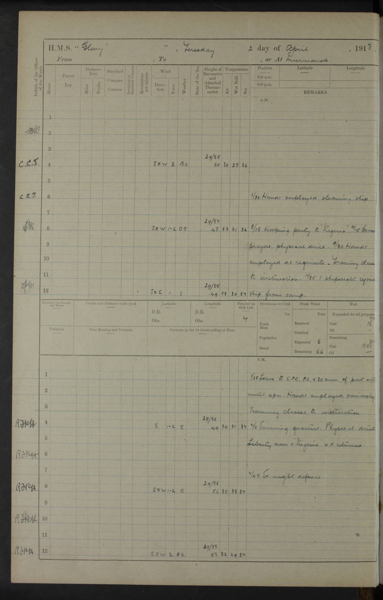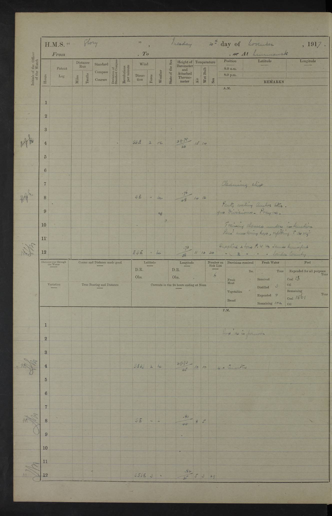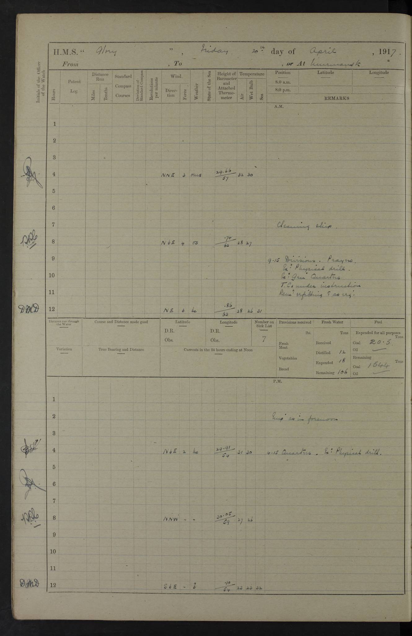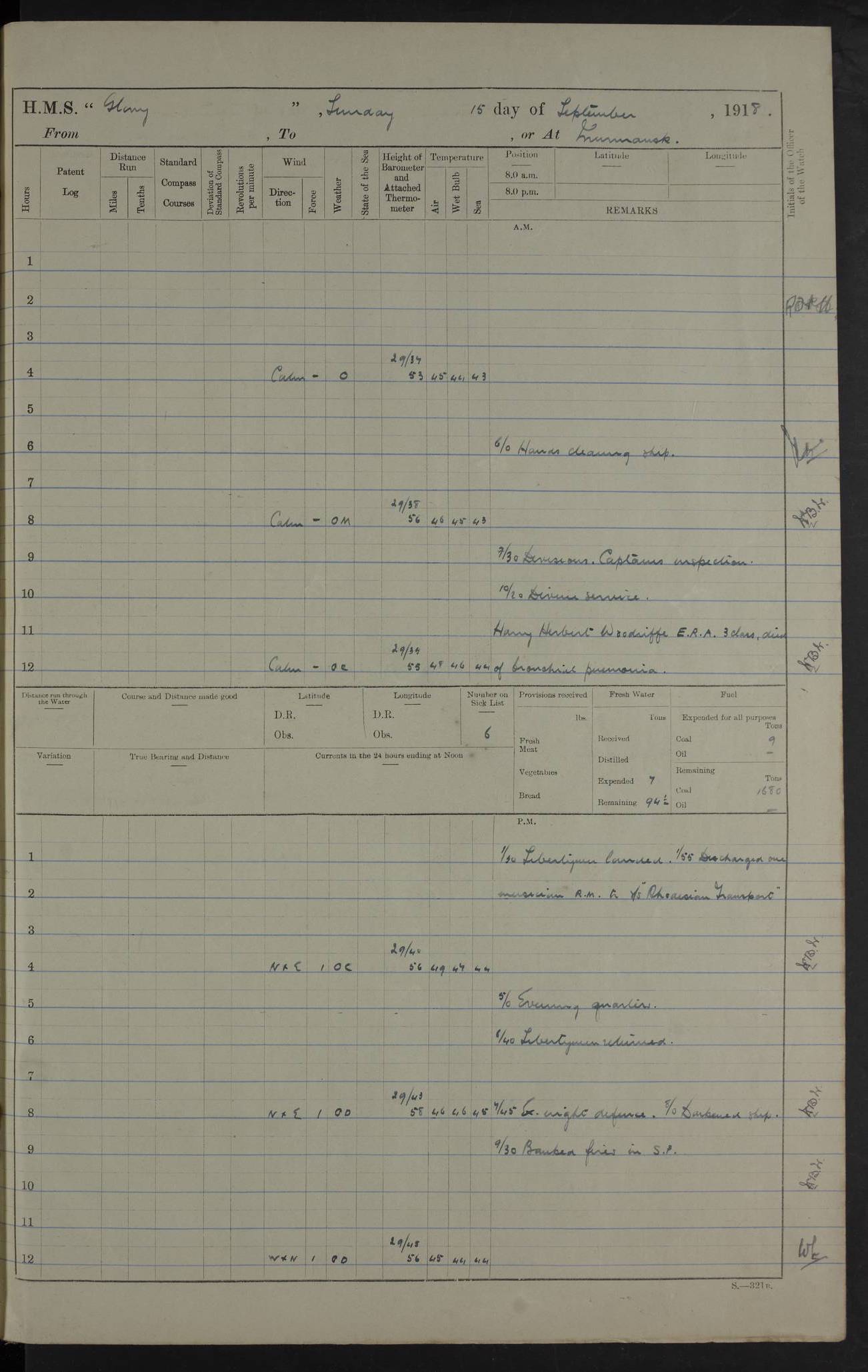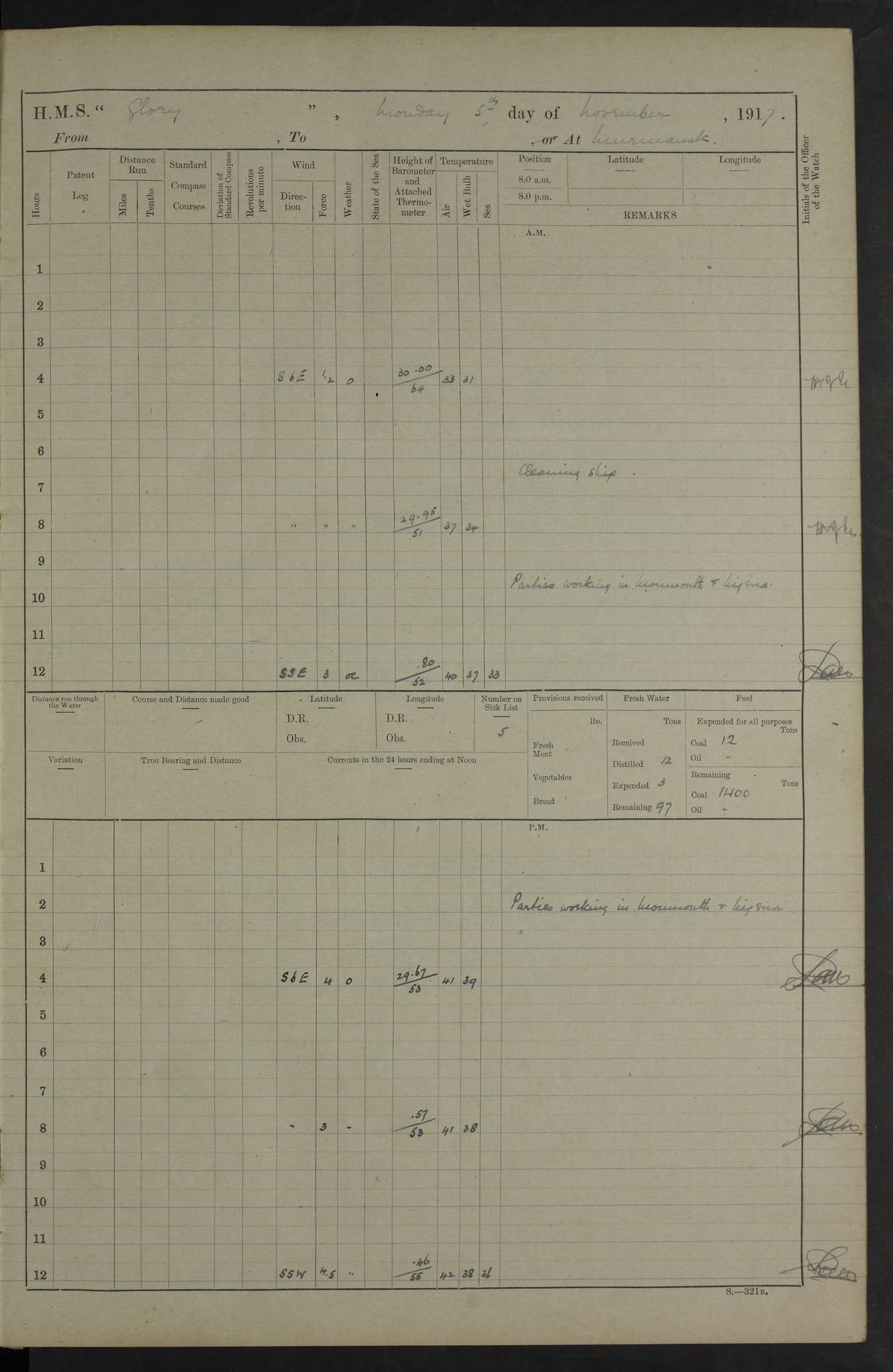 LOGS FOR OCTOBER 1916 For the period covered by the remainder of these logs (1 October, 1916 to 31 December 1918), HMS Glory was based at Murmansk, northern Russia. The city had a variety of names in the early 20th Century – including, Port Murman, Romanov and Murmansk. The location will be given in these pages as Murmansk, the modern name. A history of Murmansk’s names is available at http://en.wikipedia.org/wiki/Murmansk . 4f961482a2fc8e2def0011c7: (http://s3.amazonaws.com/oldweather/ADM53-43026/ADM 53-43026-001_0.jpg) This log is to be kept in a cover in future 4f961482a2fc8e2def0011c8: (http://s3.amazonaws.com/oldweather/ADM53-43026/ADM 53-43026-001_1.jpg) 4f961482a2fc8e2def0011c9: (http://s3.amazonaws.com/oldweather/ADM53-43026/ADM 53-43026-002_0.jpg) 4f961483a2fc8e2def0011ca: (http://s3.amazonaws.com/oldweather/ADM53-43026/ADM 53-43026-002_1.jpg) 4f961483a2fc8e2def0011cb: (http://s3.amazonaws.com/oldweather/ADM53-43026/ADM 53-43026-003_0.jpg) 4f961483a2fc8e2def0011cc: (http://s3.amazonaws.com/oldweather/ADM53-43026/ADM 53-43026-003_1.jpg) 1 October 1916 Murmansk Lat 69.03, Long 33.05 5.40am: Russian auxiliary Kolgiev sailed. Information regarding this vessel (or similar name) has not been found. 7.30am: Celebrated Holy Communion. am: Party working in Earl Essex. Earl Essex was a hired trawler of 225 grt, built, in 1914. Sourced from F.J. Dittmar & J.J. Colledge (1972) – British warships 1914–1919, Ian Allan. 10.45am: Held Divine Service. 11.30am: Celebrated Holy Communion. 4.45pm: Out nets. 4f961484a2fc8e2def0011cd: (http://s3.amazonaws.com/oldweather/ADM53-43026/ADM 53-43026-004_0.jpg) 2 October 1916 Murmansk Lat 69.03, Long 33.05 am: Party working in Earl Essex. 11.30am: Paid quarterly settlement. 6.15pm: Kolgiev arrived. 4f961484a2fc8e2def0011ce: (http://s3.amazonaws.com/oldweather/ADM53-43026/ADM 53-43026-004_1.jpg) 3 October 1916 Murmansk Lat 69.03, Long 33.05 Number on sick list: 9 9.20am: Aft port nets. 11.30am: Russian TBs Goorovoi and Plasteevyi(?) arrived. The first of these TBs is possibly ‘Grosovoi’, built at Le Havre around 1900. Her fate is unclear. The name of the second vessel is possibly incorrect, but no near match has been found. 1.30pm: Out port nets. 4f961484a2fc8e2def0011cf: (http://s3.amazonaws.com/oldweather/ADM53-43026/ADM 53-43026-005_0.jpg) 4 October 1916 Murmansk Lat 69.03, Long 33.05 8.30am: Salvator - broad pendant of Commodore T.W. Kemp arrived. Salvator (ex–Katoomba) was a hired yacht of 684 tons gross, built in 1903. She served as the Heliopolis in WW2. Details at WW1NavyBritishShips-Dittmar4AP.htm . 9.25am: Aft port nets. 11.05am: HE the Minister of Marine visited ship. 11.30am: Out port nets. 11.50am: Russian auxiliary Gotowsci(?) arrived. 12 noon: Kolgiev sailed. pm: HM Tug Blackcock arrived. Blackcock was a hired patrol tug, built in 1886 and wrecked on 18 January, 1918, in the White Sea. Sourced from F.J. Dittmar & J.J. Colledge (1972) – British warships 1914–1919, Ian Allan. 6.50pm: Kolgiev arrived. 4f961485a2fc8e2def0011d0: (http://s3.amazonaws.com/oldweather/ADM53-43026/ADM 53-43026-005_1.jpg) 5 October 1916 Murmansk Lat 69.03, Long 33.05 10.35am: Kolgiev sailed. 1.05pm: Salvator sailed. pm: Read Warrant No. 5. 4f961485a2fc8e2def0011d1: (http://s3.amazonaws.com/oldweather/ADM53-43026/ADM 53-43026-006_0.jpg) 6 October 1916 Murmansk Lat 69.03, Long 33.05 pm: 5 tons of water supplied to Blackcock. 3.30pm: Action. 3.45pm: Secure. Russian T.B's Grosovoi and Plasteevyi sailed. 4f961485a2fc8e2def0011d2: (http://s3.amazonaws.com/oldweather/ADM53-43026/ADM 53-43026-006_1.jpg) 7 October 1916 Murmansk Lat 69.03, Long 33.05 am: Party coaling trawler. am: Tested life buoys – correct. 4f961486a2fc8e2def0011d3: (http://s3.amazonaws.com/oldweather/ADM53-43026/ADM 53-43026-007_0.jpg) 8 October 1916 Murmansk Lat 69.03, Long 33.05 6.45am: Party working in collier. 7.30am: Celebrated Holy Communion. 10.45am: Held Divine service. 5.45pm: Held Divine Service. 4f961486a2fc8e2def0011d4: (http://s3.amazonaws.com/oldweather/ADM53-43026/ADM 53-43026-007_1.jpg) 9 October 1916 Murmansk Lat 69.03, Long 33.05 Number on sick list: 9 am: Exercised fire stations. am: 2nd pinnace patrolling. pm: Landed marines for drill. 4f961486a2fc8e2def0011d5: (http://s3.amazonaws.com/oldweather/ADM53-43026/ADM 53-43026-008_0.jpg) 10 October 1916 Murmansk Lat 69.03, Long 33.05 am: Steam pinnace patrolling. 1.55pm: Kolgiev arrived. 4f961487a2fc8e2def0011d6: (http://s3.amazonaws.com/oldweather/ADM53-43026/ADM 53-43026-008_1.jpg) 11 October 1916 Murmansk Lat 69.03, Long 33.05 am: Party working on boom defence. am: MT and QD men aired bedding. am: Marines at drill. 1.50pm: Kolgiev sailed. 3.15pm: British tug Racia (lighter ES 23 in tow) arrived. Racia was a hired screw tug of 410 grt, built in 1894 and sold on 23 June, 1920. Sourced from F.J. Dittmar & J.J. Colledge (1972) – British warships 1914–1919, Ian Allan. 4f961487a2fc8e2def0011d7: (http://s3.amazonaws.com/oldweather/ADM53-43026/ADM 53-43026-009_0.jpg) 12 October 1916 Murmansk Lat 69.03, Long 33.05 Number on sick list: 6 am: Party working on boom defence. am: Steam pinnace patrolling. pm: Make and mend clothes. 4.15pm: Read warrant No. 6. 6.00pm: Imperator Nicolas arrived. A vessel with this name has not been traced. 4f961487a2fc8e2def0011d8: (http://s3.amazonaws.com/oldweathe/ADM53-43026/ADM 53-43026-009_1.jpg) 13 October 1916 Murmansk Lat 69.03, Long 33.05 am: Steam pinnace patrolling. am: Party working on boom defence. am: Found foc’sle awning and side screens damaged by rats. 4f961488a2fc8e2def0011d9: (http://s3.amazonaws.com/oldweather/ADM53-43026/ADM 53-43026-010_0.jpg) 14 August 1916 (probably should read October) Murmansk Lat 69.03, Long 33.05 Number on sick list: 7 6.45am: Racia (floating crane in tow) sailed. am: Party working on boom defence. am: Tested life buoys – correct. 3.00pm: Vindictive arrived. HMS Vindictive was a protected cruiser of the Arrogant class, launched in 1897 at Chatham Dockyar
