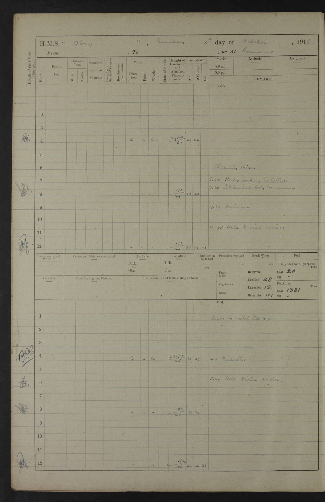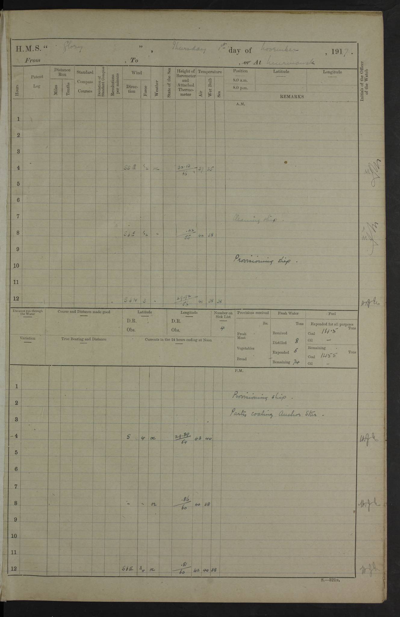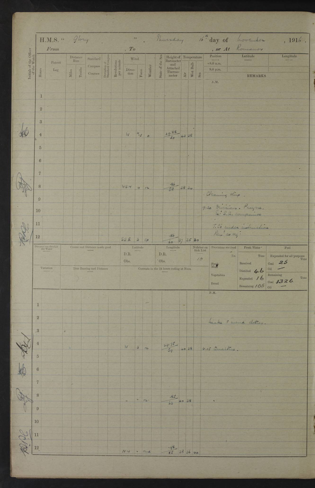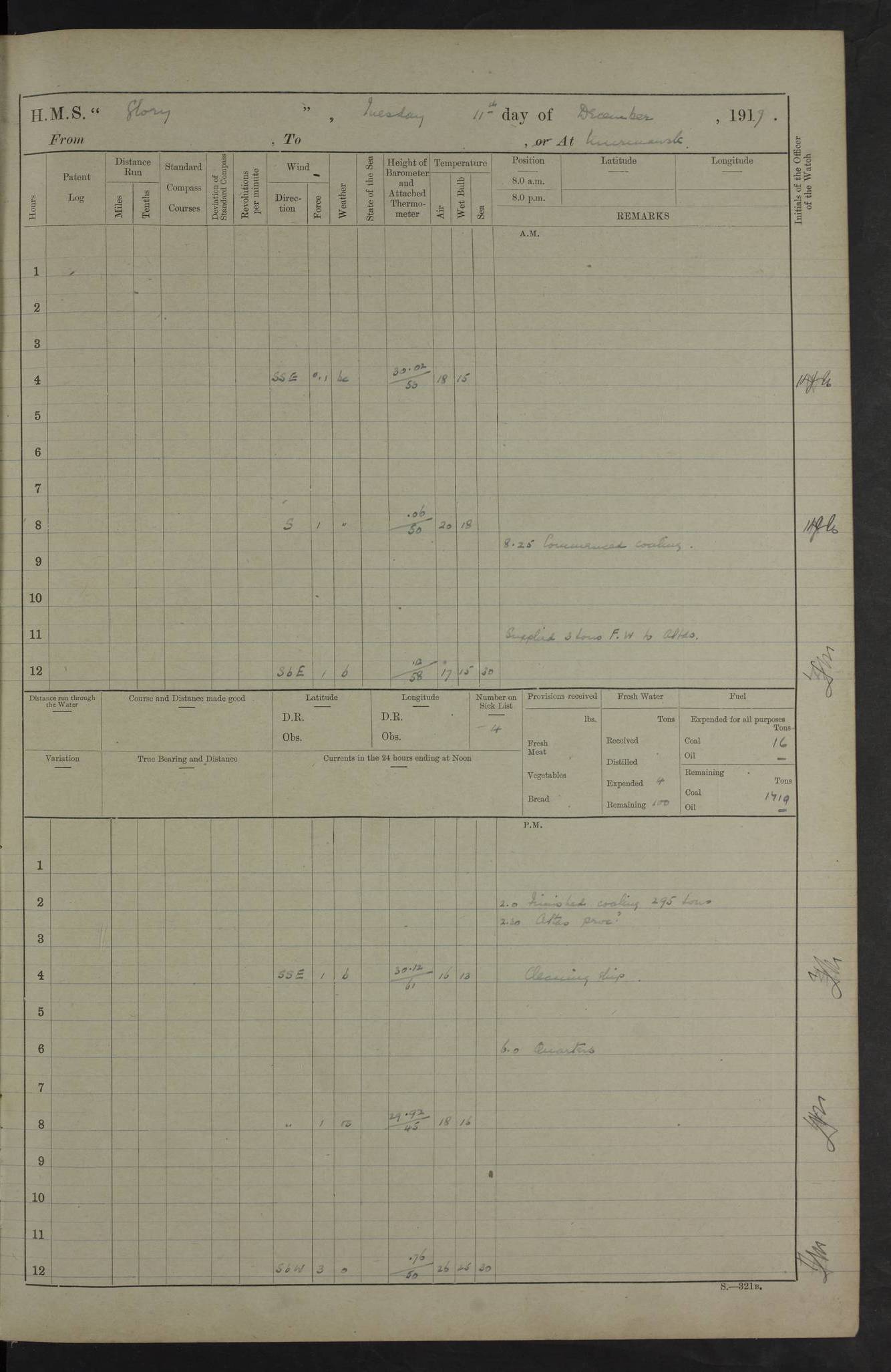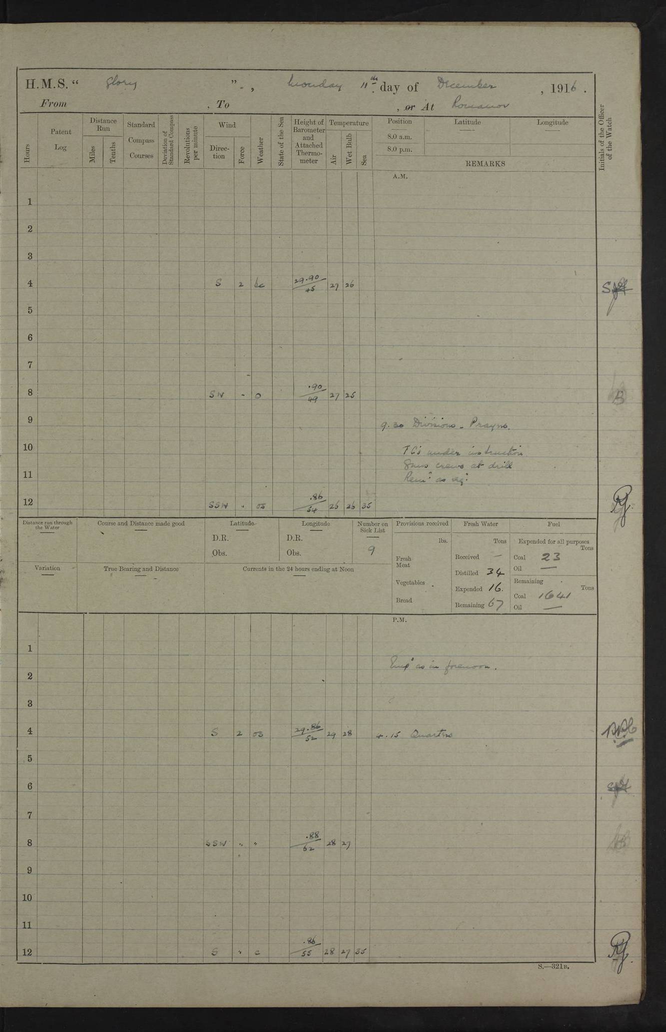 LOGS FOR OCTOBER 1916 For the period covered by the remainder of these logs (1 October, 1916 to 31 December 1918), HMS Glory was based at Murmansk, northern Russia. The city had a variety of names in the early 20th Century – including, Port Murman, Romanov and Murmansk. The location will be given in these pages as Murmansk, the modern name. A history of Murmansk’s names is available at http://en.wikipedia.org/wiki/Murmansk . 4f961482a2fc8e2def0011c7: (http://s3.amazonaws.com/oldweather/ADM53-43026/ADM 53-43026-001_0.jpg) This log is to be kept in a cover in future 4f961482a2fc8e2def0011c8: (http://s3.amazonaws.com/oldweather/ADM53-43026/ADM 53-43026-001_1.jpg) 4f961482a2fc8e2def0011c9: (http://s3.amazonaws.com/oldweather/ADM53-43026/ADM 53-43026-002_0.jpg) 4f961483a2fc8e2def0011ca: (http://s3.amazonaws.com/oldweather/ADM53-43026/ADM 53-43026-002_1.jpg) 4f961483a2fc8e2def0011cb: (http://s3.amazonaws.com/oldweather/ADM53-43026/ADM 53-43026-003_0.jpg) 4f961483a2fc8e2def0011cc: (http://s3.amazonaws.com/oldweather/ADM53-43026/ADM 53-43026-003_1.jpg) 1 October 1916 Murmansk Lat 69.03, Long 33.05 5.40am: Russian auxiliary Kolgiev sailed. Information regarding this vessel (or similar name) has not been found. 7.30am: Celebrated Holy Communion. am: Party working in Earl Essex. Earl Essex was a hired trawler of 225 grt, built, in 1914. Sourced from F.J. Dittmar & J.J. Colledge (1972) – British warships 1914–1919, Ian Allan. 10.45am: Held Divine Service. 11.30am: Celebrated Holy Communion. 4.45pm: Out nets. 4f961484a2fc8e2def0011cd: (http://s3.amazonaws.com/oldweather/ADM53-43026/ADM 53-43026-004_0.jpg) 2 October 1916 Murmansk Lat 69.03, Long 33.05 am: Party working in Earl Essex. 11.30am: Paid quarterly settlement. 6.15pm: Kolgiev arrived. 4f961484a2fc8e2def0011ce: (http://s3.amazonaws.com/oldweather/ADM53-43026/ADM 53-43026-004_1.jpg) 3 October 1916 Murmansk Lat 69.03, Long 33.05 Number on sick list: 9 9.20am: Aft port nets. 11.30am: Russian TBs Goorovoi and Plasteevyi(?) arrived. The first of these TBs is possibly ‘Grosovoi’, built at Le Havre around 1900. Her fate is unclear. The name of the second vessel is possibly incorrect, but no near match has been found. 1.30pm: Out port nets. 4f961484a2fc8e2def0011cf: (http://s3.amazonaws.com/oldweather/ADM53-43026/ADM 53-43026-005_0.jpg) 4 October 1916 Murmansk Lat 69.03, Long 33.05 8.30am: Salvator - broad pendant of Commodore T.W. Kemp arrived. Salvator (ex–Katoomba) was a hired yacht of 684 tons gross, built in 1903. She served as the Heliopolis in WW2. Details at WW1NavyBritishShips-Dittmar4AP.htm . 9.25am: Aft port nets. 11.05am: HE the Minister of Marine visited ship. 11.30am: Out port nets. 11.50am: Russian auxiliary Gotowsci(?) arrived. 12 noon: Kolgiev sailed. pm: HM Tug Blackcock arrived. Blackcock was a hired patrol tug, built in 1886 and wrecked on 18 January, 1918, in the White Sea. Sourced from F.J. Dittmar & J.J. Colledge (1972) – British warships 1914–1919, Ian Allan. 6.50pm: Kolgiev arrived. 4f961485a2fc8e2def0011d0: (http://s3.amazonaws.com/oldweather/ADM53-43026/ADM 53-43026-005_1.jpg) 5 October 1916 Murmansk Lat 69.03, Long 33.05 10.35am: Kolgiev sailed. 1.05pm: Salvator sailed. pm: Read Warrant No. 5. 4f961485a2fc8e2def0011d1: (http://s3.amazonaws.com/oldweather/ADM53-43026/ADM 53-43026-006_0.jpg) 6 October 1916 Murmansk Lat 69.03, Long 33.05 pm: 5 tons of water supplied to Blackcock. 3.30pm: Action. 3.45pm: Secure. Russian T.B's Grosovoi and Plasteevyi sailed. 4f961485a2fc8e2def0011d2: (http://s3.amazonaws.com/oldweather/ADM53-43026/ADM 53-43026-006_1.jpg) 7 October 1916 Murmansk Lat 69.03, Long 33.05 am: Party coaling trawler. am: Tested life buoys – correct. 4f961486a2fc8e2def0011d3: (http://s3.amazonaws.com/oldweather/ADM53-43026/ADM 53-43026-007_0.jpg) 8 October 1916 Murmansk Lat 69.03, Long 33.05 6.45am: Party working in collier. 7.30am: Celebrated Holy Communion. 10.45am: Held Divine service. 5.45pm: Held Divine Service. 4f961486a2fc8e2def0011d4: (http://s3.amazonaws.com/oldweather/ADM53-43026/ADM 53-43026-007_1.jpg) 9 October 1916 Murmansk Lat 69.03, Long 33.05 Number on sick list: 9 am: Exercised fire stations. am: 2nd pinnace patrolling. pm: Landed marines for drill. 4f961486a2fc8e2def0011d5: (http://s3.amazonaws.com/oldweather/ADM53-43026/ADM 53-43026-008_0.jpg) 10 October 1916 Murmansk Lat 69.03, Long 33.05 am: Steam pinnace patrolling. 1.55pm: Kolgiev arrived. 4f961487a2fc8e2def0011d6: (http://s3.amazonaws.com/oldweather/ADM53-43026/ADM 53-43026-008_1.jpg) 11 October 1916 Murmansk Lat 69.03, Long 33.05 am: Party working on boom defence. am: MT and QD men aired bedding. am: Marines at drill. 1.50pm: Kolgiev sailed. 3.15pm: British tug Racia (lighter ES 23 in tow) arrived. Racia was a hired screw tug of 410 grt, built in 1894 and sold on 23 June, 1920. Sourced from F.J. Dittmar & J.J. Colledge (1972) – British warships 1914–1919, Ian Allan. 4f961487a2fc8e2def0011d7: (http://s3.amazonaws.com/oldweather/ADM53-43026/ADM 53-43026-009_0.jpg) 12 October 1916 Murmansk Lat 69.03, Long 33.05 Number on sick list: 6 am: Party working on boom defence. am: Steam pinnace patrolling. pm: Make and mend clothes. 4.15pm: Read warrant No. 6. 6.00pm: Imperator Nicolas arrived. A vessel with this name has not been traced. 4f961487a2fc8e2def0011d8: (http://s3.amazonaws.com/oldweathe/ADM53-43026/ADM 53-43026-009_1.jpg) 13 October 1916 Murmansk Lat 69.03, Long 33.05 am: Steam pinnace patrolling. am: Party working on boom defence. am: Found foc’sle awning and side screens damaged by rats. 4f961488a2fc8e2def0011d9: (http://s3.amazonaws.com/oldweather/ADM53-43026/ADM 53-43026-010_0.jpg) 14 August 1916 (probably should read October) Murmansk Lat 69.03, Long 33.05 Number on sick list: 7 6.45am: Racia (floating crane in tow) sailed. am: Party working on boom defence. am: Tested life buoys – correct. 3.00pm: Vindictive arrived. HMS Vindictive was a protected cruiser of the Arrogant class, launched in 1897 at Chatham Dockyar