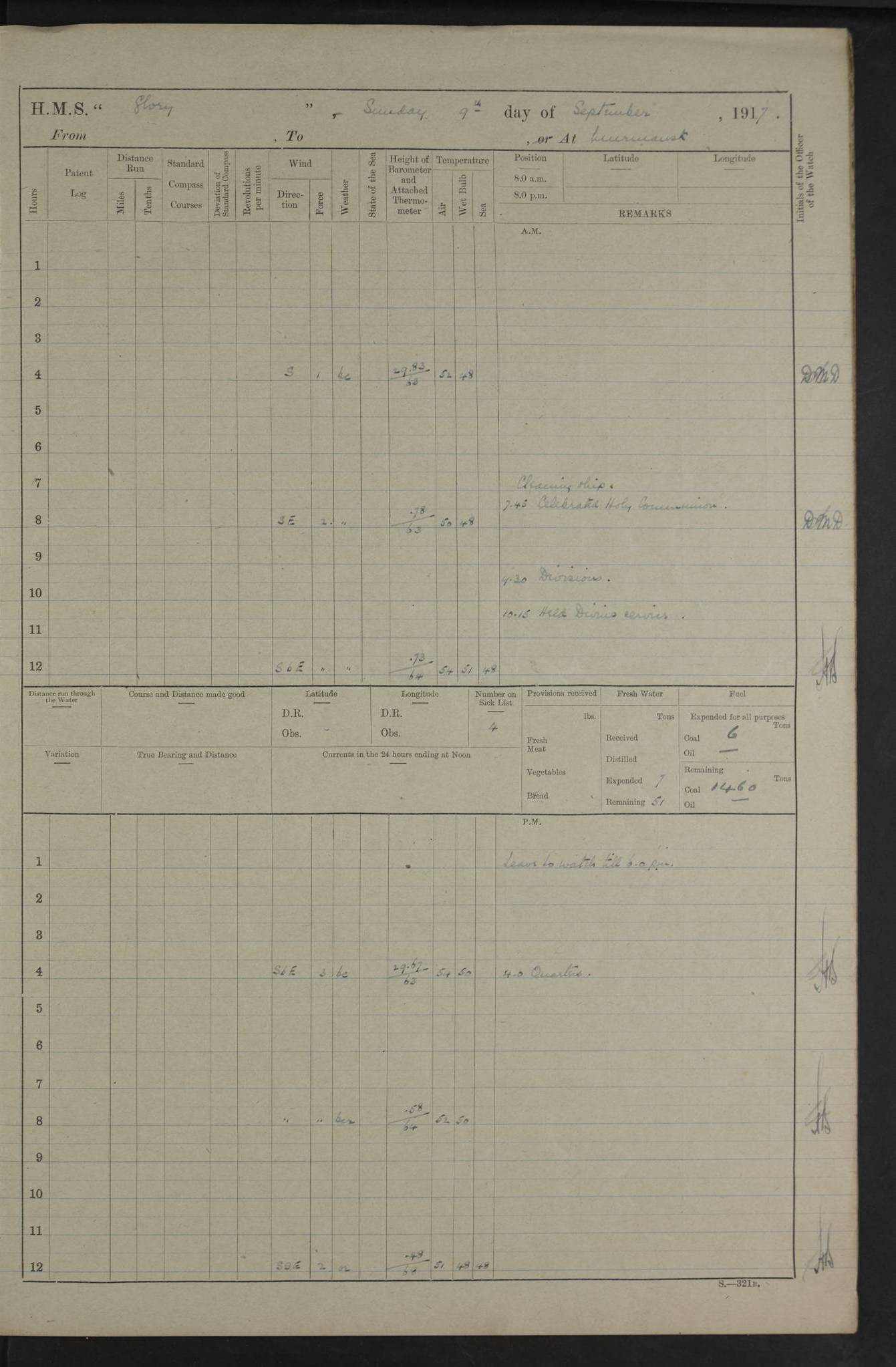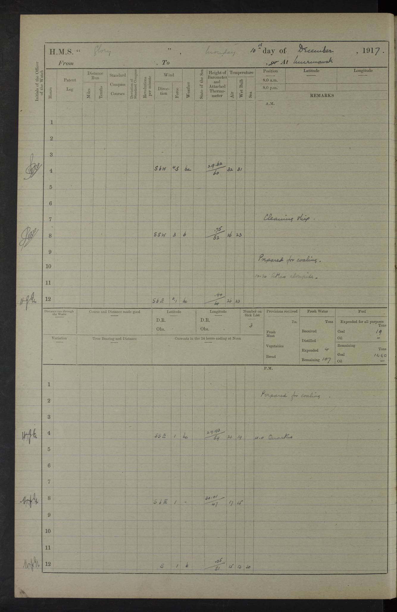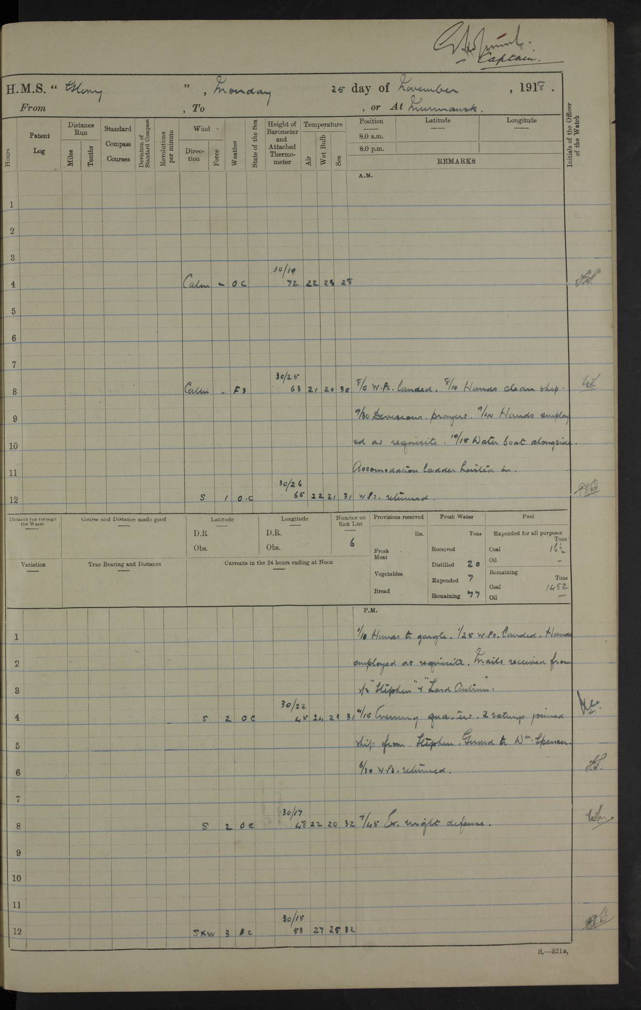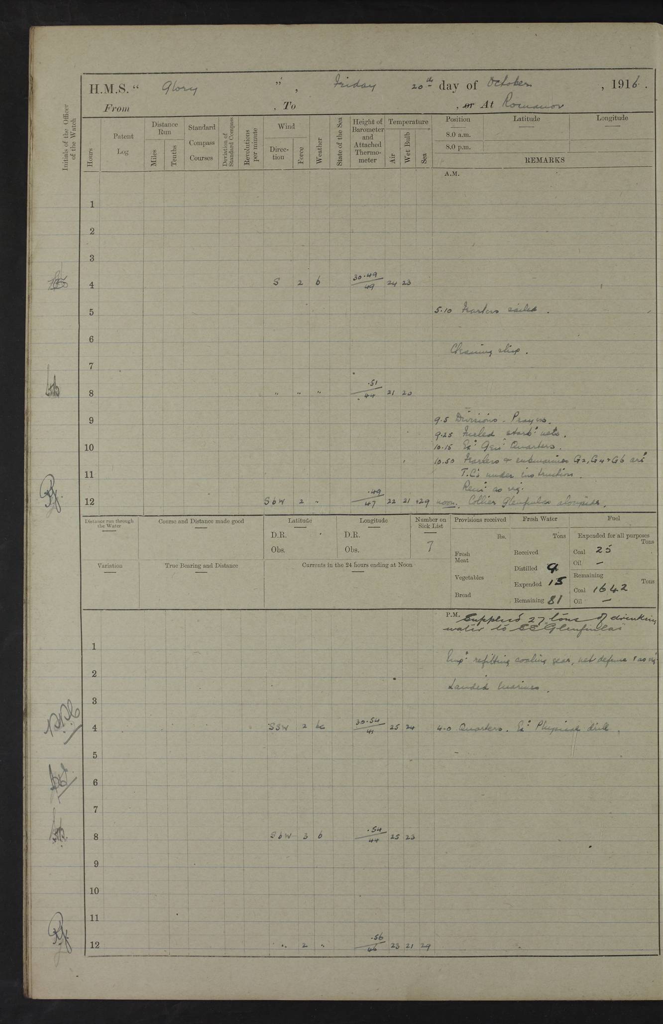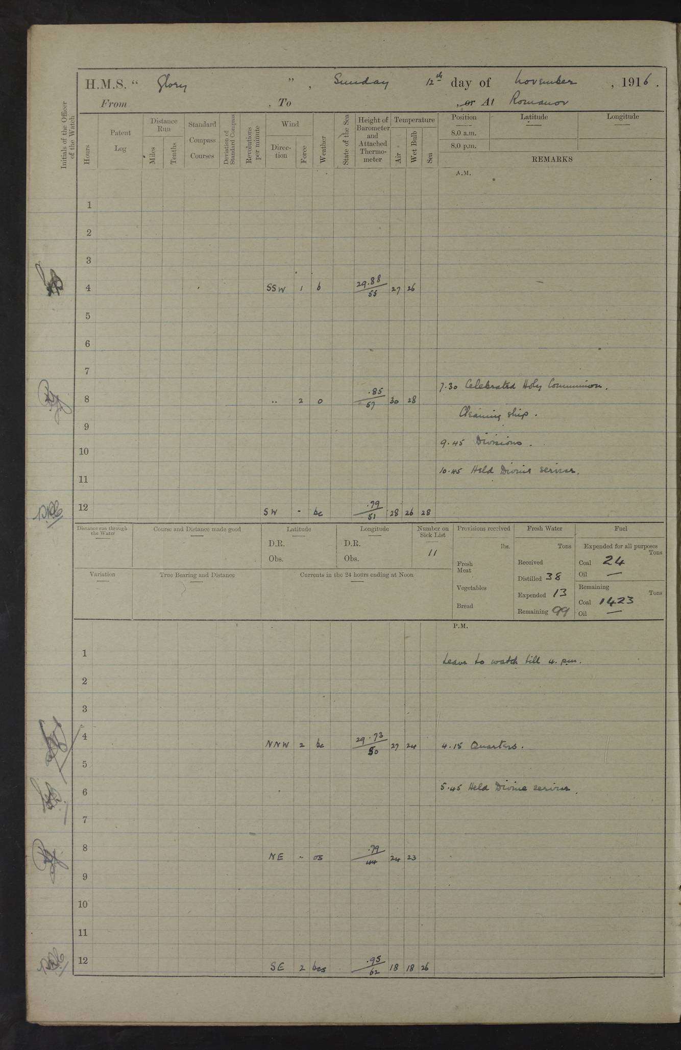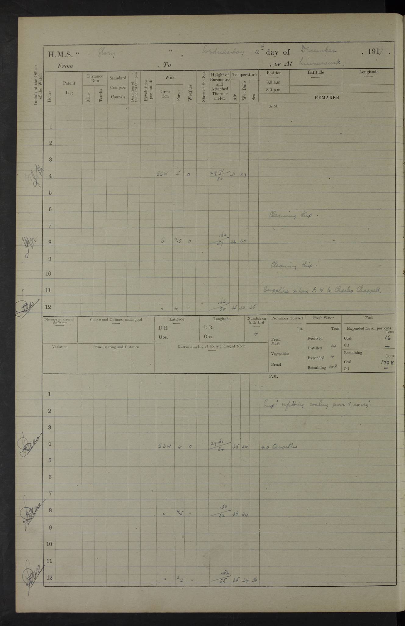 LOGS FOR OCTOBER 1916 For the period covered by the remainder of these logs (1 October, 1916 to 31 December 1918), HMS Glory was based at Murmansk, northern Russia. The city had a variety of names in the early 20th Century – including, Port Murman, Romanov and Murmansk. The location will be given in these pages as Murmansk, the modern name. A history of Murmansk’s names is available at http://en.wikipedia.org/wiki/Murmansk . 4f961482a2fc8e2def0011c7: (http://s3.amazonaws.com/oldweather/ADM53-43026/ADM 53-43026-001_0.jpg) This log is to be kept in a cover in future 4f961482a2fc8e2def0011c8: (http://s3.amazonaws.com/oldweather/ADM53-43026/ADM 53-43026-001_1.jpg) 4f961482a2fc8e2def0011c9: (http://s3.amazonaws.com/oldweather/ADM53-43026/ADM 53-43026-002_0.jpg) 4f961483a2fc8e2def0011ca: (http://s3.amazonaws.com/oldweather/ADM53-43026/ADM 53-43026-002_1.jpg) 4f961483a2fc8e2def0011cb: (http://s3.amazonaws.com/oldweather/ADM53-43026/ADM 53-43026-003_0.jpg) 4f961483a2fc8e2def0011cc: (http://s3.amazonaws.com/oldweather/ADM53-43026/ADM 53-43026-003_1.jpg) 1 October 1916 Murmansk Lat 69.03, Long 33.05 5.40am: Russian auxiliary Kolgiev sailed. Information regarding this vessel (or similar name) has not been found. 7.30am: Celebrated Holy Communion. am: Party working in Earl Essex. Earl Essex was a hired trawler of 225 grt, built, in 1914. Sourced from F.J. Dittmar & J.J. Colledge (1972) – British warships 1914–1919, Ian Allan. 10.45am: Held Divine Service. 11.30am: Celebrated Holy Communion. 4.45pm: Out nets. 4f961484a2fc8e2def0011cd: (http://s3.amazonaws.com/oldweather/ADM53-43026/ADM 53-43026-004_0.jpg) 2 October 1916 Murmansk Lat 69.03, Long 33.05 am: Party working in Earl Essex. 11.30am: Paid quarterly settlement. 6.15pm: Kolgiev arrived. 4f961484a2fc8e2def0011ce: (http://s3.amazonaws.com/oldweather/ADM53-43026/ADM 53-43026-004_1.jpg) 3 October 1916 Murmansk Lat 69.03, Long 33.05 Number on sick list: 9 9.20am: Aft port nets. 11.30am: Russian TBs Goorovoi and Plasteevyi(?) arrived. The first of these TBs is possibly ‘Grosovoi’, built at Le Havre around 1900. Her fate is unclear. The name of the second vessel is possibly incorrect, but no near match has been found. 1.30pm: Out port nets. 4f961484a2fc8e2def0011cf: (http://s3.amazonaws.com/oldweather/ADM53-43026/ADM 53-43026-005_0.jpg) 4 October 1916 Murmansk Lat 69.03, Long 33.05 8.30am: Salvator - broad pendant of Commodore T.W. Kemp arrived. Salvator (ex–Katoomba) was a hired yacht of 684 tons gross, built in 1903. She served as the Heliopolis in WW2. Details at WW1NavyBritishShips-Dittmar4AP.htm . 9.25am: Aft port nets. 11.05am: HE the Minister of Marine visited ship. 11.30am: Out port nets. 11.50am: Russian auxiliary Gotowsci(?) arrived. 12 noon: Kolgiev sailed. pm: HM Tug Blackcock arrived. Blackcock was a hired patrol tug, built in 1886 and wrecked on 18 January, 1918, in the White Sea. Sourced from F.J. Dittmar & J.J. Colledge (1972) – British warships 1914–1919, Ian Allan. 6.50pm: Kolgiev arrived. 4f961485a2fc8e2def0011d0: (http://s3.amazonaws.com/oldweather/ADM53-43026/ADM 53-43026-005_1.jpg) 5 October 1916 Murmansk Lat 69.03, Long 33.05 10.35am: Kolgiev sailed. 1.05pm: Salvator sailed. pm: Read Warrant No. 5. 4f961485a2fc8e2def0011d1: (http://s3.amazonaws.com/oldweather/ADM53-43026/ADM 53-43026-006_0.jpg) 6 October 1916 Murmansk Lat 69.03, Long 33.05 pm: 5 tons of water supplied to Blackcock. 3.30pm: Action. 3.45pm: Secure. Russian T.B's Grosovoi and Plasteevyi sailed. 4f961485a2fc8e2def0011d2: (http://s3.amazonaws.com/oldweather/ADM53-43026/ADM 53-43026-006_1.jpg) 7 October 1916 Murmansk Lat 69.03, Long 33.05 am: Party coaling trawler. am: Tested life buoys – correct. 4f961486a2fc8e2def0011d3: (http://s3.amazonaws.com/oldweather/ADM53-43026/ADM 53-43026-007_0.jpg) 8 October 1916 Murmansk Lat 69.03, Long 33.05 6.45am: Party working in collier. 7.30am: Celebrated Holy Communion. 10.45am: Held Divine service. 5.45pm: Held Divine Service. 4f961486a2fc8e2def0011d4: (http://s3.amazonaws.com/oldweather/ADM53-43026/ADM 53-43026-007_1.jpg) 9 October 1916 Murmansk Lat 69.03, Long 33.05 Number on sick list: 9 am: Exercised fire stations. am: 2nd pinnace patrolling. pm: Landed marines for drill. 4f961486a2fc8e2def0011d5: (http://s3.amazonaws.com/oldweather/ADM53-43026/ADM 53-43026-008_0.jpg) 10 October 1916 Murmansk Lat 69.03, Long 33.05 am: Steam pinnace patrolling. 1.55pm: Kolgiev arrived. 4f961487a2fc8e2def0011d6: (http://s3.amazonaws.com/oldweather/ADM53-43026/ADM 53-43026-008_1.jpg) 11 October 1916 Murmansk Lat 69.03, Long 33.05 am: Party working on boom defence. am: MT and QD men aired bedding. am: Marines at drill. 1.50pm: Kolgiev sailed. 3.15pm: British tug Racia (lighter ES 23 in tow) arrived. Racia was a hired screw tug of 410 grt, built in 1894 and sold on 23 June, 1920. Sourced from F.J. Dittmar & J.J. Colledge (1972) – British warships 1914–1919, Ian Allan. 4f961487a2fc8e2def0011d7: (http://s3.amazonaws.com/oldweather/ADM53-43026/ADM 53-43026-009_0.jpg) 12 October 1916 Murmansk Lat 69.03, Long 33.05 Number on sick list: 6 am: Party working on boom defence. am: Steam pinnace patrolling. pm: Make and mend clothes. 4.15pm: Read warrant No. 6. 6.00pm: Imperator Nicolas arrived. A vessel with this name has not been traced. 4f961487a2fc8e2def0011d8: (http://s3.amazonaws.com/oldweathe/ADM53-43026/ADM 53-43026-009_1.jpg) 13 October 1916 Murmansk Lat 69.03, Long 33.05 am: Steam pinnace patrolling. am: Party working on boom defence. am: Found foc’sle awning and side screens damaged by rats. 4f961488a2fc8e2def0011d9: (http://s3.amazonaws.com/oldweather/ADM53-43026/ADM 53-43026-010_0.jpg) 14 August 1916 (probably should read October) Murmansk Lat 69.03, Long 33.05 Number on sick list: 7 6.45am: Racia (floating crane in tow) sailed. am: Party working on boom defence. am: Tested life buoys – correct. 3.00pm: Vindictive arrived. HMS Vindictive was a protected cruiser of the Arrogant class, launched in 1897 at Chatham Dockyar