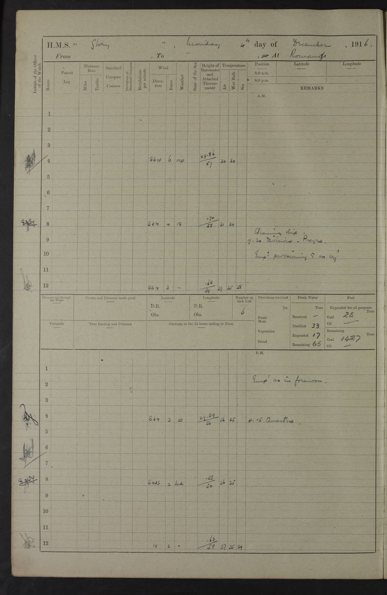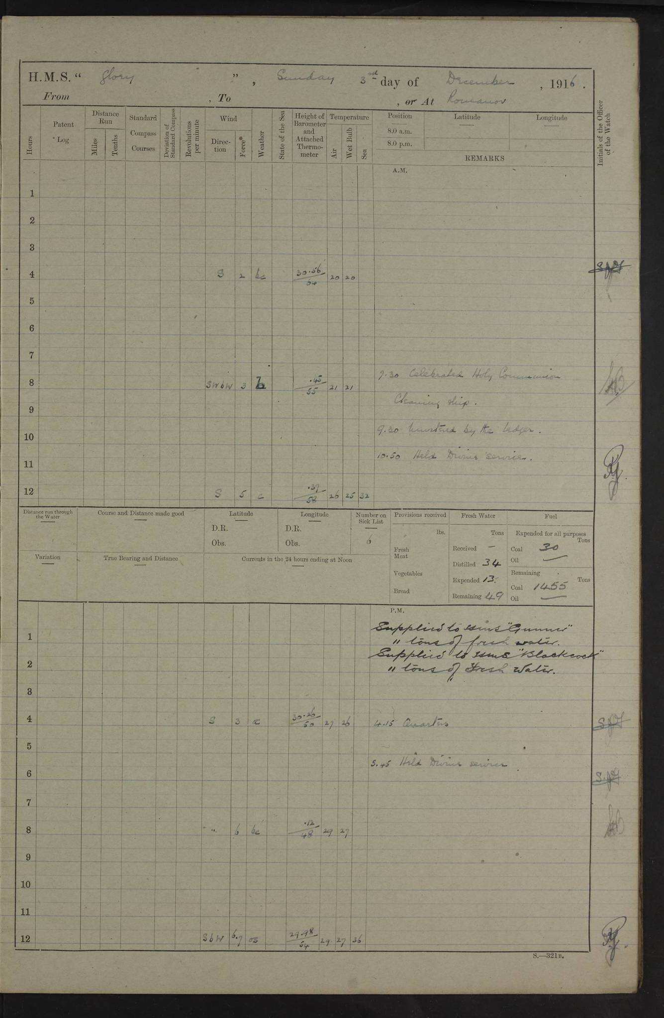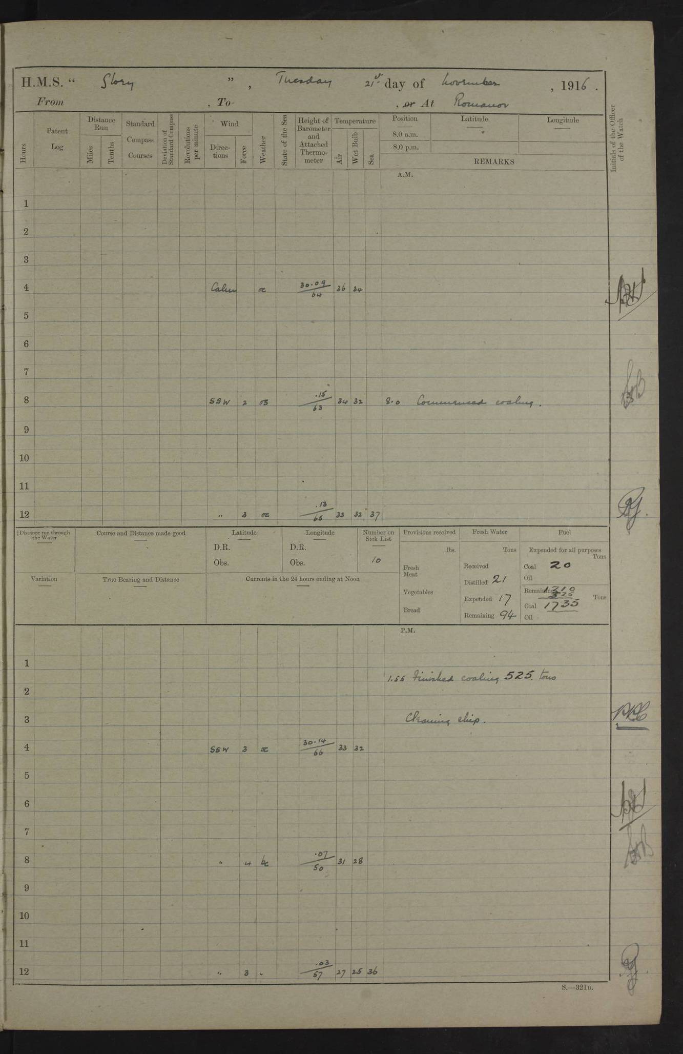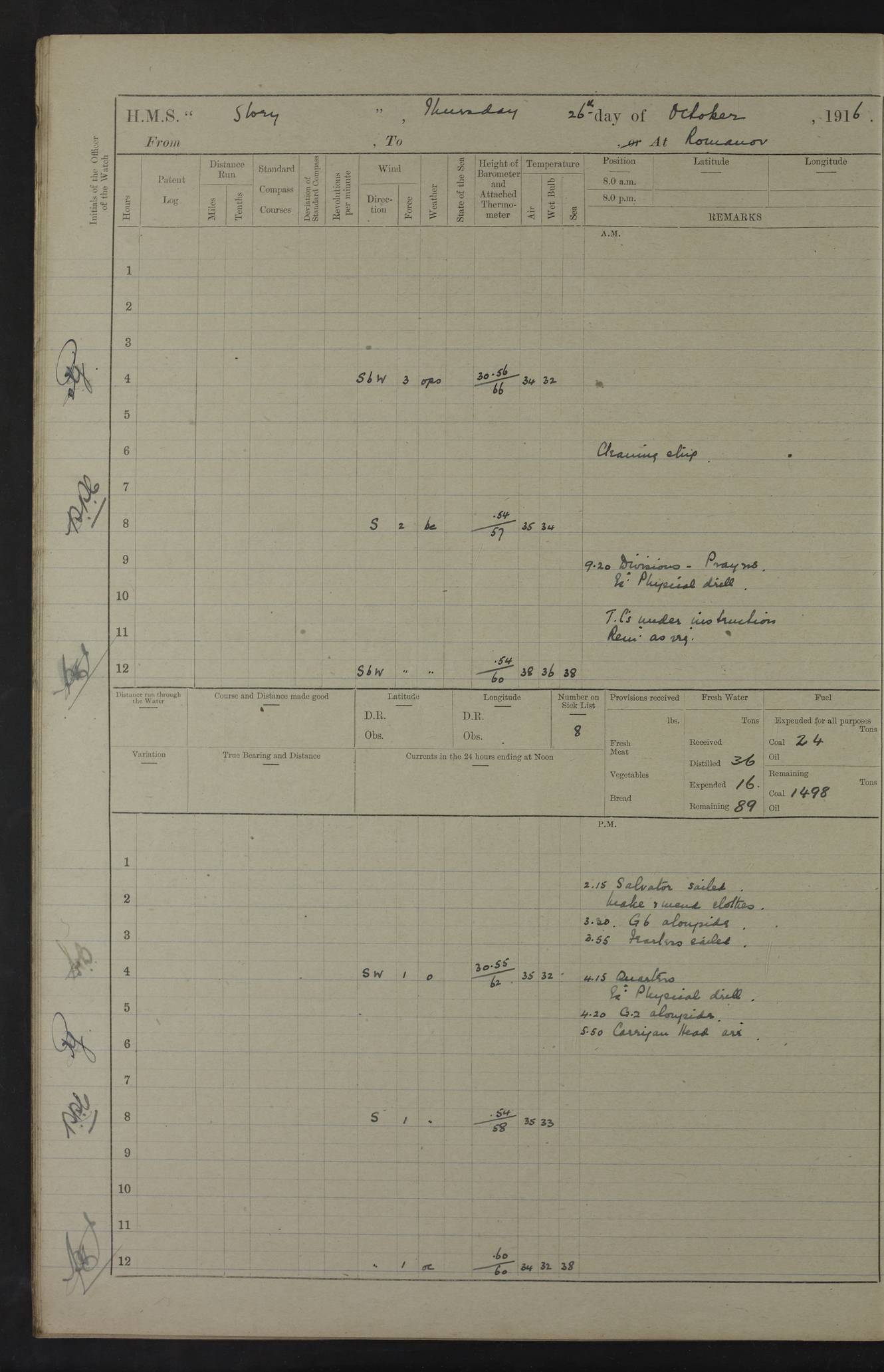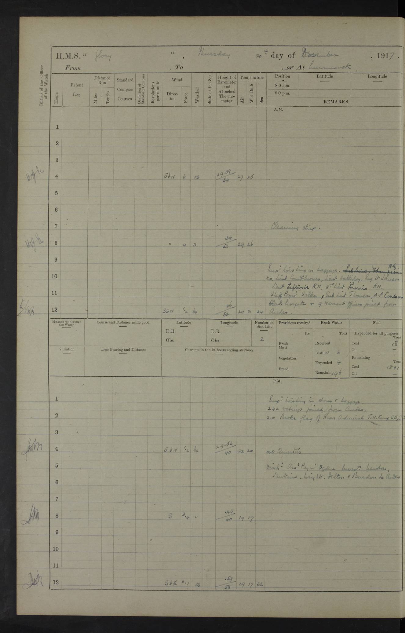 LOGS FOR OCTOBER 1916 For the period covered by the remainder of these logs (1 October, 1916 to 31 December 1918), HMS Glory was based at Murmansk, northern Russia. The city had a variety of names in the early 20th Century – including, Port Murman, Romanov and Murmansk. The location will be given in these pages as Murmansk, the modern name. A history of Murmansk’s names is available at http://en.wikipedia.org/wiki/Murmansk . 4f961482a2fc8e2def0011c7: (http://s3.amazonaws.com/oldweather/ADM53-43026/ADM 53-43026-001_0.jpg) This log is to be kept in a cover in future 4f961482a2fc8e2def0011c8: (http://s3.amazonaws.com/oldweather/ADM53-43026/ADM 53-43026-001_1.jpg) 4f961482a2fc8e2def0011c9: (http://s3.amazonaws.com/oldweather/ADM53-43026/ADM 53-43026-002_0.jpg) 4f961483a2fc8e2def0011ca: (http://s3.amazonaws.com/oldweather/ADM53-43026/ADM 53-43026-002_1.jpg) 4f961483a2fc8e2def0011cb: (http://s3.amazonaws.com/oldweather/ADM53-43026/ADM 53-43026-003_0.jpg) 4f961483a2fc8e2def0011cc: (http://s3.amazonaws.com/oldweather/ADM53-43026/ADM 53-43026-003_1.jpg) 1 October 1916 Murmansk Lat 69.03, Long 33.05 5.40am: Russian auxiliary Kolgiev sailed. Information regarding this vessel (or similar name) has not been found. 7.30am: Celebrated Holy Communion. am: Party working in Earl Essex. Earl Essex was a hired trawler of 225 grt, built, in 1914. Sourced from F.J. Dittmar & J.J. Colledge (1972) – British warships 1914–1919, Ian Allan. 10.45am: Held Divine Service. 11.30am: Celebrated Holy Communion. 4.45pm: Out nets. 4f961484a2fc8e2def0011cd: (http://s3.amazonaws.com/oldweather/ADM53-43026/ADM 53-43026-004_0.jpg) 2 October 1916 Murmansk Lat 69.03, Long 33.05 am: Party working in Earl Essex. 11.30am: Paid quarterly settlement. 6.15pm: Kolgiev arrived. 4f961484a2fc8e2def0011ce: (http://s3.amazonaws.com/oldweather/ADM53-43026/ADM 53-43026-004_1.jpg) 3 October 1916 Murmansk Lat 69.03, Long 33.05 Number on sick list: 9 9.20am: Aft port nets. 11.30am: Russian TBs Goorovoi and Plasteevyi(?) arrived. The first of these TBs is possibly ‘Grosovoi’, built at Le Havre around 1900. Her fate is unclear. The name of the second vessel is possibly incorrect, but no near match has been found. 1.30pm: Out port nets. 4f961484a2fc8e2def0011cf: (http://s3.amazonaws.com/oldweather/ADM53-43026/ADM 53-43026-005_0.jpg) 4 October 1916 Murmansk Lat 69.03, Long 33.05 8.30am: Salvator - broad pendant of Commodore T.W. Kemp arrived. Salvator (ex–Katoomba) was a hired yacht of 684 tons gross, built in 1903. She served as the Heliopolis in WW2. Details at WW1NavyBritishShips-Dittmar4AP.htm . 9.25am: Aft port nets. 11.05am: HE the Minister of Marine visited ship. 11.30am: Out port nets. 11.50am: Russian auxiliary Gotowsci(?) arrived. 12 noon: Kolgiev sailed. pm: HM Tug Blackcock arrived. Blackcock was a hired patrol tug, built in 1886 and wrecked on 18 January, 1918, in the White Sea. Sourced from F.J. Dittmar & J.J. Colledge (1972) – British warships 1914–1919, Ian Allan. 6.50pm: Kolgiev arrived. 4f961485a2fc8e2def0011d0: (http://s3.amazonaws.com/oldweather/ADM53-43026/ADM 53-43026-005_1.jpg) 5 October 1916 Murmansk Lat 69.03, Long 33.05 10.35am: Kolgiev sailed. 1.05pm: Salvator sailed. pm: Read Warrant No. 5. 4f961485a2fc8e2def0011d1: (http://s3.amazonaws.com/oldweather/ADM53-43026/ADM 53-43026-006_0.jpg) 6 October 1916 Murmansk Lat 69.03, Long 33.05 pm: 5 tons of water supplied to Blackcock. 3.30pm: Action. 3.45pm: Secure. Russian T.B's Grosovoi and Plasteevyi sailed. 4f961485a2fc8e2def0011d2: (http://s3.amazonaws.com/oldweather/ADM53-43026/ADM 53-43026-006_1.jpg) 7 October 1916 Murmansk Lat 69.03, Long 33.05 am: Party coaling trawler. am: Tested life buoys – correct. 4f961486a2fc8e2def0011d3: (http://s3.amazonaws.com/oldweather/ADM53-43026/ADM 53-43026-007_0.jpg) 8 October 1916 Murmansk Lat 69.03, Long 33.05 6.45am: Party working in collier. 7.30am: Celebrated Holy Communion. 10.45am: Held Divine service. 5.45pm: Held Divine Service. 4f961486a2fc8e2def0011d4: (http://s3.amazonaws.com/oldweather/ADM53-43026/ADM 53-43026-007_1.jpg) 9 October 1916 Murmansk Lat 69.03, Long 33.05 Number on sick list: 9 am: Exercised fire stations. am: 2nd pinnace patrolling. pm: Landed marines for drill. 4f961486a2fc8e2def0011d5: (http://s3.amazonaws.com/oldweather/ADM53-43026/ADM 53-43026-008_0.jpg) 10 October 1916 Murmansk Lat 69.03, Long 33.05 am: Steam pinnace patrolling. 1.55pm: Kolgiev arrived. 4f961487a2fc8e2def0011d6: (http://s3.amazonaws.com/oldweather/ADM53-43026/ADM 53-43026-008_1.jpg) 11 October 1916 Murmansk Lat 69.03, Long 33.05 am: Party working on boom defence. am: MT and QD men aired bedding. am: Marines at drill. 1.50pm: Kolgiev sailed. 3.15pm: British tug Racia (lighter ES 23 in tow) arrived. Racia was a hired screw tug of 410 grt, built in 1894 and sold on 23 June, 1920. Sourced from F.J. Dittmar & J.J. Colledge (1972) – British warships 1914–1919, Ian Allan. 4f961487a2fc8e2def0011d7: (http://s3.amazonaws.com/oldweather/ADM53-43026/ADM 53-43026-009_0.jpg) 12 October 1916 Murmansk Lat 69.03, Long 33.05 Number on sick list: 6 am: Party working on boom defence. am: Steam pinnace patrolling. pm: Make and mend clothes. 4.15pm: Read warrant No. 6. 6.00pm: Imperator Nicolas arrived. A vessel with this name has not been traced. 4f961487a2fc8e2def0011d8: (http://s3.amazonaws.com/oldweathe/ADM53-43026/ADM 53-43026-009_1.jpg) 13 October 1916 Murmansk Lat 69.03, Long 33.05 am: Steam pinnace patrolling. am: Party working on boom defence. am: Found foc’sle awning and side screens damaged by rats. 4f961488a2fc8e2def0011d9: (http://s3.amazonaws.com/oldweather/ADM53-43026/ADM 53-43026-010_0.jpg) 14 August 1916 (probably should read October) Murmansk Lat 69.03, Long 33.05 Number on sick list: 7 6.45am: Racia (floating crane in tow) sailed. am: Party working on boom defence. am: Tested life buoys – correct. 3.00pm: Vindictive arrived. HMS Vindictive was a protected cruiser of the Arrogant class, launched in 1897 at Chatham Dockyar