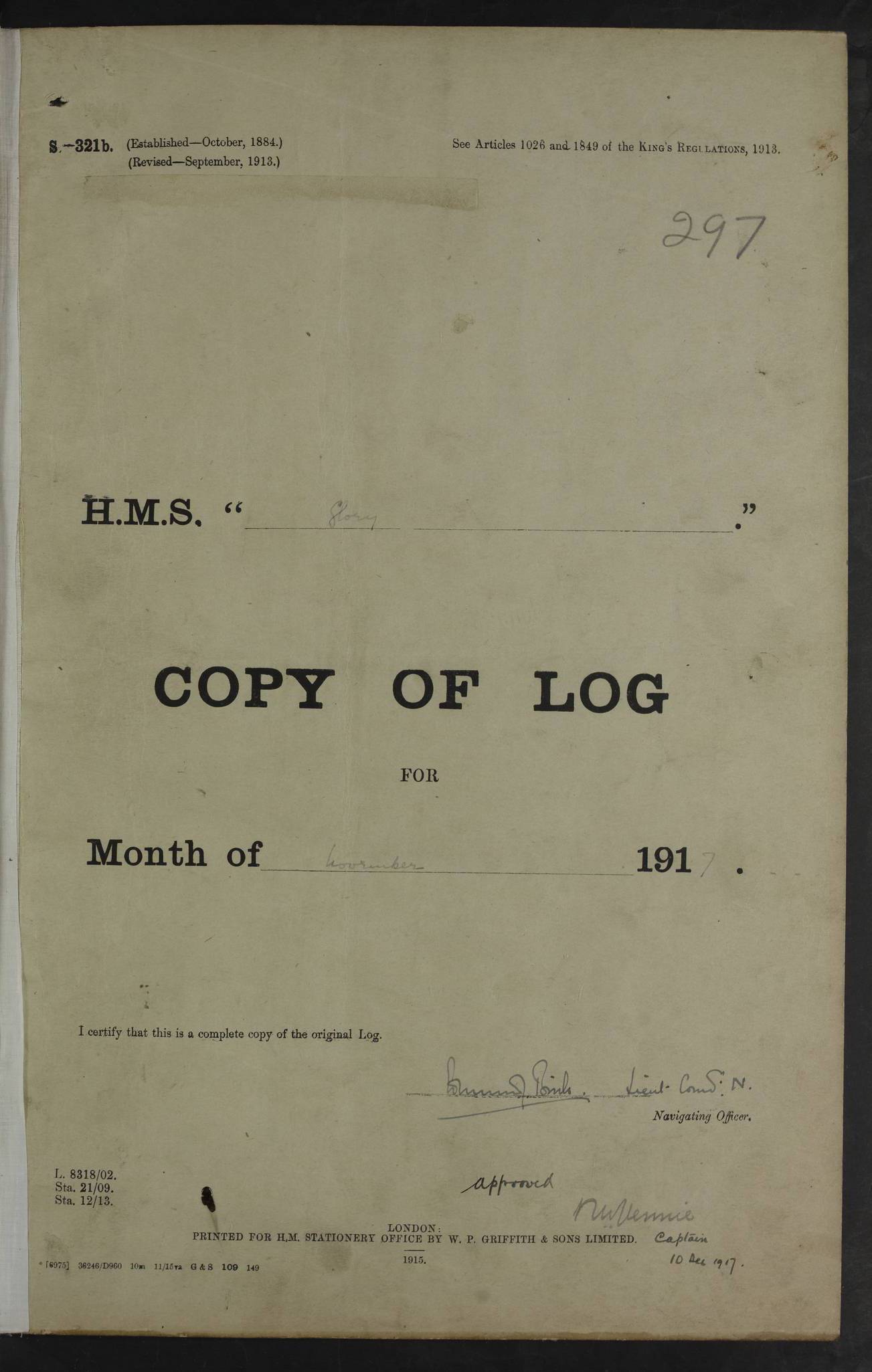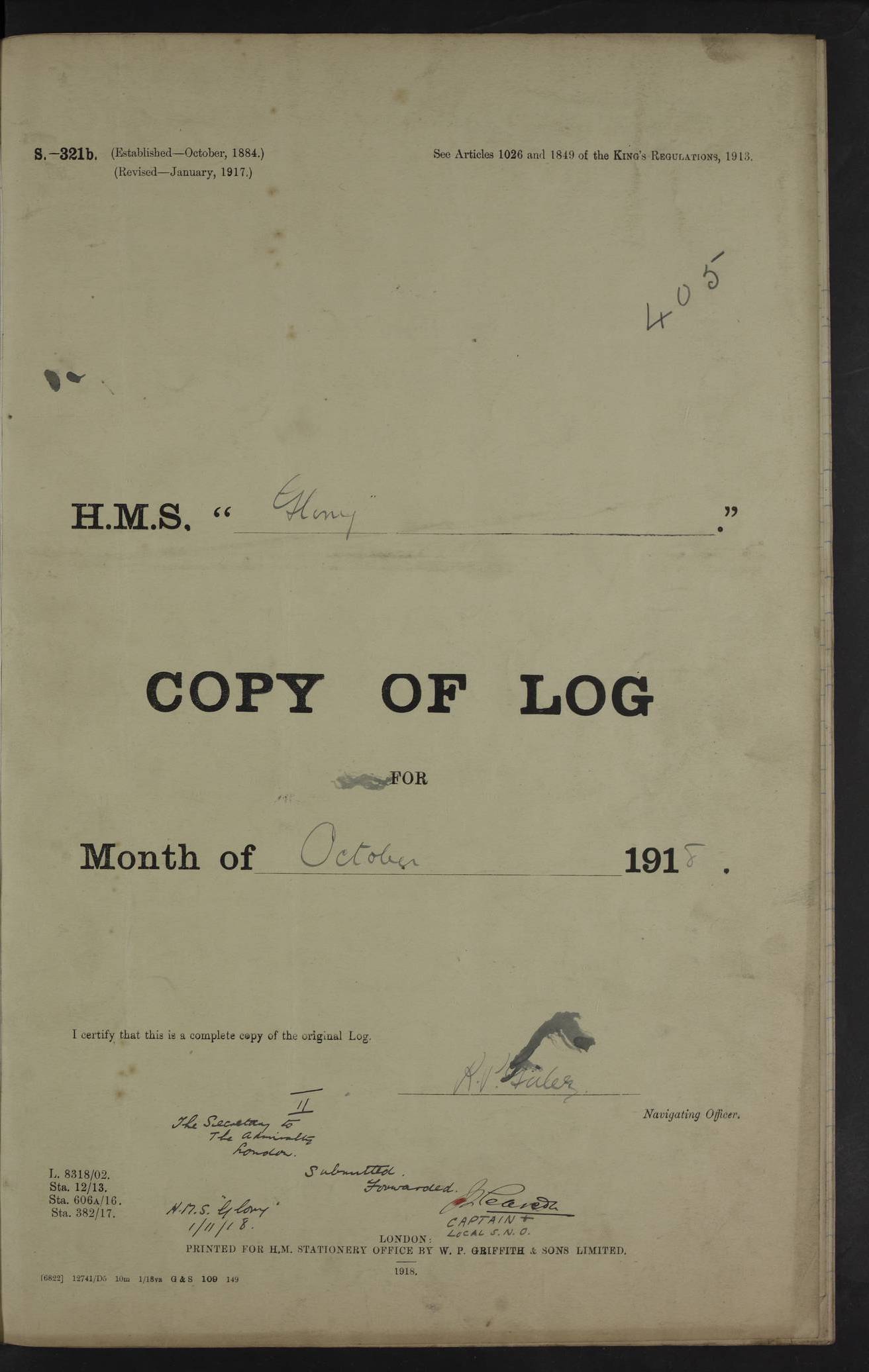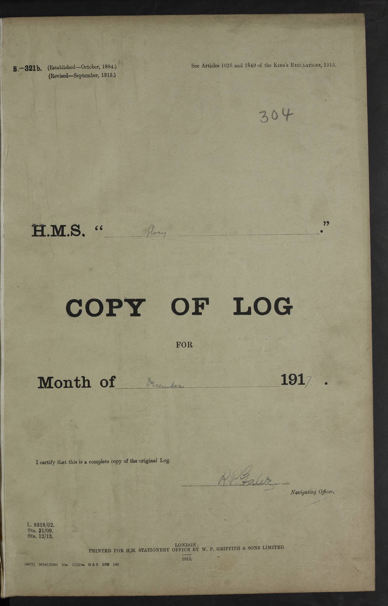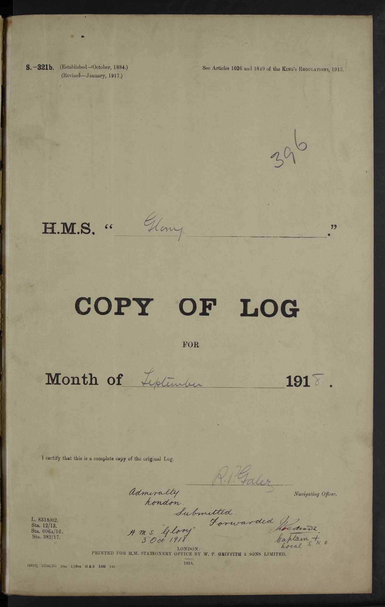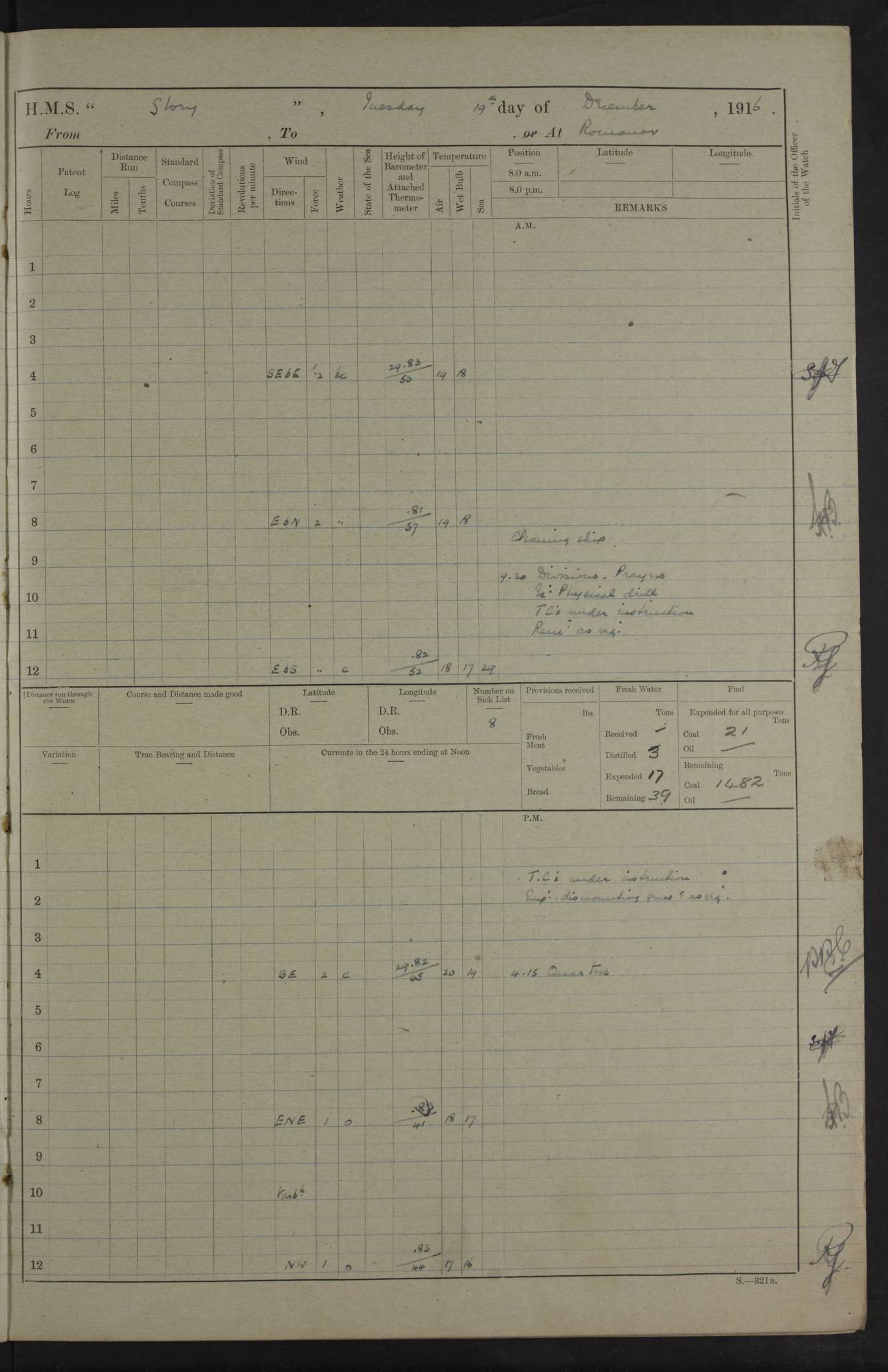 LOGS FOR OCTOBER 1916 For the period covered by the remainder of these logs (1 October, 1916 to 31 December 1918), HMS Glory was based at Murmansk, northern Russia. The city had a variety of names in the early 20th Century – including, Port Murman, Romanov and Murmansk. The location will be given in these pages as Murmansk, the modern name. A history of Murmansk’s names is available at http://en.wikipedia.org/wiki/Murmansk . 4f961482a2fc8e2def0011c7: (http://s3.amazonaws.com/oldweather/ADM53-43026/ADM 53-43026-001_0.jpg) This log is to be kept in a cover in future 4f961482a2fc8e2def0011c8: (http://s3.amazonaws.com/oldweather/ADM53-43026/ADM 53-43026-001_1.jpg) 4f961482a2fc8e2def0011c9: (http://s3.amazonaws.com/oldweather/ADM53-43026/ADM 53-43026-002_0.jpg) 4f961483a2fc8e2def0011ca: (http://s3.amazonaws.com/oldweather/ADM53-43026/ADM 53-43026-002_1.jpg) 4f961483a2fc8e2def0011cb: (http://s3.amazonaws.com/oldweather/ADM53-43026/ADM 53-43026-003_0.jpg) 4f961483a2fc8e2def0011cc: (http://s3.amazonaws.com/oldweather/ADM53-43026/ADM 53-43026-003_1.jpg) 1 October 1916 Murmansk Lat 69.03, Long 33.05 5.40am: Russian auxiliary Kolgiev sailed. Information regarding this vessel (or similar name) has not been found. 7.30am: Celebrated Holy Communion. am: Party working in Earl Essex. Earl Essex was a hired trawler of 225 grt, built, in 1914. Sourced from F.J. Dittmar & J.J. Colledge (1972) – British warships 1914–1919, Ian Allan. 10.45am: Held Divine Service. 11.30am: Celebrated Holy Communion. 4.45pm: Out nets. 4f961484a2fc8e2def0011cd: (http://s3.amazonaws.com/oldweather/ADM53-43026/ADM 53-43026-004_0.jpg) 2 October 1916 Murmansk Lat 69.03, Long 33.05 am: Party working in Earl Essex. 11.30am: Paid quarterly settlement. 6.15pm: Kolgiev arrived. 4f961484a2fc8e2def0011ce: (http://s3.amazonaws.com/oldweather/ADM53-43026/ADM 53-43026-004_1.jpg) 3 October 1916 Murmansk Lat 69.03, Long 33.05 Number on sick list: 9 9.20am: Aft port nets. 11.30am: Russian TBs Goorovoi and Plasteevyi(?) arrived. The first of these TBs is possibly ‘Grosovoi’, built at Le Havre around 1900. Her fate is unclear. The name of the second vessel is possibly incorrect, but no near match has been found. 1.30pm: Out port nets. 4f961484a2fc8e2def0011cf: (http://s3.amazonaws.com/oldweather/ADM53-43026/ADM 53-43026-005_0.jpg) 4 October 1916 Murmansk Lat 69.03, Long 33.05 8.30am: Salvator - broad pendant of Commodore T.W. Kemp arrived. Salvator (ex–Katoomba) was a hired yacht of 684 tons gross, built in 1903. She served as the Heliopolis in WW2. Details at WW1NavyBritishShips-Dittmar4AP.htm . 9.25am: Aft port nets. 11.05am: HE the Minister of Marine visited ship. 11.30am: Out port nets. 11.50am: Russian auxiliary Gotowsci(?) arrived. 12 noon: Kolgiev sailed. pm: HM Tug Blackcock arrived. Blackcock was a hired patrol tug, built in 1886 and wrecked on 18 January, 1918, in the White Sea. Sourced from F.J. Dittmar & J.J. Colledge (1972) – British warships 1914–1919, Ian Allan. 6.50pm: Kolgiev arrived. 4f961485a2fc8e2def0011d0: (http://s3.amazonaws.com/oldweather/ADM53-43026/ADM 53-43026-005_1.jpg) 5 October 1916 Murmansk Lat 69.03, Long 33.05 10.35am: Kolgiev sailed. 1.05pm: Salvator sailed. pm: Read Warrant No. 5. 4f961485a2fc8e2def0011d1: (http://s3.amazonaws.com/oldweather/ADM53-43026/ADM 53-43026-006_0.jpg) 6 October 1916 Murmansk Lat 69.03, Long 33.05 pm: 5 tons of water supplied to Blackcock. 3.30pm: Action. 3.45pm: Secure. Russian T.B's Grosovoi and Plasteevyi sailed. 4f961485a2fc8e2def0011d2: (http://s3.amazonaws.com/oldweather/ADM53-43026/ADM 53-43026-006_1.jpg) 7 October 1916 Murmansk Lat 69.03, Long 33.05 am: Party coaling trawler. am: Tested life buoys – correct. 4f961486a2fc8e2def0011d3: (http://s3.amazonaws.com/oldweather/ADM53-43026/ADM 53-43026-007_0.jpg) 8 October 1916 Murmansk Lat 69.03, Long 33.05 6.45am: Party working in collier. 7.30am: Celebrated Holy Communion. 10.45am: Held Divine service. 5.45pm: Held Divine Service. 4f961486a2fc8e2def0011d4: (http://s3.amazonaws.com/oldweather/ADM53-43026/ADM 53-43026-007_1.jpg) 9 October 1916 Murmansk Lat 69.03, Long 33.05 Number on sick list: 9 am: Exercised fire stations. am: 2nd pinnace patrolling. pm: Landed marines for drill. 4f961486a2fc8e2def0011d5: (http://s3.amazonaws.com/oldweather/ADM53-43026/ADM 53-43026-008_0.jpg) 10 October 1916 Murmansk Lat 69.03, Long 33.05 am: Steam pinnace patrolling. 1.55pm: Kolgiev arrived. 4f961487a2fc8e2def0011d6: (http://s3.amazonaws.com/oldweather/ADM53-43026/ADM 53-43026-008_1.jpg) 11 October 1916 Murmansk Lat 69.03, Long 33.05 am: Party working on boom defence. am: MT and QD men aired bedding. am: Marines at drill. 1.50pm: Kolgiev sailed. 3.15pm: British tug Racia (lighter ES 23 in tow) arrived. Racia was a hired screw tug of 410 grt, built in 1894 and sold on 23 June, 1920. Sourced from F.J. Dittmar & J.J. Colledge (1972) – British warships 1914–1919, Ian Allan. 4f961487a2fc8e2def0011d7: (http://s3.amazonaws.com/oldweather/ADM53-43026/ADM 53-43026-009_0.jpg) 12 October 1916 Murmansk Lat 69.03, Long 33.05 Number on sick list: 6 am: Party working on boom defence. am: Steam pinnace patrolling. pm: Make and mend clothes. 4.15pm: Read warrant No. 6. 6.00pm: Imperator Nicolas arrived. A vessel with this name has not been traced. 4f961487a2fc8e2def0011d8: (http://s3.amazonaws.com/oldweathe/ADM53-43026/ADM 53-43026-009_1.jpg) 13 October 1916 Murmansk Lat 69.03, Long 33.05 am: Steam pinnace patrolling. am: Party working on boom defence. am: Found foc’sle awning and side screens damaged by rats. 4f961488a2fc8e2def0011d9: (http://s3.amazonaws.com/oldweather/ADM53-43026/ADM 53-43026-010_0.jpg) 14 August 1916 (probably should read October) Murmansk Lat 69.03, Long 33.05 Number on sick list: 7 6.45am: Racia (floating crane in tow) sailed. am: Party working on boom defence. am: Tested life buoys – correct. 3.00pm: Vindictive arrived. HMS Vindictive was a protected cruiser of the Arrogant class, launched in 1897 at Chatham Dockyar