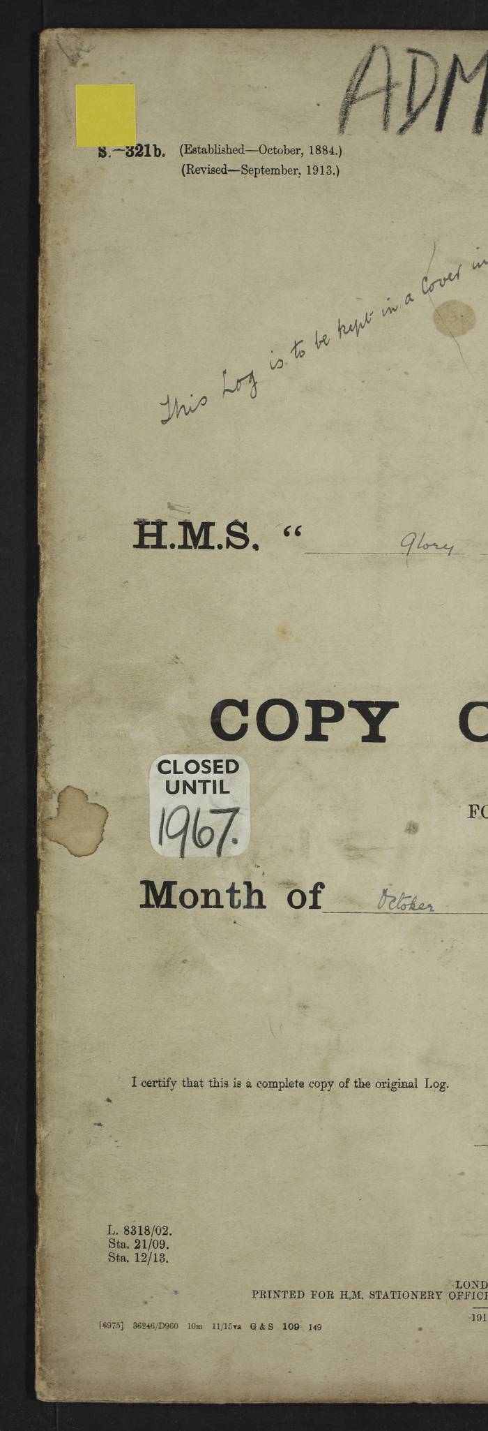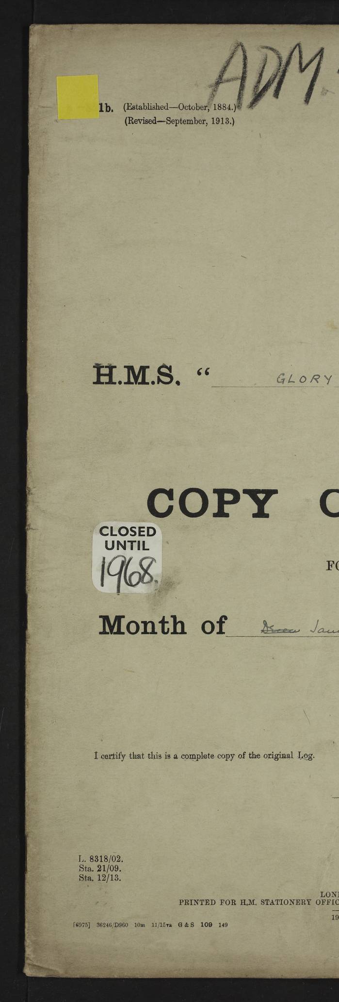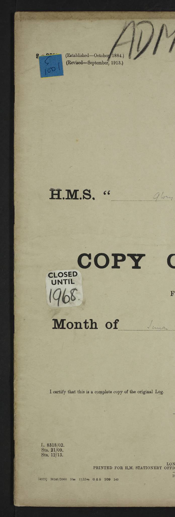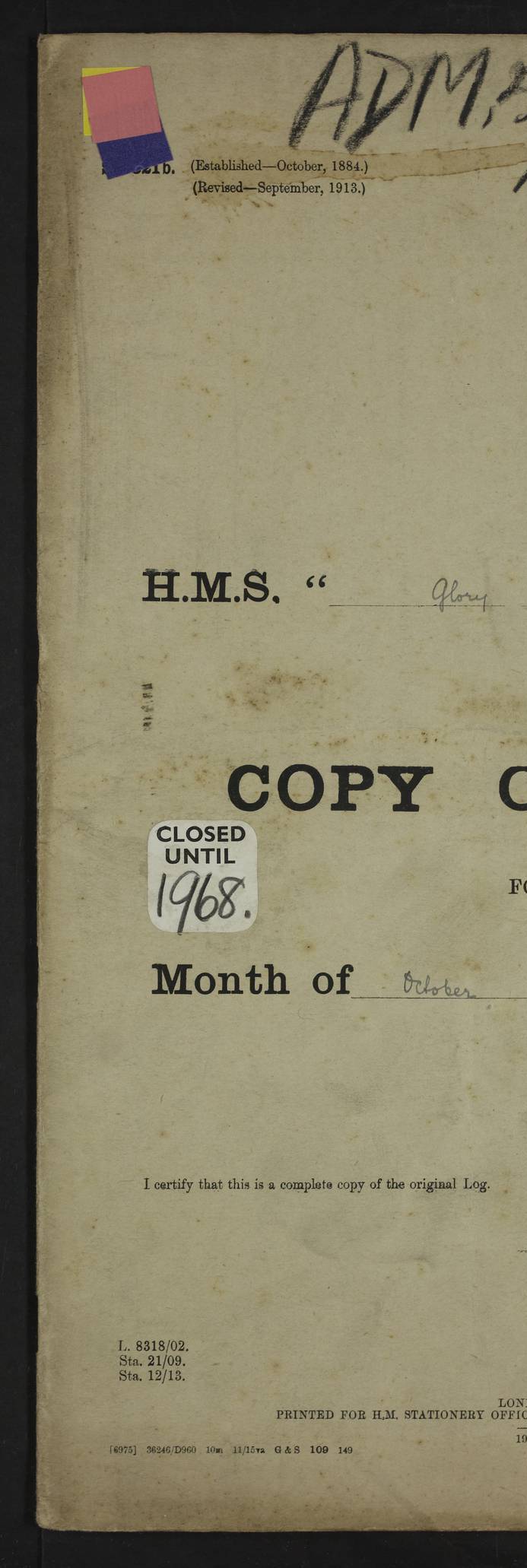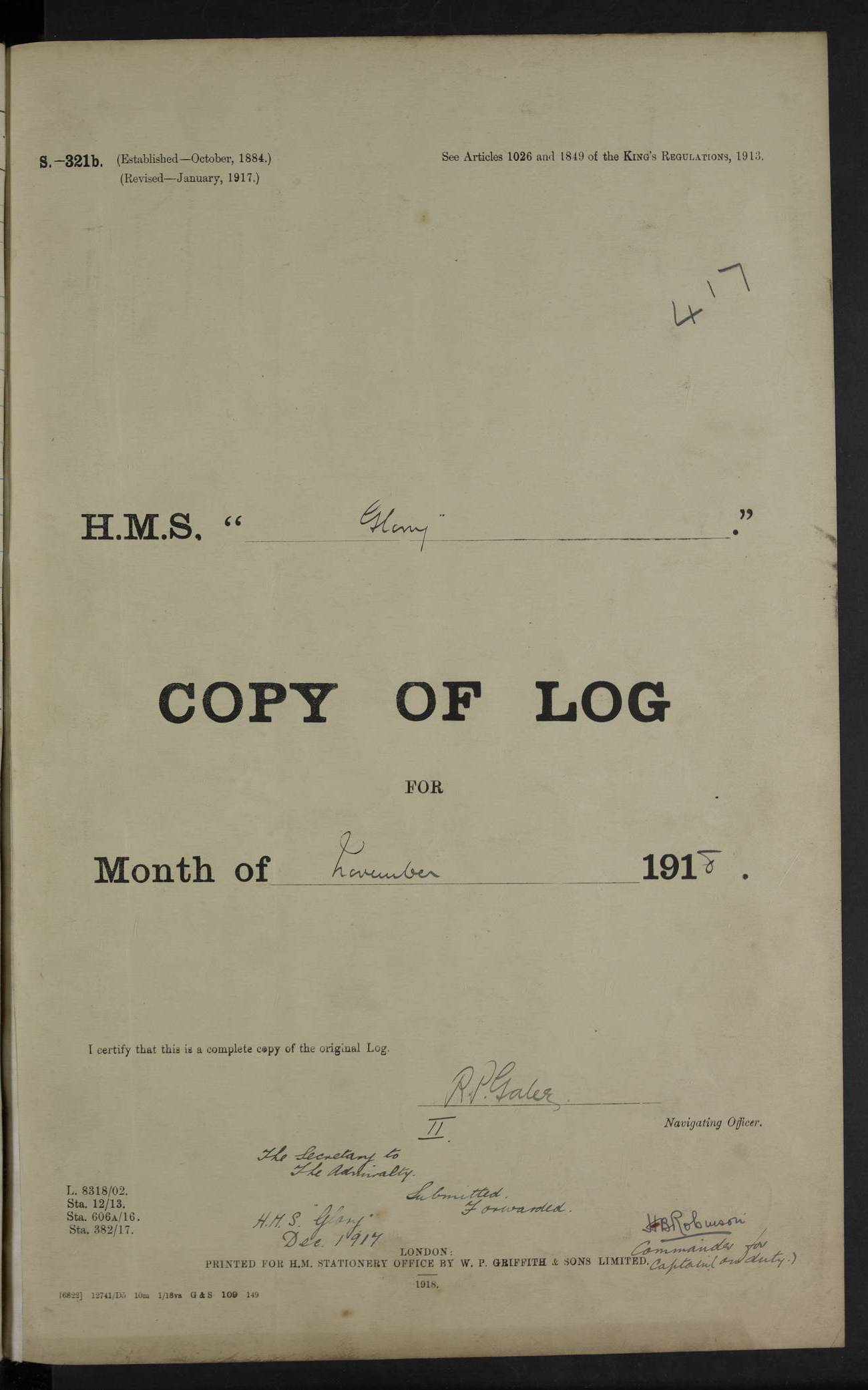 LOGS FOR OCTOBER 1916 For the period covered by the remainder of these logs (1 October, 1916 to 31 December 1918), HMS Glory was based at Murmansk, northern Russia. The city had a variety of names in the early 20th Century – including, Port Murman, Romanov and Murmansk. The location will be given in these pages as Murmansk, the modern name. A history of Murmansk’s names is available at http://en.wikipedia.org/wiki/Murmansk . 4f961482a2fc8e2def0011c7: (http://s3.amazonaws.com/oldweather/ADM53-43026/ADM 53-43026-001_0.jpg) This log is to be kept in a cover in future 4f961482a2fc8e2def0011c8: (http://s3.amazonaws.com/oldweather/ADM53-43026/ADM 53-43026-001_1.jpg) 4f961482a2fc8e2def0011c9: (http://s3.amazonaws.com/oldweather/ADM53-43026/ADM 53-43026-002_0.jpg) 4f961483a2fc8e2def0011ca: (http://s3.amazonaws.com/oldweather/ADM53-43026/ADM 53-43026-002_1.jpg) 4f961483a2fc8e2def0011cb: (http://s3.amazonaws.com/oldweather/ADM53-43026/ADM 53-43026-003_0.jpg) 4f961483a2fc8e2def0011cc: (http://s3.amazonaws.com/oldweather/ADM53-43026/ADM 53-43026-003_1.jpg) 1 October 1916 Murmansk Lat 69.03, Long 33.05 5.40am: Russian auxiliary Kolgiev sailed. Information regarding this vessel (or similar name) has not been found. 7.30am: Celebrated Holy Communion. am: Party working in Earl Essex. Earl Essex was a hired trawler of 225 grt, built, in 1914. Sourced from F.J. Dittmar & J.J. Colledge (1972) – British warships 1914–1919, Ian Allan. 10.45am: Held Divine Service. 11.30am: Celebrated Holy Communion. 4.45pm: Out nets. 4f961484a2fc8e2def0011cd: (http://s3.amazonaws.com/oldweather/ADM53-43026/ADM 53-43026-004_0.jpg) 2 October 1916 Murmansk Lat 69.03, Long 33.05 am: Party working in Earl Essex. 11.30am: Paid quarterly settlement. 6.15pm: Kolgiev arrived. 4f961484a2fc8e2def0011ce: (http://s3.amazonaws.com/oldweather/ADM53-43026/ADM 53-43026-004_1.jpg) 3 October 1916 Murmansk Lat 69.03, Long 33.05 Number on sick list: 9 9.20am: Aft port nets. 11.30am: Russian TBs Goorovoi and Plasteevyi(?) arrived. The first of these TBs is possibly ‘Grosovoi’, built at Le Havre around 1900. Her fate is unclear. The name of the second vessel is possibly incorrect, but no near match has been found. 1.30pm: Out port nets. 4f961484a2fc8e2def0011cf: (http://s3.amazonaws.com/oldweather/ADM53-43026/ADM 53-43026-005_0.jpg) 4 October 1916 Murmansk Lat 69.03, Long 33.05 8.30am: Salvator - broad pendant of Commodore T.W. Kemp arrived. Salvator (ex–Katoomba) was a hired yacht of 684 tons gross, built in 1903. She served as the Heliopolis in WW2. Details at WW1NavyBritishShips-Dittmar4AP.htm . 9.25am: Aft port nets. 11.05am: HE the Minister of Marine visited ship. 11.30am: Out port nets. 11.50am: Russian auxiliary Gotowsci(?) arrived. 12 noon: Kolgiev sailed. pm: HM Tug Blackcock arrived. Blackcock was a hired patrol tug, built in 1886 and wrecked on 18 January, 1918, in the White Sea. Sourced from F.J. Dittmar & J.J. Colledge (1972) – British warships 1914–1919, Ian Allan. 6.50pm: Kolgiev arrived. 4f961485a2fc8e2def0011d0: (http://s3.amazonaws.com/oldweather/ADM53-43026/ADM 53-43026-005_1.jpg) 5 October 1916 Murmansk Lat 69.03, Long 33.05 10.35am: Kolgiev sailed. 1.05pm: Salvator sailed. pm: Read Warrant No. 5. 4f961485a2fc8e2def0011d1: (http://s3.amazonaws.com/oldweather/ADM53-43026/ADM 53-43026-006_0.jpg) 6 October 1916 Murmansk Lat 69.03, Long 33.05 pm: 5 tons of water supplied to Blackcock. 3.30pm: Action. 3.45pm: Secure. Russian T.B's Grosovoi and Plasteevyi sailed. 4f961485a2fc8e2def0011d2: (http://s3.amazonaws.com/oldweather/ADM53-43026/ADM 53-43026-006_1.jpg) 7 October 1916 Murmansk Lat 69.03, Long 33.05 am: Party coaling trawler. am: Tested life buoys – correct. 4f961486a2fc8e2def0011d3: (http://s3.amazonaws.com/oldweather/ADM53-43026/ADM 53-43026-007_0.jpg) 8 October 1916 Murmansk Lat 69.03, Long 33.05 6.45am: Party working in collier. 7.30am: Celebrated Holy Communion. 10.45am: Held Divine service. 5.45pm: Held Divine Service. 4f961486a2fc8e2def0011d4: (http://s3.amazonaws.com/oldweather/ADM53-43026/ADM 53-43026-007_1.jpg) 9 October 1916 Murmansk Lat 69.03, Long 33.05 Number on sick list: 9 am: Exercised fire stations. am: 2nd pinnace patrolling. pm: Landed marines for drill. 4f961486a2fc8e2def0011d5: (http://s3.amazonaws.com/oldweather/ADM53-43026/ADM 53-43026-008_0.jpg) 10 October 1916 Murmansk Lat 69.03, Long 33.05 am: Steam pinnace patrolling. 1.55pm: Kolgiev arrived. 4f961487a2fc8e2def0011d6: (http://s3.amazonaws.com/oldweather/ADM53-43026/ADM 53-43026-008_1.jpg) 11 October 1916 Murmansk Lat 69.03, Long 33.05 am: Party working on boom defence. am: MT and QD men aired bedding. am: Marines at drill. 1.50pm: Kolgiev sailed. 3.15pm: British tug Racia (lighter ES 23 in tow) arrived. Racia was a hired screw tug of 410 grt, built in 1894 and sold on 23 June, 1920. Sourced from F.J. Dittmar & J.J. Colledge (1972) – British warships 1914–1919, Ian Allan. 4f961487a2fc8e2def0011d7: (http://s3.amazonaws.com/oldweather/ADM53-43026/ADM 53-43026-009_0.jpg) 12 October 1916 Murmansk Lat 69.03, Long 33.05 Number on sick list: 6 am: Party working on boom defence. am: Steam pinnace patrolling. pm: Make and mend clothes. 4.15pm: Read warrant No. 6. 6.00pm: Imperator Nicolas arrived. A vessel with this name has not been traced. 4f961487a2fc8e2def0011d8: (http://s3.amazonaws.com/oldweathe/ADM53-43026/ADM 53-43026-009_1.jpg) 13 October 1916 Murmansk Lat 69.03, Long 33.05 am: Steam pinnace patrolling. am: Party working on boom defence. am: Found foc’sle awning and side screens damaged by rats. 4f961488a2fc8e2def0011d9: (http://s3.amazonaws.com/oldweather/ADM53-43026/ADM 53-43026-010_0.jpg) 14 August 1916 (probably should read October) Murmansk Lat 69.03, Long 33.05 Number on sick list: 7 6.45am: Racia (floating crane in tow) sailed. am: Party working on boom defence. am: Tested life buoys – correct. 3.00pm: Vindictive arrived. HMS Vindictive was a protected cruiser of the Arrogant class, launched in 1897 at Chatham Dockyar