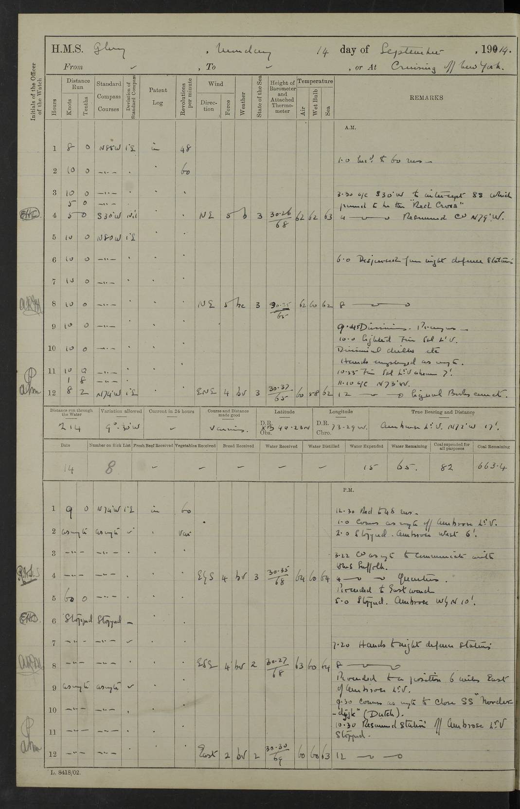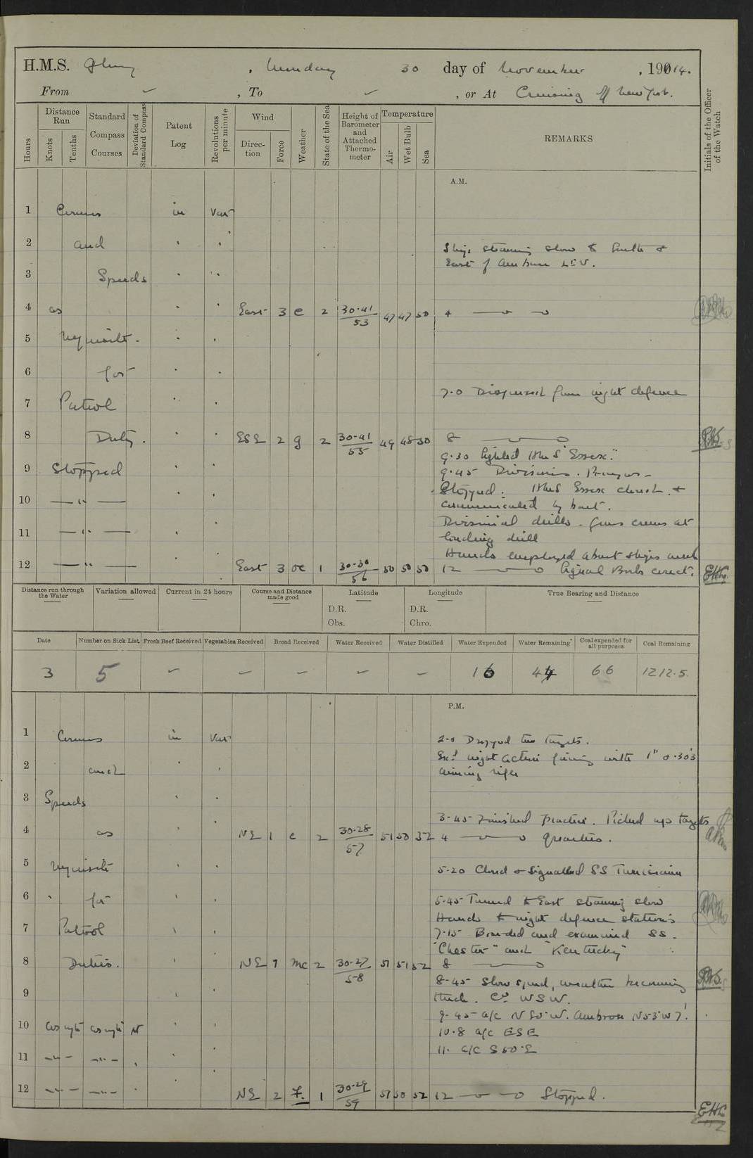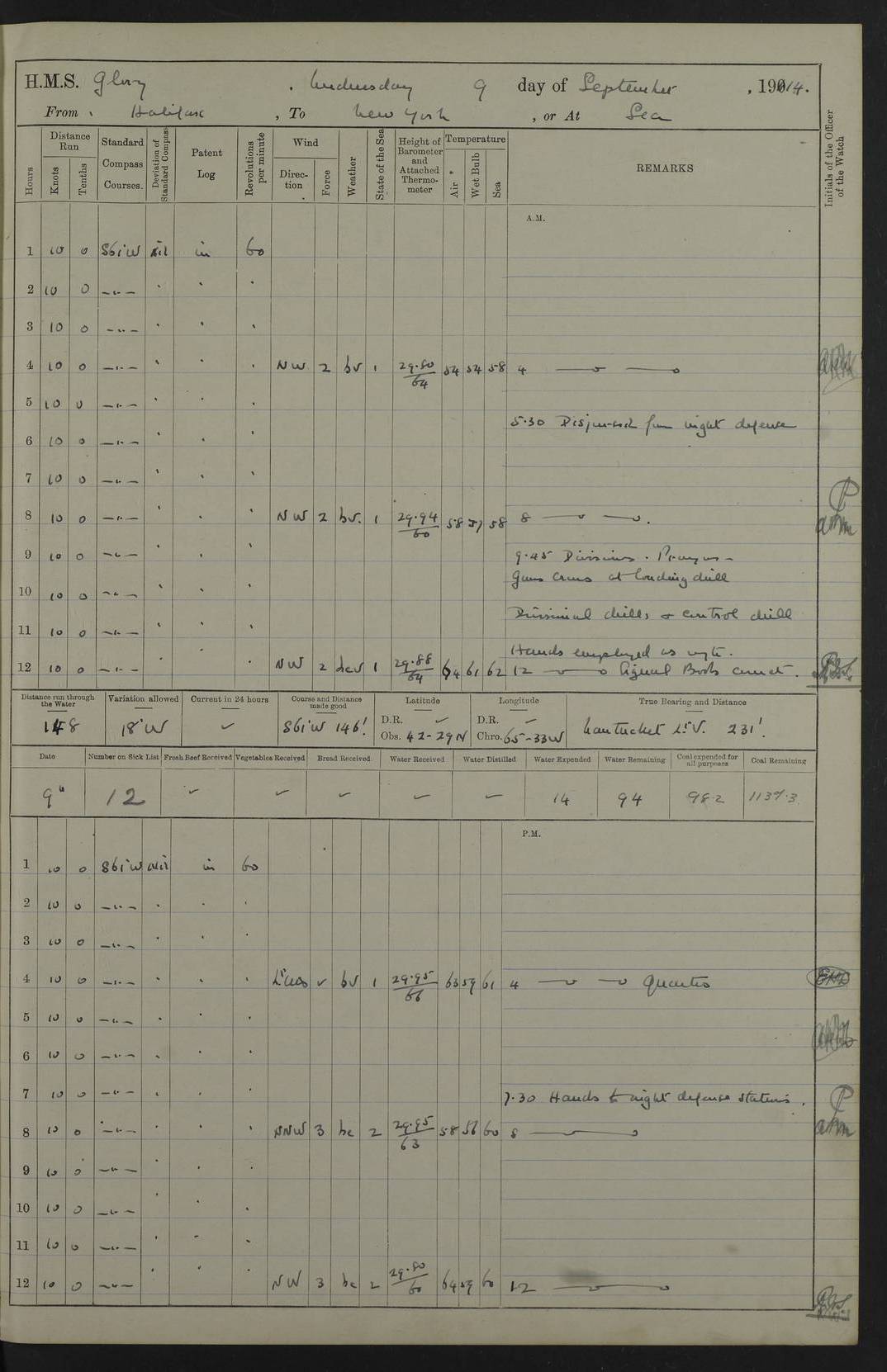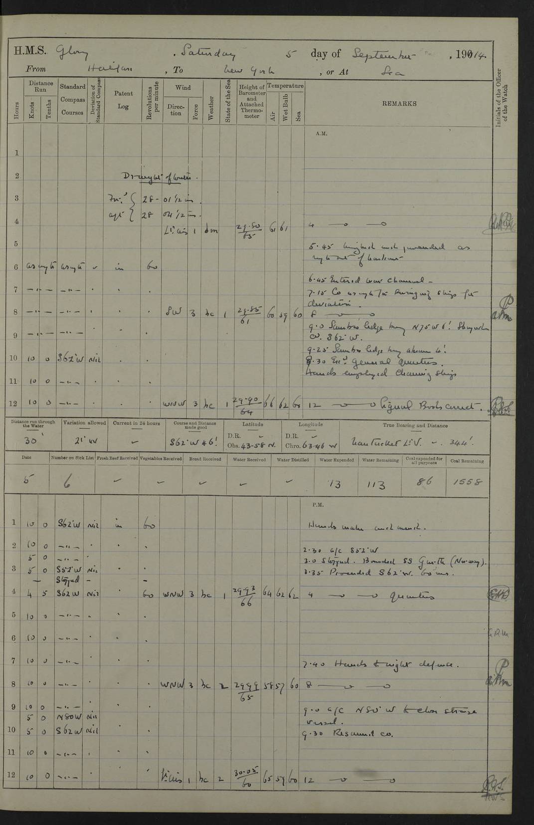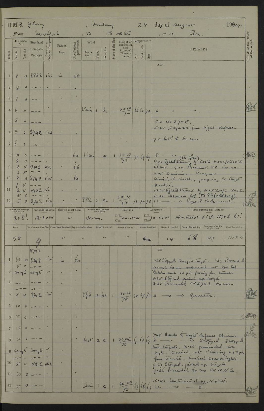 4f73cd06a2fc8ea903001489: (https://s3.amazonaws.com:443/oldweather/ADM53-43011/0072_0.jpg) 17 August 1914 Halifax Lat 44.63, Long -63.55 Number on sick list: 11 6.00am: Commenced coaling from Patent fuel sheds on jetty. 1.30pm: Finished coaling. pm: Washed down upper deck. 4f73cd06a2fc8ea90300148a: (https://s3.amazonaws.com:443/oldweather/ADM53-43011/0072_1.jpg) 18 August 1914 Halifax Lat 44.63, Long -63.55 Number on sick list: 10 4f73cd07a2fc8ea90300148b: (https://s3.amazonaws.com:443/oldweather/ADM53-43011/0073_0.jpg) 19 August 1914 Halifax Lat 44.63, Long -63.55 Number on sick list: 7 5.05am: Slipped from jetty and proceeded as requisite to anchorage in stream. 5.45am: Stopped. Let go Port anchor. am: Preparing for coaling. 9.00am: Collier Brinkwood made fast alongside (Starboard side). 10.10am: Commenced coaling. 9.40pm: Finished coaling. Received 1080 tons. 4f73cd07a2fc8ea90300148c: (https://s3.amazonaws.com:443/oldweather/ADM53-43011/0073_1.jpg) 20 August 1914 Halifax Lat 44.63, Long -63.55 Number on sick list: 7 am: Employed unrigging collier and gear etc. 7.15am: Collier left ship. 5.15pm: Hands to bathe. 4f73cd07a2fc8ea90300148d: (https://s3.amazonaws.com:443/oldweather/ADM53-43011/0074_0.jpg) 21 August 1914 Halifax Lat 44.63, Long -63.55 Number on sick list: 7 pm: Testing gun sights. 8.30pm: Exercised darken ship. 9.15pm: Opened deadlights etc. 4f73cd07a2fc8ea90300148e: (https://s3.amazonaws.com:443/oldweather/ADM53-43011/0074_1.jpg) 22 August 1914 Halifax Lat 44.63, Long -63.55 Number on sick list: 8 am: Aired night clothing. pm: Employed disembarking spare torpedo booms and other gear. pm: Tested lifebuoys. Found correct. 4f73cd08a2fc8ea90300148f: (https://s3.amazonaws.com:443/oldweather/ADM53-43011/0075_0.jpg) 23 August 1914 Halifax and at Sea Lat 44.63, Long -63.55 Number on sick list: 7 10.00am: Held Divine Service on board. am: Preparing for sea. 11.45am: Weighed and proceeded as requisite out of harbour. 12.50pm: Entered War Channel. 3.20pm: a/c S59ºW for rendezvous. 7.25pm: Observed HMS Suffolk 1 pt on starboard bow. HMS Suffolk was a Kent class armoured cruiser, launched at Portsmouth Dockyard in 1903, and sold in 1920. Details at http://en.wikipedia.org/wiki/HMS_Suffolk_(1903) . 8.00pm: Stopped at rendezvous. Communicated by boat with Suffolk. 9.30pm: Fog shut down. 9.00pm: Hands to night defence stations. 9.30pm: Fog shut down.9.45pm: Proceeded. 10.50pm: Fog cleared. 4f73cd08a2fc8ea903001490: (https://s3.amazonaws.com:443/oldweather/ADM53-43011/0075_1.jpg) 24 August 1914 At sea, Halifax to New York Lat 41.9, Long -66.4 Number on sick list: 9 5.30am: Dispersed from night defence. 10.20am: a/c to speak merchant steamer bearing WNW (SS Hurley of Montreal). 10.40am: a/c south. Stopped. Dropped target. 11.00am: Carried out aiming rifle practice. 12.10pm: Stopped. 1.20pm: Dropped second target. Carried out aiming rifle and sub calibre practice. 2.50pm: Fog shut down. pm: Hands at night defence stations. 10.45pm: Fog clearing. 4f73cd08a2fc8ea903001491: (https://s3.amazonaws.com:443/oldweather/ADM53-43011/0076_0.jpg) 25 August 1914 Patrolling off New York Lat 40.6, Long -70.0 Number on sick list: 8 5.40am: Dispersed from night defence. 6.10am: Observed sail N30ºW/ a/c N30ºW. Reduced to 60 revs. 6.50am: Resumed course. Abeam sail (Alicia B. Crosby). 9.36am: Sighted Nantucket Light N65ºW. 10.15am: Met Mason Lines Antilles. 10.25am: Nantucket Light Vessel abeam, 1.2 miles. 6.00pm: Sighted cruiser ahead. 6.10pm: Action. 6.25pm: Dispersed. 6.40pm: Stopped and signalled HMS Essex. HMS Essex was an armoured cruiser of the Kent class, launched in 1901 at Pembroke Dockyard and sold in 1921. Details at http://en.wikipedia.org/wiki/HMS_Essex_(1901) . 7.00pm: Proceeded as requisite. 7.25pm: Sighted steamer. a/c N60ºW, 60 revs. 7.35pm: Turned to east in company with SS Uranium. 8.00pm: Hands to night defence. 8.05pm: Stopped. Communicated by boat with Uranium. 9.23pm: Proceeded, course as requisite to northward to investigate searchlights. pm: Connected conning tower steaming gear. 4f73cd08a2fc8ea903001492: (https://s3.amazonaws.com:443/oldweather/ADM53-43011/0076_1.jpg) 26 August 1914 Patrolling off New York Lat 40.4, Long -73.6 Number on sick list: 11 5.16am: Fire Island Light abeam 7 miles. 7.00am: a/c N49ºW on sighting steamer to north. 8.25am: Sighted Ambrose Light Vessel. 1.00pm: Courses as requisite investigating shipping off Ambrose Light Vessel and Waveside. 2.15pm: Stopped, communicated by boat with SS Van der Duyn. 2.55pm: Proceeded as requisite. 5.26pm: In company with steamers New York and Commanchee. 6.17pm: Connected up fore bridge steering gear. 7.12pm: a/c to south to close steamer (St Louis). 7.25pm: Resumed course. 9.00pm: Hands to night defence. 4f73cd09a2fc8ea903001493: (https://s3.amazonaws.com:443/oldweather/ADM53-43011/0077_0.jpg) 27 August 1914 Patrolling off New York Lat 40.5, Long -72.3 Number on sick list: 10 5.45pm: Dispersed from night defence. 7.12am: a/c as requisite to close merchantman (Wilson Line Francisco). 7.55am: Resumed course. 9.55am: a/c to close Norwegian ship. 10.10am: Stopped, communicated with her by boat (SS Bjornstjerne Bjornsen). 10.50am: Proceeded N30ºE to close Circadian. 3.55pm: Fire Island Light Vessel abeam 2¾ miles. 4.12pm: Reduced to 36 revs. Passed SS Baltic. 5.35pm: Connected up conning tower steering gear. 6.40pm: Ambrose Light Vessel N33ºW, 7 miles. 7.00pm: Connected up fore bridge steering gear. 9.00pm: Hands to night defence stations. 4f73cd09a2fc8ea903001494: (https://s3.amazonaws.com:443/oldweather/ADM53-43011/0077_1.jpg) 28 August 1914 At sea, New York to Boston Lat 40.2, Long -70.8 Number on sick list: 9 5.45am: Dispersed from night defence. 8.40am: Sighted steamer (SS Ran) bearing S50ºE. 9.10am: Resumed course. am: Divisional drills. Preparing for target practice. 10.45am: Sighted steamer bearing N55ºE. 11.32am: Resumed course (SS Skjorldborg). 1.25pm: Stopped. Dropped target. 1.29pm: Proceeded, course as requi