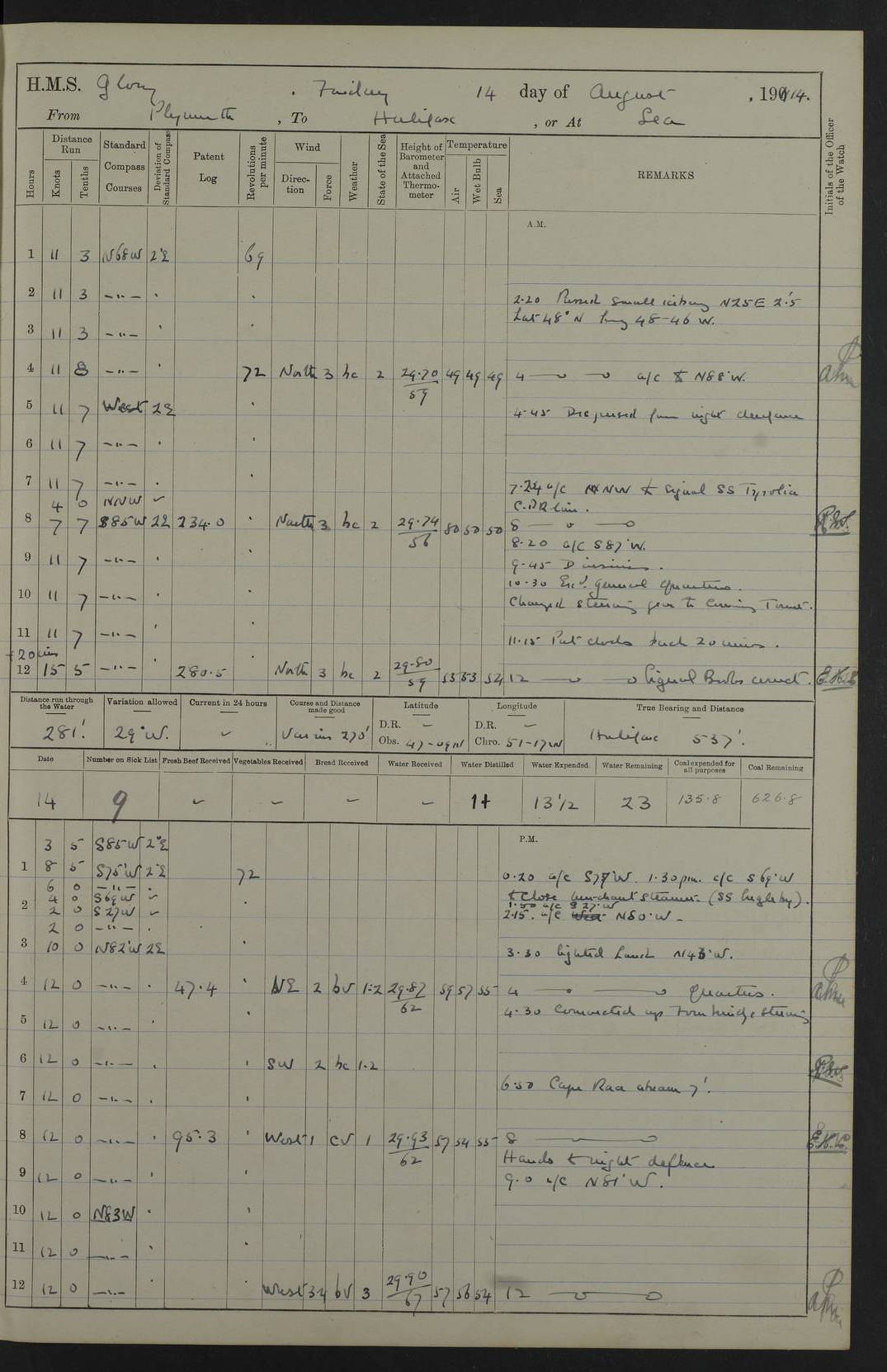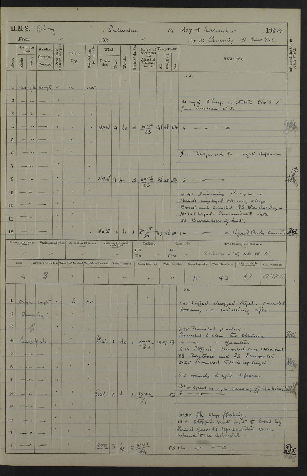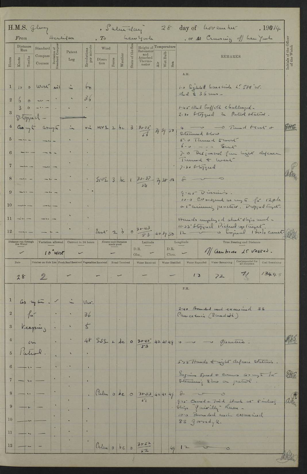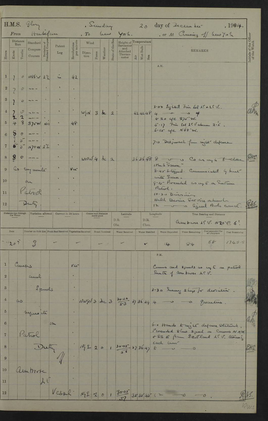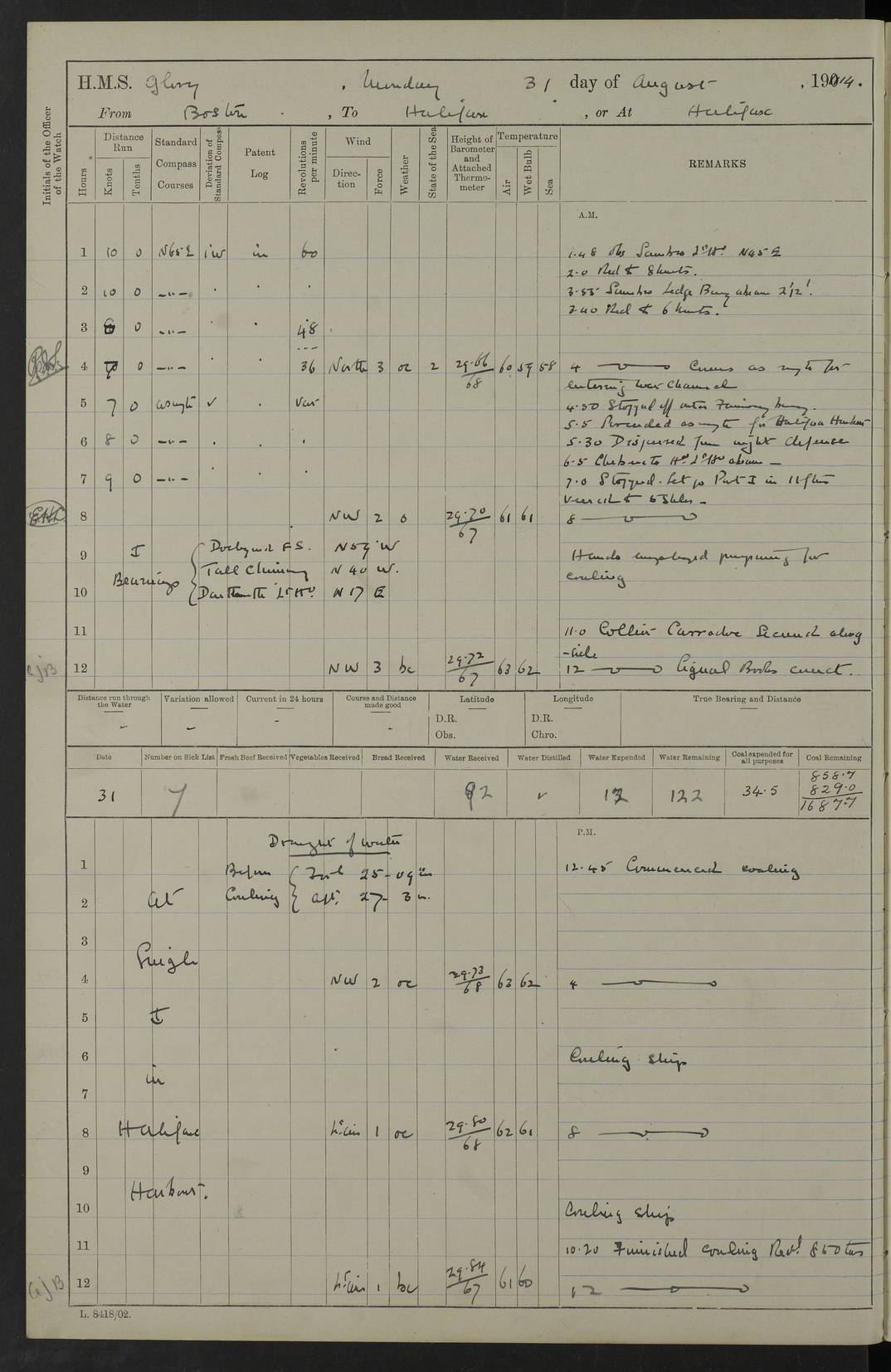 4f73cd06a2fc8ea903001489: (https://s3.amazonaws.com:443/oldweather/ADM53-43011/0072_0.jpg) 17 August 1914 Halifax Lat 44.63, Long -63.55 Number on sick list: 11 6.00am: Commenced coaling from Patent fuel sheds on jetty. 1.30pm: Finished coaling. pm: Washed down upper deck. 4f73cd06a2fc8ea90300148a: (https://s3.amazonaws.com:443/oldweather/ADM53-43011/0072_1.jpg) 18 August 1914 Halifax Lat 44.63, Long -63.55 Number on sick list: 10 4f73cd07a2fc8ea90300148b: (https://s3.amazonaws.com:443/oldweather/ADM53-43011/0073_0.jpg) 19 August 1914 Halifax Lat 44.63, Long -63.55 Number on sick list: 7 5.05am: Slipped from jetty and proceeded as requisite to anchorage in stream. 5.45am: Stopped. Let go Port anchor. am: Preparing for coaling. 9.00am: Collier Brinkwood made fast alongside (Starboard side). 10.10am: Commenced coaling. 9.40pm: Finished coaling. Received 1080 tons. 4f73cd07a2fc8ea90300148c: (https://s3.amazonaws.com:443/oldweather/ADM53-43011/0073_1.jpg) 20 August 1914 Halifax Lat 44.63, Long -63.55 Number on sick list: 7 am: Employed unrigging collier and gear etc. 7.15am: Collier left ship. 5.15pm: Hands to bathe. 4f73cd07a2fc8ea90300148d: (https://s3.amazonaws.com:443/oldweather/ADM53-43011/0074_0.jpg) 21 August 1914 Halifax Lat 44.63, Long -63.55 Number on sick list: 7 pm: Testing gun sights. 8.30pm: Exercised darken ship. 9.15pm: Opened deadlights etc. 4f73cd07a2fc8ea90300148e: (https://s3.amazonaws.com:443/oldweather/ADM53-43011/0074_1.jpg) 22 August 1914 Halifax Lat 44.63, Long -63.55 Number on sick list: 8 am: Aired night clothing. pm: Employed disembarking spare torpedo booms and other gear. pm: Tested lifebuoys. Found correct. 4f73cd08a2fc8ea90300148f: (https://s3.amazonaws.com:443/oldweather/ADM53-43011/0075_0.jpg) 23 August 1914 Halifax and at Sea Lat 44.63, Long -63.55 Number on sick list: 7 10.00am: Held Divine Service on board. am: Preparing for sea. 11.45am: Weighed and proceeded as requisite out of harbour. 12.50pm: Entered War Channel. 3.20pm: a/c S59ºW for rendezvous. 7.25pm: Observed HMS Suffolk 1 pt on starboard bow. HMS Suffolk was a Kent class armoured cruiser, launched at Portsmouth Dockyard in 1903, and sold in 1920. Details at http://en.wikipedia.org/wiki/HMS_Suffolk_(1903) . 8.00pm: Stopped at rendezvous. Communicated by boat with Suffolk. 9.30pm: Fog shut down. 9.00pm: Hands to night defence stations. 9.30pm: Fog shut down.9.45pm: Proceeded. 10.50pm: Fog cleared. 4f73cd08a2fc8ea903001490: (https://s3.amazonaws.com:443/oldweather/ADM53-43011/0075_1.jpg) 24 August 1914 At sea, Halifax to New York Lat 41.9, Long -66.4 Number on sick list: 9 5.30am: Dispersed from night defence. 10.20am: a/c to speak merchant steamer bearing WNW (SS Hurley of Montreal). 10.40am: a/c south. Stopped. Dropped target. 11.00am: Carried out aiming rifle practice. 12.10pm: Stopped. 1.20pm: Dropped second target. Carried out aiming rifle and sub calibre practice. 2.50pm: Fog shut down. pm: Hands at night defence stations. 10.45pm: Fog clearing. 4f73cd08a2fc8ea903001491: (https://s3.amazonaws.com:443/oldweather/ADM53-43011/0076_0.jpg) 25 August 1914 Patrolling off New York Lat 40.6, Long -70.0 Number on sick list: 8 5.40am: Dispersed from night defence. 6.10am: Observed sail N30ºW/ a/c N30ºW. Reduced to 60 revs. 6.50am: Resumed course. Abeam sail (Alicia B. Crosby). 9.36am: Sighted Nantucket Light N65ºW. 10.15am: Met Mason Lines Antilles. 10.25am: Nantucket Light Vessel abeam, 1.2 miles. 6.00pm: Sighted cruiser ahead. 6.10pm: Action. 6.25pm: Dispersed. 6.40pm: Stopped and signalled HMS Essex. HMS Essex was an armoured cruiser of the Kent class, launched in 1901 at Pembroke Dockyard and sold in 1921. Details at http://en.wikipedia.org/wiki/HMS_Essex_(1901) . 7.00pm: Proceeded as requisite. 7.25pm: Sighted steamer. a/c N60ºW, 60 revs. 7.35pm: Turned to east in company with SS Uranium. 8.00pm: Hands to night defence. 8.05pm: Stopped. Communicated by boat with Uranium. 9.23pm: Proceeded, course as requisite to northward to investigate searchlights. pm: Connected conning tower steaming gear. 4f73cd08a2fc8ea903001492: (https://s3.amazonaws.com:443/oldweather/ADM53-43011/0076_1.jpg) 26 August 1914 Patrolling off New York Lat 40.4, Long -73.6 Number on sick list: 11 5.16am: Fire Island Light abeam 7 miles. 7.00am: a/c N49ºW on sighting steamer to north. 8.25am: Sighted Ambrose Light Vessel. 1.00pm: Courses as requisite investigating shipping off Ambrose Light Vessel and Waveside. 2.15pm: Stopped, communicated by boat with SS Van der Duyn. 2.55pm: Proceeded as requisite. 5.26pm: In company with steamers New York and Commanchee. 6.17pm: Connected up fore bridge steering gear. 7.12pm: a/c to south to close steamer (St Louis). 7.25pm: Resumed course. 9.00pm: Hands to night defence. 4f73cd09a2fc8ea903001493: (https://s3.amazonaws.com:443/oldweather/ADM53-43011/0077_0.jpg) 27 August 1914 Patrolling off New York Lat 40.5, Long -72.3 Number on sick list: 10 5.45pm: Dispersed from night defence. 7.12am: a/c as requisite to close merchantman (Wilson Line Francisco). 7.55am: Resumed course. 9.55am: a/c to close Norwegian ship. 10.10am: Stopped, communicated with her by boat (SS Bjornstjerne Bjornsen). 10.50am: Proceeded N30ºE to close Circadian. 3.55pm: Fire Island Light Vessel abeam 2¾ miles. 4.12pm: Reduced to 36 revs. Passed SS Baltic. 5.35pm: Connected up conning tower steering gear. 6.40pm: Ambrose Light Vessel N33ºW, 7 miles. 7.00pm: Connected up fore bridge steering gear. 9.00pm: Hands to night defence stations. 4f73cd09a2fc8ea903001494: (https://s3.amazonaws.com:443/oldweather/ADM53-43011/0077_1.jpg) 28 August 1914 At sea, New York to Boston Lat 40.2, Long -70.8 Number on sick list: 9 5.45am: Dispersed from night defence. 8.40am: Sighted steamer (SS Ran) bearing S50ºE. 9.10am: Resumed course. am: Divisional drills. Preparing for target practice. 10.45am: Sighted steamer bearing N55ºE. 11.32am: Resumed course (SS Skjorldborg). 1.25pm: Stopped. Dropped target. 1.29pm: Proceeded, course as requi