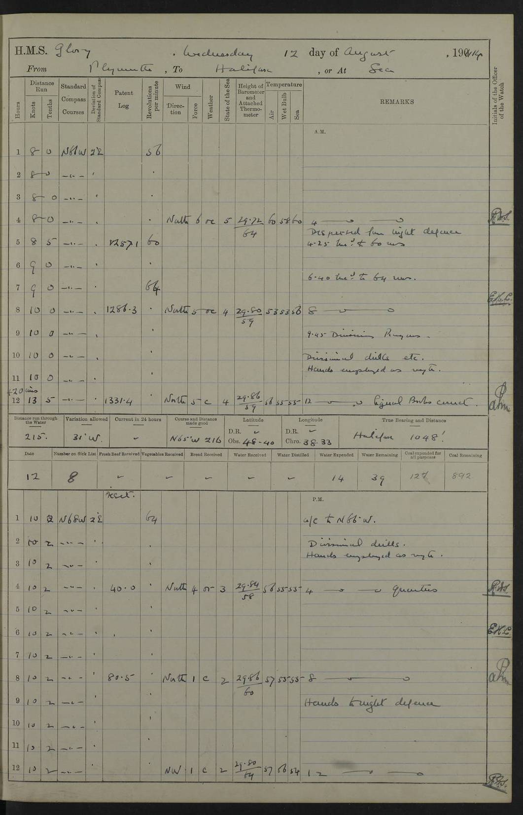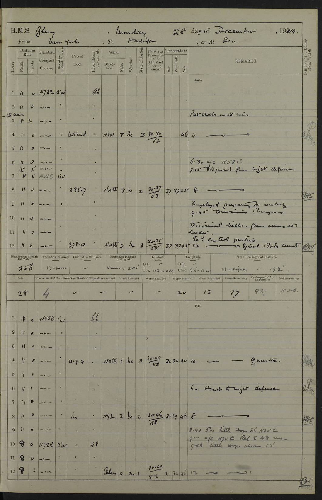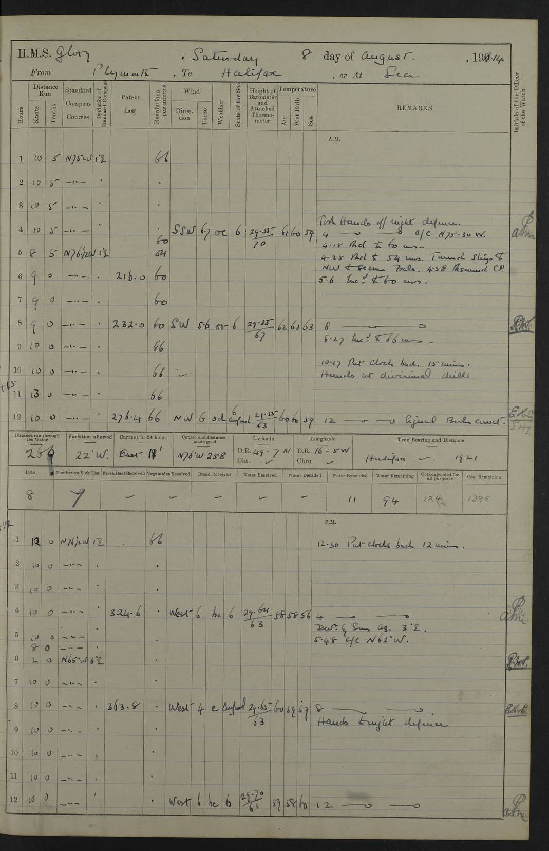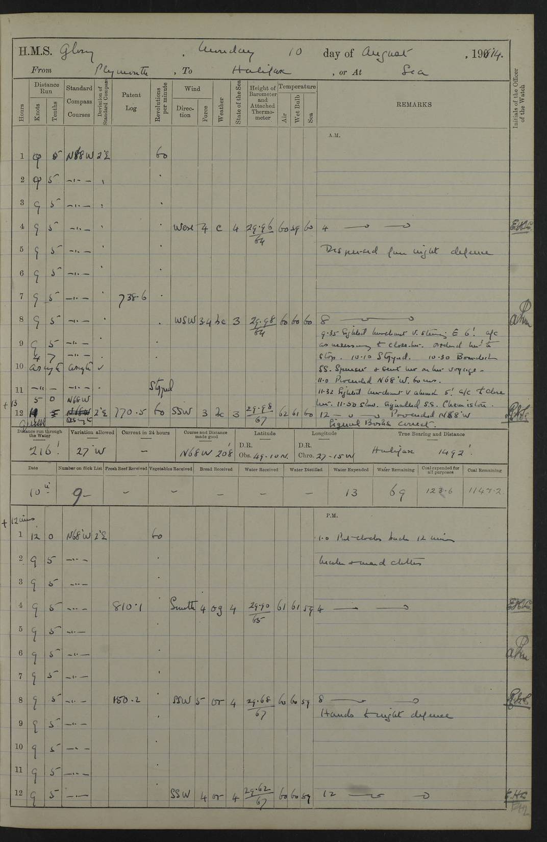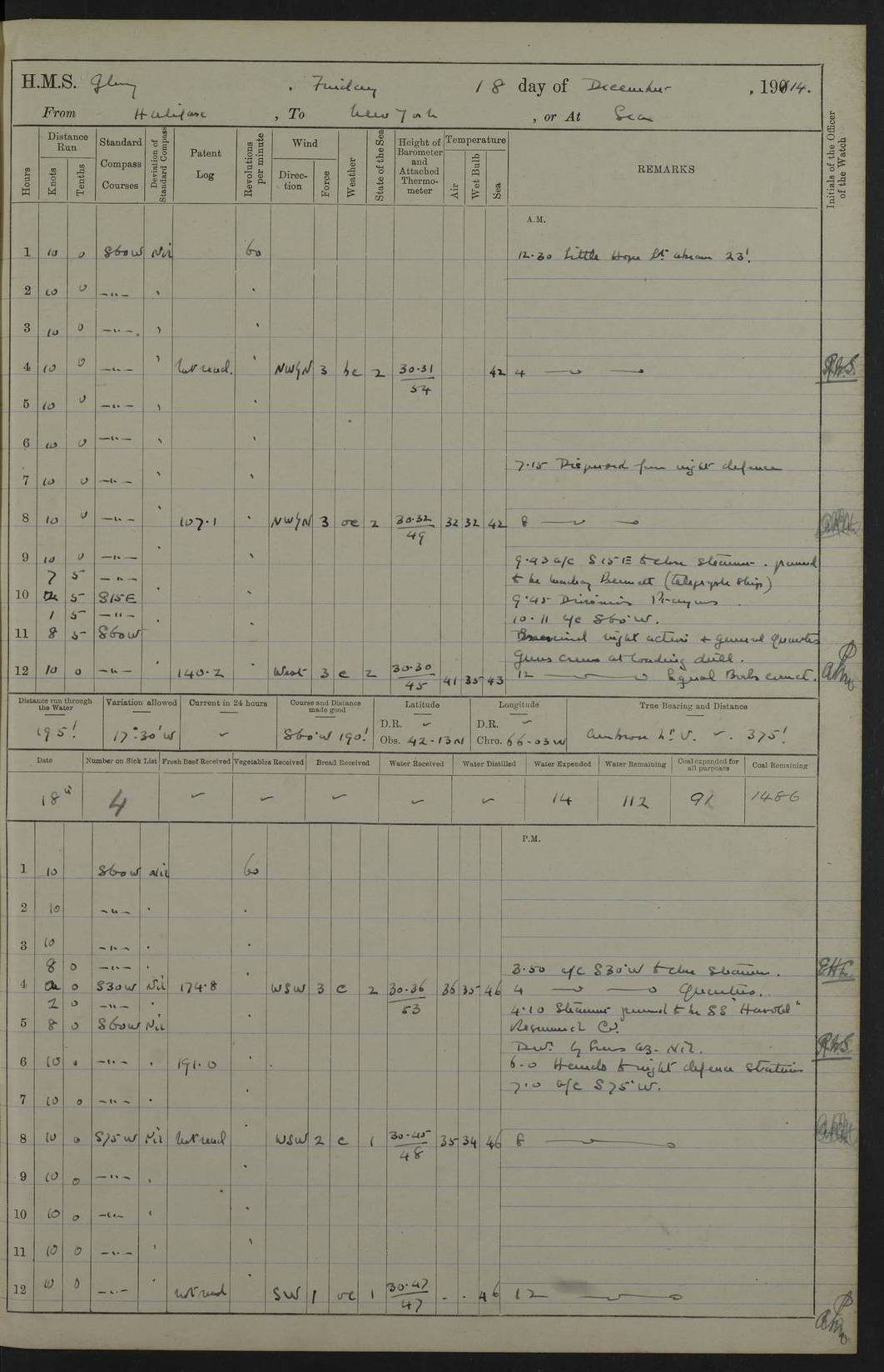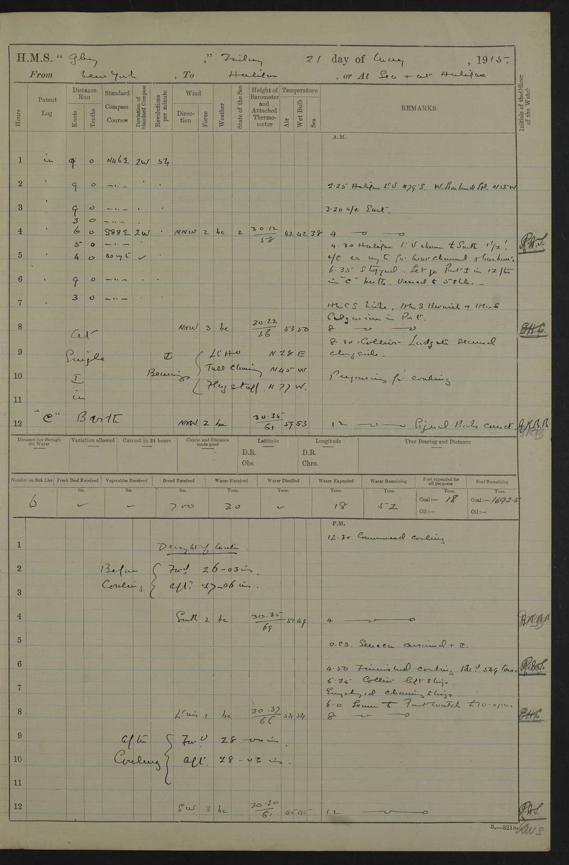 4f73cd06a2fc8ea903001489: (https://s3.amazonaws.com:443/oldweather/ADM53-43011/0072_0.jpg) 17 August 1914 Halifax Lat 44.63, Long -63.55 Number on sick list: 11 6.00am: Commenced coaling from Patent fuel sheds on jetty. 1.30pm: Finished coaling. pm: Washed down upper deck. 4f73cd06a2fc8ea90300148a: (https://s3.amazonaws.com:443/oldweather/ADM53-43011/0072_1.jpg) 18 August 1914 Halifax Lat 44.63, Long -63.55 Number on sick list: 10 4f73cd07a2fc8ea90300148b: (https://s3.amazonaws.com:443/oldweather/ADM53-43011/0073_0.jpg) 19 August 1914 Halifax Lat 44.63, Long -63.55 Number on sick list: 7 5.05am: Slipped from jetty and proceeded as requisite to anchorage in stream. 5.45am: Stopped. Let go Port anchor. am: Preparing for coaling. 9.00am: Collier Brinkwood made fast alongside (Starboard side). 10.10am: Commenced coaling. 9.40pm: Finished coaling. Received 1080 tons. 4f73cd07a2fc8ea90300148c: (https://s3.amazonaws.com:443/oldweather/ADM53-43011/0073_1.jpg) 20 August 1914 Halifax Lat 44.63, Long -63.55 Number on sick list: 7 am: Employed unrigging collier and gear etc. 7.15am: Collier left ship. 5.15pm: Hands to bathe. 4f73cd07a2fc8ea90300148d: (https://s3.amazonaws.com:443/oldweather/ADM53-43011/0074_0.jpg) 21 August 1914 Halifax Lat 44.63, Long -63.55 Number on sick list: 7 pm: Testing gun sights. 8.30pm: Exercised darken ship. 9.15pm: Opened deadlights etc. 4f73cd07a2fc8ea90300148e: (https://s3.amazonaws.com:443/oldweather/ADM53-43011/0074_1.jpg) 22 August 1914 Halifax Lat 44.63, Long -63.55 Number on sick list: 8 am: Aired night clothing. pm: Employed disembarking spare torpedo booms and other gear. pm: Tested lifebuoys. Found correct. 4f73cd08a2fc8ea90300148f: (https://s3.amazonaws.com:443/oldweather/ADM53-43011/0075_0.jpg) 23 August 1914 Halifax and at Sea Lat 44.63, Long -63.55 Number on sick list: 7 10.00am: Held Divine Service on board. am: Preparing for sea. 11.45am: Weighed and proceeded as requisite out of harbour. 12.50pm: Entered War Channel. 3.20pm: a/c S59ºW for rendezvous. 7.25pm: Observed HMS Suffolk 1 pt on starboard bow. HMS Suffolk was a Kent class armoured cruiser, launched at Portsmouth Dockyard in 1903, and sold in 1920. Details at http://en.wikipedia.org/wiki/HMS_Suffolk_(1903) . 8.00pm: Stopped at rendezvous. Communicated by boat with Suffolk. 9.30pm: Fog shut down. 9.00pm: Hands to night defence stations. 9.30pm: Fog shut down.9.45pm: Proceeded. 10.50pm: Fog cleared. 4f73cd08a2fc8ea903001490: (https://s3.amazonaws.com:443/oldweather/ADM53-43011/0075_1.jpg) 24 August 1914 At sea, Halifax to New York Lat 41.9, Long -66.4 Number on sick list: 9 5.30am: Dispersed from night defence. 10.20am: a/c to speak merchant steamer bearing WNW (SS Hurley of Montreal). 10.40am: a/c south. Stopped. Dropped target. 11.00am: Carried out aiming rifle practice. 12.10pm: Stopped. 1.20pm: Dropped second target. Carried out aiming rifle and sub calibre practice. 2.50pm: Fog shut down. pm: Hands at night defence stations. 10.45pm: Fog clearing. 4f73cd08a2fc8ea903001491: (https://s3.amazonaws.com:443/oldweather/ADM53-43011/0076_0.jpg) 25 August 1914 Patrolling off New York Lat 40.6, Long -70.0 Number on sick list: 8 5.40am: Dispersed from night defence. 6.10am: Observed sail N30ºW/ a/c N30ºW. Reduced to 60 revs. 6.50am: Resumed course. Abeam sail (Alicia B. Crosby). 9.36am: Sighted Nantucket Light N65ºW. 10.15am: Met Mason Lines Antilles. 10.25am: Nantucket Light Vessel abeam, 1.2 miles. 6.00pm: Sighted cruiser ahead. 6.10pm: Action. 6.25pm: Dispersed. 6.40pm: Stopped and signalled HMS Essex. HMS Essex was an armoured cruiser of the Kent class, launched in 1901 at Pembroke Dockyard and sold in 1921. Details at http://en.wikipedia.org/wiki/HMS_Essex_(1901) . 7.00pm: Proceeded as requisite. 7.25pm: Sighted steamer. a/c N60ºW, 60 revs. 7.35pm: Turned to east in company with SS Uranium. 8.00pm: Hands to night defence. 8.05pm: Stopped. Communicated by boat with Uranium. 9.23pm: Proceeded, course as requisite to northward to investigate searchlights. pm: Connected conning tower steaming gear. 4f73cd08a2fc8ea903001492: (https://s3.amazonaws.com:443/oldweather/ADM53-43011/0076_1.jpg) 26 August 1914 Patrolling off New York Lat 40.4, Long -73.6 Number on sick list: 11 5.16am: Fire Island Light abeam 7 miles. 7.00am: a/c N49ºW on sighting steamer to north. 8.25am: Sighted Ambrose Light Vessel. 1.00pm: Courses as requisite investigating shipping off Ambrose Light Vessel and Waveside. 2.15pm: Stopped, communicated by boat with SS Van der Duyn. 2.55pm: Proceeded as requisite. 5.26pm: In company with steamers New York and Commanchee. 6.17pm: Connected up fore bridge steering gear. 7.12pm: a/c to south to close steamer (St Louis). 7.25pm: Resumed course. 9.00pm: Hands to night defence. 4f73cd09a2fc8ea903001493: (https://s3.amazonaws.com:443/oldweather/ADM53-43011/0077_0.jpg) 27 August 1914 Patrolling off New York Lat 40.5, Long -72.3 Number on sick list: 10 5.45pm: Dispersed from night defence. 7.12am: a/c as requisite to close merchantman (Wilson Line Francisco). 7.55am: Resumed course. 9.55am: a/c to close Norwegian ship. 10.10am: Stopped, communicated with her by boat (SS Bjornstjerne Bjornsen). 10.50am: Proceeded N30ºE to close Circadian. 3.55pm: Fire Island Light Vessel abeam 2¾ miles. 4.12pm: Reduced to 36 revs. Passed SS Baltic. 5.35pm: Connected up conning tower steering gear. 6.40pm: Ambrose Light Vessel N33ºW, 7 miles. 7.00pm: Connected up fore bridge steering gear. 9.00pm: Hands to night defence stations. 4f73cd09a2fc8ea903001494: (https://s3.amazonaws.com:443/oldweather/ADM53-43011/0077_1.jpg) 28 August 1914 At sea, New York to Boston Lat 40.2, Long -70.8 Number on sick list: 9 5.45am: Dispersed from night defence. 8.40am: Sighted steamer (SS Ran) bearing S50ºE. 9.10am: Resumed course. am: Divisional drills. Preparing for target practice. 10.45am: Sighted steamer bearing N55ºE. 11.32am: Resumed course (SS Skjorldborg). 1.25pm: Stopped. Dropped target. 1.29pm: Proceeded, course as requi