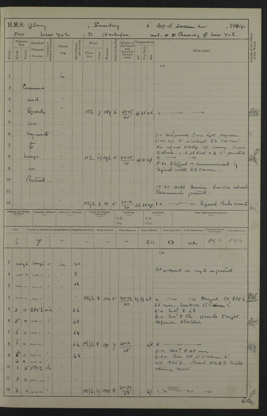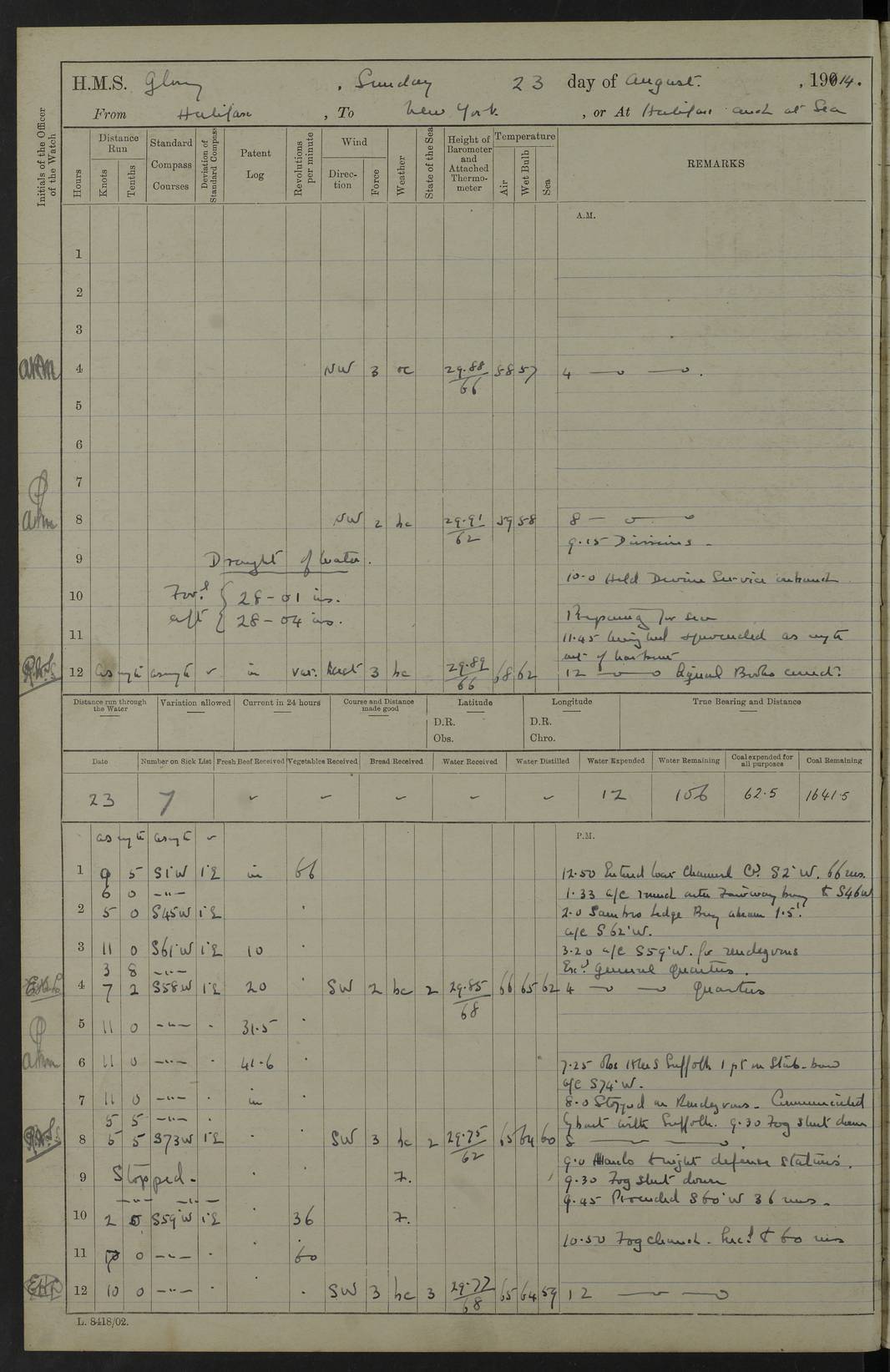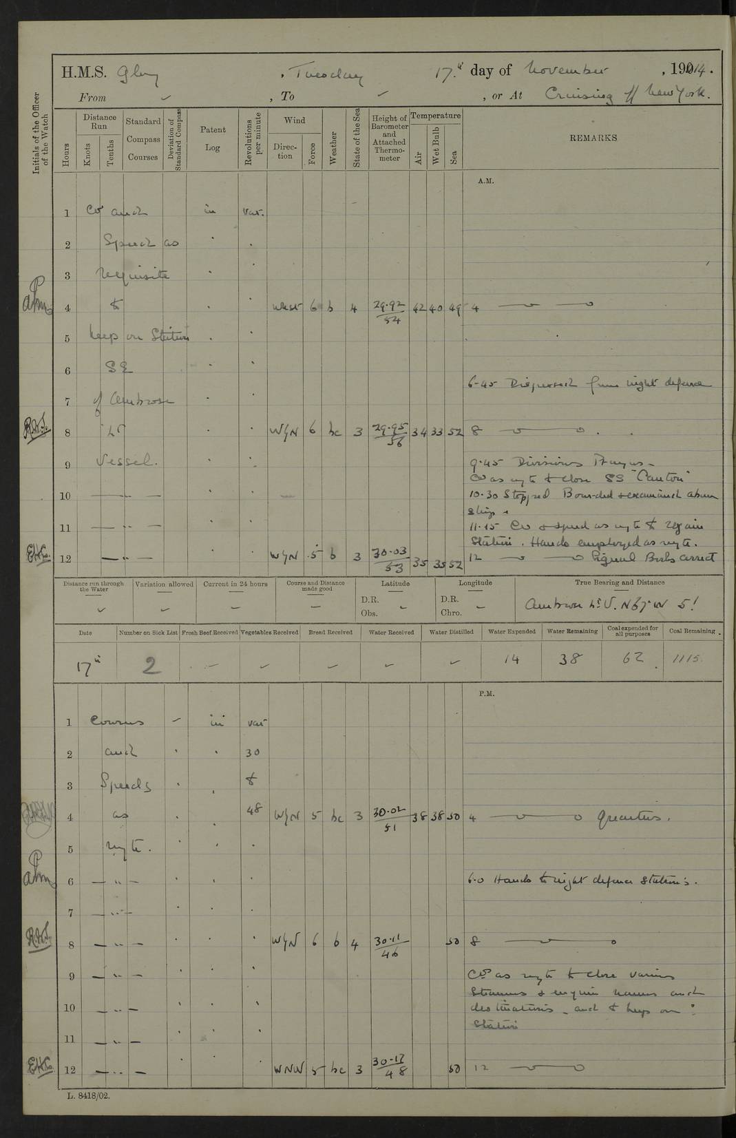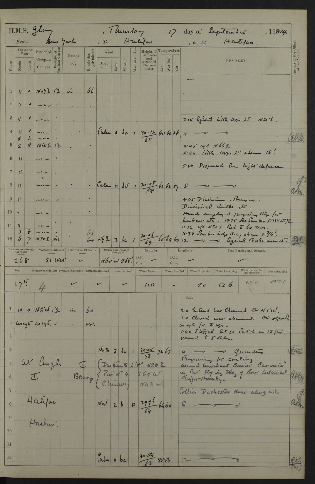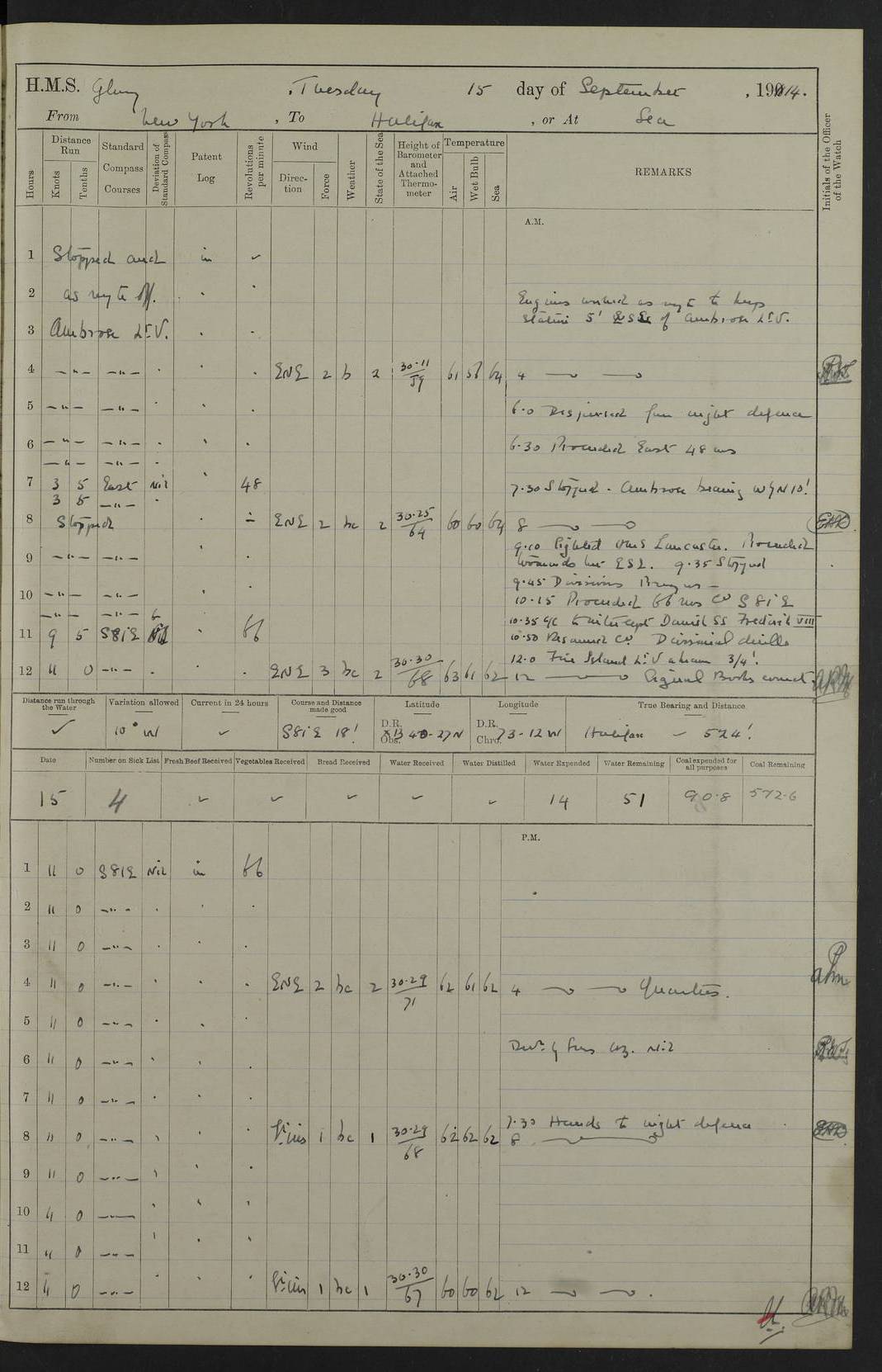 4f73cd06a2fc8ea903001489: (https://s3.amazonaws.com:443/oldweather/ADM53-43011/0072_0.jpg) 17 August 1914 Halifax Lat 44.63, Long -63.55 Number on sick list: 11 6.00am: Commenced coaling from Patent fuel sheds on jetty. 1.30pm: Finished coaling. pm: Washed down upper deck. 4f73cd06a2fc8ea90300148a: (https://s3.amazonaws.com:443/oldweather/ADM53-43011/0072_1.jpg) 18 August 1914 Halifax Lat 44.63, Long -63.55 Number on sick list: 10 4f73cd07a2fc8ea90300148b: (https://s3.amazonaws.com:443/oldweather/ADM53-43011/0073_0.jpg) 19 August 1914 Halifax Lat 44.63, Long -63.55 Number on sick list: 7 5.05am: Slipped from jetty and proceeded as requisite to anchorage in stream. 5.45am: Stopped. Let go Port anchor. am: Preparing for coaling. 9.00am: Collier Brinkwood made fast alongside (Starboard side). 10.10am: Commenced coaling. 9.40pm: Finished coaling. Received 1080 tons. 4f73cd07a2fc8ea90300148c: (https://s3.amazonaws.com:443/oldweather/ADM53-43011/0073_1.jpg) 20 August 1914 Halifax Lat 44.63, Long -63.55 Number on sick list: 7 am: Employed unrigging collier and gear etc. 7.15am: Collier left ship. 5.15pm: Hands to bathe. 4f73cd07a2fc8ea90300148d: (https://s3.amazonaws.com:443/oldweather/ADM53-43011/0074_0.jpg) 21 August 1914 Halifax Lat 44.63, Long -63.55 Number on sick list: 7 pm: Testing gun sights. 8.30pm: Exercised darken ship. 9.15pm: Opened deadlights etc. 4f73cd07a2fc8ea90300148e: (https://s3.amazonaws.com:443/oldweather/ADM53-43011/0074_1.jpg) 22 August 1914 Halifax Lat 44.63, Long -63.55 Number on sick list: 8 am: Aired night clothing. pm: Employed disembarking spare torpedo booms and other gear. pm: Tested lifebuoys. Found correct. 4f73cd08a2fc8ea90300148f: (https://s3.amazonaws.com:443/oldweather/ADM53-43011/0075_0.jpg) 23 August 1914 Halifax and at Sea Lat 44.63, Long -63.55 Number on sick list: 7 10.00am: Held Divine Service on board. am: Preparing for sea. 11.45am: Weighed and proceeded as requisite out of harbour. 12.50pm: Entered War Channel. 3.20pm: a/c S59ºW for rendezvous. 7.25pm: Observed HMS Suffolk 1 pt on starboard bow. HMS Suffolk was a Kent class armoured cruiser, launched at Portsmouth Dockyard in 1903, and sold in 1920. Details at http://en.wikipedia.org/wiki/HMS_Suffolk_(1903) . 8.00pm: Stopped at rendezvous. Communicated by boat with Suffolk. 9.30pm: Fog shut down. 9.00pm: Hands to night defence stations. 9.30pm: Fog shut down.9.45pm: Proceeded. 10.50pm: Fog cleared. 4f73cd08a2fc8ea903001490: (https://s3.amazonaws.com:443/oldweather/ADM53-43011/0075_1.jpg) 24 August 1914 At sea, Halifax to New York Lat 41.9, Long -66.4 Number on sick list: 9 5.30am: Dispersed from night defence. 10.20am: a/c to speak merchant steamer bearing WNW (SS Hurley of Montreal). 10.40am: a/c south. Stopped. Dropped target. 11.00am: Carried out aiming rifle practice. 12.10pm: Stopped. 1.20pm: Dropped second target. Carried out aiming rifle and sub calibre practice. 2.50pm: Fog shut down. pm: Hands at night defence stations. 10.45pm: Fog clearing. 4f73cd08a2fc8ea903001491: (https://s3.amazonaws.com:443/oldweather/ADM53-43011/0076_0.jpg) 25 August 1914 Patrolling off New York Lat 40.6, Long -70.0 Number on sick list: 8 5.40am: Dispersed from night defence. 6.10am: Observed sail N30ºW/ a/c N30ºW. Reduced to 60 revs. 6.50am: Resumed course. Abeam sail (Alicia B. Crosby). 9.36am: Sighted Nantucket Light N65ºW. 10.15am: Met Mason Lines Antilles. 10.25am: Nantucket Light Vessel abeam, 1.2 miles. 6.00pm: Sighted cruiser ahead. 6.10pm: Action. 6.25pm: Dispersed. 6.40pm: Stopped and signalled HMS Essex. HMS Essex was an armoured cruiser of the Kent class, launched in 1901 at Pembroke Dockyard and sold in 1921. Details at http://en.wikipedia.org/wiki/HMS_Essex_(1901) . 7.00pm: Proceeded as requisite. 7.25pm: Sighted steamer. a/c N60ºW, 60 revs. 7.35pm: Turned to east in company with SS Uranium. 8.00pm: Hands to night defence. 8.05pm: Stopped. Communicated by boat with Uranium. 9.23pm: Proceeded, course as requisite to northward to investigate searchlights. pm: Connected conning tower steaming gear. 4f73cd08a2fc8ea903001492: (https://s3.amazonaws.com:443/oldweather/ADM53-43011/0076_1.jpg) 26 August 1914 Patrolling off New York Lat 40.4, Long -73.6 Number on sick list: 11 5.16am: Fire Island Light abeam 7 miles. 7.00am: a/c N49ºW on sighting steamer to north. 8.25am: Sighted Ambrose Light Vessel. 1.00pm: Courses as requisite investigating shipping off Ambrose Light Vessel and Waveside. 2.15pm: Stopped, communicated by boat with SS Van der Duyn. 2.55pm: Proceeded as requisite. 5.26pm: In company with steamers New York and Commanchee. 6.17pm: Connected up fore bridge steering gear. 7.12pm: a/c to south to close steamer (St Louis). 7.25pm: Resumed course. 9.00pm: Hands to night defence. 4f73cd09a2fc8ea903001493: (https://s3.amazonaws.com:443/oldweather/ADM53-43011/0077_0.jpg) 27 August 1914 Patrolling off New York Lat 40.5, Long -72.3 Number on sick list: 10 5.45pm: Dispersed from night defence. 7.12am: a/c as requisite to close merchantman (Wilson Line Francisco). 7.55am: Resumed course. 9.55am: a/c to close Norwegian ship. 10.10am: Stopped, communicated with her by boat (SS Bjornstjerne Bjornsen). 10.50am: Proceeded N30ºE to close Circadian. 3.55pm: Fire Island Light Vessel abeam 2¾ miles. 4.12pm: Reduced to 36 revs. Passed SS Baltic. 5.35pm: Connected up conning tower steering gear. 6.40pm: Ambrose Light Vessel N33ºW, 7 miles. 7.00pm: Connected up fore bridge steering gear. 9.00pm: Hands to night defence stations. 4f73cd09a2fc8ea903001494: (https://s3.amazonaws.com:443/oldweather/ADM53-43011/0077_1.jpg) 28 August 1914 At sea, New York to Boston Lat 40.2, Long -70.8 Number on sick list: 9 5.45am: Dispersed from night defence. 8.40am: Sighted steamer (SS Ran) bearing S50ºE. 9.10am: Resumed course. am: Divisional drills. Preparing for target practice. 10.45am: Sighted steamer bearing N55ºE. 11.32am: Resumed course (SS Skjorldborg). 1.25pm: Stopped. Dropped target. 1.29pm: Proceeded, course as requi