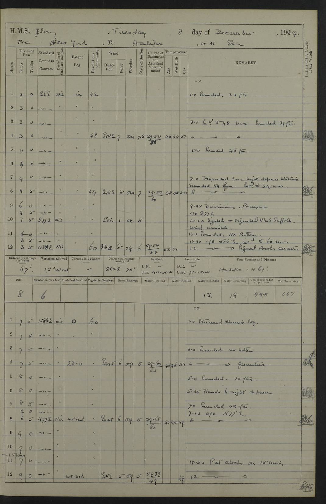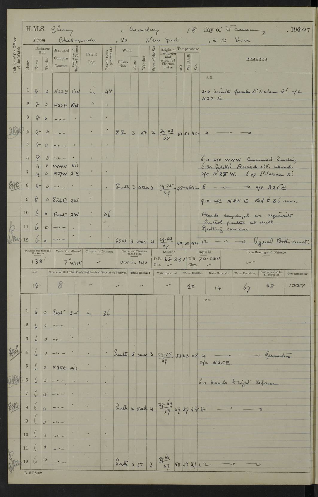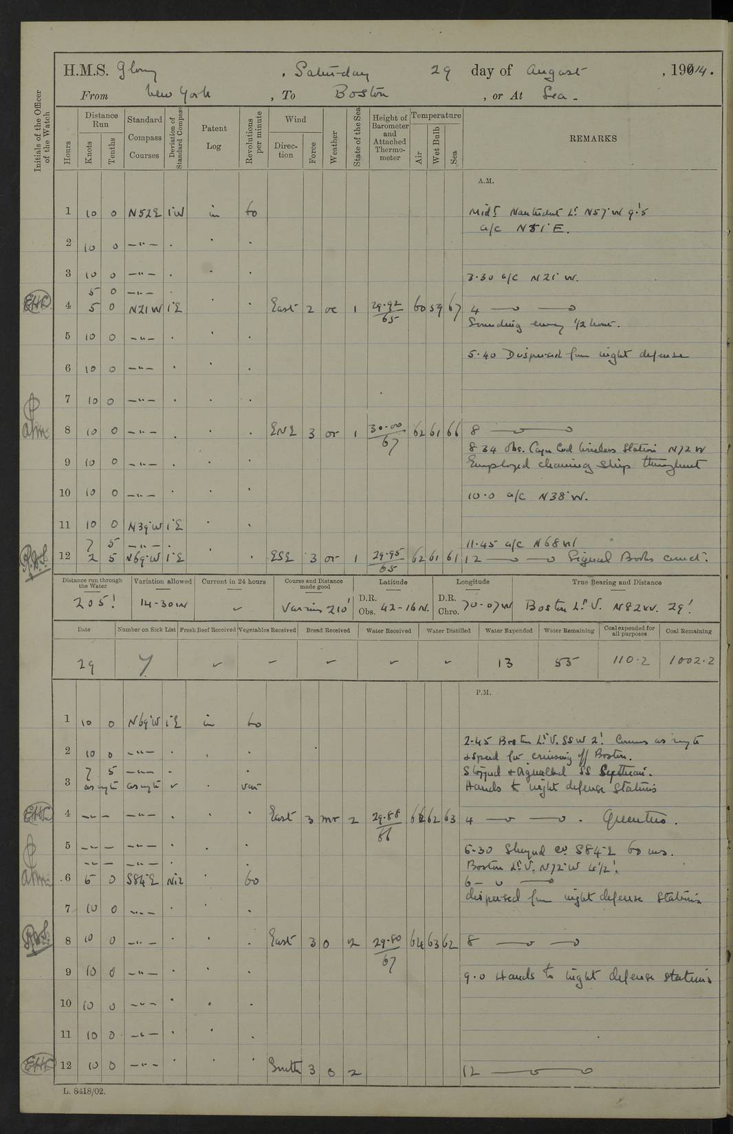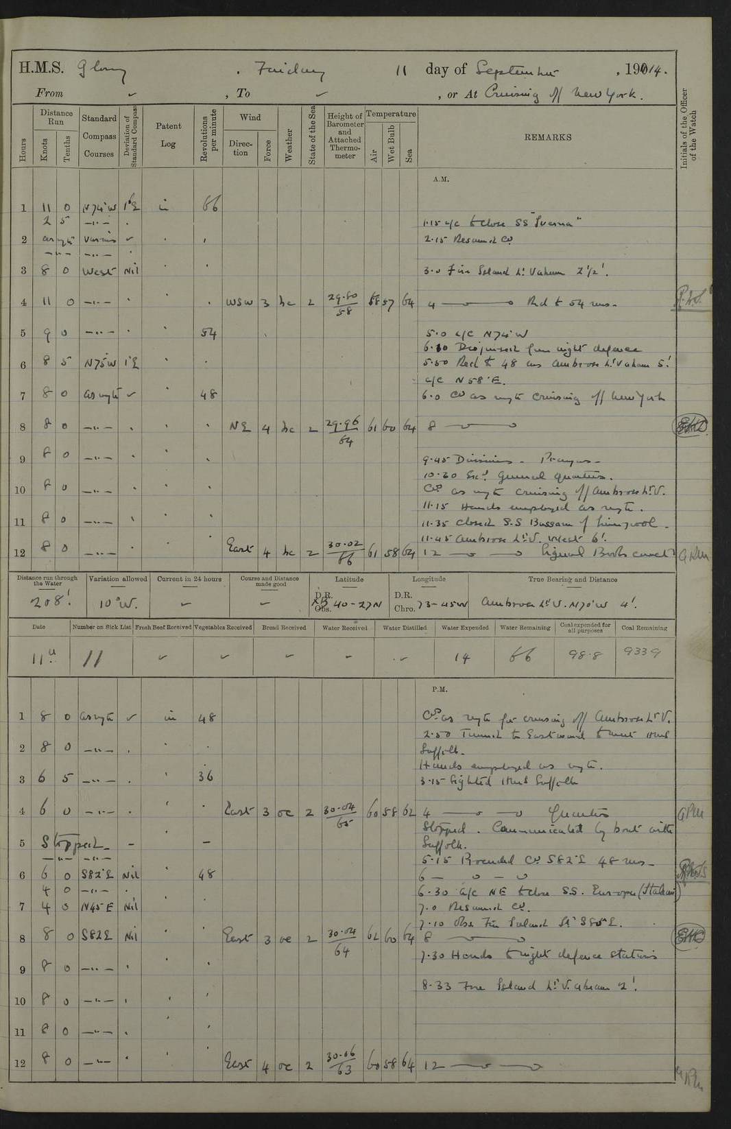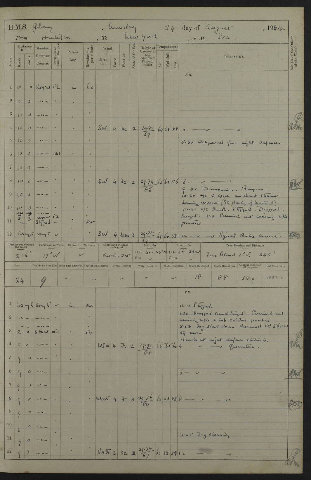 4f73cd06a2fc8ea903001489: (https://s3.amazonaws.com:443/oldweather/ADM53-43011/0072_0.jpg) 17 August 1914 Halifax Lat 44.63, Long -63.55 Number on sick list: 11 6.00am: Commenced coaling from Patent fuel sheds on jetty. 1.30pm: Finished coaling. pm: Washed down upper deck. 4f73cd06a2fc8ea90300148a: (https://s3.amazonaws.com:443/oldweather/ADM53-43011/0072_1.jpg) 18 August 1914 Halifax Lat 44.63, Long -63.55 Number on sick list: 10 4f73cd07a2fc8ea90300148b: (https://s3.amazonaws.com:443/oldweather/ADM53-43011/0073_0.jpg) 19 August 1914 Halifax Lat 44.63, Long -63.55 Number on sick list: 7 5.05am: Slipped from jetty and proceeded as requisite to anchorage in stream. 5.45am: Stopped. Let go Port anchor. am: Preparing for coaling. 9.00am: Collier Brinkwood made fast alongside (Starboard side). 10.10am: Commenced coaling. 9.40pm: Finished coaling. Received 1080 tons. 4f73cd07a2fc8ea90300148c: (https://s3.amazonaws.com:443/oldweather/ADM53-43011/0073_1.jpg) 20 August 1914 Halifax Lat 44.63, Long -63.55 Number on sick list: 7 am: Employed unrigging collier and gear etc. 7.15am: Collier left ship. 5.15pm: Hands to bathe. 4f73cd07a2fc8ea90300148d: (https://s3.amazonaws.com:443/oldweather/ADM53-43011/0074_0.jpg) 21 August 1914 Halifax Lat 44.63, Long -63.55 Number on sick list: 7 pm: Testing gun sights. 8.30pm: Exercised darken ship. 9.15pm: Opened deadlights etc. 4f73cd07a2fc8ea90300148e: (https://s3.amazonaws.com:443/oldweather/ADM53-43011/0074_1.jpg) 22 August 1914 Halifax Lat 44.63, Long -63.55 Number on sick list: 8 am: Aired night clothing. pm: Employed disembarking spare torpedo booms and other gear. pm: Tested lifebuoys. Found correct. 4f73cd08a2fc8ea90300148f: (https://s3.amazonaws.com:443/oldweather/ADM53-43011/0075_0.jpg) 23 August 1914 Halifax and at Sea Lat 44.63, Long -63.55 Number on sick list: 7 10.00am: Held Divine Service on board. am: Preparing for sea. 11.45am: Weighed and proceeded as requisite out of harbour. 12.50pm: Entered War Channel. 3.20pm: a/c S59ºW for rendezvous. 7.25pm: Observed HMS Suffolk 1 pt on starboard bow. HMS Suffolk was a Kent class armoured cruiser, launched at Portsmouth Dockyard in 1903, and sold in 1920. Details at http://en.wikipedia.org/wiki/HMS_Suffolk_(1903) . 8.00pm: Stopped at rendezvous. Communicated by boat with Suffolk. 9.30pm: Fog shut down. 9.00pm: Hands to night defence stations. 9.30pm: Fog shut down.9.45pm: Proceeded. 10.50pm: Fog cleared. 4f73cd08a2fc8ea903001490: (https://s3.amazonaws.com:443/oldweather/ADM53-43011/0075_1.jpg) 24 August 1914 At sea, Halifax to New York Lat 41.9, Long -66.4 Number on sick list: 9 5.30am: Dispersed from night defence. 10.20am: a/c to speak merchant steamer bearing WNW (SS Hurley of Montreal). 10.40am: a/c south. Stopped. Dropped target. 11.00am: Carried out aiming rifle practice. 12.10pm: Stopped. 1.20pm: Dropped second target. Carried out aiming rifle and sub calibre practice. 2.50pm: Fog shut down. pm: Hands at night defence stations. 10.45pm: Fog clearing. 4f73cd08a2fc8ea903001491: (https://s3.amazonaws.com:443/oldweather/ADM53-43011/0076_0.jpg) 25 August 1914 Patrolling off New York Lat 40.6, Long -70.0 Number on sick list: 8 5.40am: Dispersed from night defence. 6.10am: Observed sail N30ºW/ a/c N30ºW. Reduced to 60 revs. 6.50am: Resumed course. Abeam sail (Alicia B. Crosby). 9.36am: Sighted Nantucket Light N65ºW. 10.15am: Met Mason Lines Antilles. 10.25am: Nantucket Light Vessel abeam, 1.2 miles. 6.00pm: Sighted cruiser ahead. 6.10pm: Action. 6.25pm: Dispersed. 6.40pm: Stopped and signalled HMS Essex. HMS Essex was an armoured cruiser of the Kent class, launched in 1901 at Pembroke Dockyard and sold in 1921. Details at http://en.wikipedia.org/wiki/HMS_Essex_(1901) . 7.00pm: Proceeded as requisite. 7.25pm: Sighted steamer. a/c N60ºW, 60 revs. 7.35pm: Turned to east in company with SS Uranium. 8.00pm: Hands to night defence. 8.05pm: Stopped. Communicated by boat with Uranium. 9.23pm: Proceeded, course as requisite to northward to investigate searchlights. pm: Connected conning tower steaming gear. 4f73cd08a2fc8ea903001492: (https://s3.amazonaws.com:443/oldweather/ADM53-43011/0076_1.jpg) 26 August 1914 Patrolling off New York Lat 40.4, Long -73.6 Number on sick list: 11 5.16am: Fire Island Light abeam 7 miles. 7.00am: a/c N49ºW on sighting steamer to north. 8.25am: Sighted Ambrose Light Vessel. 1.00pm: Courses as requisite investigating shipping off Ambrose Light Vessel and Waveside. 2.15pm: Stopped, communicated by boat with SS Van der Duyn. 2.55pm: Proceeded as requisite. 5.26pm: In company with steamers New York and Commanchee. 6.17pm: Connected up fore bridge steering gear. 7.12pm: a/c to south to close steamer (St Louis). 7.25pm: Resumed course. 9.00pm: Hands to night defence. 4f73cd09a2fc8ea903001493: (https://s3.amazonaws.com:443/oldweather/ADM53-43011/0077_0.jpg) 27 August 1914 Patrolling off New York Lat 40.5, Long -72.3 Number on sick list: 10 5.45pm: Dispersed from night defence. 7.12am: a/c as requisite to close merchantman (Wilson Line Francisco). 7.55am: Resumed course. 9.55am: a/c to close Norwegian ship. 10.10am: Stopped, communicated with her by boat (SS Bjornstjerne Bjornsen). 10.50am: Proceeded N30ºE to close Circadian. 3.55pm: Fire Island Light Vessel abeam 2¾ miles. 4.12pm: Reduced to 36 revs. Passed SS Baltic. 5.35pm: Connected up conning tower steering gear. 6.40pm: Ambrose Light Vessel N33ºW, 7 miles. 7.00pm: Connected up fore bridge steering gear. 9.00pm: Hands to night defence stations. 4f73cd09a2fc8ea903001494: (https://s3.amazonaws.com:443/oldweather/ADM53-43011/0077_1.jpg) 28 August 1914 At sea, New York to Boston Lat 40.2, Long -70.8 Number on sick list: 9 5.45am: Dispersed from night defence. 8.40am: Sighted steamer (SS Ran) bearing S50ºE. 9.10am: Resumed course. am: Divisional drills. Preparing for target practice. 10.45am: Sighted steamer bearing N55ºE. 11.32am: Resumed course (SS Skjorldborg). 1.25pm: Stopped. Dropped target. 1.29pm: Proceeded, course as requi