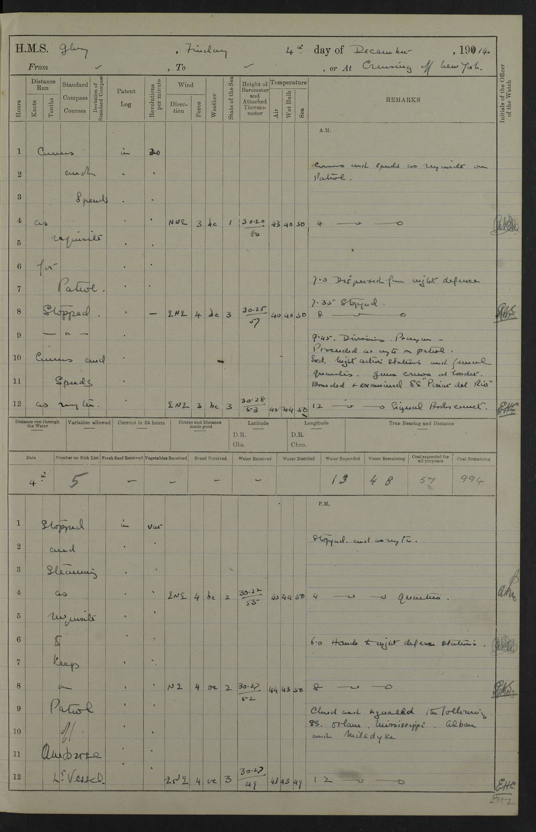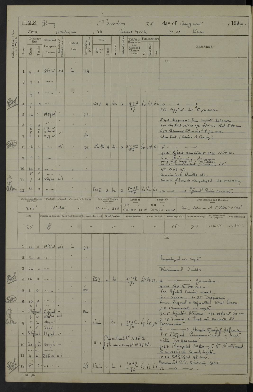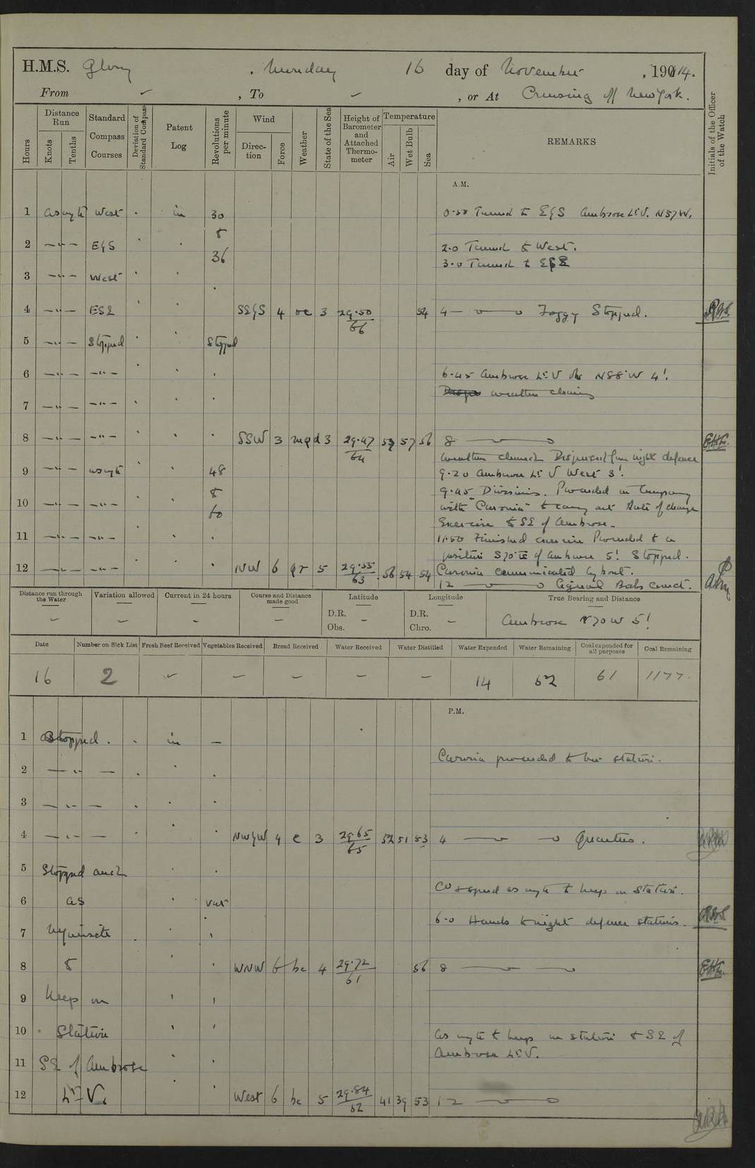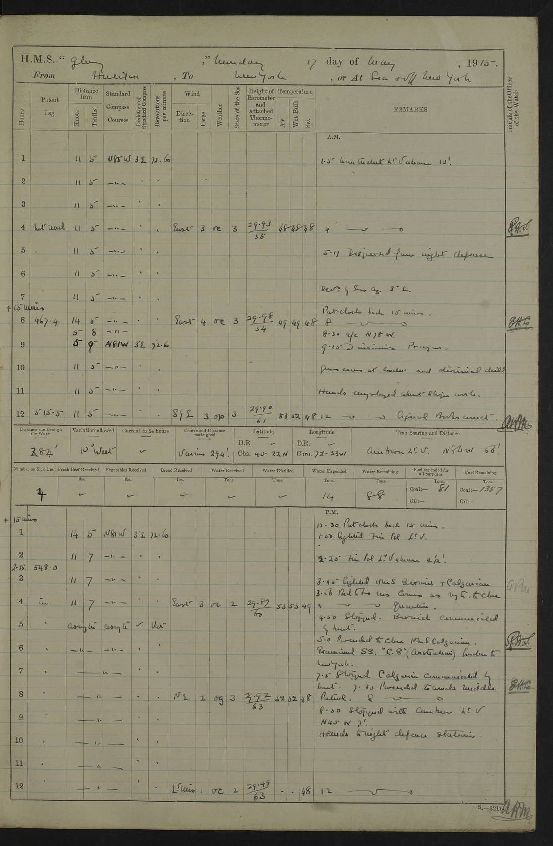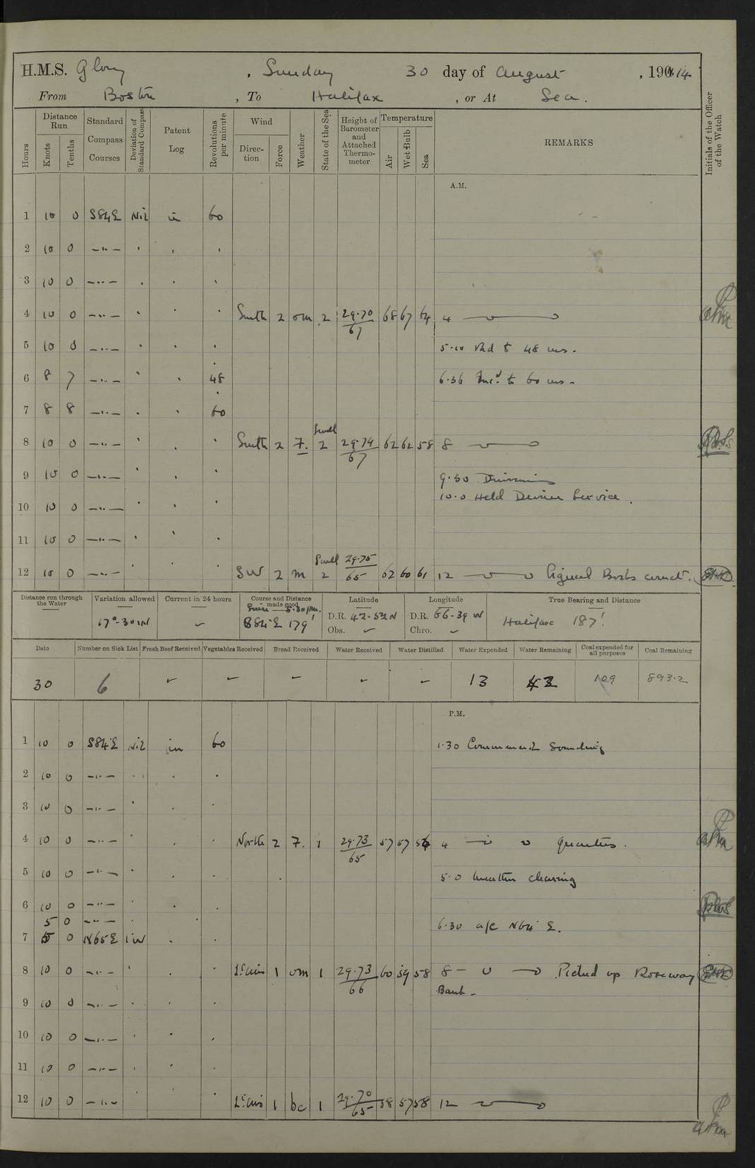 4f73cd06a2fc8ea903001489: (https://s3.amazonaws.com:443/oldweather/ADM53-43011/0072_0.jpg) 17 August 1914 Halifax Lat 44.63, Long -63.55 Number on sick list: 11 6.00am: Commenced coaling from Patent fuel sheds on jetty. 1.30pm: Finished coaling. pm: Washed down upper deck. 4f73cd06a2fc8ea90300148a: (https://s3.amazonaws.com:443/oldweather/ADM53-43011/0072_1.jpg) 18 August 1914 Halifax Lat 44.63, Long -63.55 Number on sick list: 10 4f73cd07a2fc8ea90300148b: (https://s3.amazonaws.com:443/oldweather/ADM53-43011/0073_0.jpg) 19 August 1914 Halifax Lat 44.63, Long -63.55 Number on sick list: 7 5.05am: Slipped from jetty and proceeded as requisite to anchorage in stream. 5.45am: Stopped. Let go Port anchor. am: Preparing for coaling. 9.00am: Collier Brinkwood made fast alongside (Starboard side). 10.10am: Commenced coaling. 9.40pm: Finished coaling. Received 1080 tons. 4f73cd07a2fc8ea90300148c: (https://s3.amazonaws.com:443/oldweather/ADM53-43011/0073_1.jpg) 20 August 1914 Halifax Lat 44.63, Long -63.55 Number on sick list: 7 am: Employed unrigging collier and gear etc. 7.15am: Collier left ship. 5.15pm: Hands to bathe. 4f73cd07a2fc8ea90300148d: (https://s3.amazonaws.com:443/oldweather/ADM53-43011/0074_0.jpg) 21 August 1914 Halifax Lat 44.63, Long -63.55 Number on sick list: 7 pm: Testing gun sights. 8.30pm: Exercised darken ship. 9.15pm: Opened deadlights etc. 4f73cd07a2fc8ea90300148e: (https://s3.amazonaws.com:443/oldweather/ADM53-43011/0074_1.jpg) 22 August 1914 Halifax Lat 44.63, Long -63.55 Number on sick list: 8 am: Aired night clothing. pm: Employed disembarking spare torpedo booms and other gear. pm: Tested lifebuoys. Found correct. 4f73cd08a2fc8ea90300148f: (https://s3.amazonaws.com:443/oldweather/ADM53-43011/0075_0.jpg) 23 August 1914 Halifax and at Sea Lat 44.63, Long -63.55 Number on sick list: 7 10.00am: Held Divine Service on board. am: Preparing for sea. 11.45am: Weighed and proceeded as requisite out of harbour. 12.50pm: Entered War Channel. 3.20pm: a/c S59ºW for rendezvous. 7.25pm: Observed HMS Suffolk 1 pt on starboard bow. HMS Suffolk was a Kent class armoured cruiser, launched at Portsmouth Dockyard in 1903, and sold in 1920. Details at http://en.wikipedia.org/wiki/HMS_Suffolk_(1903) . 8.00pm: Stopped at rendezvous. Communicated by boat with Suffolk. 9.30pm: Fog shut down. 9.00pm: Hands to night defence stations. 9.30pm: Fog shut down.9.45pm: Proceeded. 10.50pm: Fog cleared. 4f73cd08a2fc8ea903001490: (https://s3.amazonaws.com:443/oldweather/ADM53-43011/0075_1.jpg) 24 August 1914 At sea, Halifax to New York Lat 41.9, Long -66.4 Number on sick list: 9 5.30am: Dispersed from night defence. 10.20am: a/c to speak merchant steamer bearing WNW (SS Hurley of Montreal). 10.40am: a/c south. Stopped. Dropped target. 11.00am: Carried out aiming rifle practice. 12.10pm: Stopped. 1.20pm: Dropped second target. Carried out aiming rifle and sub calibre practice. 2.50pm: Fog shut down. pm: Hands at night defence stations. 10.45pm: Fog clearing. 4f73cd08a2fc8ea903001491: (https://s3.amazonaws.com:443/oldweather/ADM53-43011/0076_0.jpg) 25 August 1914 Patrolling off New York Lat 40.6, Long -70.0 Number on sick list: 8 5.40am: Dispersed from night defence. 6.10am: Observed sail N30ºW/ a/c N30ºW. Reduced to 60 revs. 6.50am: Resumed course. Abeam sail (Alicia B. Crosby). 9.36am: Sighted Nantucket Light N65ºW. 10.15am: Met Mason Lines Antilles. 10.25am: Nantucket Light Vessel abeam, 1.2 miles. 6.00pm: Sighted cruiser ahead. 6.10pm: Action. 6.25pm: Dispersed. 6.40pm: Stopped and signalled HMS Essex. HMS Essex was an armoured cruiser of the Kent class, launched in 1901 at Pembroke Dockyard and sold in 1921. Details at http://en.wikipedia.org/wiki/HMS_Essex_(1901) . 7.00pm: Proceeded as requisite. 7.25pm: Sighted steamer. a/c N60ºW, 60 revs. 7.35pm: Turned to east in company with SS Uranium. 8.00pm: Hands to night defence. 8.05pm: Stopped. Communicated by boat with Uranium. 9.23pm: Proceeded, course as requisite to northward to investigate searchlights. pm: Connected conning tower steaming gear. 4f73cd08a2fc8ea903001492: (https://s3.amazonaws.com:443/oldweather/ADM53-43011/0076_1.jpg) 26 August 1914 Patrolling off New York Lat 40.4, Long -73.6 Number on sick list: 11 5.16am: Fire Island Light abeam 7 miles. 7.00am: a/c N49ºW on sighting steamer to north. 8.25am: Sighted Ambrose Light Vessel. 1.00pm: Courses as requisite investigating shipping off Ambrose Light Vessel and Waveside. 2.15pm: Stopped, communicated by boat with SS Van der Duyn. 2.55pm: Proceeded as requisite. 5.26pm: In company with steamers New York and Commanchee. 6.17pm: Connected up fore bridge steering gear. 7.12pm: a/c to south to close steamer (St Louis). 7.25pm: Resumed course. 9.00pm: Hands to night defence. 4f73cd09a2fc8ea903001493: (https://s3.amazonaws.com:443/oldweather/ADM53-43011/0077_0.jpg) 27 August 1914 Patrolling off New York Lat 40.5, Long -72.3 Number on sick list: 10 5.45pm: Dispersed from night defence. 7.12am: a/c as requisite to close merchantman (Wilson Line Francisco). 7.55am: Resumed course. 9.55am: a/c to close Norwegian ship. 10.10am: Stopped, communicated with her by boat (SS Bjornstjerne Bjornsen). 10.50am: Proceeded N30ºE to close Circadian. 3.55pm: Fire Island Light Vessel abeam 2¾ miles. 4.12pm: Reduced to 36 revs. Passed SS Baltic. 5.35pm: Connected up conning tower steering gear. 6.40pm: Ambrose Light Vessel N33ºW, 7 miles. 7.00pm: Connected up fore bridge steering gear. 9.00pm: Hands to night defence stations. 4f73cd09a2fc8ea903001494: (https://s3.amazonaws.com:443/oldweather/ADM53-43011/0077_1.jpg) 28 August 1914 At sea, New York to Boston Lat 40.2, Long -70.8 Number on sick list: 9 5.45am: Dispersed from night defence. 8.40am: Sighted steamer (SS Ran) bearing S50ºE. 9.10am: Resumed course. am: Divisional drills. Preparing for target practice. 10.45am: Sighted steamer bearing N55ºE. 11.32am: Resumed course (SS Skjorldborg). 1.25pm: Stopped. Dropped target. 1.29pm: Proceeded, course as requi