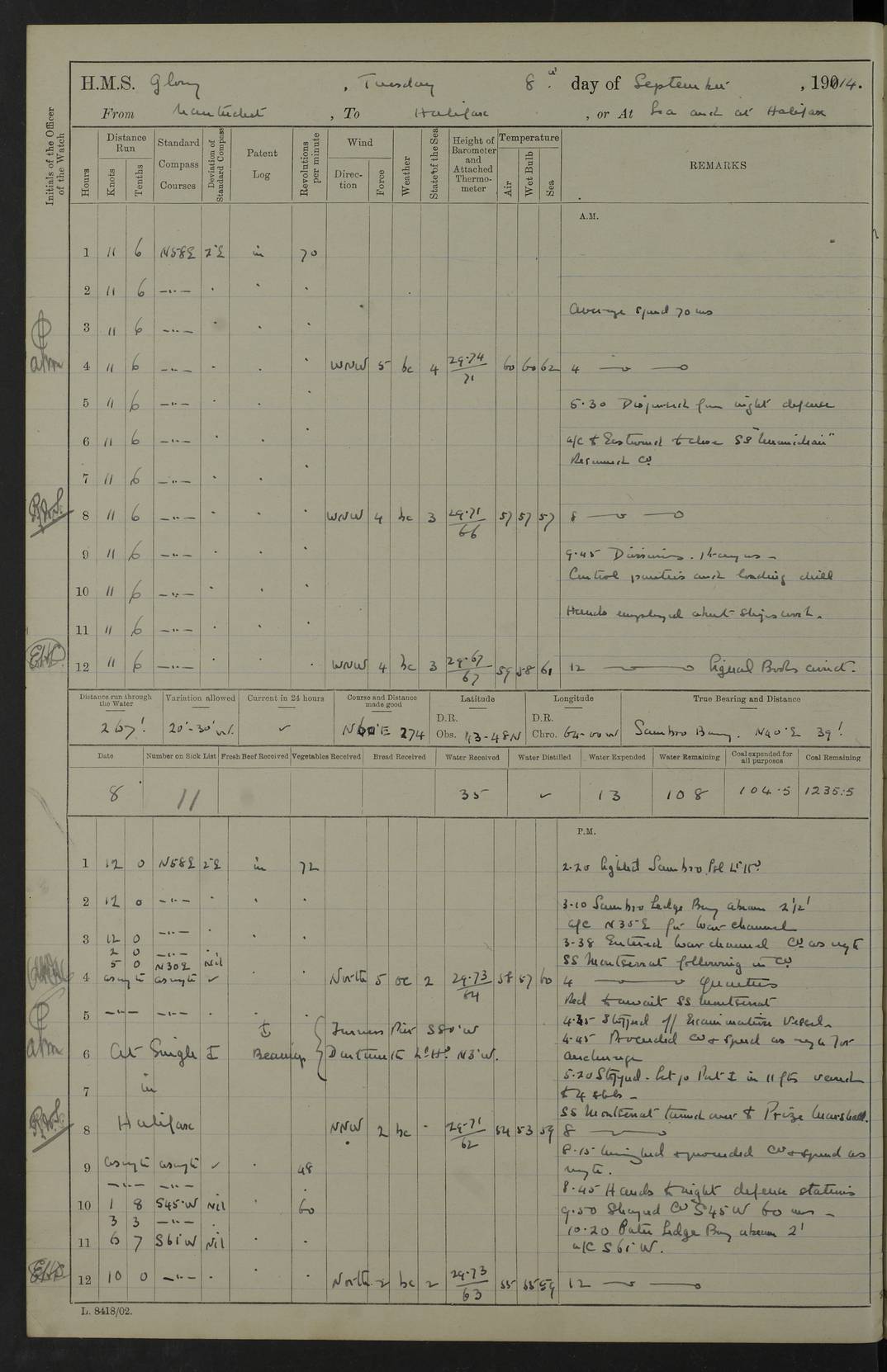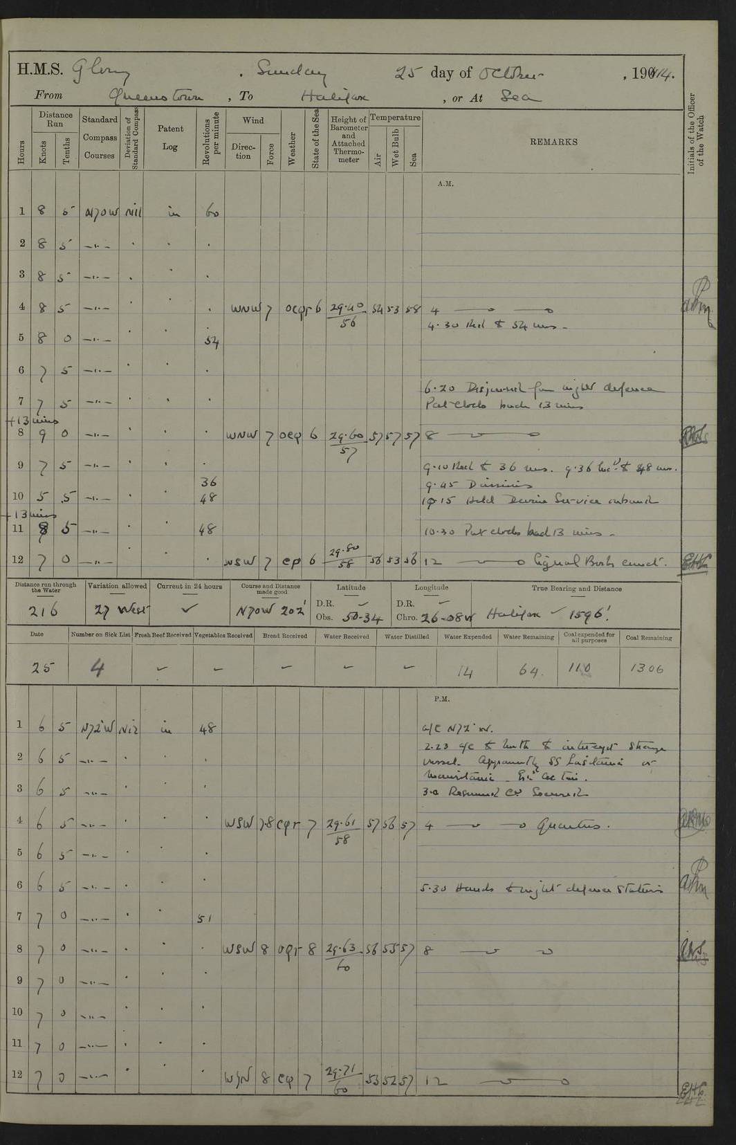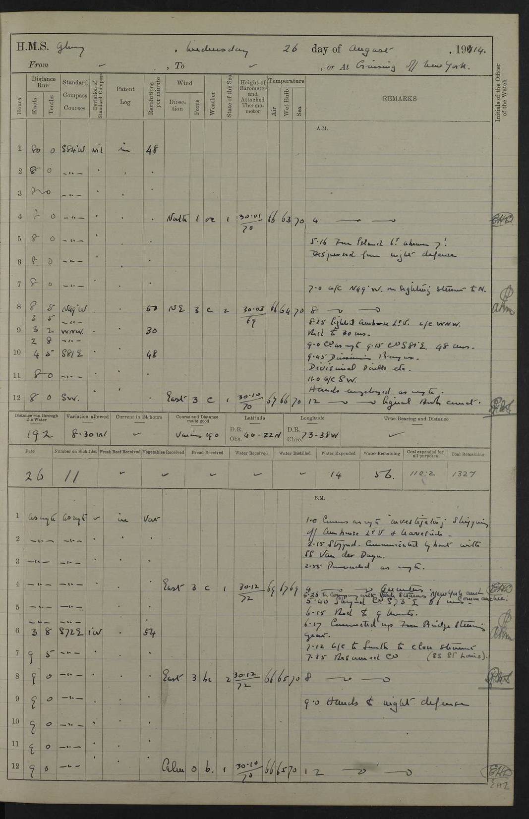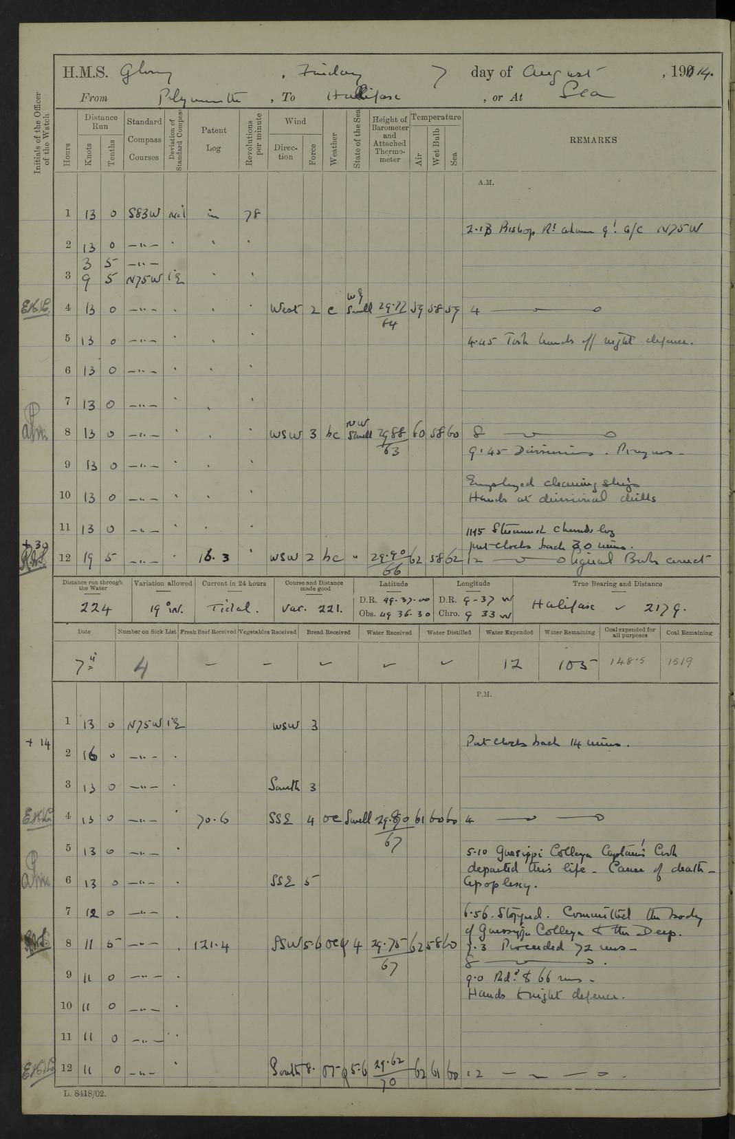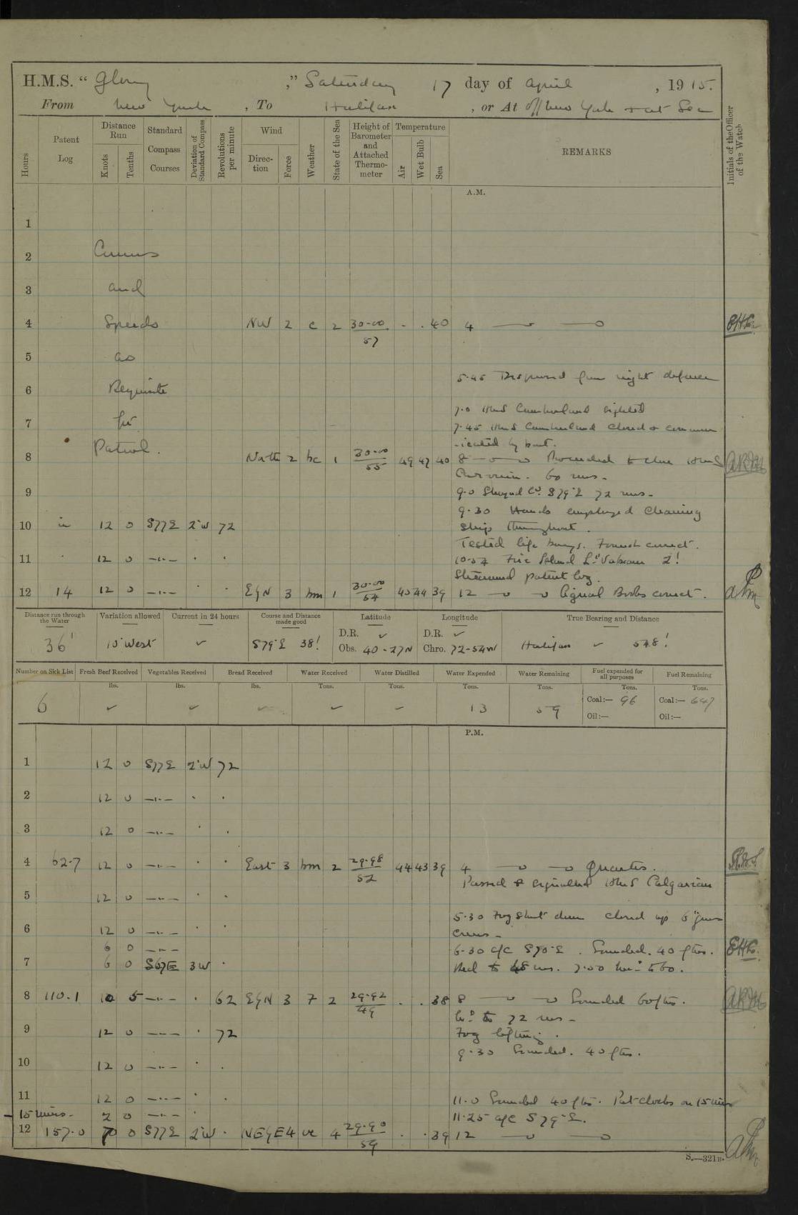 4f73cd06a2fc8ea903001489: (https://s3.amazonaws.com:443/oldweather/ADM53-43011/0072_0.jpg) 17 August 1914 Halifax Lat 44.63, Long -63.55 Number on sick list: 11 6.00am: Commenced coaling from Patent fuel sheds on jetty. 1.30pm: Finished coaling. pm: Washed down upper deck. 4f73cd06a2fc8ea90300148a: (https://s3.amazonaws.com:443/oldweather/ADM53-43011/0072_1.jpg) 18 August 1914 Halifax Lat 44.63, Long -63.55 Number on sick list: 10 4f73cd07a2fc8ea90300148b: (https://s3.amazonaws.com:443/oldweather/ADM53-43011/0073_0.jpg) 19 August 1914 Halifax Lat 44.63, Long -63.55 Number on sick list: 7 5.05am: Slipped from jetty and proceeded as requisite to anchorage in stream. 5.45am: Stopped. Let go Port anchor. am: Preparing for coaling. 9.00am: Collier Brinkwood made fast alongside (Starboard side). 10.10am: Commenced coaling. 9.40pm: Finished coaling. Received 1080 tons. 4f73cd07a2fc8ea90300148c: (https://s3.amazonaws.com:443/oldweather/ADM53-43011/0073_1.jpg) 20 August 1914 Halifax Lat 44.63, Long -63.55 Number on sick list: 7 am: Employed unrigging collier and gear etc. 7.15am: Collier left ship. 5.15pm: Hands to bathe. 4f73cd07a2fc8ea90300148d: (https://s3.amazonaws.com:443/oldweather/ADM53-43011/0074_0.jpg) 21 August 1914 Halifax Lat 44.63, Long -63.55 Number on sick list: 7 pm: Testing gun sights. 8.30pm: Exercised darken ship. 9.15pm: Opened deadlights etc. 4f73cd07a2fc8ea90300148e: (https://s3.amazonaws.com:443/oldweather/ADM53-43011/0074_1.jpg) 22 August 1914 Halifax Lat 44.63, Long -63.55 Number on sick list: 8 am: Aired night clothing. pm: Employed disembarking spare torpedo booms and other gear. pm: Tested lifebuoys. Found correct. 4f73cd08a2fc8ea90300148f: (https://s3.amazonaws.com:443/oldweather/ADM53-43011/0075_0.jpg) 23 August 1914 Halifax and at Sea Lat 44.63, Long -63.55 Number on sick list: 7 10.00am: Held Divine Service on board. am: Preparing for sea. 11.45am: Weighed and proceeded as requisite out of harbour. 12.50pm: Entered War Channel. 3.20pm: a/c S59ºW for rendezvous. 7.25pm: Observed HMS Suffolk 1 pt on starboard bow. HMS Suffolk was a Kent class armoured cruiser, launched at Portsmouth Dockyard in 1903, and sold in 1920. Details at http://en.wikipedia.org/wiki/HMS_Suffolk_(1903) . 8.00pm: Stopped at rendezvous. Communicated by boat with Suffolk. 9.30pm: Fog shut down. 9.00pm: Hands to night defence stations. 9.30pm: Fog shut down.9.45pm: Proceeded. 10.50pm: Fog cleared. 4f73cd08a2fc8ea903001490: (https://s3.amazonaws.com:443/oldweather/ADM53-43011/0075_1.jpg) 24 August 1914 At sea, Halifax to New York Lat 41.9, Long -66.4 Number on sick list: 9 5.30am: Dispersed from night defence. 10.20am: a/c to speak merchant steamer bearing WNW (SS Hurley of Montreal). 10.40am: a/c south. Stopped. Dropped target. 11.00am: Carried out aiming rifle practice. 12.10pm: Stopped. 1.20pm: Dropped second target. Carried out aiming rifle and sub calibre practice. 2.50pm: Fog shut down. pm: Hands at night defence stations. 10.45pm: Fog clearing. 4f73cd08a2fc8ea903001491: (https://s3.amazonaws.com:443/oldweather/ADM53-43011/0076_0.jpg) 25 August 1914 Patrolling off New York Lat 40.6, Long -70.0 Number on sick list: 8 5.40am: Dispersed from night defence. 6.10am: Observed sail N30ºW/ a/c N30ºW. Reduced to 60 revs. 6.50am: Resumed course. Abeam sail (Alicia B. Crosby). 9.36am: Sighted Nantucket Light N65ºW. 10.15am: Met Mason Lines Antilles. 10.25am: Nantucket Light Vessel abeam, 1.2 miles. 6.00pm: Sighted cruiser ahead. 6.10pm: Action. 6.25pm: Dispersed. 6.40pm: Stopped and signalled HMS Essex. HMS Essex was an armoured cruiser of the Kent class, launched in 1901 at Pembroke Dockyard and sold in 1921. Details at http://en.wikipedia.org/wiki/HMS_Essex_(1901) . 7.00pm: Proceeded as requisite. 7.25pm: Sighted steamer. a/c N60ºW, 60 revs. 7.35pm: Turned to east in company with SS Uranium. 8.00pm: Hands to night defence. 8.05pm: Stopped. Communicated by boat with Uranium. 9.23pm: Proceeded, course as requisite to northward to investigate searchlights. pm: Connected conning tower steaming gear. 4f73cd08a2fc8ea903001492: (https://s3.amazonaws.com:443/oldweather/ADM53-43011/0076_1.jpg) 26 August 1914 Patrolling off New York Lat 40.4, Long -73.6 Number on sick list: 11 5.16am: Fire Island Light abeam 7 miles. 7.00am: a/c N49ºW on sighting steamer to north. 8.25am: Sighted Ambrose Light Vessel. 1.00pm: Courses as requisite investigating shipping off Ambrose Light Vessel and Waveside. 2.15pm: Stopped, communicated by boat with SS Van der Duyn. 2.55pm: Proceeded as requisite. 5.26pm: In company with steamers New York and Commanchee. 6.17pm: Connected up fore bridge steering gear. 7.12pm: a/c to south to close steamer (St Louis). 7.25pm: Resumed course. 9.00pm: Hands to night defence. 4f73cd09a2fc8ea903001493: (https://s3.amazonaws.com:443/oldweather/ADM53-43011/0077_0.jpg) 27 August 1914 Patrolling off New York Lat 40.5, Long -72.3 Number on sick list: 10 5.45pm: Dispersed from night defence. 7.12am: a/c as requisite to close merchantman (Wilson Line Francisco). 7.55am: Resumed course. 9.55am: a/c to close Norwegian ship. 10.10am: Stopped, communicated with her by boat (SS Bjornstjerne Bjornsen). 10.50am: Proceeded N30ºE to close Circadian. 3.55pm: Fire Island Light Vessel abeam 2¾ miles. 4.12pm: Reduced to 36 revs. Passed SS Baltic. 5.35pm: Connected up conning tower steering gear. 6.40pm: Ambrose Light Vessel N33ºW, 7 miles. 7.00pm: Connected up fore bridge steering gear. 9.00pm: Hands to night defence stations. 4f73cd09a2fc8ea903001494: (https://s3.amazonaws.com:443/oldweather/ADM53-43011/0077_1.jpg) 28 August 1914 At sea, New York to Boston Lat 40.2, Long -70.8 Number on sick list: 9 5.45am: Dispersed from night defence. 8.40am: Sighted steamer (SS Ran) bearing S50ºE. 9.10am: Resumed course. am: Divisional drills. Preparing for target practice. 10.45am: Sighted steamer bearing N55ºE. 11.32am: Resumed course (SS Skjorldborg). 1.25pm: Stopped. Dropped target. 1.29pm: Proceeded, course as requi