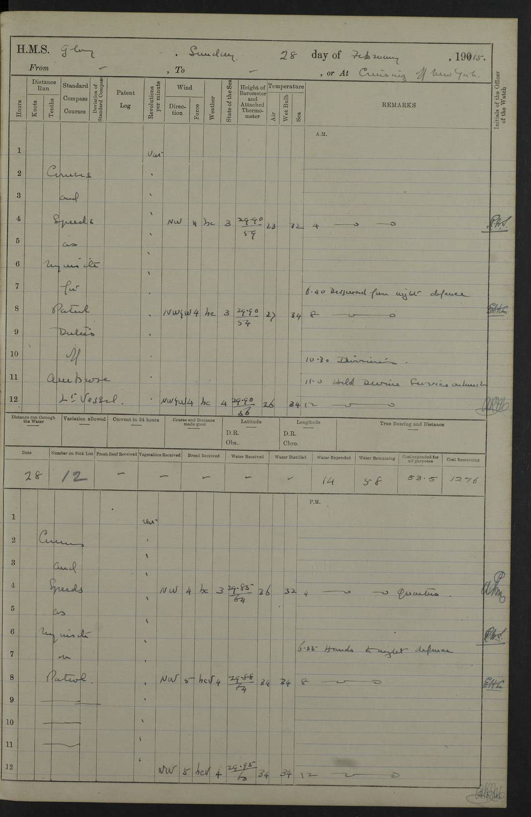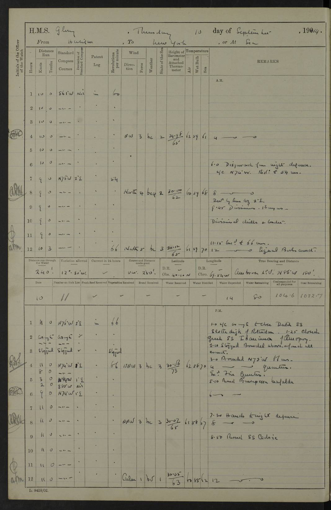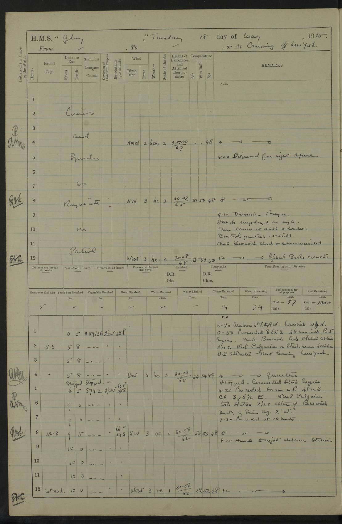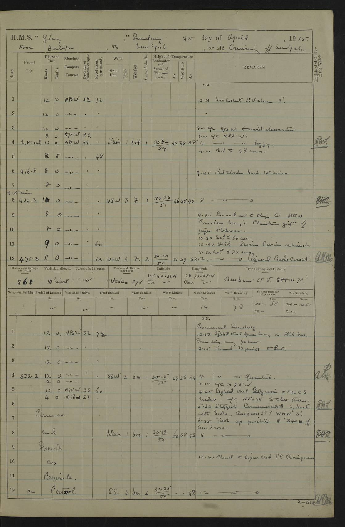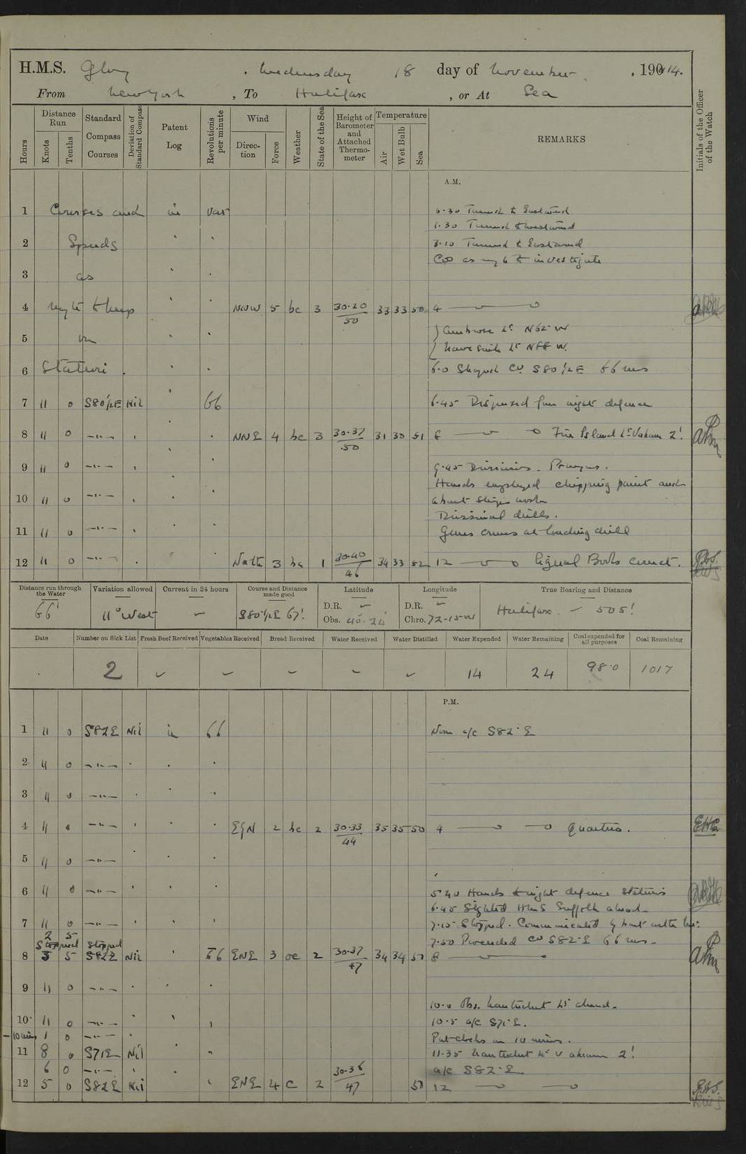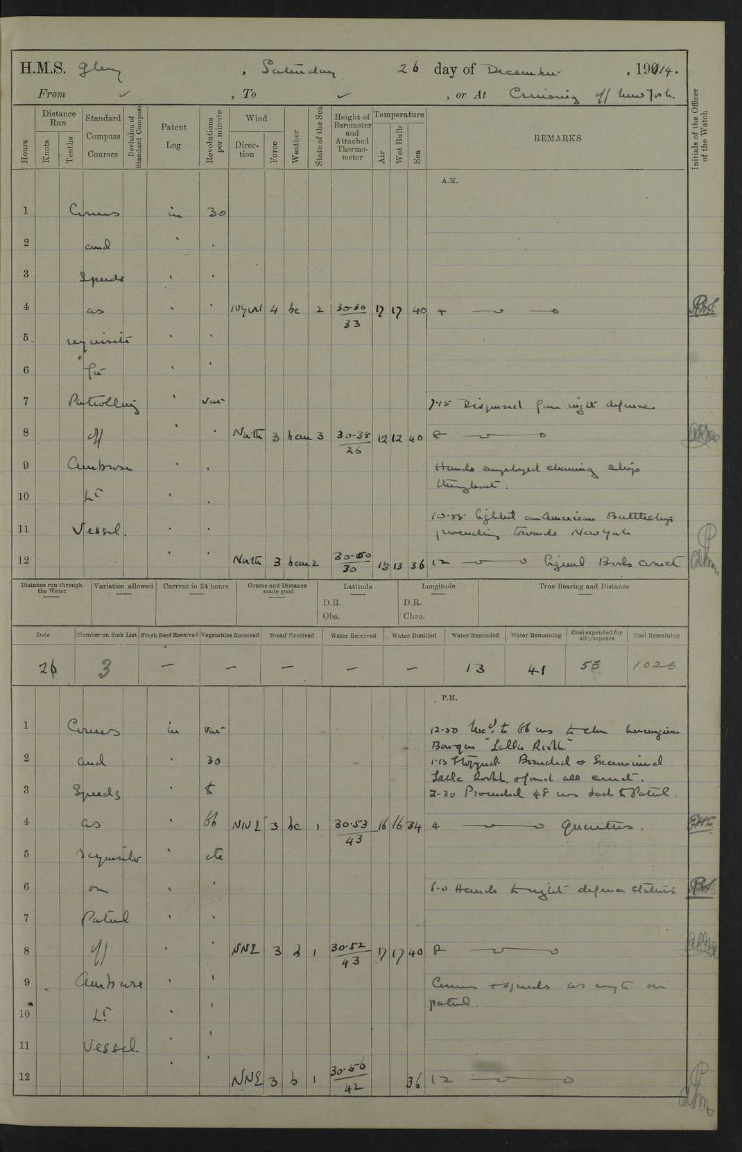 4f73cd06a2fc8ea903001489: (https://s3.amazonaws.com:443/oldweather/ADM53-43011/0072_0.jpg) 17 August 1914 Halifax Lat 44.63, Long -63.55 Number on sick list: 11 6.00am: Commenced coaling from Patent fuel sheds on jetty. 1.30pm: Finished coaling. pm: Washed down upper deck. 4f73cd06a2fc8ea90300148a: (https://s3.amazonaws.com:443/oldweather/ADM53-43011/0072_1.jpg) 18 August 1914 Halifax Lat 44.63, Long -63.55 Number on sick list: 10 4f73cd07a2fc8ea90300148b: (https://s3.amazonaws.com:443/oldweather/ADM53-43011/0073_0.jpg) 19 August 1914 Halifax Lat 44.63, Long -63.55 Number on sick list: 7 5.05am: Slipped from jetty and proceeded as requisite to anchorage in stream. 5.45am: Stopped. Let go Port anchor. am: Preparing for coaling. 9.00am: Collier Brinkwood made fast alongside (Starboard side). 10.10am: Commenced coaling. 9.40pm: Finished coaling. Received 1080 tons. 4f73cd07a2fc8ea90300148c: (https://s3.amazonaws.com:443/oldweather/ADM53-43011/0073_1.jpg) 20 August 1914 Halifax Lat 44.63, Long -63.55 Number on sick list: 7 am: Employed unrigging collier and gear etc. 7.15am: Collier left ship. 5.15pm: Hands to bathe. 4f73cd07a2fc8ea90300148d: (https://s3.amazonaws.com:443/oldweather/ADM53-43011/0074_0.jpg) 21 August 1914 Halifax Lat 44.63, Long -63.55 Number on sick list: 7 pm: Testing gun sights. 8.30pm: Exercised darken ship. 9.15pm: Opened deadlights etc. 4f73cd07a2fc8ea90300148e: (https://s3.amazonaws.com:443/oldweather/ADM53-43011/0074_1.jpg) 22 August 1914 Halifax Lat 44.63, Long -63.55 Number on sick list: 8 am: Aired night clothing. pm: Employed disembarking spare torpedo booms and other gear. pm: Tested lifebuoys. Found correct. 4f73cd08a2fc8ea90300148f: (https://s3.amazonaws.com:443/oldweather/ADM53-43011/0075_0.jpg) 23 August 1914 Halifax and at Sea Lat 44.63, Long -63.55 Number on sick list: 7 10.00am: Held Divine Service on board. am: Preparing for sea. 11.45am: Weighed and proceeded as requisite out of harbour. 12.50pm: Entered War Channel. 3.20pm: a/c S59ºW for rendezvous. 7.25pm: Observed HMS Suffolk 1 pt on starboard bow. HMS Suffolk was a Kent class armoured cruiser, launched at Portsmouth Dockyard in 1903, and sold in 1920. Details at http://en.wikipedia.org/wiki/HMS_Suffolk_(1903) . 8.00pm: Stopped at rendezvous. Communicated by boat with Suffolk. 9.30pm: Fog shut down. 9.00pm: Hands to night defence stations. 9.30pm: Fog shut down.9.45pm: Proceeded. 10.50pm: Fog cleared. 4f73cd08a2fc8ea903001490: (https://s3.amazonaws.com:443/oldweather/ADM53-43011/0075_1.jpg) 24 August 1914 At sea, Halifax to New York Lat 41.9, Long -66.4 Number on sick list: 9 5.30am: Dispersed from night defence. 10.20am: a/c to speak merchant steamer bearing WNW (SS Hurley of Montreal). 10.40am: a/c south. Stopped. Dropped target. 11.00am: Carried out aiming rifle practice. 12.10pm: Stopped. 1.20pm: Dropped second target. Carried out aiming rifle and sub calibre practice. 2.50pm: Fog shut down. pm: Hands at night defence stations. 10.45pm: Fog clearing. 4f73cd08a2fc8ea903001491: (https://s3.amazonaws.com:443/oldweather/ADM53-43011/0076_0.jpg) 25 August 1914 Patrolling off New York Lat 40.6, Long -70.0 Number on sick list: 8 5.40am: Dispersed from night defence. 6.10am: Observed sail N30ºW/ a/c N30ºW. Reduced to 60 revs. 6.50am: Resumed course. Abeam sail (Alicia B. Crosby). 9.36am: Sighted Nantucket Light N65ºW. 10.15am: Met Mason Lines Antilles. 10.25am: Nantucket Light Vessel abeam, 1.2 miles. 6.00pm: Sighted cruiser ahead. 6.10pm: Action. 6.25pm: Dispersed. 6.40pm: Stopped and signalled HMS Essex. HMS Essex was an armoured cruiser of the Kent class, launched in 1901 at Pembroke Dockyard and sold in 1921. Details at http://en.wikipedia.org/wiki/HMS_Essex_(1901) . 7.00pm: Proceeded as requisite. 7.25pm: Sighted steamer. a/c N60ºW, 60 revs. 7.35pm: Turned to east in company with SS Uranium. 8.00pm: Hands to night defence. 8.05pm: Stopped. Communicated by boat with Uranium. 9.23pm: Proceeded, course as requisite to northward to investigate searchlights. pm: Connected conning tower steaming gear. 4f73cd08a2fc8ea903001492: (https://s3.amazonaws.com:443/oldweather/ADM53-43011/0076_1.jpg) 26 August 1914 Patrolling off New York Lat 40.4, Long -73.6 Number on sick list: 11 5.16am: Fire Island Light abeam 7 miles. 7.00am: a/c N49ºW on sighting steamer to north. 8.25am: Sighted Ambrose Light Vessel. 1.00pm: Courses as requisite investigating shipping off Ambrose Light Vessel and Waveside. 2.15pm: Stopped, communicated by boat with SS Van der Duyn. 2.55pm: Proceeded as requisite. 5.26pm: In company with steamers New York and Commanchee. 6.17pm: Connected up fore bridge steering gear. 7.12pm: a/c to south to close steamer (St Louis). 7.25pm: Resumed course. 9.00pm: Hands to night defence. 4f73cd09a2fc8ea903001493: (https://s3.amazonaws.com:443/oldweather/ADM53-43011/0077_0.jpg) 27 August 1914 Patrolling off New York Lat 40.5, Long -72.3 Number on sick list: 10 5.45pm: Dispersed from night defence. 7.12am: a/c as requisite to close merchantman (Wilson Line Francisco). 7.55am: Resumed course. 9.55am: a/c to close Norwegian ship. 10.10am: Stopped, communicated with her by boat (SS Bjornstjerne Bjornsen). 10.50am: Proceeded N30ºE to close Circadian. 3.55pm: Fire Island Light Vessel abeam 2¾ miles. 4.12pm: Reduced to 36 revs. Passed SS Baltic. 5.35pm: Connected up conning tower steering gear. 6.40pm: Ambrose Light Vessel N33ºW, 7 miles. 7.00pm: Connected up fore bridge steering gear. 9.00pm: Hands to night defence stations. 4f73cd09a2fc8ea903001494: (https://s3.amazonaws.com:443/oldweather/ADM53-43011/0077_1.jpg) 28 August 1914 At sea, New York to Boston Lat 40.2, Long -70.8 Number on sick list: 9 5.45am: Dispersed from night defence. 8.40am: Sighted steamer (SS Ran) bearing S50ºE. 9.10am: Resumed course. am: Divisional drills. Preparing for target practice. 10.45am: Sighted steamer bearing N55ºE. 11.32am: Resumed course (SS Skjorldborg). 1.25pm: Stopped. Dropped target. 1.29pm: Proceeded, course as requi
