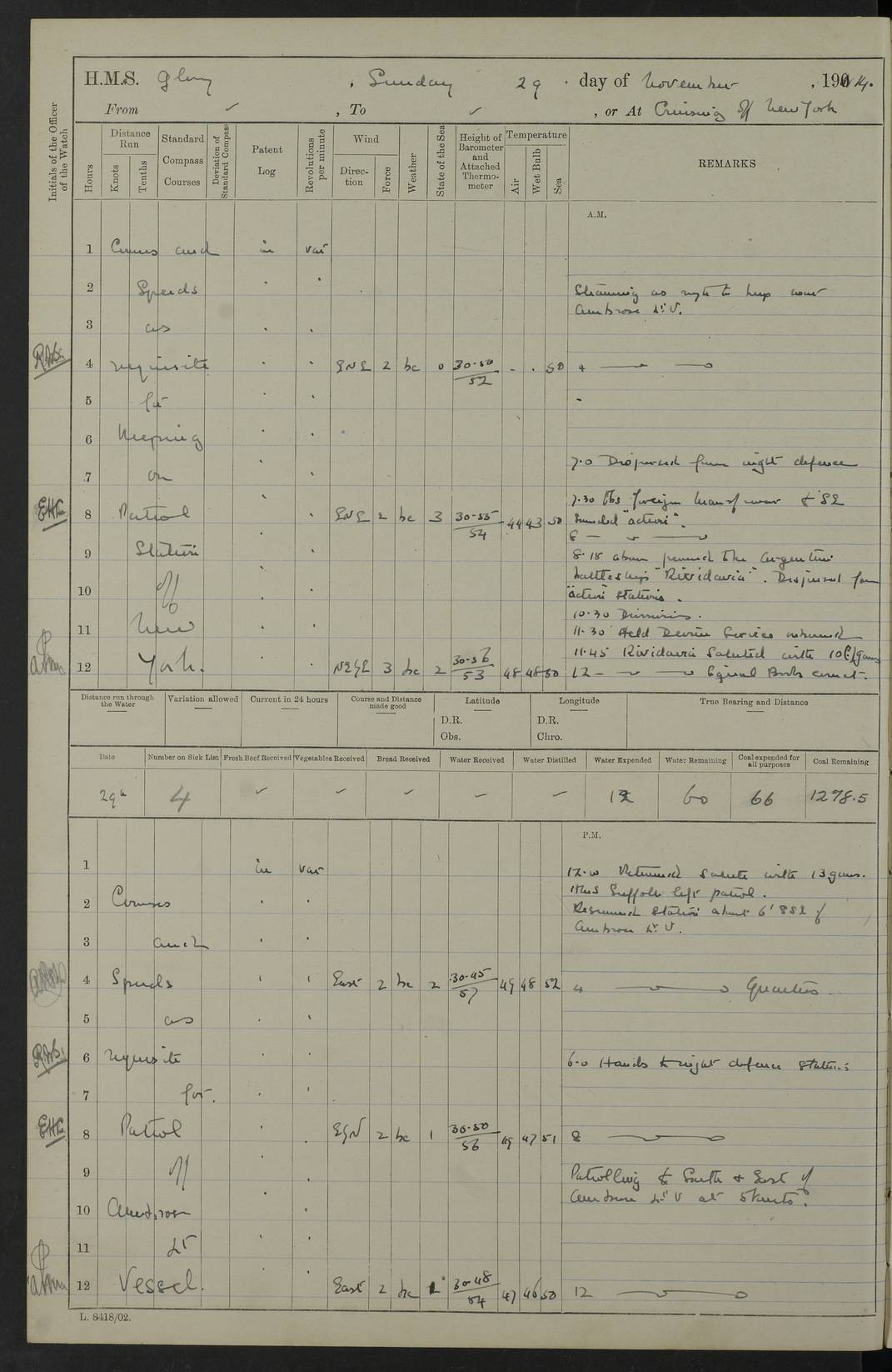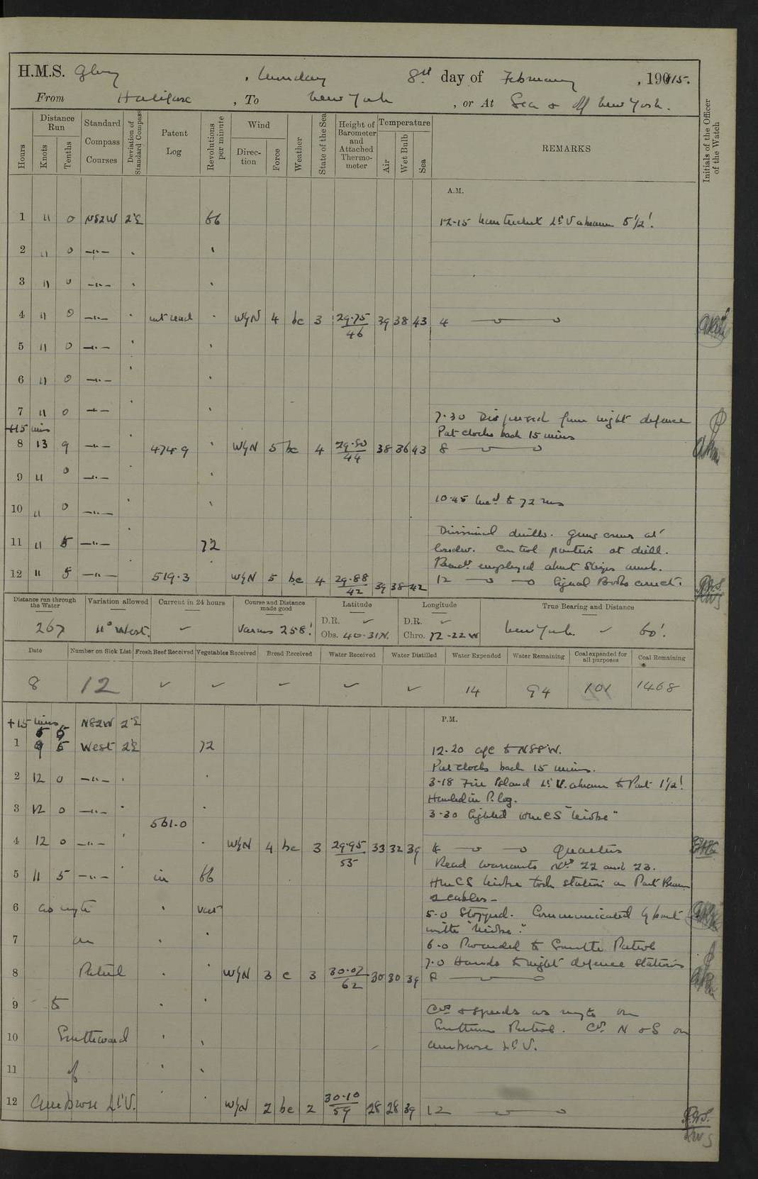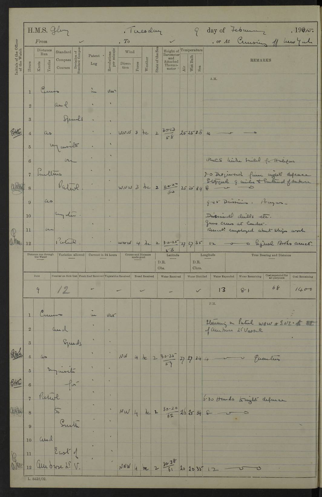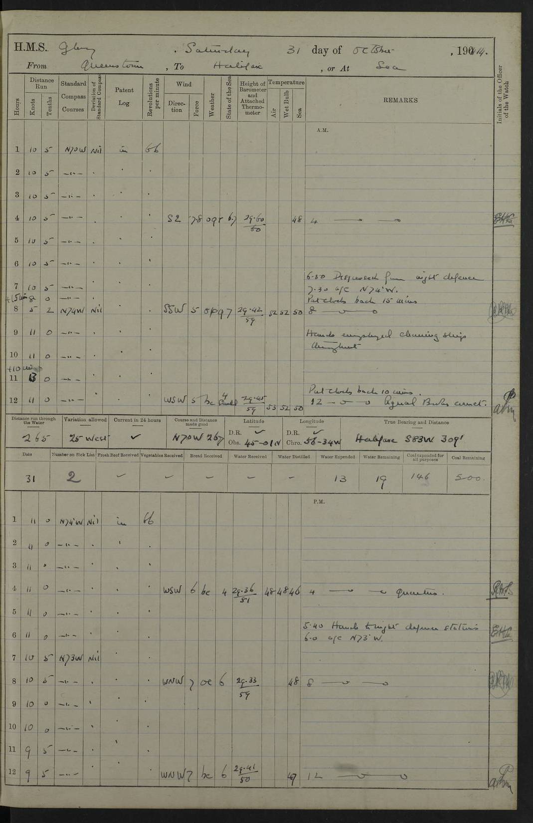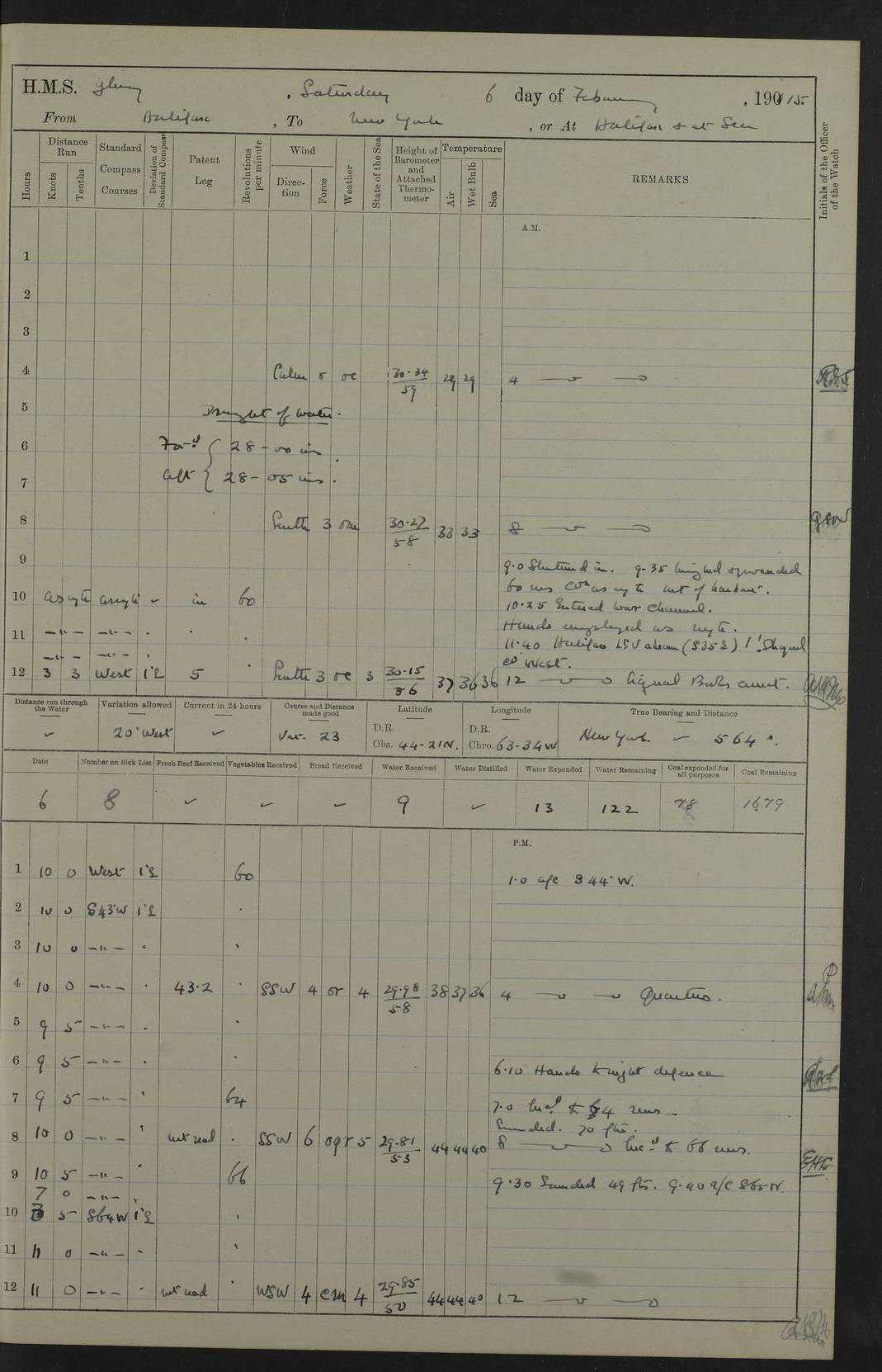 4f73cd06a2fc8ea903001489: (https://s3.amazonaws.com:443/oldweather/ADM53-43011/0072_0.jpg) 17 August 1914 Halifax Lat 44.63, Long -63.55 Number on sick list: 11 6.00am: Commenced coaling from Patent fuel sheds on jetty. 1.30pm: Finished coaling. pm: Washed down upper deck. 4f73cd06a2fc8ea90300148a: (https://s3.amazonaws.com:443/oldweather/ADM53-43011/0072_1.jpg) 18 August 1914 Halifax Lat 44.63, Long -63.55 Number on sick list: 10 4f73cd07a2fc8ea90300148b: (https://s3.amazonaws.com:443/oldweather/ADM53-43011/0073_0.jpg) 19 August 1914 Halifax Lat 44.63, Long -63.55 Number on sick list: 7 5.05am: Slipped from jetty and proceeded as requisite to anchorage in stream. 5.45am: Stopped. Let go Port anchor. am: Preparing for coaling. 9.00am: Collier Brinkwood made fast alongside (Starboard side). 10.10am: Commenced coaling. 9.40pm: Finished coaling. Received 1080 tons. 4f73cd07a2fc8ea90300148c: (https://s3.amazonaws.com:443/oldweather/ADM53-43011/0073_1.jpg) 20 August 1914 Halifax Lat 44.63, Long -63.55 Number on sick list: 7 am: Employed unrigging collier and gear etc. 7.15am: Collier left ship. 5.15pm: Hands to bathe. 4f73cd07a2fc8ea90300148d: (https://s3.amazonaws.com:443/oldweather/ADM53-43011/0074_0.jpg) 21 August 1914 Halifax Lat 44.63, Long -63.55 Number on sick list: 7 pm: Testing gun sights. 8.30pm: Exercised darken ship. 9.15pm: Opened deadlights etc. 4f73cd07a2fc8ea90300148e: (https://s3.amazonaws.com:443/oldweather/ADM53-43011/0074_1.jpg) 22 August 1914 Halifax Lat 44.63, Long -63.55 Number on sick list: 8 am: Aired night clothing. pm: Employed disembarking spare torpedo booms and other gear. pm: Tested lifebuoys. Found correct. 4f73cd08a2fc8ea90300148f: (https://s3.amazonaws.com:443/oldweather/ADM53-43011/0075_0.jpg) 23 August 1914 Halifax and at Sea Lat 44.63, Long -63.55 Number on sick list: 7 10.00am: Held Divine Service on board. am: Preparing for sea. 11.45am: Weighed and proceeded as requisite out of harbour. 12.50pm: Entered War Channel. 3.20pm: a/c S59ºW for rendezvous. 7.25pm: Observed HMS Suffolk 1 pt on starboard bow. HMS Suffolk was a Kent class armoured cruiser, launched at Portsmouth Dockyard in 1903, and sold in 1920. Details at http://en.wikipedia.org/wiki/HMS_Suffolk_(1903) . 8.00pm: Stopped at rendezvous. Communicated by boat with Suffolk. 9.30pm: Fog shut down. 9.00pm: Hands to night defence stations. 9.30pm: Fog shut down.9.45pm: Proceeded. 10.50pm: Fog cleared. 4f73cd08a2fc8ea903001490: (https://s3.amazonaws.com:443/oldweather/ADM53-43011/0075_1.jpg) 24 August 1914 At sea, Halifax to New York Lat 41.9, Long -66.4 Number on sick list: 9 5.30am: Dispersed from night defence. 10.20am: a/c to speak merchant steamer bearing WNW (SS Hurley of Montreal). 10.40am: a/c south. Stopped. Dropped target. 11.00am: Carried out aiming rifle practice. 12.10pm: Stopped. 1.20pm: Dropped second target. Carried out aiming rifle and sub calibre practice. 2.50pm: Fog shut down. pm: Hands at night defence stations. 10.45pm: Fog clearing. 4f73cd08a2fc8ea903001491: (https://s3.amazonaws.com:443/oldweather/ADM53-43011/0076_0.jpg) 25 August 1914 Patrolling off New York Lat 40.6, Long -70.0 Number on sick list: 8 5.40am: Dispersed from night defence. 6.10am: Observed sail N30ºW/ a/c N30ºW. Reduced to 60 revs. 6.50am: Resumed course. Abeam sail (Alicia B. Crosby). 9.36am: Sighted Nantucket Light N65ºW. 10.15am: Met Mason Lines Antilles. 10.25am: Nantucket Light Vessel abeam, 1.2 miles. 6.00pm: Sighted cruiser ahead. 6.10pm: Action. 6.25pm: Dispersed. 6.40pm: Stopped and signalled HMS Essex. HMS Essex was an armoured cruiser of the Kent class, launched in 1901 at Pembroke Dockyard and sold in 1921. Details at http://en.wikipedia.org/wiki/HMS_Essex_(1901) . 7.00pm: Proceeded as requisite. 7.25pm: Sighted steamer. a/c N60ºW, 60 revs. 7.35pm: Turned to east in company with SS Uranium. 8.00pm: Hands to night defence. 8.05pm: Stopped. Communicated by boat with Uranium. 9.23pm: Proceeded, course as requisite to northward to investigate searchlights. pm: Connected conning tower steaming gear. 4f73cd08a2fc8ea903001492: (https://s3.amazonaws.com:443/oldweather/ADM53-43011/0076_1.jpg) 26 August 1914 Patrolling off New York Lat 40.4, Long -73.6 Number on sick list: 11 5.16am: Fire Island Light abeam 7 miles. 7.00am: a/c N49ºW on sighting steamer to north. 8.25am: Sighted Ambrose Light Vessel. 1.00pm: Courses as requisite investigating shipping off Ambrose Light Vessel and Waveside. 2.15pm: Stopped, communicated by boat with SS Van der Duyn. 2.55pm: Proceeded as requisite. 5.26pm: In company with steamers New York and Commanchee. 6.17pm: Connected up fore bridge steering gear. 7.12pm: a/c to south to close steamer (St Louis). 7.25pm: Resumed course. 9.00pm: Hands to night defence. 4f73cd09a2fc8ea903001493: (https://s3.amazonaws.com:443/oldweather/ADM53-43011/0077_0.jpg) 27 August 1914 Patrolling off New York Lat 40.5, Long -72.3 Number on sick list: 10 5.45pm: Dispersed from night defence. 7.12am: a/c as requisite to close merchantman (Wilson Line Francisco). 7.55am: Resumed course. 9.55am: a/c to close Norwegian ship. 10.10am: Stopped, communicated with her by boat (SS Bjornstjerne Bjornsen). 10.50am: Proceeded N30ºE to close Circadian. 3.55pm: Fire Island Light Vessel abeam 2¾ miles. 4.12pm: Reduced to 36 revs. Passed SS Baltic. 5.35pm: Connected up conning tower steering gear. 6.40pm: Ambrose Light Vessel N33ºW, 7 miles. 7.00pm: Connected up fore bridge steering gear. 9.00pm: Hands to night defence stations. 4f73cd09a2fc8ea903001494: (https://s3.amazonaws.com:443/oldweather/ADM53-43011/0077_1.jpg) 28 August 1914 At sea, New York to Boston Lat 40.2, Long -70.8 Number on sick list: 9 5.45am: Dispersed from night defence. 8.40am: Sighted steamer (SS Ran) bearing S50ºE. 9.10am: Resumed course. am: Divisional drills. Preparing for target practice. 10.45am: Sighted steamer bearing N55ºE. 11.32am: Resumed course (SS Skjorldborg). 1.25pm: Stopped. Dropped target. 1.29pm: Proceeded, course as requi