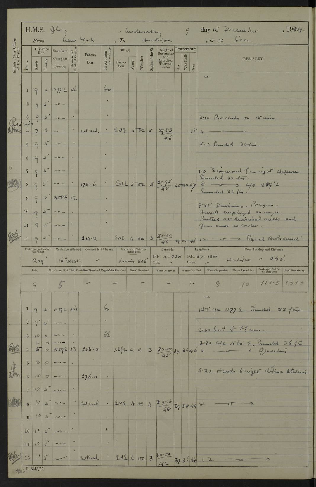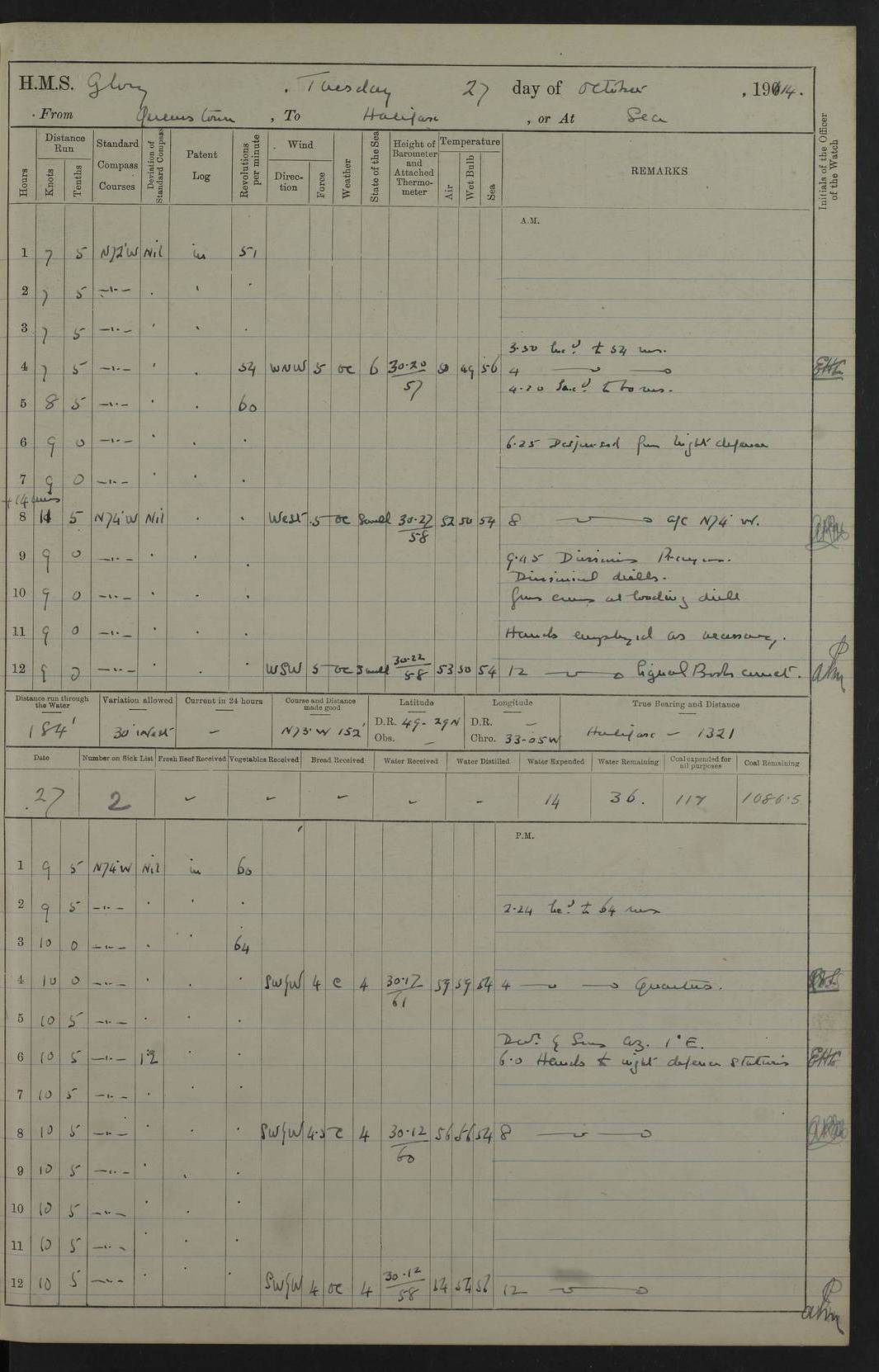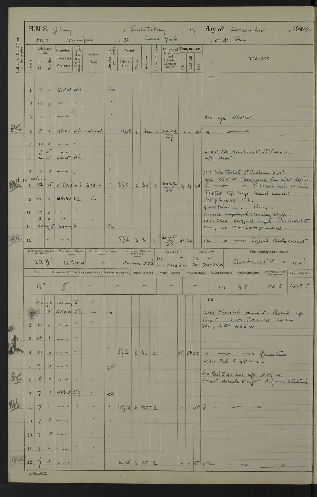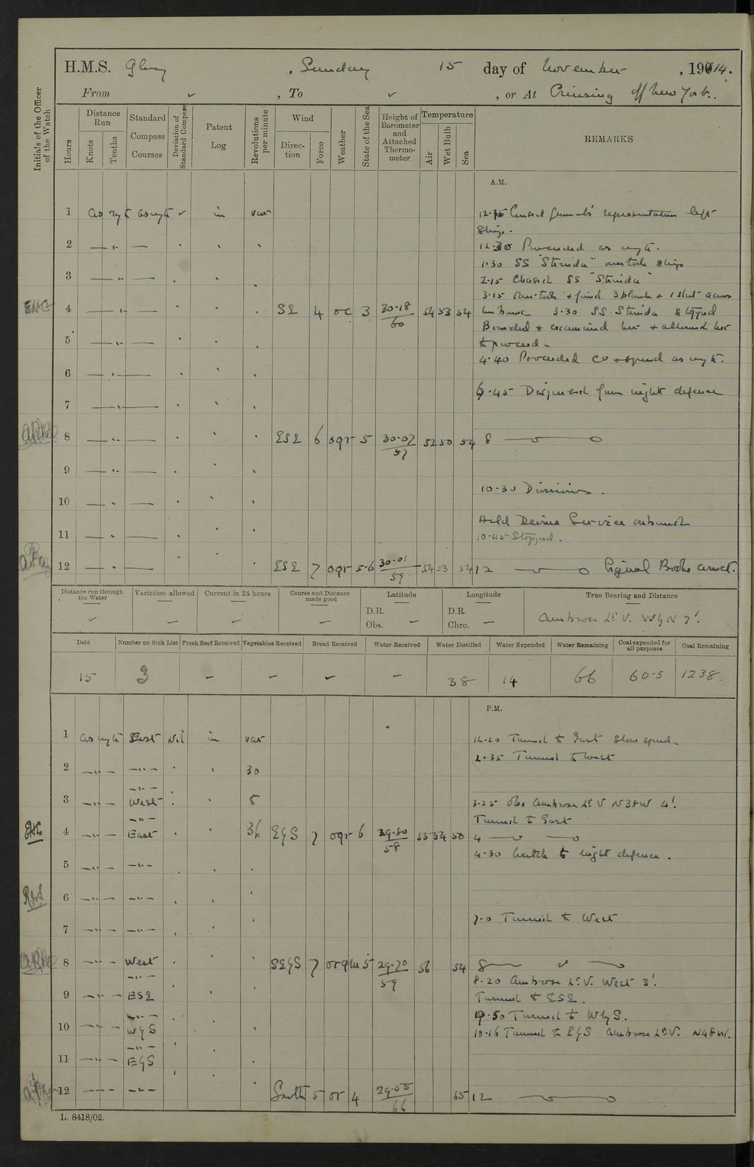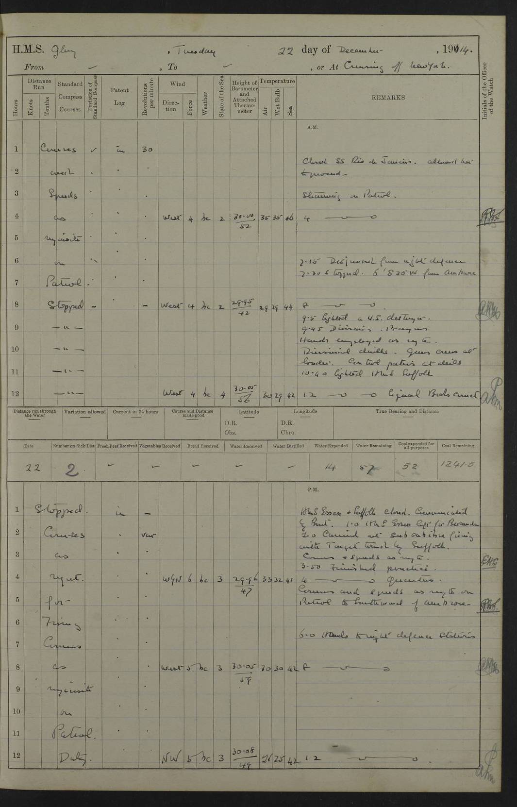 4f73cd06a2fc8ea903001489: (https://s3.amazonaws.com:443/oldweather/ADM53-43011/0072_0.jpg) 17 August 1914 Halifax Lat 44.63, Long -63.55 Number on sick list: 11 6.00am: Commenced coaling from Patent fuel sheds on jetty. 1.30pm: Finished coaling. pm: Washed down upper deck. 4f73cd06a2fc8ea90300148a: (https://s3.amazonaws.com:443/oldweather/ADM53-43011/0072_1.jpg) 18 August 1914 Halifax Lat 44.63, Long -63.55 Number on sick list: 10 4f73cd07a2fc8ea90300148b: (https://s3.amazonaws.com:443/oldweather/ADM53-43011/0073_0.jpg) 19 August 1914 Halifax Lat 44.63, Long -63.55 Number on sick list: 7 5.05am: Slipped from jetty and proceeded as requisite to anchorage in stream. 5.45am: Stopped. Let go Port anchor. am: Preparing for coaling. 9.00am: Collier Brinkwood made fast alongside (Starboard side). 10.10am: Commenced coaling. 9.40pm: Finished coaling. Received 1080 tons. 4f73cd07a2fc8ea90300148c: (https://s3.amazonaws.com:443/oldweather/ADM53-43011/0073_1.jpg) 20 August 1914 Halifax Lat 44.63, Long -63.55 Number on sick list: 7 am: Employed unrigging collier and gear etc. 7.15am: Collier left ship. 5.15pm: Hands to bathe. 4f73cd07a2fc8ea90300148d: (https://s3.amazonaws.com:443/oldweather/ADM53-43011/0074_0.jpg) 21 August 1914 Halifax Lat 44.63, Long -63.55 Number on sick list: 7 pm: Testing gun sights. 8.30pm: Exercised darken ship. 9.15pm: Opened deadlights etc. 4f73cd07a2fc8ea90300148e: (https://s3.amazonaws.com:443/oldweather/ADM53-43011/0074_1.jpg) 22 August 1914 Halifax Lat 44.63, Long -63.55 Number on sick list: 8 am: Aired night clothing. pm: Employed disembarking spare torpedo booms and other gear. pm: Tested lifebuoys. Found correct. 4f73cd08a2fc8ea90300148f: (https://s3.amazonaws.com:443/oldweather/ADM53-43011/0075_0.jpg) 23 August 1914 Halifax and at Sea Lat 44.63, Long -63.55 Number on sick list: 7 10.00am: Held Divine Service on board. am: Preparing for sea. 11.45am: Weighed and proceeded as requisite out of harbour. 12.50pm: Entered War Channel. 3.20pm: a/c S59ºW for rendezvous. 7.25pm: Observed HMS Suffolk 1 pt on starboard bow. HMS Suffolk was a Kent class armoured cruiser, launched at Portsmouth Dockyard in 1903, and sold in 1920. Details at http://en.wikipedia.org/wiki/HMS_Suffolk_(1903) . 8.00pm: Stopped at rendezvous. Communicated by boat with Suffolk. 9.30pm: Fog shut down. 9.00pm: Hands to night defence stations. 9.30pm: Fog shut down.9.45pm: Proceeded. 10.50pm: Fog cleared. 4f73cd08a2fc8ea903001490: (https://s3.amazonaws.com:443/oldweather/ADM53-43011/0075_1.jpg) 24 August 1914 At sea, Halifax to New York Lat 41.9, Long -66.4 Number on sick list: 9 5.30am: Dispersed from night defence. 10.20am: a/c to speak merchant steamer bearing WNW (SS Hurley of Montreal). 10.40am: a/c south. Stopped. Dropped target. 11.00am: Carried out aiming rifle practice. 12.10pm: Stopped. 1.20pm: Dropped second target. Carried out aiming rifle and sub calibre practice. 2.50pm: Fog shut down. pm: Hands at night defence stations. 10.45pm: Fog clearing. 4f73cd08a2fc8ea903001491: (https://s3.amazonaws.com:443/oldweather/ADM53-43011/0076_0.jpg) 25 August 1914 Patrolling off New York Lat 40.6, Long -70.0 Number on sick list: 8 5.40am: Dispersed from night defence. 6.10am: Observed sail N30ºW/ a/c N30ºW. Reduced to 60 revs. 6.50am: Resumed course. Abeam sail (Alicia B. Crosby). 9.36am: Sighted Nantucket Light N65ºW. 10.15am: Met Mason Lines Antilles. 10.25am: Nantucket Light Vessel abeam, 1.2 miles. 6.00pm: Sighted cruiser ahead. 6.10pm: Action. 6.25pm: Dispersed. 6.40pm: Stopped and signalled HMS Essex. HMS Essex was an armoured cruiser of the Kent class, launched in 1901 at Pembroke Dockyard and sold in 1921. Details at http://en.wikipedia.org/wiki/HMS_Essex_(1901) . 7.00pm: Proceeded as requisite. 7.25pm: Sighted steamer. a/c N60ºW, 60 revs. 7.35pm: Turned to east in company with SS Uranium. 8.00pm: Hands to night defence. 8.05pm: Stopped. Communicated by boat with Uranium. 9.23pm: Proceeded, course as requisite to northward to investigate searchlights. pm: Connected conning tower steaming gear. 4f73cd08a2fc8ea903001492: (https://s3.amazonaws.com:443/oldweather/ADM53-43011/0076_1.jpg) 26 August 1914 Patrolling off New York Lat 40.4, Long -73.6 Number on sick list: 11 5.16am: Fire Island Light abeam 7 miles. 7.00am: a/c N49ºW on sighting steamer to north. 8.25am: Sighted Ambrose Light Vessel. 1.00pm: Courses as requisite investigating shipping off Ambrose Light Vessel and Waveside. 2.15pm: Stopped, communicated by boat with SS Van der Duyn. 2.55pm: Proceeded as requisite. 5.26pm: In company with steamers New York and Commanchee. 6.17pm: Connected up fore bridge steering gear. 7.12pm: a/c to south to close steamer (St Louis). 7.25pm: Resumed course. 9.00pm: Hands to night defence. 4f73cd09a2fc8ea903001493: (https://s3.amazonaws.com:443/oldweather/ADM53-43011/0077_0.jpg) 27 August 1914 Patrolling off New York Lat 40.5, Long -72.3 Number on sick list: 10 5.45pm: Dispersed from night defence. 7.12am: a/c as requisite to close merchantman (Wilson Line Francisco). 7.55am: Resumed course. 9.55am: a/c to close Norwegian ship. 10.10am: Stopped, communicated with her by boat (SS Bjornstjerne Bjornsen). 10.50am: Proceeded N30ºE to close Circadian. 3.55pm: Fire Island Light Vessel abeam 2¾ miles. 4.12pm: Reduced to 36 revs. Passed SS Baltic. 5.35pm: Connected up conning tower steering gear. 6.40pm: Ambrose Light Vessel N33ºW, 7 miles. 7.00pm: Connected up fore bridge steering gear. 9.00pm: Hands to night defence stations. 4f73cd09a2fc8ea903001494: (https://s3.amazonaws.com:443/oldweather/ADM53-43011/0077_1.jpg) 28 August 1914 At sea, New York to Boston Lat 40.2, Long -70.8 Number on sick list: 9 5.45am: Dispersed from night defence. 8.40am: Sighted steamer (SS Ran) bearing S50ºE. 9.10am: Resumed course. am: Divisional drills. Preparing for target practice. 10.45am: Sighted steamer bearing N55ºE. 11.32am: Resumed course (SS Skjorldborg). 1.25pm: Stopped. Dropped target. 1.29pm: Proceeded, course as requi