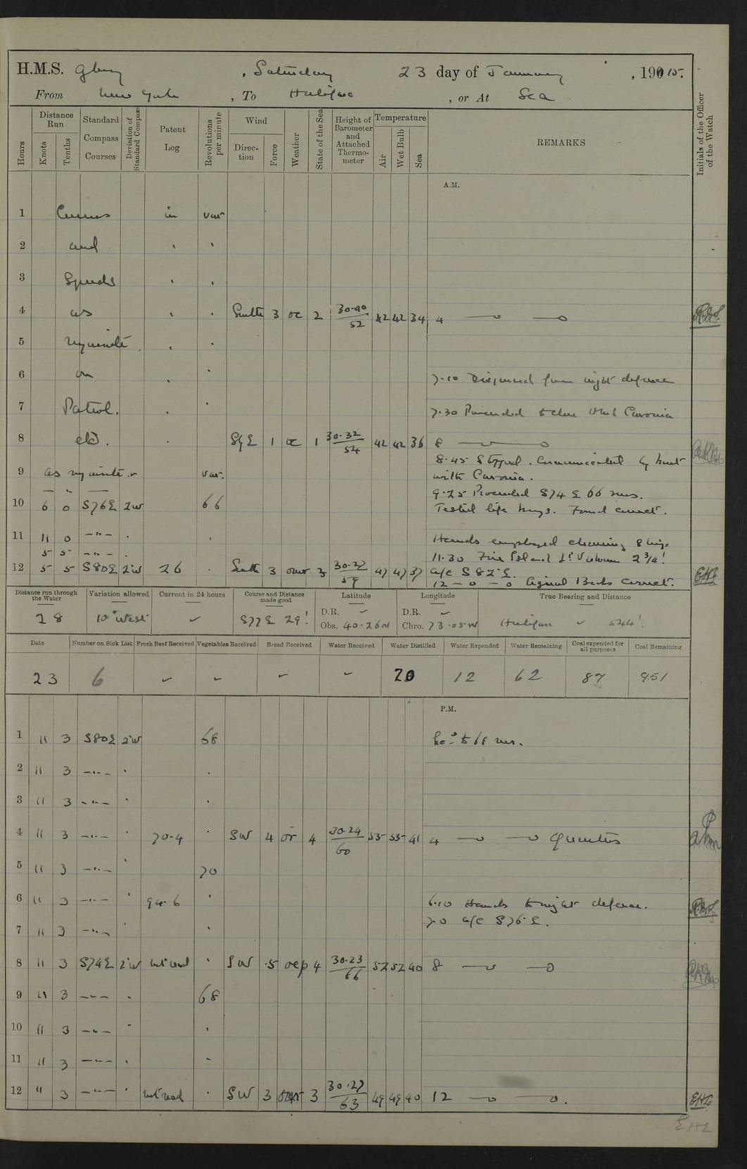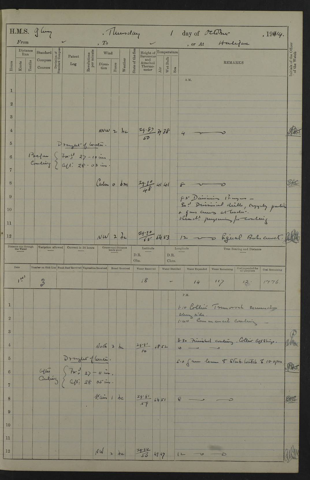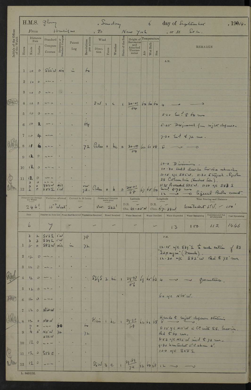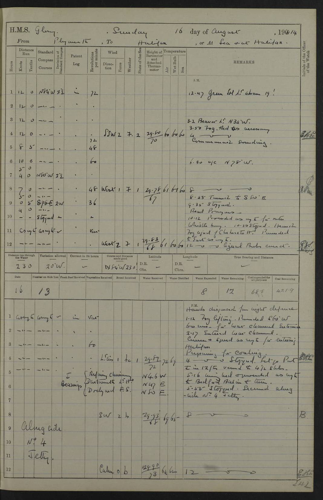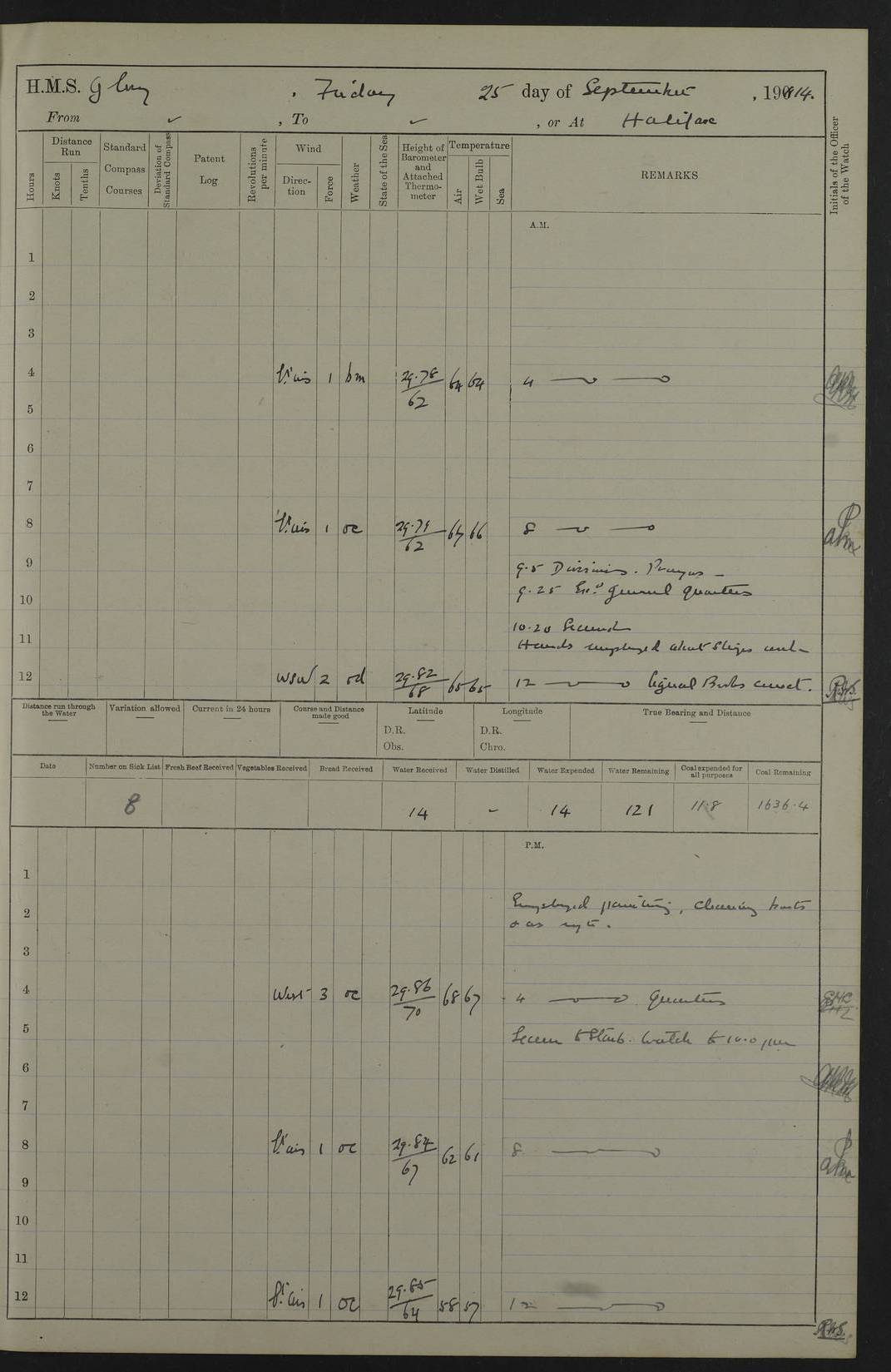 4f73cd06a2fc8ea903001489: (https://s3.amazonaws.com:443/oldweather/ADM53-43011/0072_0.jpg) 17 August 1914 Halifax Lat 44.63, Long -63.55 Number on sick list: 11 6.00am: Commenced coaling from Patent fuel sheds on jetty. 1.30pm: Finished coaling. pm: Washed down upper deck. 4f73cd06a2fc8ea90300148a: (https://s3.amazonaws.com:443/oldweather/ADM53-43011/0072_1.jpg) 18 August 1914 Halifax Lat 44.63, Long -63.55 Number on sick list: 10 4f73cd07a2fc8ea90300148b: (https://s3.amazonaws.com:443/oldweather/ADM53-43011/0073_0.jpg) 19 August 1914 Halifax Lat 44.63, Long -63.55 Number on sick list: 7 5.05am: Slipped from jetty and proceeded as requisite to anchorage in stream. 5.45am: Stopped. Let go Port anchor. am: Preparing for coaling. 9.00am: Collier Brinkwood made fast alongside (Starboard side). 10.10am: Commenced coaling. 9.40pm: Finished coaling. Received 1080 tons. 4f73cd07a2fc8ea90300148c: (https://s3.amazonaws.com:443/oldweather/ADM53-43011/0073_1.jpg) 20 August 1914 Halifax Lat 44.63, Long -63.55 Number on sick list: 7 am: Employed unrigging collier and gear etc. 7.15am: Collier left ship. 5.15pm: Hands to bathe. 4f73cd07a2fc8ea90300148d: (https://s3.amazonaws.com:443/oldweather/ADM53-43011/0074_0.jpg) 21 August 1914 Halifax Lat 44.63, Long -63.55 Number on sick list: 7 pm: Testing gun sights. 8.30pm: Exercised darken ship. 9.15pm: Opened deadlights etc. 4f73cd07a2fc8ea90300148e: (https://s3.amazonaws.com:443/oldweather/ADM53-43011/0074_1.jpg) 22 August 1914 Halifax Lat 44.63, Long -63.55 Number on sick list: 8 am: Aired night clothing. pm: Employed disembarking spare torpedo booms and other gear. pm: Tested lifebuoys. Found correct. 4f73cd08a2fc8ea90300148f: (https://s3.amazonaws.com:443/oldweather/ADM53-43011/0075_0.jpg) 23 August 1914 Halifax and at Sea Lat 44.63, Long -63.55 Number on sick list: 7 10.00am: Held Divine Service on board. am: Preparing for sea. 11.45am: Weighed and proceeded as requisite out of harbour. 12.50pm: Entered War Channel. 3.20pm: a/c S59ºW for rendezvous. 7.25pm: Observed HMS Suffolk 1 pt on starboard bow. HMS Suffolk was a Kent class armoured cruiser, launched at Portsmouth Dockyard in 1903, and sold in 1920. Details at http://en.wikipedia.org/wiki/HMS_Suffolk_(1903) . 8.00pm: Stopped at rendezvous. Communicated by boat with Suffolk. 9.30pm: Fog shut down. 9.00pm: Hands to night defence stations. 9.30pm: Fog shut down.9.45pm: Proceeded. 10.50pm: Fog cleared. 4f73cd08a2fc8ea903001490: (https://s3.amazonaws.com:443/oldweather/ADM53-43011/0075_1.jpg) 24 August 1914 At sea, Halifax to New York Lat 41.9, Long -66.4 Number on sick list: 9 5.30am: Dispersed from night defence. 10.20am: a/c to speak merchant steamer bearing WNW (SS Hurley of Montreal). 10.40am: a/c south. Stopped. Dropped target. 11.00am: Carried out aiming rifle practice. 12.10pm: Stopped. 1.20pm: Dropped second target. Carried out aiming rifle and sub calibre practice. 2.50pm: Fog shut down. pm: Hands at night defence stations. 10.45pm: Fog clearing. 4f73cd08a2fc8ea903001491: (https://s3.amazonaws.com:443/oldweather/ADM53-43011/0076_0.jpg) 25 August 1914 Patrolling off New York Lat 40.6, Long -70.0 Number on sick list: 8 5.40am: Dispersed from night defence. 6.10am: Observed sail N30ºW/ a/c N30ºW. Reduced to 60 revs. 6.50am: Resumed course. Abeam sail (Alicia B. Crosby). 9.36am: Sighted Nantucket Light N65ºW. 10.15am: Met Mason Lines Antilles. 10.25am: Nantucket Light Vessel abeam, 1.2 miles. 6.00pm: Sighted cruiser ahead. 6.10pm: Action. 6.25pm: Dispersed. 6.40pm: Stopped and signalled HMS Essex. HMS Essex was an armoured cruiser of the Kent class, launched in 1901 at Pembroke Dockyard and sold in 1921. Details at http://en.wikipedia.org/wiki/HMS_Essex_(1901) . 7.00pm: Proceeded as requisite. 7.25pm: Sighted steamer. a/c N60ºW, 60 revs. 7.35pm: Turned to east in company with SS Uranium. 8.00pm: Hands to night defence. 8.05pm: Stopped. Communicated by boat with Uranium. 9.23pm: Proceeded, course as requisite to northward to investigate searchlights. pm: Connected conning tower steaming gear. 4f73cd08a2fc8ea903001492: (https://s3.amazonaws.com:443/oldweather/ADM53-43011/0076_1.jpg) 26 August 1914 Patrolling off New York Lat 40.4, Long -73.6 Number on sick list: 11 5.16am: Fire Island Light abeam 7 miles. 7.00am: a/c N49ºW on sighting steamer to north. 8.25am: Sighted Ambrose Light Vessel. 1.00pm: Courses as requisite investigating shipping off Ambrose Light Vessel and Waveside. 2.15pm: Stopped, communicated by boat with SS Van der Duyn. 2.55pm: Proceeded as requisite. 5.26pm: In company with steamers New York and Commanchee. 6.17pm: Connected up fore bridge steering gear. 7.12pm: a/c to south to close steamer (St Louis). 7.25pm: Resumed course. 9.00pm: Hands to night defence. 4f73cd09a2fc8ea903001493: (https://s3.amazonaws.com:443/oldweather/ADM53-43011/0077_0.jpg) 27 August 1914 Patrolling off New York Lat 40.5, Long -72.3 Number on sick list: 10 5.45pm: Dispersed from night defence. 7.12am: a/c as requisite to close merchantman (Wilson Line Francisco). 7.55am: Resumed course. 9.55am: a/c to close Norwegian ship. 10.10am: Stopped, communicated with her by boat (SS Bjornstjerne Bjornsen). 10.50am: Proceeded N30ºE to close Circadian. 3.55pm: Fire Island Light Vessel abeam 2¾ miles. 4.12pm: Reduced to 36 revs. Passed SS Baltic. 5.35pm: Connected up conning tower steering gear. 6.40pm: Ambrose Light Vessel N33ºW, 7 miles. 7.00pm: Connected up fore bridge steering gear. 9.00pm: Hands to night defence stations. 4f73cd09a2fc8ea903001494: (https://s3.amazonaws.com:443/oldweather/ADM53-43011/0077_1.jpg) 28 August 1914 At sea, New York to Boston Lat 40.2, Long -70.8 Number on sick list: 9 5.45am: Dispersed from night defence. 8.40am: Sighted steamer (SS Ran) bearing S50ºE. 9.10am: Resumed course. am: Divisional drills. Preparing for target practice. 10.45am: Sighted steamer bearing N55ºE. 11.32am: Resumed course (SS Skjorldborg). 1.25pm: Stopped. Dropped target. 1.29pm: Proceeded, course as requi
