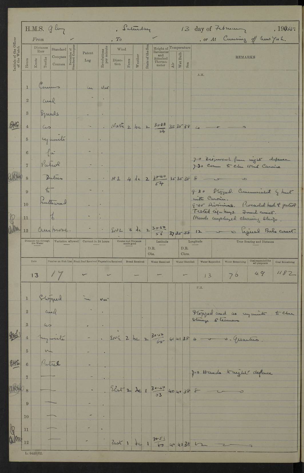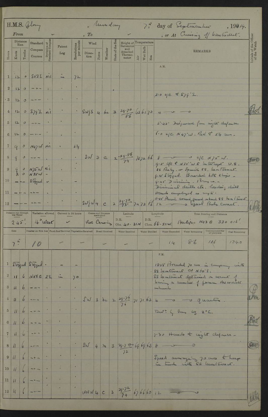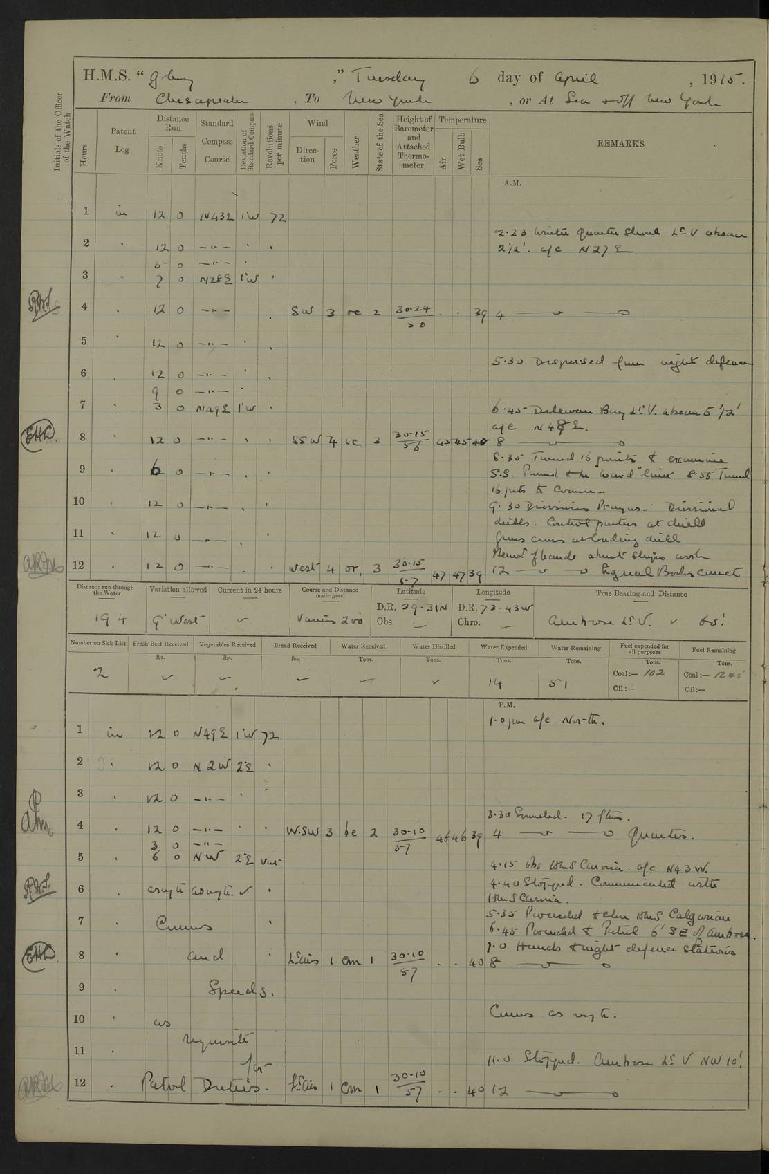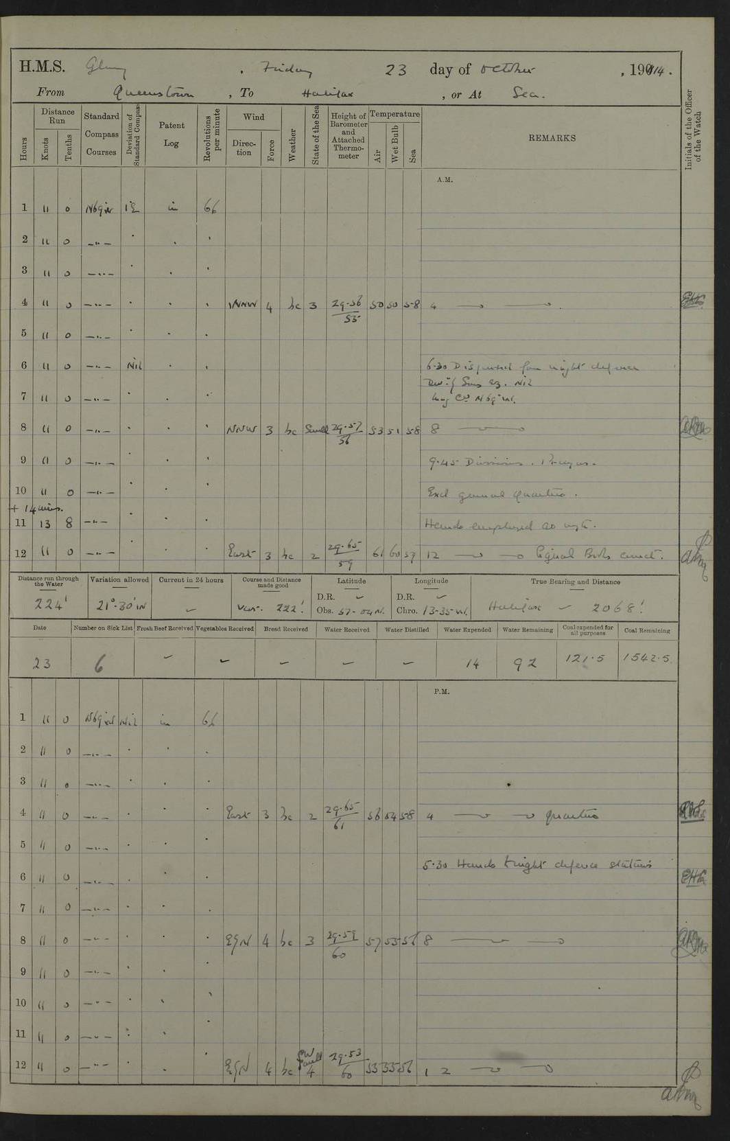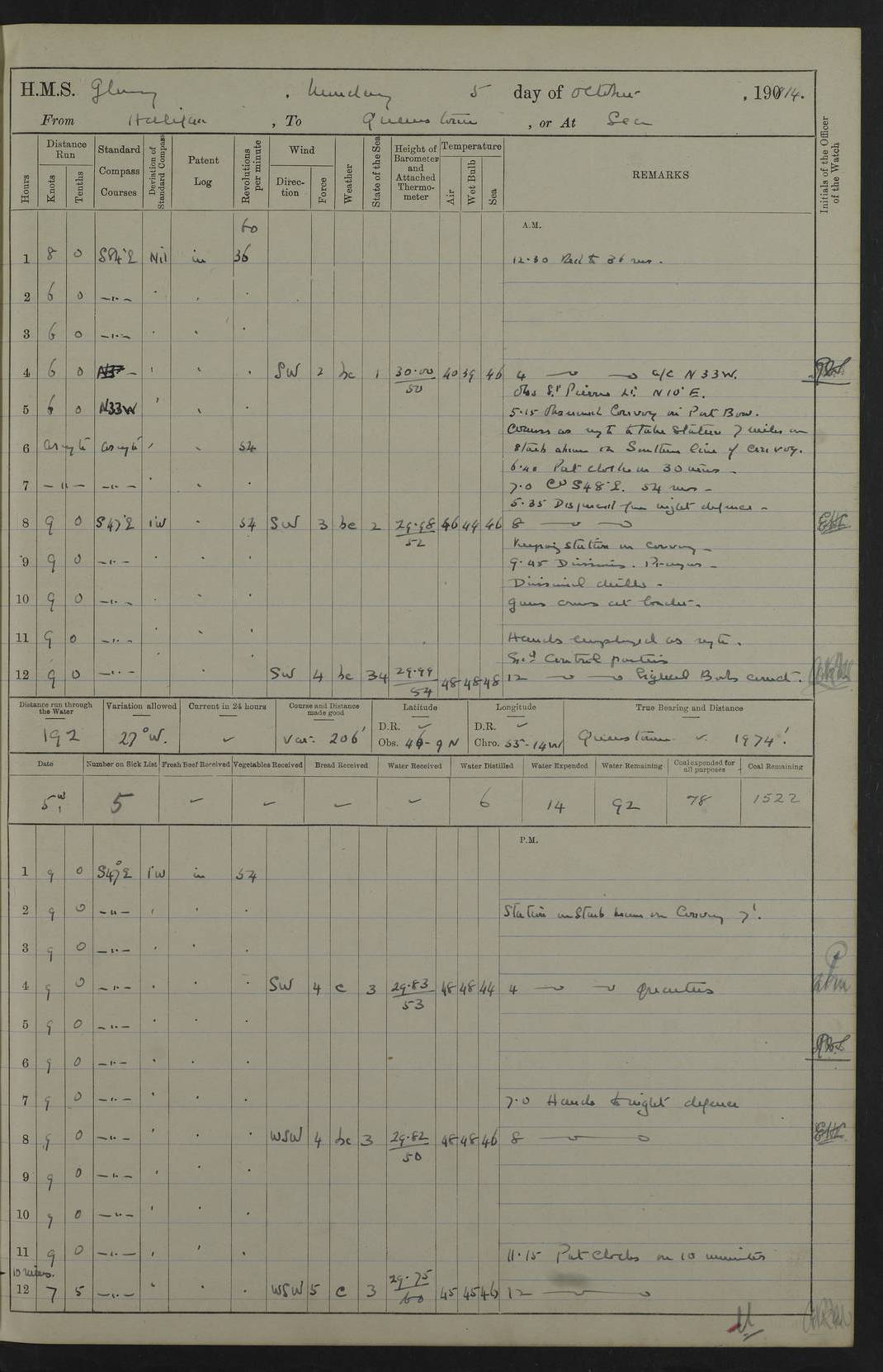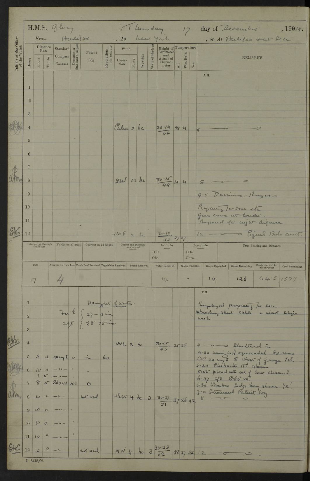 4f73cd06a2fc8ea903001489: (https://s3.amazonaws.com:443/oldweather/ADM53-43011/0072_0.jpg) 17 August 1914 Halifax Lat 44.63, Long -63.55 Number on sick list: 11 6.00am: Commenced coaling from Patent fuel sheds on jetty. 1.30pm: Finished coaling. pm: Washed down upper deck. 4f73cd06a2fc8ea90300148a: (https://s3.amazonaws.com:443/oldweather/ADM53-43011/0072_1.jpg) 18 August 1914 Halifax Lat 44.63, Long -63.55 Number on sick list: 10 4f73cd07a2fc8ea90300148b: (https://s3.amazonaws.com:443/oldweather/ADM53-43011/0073_0.jpg) 19 August 1914 Halifax Lat 44.63, Long -63.55 Number on sick list: 7 5.05am: Slipped from jetty and proceeded as requisite to anchorage in stream. 5.45am: Stopped. Let go Port anchor. am: Preparing for coaling. 9.00am: Collier Brinkwood made fast alongside (Starboard side). 10.10am: Commenced coaling. 9.40pm: Finished coaling. Received 1080 tons. 4f73cd07a2fc8ea90300148c: (https://s3.amazonaws.com:443/oldweather/ADM53-43011/0073_1.jpg) 20 August 1914 Halifax Lat 44.63, Long -63.55 Number on sick list: 7 am: Employed unrigging collier and gear etc. 7.15am: Collier left ship. 5.15pm: Hands to bathe. 4f73cd07a2fc8ea90300148d: (https://s3.amazonaws.com:443/oldweather/ADM53-43011/0074_0.jpg) 21 August 1914 Halifax Lat 44.63, Long -63.55 Number on sick list: 7 pm: Testing gun sights. 8.30pm: Exercised darken ship. 9.15pm: Opened deadlights etc. 4f73cd07a2fc8ea90300148e: (https://s3.amazonaws.com:443/oldweather/ADM53-43011/0074_1.jpg) 22 August 1914 Halifax Lat 44.63, Long -63.55 Number on sick list: 8 am: Aired night clothing. pm: Employed disembarking spare torpedo booms and other gear. pm: Tested lifebuoys. Found correct. 4f73cd08a2fc8ea90300148f: (https://s3.amazonaws.com:443/oldweather/ADM53-43011/0075_0.jpg) 23 August 1914 Halifax and at Sea Lat 44.63, Long -63.55 Number on sick list: 7 10.00am: Held Divine Service on board. am: Preparing for sea. 11.45am: Weighed and proceeded as requisite out of harbour. 12.50pm: Entered War Channel. 3.20pm: a/c S59ºW for rendezvous. 7.25pm: Observed HMS Suffolk 1 pt on starboard bow. HMS Suffolk was a Kent class armoured cruiser, launched at Portsmouth Dockyard in 1903, and sold in 1920. Details at http://en.wikipedia.org/wiki/HMS_Suffolk_(1903) . 8.00pm: Stopped at rendezvous. Communicated by boat with Suffolk. 9.30pm: Fog shut down. 9.00pm: Hands to night defence stations. 9.30pm: Fog shut down.9.45pm: Proceeded. 10.50pm: Fog cleared. 4f73cd08a2fc8ea903001490: (https://s3.amazonaws.com:443/oldweather/ADM53-43011/0075_1.jpg) 24 August 1914 At sea, Halifax to New York Lat 41.9, Long -66.4 Number on sick list: 9 5.30am: Dispersed from night defence. 10.20am: a/c to speak merchant steamer bearing WNW (SS Hurley of Montreal). 10.40am: a/c south. Stopped. Dropped target. 11.00am: Carried out aiming rifle practice. 12.10pm: Stopped. 1.20pm: Dropped second target. Carried out aiming rifle and sub calibre practice. 2.50pm: Fog shut down. pm: Hands at night defence stations. 10.45pm: Fog clearing. 4f73cd08a2fc8ea903001491: (https://s3.amazonaws.com:443/oldweather/ADM53-43011/0076_0.jpg) 25 August 1914 Patrolling off New York Lat 40.6, Long -70.0 Number on sick list: 8 5.40am: Dispersed from night defence. 6.10am: Observed sail N30ºW/ a/c N30ºW. Reduced to 60 revs. 6.50am: Resumed course. Abeam sail (Alicia B. Crosby). 9.36am: Sighted Nantucket Light N65ºW. 10.15am: Met Mason Lines Antilles. 10.25am: Nantucket Light Vessel abeam, 1.2 miles. 6.00pm: Sighted cruiser ahead. 6.10pm: Action. 6.25pm: Dispersed. 6.40pm: Stopped and signalled HMS Essex. HMS Essex was an armoured cruiser of the Kent class, launched in 1901 at Pembroke Dockyard and sold in 1921. Details at http://en.wikipedia.org/wiki/HMS_Essex_(1901) . 7.00pm: Proceeded as requisite. 7.25pm: Sighted steamer. a/c N60ºW, 60 revs. 7.35pm: Turned to east in company with SS Uranium. 8.00pm: Hands to night defence. 8.05pm: Stopped. Communicated by boat with Uranium. 9.23pm: Proceeded, course as requisite to northward to investigate searchlights. pm: Connected conning tower steaming gear. 4f73cd08a2fc8ea903001492: (https://s3.amazonaws.com:443/oldweather/ADM53-43011/0076_1.jpg) 26 August 1914 Patrolling off New York Lat 40.4, Long -73.6 Number on sick list: 11 5.16am: Fire Island Light abeam 7 miles. 7.00am: a/c N49ºW on sighting steamer to north. 8.25am: Sighted Ambrose Light Vessel. 1.00pm: Courses as requisite investigating shipping off Ambrose Light Vessel and Waveside. 2.15pm: Stopped, communicated by boat with SS Van der Duyn. 2.55pm: Proceeded as requisite. 5.26pm: In company with steamers New York and Commanchee. 6.17pm: Connected up fore bridge steering gear. 7.12pm: a/c to south to close steamer (St Louis). 7.25pm: Resumed course. 9.00pm: Hands to night defence. 4f73cd09a2fc8ea903001493: (https://s3.amazonaws.com:443/oldweather/ADM53-43011/0077_0.jpg) 27 August 1914 Patrolling off New York Lat 40.5, Long -72.3 Number on sick list: 10 5.45pm: Dispersed from night defence. 7.12am: a/c as requisite to close merchantman (Wilson Line Francisco). 7.55am: Resumed course. 9.55am: a/c to close Norwegian ship. 10.10am: Stopped, communicated with her by boat (SS Bjornstjerne Bjornsen). 10.50am: Proceeded N30ºE to close Circadian. 3.55pm: Fire Island Light Vessel abeam 2¾ miles. 4.12pm: Reduced to 36 revs. Passed SS Baltic. 5.35pm: Connected up conning tower steering gear. 6.40pm: Ambrose Light Vessel N33ºW, 7 miles. 7.00pm: Connected up fore bridge steering gear. 9.00pm: Hands to night defence stations. 4f73cd09a2fc8ea903001494: (https://s3.amazonaws.com:443/oldweather/ADM53-43011/0077_1.jpg) 28 August 1914 At sea, New York to Boston Lat 40.2, Long -70.8 Number on sick list: 9 5.45am: Dispersed from night defence. 8.40am: Sighted steamer (SS Ran) bearing S50ºE. 9.10am: Resumed course. am: Divisional drills. Preparing for target practice. 10.45am: Sighted steamer bearing N55ºE. 11.32am: Resumed course (SS Skjorldborg). 1.25pm: Stopped. Dropped target. 1.29pm: Proceeded, course as requi