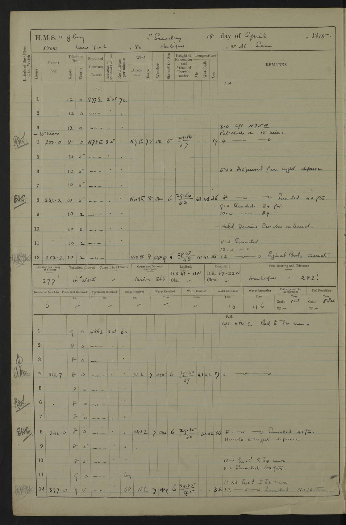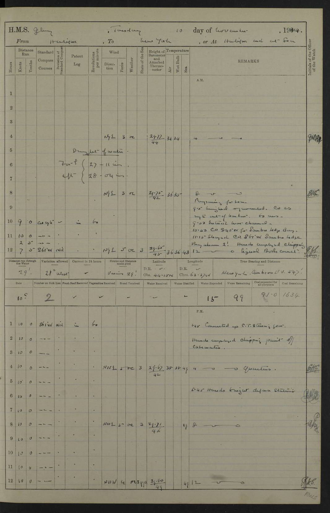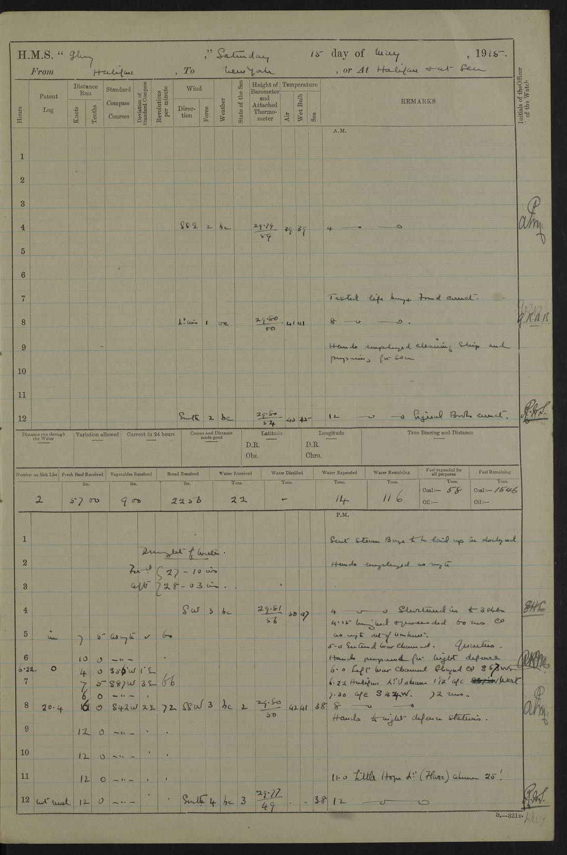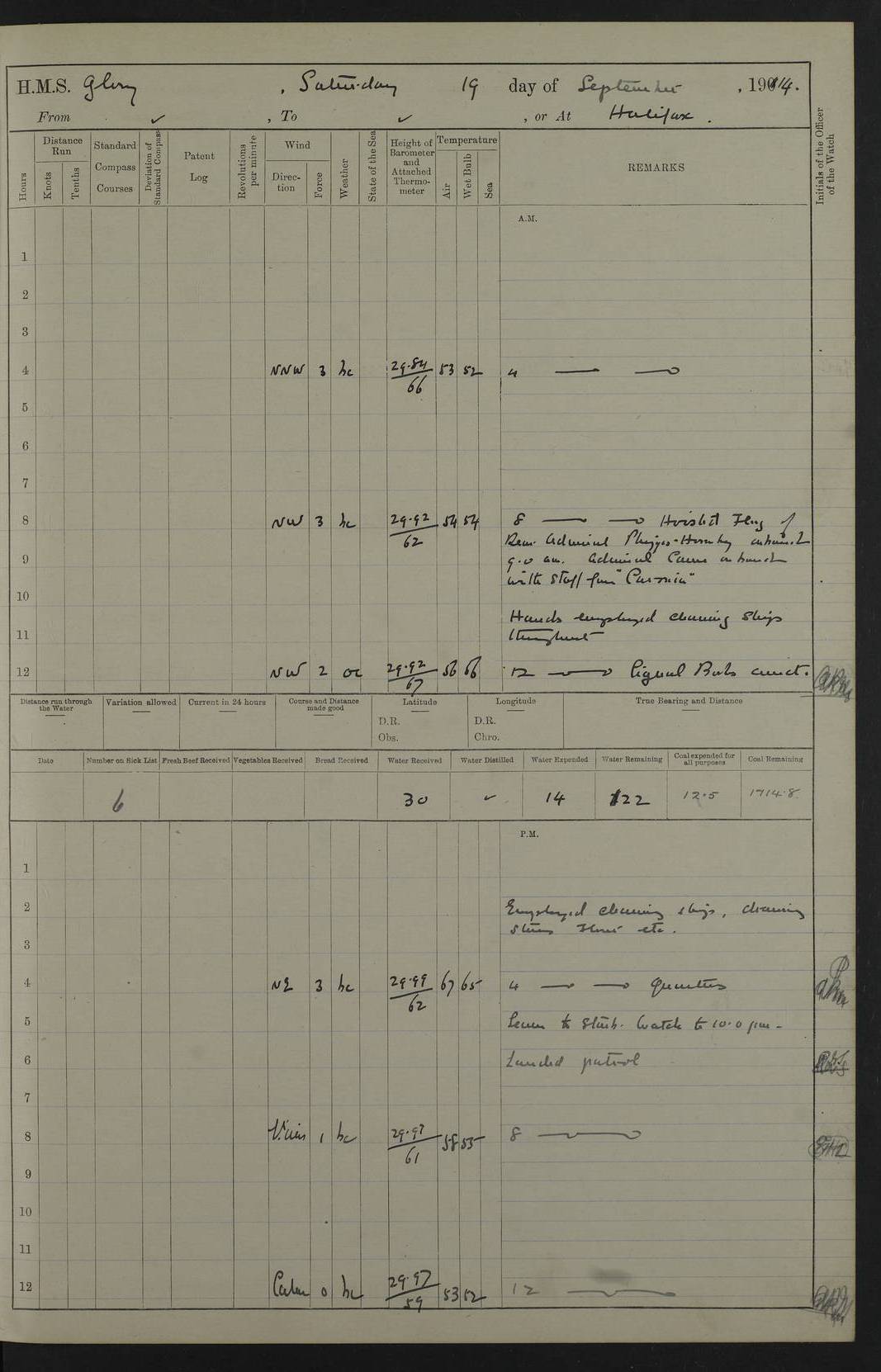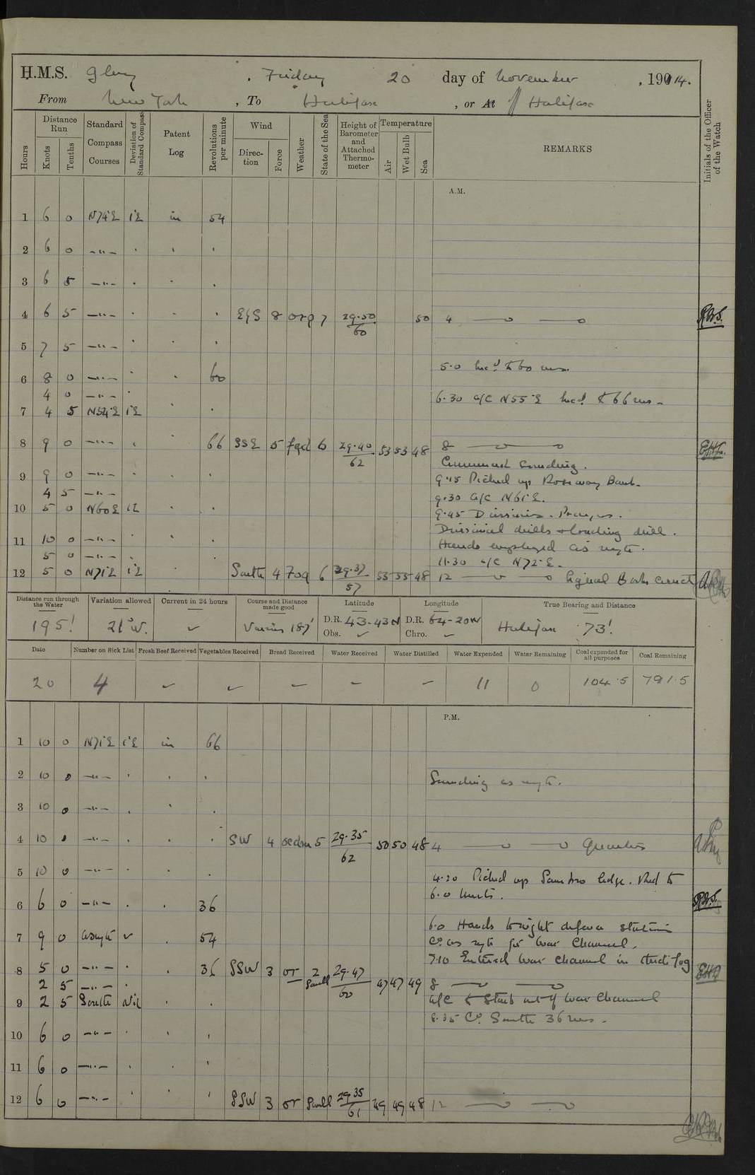 4f73cd06a2fc8ea903001489: (https://s3.amazonaws.com:443/oldweather/ADM53-43011/0072_0.jpg) 17 August 1914 Halifax Lat 44.63, Long -63.55 Number on sick list: 11 6.00am: Commenced coaling from Patent fuel sheds on jetty. 1.30pm: Finished coaling. pm: Washed down upper deck. 4f73cd06a2fc8ea90300148a: (https://s3.amazonaws.com:443/oldweather/ADM53-43011/0072_1.jpg) 18 August 1914 Halifax Lat 44.63, Long -63.55 Number on sick list: 10 4f73cd07a2fc8ea90300148b: (https://s3.amazonaws.com:443/oldweather/ADM53-43011/0073_0.jpg) 19 August 1914 Halifax Lat 44.63, Long -63.55 Number on sick list: 7 5.05am: Slipped from jetty and proceeded as requisite to anchorage in stream. 5.45am: Stopped. Let go Port anchor. am: Preparing for coaling. 9.00am: Collier Brinkwood made fast alongside (Starboard side). 10.10am: Commenced coaling. 9.40pm: Finished coaling. Received 1080 tons. 4f73cd07a2fc8ea90300148c: (https://s3.amazonaws.com:443/oldweather/ADM53-43011/0073_1.jpg) 20 August 1914 Halifax Lat 44.63, Long -63.55 Number on sick list: 7 am: Employed unrigging collier and gear etc. 7.15am: Collier left ship. 5.15pm: Hands to bathe. 4f73cd07a2fc8ea90300148d: (https://s3.amazonaws.com:443/oldweather/ADM53-43011/0074_0.jpg) 21 August 1914 Halifax Lat 44.63, Long -63.55 Number on sick list: 7 pm: Testing gun sights. 8.30pm: Exercised darken ship. 9.15pm: Opened deadlights etc. 4f73cd07a2fc8ea90300148e: (https://s3.amazonaws.com:443/oldweather/ADM53-43011/0074_1.jpg) 22 August 1914 Halifax Lat 44.63, Long -63.55 Number on sick list: 8 am: Aired night clothing. pm: Employed disembarking spare torpedo booms and other gear. pm: Tested lifebuoys. Found correct. 4f73cd08a2fc8ea90300148f: (https://s3.amazonaws.com:443/oldweather/ADM53-43011/0075_0.jpg) 23 August 1914 Halifax and at Sea Lat 44.63, Long -63.55 Number on sick list: 7 10.00am: Held Divine Service on board. am: Preparing for sea. 11.45am: Weighed and proceeded as requisite out of harbour. 12.50pm: Entered War Channel. 3.20pm: a/c S59ºW for rendezvous. 7.25pm: Observed HMS Suffolk 1 pt on starboard bow. HMS Suffolk was a Kent class armoured cruiser, launched at Portsmouth Dockyard in 1903, and sold in 1920. Details at http://en.wikipedia.org/wiki/HMS_Suffolk_(1903) . 8.00pm: Stopped at rendezvous. Communicated by boat with Suffolk. 9.30pm: Fog shut down. 9.00pm: Hands to night defence stations. 9.30pm: Fog shut down.9.45pm: Proceeded. 10.50pm: Fog cleared. 4f73cd08a2fc8ea903001490: (https://s3.amazonaws.com:443/oldweather/ADM53-43011/0075_1.jpg) 24 August 1914 At sea, Halifax to New York Lat 41.9, Long -66.4 Number on sick list: 9 5.30am: Dispersed from night defence. 10.20am: a/c to speak merchant steamer bearing WNW (SS Hurley of Montreal). 10.40am: a/c south. Stopped. Dropped target. 11.00am: Carried out aiming rifle practice. 12.10pm: Stopped. 1.20pm: Dropped second target. Carried out aiming rifle and sub calibre practice. 2.50pm: Fog shut down. pm: Hands at night defence stations. 10.45pm: Fog clearing. 4f73cd08a2fc8ea903001491: (https://s3.amazonaws.com:443/oldweather/ADM53-43011/0076_0.jpg) 25 August 1914 Patrolling off New York Lat 40.6, Long -70.0 Number on sick list: 8 5.40am: Dispersed from night defence. 6.10am: Observed sail N30ºW/ a/c N30ºW. Reduced to 60 revs. 6.50am: Resumed course. Abeam sail (Alicia B. Crosby). 9.36am: Sighted Nantucket Light N65ºW. 10.15am: Met Mason Lines Antilles. 10.25am: Nantucket Light Vessel abeam, 1.2 miles. 6.00pm: Sighted cruiser ahead. 6.10pm: Action. 6.25pm: Dispersed. 6.40pm: Stopped and signalled HMS Essex. HMS Essex was an armoured cruiser of the Kent class, launched in 1901 at Pembroke Dockyard and sold in 1921. Details at http://en.wikipedia.org/wiki/HMS_Essex_(1901) . 7.00pm: Proceeded as requisite. 7.25pm: Sighted steamer. a/c N60ºW, 60 revs. 7.35pm: Turned to east in company with SS Uranium. 8.00pm: Hands to night defence. 8.05pm: Stopped. Communicated by boat with Uranium. 9.23pm: Proceeded, course as requisite to northward to investigate searchlights. pm: Connected conning tower steaming gear. 4f73cd08a2fc8ea903001492: (https://s3.amazonaws.com:443/oldweather/ADM53-43011/0076_1.jpg) 26 August 1914 Patrolling off New York Lat 40.4, Long -73.6 Number on sick list: 11 5.16am: Fire Island Light abeam 7 miles. 7.00am: a/c N49ºW on sighting steamer to north. 8.25am: Sighted Ambrose Light Vessel. 1.00pm: Courses as requisite investigating shipping off Ambrose Light Vessel and Waveside. 2.15pm: Stopped, communicated by boat with SS Van der Duyn. 2.55pm: Proceeded as requisite. 5.26pm: In company with steamers New York and Commanchee. 6.17pm: Connected up fore bridge steering gear. 7.12pm: a/c to south to close steamer (St Louis). 7.25pm: Resumed course. 9.00pm: Hands to night defence. 4f73cd09a2fc8ea903001493: (https://s3.amazonaws.com:443/oldweather/ADM53-43011/0077_0.jpg) 27 August 1914 Patrolling off New York Lat 40.5, Long -72.3 Number on sick list: 10 5.45pm: Dispersed from night defence. 7.12am: a/c as requisite to close merchantman (Wilson Line Francisco). 7.55am: Resumed course. 9.55am: a/c to close Norwegian ship. 10.10am: Stopped, communicated with her by boat (SS Bjornstjerne Bjornsen). 10.50am: Proceeded N30ºE to close Circadian. 3.55pm: Fire Island Light Vessel abeam 2¾ miles. 4.12pm: Reduced to 36 revs. Passed SS Baltic. 5.35pm: Connected up conning tower steering gear. 6.40pm: Ambrose Light Vessel N33ºW, 7 miles. 7.00pm: Connected up fore bridge steering gear. 9.00pm: Hands to night defence stations. 4f73cd09a2fc8ea903001494: (https://s3.amazonaws.com:443/oldweather/ADM53-43011/0077_1.jpg) 28 August 1914 At sea, New York to Boston Lat 40.2, Long -70.8 Number on sick list: 9 5.45am: Dispersed from night defence. 8.40am: Sighted steamer (SS Ran) bearing S50ºE. 9.10am: Resumed course. am: Divisional drills. Preparing for target practice. 10.45am: Sighted steamer bearing N55ºE. 11.32am: Resumed course (SS Skjorldborg). 1.25pm: Stopped. Dropped target. 1.29pm: Proceeded, course as requi