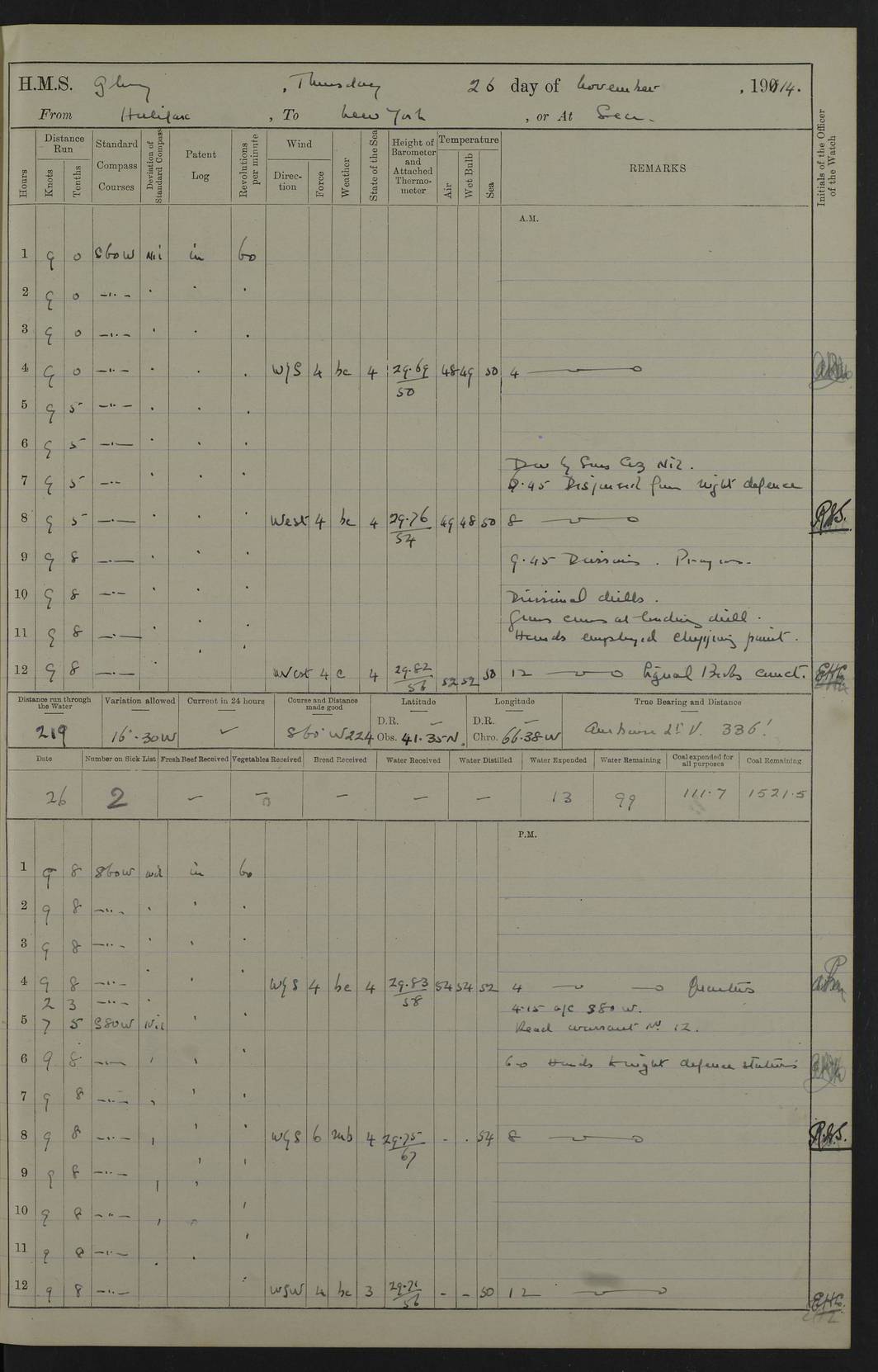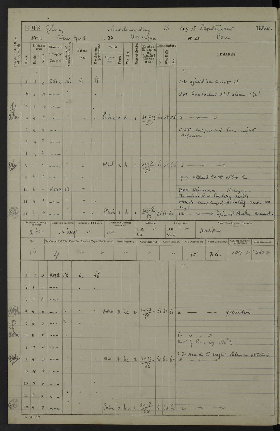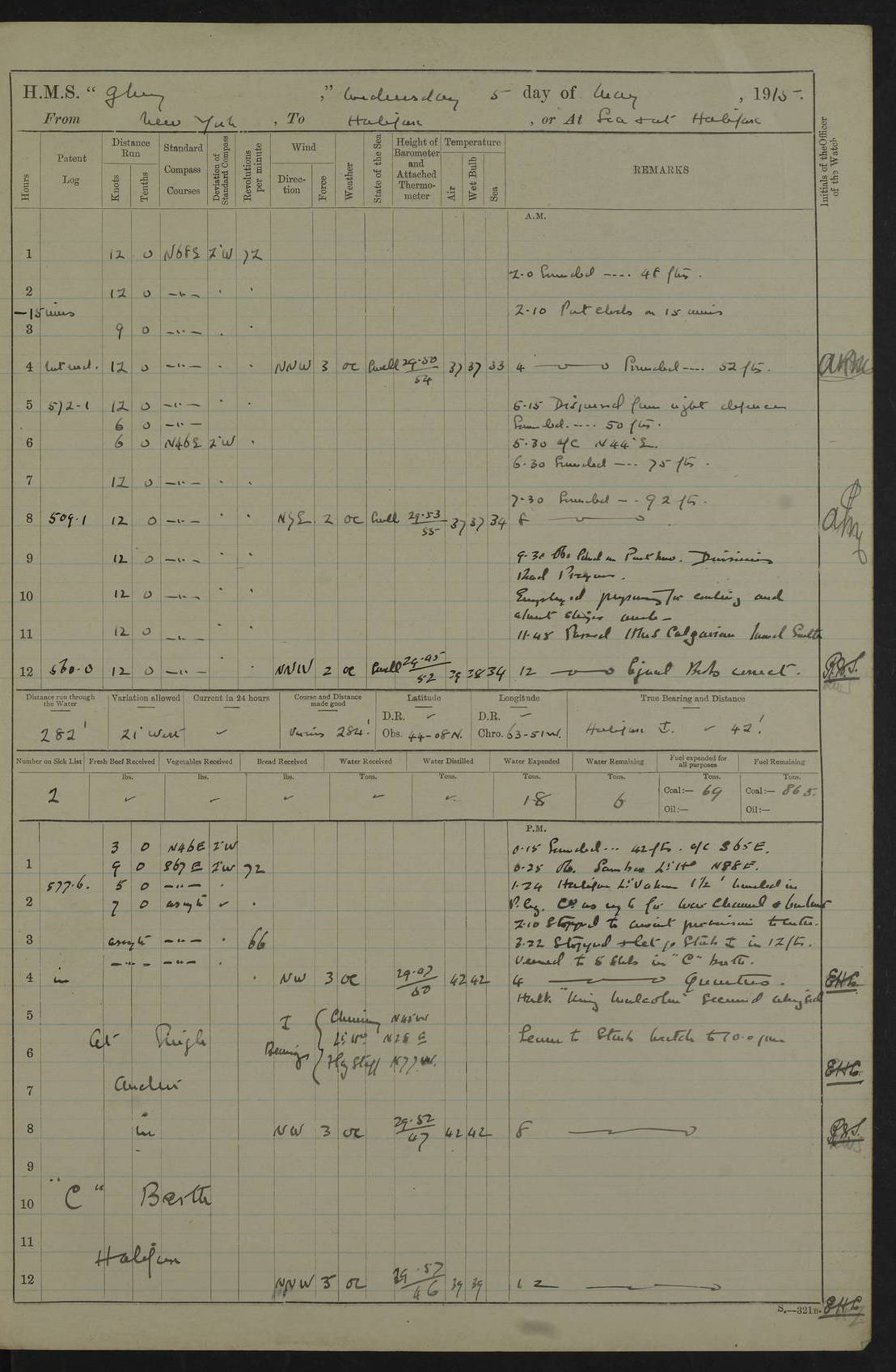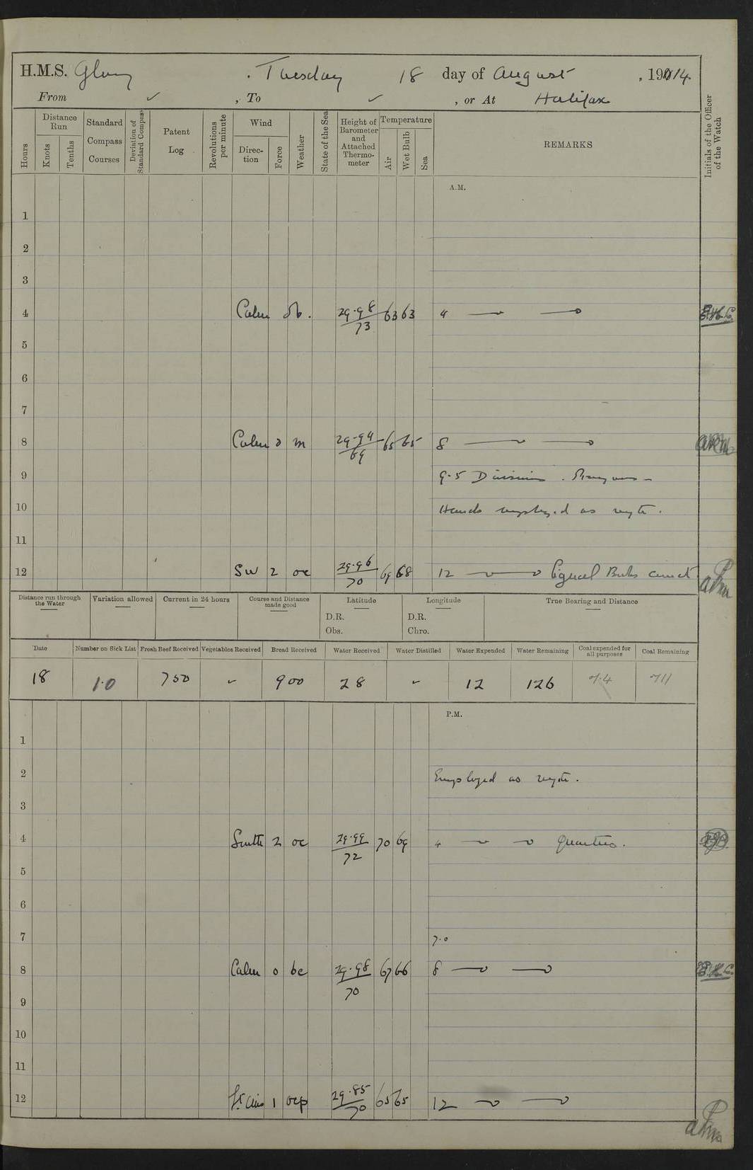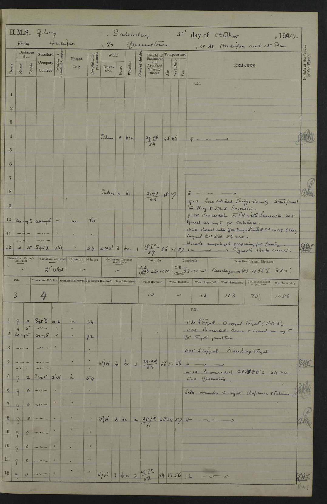 4f73cd06a2fc8ea903001489: (https://s3.amazonaws.com:443/oldweather/ADM53-43011/0072_0.jpg) 17 August 1914 Halifax Lat 44.63, Long -63.55 Number on sick list: 11 6.00am: Commenced coaling from Patent fuel sheds on jetty. 1.30pm: Finished coaling. pm: Washed down upper deck. 4f73cd06a2fc8ea90300148a: (https://s3.amazonaws.com:443/oldweather/ADM53-43011/0072_1.jpg) 18 August 1914 Halifax Lat 44.63, Long -63.55 Number on sick list: 10 4f73cd07a2fc8ea90300148b: (https://s3.amazonaws.com:443/oldweather/ADM53-43011/0073_0.jpg) 19 August 1914 Halifax Lat 44.63, Long -63.55 Number on sick list: 7 5.05am: Slipped from jetty and proceeded as requisite to anchorage in stream. 5.45am: Stopped. Let go Port anchor. am: Preparing for coaling. 9.00am: Collier Brinkwood made fast alongside (Starboard side). 10.10am: Commenced coaling. 9.40pm: Finished coaling. Received 1080 tons. 4f73cd07a2fc8ea90300148c: (https://s3.amazonaws.com:443/oldweather/ADM53-43011/0073_1.jpg) 20 August 1914 Halifax Lat 44.63, Long -63.55 Number on sick list: 7 am: Employed unrigging collier and gear etc. 7.15am: Collier left ship. 5.15pm: Hands to bathe. 4f73cd07a2fc8ea90300148d: (https://s3.amazonaws.com:443/oldweather/ADM53-43011/0074_0.jpg) 21 August 1914 Halifax Lat 44.63, Long -63.55 Number on sick list: 7 pm: Testing gun sights. 8.30pm: Exercised darken ship. 9.15pm: Opened deadlights etc. 4f73cd07a2fc8ea90300148e: (https://s3.amazonaws.com:443/oldweather/ADM53-43011/0074_1.jpg) 22 August 1914 Halifax Lat 44.63, Long -63.55 Number on sick list: 8 am: Aired night clothing. pm: Employed disembarking spare torpedo booms and other gear. pm: Tested lifebuoys. Found correct. 4f73cd08a2fc8ea90300148f: (https://s3.amazonaws.com:443/oldweather/ADM53-43011/0075_0.jpg) 23 August 1914 Halifax and at Sea Lat 44.63, Long -63.55 Number on sick list: 7 10.00am: Held Divine Service on board. am: Preparing for sea. 11.45am: Weighed and proceeded as requisite out of harbour. 12.50pm: Entered War Channel. 3.20pm: a/c S59ºW for rendezvous. 7.25pm: Observed HMS Suffolk 1 pt on starboard bow. HMS Suffolk was a Kent class armoured cruiser, launched at Portsmouth Dockyard in 1903, and sold in 1920. Details at http://en.wikipedia.org/wiki/HMS_Suffolk_(1903) . 8.00pm: Stopped at rendezvous. Communicated by boat with Suffolk. 9.30pm: Fog shut down. 9.00pm: Hands to night defence stations. 9.30pm: Fog shut down.9.45pm: Proceeded. 10.50pm: Fog cleared. 4f73cd08a2fc8ea903001490: (https://s3.amazonaws.com:443/oldweather/ADM53-43011/0075_1.jpg) 24 August 1914 At sea, Halifax to New York Lat 41.9, Long -66.4 Number on sick list: 9 5.30am: Dispersed from night defence. 10.20am: a/c to speak merchant steamer bearing WNW (SS Hurley of Montreal). 10.40am: a/c south. Stopped. Dropped target. 11.00am: Carried out aiming rifle practice. 12.10pm: Stopped. 1.20pm: Dropped second target. Carried out aiming rifle and sub calibre practice. 2.50pm: Fog shut down. pm: Hands at night defence stations. 10.45pm: Fog clearing. 4f73cd08a2fc8ea903001491: (https://s3.amazonaws.com:443/oldweather/ADM53-43011/0076_0.jpg) 25 August 1914 Patrolling off New York Lat 40.6, Long -70.0 Number on sick list: 8 5.40am: Dispersed from night defence. 6.10am: Observed sail N30ºW/ a/c N30ºW. Reduced to 60 revs. 6.50am: Resumed course. Abeam sail (Alicia B. Crosby). 9.36am: Sighted Nantucket Light N65ºW. 10.15am: Met Mason Lines Antilles. 10.25am: Nantucket Light Vessel abeam, 1.2 miles. 6.00pm: Sighted cruiser ahead. 6.10pm: Action. 6.25pm: Dispersed. 6.40pm: Stopped and signalled HMS Essex. HMS Essex was an armoured cruiser of the Kent class, launched in 1901 at Pembroke Dockyard and sold in 1921. Details at http://en.wikipedia.org/wiki/HMS_Essex_(1901) . 7.00pm: Proceeded as requisite. 7.25pm: Sighted steamer. a/c N60ºW, 60 revs. 7.35pm: Turned to east in company with SS Uranium. 8.00pm: Hands to night defence. 8.05pm: Stopped. Communicated by boat with Uranium. 9.23pm: Proceeded, course as requisite to northward to investigate searchlights. pm: Connected conning tower steaming gear. 4f73cd08a2fc8ea903001492: (https://s3.amazonaws.com:443/oldweather/ADM53-43011/0076_1.jpg) 26 August 1914 Patrolling off New York Lat 40.4, Long -73.6 Number on sick list: 11 5.16am: Fire Island Light abeam 7 miles. 7.00am: a/c N49ºW on sighting steamer to north. 8.25am: Sighted Ambrose Light Vessel. 1.00pm: Courses as requisite investigating shipping off Ambrose Light Vessel and Waveside. 2.15pm: Stopped, communicated by boat with SS Van der Duyn. 2.55pm: Proceeded as requisite. 5.26pm: In company with steamers New York and Commanchee. 6.17pm: Connected up fore bridge steering gear. 7.12pm: a/c to south to close steamer (St Louis). 7.25pm: Resumed course. 9.00pm: Hands to night defence. 4f73cd09a2fc8ea903001493: (https://s3.amazonaws.com:443/oldweather/ADM53-43011/0077_0.jpg) 27 August 1914 Patrolling off New York Lat 40.5, Long -72.3 Number on sick list: 10 5.45pm: Dispersed from night defence. 7.12am: a/c as requisite to close merchantman (Wilson Line Francisco). 7.55am: Resumed course. 9.55am: a/c to close Norwegian ship. 10.10am: Stopped, communicated with her by boat (SS Bjornstjerne Bjornsen). 10.50am: Proceeded N30ºE to close Circadian. 3.55pm: Fire Island Light Vessel abeam 2¾ miles. 4.12pm: Reduced to 36 revs. Passed SS Baltic. 5.35pm: Connected up conning tower steering gear. 6.40pm: Ambrose Light Vessel N33ºW, 7 miles. 7.00pm: Connected up fore bridge steering gear. 9.00pm: Hands to night defence stations. 4f73cd09a2fc8ea903001494: (https://s3.amazonaws.com:443/oldweather/ADM53-43011/0077_1.jpg) 28 August 1914 At sea, New York to Boston Lat 40.2, Long -70.8 Number on sick list: 9 5.45am: Dispersed from night defence. 8.40am: Sighted steamer (SS Ran) bearing S50ºE. 9.10am: Resumed course. am: Divisional drills. Preparing for target practice. 10.45am: Sighted steamer bearing N55ºE. 11.32am: Resumed course (SS Skjorldborg). 1.25pm: Stopped. Dropped target. 1.29pm: Proceeded, course as requi