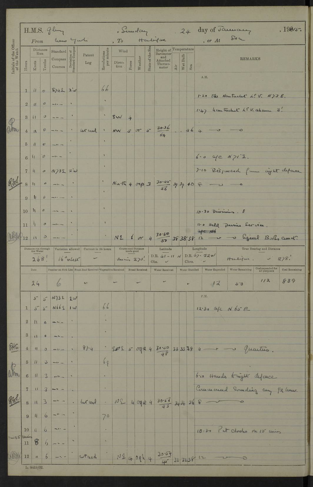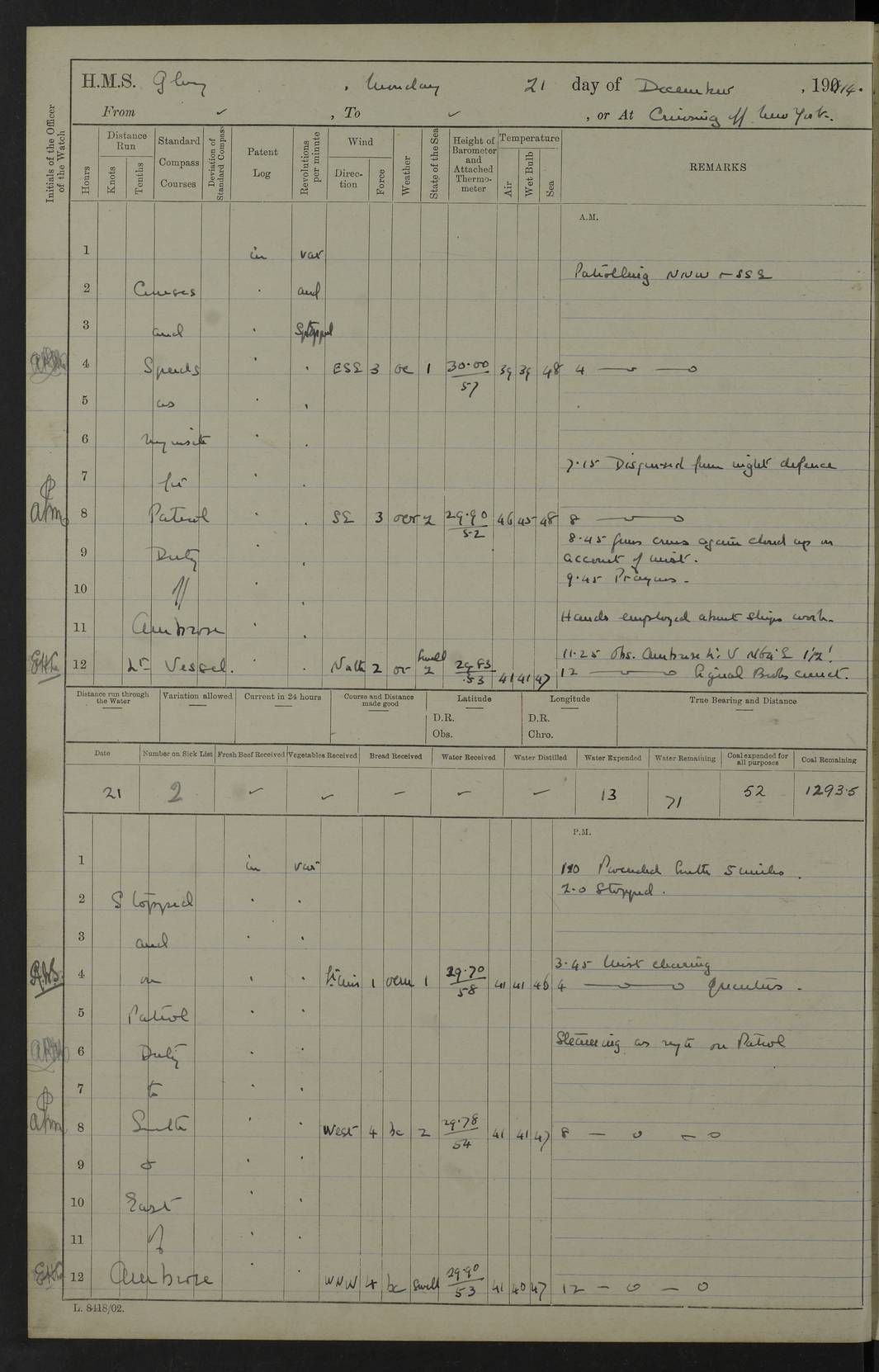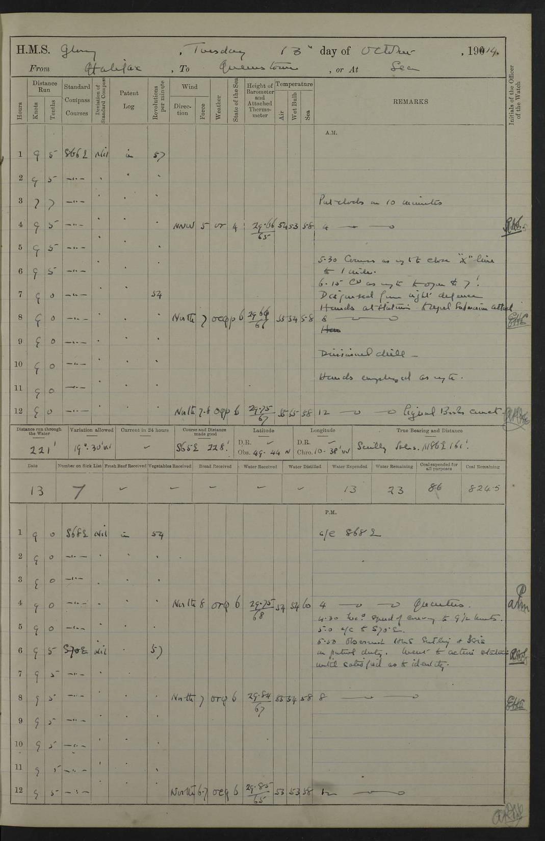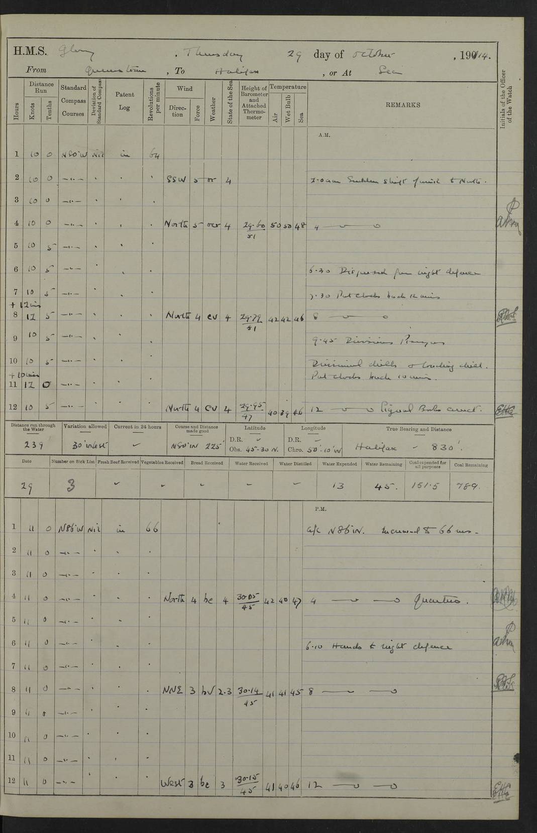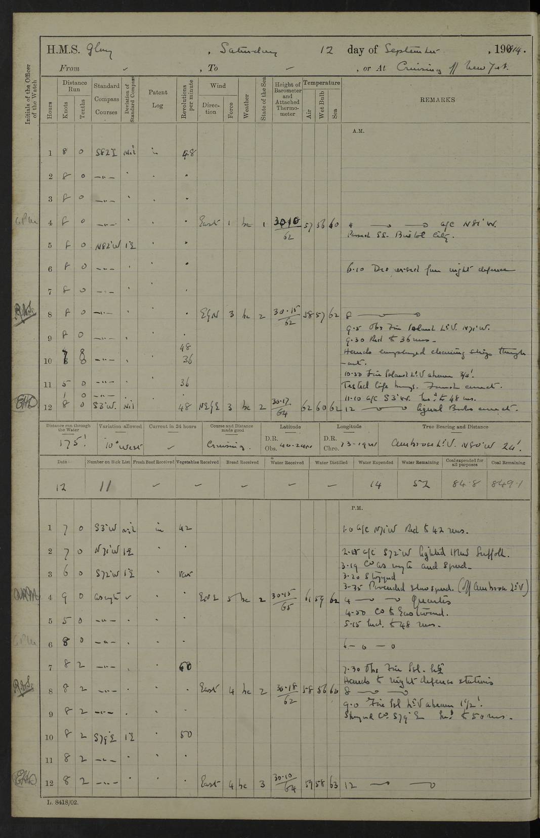 4f73cd06a2fc8ea903001489: (https://s3.amazonaws.com:443/oldweather/ADM53-43011/0072_0.jpg) 17 August 1914 Halifax Lat 44.63, Long -63.55 Number on sick list: 11 6.00am: Commenced coaling from Patent fuel sheds on jetty. 1.30pm: Finished coaling. pm: Washed down upper deck. 4f73cd06a2fc8ea90300148a: (https://s3.amazonaws.com:443/oldweather/ADM53-43011/0072_1.jpg) 18 August 1914 Halifax Lat 44.63, Long -63.55 Number on sick list: 10 4f73cd07a2fc8ea90300148b: (https://s3.amazonaws.com:443/oldweather/ADM53-43011/0073_0.jpg) 19 August 1914 Halifax Lat 44.63, Long -63.55 Number on sick list: 7 5.05am: Slipped from jetty and proceeded as requisite to anchorage in stream. 5.45am: Stopped. Let go Port anchor. am: Preparing for coaling. 9.00am: Collier Brinkwood made fast alongside (Starboard side). 10.10am: Commenced coaling. 9.40pm: Finished coaling. Received 1080 tons. 4f73cd07a2fc8ea90300148c: (https://s3.amazonaws.com:443/oldweather/ADM53-43011/0073_1.jpg) 20 August 1914 Halifax Lat 44.63, Long -63.55 Number on sick list: 7 am: Employed unrigging collier and gear etc. 7.15am: Collier left ship. 5.15pm: Hands to bathe. 4f73cd07a2fc8ea90300148d: (https://s3.amazonaws.com:443/oldweather/ADM53-43011/0074_0.jpg) 21 August 1914 Halifax Lat 44.63, Long -63.55 Number on sick list: 7 pm: Testing gun sights. 8.30pm: Exercised darken ship. 9.15pm: Opened deadlights etc. 4f73cd07a2fc8ea90300148e: (https://s3.amazonaws.com:443/oldweather/ADM53-43011/0074_1.jpg) 22 August 1914 Halifax Lat 44.63, Long -63.55 Number on sick list: 8 am: Aired night clothing. pm: Employed disembarking spare torpedo booms and other gear. pm: Tested lifebuoys. Found correct. 4f73cd08a2fc8ea90300148f: (https://s3.amazonaws.com:443/oldweather/ADM53-43011/0075_0.jpg) 23 August 1914 Halifax and at Sea Lat 44.63, Long -63.55 Number on sick list: 7 10.00am: Held Divine Service on board. am: Preparing for sea. 11.45am: Weighed and proceeded as requisite out of harbour. 12.50pm: Entered War Channel. 3.20pm: a/c S59ºW for rendezvous. 7.25pm: Observed HMS Suffolk 1 pt on starboard bow. HMS Suffolk was a Kent class armoured cruiser, launched at Portsmouth Dockyard in 1903, and sold in 1920. Details at http://en.wikipedia.org/wiki/HMS_Suffolk_(1903) . 8.00pm: Stopped at rendezvous. Communicated by boat with Suffolk. 9.30pm: Fog shut down. 9.00pm: Hands to night defence stations. 9.30pm: Fog shut down.9.45pm: Proceeded. 10.50pm: Fog cleared. 4f73cd08a2fc8ea903001490: (https://s3.amazonaws.com:443/oldweather/ADM53-43011/0075_1.jpg) 24 August 1914 At sea, Halifax to New York Lat 41.9, Long -66.4 Number on sick list: 9 5.30am: Dispersed from night defence. 10.20am: a/c to speak merchant steamer bearing WNW (SS Hurley of Montreal). 10.40am: a/c south. Stopped. Dropped target. 11.00am: Carried out aiming rifle practice. 12.10pm: Stopped. 1.20pm: Dropped second target. Carried out aiming rifle and sub calibre practice. 2.50pm: Fog shut down. pm: Hands at night defence stations. 10.45pm: Fog clearing. 4f73cd08a2fc8ea903001491: (https://s3.amazonaws.com:443/oldweather/ADM53-43011/0076_0.jpg) 25 August 1914 Patrolling off New York Lat 40.6, Long -70.0 Number on sick list: 8 5.40am: Dispersed from night defence. 6.10am: Observed sail N30ºW/ a/c N30ºW. Reduced to 60 revs. 6.50am: Resumed course. Abeam sail (Alicia B. Crosby). 9.36am: Sighted Nantucket Light N65ºW. 10.15am: Met Mason Lines Antilles. 10.25am: Nantucket Light Vessel abeam, 1.2 miles. 6.00pm: Sighted cruiser ahead. 6.10pm: Action. 6.25pm: Dispersed. 6.40pm: Stopped and signalled HMS Essex. HMS Essex was an armoured cruiser of the Kent class, launched in 1901 at Pembroke Dockyard and sold in 1921. Details at http://en.wikipedia.org/wiki/HMS_Essex_(1901) . 7.00pm: Proceeded as requisite. 7.25pm: Sighted steamer. a/c N60ºW, 60 revs. 7.35pm: Turned to east in company with SS Uranium. 8.00pm: Hands to night defence. 8.05pm: Stopped. Communicated by boat with Uranium. 9.23pm: Proceeded, course as requisite to northward to investigate searchlights. pm: Connected conning tower steaming gear. 4f73cd08a2fc8ea903001492: (https://s3.amazonaws.com:443/oldweather/ADM53-43011/0076_1.jpg) 26 August 1914 Patrolling off New York Lat 40.4, Long -73.6 Number on sick list: 11 5.16am: Fire Island Light abeam 7 miles. 7.00am: a/c N49ºW on sighting steamer to north. 8.25am: Sighted Ambrose Light Vessel. 1.00pm: Courses as requisite investigating shipping off Ambrose Light Vessel and Waveside. 2.15pm: Stopped, communicated by boat with SS Van der Duyn. 2.55pm: Proceeded as requisite. 5.26pm: In company with steamers New York and Commanchee. 6.17pm: Connected up fore bridge steering gear. 7.12pm: a/c to south to close steamer (St Louis). 7.25pm: Resumed course. 9.00pm: Hands to night defence. 4f73cd09a2fc8ea903001493: (https://s3.amazonaws.com:443/oldweather/ADM53-43011/0077_0.jpg) 27 August 1914 Patrolling off New York Lat 40.5, Long -72.3 Number on sick list: 10 5.45pm: Dispersed from night defence. 7.12am: a/c as requisite to close merchantman (Wilson Line Francisco). 7.55am: Resumed course. 9.55am: a/c to close Norwegian ship. 10.10am: Stopped, communicated with her by boat (SS Bjornstjerne Bjornsen). 10.50am: Proceeded N30ºE to close Circadian. 3.55pm: Fire Island Light Vessel abeam 2¾ miles. 4.12pm: Reduced to 36 revs. Passed SS Baltic. 5.35pm: Connected up conning tower steering gear. 6.40pm: Ambrose Light Vessel N33ºW, 7 miles. 7.00pm: Connected up fore bridge steering gear. 9.00pm: Hands to night defence stations. 4f73cd09a2fc8ea903001494: (https://s3.amazonaws.com:443/oldweather/ADM53-43011/0077_1.jpg) 28 August 1914 At sea, New York to Boston Lat 40.2, Long -70.8 Number on sick list: 9 5.45am: Dispersed from night defence. 8.40am: Sighted steamer (SS Ran) bearing S50ºE. 9.10am: Resumed course. am: Divisional drills. Preparing for target practice. 10.45am: Sighted steamer bearing N55ºE. 11.32am: Resumed course (SS Skjorldborg). 1.25pm: Stopped. Dropped target. 1.29pm: Proceeded, course as requi