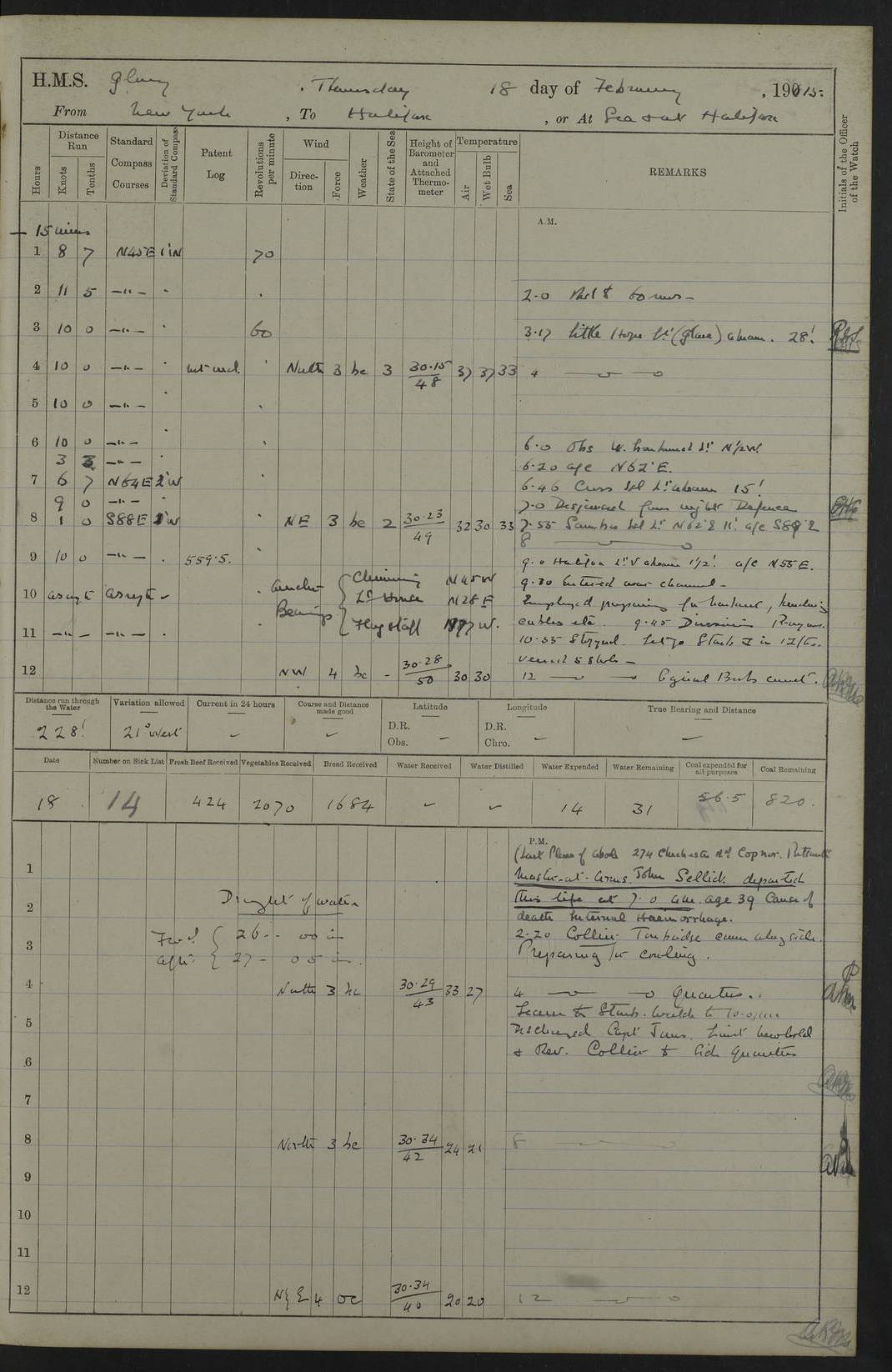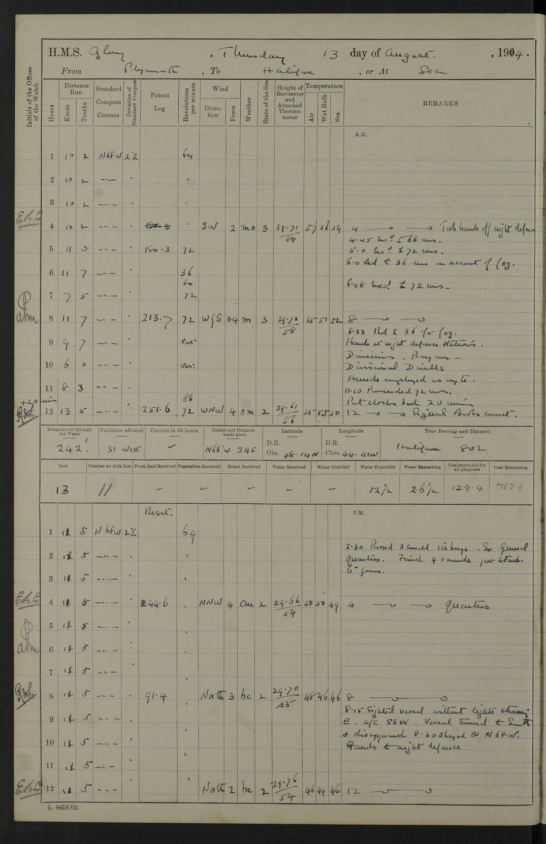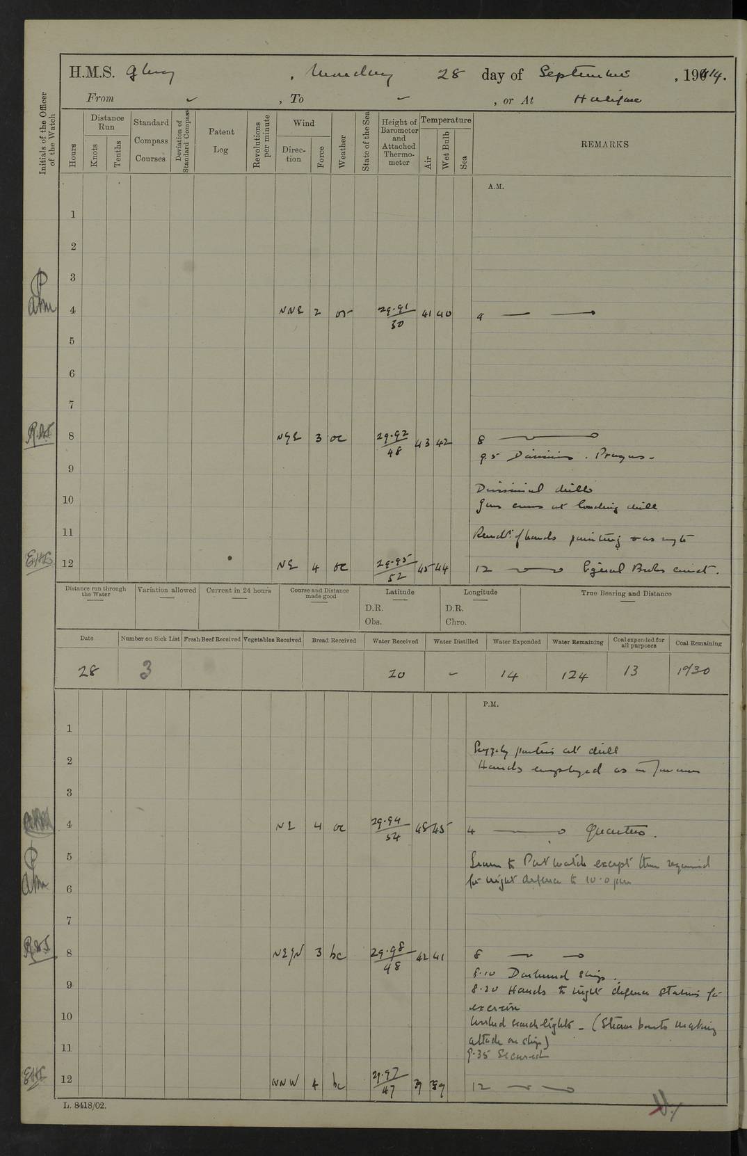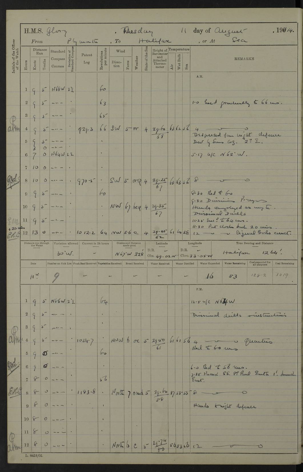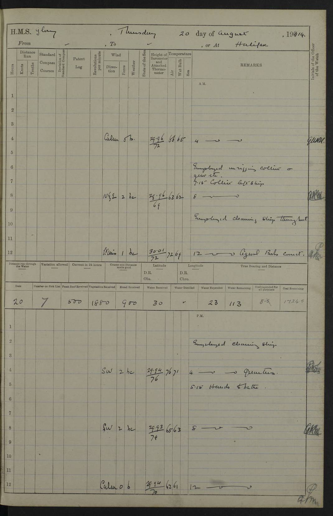 4f73cd06a2fc8ea903001489: (https://s3.amazonaws.com:443/oldweather/ADM53-43011/0072_0.jpg) 17 August 1914 Halifax Lat 44.63, Long -63.55 Number on sick list: 11 6.00am: Commenced coaling from Patent fuel sheds on jetty. 1.30pm: Finished coaling. pm: Washed down upper deck. 4f73cd06a2fc8ea90300148a: (https://s3.amazonaws.com:443/oldweather/ADM53-43011/0072_1.jpg) 18 August 1914 Halifax Lat 44.63, Long -63.55 Number on sick list: 10 4f73cd07a2fc8ea90300148b: (https://s3.amazonaws.com:443/oldweather/ADM53-43011/0073_0.jpg) 19 August 1914 Halifax Lat 44.63, Long -63.55 Number on sick list: 7 5.05am: Slipped from jetty and proceeded as requisite to anchorage in stream. 5.45am: Stopped. Let go Port anchor. am: Preparing for coaling. 9.00am: Collier Brinkwood made fast alongside (Starboard side). 10.10am: Commenced coaling. 9.40pm: Finished coaling. Received 1080 tons. 4f73cd07a2fc8ea90300148c: (https://s3.amazonaws.com:443/oldweather/ADM53-43011/0073_1.jpg) 20 August 1914 Halifax Lat 44.63, Long -63.55 Number on sick list: 7 am: Employed unrigging collier and gear etc. 7.15am: Collier left ship. 5.15pm: Hands to bathe. 4f73cd07a2fc8ea90300148d: (https://s3.amazonaws.com:443/oldweather/ADM53-43011/0074_0.jpg) 21 August 1914 Halifax Lat 44.63, Long -63.55 Number on sick list: 7 pm: Testing gun sights. 8.30pm: Exercised darken ship. 9.15pm: Opened deadlights etc. 4f73cd07a2fc8ea90300148e: (https://s3.amazonaws.com:443/oldweather/ADM53-43011/0074_1.jpg) 22 August 1914 Halifax Lat 44.63, Long -63.55 Number on sick list: 8 am: Aired night clothing. pm: Employed disembarking spare torpedo booms and other gear. pm: Tested lifebuoys. Found correct. 4f73cd08a2fc8ea90300148f: (https://s3.amazonaws.com:443/oldweather/ADM53-43011/0075_0.jpg) 23 August 1914 Halifax and at Sea Lat 44.63, Long -63.55 Number on sick list: 7 10.00am: Held Divine Service on board. am: Preparing for sea. 11.45am: Weighed and proceeded as requisite out of harbour. 12.50pm: Entered War Channel. 3.20pm: a/c S59ºW for rendezvous. 7.25pm: Observed HMS Suffolk 1 pt on starboard bow. HMS Suffolk was a Kent class armoured cruiser, launched at Portsmouth Dockyard in 1903, and sold in 1920. Details at http://en.wikipedia.org/wiki/HMS_Suffolk_(1903) . 8.00pm: Stopped at rendezvous. Communicated by boat with Suffolk. 9.30pm: Fog shut down. 9.00pm: Hands to night defence stations. 9.30pm: Fog shut down.9.45pm: Proceeded. 10.50pm: Fog cleared. 4f73cd08a2fc8ea903001490: (https://s3.amazonaws.com:443/oldweather/ADM53-43011/0075_1.jpg) 24 August 1914 At sea, Halifax to New York Lat 41.9, Long -66.4 Number on sick list: 9 5.30am: Dispersed from night defence. 10.20am: a/c to speak merchant steamer bearing WNW (SS Hurley of Montreal). 10.40am: a/c south. Stopped. Dropped target. 11.00am: Carried out aiming rifle practice. 12.10pm: Stopped. 1.20pm: Dropped second target. Carried out aiming rifle and sub calibre practice. 2.50pm: Fog shut down. pm: Hands at night defence stations. 10.45pm: Fog clearing. 4f73cd08a2fc8ea903001491: (https://s3.amazonaws.com:443/oldweather/ADM53-43011/0076_0.jpg) 25 August 1914 Patrolling off New York Lat 40.6, Long -70.0 Number on sick list: 8 5.40am: Dispersed from night defence. 6.10am: Observed sail N30ºW/ a/c N30ºW. Reduced to 60 revs. 6.50am: Resumed course. Abeam sail (Alicia B. Crosby). 9.36am: Sighted Nantucket Light N65ºW. 10.15am: Met Mason Lines Antilles. 10.25am: Nantucket Light Vessel abeam, 1.2 miles. 6.00pm: Sighted cruiser ahead. 6.10pm: Action. 6.25pm: Dispersed. 6.40pm: Stopped and signalled HMS Essex. HMS Essex was an armoured cruiser of the Kent class, launched in 1901 at Pembroke Dockyard and sold in 1921. Details at http://en.wikipedia.org/wiki/HMS_Essex_(1901) . 7.00pm: Proceeded as requisite. 7.25pm: Sighted steamer. a/c N60ºW, 60 revs. 7.35pm: Turned to east in company with SS Uranium. 8.00pm: Hands to night defence. 8.05pm: Stopped. Communicated by boat with Uranium. 9.23pm: Proceeded, course as requisite to northward to investigate searchlights. pm: Connected conning tower steaming gear. 4f73cd08a2fc8ea903001492: (https://s3.amazonaws.com:443/oldweather/ADM53-43011/0076_1.jpg) 26 August 1914 Patrolling off New York Lat 40.4, Long -73.6 Number on sick list: 11 5.16am: Fire Island Light abeam 7 miles. 7.00am: a/c N49ºW on sighting steamer to north. 8.25am: Sighted Ambrose Light Vessel. 1.00pm: Courses as requisite investigating shipping off Ambrose Light Vessel and Waveside. 2.15pm: Stopped, communicated by boat with SS Van der Duyn. 2.55pm: Proceeded as requisite. 5.26pm: In company with steamers New York and Commanchee. 6.17pm: Connected up fore bridge steering gear. 7.12pm: a/c to south to close steamer (St Louis). 7.25pm: Resumed course. 9.00pm: Hands to night defence. 4f73cd09a2fc8ea903001493: (https://s3.amazonaws.com:443/oldweather/ADM53-43011/0077_0.jpg) 27 August 1914 Patrolling off New York Lat 40.5, Long -72.3 Number on sick list: 10 5.45pm: Dispersed from night defence. 7.12am: a/c as requisite to close merchantman (Wilson Line Francisco). 7.55am: Resumed course. 9.55am: a/c to close Norwegian ship. 10.10am: Stopped, communicated with her by boat (SS Bjornstjerne Bjornsen). 10.50am: Proceeded N30ºE to close Circadian. 3.55pm: Fire Island Light Vessel abeam 2¾ miles. 4.12pm: Reduced to 36 revs. Passed SS Baltic. 5.35pm: Connected up conning tower steering gear. 6.40pm: Ambrose Light Vessel N33ºW, 7 miles. 7.00pm: Connected up fore bridge steering gear. 9.00pm: Hands to night defence stations. 4f73cd09a2fc8ea903001494: (https://s3.amazonaws.com:443/oldweather/ADM53-43011/0077_1.jpg) 28 August 1914 At sea, New York to Boston Lat 40.2, Long -70.8 Number on sick list: 9 5.45am: Dispersed from night defence. 8.40am: Sighted steamer (SS Ran) bearing S50ºE. 9.10am: Resumed course. am: Divisional drills. Preparing for target practice. 10.45am: Sighted steamer bearing N55ºE. 11.32am: Resumed course (SS Skjorldborg). 1.25pm: Stopped. Dropped target. 1.29pm: Proceeded, course as requi