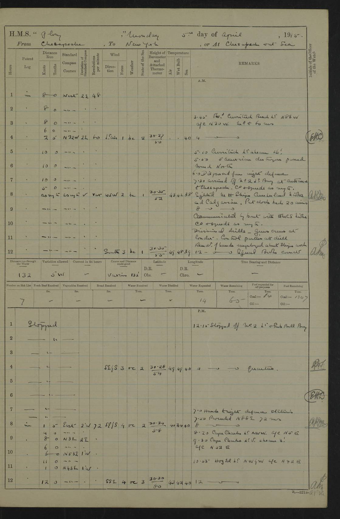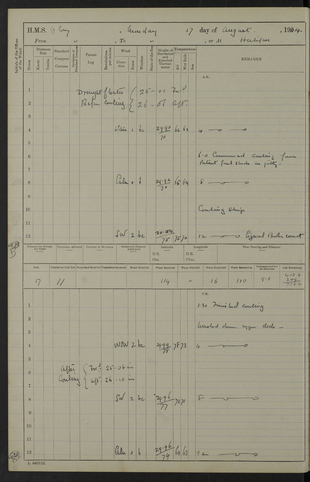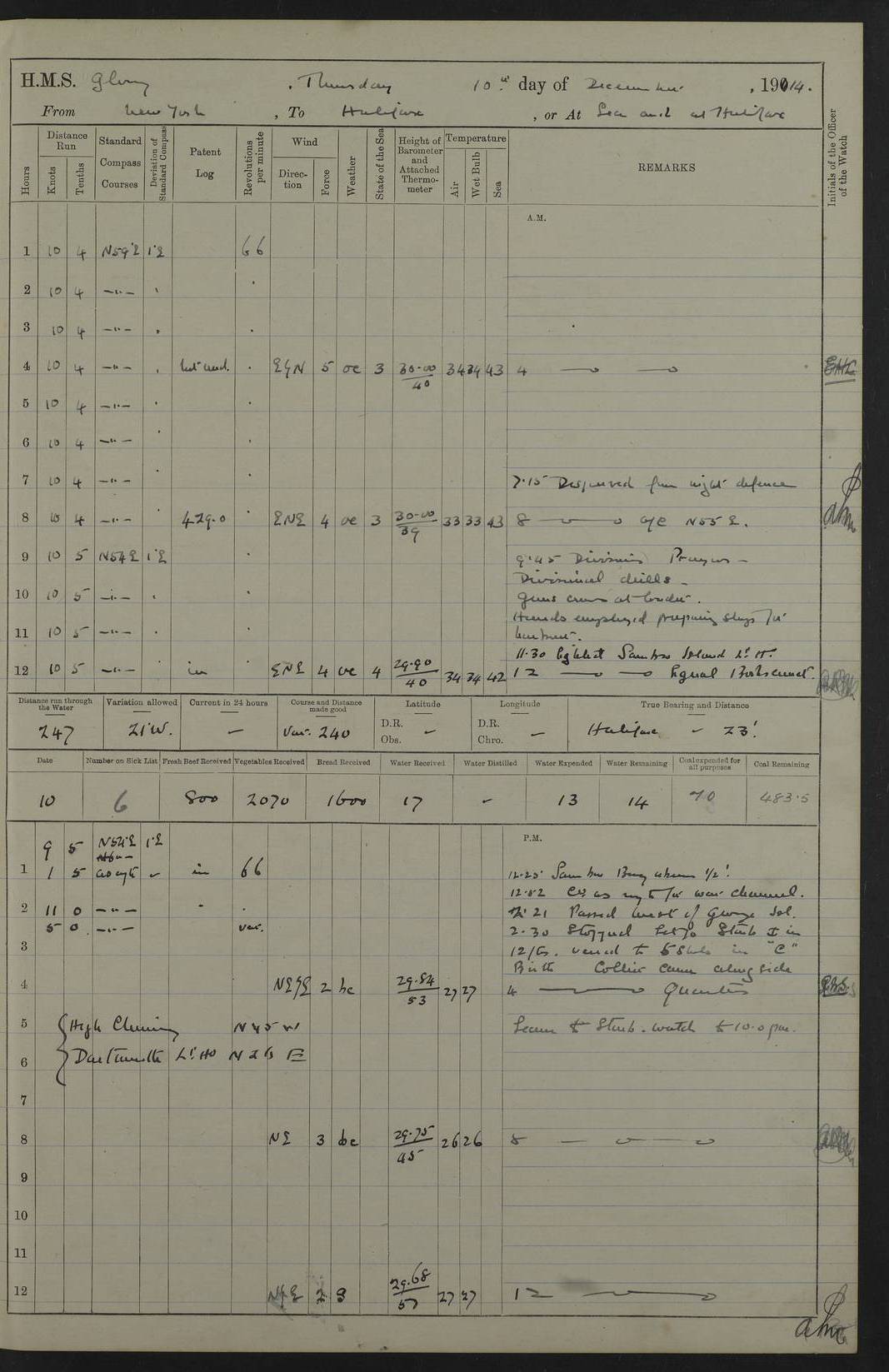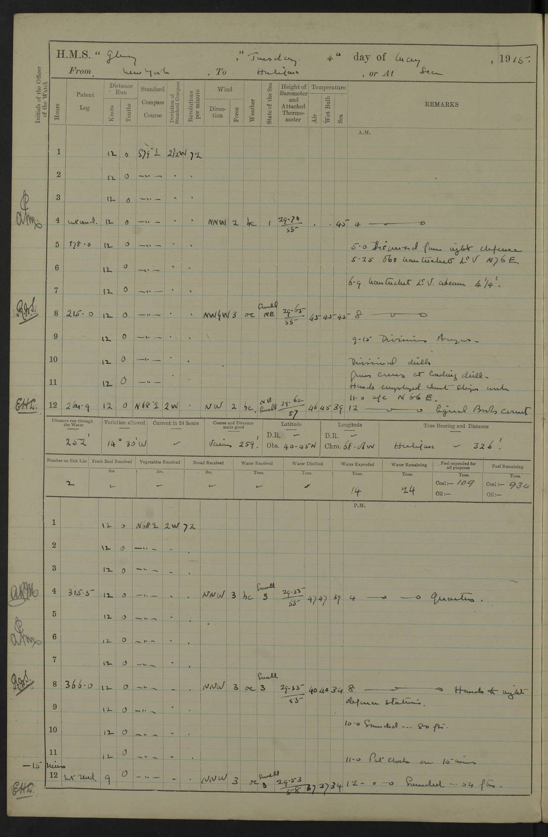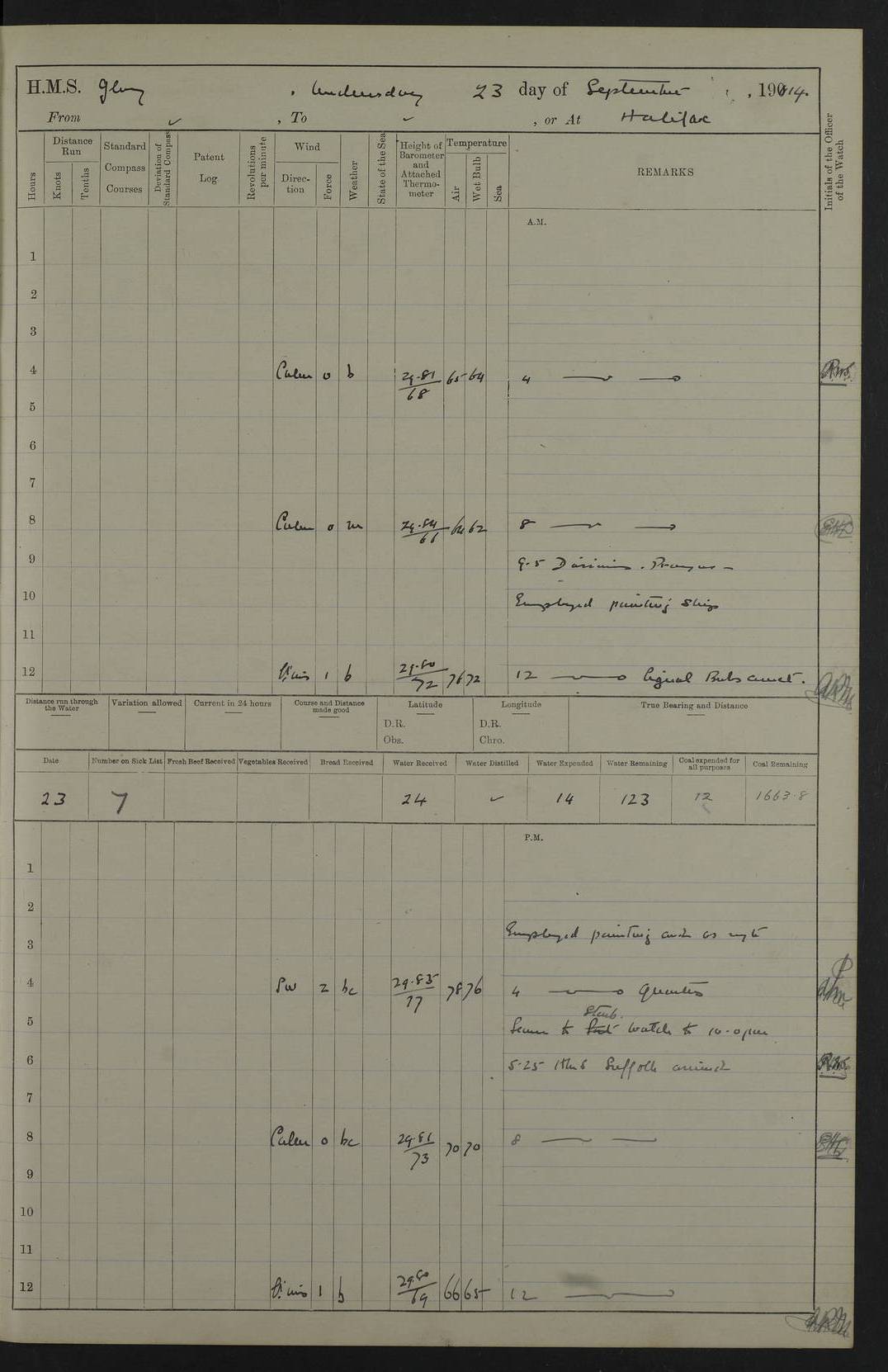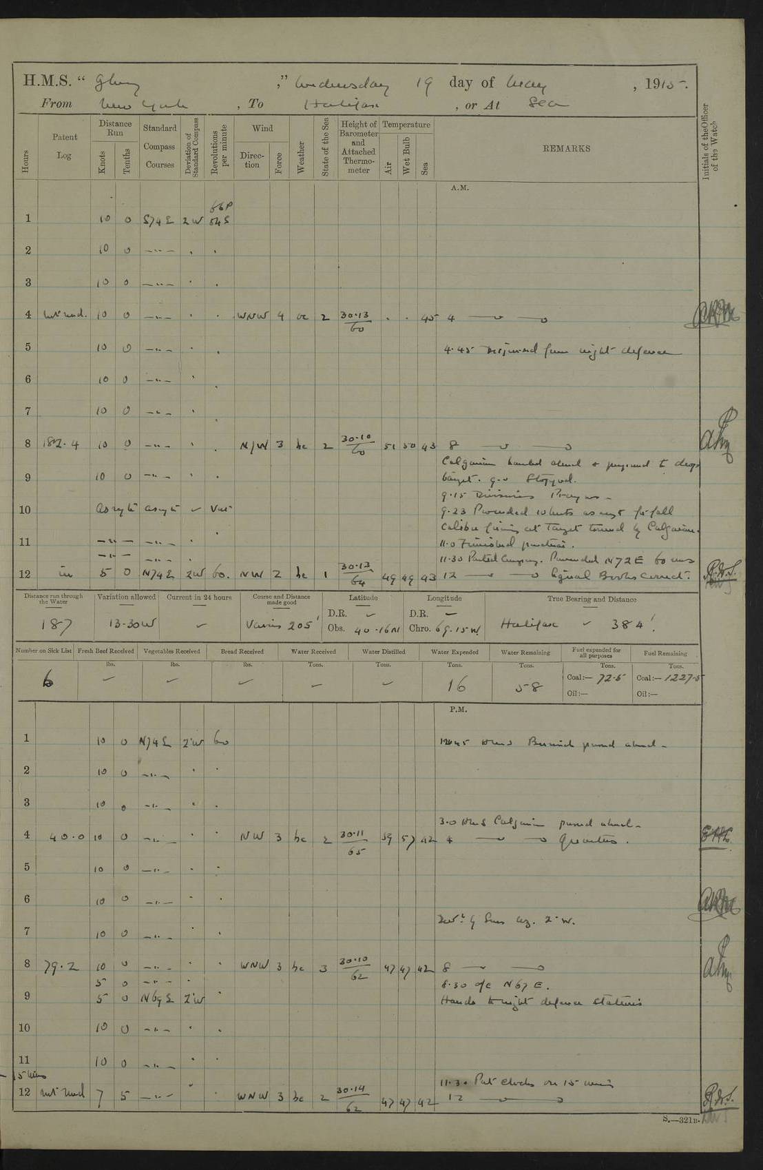 4f73cd06a2fc8ea903001489: (https://s3.amazonaws.com:443/oldweather/ADM53-43011/0072_0.jpg) 17 August 1914 Halifax Lat 44.63, Long -63.55 Number on sick list: 11 6.00am: Commenced coaling from Patent fuel sheds on jetty. 1.30pm: Finished coaling. pm: Washed down upper deck. 4f73cd06a2fc8ea90300148a: (https://s3.amazonaws.com:443/oldweather/ADM53-43011/0072_1.jpg) 18 August 1914 Halifax Lat 44.63, Long -63.55 Number on sick list: 10 4f73cd07a2fc8ea90300148b: (https://s3.amazonaws.com:443/oldweather/ADM53-43011/0073_0.jpg) 19 August 1914 Halifax Lat 44.63, Long -63.55 Number on sick list: 7 5.05am: Slipped from jetty and proceeded as requisite to anchorage in stream. 5.45am: Stopped. Let go Port anchor. am: Preparing for coaling. 9.00am: Collier Brinkwood made fast alongside (Starboard side). 10.10am: Commenced coaling. 9.40pm: Finished coaling. Received 1080 tons. 4f73cd07a2fc8ea90300148c: (https://s3.amazonaws.com:443/oldweather/ADM53-43011/0073_1.jpg) 20 August 1914 Halifax Lat 44.63, Long -63.55 Number on sick list: 7 am: Employed unrigging collier and gear etc. 7.15am: Collier left ship. 5.15pm: Hands to bathe. 4f73cd07a2fc8ea90300148d: (https://s3.amazonaws.com:443/oldweather/ADM53-43011/0074_0.jpg) 21 August 1914 Halifax Lat 44.63, Long -63.55 Number on sick list: 7 pm: Testing gun sights. 8.30pm: Exercised darken ship. 9.15pm: Opened deadlights etc. 4f73cd07a2fc8ea90300148e: (https://s3.amazonaws.com:443/oldweather/ADM53-43011/0074_1.jpg) 22 August 1914 Halifax Lat 44.63, Long -63.55 Number on sick list: 8 am: Aired night clothing. pm: Employed disembarking spare torpedo booms and other gear. pm: Tested lifebuoys. Found correct. 4f73cd08a2fc8ea90300148f: (https://s3.amazonaws.com:443/oldweather/ADM53-43011/0075_0.jpg) 23 August 1914 Halifax and at Sea Lat 44.63, Long -63.55 Number on sick list: 7 10.00am: Held Divine Service on board. am: Preparing for sea. 11.45am: Weighed and proceeded as requisite out of harbour. 12.50pm: Entered War Channel. 3.20pm: a/c S59ºW for rendezvous. 7.25pm: Observed HMS Suffolk 1 pt on starboard bow. HMS Suffolk was a Kent class armoured cruiser, launched at Portsmouth Dockyard in 1903, and sold in 1920. Details at http://en.wikipedia.org/wiki/HMS_Suffolk_(1903) . 8.00pm: Stopped at rendezvous. Communicated by boat with Suffolk. 9.30pm: Fog shut down. 9.00pm: Hands to night defence stations. 9.30pm: Fog shut down.9.45pm: Proceeded. 10.50pm: Fog cleared. 4f73cd08a2fc8ea903001490: (https://s3.amazonaws.com:443/oldweather/ADM53-43011/0075_1.jpg) 24 August 1914 At sea, Halifax to New York Lat 41.9, Long -66.4 Number on sick list: 9 5.30am: Dispersed from night defence. 10.20am: a/c to speak merchant steamer bearing WNW (SS Hurley of Montreal). 10.40am: a/c south. Stopped. Dropped target. 11.00am: Carried out aiming rifle practice. 12.10pm: Stopped. 1.20pm: Dropped second target. Carried out aiming rifle and sub calibre practice. 2.50pm: Fog shut down. pm: Hands at night defence stations. 10.45pm: Fog clearing. 4f73cd08a2fc8ea903001491: (https://s3.amazonaws.com:443/oldweather/ADM53-43011/0076_0.jpg) 25 August 1914 Patrolling off New York Lat 40.6, Long -70.0 Number on sick list: 8 5.40am: Dispersed from night defence. 6.10am: Observed sail N30ºW/ a/c N30ºW. Reduced to 60 revs. 6.50am: Resumed course. Abeam sail (Alicia B. Crosby). 9.36am: Sighted Nantucket Light N65ºW. 10.15am: Met Mason Lines Antilles. 10.25am: Nantucket Light Vessel abeam, 1.2 miles. 6.00pm: Sighted cruiser ahead. 6.10pm: Action. 6.25pm: Dispersed. 6.40pm: Stopped and signalled HMS Essex. HMS Essex was an armoured cruiser of the Kent class, launched in 1901 at Pembroke Dockyard and sold in 1921. Details at http://en.wikipedia.org/wiki/HMS_Essex_(1901) . 7.00pm: Proceeded as requisite. 7.25pm: Sighted steamer. a/c N60ºW, 60 revs. 7.35pm: Turned to east in company with SS Uranium. 8.00pm: Hands to night defence. 8.05pm: Stopped. Communicated by boat with Uranium. 9.23pm: Proceeded, course as requisite to northward to investigate searchlights. pm: Connected conning tower steaming gear. 4f73cd08a2fc8ea903001492: (https://s3.amazonaws.com:443/oldweather/ADM53-43011/0076_1.jpg) 26 August 1914 Patrolling off New York Lat 40.4, Long -73.6 Number on sick list: 11 5.16am: Fire Island Light abeam 7 miles. 7.00am: a/c N49ºW on sighting steamer to north. 8.25am: Sighted Ambrose Light Vessel. 1.00pm: Courses as requisite investigating shipping off Ambrose Light Vessel and Waveside. 2.15pm: Stopped, communicated by boat with SS Van der Duyn. 2.55pm: Proceeded as requisite. 5.26pm: In company with steamers New York and Commanchee. 6.17pm: Connected up fore bridge steering gear. 7.12pm: a/c to south to close steamer (St Louis). 7.25pm: Resumed course. 9.00pm: Hands to night defence. 4f73cd09a2fc8ea903001493: (https://s3.amazonaws.com:443/oldweather/ADM53-43011/0077_0.jpg) 27 August 1914 Patrolling off New York Lat 40.5, Long -72.3 Number on sick list: 10 5.45pm: Dispersed from night defence. 7.12am: a/c as requisite to close merchantman (Wilson Line Francisco). 7.55am: Resumed course. 9.55am: a/c to close Norwegian ship. 10.10am: Stopped, communicated with her by boat (SS Bjornstjerne Bjornsen). 10.50am: Proceeded N30ºE to close Circadian. 3.55pm: Fire Island Light Vessel abeam 2¾ miles. 4.12pm: Reduced to 36 revs. Passed SS Baltic. 5.35pm: Connected up conning tower steering gear. 6.40pm: Ambrose Light Vessel N33ºW, 7 miles. 7.00pm: Connected up fore bridge steering gear. 9.00pm: Hands to night defence stations. 4f73cd09a2fc8ea903001494: (https://s3.amazonaws.com:443/oldweather/ADM53-43011/0077_1.jpg) 28 August 1914 At sea, New York to Boston Lat 40.2, Long -70.8 Number on sick list: 9 5.45am: Dispersed from night defence. 8.40am: Sighted steamer (SS Ran) bearing S50ºE. 9.10am: Resumed course. am: Divisional drills. Preparing for target practice. 10.45am: Sighted steamer bearing N55ºE. 11.32am: Resumed course (SS Skjorldborg). 1.25pm: Stopped. Dropped target. 1.29pm: Proceeded, course as requi