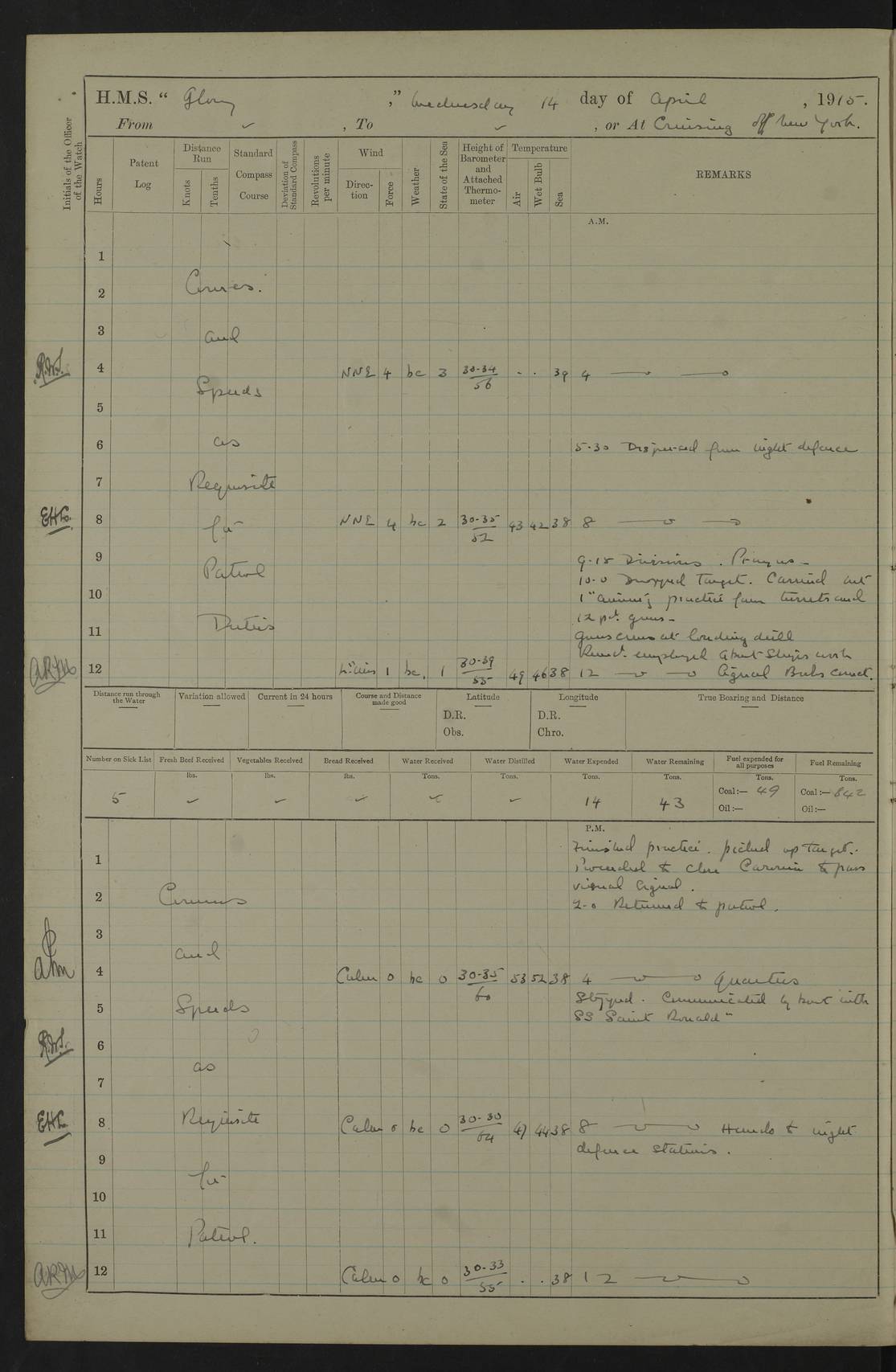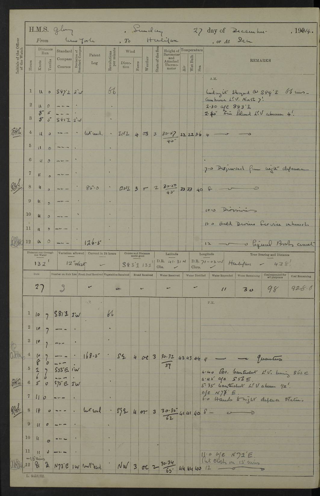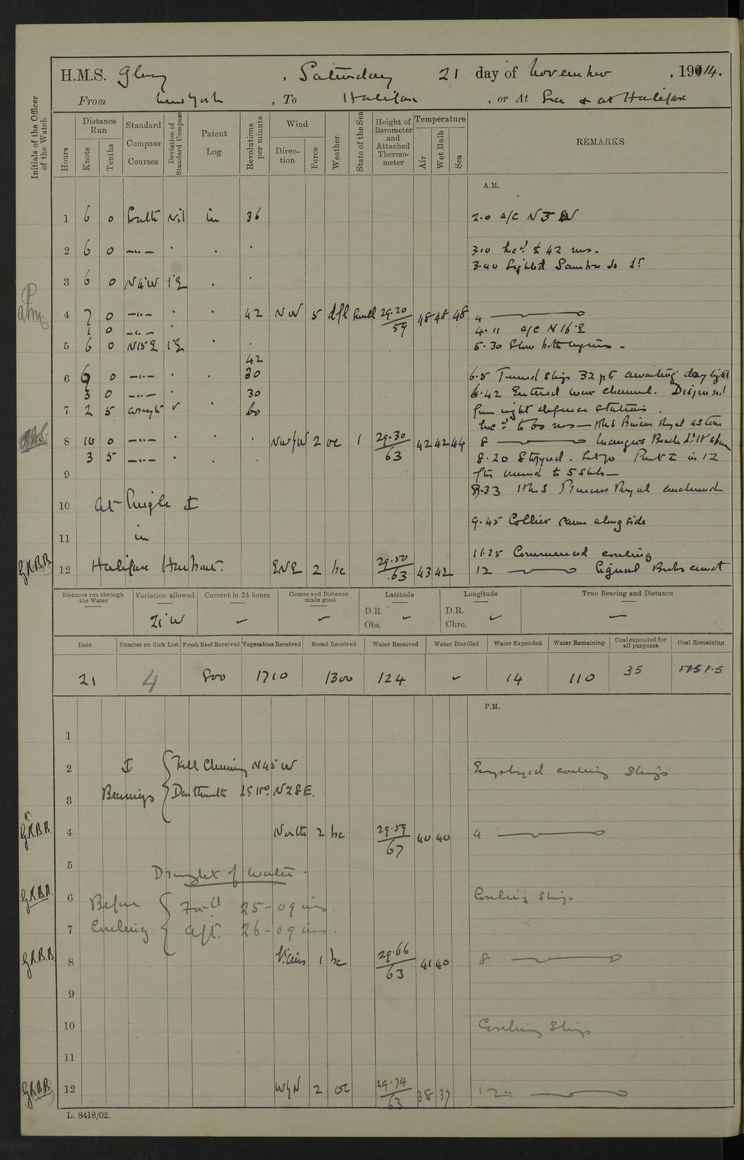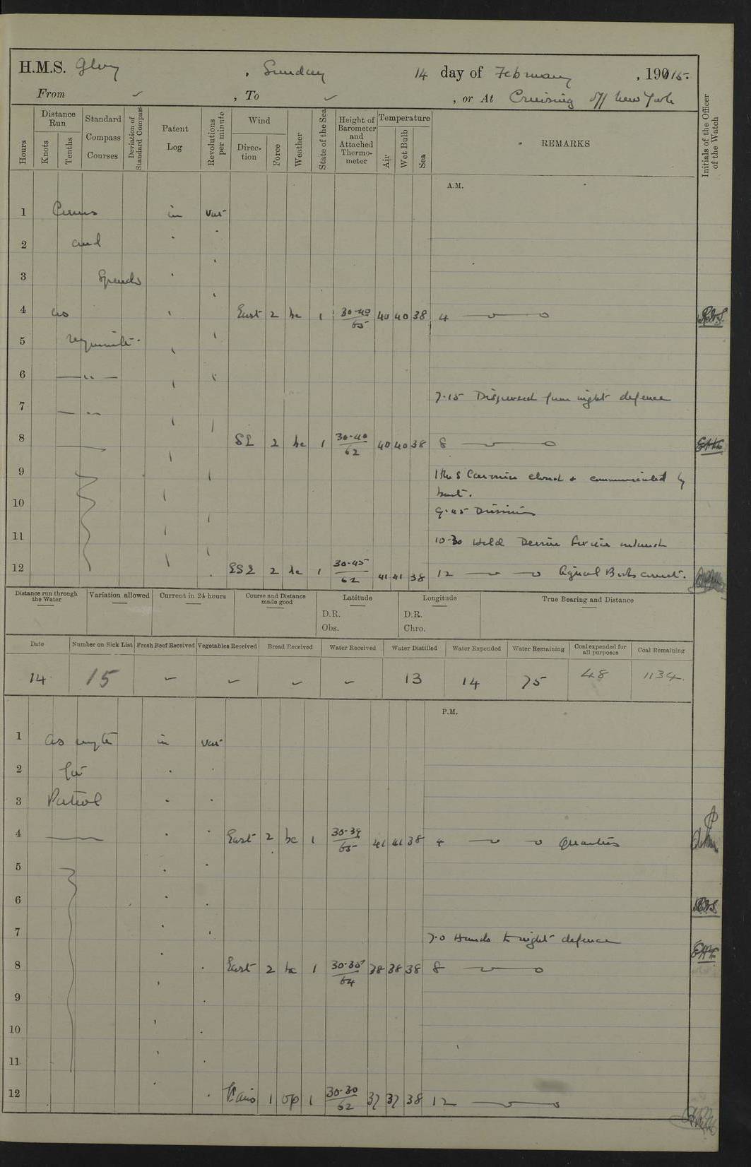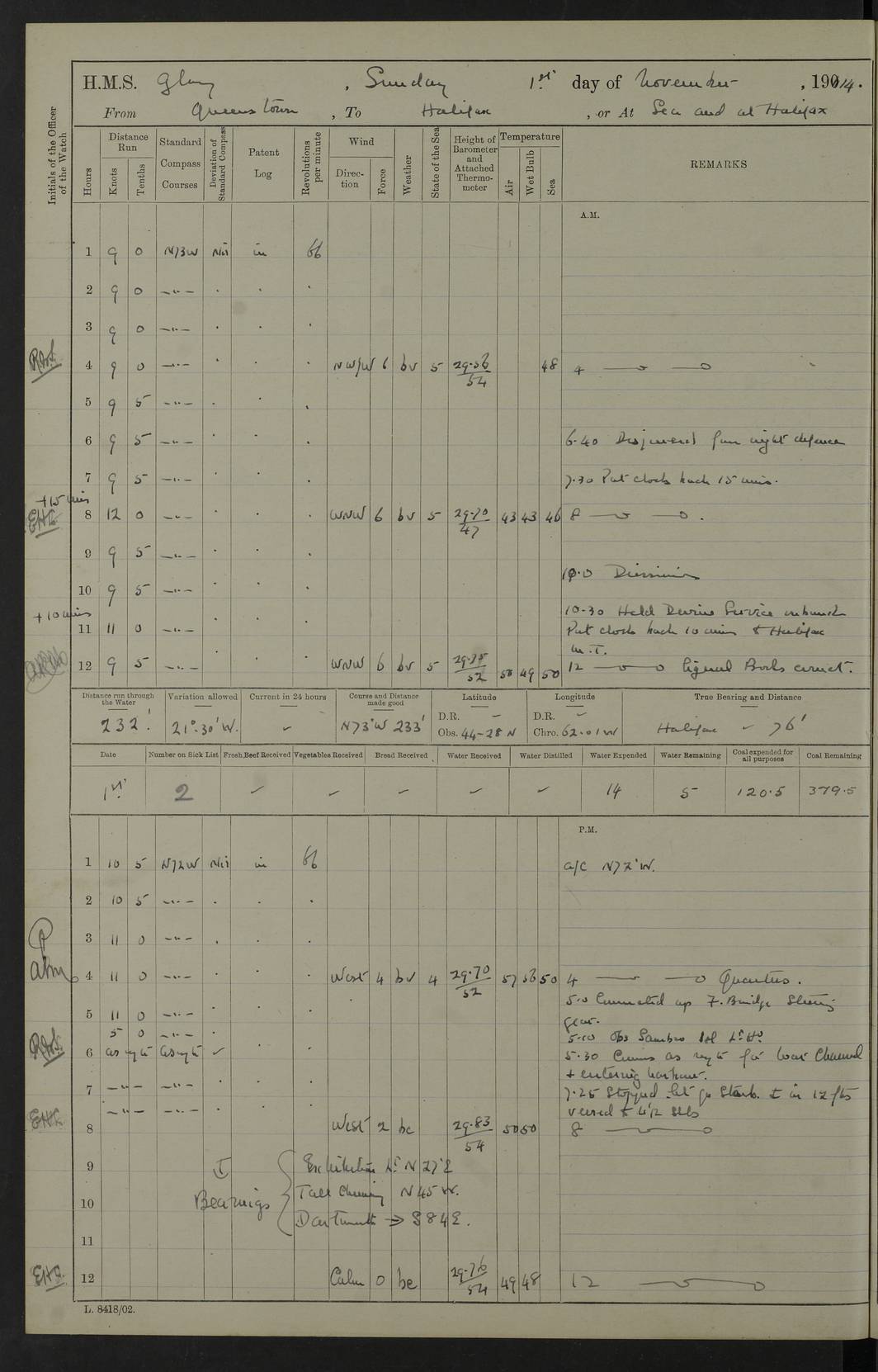 4f73cd06a2fc8ea903001489: (https://s3.amazonaws.com:443/oldweather/ADM53-43011/0072_0.jpg) 17 August 1914 Halifax Lat 44.63, Long -63.55 Number on sick list: 11 6.00am: Commenced coaling from Patent fuel sheds on jetty. 1.30pm: Finished coaling. pm: Washed down upper deck. 4f73cd06a2fc8ea90300148a: (https://s3.amazonaws.com:443/oldweather/ADM53-43011/0072_1.jpg) 18 August 1914 Halifax Lat 44.63, Long -63.55 Number on sick list: 10 4f73cd07a2fc8ea90300148b: (https://s3.amazonaws.com:443/oldweather/ADM53-43011/0073_0.jpg) 19 August 1914 Halifax Lat 44.63, Long -63.55 Number on sick list: 7 5.05am: Slipped from jetty and proceeded as requisite to anchorage in stream. 5.45am: Stopped. Let go Port anchor. am: Preparing for coaling. 9.00am: Collier Brinkwood made fast alongside (Starboard side). 10.10am: Commenced coaling. 9.40pm: Finished coaling. Received 1080 tons. 4f73cd07a2fc8ea90300148c: (https://s3.amazonaws.com:443/oldweather/ADM53-43011/0073_1.jpg) 20 August 1914 Halifax Lat 44.63, Long -63.55 Number on sick list: 7 am: Employed unrigging collier and gear etc. 7.15am: Collier left ship. 5.15pm: Hands to bathe. 4f73cd07a2fc8ea90300148d: (https://s3.amazonaws.com:443/oldweather/ADM53-43011/0074_0.jpg) 21 August 1914 Halifax Lat 44.63, Long -63.55 Number on sick list: 7 pm: Testing gun sights. 8.30pm: Exercised darken ship. 9.15pm: Opened deadlights etc. 4f73cd07a2fc8ea90300148e: (https://s3.amazonaws.com:443/oldweather/ADM53-43011/0074_1.jpg) 22 August 1914 Halifax Lat 44.63, Long -63.55 Number on sick list: 8 am: Aired night clothing. pm: Employed disembarking spare torpedo booms and other gear. pm: Tested lifebuoys. Found correct. 4f73cd08a2fc8ea90300148f: (https://s3.amazonaws.com:443/oldweather/ADM53-43011/0075_0.jpg) 23 August 1914 Halifax and at Sea Lat 44.63, Long -63.55 Number on sick list: 7 10.00am: Held Divine Service on board. am: Preparing for sea. 11.45am: Weighed and proceeded as requisite out of harbour. 12.50pm: Entered War Channel. 3.20pm: a/c S59ºW for rendezvous. 7.25pm: Observed HMS Suffolk 1 pt on starboard bow. HMS Suffolk was a Kent class armoured cruiser, launched at Portsmouth Dockyard in 1903, and sold in 1920. Details at http://en.wikipedia.org/wiki/HMS_Suffolk_(1903) . 8.00pm: Stopped at rendezvous. Communicated by boat with Suffolk. 9.30pm: Fog shut down. 9.00pm: Hands to night defence stations. 9.30pm: Fog shut down.9.45pm: Proceeded. 10.50pm: Fog cleared. 4f73cd08a2fc8ea903001490: (https://s3.amazonaws.com:443/oldweather/ADM53-43011/0075_1.jpg) 24 August 1914 At sea, Halifax to New York Lat 41.9, Long -66.4 Number on sick list: 9 5.30am: Dispersed from night defence. 10.20am: a/c to speak merchant steamer bearing WNW (SS Hurley of Montreal). 10.40am: a/c south. Stopped. Dropped target. 11.00am: Carried out aiming rifle practice. 12.10pm: Stopped. 1.20pm: Dropped second target. Carried out aiming rifle and sub calibre practice. 2.50pm: Fog shut down. pm: Hands at night defence stations. 10.45pm: Fog clearing. 4f73cd08a2fc8ea903001491: (https://s3.amazonaws.com:443/oldweather/ADM53-43011/0076_0.jpg) 25 August 1914 Patrolling off New York Lat 40.6, Long -70.0 Number on sick list: 8 5.40am: Dispersed from night defence. 6.10am: Observed sail N30ºW/ a/c N30ºW. Reduced to 60 revs. 6.50am: Resumed course. Abeam sail (Alicia B. Crosby). 9.36am: Sighted Nantucket Light N65ºW. 10.15am: Met Mason Lines Antilles. 10.25am: Nantucket Light Vessel abeam, 1.2 miles. 6.00pm: Sighted cruiser ahead. 6.10pm: Action. 6.25pm: Dispersed. 6.40pm: Stopped and signalled HMS Essex. HMS Essex was an armoured cruiser of the Kent class, launched in 1901 at Pembroke Dockyard and sold in 1921. Details at http://en.wikipedia.org/wiki/HMS_Essex_(1901) . 7.00pm: Proceeded as requisite. 7.25pm: Sighted steamer. a/c N60ºW, 60 revs. 7.35pm: Turned to east in company with SS Uranium. 8.00pm: Hands to night defence. 8.05pm: Stopped. Communicated by boat with Uranium. 9.23pm: Proceeded, course as requisite to northward to investigate searchlights. pm: Connected conning tower steaming gear. 4f73cd08a2fc8ea903001492: (https://s3.amazonaws.com:443/oldweather/ADM53-43011/0076_1.jpg) 26 August 1914 Patrolling off New York Lat 40.4, Long -73.6 Number on sick list: 11 5.16am: Fire Island Light abeam 7 miles. 7.00am: a/c N49ºW on sighting steamer to north. 8.25am: Sighted Ambrose Light Vessel. 1.00pm: Courses as requisite investigating shipping off Ambrose Light Vessel and Waveside. 2.15pm: Stopped, communicated by boat with SS Van der Duyn. 2.55pm: Proceeded as requisite. 5.26pm: In company with steamers New York and Commanchee. 6.17pm: Connected up fore bridge steering gear. 7.12pm: a/c to south to close steamer (St Louis). 7.25pm: Resumed course. 9.00pm: Hands to night defence. 4f73cd09a2fc8ea903001493: (https://s3.amazonaws.com:443/oldweather/ADM53-43011/0077_0.jpg) 27 August 1914 Patrolling off New York Lat 40.5, Long -72.3 Number on sick list: 10 5.45pm: Dispersed from night defence. 7.12am: a/c as requisite to close merchantman (Wilson Line Francisco). 7.55am: Resumed course. 9.55am: a/c to close Norwegian ship. 10.10am: Stopped, communicated with her by boat (SS Bjornstjerne Bjornsen). 10.50am: Proceeded N30ºE to close Circadian. 3.55pm: Fire Island Light Vessel abeam 2¾ miles. 4.12pm: Reduced to 36 revs. Passed SS Baltic. 5.35pm: Connected up conning tower steering gear. 6.40pm: Ambrose Light Vessel N33ºW, 7 miles. 7.00pm: Connected up fore bridge steering gear. 9.00pm: Hands to night defence stations. 4f73cd09a2fc8ea903001494: (https://s3.amazonaws.com:443/oldweather/ADM53-43011/0077_1.jpg) 28 August 1914 At sea, New York to Boston Lat 40.2, Long -70.8 Number on sick list: 9 5.45am: Dispersed from night defence. 8.40am: Sighted steamer (SS Ran) bearing S50ºE. 9.10am: Resumed course. am: Divisional drills. Preparing for target practice. 10.45am: Sighted steamer bearing N55ºE. 11.32am: Resumed course (SS Skjorldborg). 1.25pm: Stopped. Dropped target. 1.29pm: Proceeded, course as requi