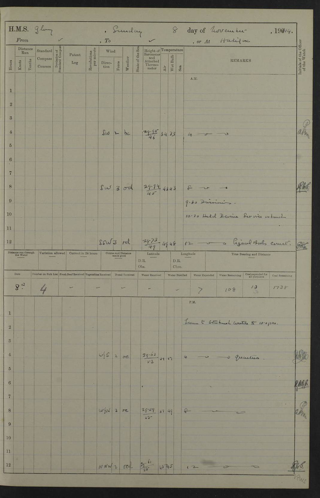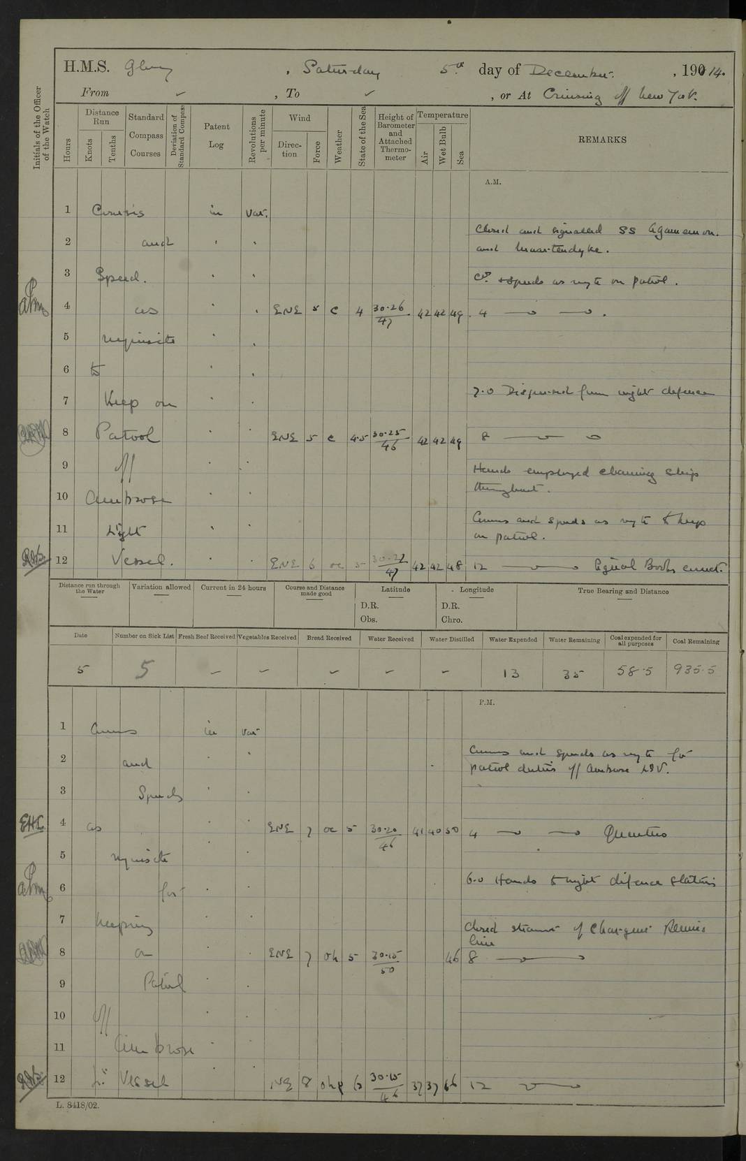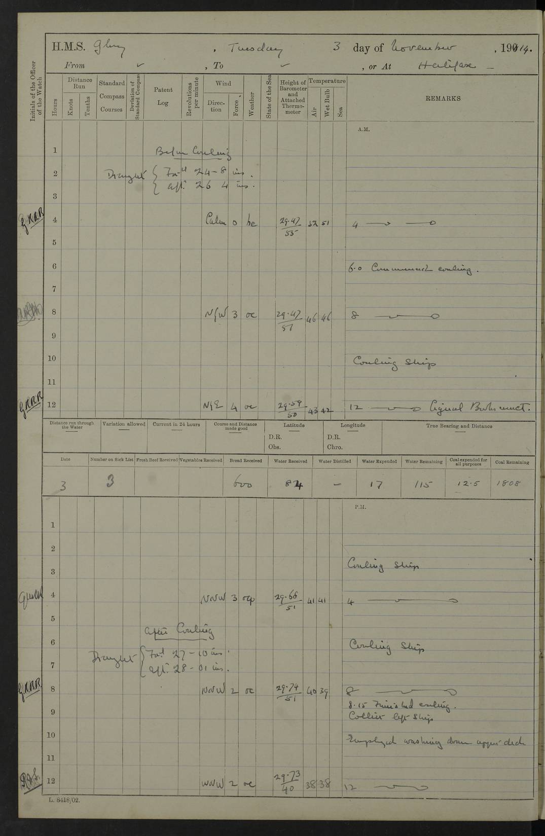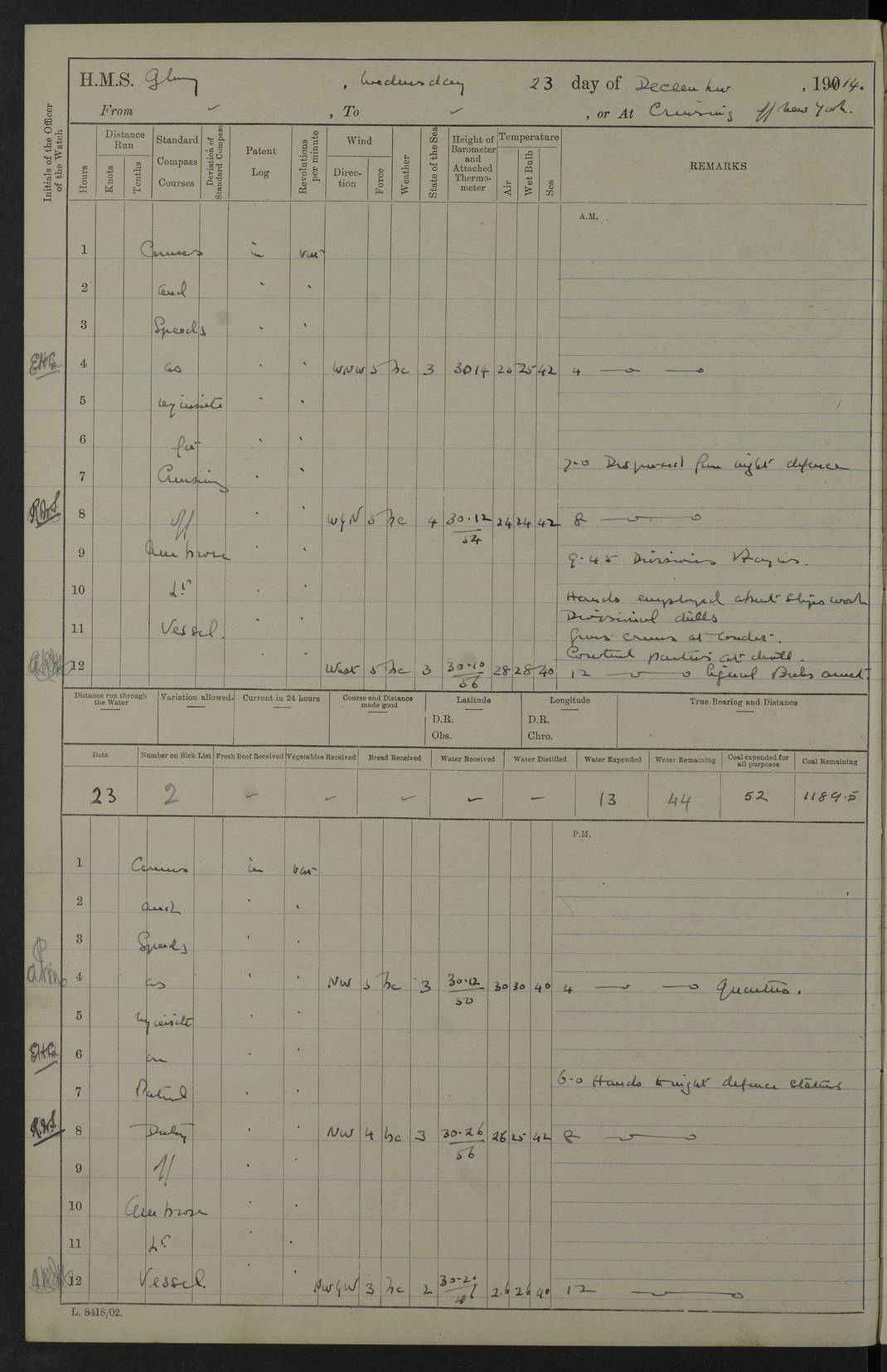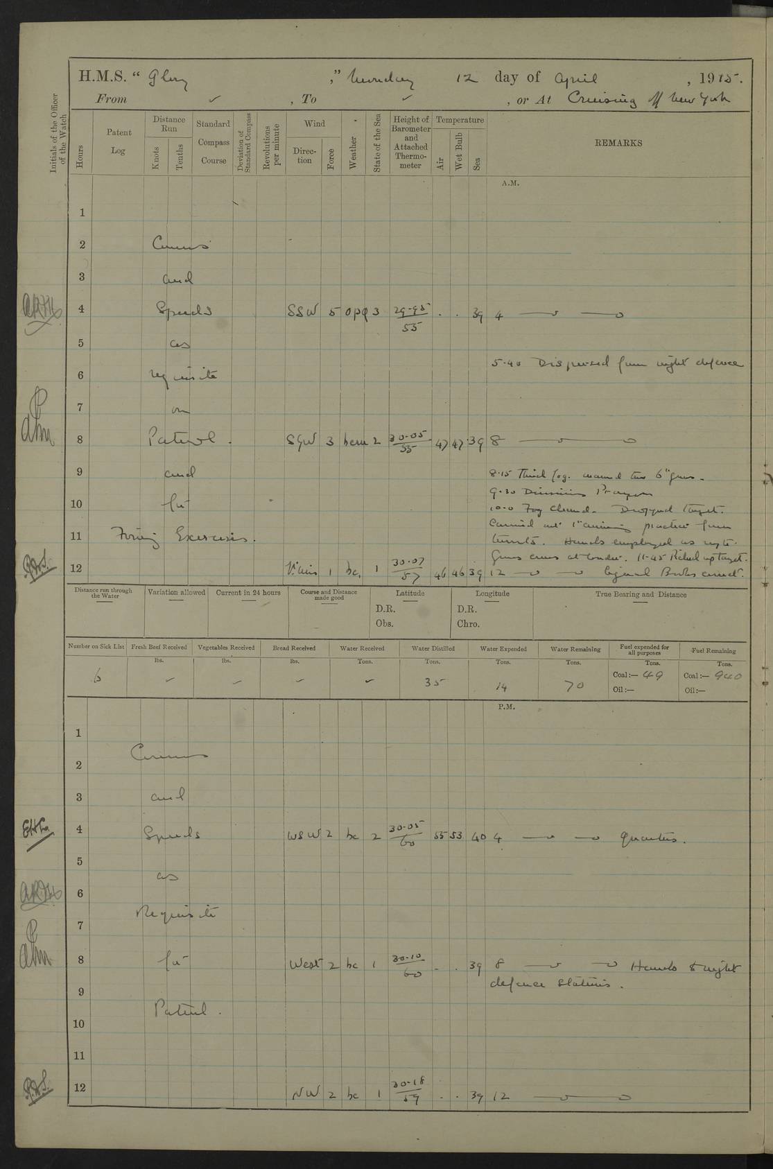 4f73cd06a2fc8ea903001489: (https://s3.amazonaws.com:443/oldweather/ADM53-43011/0072_0.jpg) 17 August 1914 Halifax Lat 44.63, Long -63.55 Number on sick list: 11 6.00am: Commenced coaling from Patent fuel sheds on jetty. 1.30pm: Finished coaling. pm: Washed down upper deck. 4f73cd06a2fc8ea90300148a: (https://s3.amazonaws.com:443/oldweather/ADM53-43011/0072_1.jpg) 18 August 1914 Halifax Lat 44.63, Long -63.55 Number on sick list: 10 4f73cd07a2fc8ea90300148b: (https://s3.amazonaws.com:443/oldweather/ADM53-43011/0073_0.jpg) 19 August 1914 Halifax Lat 44.63, Long -63.55 Number on sick list: 7 5.05am: Slipped from jetty and proceeded as requisite to anchorage in stream. 5.45am: Stopped. Let go Port anchor. am: Preparing for coaling. 9.00am: Collier Brinkwood made fast alongside (Starboard side). 10.10am: Commenced coaling. 9.40pm: Finished coaling. Received 1080 tons. 4f73cd07a2fc8ea90300148c: (https://s3.amazonaws.com:443/oldweather/ADM53-43011/0073_1.jpg) 20 August 1914 Halifax Lat 44.63, Long -63.55 Number on sick list: 7 am: Employed unrigging collier and gear etc. 7.15am: Collier left ship. 5.15pm: Hands to bathe. 4f73cd07a2fc8ea90300148d: (https://s3.amazonaws.com:443/oldweather/ADM53-43011/0074_0.jpg) 21 August 1914 Halifax Lat 44.63, Long -63.55 Number on sick list: 7 pm: Testing gun sights. 8.30pm: Exercised darken ship. 9.15pm: Opened deadlights etc. 4f73cd07a2fc8ea90300148e: (https://s3.amazonaws.com:443/oldweather/ADM53-43011/0074_1.jpg) 22 August 1914 Halifax Lat 44.63, Long -63.55 Number on sick list: 8 am: Aired night clothing. pm: Employed disembarking spare torpedo booms and other gear. pm: Tested lifebuoys. Found correct. 4f73cd08a2fc8ea90300148f: (https://s3.amazonaws.com:443/oldweather/ADM53-43011/0075_0.jpg) 23 August 1914 Halifax and at Sea Lat 44.63, Long -63.55 Number on sick list: 7 10.00am: Held Divine Service on board. am: Preparing for sea. 11.45am: Weighed and proceeded as requisite out of harbour. 12.50pm: Entered War Channel. 3.20pm: a/c S59ºW for rendezvous. 7.25pm: Observed HMS Suffolk 1 pt on starboard bow. HMS Suffolk was a Kent class armoured cruiser, launched at Portsmouth Dockyard in 1903, and sold in 1920. Details at http://en.wikipedia.org/wiki/HMS_Suffolk_(1903) . 8.00pm: Stopped at rendezvous. Communicated by boat with Suffolk. 9.30pm: Fog shut down. 9.00pm: Hands to night defence stations. 9.30pm: Fog shut down.9.45pm: Proceeded. 10.50pm: Fog cleared. 4f73cd08a2fc8ea903001490: (https://s3.amazonaws.com:443/oldweather/ADM53-43011/0075_1.jpg) 24 August 1914 At sea, Halifax to New York Lat 41.9, Long -66.4 Number on sick list: 9 5.30am: Dispersed from night defence. 10.20am: a/c to speak merchant steamer bearing WNW (SS Hurley of Montreal). 10.40am: a/c south. Stopped. Dropped target. 11.00am: Carried out aiming rifle practice. 12.10pm: Stopped. 1.20pm: Dropped second target. Carried out aiming rifle and sub calibre practice. 2.50pm: Fog shut down. pm: Hands at night defence stations. 10.45pm: Fog clearing. 4f73cd08a2fc8ea903001491: (https://s3.amazonaws.com:443/oldweather/ADM53-43011/0076_0.jpg) 25 August 1914 Patrolling off New York Lat 40.6, Long -70.0 Number on sick list: 8 5.40am: Dispersed from night defence. 6.10am: Observed sail N30ºW/ a/c N30ºW. Reduced to 60 revs. 6.50am: Resumed course. Abeam sail (Alicia B. Crosby). 9.36am: Sighted Nantucket Light N65ºW. 10.15am: Met Mason Lines Antilles. 10.25am: Nantucket Light Vessel abeam, 1.2 miles. 6.00pm: Sighted cruiser ahead. 6.10pm: Action. 6.25pm: Dispersed. 6.40pm: Stopped and signalled HMS Essex. HMS Essex was an armoured cruiser of the Kent class, launched in 1901 at Pembroke Dockyard and sold in 1921. Details at http://en.wikipedia.org/wiki/HMS_Essex_(1901) . 7.00pm: Proceeded as requisite. 7.25pm: Sighted steamer. a/c N60ºW, 60 revs. 7.35pm: Turned to east in company with SS Uranium. 8.00pm: Hands to night defence. 8.05pm: Stopped. Communicated by boat with Uranium. 9.23pm: Proceeded, course as requisite to northward to investigate searchlights. pm: Connected conning tower steaming gear. 4f73cd08a2fc8ea903001492: (https://s3.amazonaws.com:443/oldweather/ADM53-43011/0076_1.jpg) 26 August 1914 Patrolling off New York Lat 40.4, Long -73.6 Number on sick list: 11 5.16am: Fire Island Light abeam 7 miles. 7.00am: a/c N49ºW on sighting steamer to north. 8.25am: Sighted Ambrose Light Vessel. 1.00pm: Courses as requisite investigating shipping off Ambrose Light Vessel and Waveside. 2.15pm: Stopped, communicated by boat with SS Van der Duyn. 2.55pm: Proceeded as requisite. 5.26pm: In company with steamers New York and Commanchee. 6.17pm: Connected up fore bridge steering gear. 7.12pm: a/c to south to close steamer (St Louis). 7.25pm: Resumed course. 9.00pm: Hands to night defence. 4f73cd09a2fc8ea903001493: (https://s3.amazonaws.com:443/oldweather/ADM53-43011/0077_0.jpg) 27 August 1914 Patrolling off New York Lat 40.5, Long -72.3 Number on sick list: 10 5.45pm: Dispersed from night defence. 7.12am: a/c as requisite to close merchantman (Wilson Line Francisco). 7.55am: Resumed course. 9.55am: a/c to close Norwegian ship. 10.10am: Stopped, communicated with her by boat (SS Bjornstjerne Bjornsen). 10.50am: Proceeded N30ºE to close Circadian. 3.55pm: Fire Island Light Vessel abeam 2¾ miles. 4.12pm: Reduced to 36 revs. Passed SS Baltic. 5.35pm: Connected up conning tower steering gear. 6.40pm: Ambrose Light Vessel N33ºW, 7 miles. 7.00pm: Connected up fore bridge steering gear. 9.00pm: Hands to night defence stations. 4f73cd09a2fc8ea903001494: (https://s3.amazonaws.com:443/oldweather/ADM53-43011/0077_1.jpg) 28 August 1914 At sea, New York to Boston Lat 40.2, Long -70.8 Number on sick list: 9 5.45am: Dispersed from night defence. 8.40am: Sighted steamer (SS Ran) bearing S50ºE. 9.10am: Resumed course. am: Divisional drills. Preparing for target practice. 10.45am: Sighted steamer bearing N55ºE. 11.32am: Resumed course (SS Skjorldborg). 1.25pm: Stopped. Dropped target. 1.29pm: Proceeded, course as requi