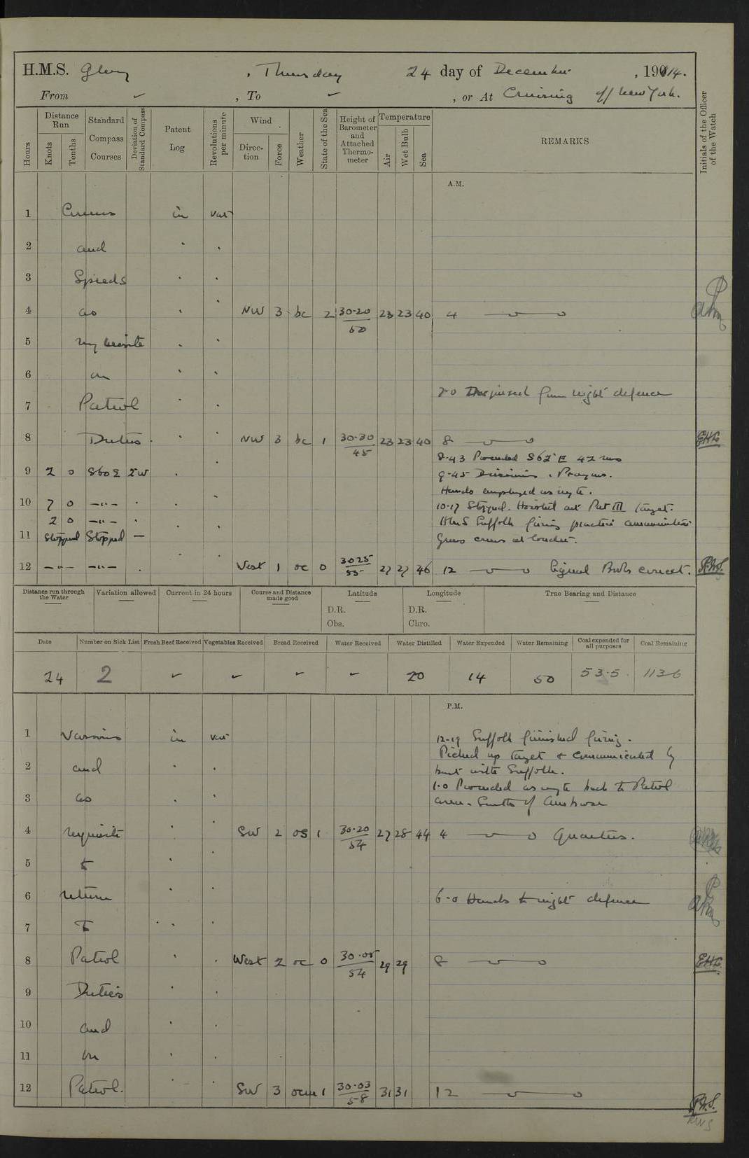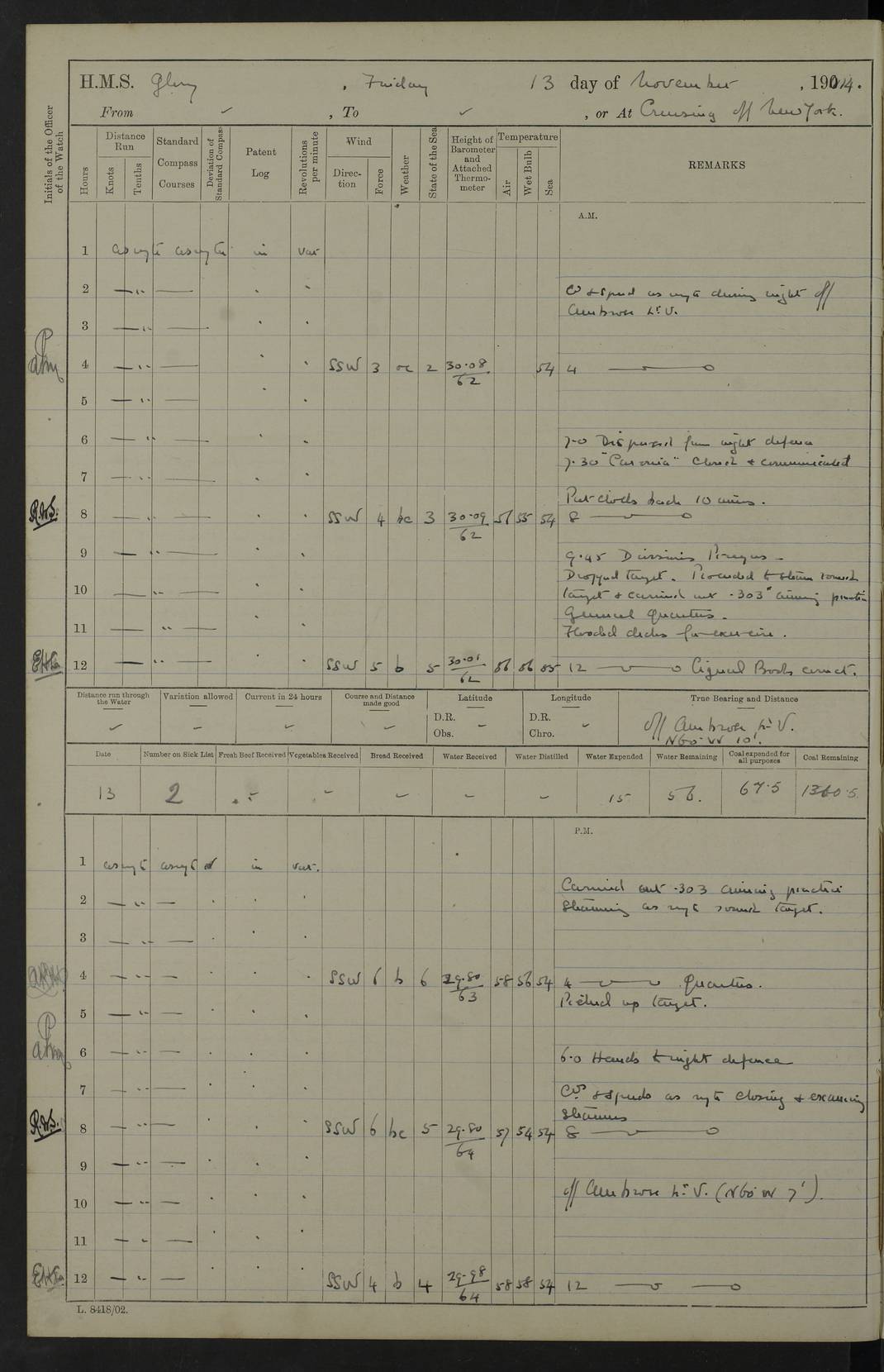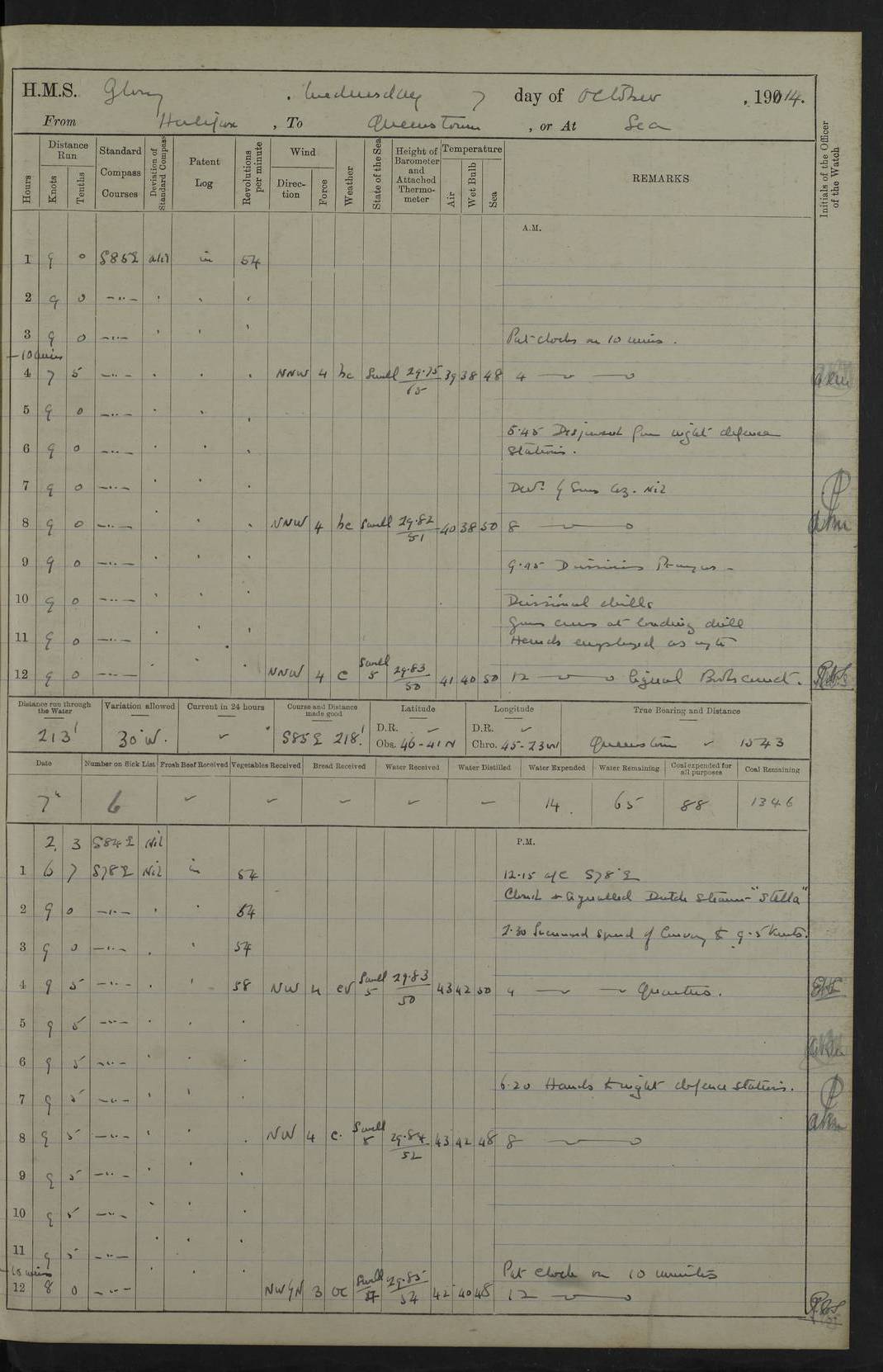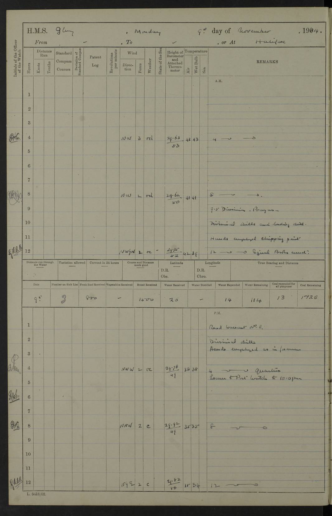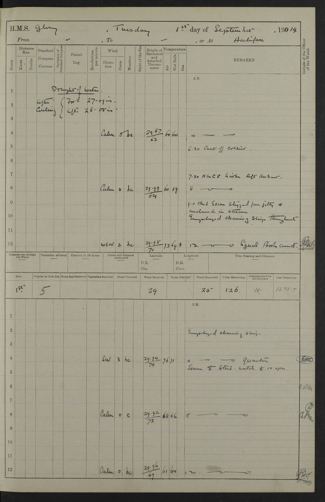 4f73cd06a2fc8ea903001489: (https://s3.amazonaws.com:443/oldweather/ADM53-43011/0072_0.jpg) 17 August 1914 Halifax Lat 44.63, Long -63.55 Number on sick list: 11 6.00am: Commenced coaling from Patent fuel sheds on jetty. 1.30pm: Finished coaling. pm: Washed down upper deck. 4f73cd06a2fc8ea90300148a: (https://s3.amazonaws.com:443/oldweather/ADM53-43011/0072_1.jpg) 18 August 1914 Halifax Lat 44.63, Long -63.55 Number on sick list: 10 4f73cd07a2fc8ea90300148b: (https://s3.amazonaws.com:443/oldweather/ADM53-43011/0073_0.jpg) 19 August 1914 Halifax Lat 44.63, Long -63.55 Number on sick list: 7 5.05am: Slipped from jetty and proceeded as requisite to anchorage in stream. 5.45am: Stopped. Let go Port anchor. am: Preparing for coaling. 9.00am: Collier Brinkwood made fast alongside (Starboard side). 10.10am: Commenced coaling. 9.40pm: Finished coaling. Received 1080 tons. 4f73cd07a2fc8ea90300148c: (https://s3.amazonaws.com:443/oldweather/ADM53-43011/0073_1.jpg) 20 August 1914 Halifax Lat 44.63, Long -63.55 Number on sick list: 7 am: Employed unrigging collier and gear etc. 7.15am: Collier left ship. 5.15pm: Hands to bathe. 4f73cd07a2fc8ea90300148d: (https://s3.amazonaws.com:443/oldweather/ADM53-43011/0074_0.jpg) 21 August 1914 Halifax Lat 44.63, Long -63.55 Number on sick list: 7 pm: Testing gun sights. 8.30pm: Exercised darken ship. 9.15pm: Opened deadlights etc. 4f73cd07a2fc8ea90300148e: (https://s3.amazonaws.com:443/oldweather/ADM53-43011/0074_1.jpg) 22 August 1914 Halifax Lat 44.63, Long -63.55 Number on sick list: 8 am: Aired night clothing. pm: Employed disembarking spare torpedo booms and other gear. pm: Tested lifebuoys. Found correct. 4f73cd08a2fc8ea90300148f: (https://s3.amazonaws.com:443/oldweather/ADM53-43011/0075_0.jpg) 23 August 1914 Halifax and at Sea Lat 44.63, Long -63.55 Number on sick list: 7 10.00am: Held Divine Service on board. am: Preparing for sea. 11.45am: Weighed and proceeded as requisite out of harbour. 12.50pm: Entered War Channel. 3.20pm: a/c S59ºW for rendezvous. 7.25pm: Observed HMS Suffolk 1 pt on starboard bow. HMS Suffolk was a Kent class armoured cruiser, launched at Portsmouth Dockyard in 1903, and sold in 1920. Details at http://en.wikipedia.org/wiki/HMS_Suffolk_(1903) . 8.00pm: Stopped at rendezvous. Communicated by boat with Suffolk. 9.30pm: Fog shut down. 9.00pm: Hands to night defence stations. 9.30pm: Fog shut down.9.45pm: Proceeded. 10.50pm: Fog cleared. 4f73cd08a2fc8ea903001490: (https://s3.amazonaws.com:443/oldweather/ADM53-43011/0075_1.jpg) 24 August 1914 At sea, Halifax to New York Lat 41.9, Long -66.4 Number on sick list: 9 5.30am: Dispersed from night defence. 10.20am: a/c to speak merchant steamer bearing WNW (SS Hurley of Montreal). 10.40am: a/c south. Stopped. Dropped target. 11.00am: Carried out aiming rifle practice. 12.10pm: Stopped. 1.20pm: Dropped second target. Carried out aiming rifle and sub calibre practice. 2.50pm: Fog shut down. pm: Hands at night defence stations. 10.45pm: Fog clearing. 4f73cd08a2fc8ea903001491: (https://s3.amazonaws.com:443/oldweather/ADM53-43011/0076_0.jpg) 25 August 1914 Patrolling off New York Lat 40.6, Long -70.0 Number on sick list: 8 5.40am: Dispersed from night defence. 6.10am: Observed sail N30ºW/ a/c N30ºW. Reduced to 60 revs. 6.50am: Resumed course. Abeam sail (Alicia B. Crosby). 9.36am: Sighted Nantucket Light N65ºW. 10.15am: Met Mason Lines Antilles. 10.25am: Nantucket Light Vessel abeam, 1.2 miles. 6.00pm: Sighted cruiser ahead. 6.10pm: Action. 6.25pm: Dispersed. 6.40pm: Stopped and signalled HMS Essex. HMS Essex was an armoured cruiser of the Kent class, launched in 1901 at Pembroke Dockyard and sold in 1921. Details at http://en.wikipedia.org/wiki/HMS_Essex_(1901) . 7.00pm: Proceeded as requisite. 7.25pm: Sighted steamer. a/c N60ºW, 60 revs. 7.35pm: Turned to east in company with SS Uranium. 8.00pm: Hands to night defence. 8.05pm: Stopped. Communicated by boat with Uranium. 9.23pm: Proceeded, course as requisite to northward to investigate searchlights. pm: Connected conning tower steaming gear. 4f73cd08a2fc8ea903001492: (https://s3.amazonaws.com:443/oldweather/ADM53-43011/0076_1.jpg) 26 August 1914 Patrolling off New York Lat 40.4, Long -73.6 Number on sick list: 11 5.16am: Fire Island Light abeam 7 miles. 7.00am: a/c N49ºW on sighting steamer to north. 8.25am: Sighted Ambrose Light Vessel. 1.00pm: Courses as requisite investigating shipping off Ambrose Light Vessel and Waveside. 2.15pm: Stopped, communicated by boat with SS Van der Duyn. 2.55pm: Proceeded as requisite. 5.26pm: In company with steamers New York and Commanchee. 6.17pm: Connected up fore bridge steering gear. 7.12pm: a/c to south to close steamer (St Louis). 7.25pm: Resumed course. 9.00pm: Hands to night defence. 4f73cd09a2fc8ea903001493: (https://s3.amazonaws.com:443/oldweather/ADM53-43011/0077_0.jpg) 27 August 1914 Patrolling off New York Lat 40.5, Long -72.3 Number on sick list: 10 5.45pm: Dispersed from night defence. 7.12am: a/c as requisite to close merchantman (Wilson Line Francisco). 7.55am: Resumed course. 9.55am: a/c to close Norwegian ship. 10.10am: Stopped, communicated with her by boat (SS Bjornstjerne Bjornsen). 10.50am: Proceeded N30ºE to close Circadian. 3.55pm: Fire Island Light Vessel abeam 2¾ miles. 4.12pm: Reduced to 36 revs. Passed SS Baltic. 5.35pm: Connected up conning tower steering gear. 6.40pm: Ambrose Light Vessel N33ºW, 7 miles. 7.00pm: Connected up fore bridge steering gear. 9.00pm: Hands to night defence stations. 4f73cd09a2fc8ea903001494: (https://s3.amazonaws.com:443/oldweather/ADM53-43011/0077_1.jpg) 28 August 1914 At sea, New York to Boston Lat 40.2, Long -70.8 Number on sick list: 9 5.45am: Dispersed from night defence. 8.40am: Sighted steamer (SS Ran) bearing S50ºE. 9.10am: Resumed course. am: Divisional drills. Preparing for target practice. 10.45am: Sighted steamer bearing N55ºE. 11.32am: Resumed course (SS Skjorldborg). 1.25pm: Stopped. Dropped target. 1.29pm: Proceeded, course as requi