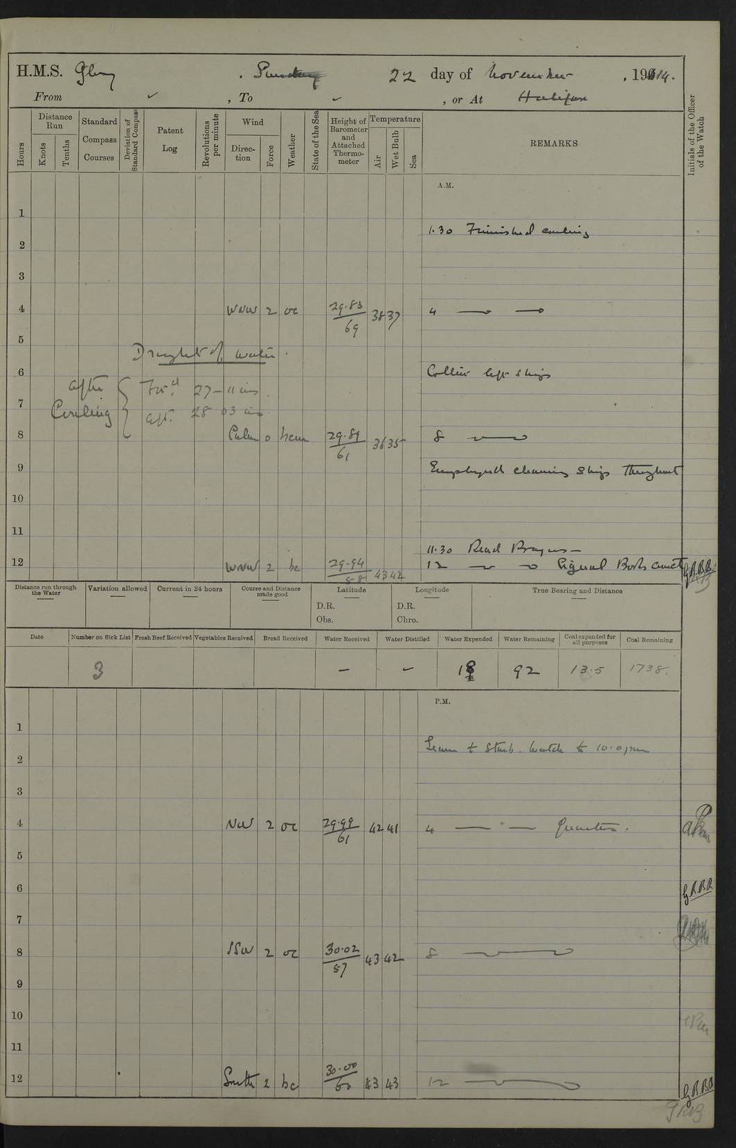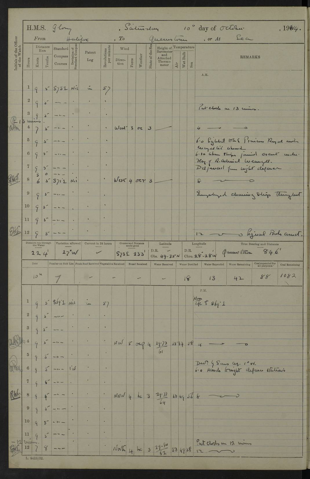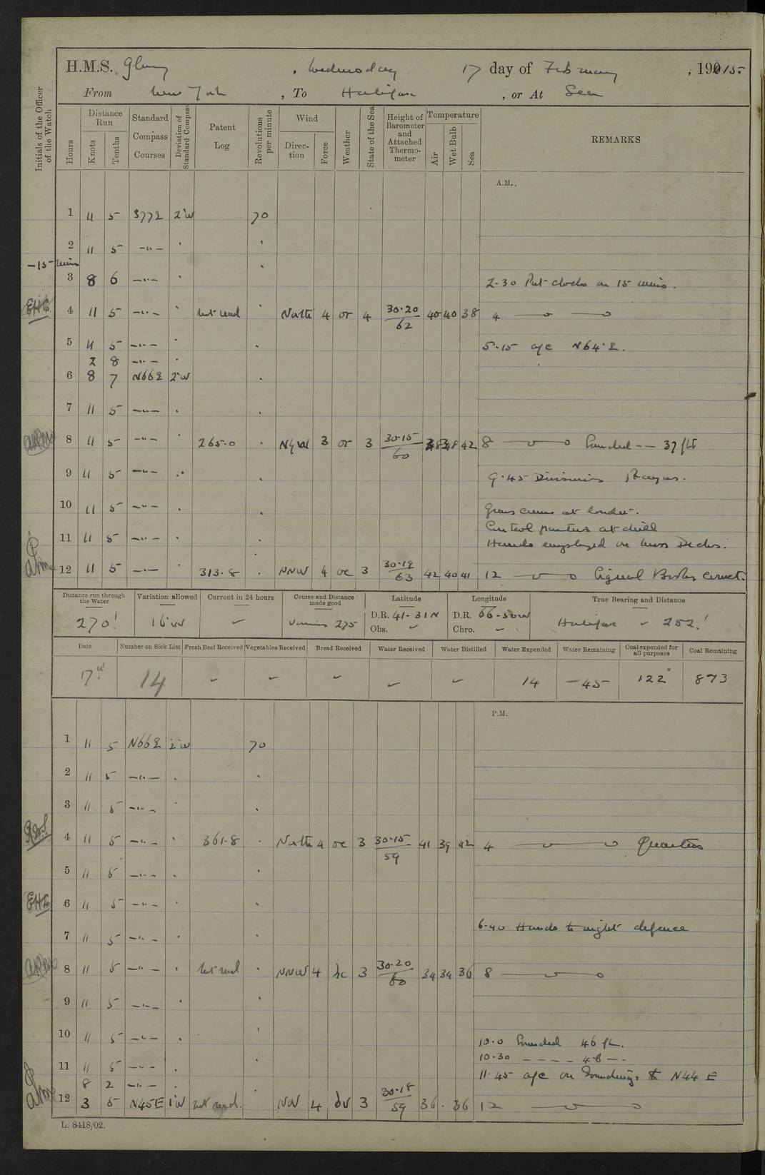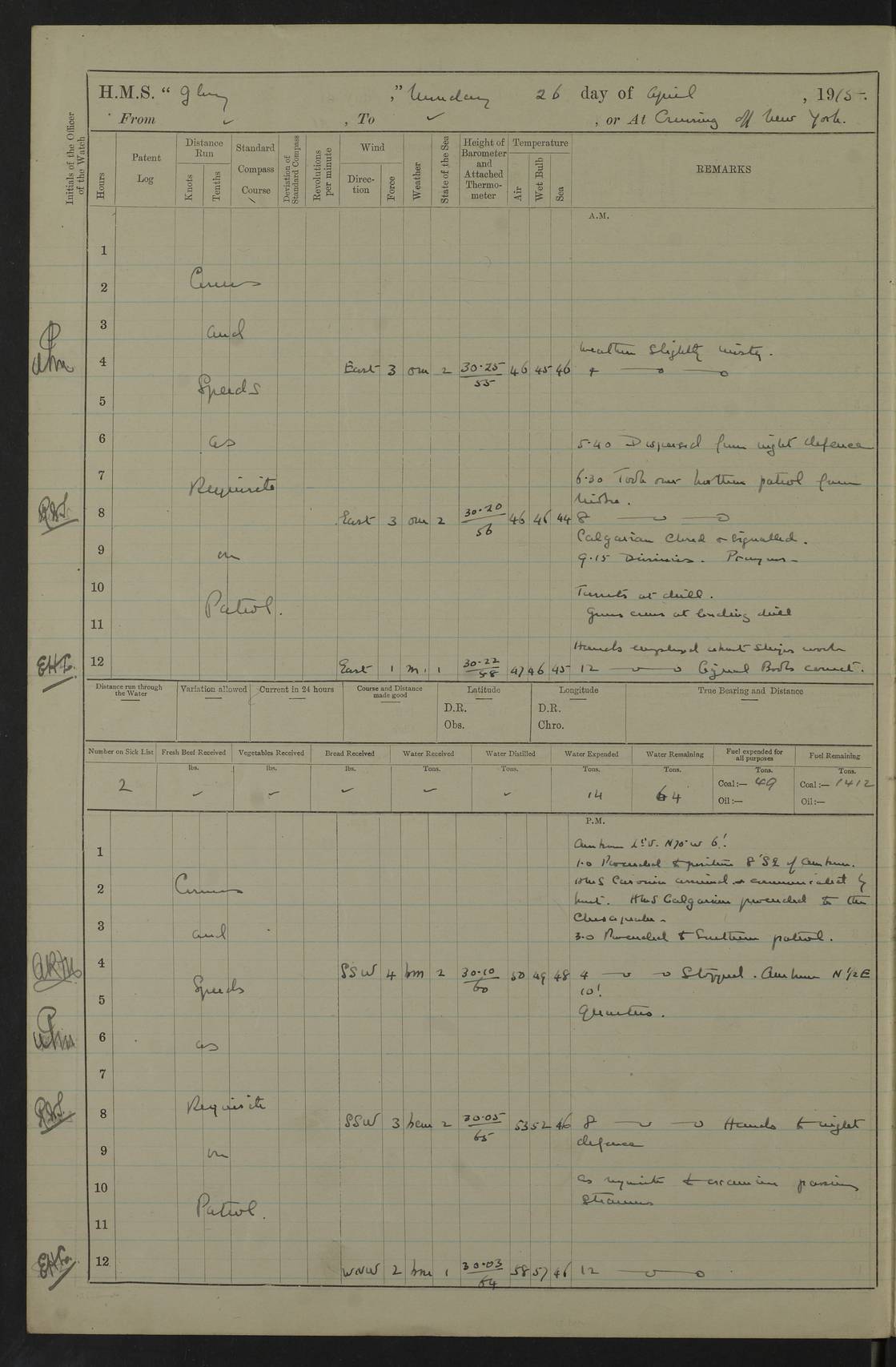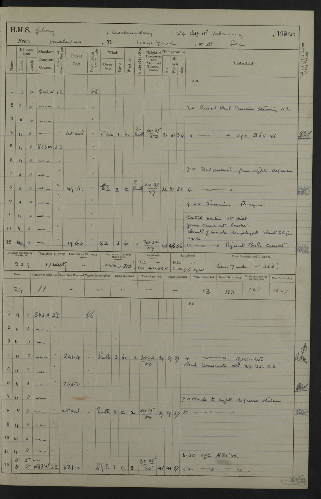 4f73cd06a2fc8ea903001489: (https://s3.amazonaws.com:443/oldweather/ADM53-43011/0072_0.jpg) 17 August 1914 Halifax Lat 44.63, Long -63.55 Number on sick list: 11 6.00am: Commenced coaling from Patent fuel sheds on jetty. 1.30pm: Finished coaling. pm: Washed down upper deck. 4f73cd06a2fc8ea90300148a: (https://s3.amazonaws.com:443/oldweather/ADM53-43011/0072_1.jpg) 18 August 1914 Halifax Lat 44.63, Long -63.55 Number on sick list: 10 4f73cd07a2fc8ea90300148b: (https://s3.amazonaws.com:443/oldweather/ADM53-43011/0073_0.jpg) 19 August 1914 Halifax Lat 44.63, Long -63.55 Number on sick list: 7 5.05am: Slipped from jetty and proceeded as requisite to anchorage in stream. 5.45am: Stopped. Let go Port anchor. am: Preparing for coaling. 9.00am: Collier Brinkwood made fast alongside (Starboard side). 10.10am: Commenced coaling. 9.40pm: Finished coaling. Received 1080 tons. 4f73cd07a2fc8ea90300148c: (https://s3.amazonaws.com:443/oldweather/ADM53-43011/0073_1.jpg) 20 August 1914 Halifax Lat 44.63, Long -63.55 Number on sick list: 7 am: Employed unrigging collier and gear etc. 7.15am: Collier left ship. 5.15pm: Hands to bathe. 4f73cd07a2fc8ea90300148d: (https://s3.amazonaws.com:443/oldweather/ADM53-43011/0074_0.jpg) 21 August 1914 Halifax Lat 44.63, Long -63.55 Number on sick list: 7 pm: Testing gun sights. 8.30pm: Exercised darken ship. 9.15pm: Opened deadlights etc. 4f73cd07a2fc8ea90300148e: (https://s3.amazonaws.com:443/oldweather/ADM53-43011/0074_1.jpg) 22 August 1914 Halifax Lat 44.63, Long -63.55 Number on sick list: 8 am: Aired night clothing. pm: Employed disembarking spare torpedo booms and other gear. pm: Tested lifebuoys. Found correct. 4f73cd08a2fc8ea90300148f: (https://s3.amazonaws.com:443/oldweather/ADM53-43011/0075_0.jpg) 23 August 1914 Halifax and at Sea Lat 44.63, Long -63.55 Number on sick list: 7 10.00am: Held Divine Service on board. am: Preparing for sea. 11.45am: Weighed and proceeded as requisite out of harbour. 12.50pm: Entered War Channel. 3.20pm: a/c S59ºW for rendezvous. 7.25pm: Observed HMS Suffolk 1 pt on starboard bow. HMS Suffolk was a Kent class armoured cruiser, launched at Portsmouth Dockyard in 1903, and sold in 1920. Details at http://en.wikipedia.org/wiki/HMS_Suffolk_(1903) . 8.00pm: Stopped at rendezvous. Communicated by boat with Suffolk. 9.30pm: Fog shut down. 9.00pm: Hands to night defence stations. 9.30pm: Fog shut down.9.45pm: Proceeded. 10.50pm: Fog cleared. 4f73cd08a2fc8ea903001490: (https://s3.amazonaws.com:443/oldweather/ADM53-43011/0075_1.jpg) 24 August 1914 At sea, Halifax to New York Lat 41.9, Long -66.4 Number on sick list: 9 5.30am: Dispersed from night defence. 10.20am: a/c to speak merchant steamer bearing WNW (SS Hurley of Montreal). 10.40am: a/c south. Stopped. Dropped target. 11.00am: Carried out aiming rifle practice. 12.10pm: Stopped. 1.20pm: Dropped second target. Carried out aiming rifle and sub calibre practice. 2.50pm: Fog shut down. pm: Hands at night defence stations. 10.45pm: Fog clearing. 4f73cd08a2fc8ea903001491: (https://s3.amazonaws.com:443/oldweather/ADM53-43011/0076_0.jpg) 25 August 1914 Patrolling off New York Lat 40.6, Long -70.0 Number on sick list: 8 5.40am: Dispersed from night defence. 6.10am: Observed sail N30ºW/ a/c N30ºW. Reduced to 60 revs. 6.50am: Resumed course. Abeam sail (Alicia B. Crosby). 9.36am: Sighted Nantucket Light N65ºW. 10.15am: Met Mason Lines Antilles. 10.25am: Nantucket Light Vessel abeam, 1.2 miles. 6.00pm: Sighted cruiser ahead. 6.10pm: Action. 6.25pm: Dispersed. 6.40pm: Stopped and signalled HMS Essex. HMS Essex was an armoured cruiser of the Kent class, launched in 1901 at Pembroke Dockyard and sold in 1921. Details at http://en.wikipedia.org/wiki/HMS_Essex_(1901) . 7.00pm: Proceeded as requisite. 7.25pm: Sighted steamer. a/c N60ºW, 60 revs. 7.35pm: Turned to east in company with SS Uranium. 8.00pm: Hands to night defence. 8.05pm: Stopped. Communicated by boat with Uranium. 9.23pm: Proceeded, course as requisite to northward to investigate searchlights. pm: Connected conning tower steaming gear. 4f73cd08a2fc8ea903001492: (https://s3.amazonaws.com:443/oldweather/ADM53-43011/0076_1.jpg) 26 August 1914 Patrolling off New York Lat 40.4, Long -73.6 Number on sick list: 11 5.16am: Fire Island Light abeam 7 miles. 7.00am: a/c N49ºW on sighting steamer to north. 8.25am: Sighted Ambrose Light Vessel. 1.00pm: Courses as requisite investigating shipping off Ambrose Light Vessel and Waveside. 2.15pm: Stopped, communicated by boat with SS Van der Duyn. 2.55pm: Proceeded as requisite. 5.26pm: In company with steamers New York and Commanchee. 6.17pm: Connected up fore bridge steering gear. 7.12pm: a/c to south to close steamer (St Louis). 7.25pm: Resumed course. 9.00pm: Hands to night defence. 4f73cd09a2fc8ea903001493: (https://s3.amazonaws.com:443/oldweather/ADM53-43011/0077_0.jpg) 27 August 1914 Patrolling off New York Lat 40.5, Long -72.3 Number on sick list: 10 5.45pm: Dispersed from night defence. 7.12am: a/c as requisite to close merchantman (Wilson Line Francisco). 7.55am: Resumed course. 9.55am: a/c to close Norwegian ship. 10.10am: Stopped, communicated with her by boat (SS Bjornstjerne Bjornsen). 10.50am: Proceeded N30ºE to close Circadian. 3.55pm: Fire Island Light Vessel abeam 2¾ miles. 4.12pm: Reduced to 36 revs. Passed SS Baltic. 5.35pm: Connected up conning tower steering gear. 6.40pm: Ambrose Light Vessel N33ºW, 7 miles. 7.00pm: Connected up fore bridge steering gear. 9.00pm: Hands to night defence stations. 4f73cd09a2fc8ea903001494: (https://s3.amazonaws.com:443/oldweather/ADM53-43011/0077_1.jpg) 28 August 1914 At sea, New York to Boston Lat 40.2, Long -70.8 Number on sick list: 9 5.45am: Dispersed from night defence. 8.40am: Sighted steamer (SS Ran) bearing S50ºE. 9.10am: Resumed course. am: Divisional drills. Preparing for target practice. 10.45am: Sighted steamer bearing N55ºE. 11.32am: Resumed course (SS Skjorldborg). 1.25pm: Stopped. Dropped target. 1.29pm: Proceeded, course as requi