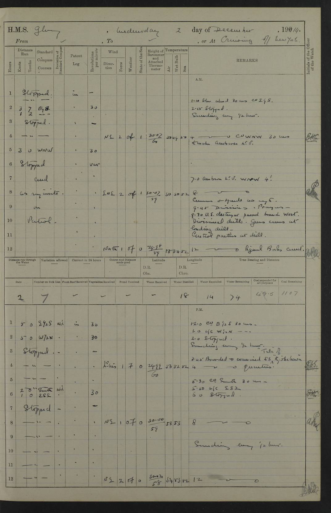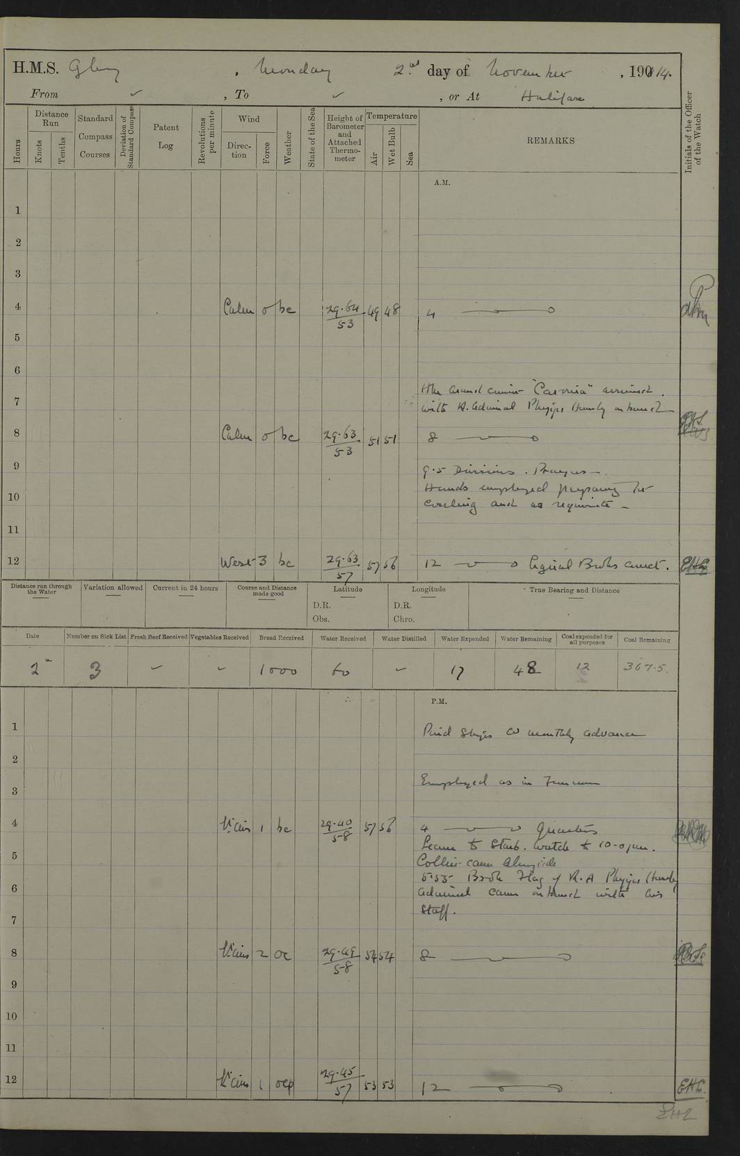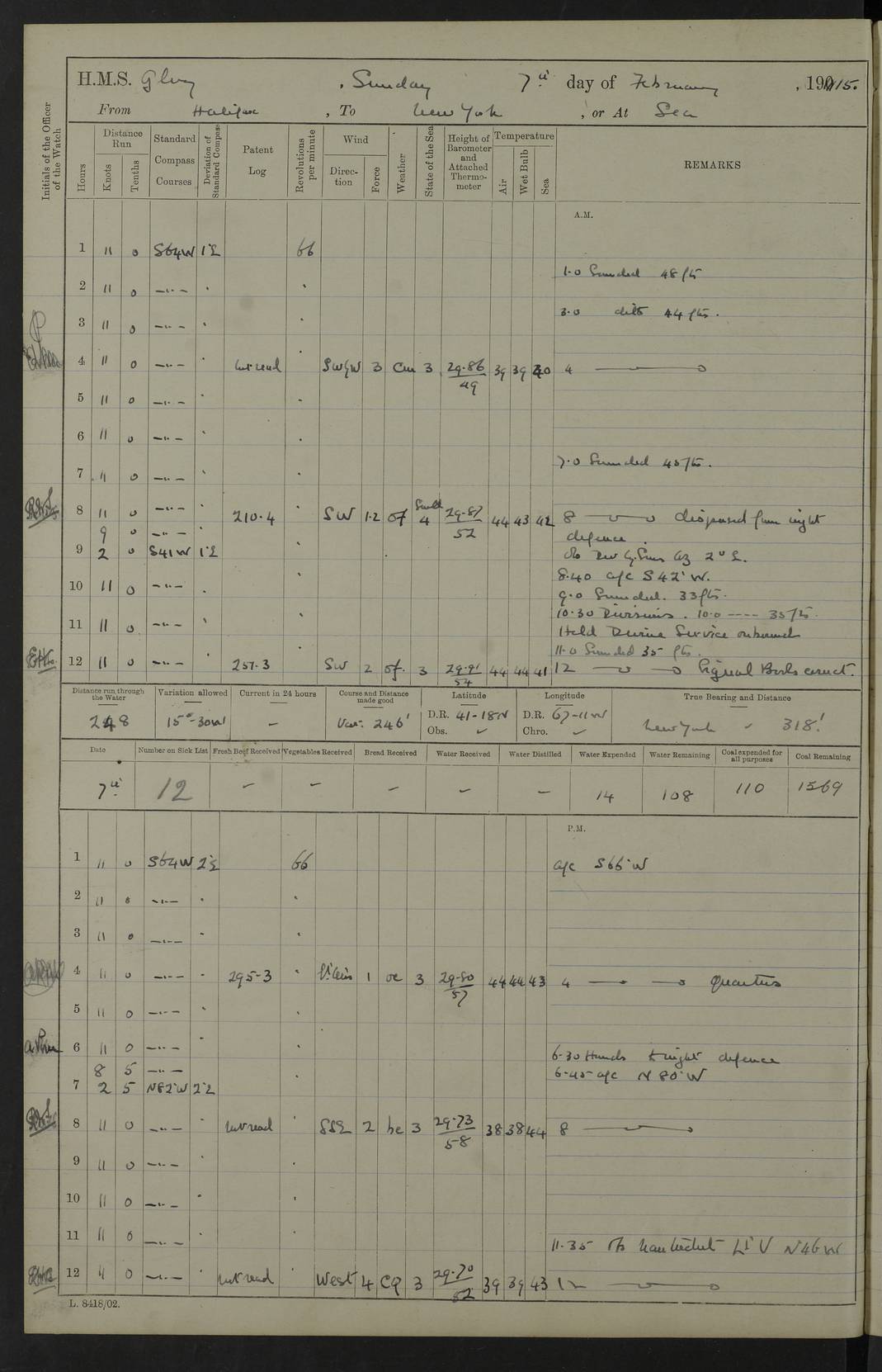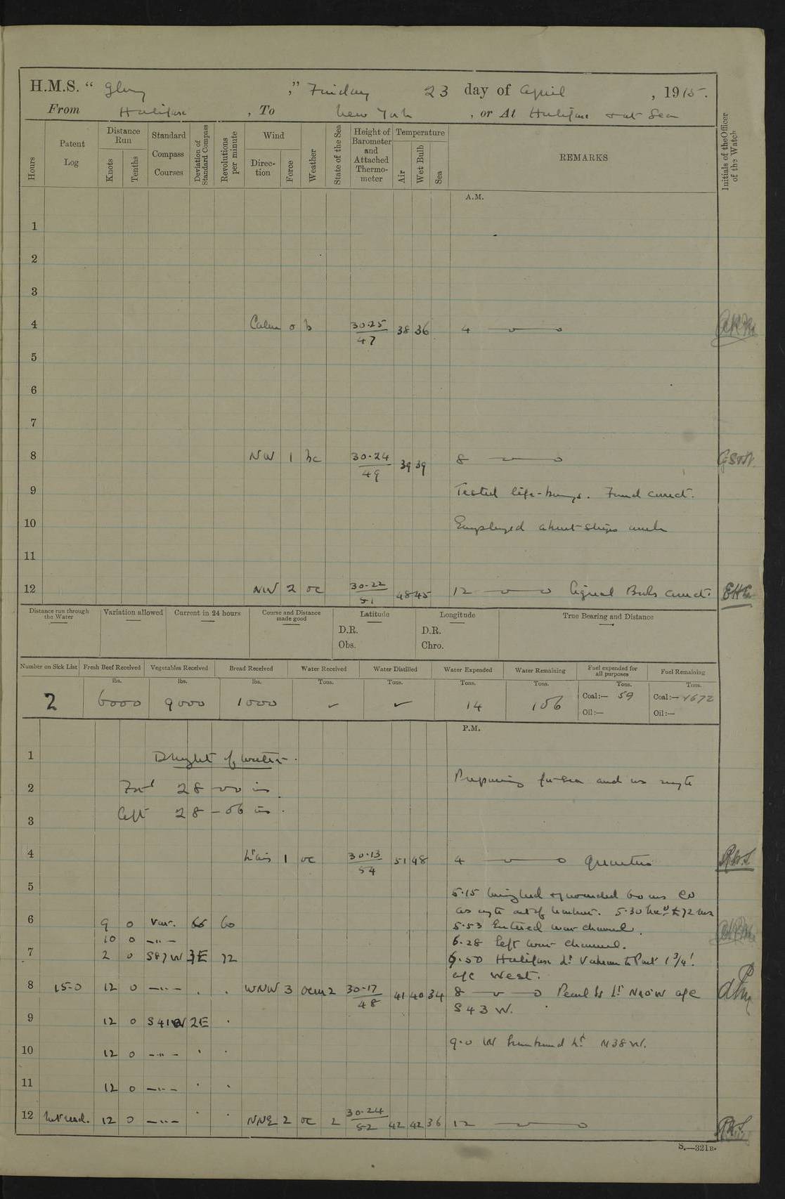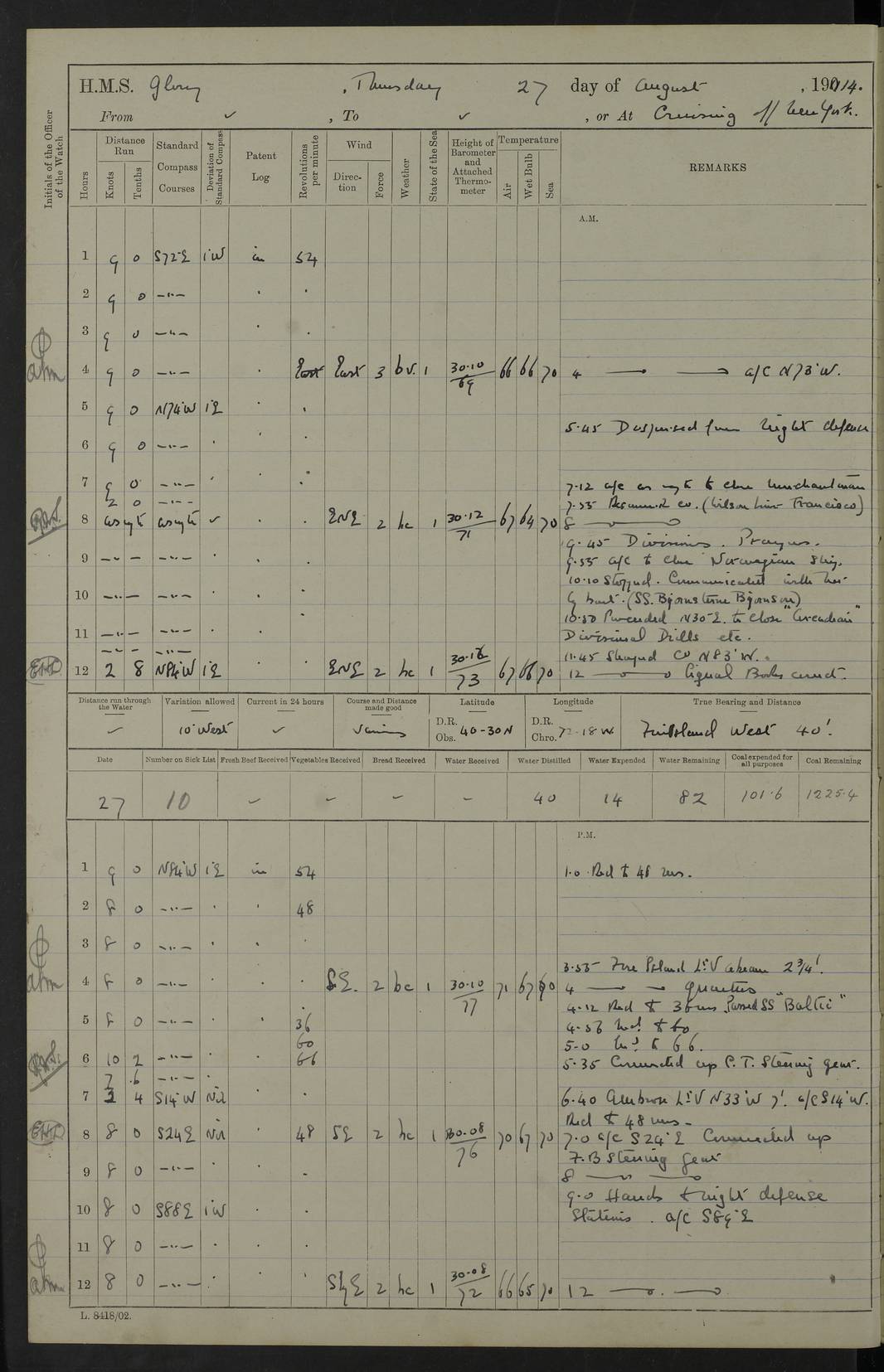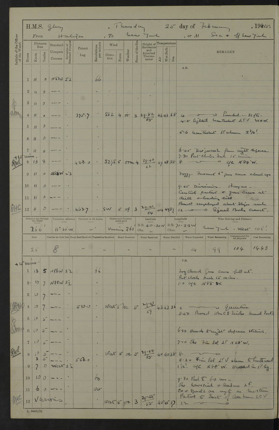 4f73cd06a2fc8ea903001489: (https://s3.amazonaws.com:443/oldweather/ADM53-43011/0072_0.jpg) 17 August 1914 Halifax Lat 44.63, Long -63.55 Number on sick list: 11 6.00am: Commenced coaling from Patent fuel sheds on jetty. 1.30pm: Finished coaling. pm: Washed down upper deck. 4f73cd06a2fc8ea90300148a: (https://s3.amazonaws.com:443/oldweather/ADM53-43011/0072_1.jpg) 18 August 1914 Halifax Lat 44.63, Long -63.55 Number on sick list: 10 4f73cd07a2fc8ea90300148b: (https://s3.amazonaws.com:443/oldweather/ADM53-43011/0073_0.jpg) 19 August 1914 Halifax Lat 44.63, Long -63.55 Number on sick list: 7 5.05am: Slipped from jetty and proceeded as requisite to anchorage in stream. 5.45am: Stopped. Let go Port anchor. am: Preparing for coaling. 9.00am: Collier Brinkwood made fast alongside (Starboard side). 10.10am: Commenced coaling. 9.40pm: Finished coaling. Received 1080 tons. 4f73cd07a2fc8ea90300148c: (https://s3.amazonaws.com:443/oldweather/ADM53-43011/0073_1.jpg) 20 August 1914 Halifax Lat 44.63, Long -63.55 Number on sick list: 7 am: Employed unrigging collier and gear etc. 7.15am: Collier left ship. 5.15pm: Hands to bathe. 4f73cd07a2fc8ea90300148d: (https://s3.amazonaws.com:443/oldweather/ADM53-43011/0074_0.jpg) 21 August 1914 Halifax Lat 44.63, Long -63.55 Number on sick list: 7 pm: Testing gun sights. 8.30pm: Exercised darken ship. 9.15pm: Opened deadlights etc. 4f73cd07a2fc8ea90300148e: (https://s3.amazonaws.com:443/oldweather/ADM53-43011/0074_1.jpg) 22 August 1914 Halifax Lat 44.63, Long -63.55 Number on sick list: 8 am: Aired night clothing. pm: Employed disembarking spare torpedo booms and other gear. pm: Tested lifebuoys. Found correct. 4f73cd08a2fc8ea90300148f: (https://s3.amazonaws.com:443/oldweather/ADM53-43011/0075_0.jpg) 23 August 1914 Halifax and at Sea Lat 44.63, Long -63.55 Number on sick list: 7 10.00am: Held Divine Service on board. am: Preparing for sea. 11.45am: Weighed and proceeded as requisite out of harbour. 12.50pm: Entered War Channel. 3.20pm: a/c S59ºW for rendezvous. 7.25pm: Observed HMS Suffolk 1 pt on starboard bow. HMS Suffolk was a Kent class armoured cruiser, launched at Portsmouth Dockyard in 1903, and sold in 1920. Details at http://en.wikipedia.org/wiki/HMS_Suffolk_(1903) . 8.00pm: Stopped at rendezvous. Communicated by boat with Suffolk. 9.30pm: Fog shut down. 9.00pm: Hands to night defence stations. 9.30pm: Fog shut down.9.45pm: Proceeded. 10.50pm: Fog cleared. 4f73cd08a2fc8ea903001490: (https://s3.amazonaws.com:443/oldweather/ADM53-43011/0075_1.jpg) 24 August 1914 At sea, Halifax to New York Lat 41.9, Long -66.4 Number on sick list: 9 5.30am: Dispersed from night defence. 10.20am: a/c to speak merchant steamer bearing WNW (SS Hurley of Montreal). 10.40am: a/c south. Stopped. Dropped target. 11.00am: Carried out aiming rifle practice. 12.10pm: Stopped. 1.20pm: Dropped second target. Carried out aiming rifle and sub calibre practice. 2.50pm: Fog shut down. pm: Hands at night defence stations. 10.45pm: Fog clearing. 4f73cd08a2fc8ea903001491: (https://s3.amazonaws.com:443/oldweather/ADM53-43011/0076_0.jpg) 25 August 1914 Patrolling off New York Lat 40.6, Long -70.0 Number on sick list: 8 5.40am: Dispersed from night defence. 6.10am: Observed sail N30ºW/ a/c N30ºW. Reduced to 60 revs. 6.50am: Resumed course. Abeam sail (Alicia B. Crosby). 9.36am: Sighted Nantucket Light N65ºW. 10.15am: Met Mason Lines Antilles. 10.25am: Nantucket Light Vessel abeam, 1.2 miles. 6.00pm: Sighted cruiser ahead. 6.10pm: Action. 6.25pm: Dispersed. 6.40pm: Stopped and signalled HMS Essex. HMS Essex was an armoured cruiser of the Kent class, launched in 1901 at Pembroke Dockyard and sold in 1921. Details at http://en.wikipedia.org/wiki/HMS_Essex_(1901) . 7.00pm: Proceeded as requisite. 7.25pm: Sighted steamer. a/c N60ºW, 60 revs. 7.35pm: Turned to east in company with SS Uranium. 8.00pm: Hands to night defence. 8.05pm: Stopped. Communicated by boat with Uranium. 9.23pm: Proceeded, course as requisite to northward to investigate searchlights. pm: Connected conning tower steaming gear. 4f73cd08a2fc8ea903001492: (https://s3.amazonaws.com:443/oldweather/ADM53-43011/0076_1.jpg) 26 August 1914 Patrolling off New York Lat 40.4, Long -73.6 Number on sick list: 11 5.16am: Fire Island Light abeam 7 miles. 7.00am: a/c N49ºW on sighting steamer to north. 8.25am: Sighted Ambrose Light Vessel. 1.00pm: Courses as requisite investigating shipping off Ambrose Light Vessel and Waveside. 2.15pm: Stopped, communicated by boat with SS Van der Duyn. 2.55pm: Proceeded as requisite. 5.26pm: In company with steamers New York and Commanchee. 6.17pm: Connected up fore bridge steering gear. 7.12pm: a/c to south to close steamer (St Louis). 7.25pm: Resumed course. 9.00pm: Hands to night defence. 4f73cd09a2fc8ea903001493: (https://s3.amazonaws.com:443/oldweather/ADM53-43011/0077_0.jpg) 27 August 1914 Patrolling off New York Lat 40.5, Long -72.3 Number on sick list: 10 5.45pm: Dispersed from night defence. 7.12am: a/c as requisite to close merchantman (Wilson Line Francisco). 7.55am: Resumed course. 9.55am: a/c to close Norwegian ship. 10.10am: Stopped, communicated with her by boat (SS Bjornstjerne Bjornsen). 10.50am: Proceeded N30ºE to close Circadian. 3.55pm: Fire Island Light Vessel abeam 2¾ miles. 4.12pm: Reduced to 36 revs. Passed SS Baltic. 5.35pm: Connected up conning tower steering gear. 6.40pm: Ambrose Light Vessel N33ºW, 7 miles. 7.00pm: Connected up fore bridge steering gear. 9.00pm: Hands to night defence stations. 4f73cd09a2fc8ea903001494: (https://s3.amazonaws.com:443/oldweather/ADM53-43011/0077_1.jpg) 28 August 1914 At sea, New York to Boston Lat 40.2, Long -70.8 Number on sick list: 9 5.45am: Dispersed from night defence. 8.40am: Sighted steamer (SS Ran) bearing S50ºE. 9.10am: Resumed course. am: Divisional drills. Preparing for target practice. 10.45am: Sighted steamer bearing N55ºE. 11.32am: Resumed course (SS Skjorldborg). 1.25pm: Stopped. Dropped target. 1.29pm: Proceeded, course as requi