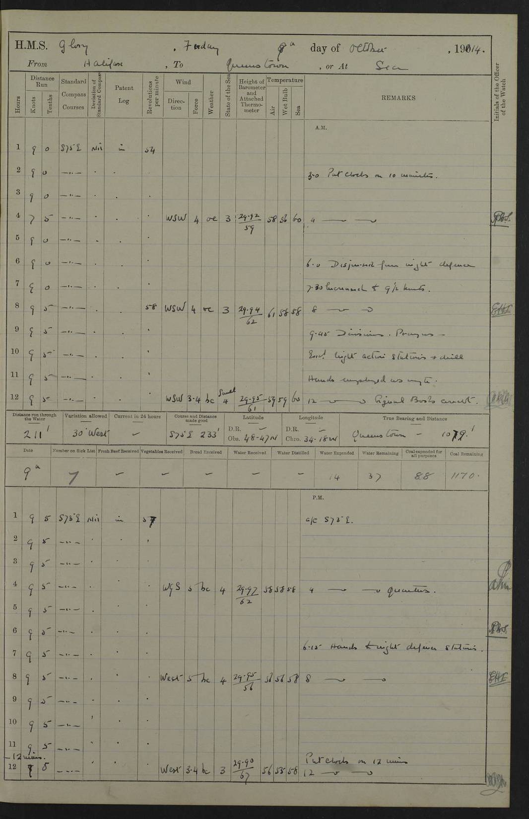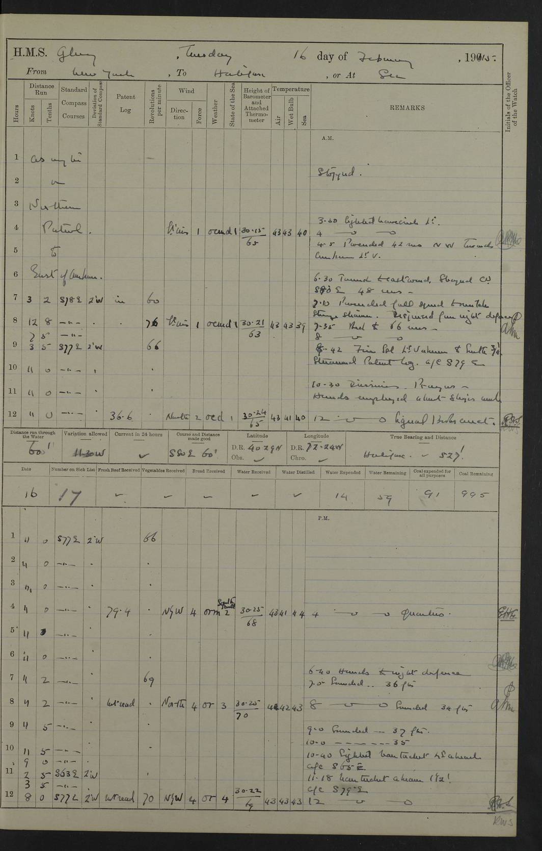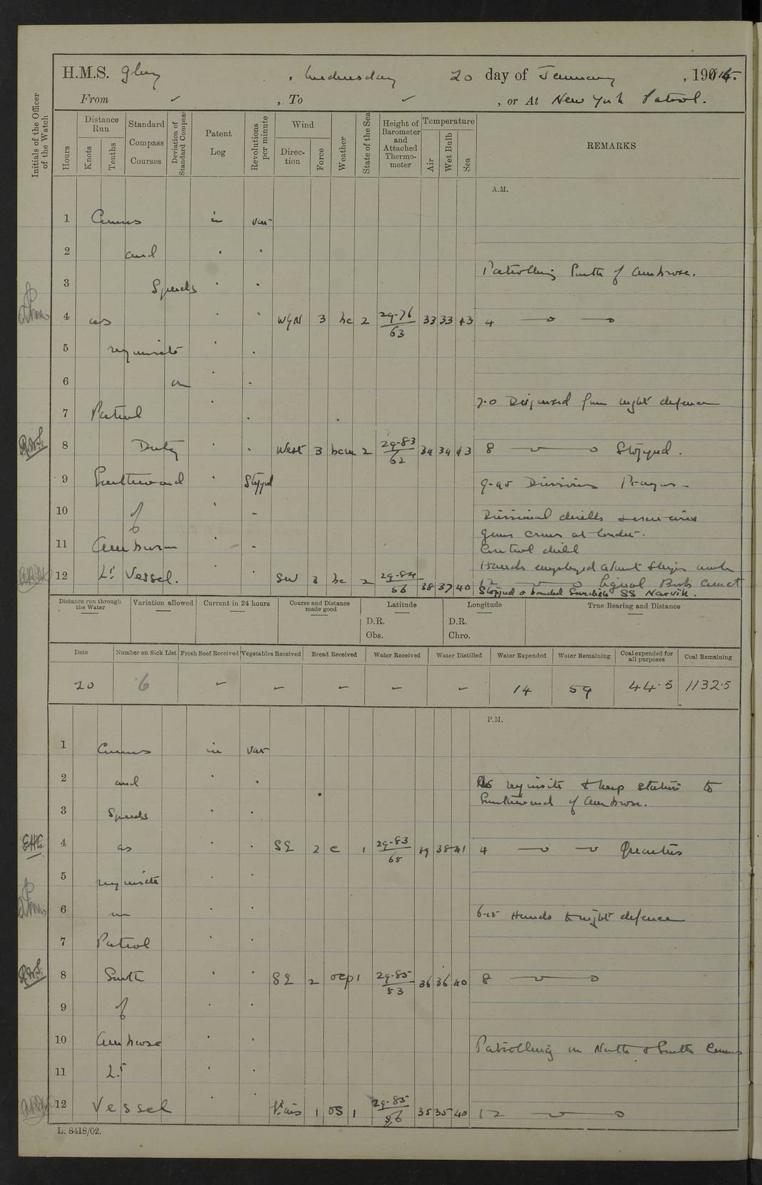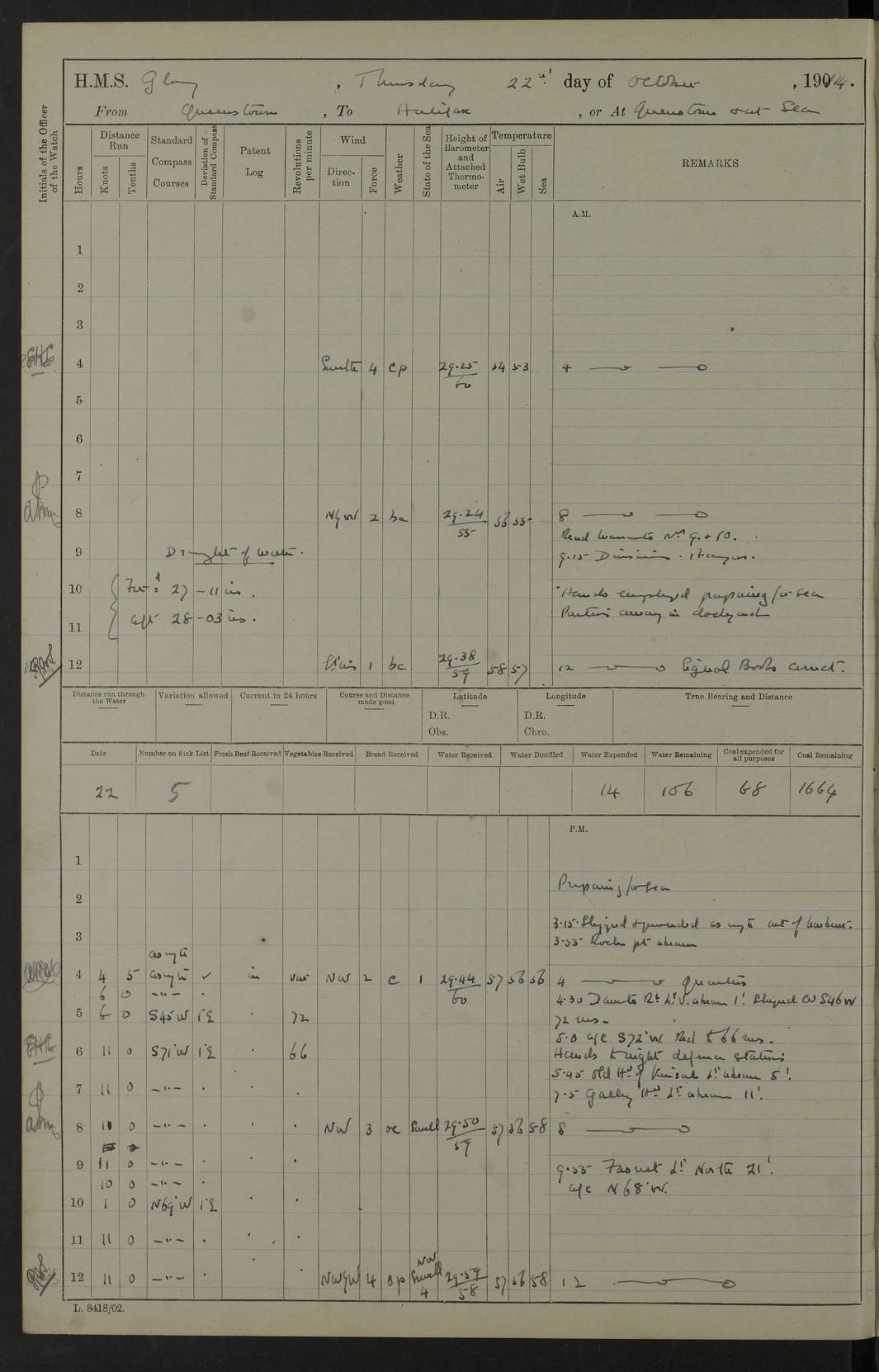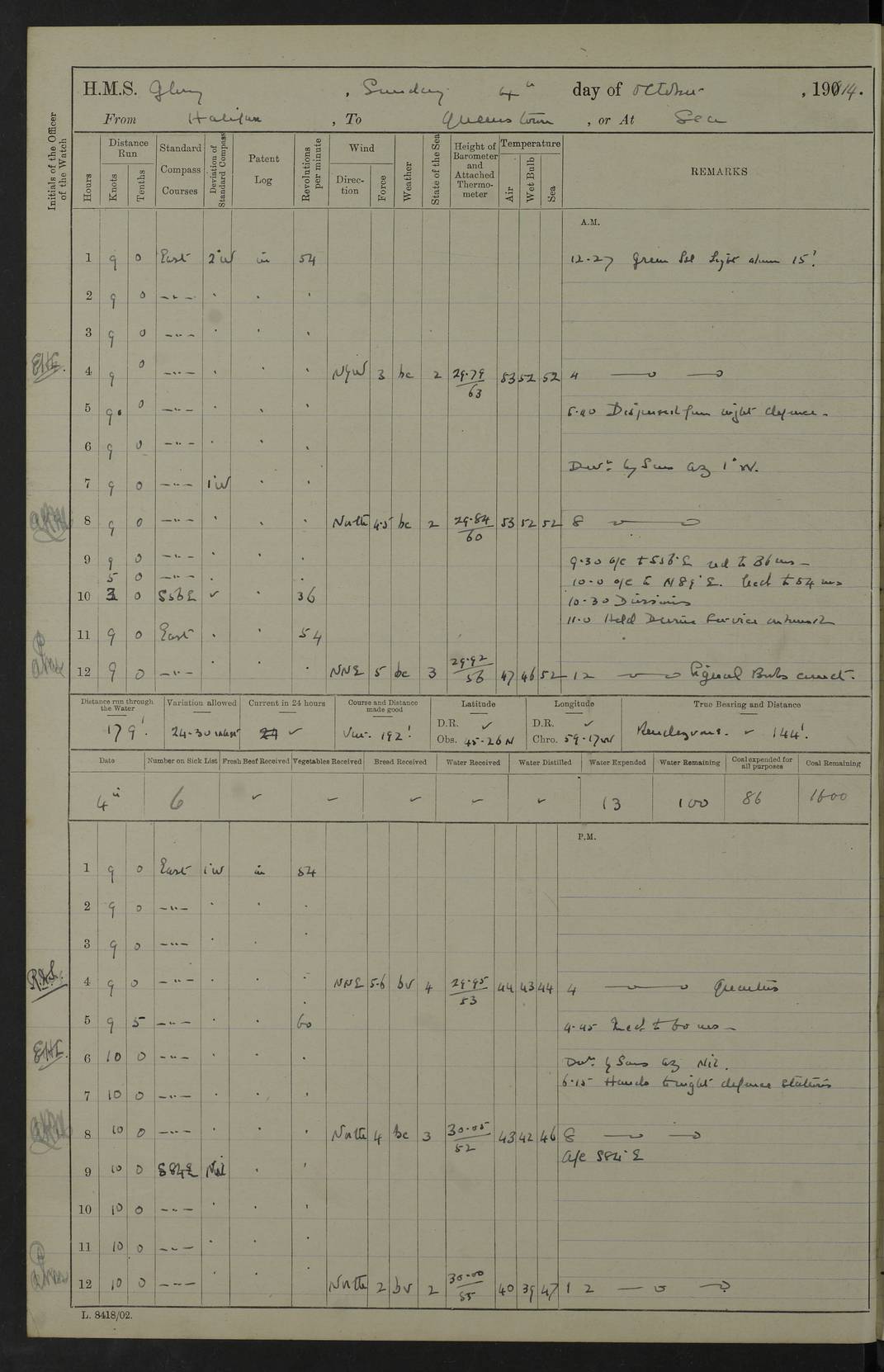 4f73cd06a2fc8ea903001489: (https://s3.amazonaws.com:443/oldweather/ADM53-43011/0072_0.jpg) 17 August 1914 Halifax Lat 44.63, Long -63.55 Number on sick list: 11 6.00am: Commenced coaling from Patent fuel sheds on jetty. 1.30pm: Finished coaling. pm: Washed down upper deck. 4f73cd06a2fc8ea90300148a: (https://s3.amazonaws.com:443/oldweather/ADM53-43011/0072_1.jpg) 18 August 1914 Halifax Lat 44.63, Long -63.55 Number on sick list: 10 4f73cd07a2fc8ea90300148b: (https://s3.amazonaws.com:443/oldweather/ADM53-43011/0073_0.jpg) 19 August 1914 Halifax Lat 44.63, Long -63.55 Number on sick list: 7 5.05am: Slipped from jetty and proceeded as requisite to anchorage in stream. 5.45am: Stopped. Let go Port anchor. am: Preparing for coaling. 9.00am: Collier Brinkwood made fast alongside (Starboard side). 10.10am: Commenced coaling. 9.40pm: Finished coaling. Received 1080 tons. 4f73cd07a2fc8ea90300148c: (https://s3.amazonaws.com:443/oldweather/ADM53-43011/0073_1.jpg) 20 August 1914 Halifax Lat 44.63, Long -63.55 Number on sick list: 7 am: Employed unrigging collier and gear etc. 7.15am: Collier left ship. 5.15pm: Hands to bathe. 4f73cd07a2fc8ea90300148d: (https://s3.amazonaws.com:443/oldweather/ADM53-43011/0074_0.jpg) 21 August 1914 Halifax Lat 44.63, Long -63.55 Number on sick list: 7 pm: Testing gun sights. 8.30pm: Exercised darken ship. 9.15pm: Opened deadlights etc. 4f73cd07a2fc8ea90300148e: (https://s3.amazonaws.com:443/oldweather/ADM53-43011/0074_1.jpg) 22 August 1914 Halifax Lat 44.63, Long -63.55 Number on sick list: 8 am: Aired night clothing. pm: Employed disembarking spare torpedo booms and other gear. pm: Tested lifebuoys. Found correct. 4f73cd08a2fc8ea90300148f: (https://s3.amazonaws.com:443/oldweather/ADM53-43011/0075_0.jpg) 23 August 1914 Halifax and at Sea Lat 44.63, Long -63.55 Number on sick list: 7 10.00am: Held Divine Service on board. am: Preparing for sea. 11.45am: Weighed and proceeded as requisite out of harbour. 12.50pm: Entered War Channel. 3.20pm: a/c S59ºW for rendezvous. 7.25pm: Observed HMS Suffolk 1 pt on starboard bow. HMS Suffolk was a Kent class armoured cruiser, launched at Portsmouth Dockyard in 1903, and sold in 1920. Details at http://en.wikipedia.org/wiki/HMS_Suffolk_(1903) . 8.00pm: Stopped at rendezvous. Communicated by boat with Suffolk. 9.30pm: Fog shut down. 9.00pm: Hands to night defence stations. 9.30pm: Fog shut down.9.45pm: Proceeded. 10.50pm: Fog cleared. 4f73cd08a2fc8ea903001490: (https://s3.amazonaws.com:443/oldweather/ADM53-43011/0075_1.jpg) 24 August 1914 At sea, Halifax to New York Lat 41.9, Long -66.4 Number on sick list: 9 5.30am: Dispersed from night defence. 10.20am: a/c to speak merchant steamer bearing WNW (SS Hurley of Montreal). 10.40am: a/c south. Stopped. Dropped target. 11.00am: Carried out aiming rifle practice. 12.10pm: Stopped. 1.20pm: Dropped second target. Carried out aiming rifle and sub calibre practice. 2.50pm: Fog shut down. pm: Hands at night defence stations. 10.45pm: Fog clearing. 4f73cd08a2fc8ea903001491: (https://s3.amazonaws.com:443/oldweather/ADM53-43011/0076_0.jpg) 25 August 1914 Patrolling off New York Lat 40.6, Long -70.0 Number on sick list: 8 5.40am: Dispersed from night defence. 6.10am: Observed sail N30ºW/ a/c N30ºW. Reduced to 60 revs. 6.50am: Resumed course. Abeam sail (Alicia B. Crosby). 9.36am: Sighted Nantucket Light N65ºW. 10.15am: Met Mason Lines Antilles. 10.25am: Nantucket Light Vessel abeam, 1.2 miles. 6.00pm: Sighted cruiser ahead. 6.10pm: Action. 6.25pm: Dispersed. 6.40pm: Stopped and signalled HMS Essex. HMS Essex was an armoured cruiser of the Kent class, launched in 1901 at Pembroke Dockyard and sold in 1921. Details at http://en.wikipedia.org/wiki/HMS_Essex_(1901) . 7.00pm: Proceeded as requisite. 7.25pm: Sighted steamer. a/c N60ºW, 60 revs. 7.35pm: Turned to east in company with SS Uranium. 8.00pm: Hands to night defence. 8.05pm: Stopped. Communicated by boat with Uranium. 9.23pm: Proceeded, course as requisite to northward to investigate searchlights. pm: Connected conning tower steaming gear. 4f73cd08a2fc8ea903001492: (https://s3.amazonaws.com:443/oldweather/ADM53-43011/0076_1.jpg) 26 August 1914 Patrolling off New York Lat 40.4, Long -73.6 Number on sick list: 11 5.16am: Fire Island Light abeam 7 miles. 7.00am: a/c N49ºW on sighting steamer to north. 8.25am: Sighted Ambrose Light Vessel. 1.00pm: Courses as requisite investigating shipping off Ambrose Light Vessel and Waveside. 2.15pm: Stopped, communicated by boat with SS Van der Duyn. 2.55pm: Proceeded as requisite. 5.26pm: In company with steamers New York and Commanchee. 6.17pm: Connected up fore bridge steering gear. 7.12pm: a/c to south to close steamer (St Louis). 7.25pm: Resumed course. 9.00pm: Hands to night defence. 4f73cd09a2fc8ea903001493: (https://s3.amazonaws.com:443/oldweather/ADM53-43011/0077_0.jpg) 27 August 1914 Patrolling off New York Lat 40.5, Long -72.3 Number on sick list: 10 5.45pm: Dispersed from night defence. 7.12am: a/c as requisite to close merchantman (Wilson Line Francisco). 7.55am: Resumed course. 9.55am: a/c to close Norwegian ship. 10.10am: Stopped, communicated with her by boat (SS Bjornstjerne Bjornsen). 10.50am: Proceeded N30ºE to close Circadian. 3.55pm: Fire Island Light Vessel abeam 2¾ miles. 4.12pm: Reduced to 36 revs. Passed SS Baltic. 5.35pm: Connected up conning tower steering gear. 6.40pm: Ambrose Light Vessel N33ºW, 7 miles. 7.00pm: Connected up fore bridge steering gear. 9.00pm: Hands to night defence stations. 4f73cd09a2fc8ea903001494: (https://s3.amazonaws.com:443/oldweather/ADM53-43011/0077_1.jpg) 28 August 1914 At sea, New York to Boston Lat 40.2, Long -70.8 Number on sick list: 9 5.45am: Dispersed from night defence. 8.40am: Sighted steamer (SS Ran) bearing S50ºE. 9.10am: Resumed course. am: Divisional drills. Preparing for target practice. 10.45am: Sighted steamer bearing N55ºE. 11.32am: Resumed course (SS Skjorldborg). 1.25pm: Stopped. Dropped target. 1.29pm: Proceeded, course as requi