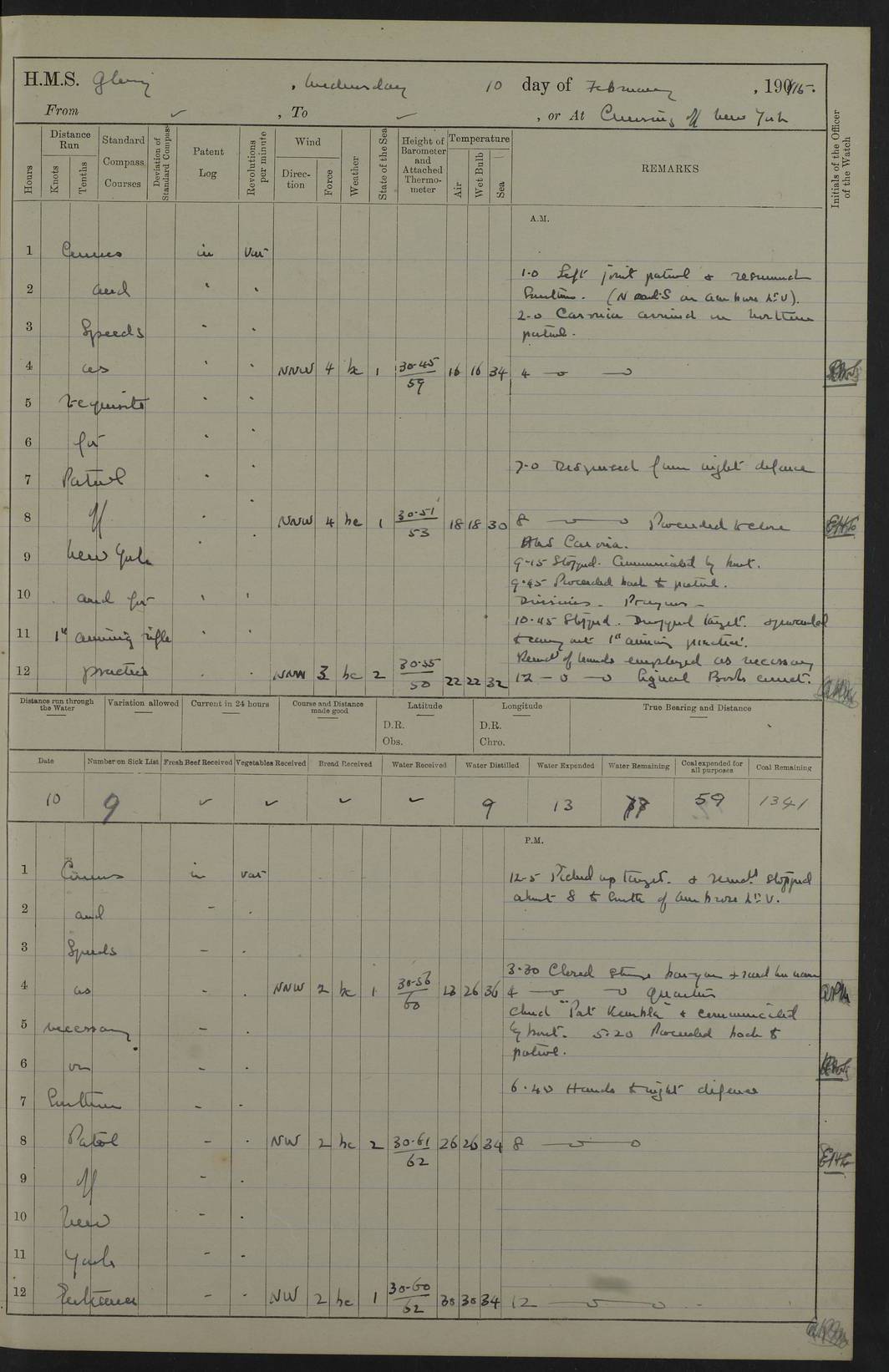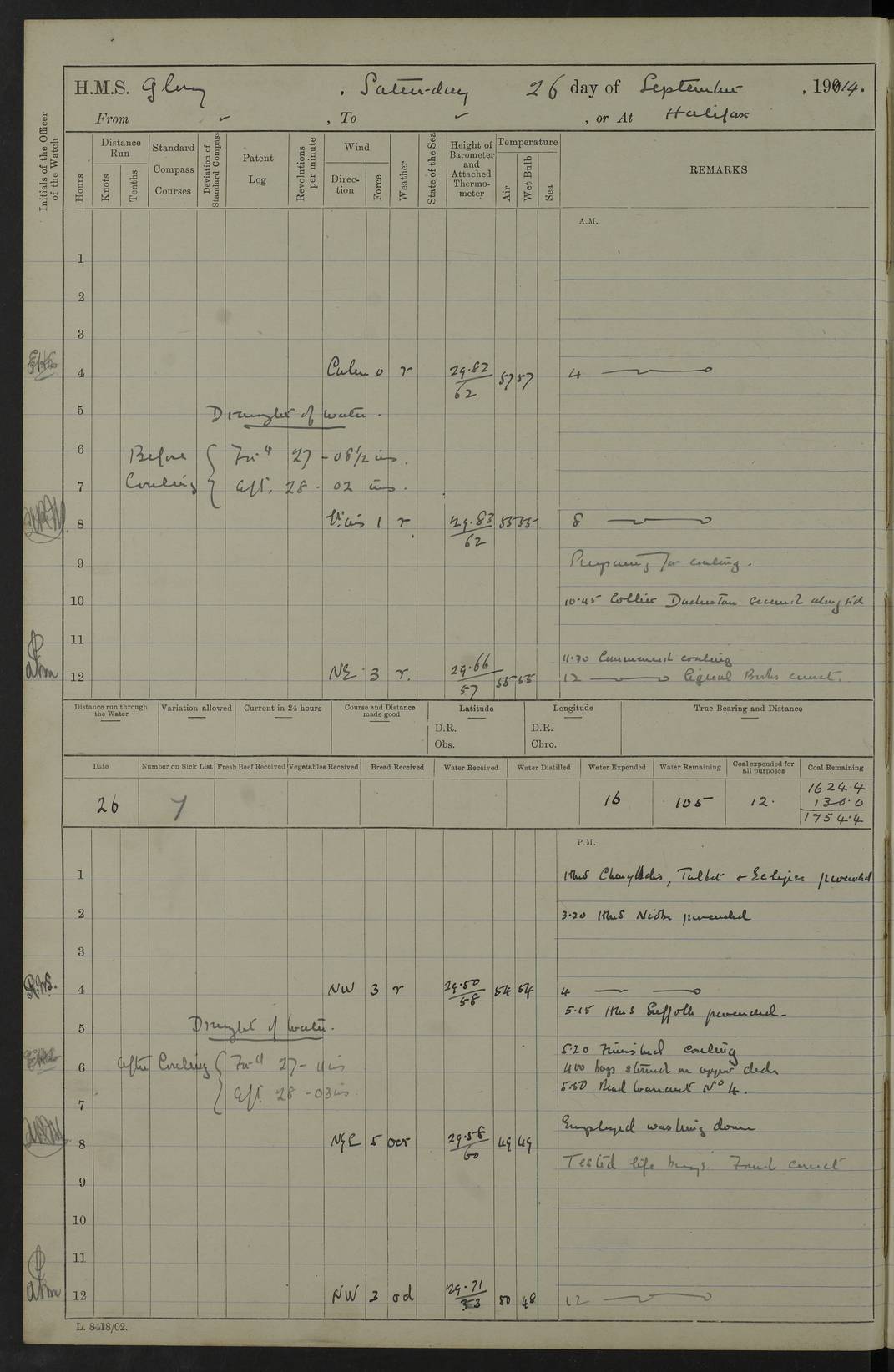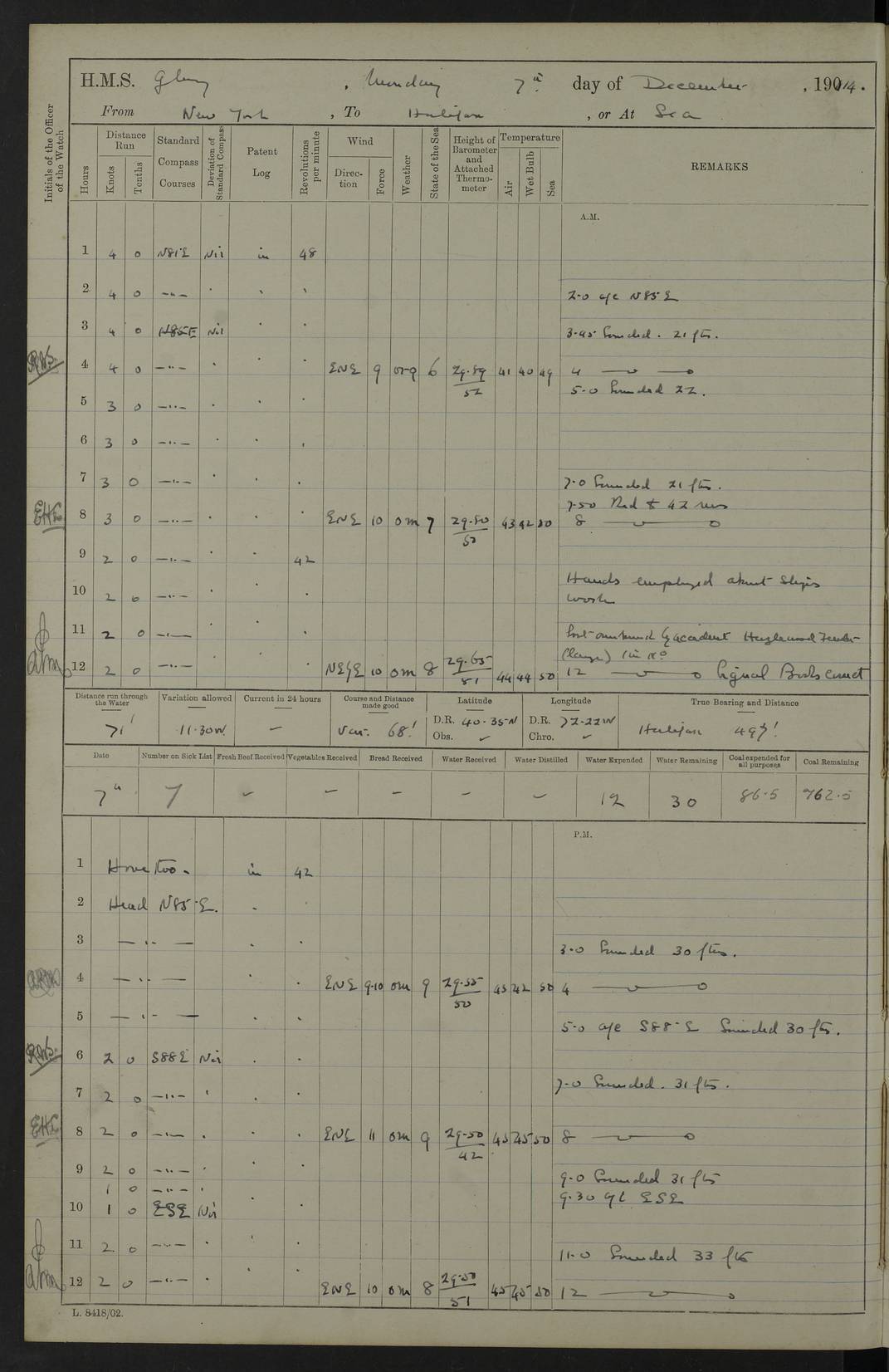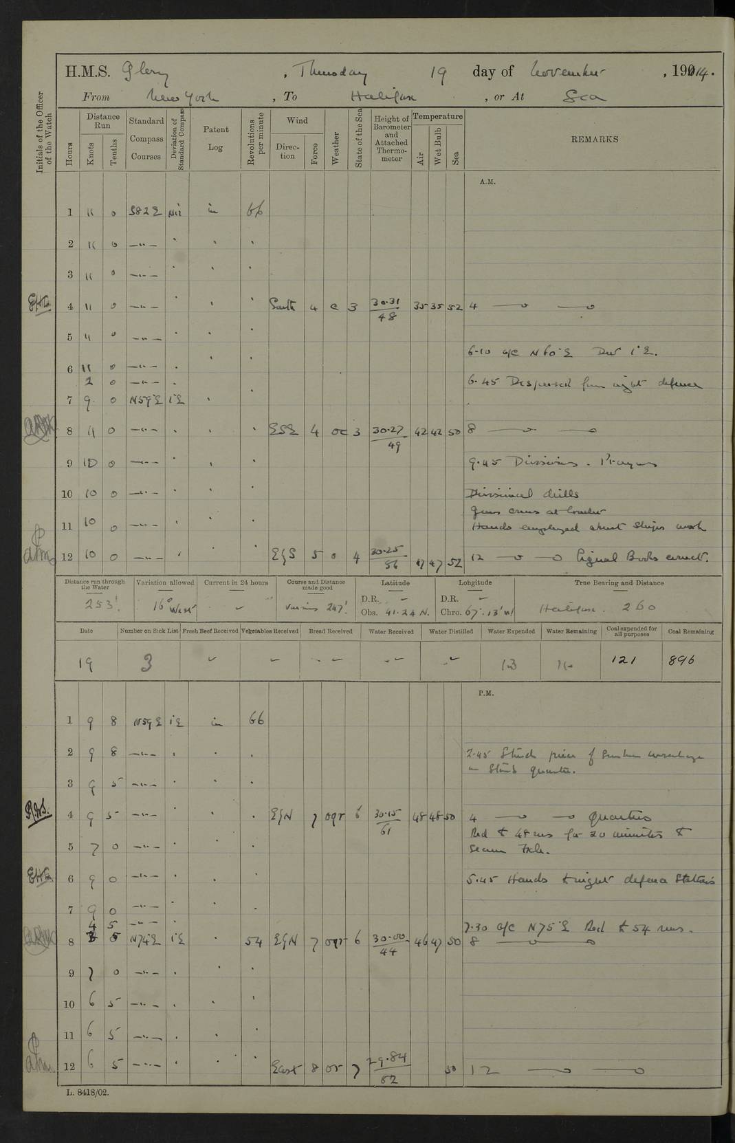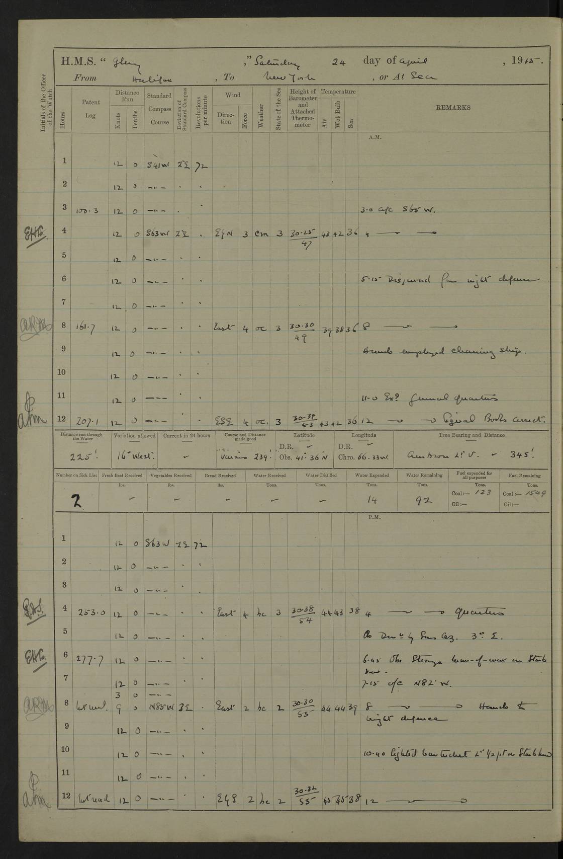 4f73cd06a2fc8ea903001489: (https://s3.amazonaws.com:443/oldweather/ADM53-43011/0072_0.jpg) 17 August 1914 Halifax Lat 44.63, Long -63.55 Number on sick list: 11 6.00am: Commenced coaling from Patent fuel sheds on jetty. 1.30pm: Finished coaling. pm: Washed down upper deck. 4f73cd06a2fc8ea90300148a: (https://s3.amazonaws.com:443/oldweather/ADM53-43011/0072_1.jpg) 18 August 1914 Halifax Lat 44.63, Long -63.55 Number on sick list: 10 4f73cd07a2fc8ea90300148b: (https://s3.amazonaws.com:443/oldweather/ADM53-43011/0073_0.jpg) 19 August 1914 Halifax Lat 44.63, Long -63.55 Number on sick list: 7 5.05am: Slipped from jetty and proceeded as requisite to anchorage in stream. 5.45am: Stopped. Let go Port anchor. am: Preparing for coaling. 9.00am: Collier Brinkwood made fast alongside (Starboard side). 10.10am: Commenced coaling. 9.40pm: Finished coaling. Received 1080 tons. 4f73cd07a2fc8ea90300148c: (https://s3.amazonaws.com:443/oldweather/ADM53-43011/0073_1.jpg) 20 August 1914 Halifax Lat 44.63, Long -63.55 Number on sick list: 7 am: Employed unrigging collier and gear etc. 7.15am: Collier left ship. 5.15pm: Hands to bathe. 4f73cd07a2fc8ea90300148d: (https://s3.amazonaws.com:443/oldweather/ADM53-43011/0074_0.jpg) 21 August 1914 Halifax Lat 44.63, Long -63.55 Number on sick list: 7 pm: Testing gun sights. 8.30pm: Exercised darken ship. 9.15pm: Opened deadlights etc. 4f73cd07a2fc8ea90300148e: (https://s3.amazonaws.com:443/oldweather/ADM53-43011/0074_1.jpg) 22 August 1914 Halifax Lat 44.63, Long -63.55 Number on sick list: 8 am: Aired night clothing. pm: Employed disembarking spare torpedo booms and other gear. pm: Tested lifebuoys. Found correct. 4f73cd08a2fc8ea90300148f: (https://s3.amazonaws.com:443/oldweather/ADM53-43011/0075_0.jpg) 23 August 1914 Halifax and at Sea Lat 44.63, Long -63.55 Number on sick list: 7 10.00am: Held Divine Service on board. am: Preparing for sea. 11.45am: Weighed and proceeded as requisite out of harbour. 12.50pm: Entered War Channel. 3.20pm: a/c S59ºW for rendezvous. 7.25pm: Observed HMS Suffolk 1 pt on starboard bow. HMS Suffolk was a Kent class armoured cruiser, launched at Portsmouth Dockyard in 1903, and sold in 1920. Details at http://en.wikipedia.org/wiki/HMS_Suffolk_(1903) . 8.00pm: Stopped at rendezvous. Communicated by boat with Suffolk. 9.30pm: Fog shut down. 9.00pm: Hands to night defence stations. 9.30pm: Fog shut down.9.45pm: Proceeded. 10.50pm: Fog cleared. 4f73cd08a2fc8ea903001490: (https://s3.amazonaws.com:443/oldweather/ADM53-43011/0075_1.jpg) 24 August 1914 At sea, Halifax to New York Lat 41.9, Long -66.4 Number on sick list: 9 5.30am: Dispersed from night defence. 10.20am: a/c to speak merchant steamer bearing WNW (SS Hurley of Montreal). 10.40am: a/c south. Stopped. Dropped target. 11.00am: Carried out aiming rifle practice. 12.10pm: Stopped. 1.20pm: Dropped second target. Carried out aiming rifle and sub calibre practice. 2.50pm: Fog shut down. pm: Hands at night defence stations. 10.45pm: Fog clearing. 4f73cd08a2fc8ea903001491: (https://s3.amazonaws.com:443/oldweather/ADM53-43011/0076_0.jpg) 25 August 1914 Patrolling off New York Lat 40.6, Long -70.0 Number on sick list: 8 5.40am: Dispersed from night defence. 6.10am: Observed sail N30ºW/ a/c N30ºW. Reduced to 60 revs. 6.50am: Resumed course. Abeam sail (Alicia B. Crosby). 9.36am: Sighted Nantucket Light N65ºW. 10.15am: Met Mason Lines Antilles. 10.25am: Nantucket Light Vessel abeam, 1.2 miles. 6.00pm: Sighted cruiser ahead. 6.10pm: Action. 6.25pm: Dispersed. 6.40pm: Stopped and signalled HMS Essex. HMS Essex was an armoured cruiser of the Kent class, launched in 1901 at Pembroke Dockyard and sold in 1921. Details at http://en.wikipedia.org/wiki/HMS_Essex_(1901) . 7.00pm: Proceeded as requisite. 7.25pm: Sighted steamer. a/c N60ºW, 60 revs. 7.35pm: Turned to east in company with SS Uranium. 8.00pm: Hands to night defence. 8.05pm: Stopped. Communicated by boat with Uranium. 9.23pm: Proceeded, course as requisite to northward to investigate searchlights. pm: Connected conning tower steaming gear. 4f73cd08a2fc8ea903001492: (https://s3.amazonaws.com:443/oldweather/ADM53-43011/0076_1.jpg) 26 August 1914 Patrolling off New York Lat 40.4, Long -73.6 Number on sick list: 11 5.16am: Fire Island Light abeam 7 miles. 7.00am: a/c N49ºW on sighting steamer to north. 8.25am: Sighted Ambrose Light Vessel. 1.00pm: Courses as requisite investigating shipping off Ambrose Light Vessel and Waveside. 2.15pm: Stopped, communicated by boat with SS Van der Duyn. 2.55pm: Proceeded as requisite. 5.26pm: In company with steamers New York and Commanchee. 6.17pm: Connected up fore bridge steering gear. 7.12pm: a/c to south to close steamer (St Louis). 7.25pm: Resumed course. 9.00pm: Hands to night defence. 4f73cd09a2fc8ea903001493: (https://s3.amazonaws.com:443/oldweather/ADM53-43011/0077_0.jpg) 27 August 1914 Patrolling off New York Lat 40.5, Long -72.3 Number on sick list: 10 5.45pm: Dispersed from night defence. 7.12am: a/c as requisite to close merchantman (Wilson Line Francisco). 7.55am: Resumed course. 9.55am: a/c to close Norwegian ship. 10.10am: Stopped, communicated with her by boat (SS Bjornstjerne Bjornsen). 10.50am: Proceeded N30ºE to close Circadian. 3.55pm: Fire Island Light Vessel abeam 2¾ miles. 4.12pm: Reduced to 36 revs. Passed SS Baltic. 5.35pm: Connected up conning tower steering gear. 6.40pm: Ambrose Light Vessel N33ºW, 7 miles. 7.00pm: Connected up fore bridge steering gear. 9.00pm: Hands to night defence stations. 4f73cd09a2fc8ea903001494: (https://s3.amazonaws.com:443/oldweather/ADM53-43011/0077_1.jpg) 28 August 1914 At sea, New York to Boston Lat 40.2, Long -70.8 Number on sick list: 9 5.45am: Dispersed from night defence. 8.40am: Sighted steamer (SS Ran) bearing S50ºE. 9.10am: Resumed course. am: Divisional drills. Preparing for target practice. 10.45am: Sighted steamer bearing N55ºE. 11.32am: Resumed course (SS Skjorldborg). 1.25pm: Stopped. Dropped target. 1.29pm: Proceeded, course as requi