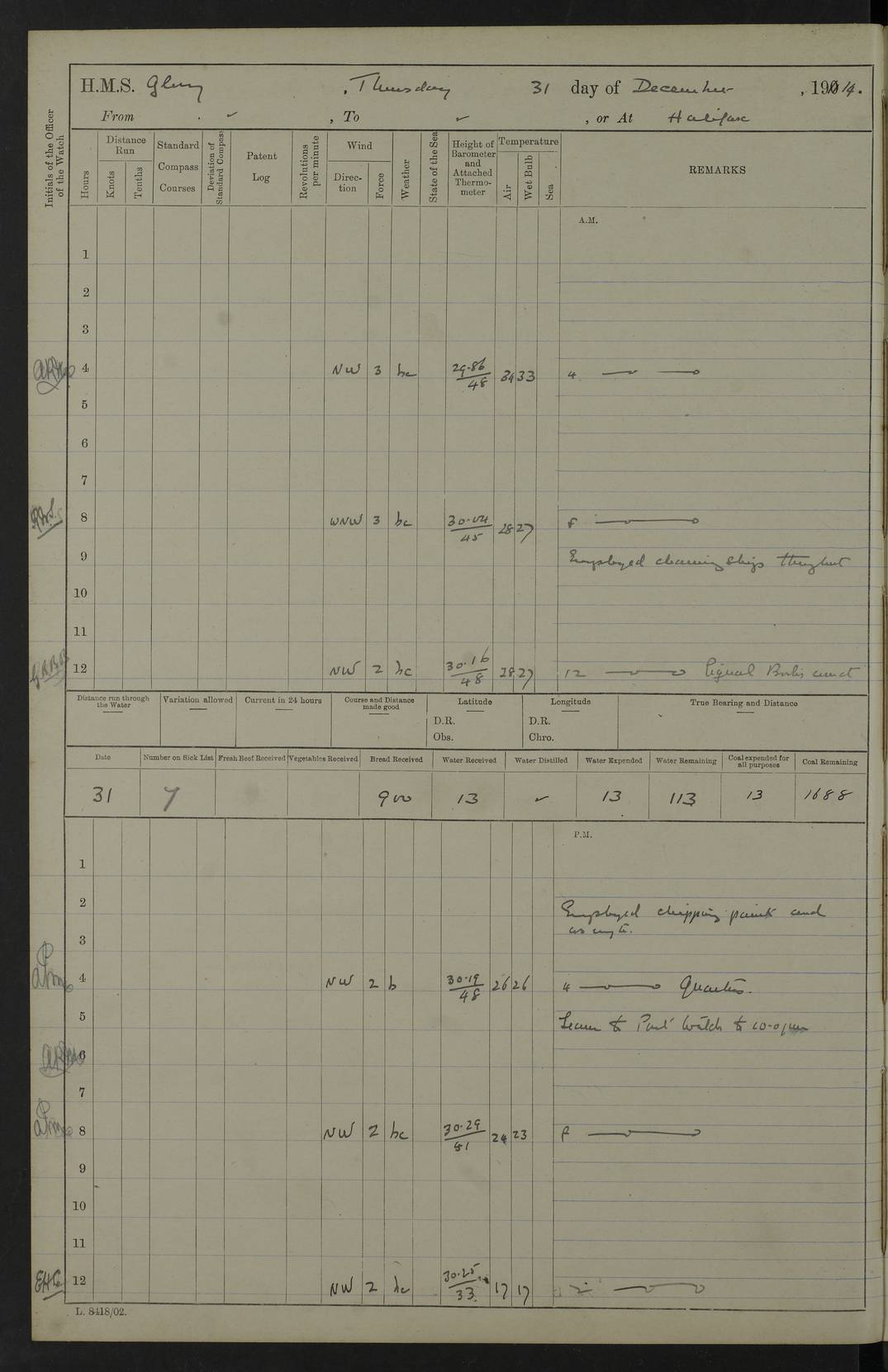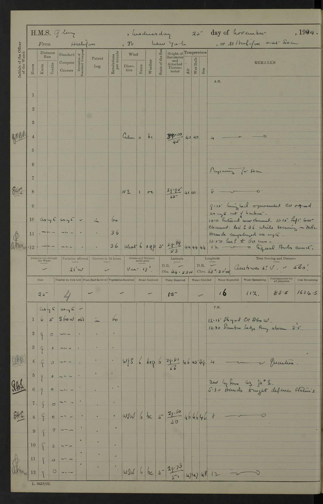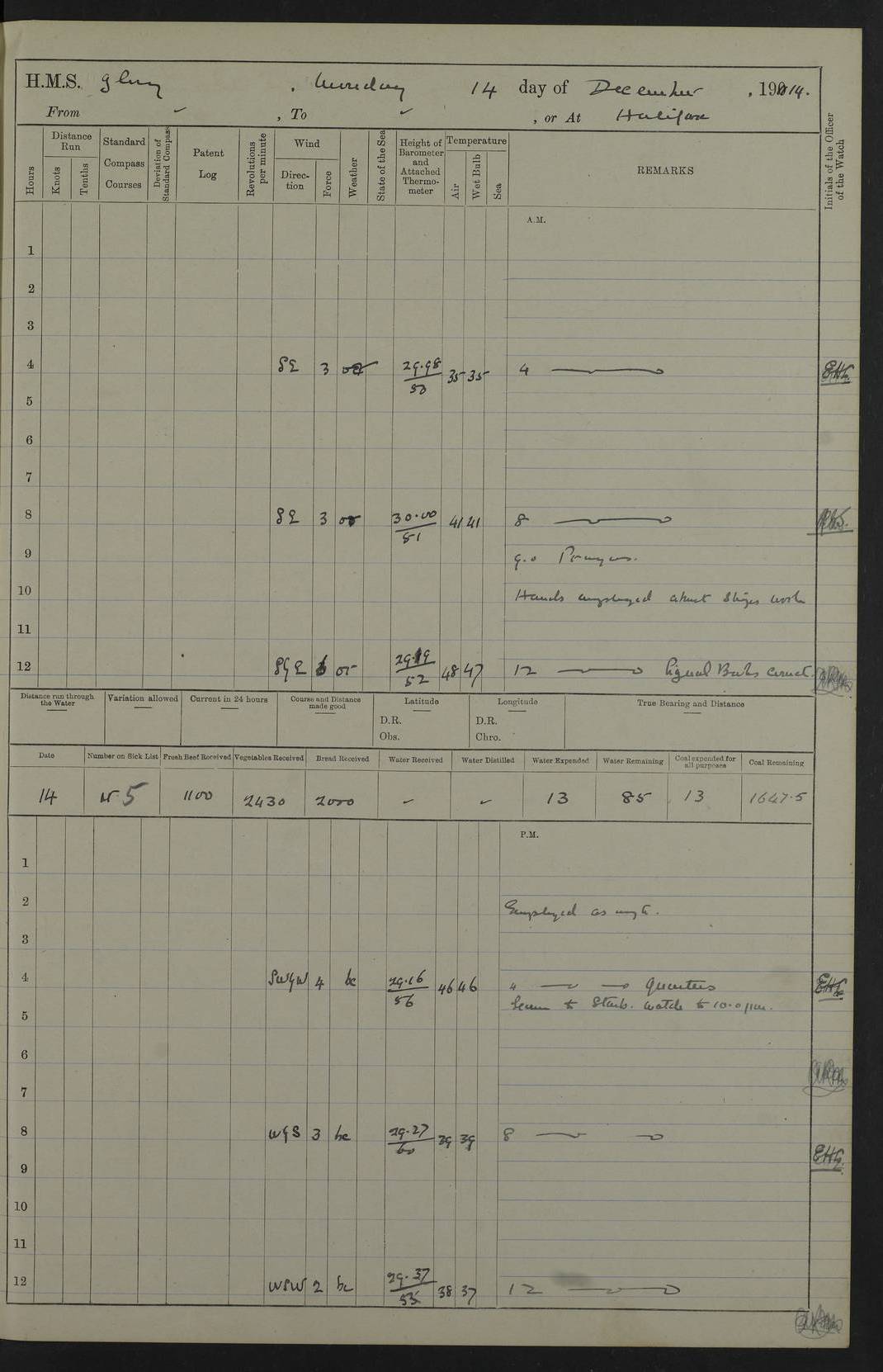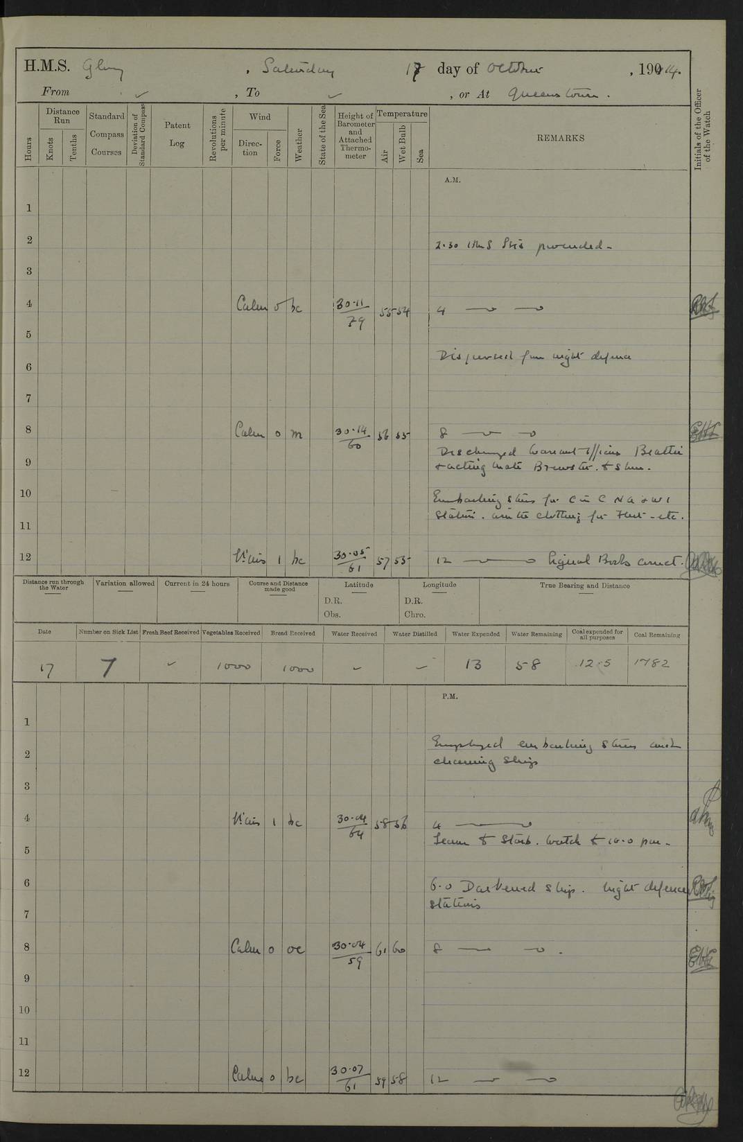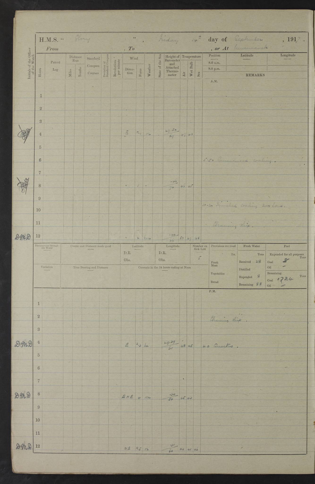 4f73cd06a2fc8ea903001489: (https://s3.amazonaws.com:443/oldweather/ADM53-43011/0072_0.jpg) 17 August 1914 Halifax Lat 44.63, Long -63.55 Number on sick list: 11 6.00am: Commenced coaling from Patent fuel sheds on jetty. 1.30pm: Finished coaling. pm: Washed down upper deck. 4f73cd06a2fc8ea90300148a: (https://s3.amazonaws.com:443/oldweather/ADM53-43011/0072_1.jpg) 18 August 1914 Halifax Lat 44.63, Long -63.55 Number on sick list: 10 4f73cd07a2fc8ea90300148b: (https://s3.amazonaws.com:443/oldweather/ADM53-43011/0073_0.jpg) 19 August 1914 Halifax Lat 44.63, Long -63.55 Number on sick list: 7 5.05am: Slipped from jetty and proceeded as requisite to anchorage in stream. 5.45am: Stopped. Let go Port anchor. am: Preparing for coaling. 9.00am: Collier Brinkwood made fast alongside (Starboard side). 10.10am: Commenced coaling. 9.40pm: Finished coaling. Received 1080 tons. 4f73cd07a2fc8ea90300148c: (https://s3.amazonaws.com:443/oldweather/ADM53-43011/0073_1.jpg) 20 August 1914 Halifax Lat 44.63, Long -63.55 Number on sick list: 7 am: Employed unrigging collier and gear etc. 7.15am: Collier left ship. 5.15pm: Hands to bathe. 4f73cd07a2fc8ea90300148d: (https://s3.amazonaws.com:443/oldweather/ADM53-43011/0074_0.jpg) 21 August 1914 Halifax Lat 44.63, Long -63.55 Number on sick list: 7 pm: Testing gun sights. 8.30pm: Exercised darken ship. 9.15pm: Opened deadlights etc. 4f73cd07a2fc8ea90300148e: (https://s3.amazonaws.com:443/oldweather/ADM53-43011/0074_1.jpg) 22 August 1914 Halifax Lat 44.63, Long -63.55 Number on sick list: 8 am: Aired night clothing. pm: Employed disembarking spare torpedo booms and other gear. pm: Tested lifebuoys. Found correct. 4f73cd08a2fc8ea90300148f: (https://s3.amazonaws.com:443/oldweather/ADM53-43011/0075_0.jpg) 23 August 1914 Halifax and at Sea Lat 44.63, Long -63.55 Number on sick list: 7 10.00am: Held Divine Service on board. am: Preparing for sea. 11.45am: Weighed and proceeded as requisite out of harbour. 12.50pm: Entered War Channel. 3.20pm: a/c S59ºW for rendezvous. 7.25pm: Observed HMS Suffolk 1 pt on starboard bow. HMS Suffolk was a Kent class armoured cruiser, launched at Portsmouth Dockyard in 1903, and sold in 1920. Details at http://en.wikipedia.org/wiki/HMS_Suffolk_(1903) . 8.00pm: Stopped at rendezvous. Communicated by boat with Suffolk. 9.30pm: Fog shut down. 9.00pm: Hands to night defence stations. 9.30pm: Fog shut down.9.45pm: Proceeded. 10.50pm: Fog cleared. 4f73cd08a2fc8ea903001490: (https://s3.amazonaws.com:443/oldweather/ADM53-43011/0075_1.jpg) 24 August 1914 At sea, Halifax to New York Lat 41.9, Long -66.4 Number on sick list: 9 5.30am: Dispersed from night defence. 10.20am: a/c to speak merchant steamer bearing WNW (SS Hurley of Montreal). 10.40am: a/c south. Stopped. Dropped target. 11.00am: Carried out aiming rifle practice. 12.10pm: Stopped. 1.20pm: Dropped second target. Carried out aiming rifle and sub calibre practice. 2.50pm: Fog shut down. pm: Hands at night defence stations. 10.45pm: Fog clearing. 4f73cd08a2fc8ea903001491: (https://s3.amazonaws.com:443/oldweather/ADM53-43011/0076_0.jpg) 25 August 1914 Patrolling off New York Lat 40.6, Long -70.0 Number on sick list: 8 5.40am: Dispersed from night defence. 6.10am: Observed sail N30ºW/ a/c N30ºW. Reduced to 60 revs. 6.50am: Resumed course. Abeam sail (Alicia B. Crosby). 9.36am: Sighted Nantucket Light N65ºW. 10.15am: Met Mason Lines Antilles. 10.25am: Nantucket Light Vessel abeam, 1.2 miles. 6.00pm: Sighted cruiser ahead. 6.10pm: Action. 6.25pm: Dispersed. 6.40pm: Stopped and signalled HMS Essex. HMS Essex was an armoured cruiser of the Kent class, launched in 1901 at Pembroke Dockyard and sold in 1921. Details at http://en.wikipedia.org/wiki/HMS_Essex_(1901) . 7.00pm: Proceeded as requisite. 7.25pm: Sighted steamer. a/c N60ºW, 60 revs. 7.35pm: Turned to east in company with SS Uranium. 8.00pm: Hands to night defence. 8.05pm: Stopped. Communicated by boat with Uranium. 9.23pm: Proceeded, course as requisite to northward to investigate searchlights. pm: Connected conning tower steaming gear. 4f73cd08a2fc8ea903001492: (https://s3.amazonaws.com:443/oldweather/ADM53-43011/0076_1.jpg) 26 August 1914 Patrolling off New York Lat 40.4, Long -73.6 Number on sick list: 11 5.16am: Fire Island Light abeam 7 miles. 7.00am: a/c N49ºW on sighting steamer to north. 8.25am: Sighted Ambrose Light Vessel. 1.00pm: Courses as requisite investigating shipping off Ambrose Light Vessel and Waveside. 2.15pm: Stopped, communicated by boat with SS Van der Duyn. 2.55pm: Proceeded as requisite. 5.26pm: In company with steamers New York and Commanchee. 6.17pm: Connected up fore bridge steering gear. 7.12pm: a/c to south to close steamer (St Louis). 7.25pm: Resumed course. 9.00pm: Hands to night defence. 4f73cd09a2fc8ea903001493: (https://s3.amazonaws.com:443/oldweather/ADM53-43011/0077_0.jpg) 27 August 1914 Patrolling off New York Lat 40.5, Long -72.3 Number on sick list: 10 5.45pm: Dispersed from night defence. 7.12am: a/c as requisite to close merchantman (Wilson Line Francisco). 7.55am: Resumed course. 9.55am: a/c to close Norwegian ship. 10.10am: Stopped, communicated with her by boat (SS Bjornstjerne Bjornsen). 10.50am: Proceeded N30ºE to close Circadian. 3.55pm: Fire Island Light Vessel abeam 2¾ miles. 4.12pm: Reduced to 36 revs. Passed SS Baltic. 5.35pm: Connected up conning tower steering gear. 6.40pm: Ambrose Light Vessel N33ºW, 7 miles. 7.00pm: Connected up fore bridge steering gear. 9.00pm: Hands to night defence stations. 4f73cd09a2fc8ea903001494: (https://s3.amazonaws.com:443/oldweather/ADM53-43011/0077_1.jpg) 28 August 1914 At sea, New York to Boston Lat 40.2, Long -70.8 Number on sick list: 9 5.45am: Dispersed from night defence. 8.40am: Sighted steamer (SS Ran) bearing S50ºE. 9.10am: Resumed course. am: Divisional drills. Preparing for target practice. 10.45am: Sighted steamer bearing N55ºE. 11.32am: Resumed course (SS Skjorldborg). 1.25pm: Stopped. Dropped target. 1.29pm: Proceeded, course as requi