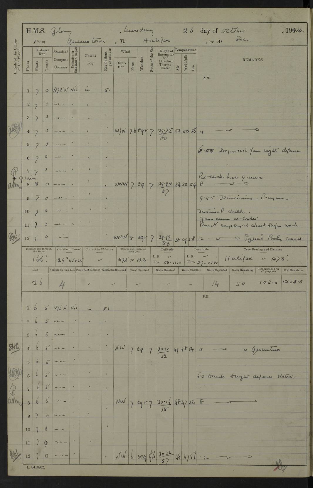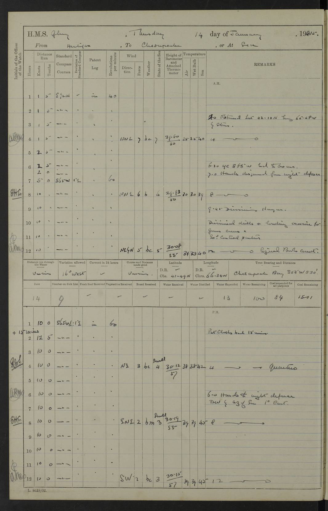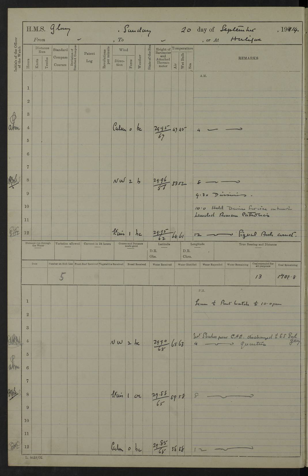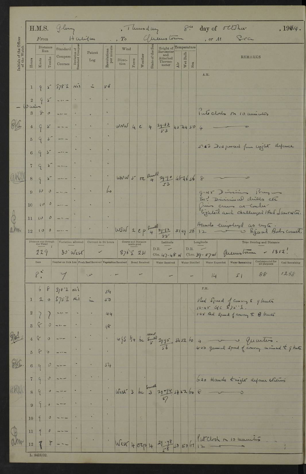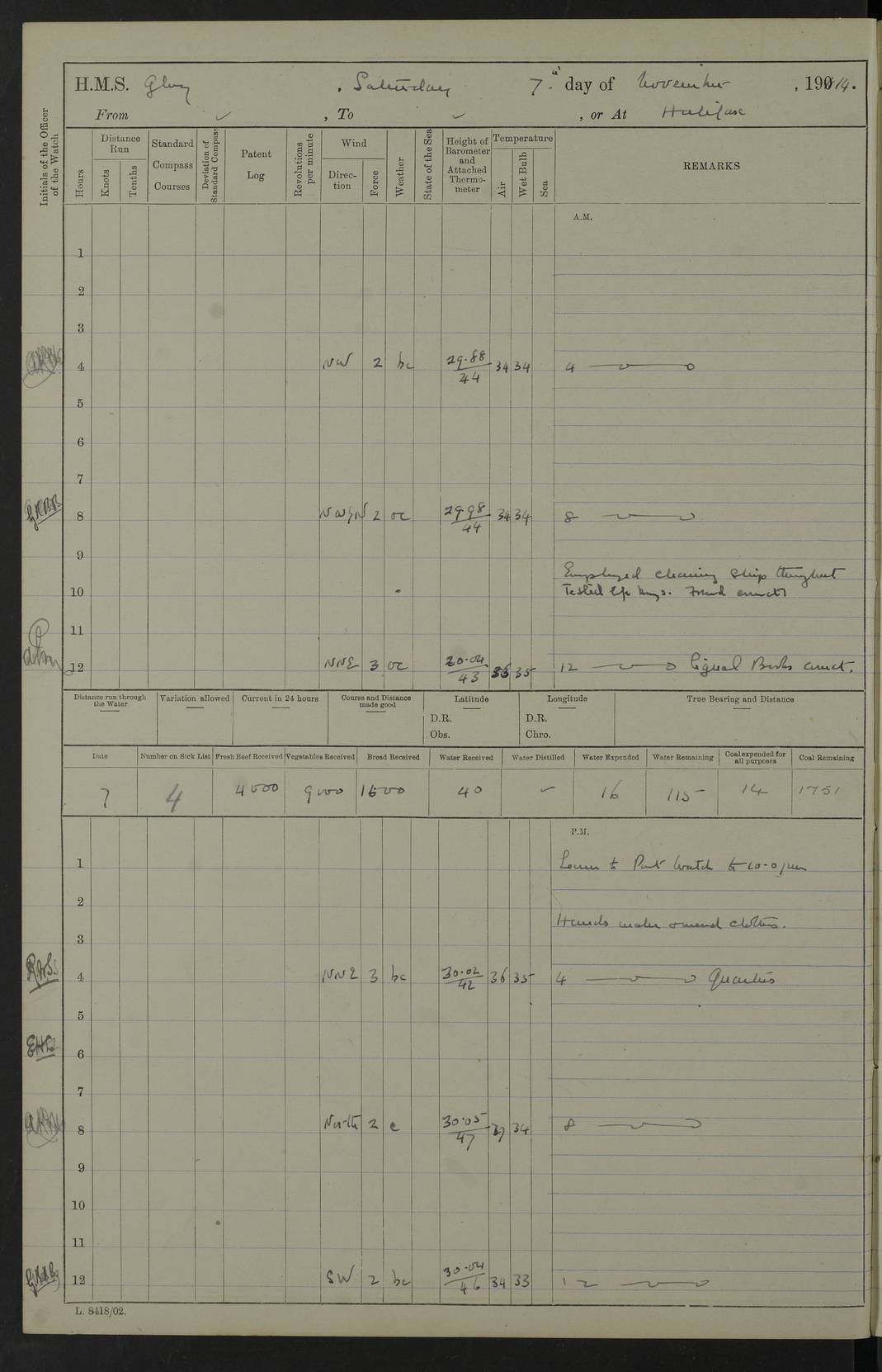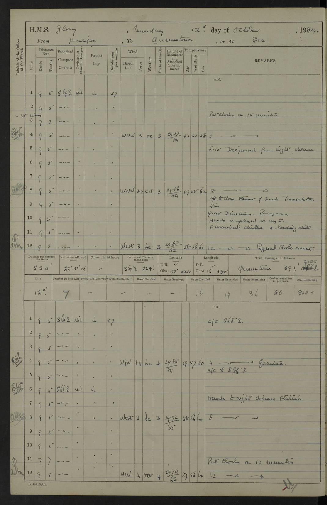 4f73cd06a2fc8ea903001489: (https://s3.amazonaws.com:443/oldweather/ADM53-43011/0072_0.jpg) 17 August 1914 Halifax Lat 44.63, Long -63.55 Number on sick list: 11 6.00am: Commenced coaling from Patent fuel sheds on jetty. 1.30pm: Finished coaling. pm: Washed down upper deck. 4f73cd06a2fc8ea90300148a: (https://s3.amazonaws.com:443/oldweather/ADM53-43011/0072_1.jpg) 18 August 1914 Halifax Lat 44.63, Long -63.55 Number on sick list: 10 4f73cd07a2fc8ea90300148b: (https://s3.amazonaws.com:443/oldweather/ADM53-43011/0073_0.jpg) 19 August 1914 Halifax Lat 44.63, Long -63.55 Number on sick list: 7 5.05am: Slipped from jetty and proceeded as requisite to anchorage in stream. 5.45am: Stopped. Let go Port anchor. am: Preparing for coaling. 9.00am: Collier Brinkwood made fast alongside (Starboard side). 10.10am: Commenced coaling. 9.40pm: Finished coaling. Received 1080 tons. 4f73cd07a2fc8ea90300148c: (https://s3.amazonaws.com:443/oldweather/ADM53-43011/0073_1.jpg) 20 August 1914 Halifax Lat 44.63, Long -63.55 Number on sick list: 7 am: Employed unrigging collier and gear etc. 7.15am: Collier left ship. 5.15pm: Hands to bathe. 4f73cd07a2fc8ea90300148d: (https://s3.amazonaws.com:443/oldweather/ADM53-43011/0074_0.jpg) 21 August 1914 Halifax Lat 44.63, Long -63.55 Number on sick list: 7 pm: Testing gun sights. 8.30pm: Exercised darken ship. 9.15pm: Opened deadlights etc. 4f73cd07a2fc8ea90300148e: (https://s3.amazonaws.com:443/oldweather/ADM53-43011/0074_1.jpg) 22 August 1914 Halifax Lat 44.63, Long -63.55 Number on sick list: 8 am: Aired night clothing. pm: Employed disembarking spare torpedo booms and other gear. pm: Tested lifebuoys. Found correct. 4f73cd08a2fc8ea90300148f: (https://s3.amazonaws.com:443/oldweather/ADM53-43011/0075_0.jpg) 23 August 1914 Halifax and at Sea Lat 44.63, Long -63.55 Number on sick list: 7 10.00am: Held Divine Service on board. am: Preparing for sea. 11.45am: Weighed and proceeded as requisite out of harbour. 12.50pm: Entered War Channel. 3.20pm: a/c S59ºW for rendezvous. 7.25pm: Observed HMS Suffolk 1 pt on starboard bow. HMS Suffolk was a Kent class armoured cruiser, launched at Portsmouth Dockyard in 1903, and sold in 1920. Details at http://en.wikipedia.org/wiki/HMS_Suffolk_(1903) . 8.00pm: Stopped at rendezvous. Communicated by boat with Suffolk. 9.30pm: Fog shut down. 9.00pm: Hands to night defence stations. 9.30pm: Fog shut down.9.45pm: Proceeded. 10.50pm: Fog cleared. 4f73cd08a2fc8ea903001490: (https://s3.amazonaws.com:443/oldweather/ADM53-43011/0075_1.jpg) 24 August 1914 At sea, Halifax to New York Lat 41.9, Long -66.4 Number on sick list: 9 5.30am: Dispersed from night defence. 10.20am: a/c to speak merchant steamer bearing WNW (SS Hurley of Montreal). 10.40am: a/c south. Stopped. Dropped target. 11.00am: Carried out aiming rifle practice. 12.10pm: Stopped. 1.20pm: Dropped second target. Carried out aiming rifle and sub calibre practice. 2.50pm: Fog shut down. pm: Hands at night defence stations. 10.45pm: Fog clearing. 4f73cd08a2fc8ea903001491: (https://s3.amazonaws.com:443/oldweather/ADM53-43011/0076_0.jpg) 25 August 1914 Patrolling off New York Lat 40.6, Long -70.0 Number on sick list: 8 5.40am: Dispersed from night defence. 6.10am: Observed sail N30ºW/ a/c N30ºW. Reduced to 60 revs. 6.50am: Resumed course. Abeam sail (Alicia B. Crosby). 9.36am: Sighted Nantucket Light N65ºW. 10.15am: Met Mason Lines Antilles. 10.25am: Nantucket Light Vessel abeam, 1.2 miles. 6.00pm: Sighted cruiser ahead. 6.10pm: Action. 6.25pm: Dispersed. 6.40pm: Stopped and signalled HMS Essex. HMS Essex was an armoured cruiser of the Kent class, launched in 1901 at Pembroke Dockyard and sold in 1921. Details at http://en.wikipedia.org/wiki/HMS_Essex_(1901) . 7.00pm: Proceeded as requisite. 7.25pm: Sighted steamer. a/c N60ºW, 60 revs. 7.35pm: Turned to east in company with SS Uranium. 8.00pm: Hands to night defence. 8.05pm: Stopped. Communicated by boat with Uranium. 9.23pm: Proceeded, course as requisite to northward to investigate searchlights. pm: Connected conning tower steaming gear. 4f73cd08a2fc8ea903001492: (https://s3.amazonaws.com:443/oldweather/ADM53-43011/0076_1.jpg) 26 August 1914 Patrolling off New York Lat 40.4, Long -73.6 Number on sick list: 11 5.16am: Fire Island Light abeam 7 miles. 7.00am: a/c N49ºW on sighting steamer to north. 8.25am: Sighted Ambrose Light Vessel. 1.00pm: Courses as requisite investigating shipping off Ambrose Light Vessel and Waveside. 2.15pm: Stopped, communicated by boat with SS Van der Duyn. 2.55pm: Proceeded as requisite. 5.26pm: In company with steamers New York and Commanchee. 6.17pm: Connected up fore bridge steering gear. 7.12pm: a/c to south to close steamer (St Louis). 7.25pm: Resumed course. 9.00pm: Hands to night defence. 4f73cd09a2fc8ea903001493: (https://s3.amazonaws.com:443/oldweather/ADM53-43011/0077_0.jpg) 27 August 1914 Patrolling off New York Lat 40.5, Long -72.3 Number on sick list: 10 5.45pm: Dispersed from night defence. 7.12am: a/c as requisite to close merchantman (Wilson Line Francisco). 7.55am: Resumed course. 9.55am: a/c to close Norwegian ship. 10.10am: Stopped, communicated with her by boat (SS Bjornstjerne Bjornsen). 10.50am: Proceeded N30ºE to close Circadian. 3.55pm: Fire Island Light Vessel abeam 2¾ miles. 4.12pm: Reduced to 36 revs. Passed SS Baltic. 5.35pm: Connected up conning tower steering gear. 6.40pm: Ambrose Light Vessel N33ºW, 7 miles. 7.00pm: Connected up fore bridge steering gear. 9.00pm: Hands to night defence stations. 4f73cd09a2fc8ea903001494: (https://s3.amazonaws.com:443/oldweather/ADM53-43011/0077_1.jpg) 28 August 1914 At sea, New York to Boston Lat 40.2, Long -70.8 Number on sick list: 9 5.45am: Dispersed from night defence. 8.40am: Sighted steamer (SS Ran) bearing S50ºE. 9.10am: Resumed course. am: Divisional drills. Preparing for target practice. 10.45am: Sighted steamer bearing N55ºE. 11.32am: Resumed course (SS Skjorldborg). 1.25pm: Stopped. Dropped target. 1.29pm: Proceeded, course as requi