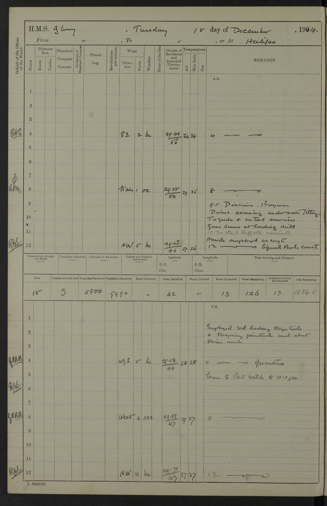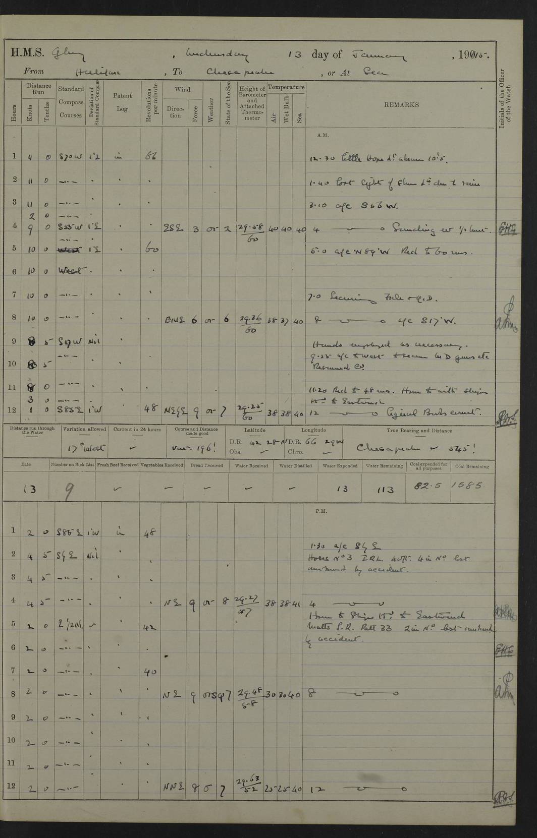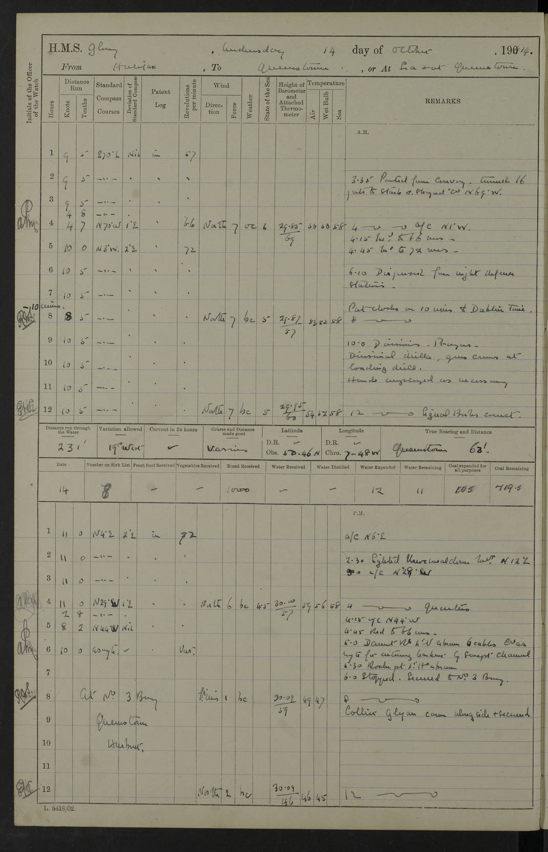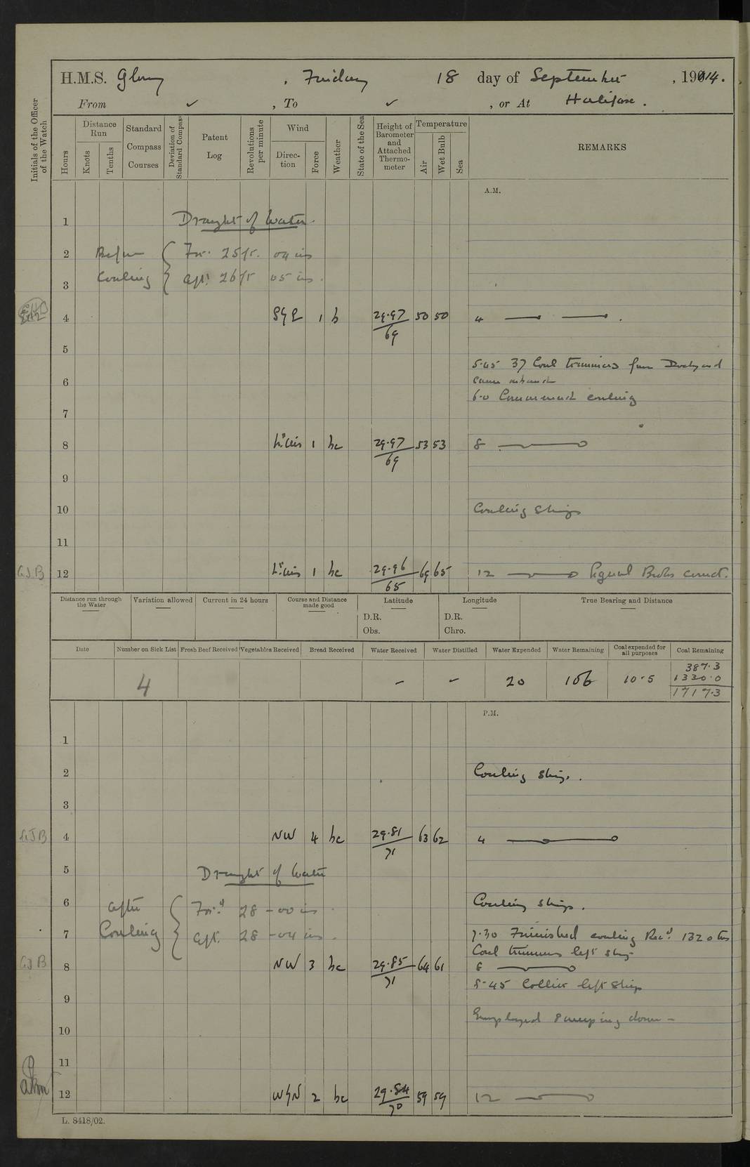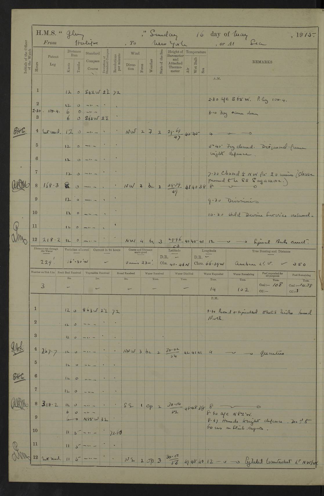 4f73cd06a2fc8ea903001489: (https://s3.amazonaws.com:443/oldweather/ADM53-43011/0072_0.jpg) 17 August 1914 Halifax Lat 44.63, Long -63.55 Number on sick list: 11 6.00am: Commenced coaling from Patent fuel sheds on jetty. 1.30pm: Finished coaling. pm: Washed down upper deck. 4f73cd06a2fc8ea90300148a: (https://s3.amazonaws.com:443/oldweather/ADM53-43011/0072_1.jpg) 18 August 1914 Halifax Lat 44.63, Long -63.55 Number on sick list: 10 4f73cd07a2fc8ea90300148b: (https://s3.amazonaws.com:443/oldweather/ADM53-43011/0073_0.jpg) 19 August 1914 Halifax Lat 44.63, Long -63.55 Number on sick list: 7 5.05am: Slipped from jetty and proceeded as requisite to anchorage in stream. 5.45am: Stopped. Let go Port anchor. am: Preparing for coaling. 9.00am: Collier Brinkwood made fast alongside (Starboard side). 10.10am: Commenced coaling. 9.40pm: Finished coaling. Received 1080 tons. 4f73cd07a2fc8ea90300148c: (https://s3.amazonaws.com:443/oldweather/ADM53-43011/0073_1.jpg) 20 August 1914 Halifax Lat 44.63, Long -63.55 Number on sick list: 7 am: Employed unrigging collier and gear etc. 7.15am: Collier left ship. 5.15pm: Hands to bathe. 4f73cd07a2fc8ea90300148d: (https://s3.amazonaws.com:443/oldweather/ADM53-43011/0074_0.jpg) 21 August 1914 Halifax Lat 44.63, Long -63.55 Number on sick list: 7 pm: Testing gun sights. 8.30pm: Exercised darken ship. 9.15pm: Opened deadlights etc. 4f73cd07a2fc8ea90300148e: (https://s3.amazonaws.com:443/oldweather/ADM53-43011/0074_1.jpg) 22 August 1914 Halifax Lat 44.63, Long -63.55 Number on sick list: 8 am: Aired night clothing. pm: Employed disembarking spare torpedo booms and other gear. pm: Tested lifebuoys. Found correct. 4f73cd08a2fc8ea90300148f: (https://s3.amazonaws.com:443/oldweather/ADM53-43011/0075_0.jpg) 23 August 1914 Halifax and at Sea Lat 44.63, Long -63.55 Number on sick list: 7 10.00am: Held Divine Service on board. am: Preparing for sea. 11.45am: Weighed and proceeded as requisite out of harbour. 12.50pm: Entered War Channel. 3.20pm: a/c S59ºW for rendezvous. 7.25pm: Observed HMS Suffolk 1 pt on starboard bow. HMS Suffolk was a Kent class armoured cruiser, launched at Portsmouth Dockyard in 1903, and sold in 1920. Details at http://en.wikipedia.org/wiki/HMS_Suffolk_(1903) . 8.00pm: Stopped at rendezvous. Communicated by boat with Suffolk. 9.30pm: Fog shut down. 9.00pm: Hands to night defence stations. 9.30pm: Fog shut down.9.45pm: Proceeded. 10.50pm: Fog cleared. 4f73cd08a2fc8ea903001490: (https://s3.amazonaws.com:443/oldweather/ADM53-43011/0075_1.jpg) 24 August 1914 At sea, Halifax to New York Lat 41.9, Long -66.4 Number on sick list: 9 5.30am: Dispersed from night defence. 10.20am: a/c to speak merchant steamer bearing WNW (SS Hurley of Montreal). 10.40am: a/c south. Stopped. Dropped target. 11.00am: Carried out aiming rifle practice. 12.10pm: Stopped. 1.20pm: Dropped second target. Carried out aiming rifle and sub calibre practice. 2.50pm: Fog shut down. pm: Hands at night defence stations. 10.45pm: Fog clearing. 4f73cd08a2fc8ea903001491: (https://s3.amazonaws.com:443/oldweather/ADM53-43011/0076_0.jpg) 25 August 1914 Patrolling off New York Lat 40.6, Long -70.0 Number on sick list: 8 5.40am: Dispersed from night defence. 6.10am: Observed sail N30ºW/ a/c N30ºW. Reduced to 60 revs. 6.50am: Resumed course. Abeam sail (Alicia B. Crosby). 9.36am: Sighted Nantucket Light N65ºW. 10.15am: Met Mason Lines Antilles. 10.25am: Nantucket Light Vessel abeam, 1.2 miles. 6.00pm: Sighted cruiser ahead. 6.10pm: Action. 6.25pm: Dispersed. 6.40pm: Stopped and signalled HMS Essex. HMS Essex was an armoured cruiser of the Kent class, launched in 1901 at Pembroke Dockyard and sold in 1921. Details at http://en.wikipedia.org/wiki/HMS_Essex_(1901) . 7.00pm: Proceeded as requisite. 7.25pm: Sighted steamer. a/c N60ºW, 60 revs. 7.35pm: Turned to east in company with SS Uranium. 8.00pm: Hands to night defence. 8.05pm: Stopped. Communicated by boat with Uranium. 9.23pm: Proceeded, course as requisite to northward to investigate searchlights. pm: Connected conning tower steaming gear. 4f73cd08a2fc8ea903001492: (https://s3.amazonaws.com:443/oldweather/ADM53-43011/0076_1.jpg) 26 August 1914 Patrolling off New York Lat 40.4, Long -73.6 Number on sick list: 11 5.16am: Fire Island Light abeam 7 miles. 7.00am: a/c N49ºW on sighting steamer to north. 8.25am: Sighted Ambrose Light Vessel. 1.00pm: Courses as requisite investigating shipping off Ambrose Light Vessel and Waveside. 2.15pm: Stopped, communicated by boat with SS Van der Duyn. 2.55pm: Proceeded as requisite. 5.26pm: In company with steamers New York and Commanchee. 6.17pm: Connected up fore bridge steering gear. 7.12pm: a/c to south to close steamer (St Louis). 7.25pm: Resumed course. 9.00pm: Hands to night defence. 4f73cd09a2fc8ea903001493: (https://s3.amazonaws.com:443/oldweather/ADM53-43011/0077_0.jpg) 27 August 1914 Patrolling off New York Lat 40.5, Long -72.3 Number on sick list: 10 5.45pm: Dispersed from night defence. 7.12am: a/c as requisite to close merchantman (Wilson Line Francisco). 7.55am: Resumed course. 9.55am: a/c to close Norwegian ship. 10.10am: Stopped, communicated with her by boat (SS Bjornstjerne Bjornsen). 10.50am: Proceeded N30ºE to close Circadian. 3.55pm: Fire Island Light Vessel abeam 2¾ miles. 4.12pm: Reduced to 36 revs. Passed SS Baltic. 5.35pm: Connected up conning tower steering gear. 6.40pm: Ambrose Light Vessel N33ºW, 7 miles. 7.00pm: Connected up fore bridge steering gear. 9.00pm: Hands to night defence stations. 4f73cd09a2fc8ea903001494: (https://s3.amazonaws.com:443/oldweather/ADM53-43011/0077_1.jpg) 28 August 1914 At sea, New York to Boston Lat 40.2, Long -70.8 Number on sick list: 9 5.45am: Dispersed from night defence. 8.40am: Sighted steamer (SS Ran) bearing S50ºE. 9.10am: Resumed course. am: Divisional drills. Preparing for target practice. 10.45am: Sighted steamer bearing N55ºE. 11.32am: Resumed course (SS Skjorldborg). 1.25pm: Stopped. Dropped target. 1.29pm: Proceeded, course as requi