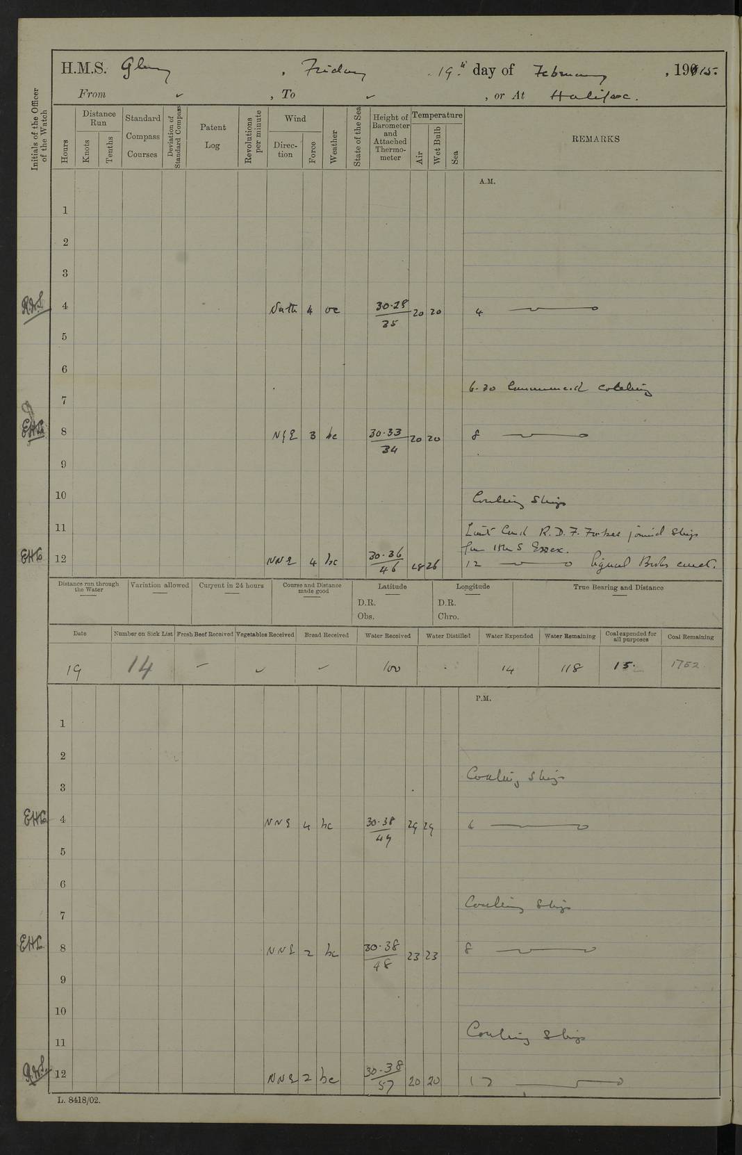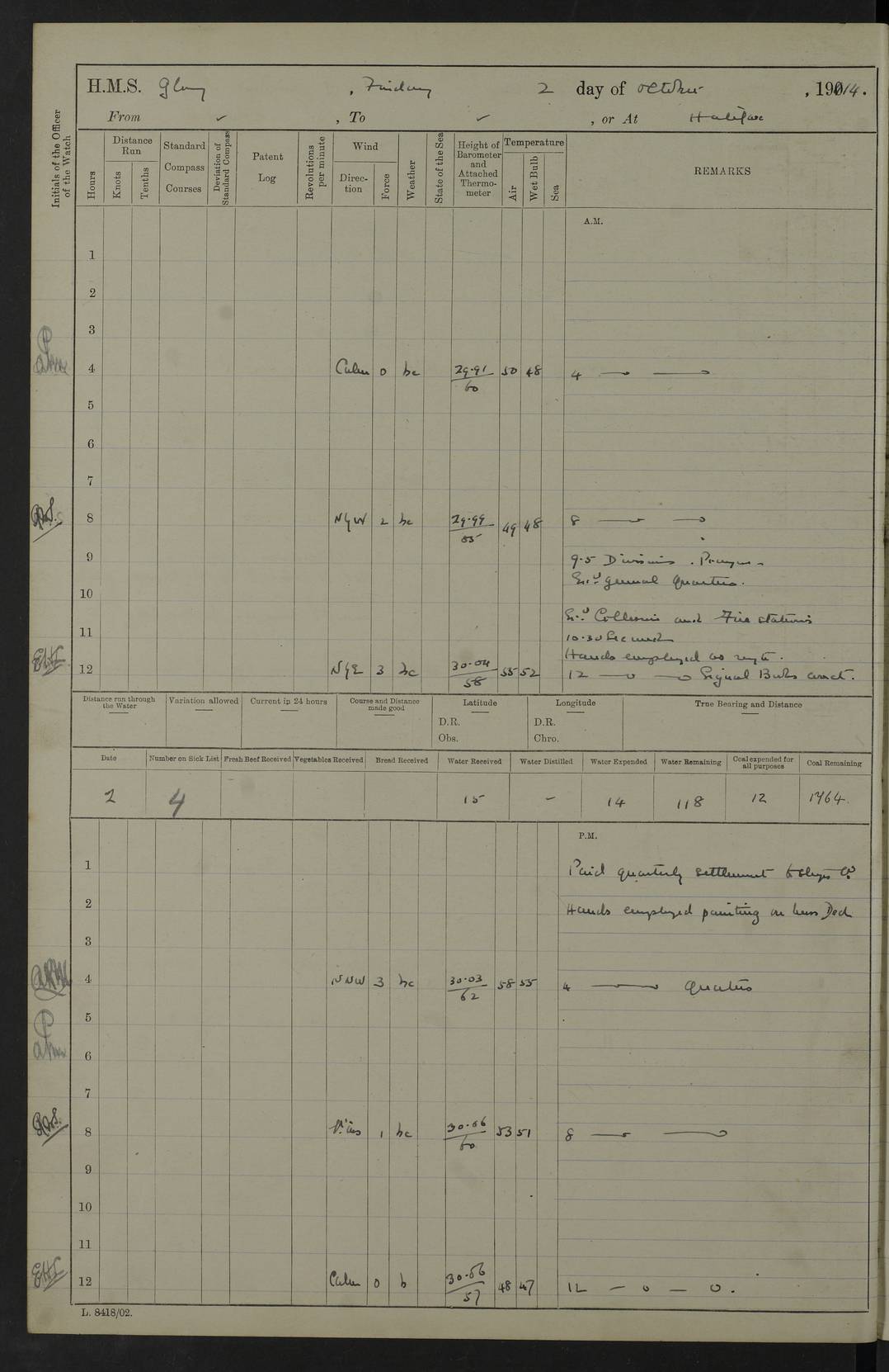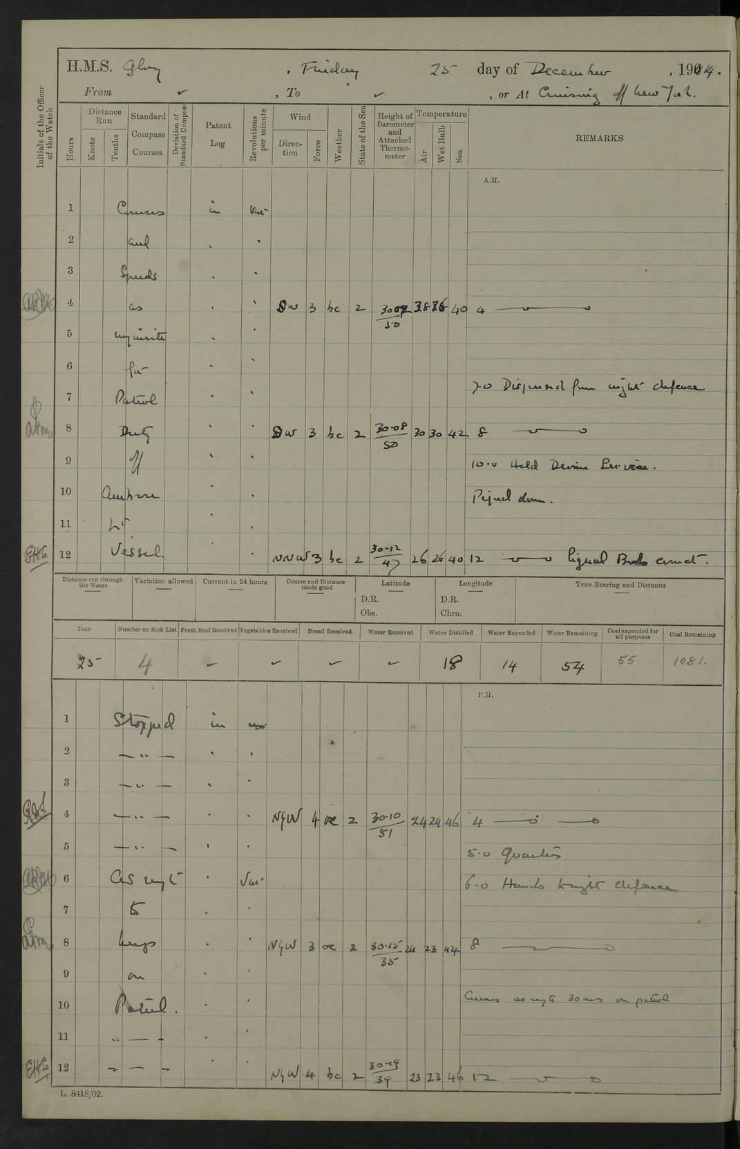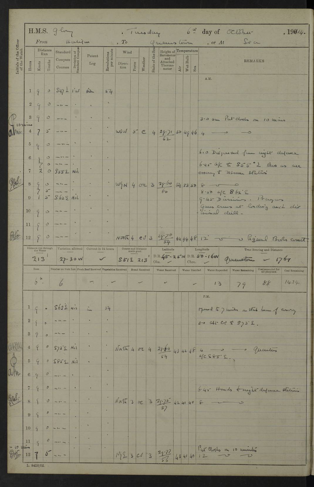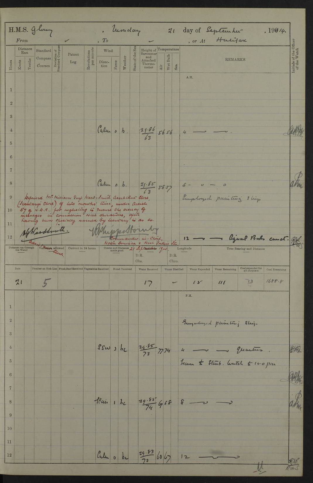 4f73cd06a2fc8ea903001489: (https://s3.amazonaws.com:443/oldweather/ADM53-43011/0072_0.jpg) 17 August 1914 Halifax Lat 44.63, Long -63.55 Number on sick list: 11 6.00am: Commenced coaling from Patent fuel sheds on jetty. 1.30pm: Finished coaling. pm: Washed down upper deck. 4f73cd06a2fc8ea90300148a: (https://s3.amazonaws.com:443/oldweather/ADM53-43011/0072_1.jpg) 18 August 1914 Halifax Lat 44.63, Long -63.55 Number on sick list: 10 4f73cd07a2fc8ea90300148b: (https://s3.amazonaws.com:443/oldweather/ADM53-43011/0073_0.jpg) 19 August 1914 Halifax Lat 44.63, Long -63.55 Number on sick list: 7 5.05am: Slipped from jetty and proceeded as requisite to anchorage in stream. 5.45am: Stopped. Let go Port anchor. am: Preparing for coaling. 9.00am: Collier Brinkwood made fast alongside (Starboard side). 10.10am: Commenced coaling. 9.40pm: Finished coaling. Received 1080 tons. 4f73cd07a2fc8ea90300148c: (https://s3.amazonaws.com:443/oldweather/ADM53-43011/0073_1.jpg) 20 August 1914 Halifax Lat 44.63, Long -63.55 Number on sick list: 7 am: Employed unrigging collier and gear etc. 7.15am: Collier left ship. 5.15pm: Hands to bathe. 4f73cd07a2fc8ea90300148d: (https://s3.amazonaws.com:443/oldweather/ADM53-43011/0074_0.jpg) 21 August 1914 Halifax Lat 44.63, Long -63.55 Number on sick list: 7 pm: Testing gun sights. 8.30pm: Exercised darken ship. 9.15pm: Opened deadlights etc. 4f73cd07a2fc8ea90300148e: (https://s3.amazonaws.com:443/oldweather/ADM53-43011/0074_1.jpg) 22 August 1914 Halifax Lat 44.63, Long -63.55 Number on sick list: 8 am: Aired night clothing. pm: Employed disembarking spare torpedo booms and other gear. pm: Tested lifebuoys. Found correct. 4f73cd08a2fc8ea90300148f: (https://s3.amazonaws.com:443/oldweather/ADM53-43011/0075_0.jpg) 23 August 1914 Halifax and at Sea Lat 44.63, Long -63.55 Number on sick list: 7 10.00am: Held Divine Service on board. am: Preparing for sea. 11.45am: Weighed and proceeded as requisite out of harbour. 12.50pm: Entered War Channel. 3.20pm: a/c S59ºW for rendezvous. 7.25pm: Observed HMS Suffolk 1 pt on starboard bow. HMS Suffolk was a Kent class armoured cruiser, launched at Portsmouth Dockyard in 1903, and sold in 1920. Details at http://en.wikipedia.org/wiki/HMS_Suffolk_(1903) . 8.00pm: Stopped at rendezvous. Communicated by boat with Suffolk. 9.30pm: Fog shut down. 9.00pm: Hands to night defence stations. 9.30pm: Fog shut down.9.45pm: Proceeded. 10.50pm: Fog cleared. 4f73cd08a2fc8ea903001490: (https://s3.amazonaws.com:443/oldweather/ADM53-43011/0075_1.jpg) 24 August 1914 At sea, Halifax to New York Lat 41.9, Long -66.4 Number on sick list: 9 5.30am: Dispersed from night defence. 10.20am: a/c to speak merchant steamer bearing WNW (SS Hurley of Montreal). 10.40am: a/c south. Stopped. Dropped target. 11.00am: Carried out aiming rifle practice. 12.10pm: Stopped. 1.20pm: Dropped second target. Carried out aiming rifle and sub calibre practice. 2.50pm: Fog shut down. pm: Hands at night defence stations. 10.45pm: Fog clearing. 4f73cd08a2fc8ea903001491: (https://s3.amazonaws.com:443/oldweather/ADM53-43011/0076_0.jpg) 25 August 1914 Patrolling off New York Lat 40.6, Long -70.0 Number on sick list: 8 5.40am: Dispersed from night defence. 6.10am: Observed sail N30ºW/ a/c N30ºW. Reduced to 60 revs. 6.50am: Resumed course. Abeam sail (Alicia B. Crosby). 9.36am: Sighted Nantucket Light N65ºW. 10.15am: Met Mason Lines Antilles. 10.25am: Nantucket Light Vessel abeam, 1.2 miles. 6.00pm: Sighted cruiser ahead. 6.10pm: Action. 6.25pm: Dispersed. 6.40pm: Stopped and signalled HMS Essex. HMS Essex was an armoured cruiser of the Kent class, launched in 1901 at Pembroke Dockyard and sold in 1921. Details at http://en.wikipedia.org/wiki/HMS_Essex_(1901) . 7.00pm: Proceeded as requisite. 7.25pm: Sighted steamer. a/c N60ºW, 60 revs. 7.35pm: Turned to east in company with SS Uranium. 8.00pm: Hands to night defence. 8.05pm: Stopped. Communicated by boat with Uranium. 9.23pm: Proceeded, course as requisite to northward to investigate searchlights. pm: Connected conning tower steaming gear. 4f73cd08a2fc8ea903001492: (https://s3.amazonaws.com:443/oldweather/ADM53-43011/0076_1.jpg) 26 August 1914 Patrolling off New York Lat 40.4, Long -73.6 Number on sick list: 11 5.16am: Fire Island Light abeam 7 miles. 7.00am: a/c N49ºW on sighting steamer to north. 8.25am: Sighted Ambrose Light Vessel. 1.00pm: Courses as requisite investigating shipping off Ambrose Light Vessel and Waveside. 2.15pm: Stopped, communicated by boat with SS Van der Duyn. 2.55pm: Proceeded as requisite. 5.26pm: In company with steamers New York and Commanchee. 6.17pm: Connected up fore bridge steering gear. 7.12pm: a/c to south to close steamer (St Louis). 7.25pm: Resumed course. 9.00pm: Hands to night defence. 4f73cd09a2fc8ea903001493: (https://s3.amazonaws.com:443/oldweather/ADM53-43011/0077_0.jpg) 27 August 1914 Patrolling off New York Lat 40.5, Long -72.3 Number on sick list: 10 5.45pm: Dispersed from night defence. 7.12am: a/c as requisite to close merchantman (Wilson Line Francisco). 7.55am: Resumed course. 9.55am: a/c to close Norwegian ship. 10.10am: Stopped, communicated with her by boat (SS Bjornstjerne Bjornsen). 10.50am: Proceeded N30ºE to close Circadian. 3.55pm: Fire Island Light Vessel abeam 2¾ miles. 4.12pm: Reduced to 36 revs. Passed SS Baltic. 5.35pm: Connected up conning tower steering gear. 6.40pm: Ambrose Light Vessel N33ºW, 7 miles. 7.00pm: Connected up fore bridge steering gear. 9.00pm: Hands to night defence stations. 4f73cd09a2fc8ea903001494: (https://s3.amazonaws.com:443/oldweather/ADM53-43011/0077_1.jpg) 28 August 1914 At sea, New York to Boston Lat 40.2, Long -70.8 Number on sick list: 9 5.45am: Dispersed from night defence. 8.40am: Sighted steamer (SS Ran) bearing S50ºE. 9.10am: Resumed course. am: Divisional drills. Preparing for target practice. 10.45am: Sighted steamer bearing N55ºE. 11.32am: Resumed course (SS Skjorldborg). 1.25pm: Stopped. Dropped target. 1.29pm: Proceeded, course as requi