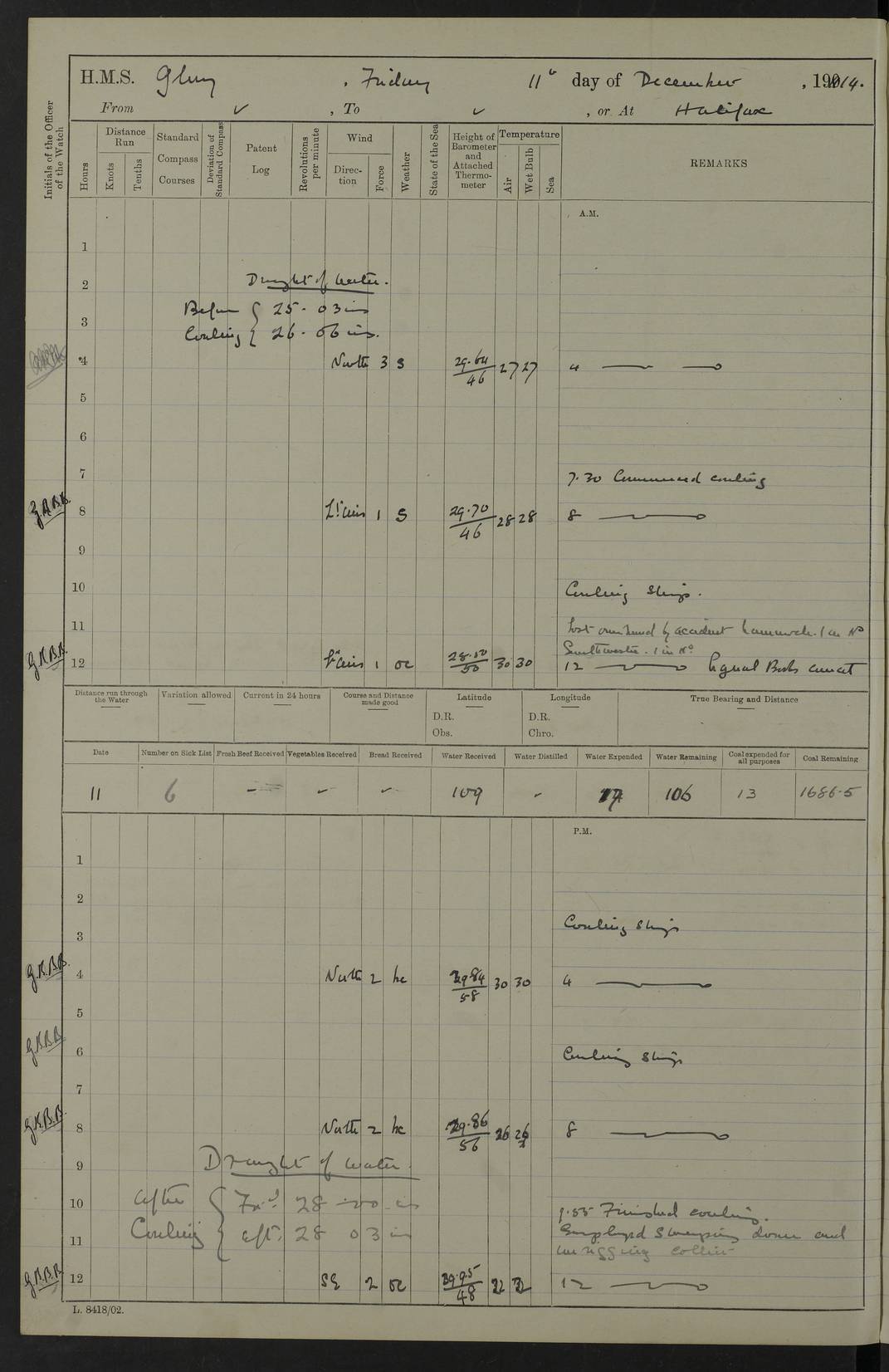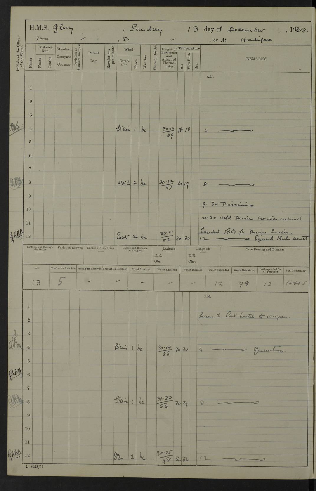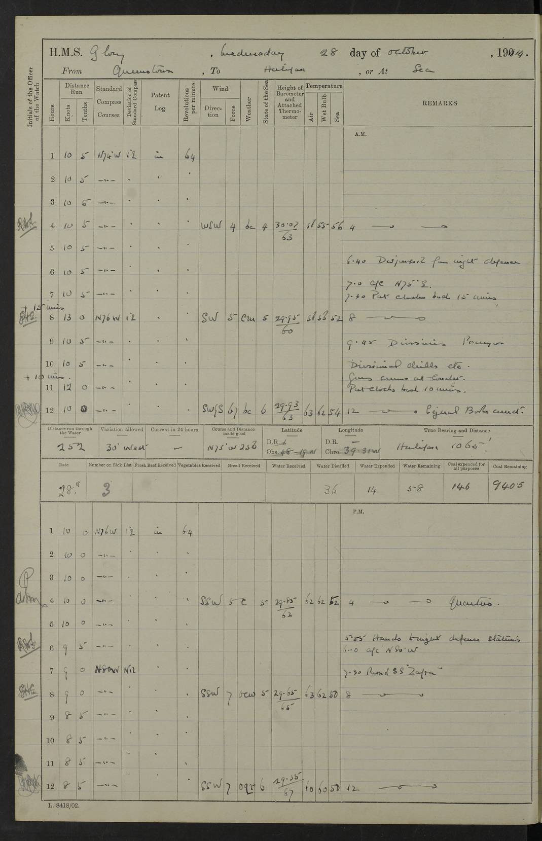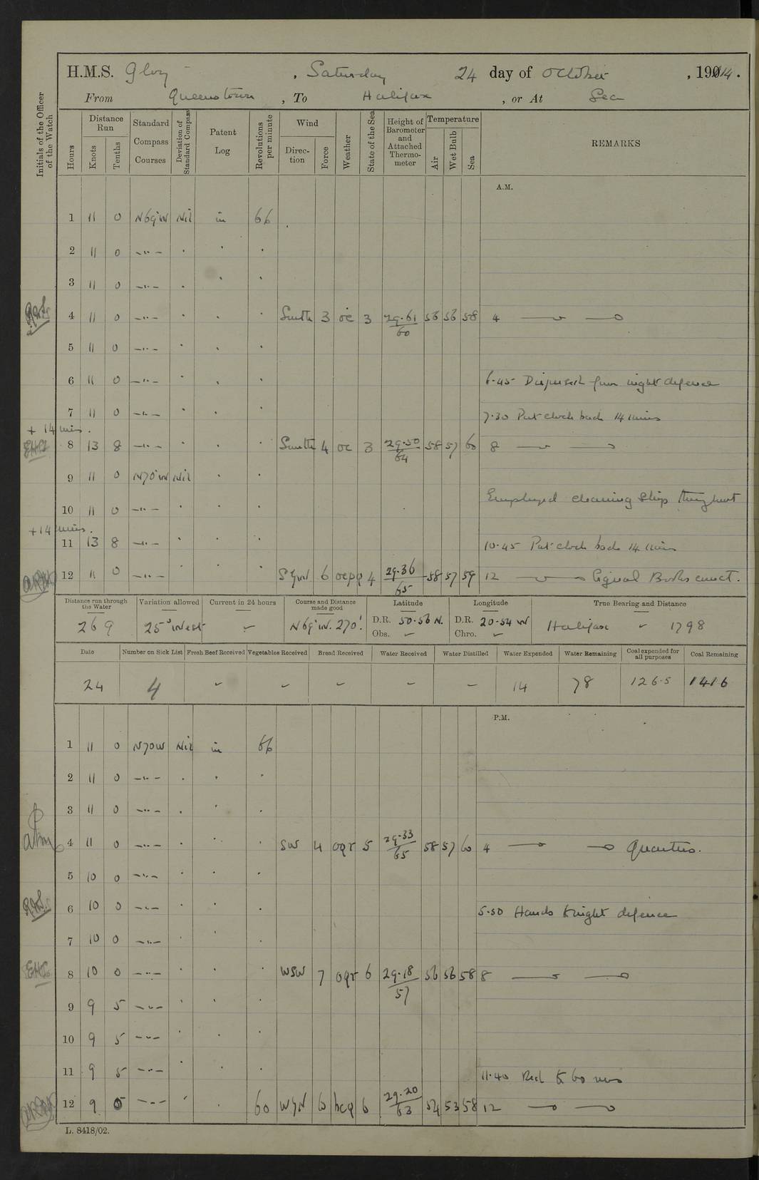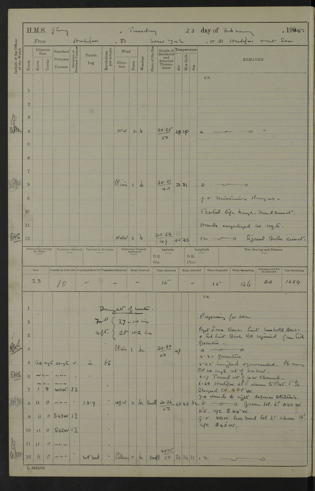 4f73cd06a2fc8ea903001489: (https://s3.amazonaws.com:443/oldweather/ADM53-43011/0072_0.jpg) 17 August 1914 Halifax Lat 44.63, Long -63.55 Number on sick list: 11 6.00am: Commenced coaling from Patent fuel sheds on jetty. 1.30pm: Finished coaling. pm: Washed down upper deck. 4f73cd06a2fc8ea90300148a: (https://s3.amazonaws.com:443/oldweather/ADM53-43011/0072_1.jpg) 18 August 1914 Halifax Lat 44.63, Long -63.55 Number on sick list: 10 4f73cd07a2fc8ea90300148b: (https://s3.amazonaws.com:443/oldweather/ADM53-43011/0073_0.jpg) 19 August 1914 Halifax Lat 44.63, Long -63.55 Number on sick list: 7 5.05am: Slipped from jetty and proceeded as requisite to anchorage in stream. 5.45am: Stopped. Let go Port anchor. am: Preparing for coaling. 9.00am: Collier Brinkwood made fast alongside (Starboard side). 10.10am: Commenced coaling. 9.40pm: Finished coaling. Received 1080 tons. 4f73cd07a2fc8ea90300148c: (https://s3.amazonaws.com:443/oldweather/ADM53-43011/0073_1.jpg) 20 August 1914 Halifax Lat 44.63, Long -63.55 Number on sick list: 7 am: Employed unrigging collier and gear etc. 7.15am: Collier left ship. 5.15pm: Hands to bathe. 4f73cd07a2fc8ea90300148d: (https://s3.amazonaws.com:443/oldweather/ADM53-43011/0074_0.jpg) 21 August 1914 Halifax Lat 44.63, Long -63.55 Number on sick list: 7 pm: Testing gun sights. 8.30pm: Exercised darken ship. 9.15pm: Opened deadlights etc. 4f73cd07a2fc8ea90300148e: (https://s3.amazonaws.com:443/oldweather/ADM53-43011/0074_1.jpg) 22 August 1914 Halifax Lat 44.63, Long -63.55 Number on sick list: 8 am: Aired night clothing. pm: Employed disembarking spare torpedo booms and other gear. pm: Tested lifebuoys. Found correct. 4f73cd08a2fc8ea90300148f: (https://s3.amazonaws.com:443/oldweather/ADM53-43011/0075_0.jpg) 23 August 1914 Halifax and at Sea Lat 44.63, Long -63.55 Number on sick list: 7 10.00am: Held Divine Service on board. am: Preparing for sea. 11.45am: Weighed and proceeded as requisite out of harbour. 12.50pm: Entered War Channel. 3.20pm: a/c S59ºW for rendezvous. 7.25pm: Observed HMS Suffolk 1 pt on starboard bow. HMS Suffolk was a Kent class armoured cruiser, launched at Portsmouth Dockyard in 1903, and sold in 1920. Details at http://en.wikipedia.org/wiki/HMS_Suffolk_(1903) . 8.00pm: Stopped at rendezvous. Communicated by boat with Suffolk. 9.30pm: Fog shut down. 9.00pm: Hands to night defence stations. 9.30pm: Fog shut down.9.45pm: Proceeded. 10.50pm: Fog cleared. 4f73cd08a2fc8ea903001490: (https://s3.amazonaws.com:443/oldweather/ADM53-43011/0075_1.jpg) 24 August 1914 At sea, Halifax to New York Lat 41.9, Long -66.4 Number on sick list: 9 5.30am: Dispersed from night defence. 10.20am: a/c to speak merchant steamer bearing WNW (SS Hurley of Montreal). 10.40am: a/c south. Stopped. Dropped target. 11.00am: Carried out aiming rifle practice. 12.10pm: Stopped. 1.20pm: Dropped second target. Carried out aiming rifle and sub calibre practice. 2.50pm: Fog shut down. pm: Hands at night defence stations. 10.45pm: Fog clearing. 4f73cd08a2fc8ea903001491: (https://s3.amazonaws.com:443/oldweather/ADM53-43011/0076_0.jpg) 25 August 1914 Patrolling off New York Lat 40.6, Long -70.0 Number on sick list: 8 5.40am: Dispersed from night defence. 6.10am: Observed sail N30ºW/ a/c N30ºW. Reduced to 60 revs. 6.50am: Resumed course. Abeam sail (Alicia B. Crosby). 9.36am: Sighted Nantucket Light N65ºW. 10.15am: Met Mason Lines Antilles. 10.25am: Nantucket Light Vessel abeam, 1.2 miles. 6.00pm: Sighted cruiser ahead. 6.10pm: Action. 6.25pm: Dispersed. 6.40pm: Stopped and signalled HMS Essex. HMS Essex was an armoured cruiser of the Kent class, launched in 1901 at Pembroke Dockyard and sold in 1921. Details at http://en.wikipedia.org/wiki/HMS_Essex_(1901) . 7.00pm: Proceeded as requisite. 7.25pm: Sighted steamer. a/c N60ºW, 60 revs. 7.35pm: Turned to east in company with SS Uranium. 8.00pm: Hands to night defence. 8.05pm: Stopped. Communicated by boat with Uranium. 9.23pm: Proceeded, course as requisite to northward to investigate searchlights. pm: Connected conning tower steaming gear. 4f73cd08a2fc8ea903001492: (https://s3.amazonaws.com:443/oldweather/ADM53-43011/0076_1.jpg) 26 August 1914 Patrolling off New York Lat 40.4, Long -73.6 Number on sick list: 11 5.16am: Fire Island Light abeam 7 miles. 7.00am: a/c N49ºW on sighting steamer to north. 8.25am: Sighted Ambrose Light Vessel. 1.00pm: Courses as requisite investigating shipping off Ambrose Light Vessel and Waveside. 2.15pm: Stopped, communicated by boat with SS Van der Duyn. 2.55pm: Proceeded as requisite. 5.26pm: In company with steamers New York and Commanchee. 6.17pm: Connected up fore bridge steering gear. 7.12pm: a/c to south to close steamer (St Louis). 7.25pm: Resumed course. 9.00pm: Hands to night defence. 4f73cd09a2fc8ea903001493: (https://s3.amazonaws.com:443/oldweather/ADM53-43011/0077_0.jpg) 27 August 1914 Patrolling off New York Lat 40.5, Long -72.3 Number on sick list: 10 5.45pm: Dispersed from night defence. 7.12am: a/c as requisite to close merchantman (Wilson Line Francisco). 7.55am: Resumed course. 9.55am: a/c to close Norwegian ship. 10.10am: Stopped, communicated with her by boat (SS Bjornstjerne Bjornsen). 10.50am: Proceeded N30ºE to close Circadian. 3.55pm: Fire Island Light Vessel abeam 2¾ miles. 4.12pm: Reduced to 36 revs. Passed SS Baltic. 5.35pm: Connected up conning tower steering gear. 6.40pm: Ambrose Light Vessel N33ºW, 7 miles. 7.00pm: Connected up fore bridge steering gear. 9.00pm: Hands to night defence stations. 4f73cd09a2fc8ea903001494: (https://s3.amazonaws.com:443/oldweather/ADM53-43011/0077_1.jpg) 28 August 1914 At sea, New York to Boston Lat 40.2, Long -70.8 Number on sick list: 9 5.45am: Dispersed from night defence. 8.40am: Sighted steamer (SS Ran) bearing S50ºE. 9.10am: Resumed course. am: Divisional drills. Preparing for target practice. 10.45am: Sighted steamer bearing N55ºE. 11.32am: Resumed course (SS Skjorldborg). 1.25pm: Stopped. Dropped target. 1.29pm: Proceeded, course as requi