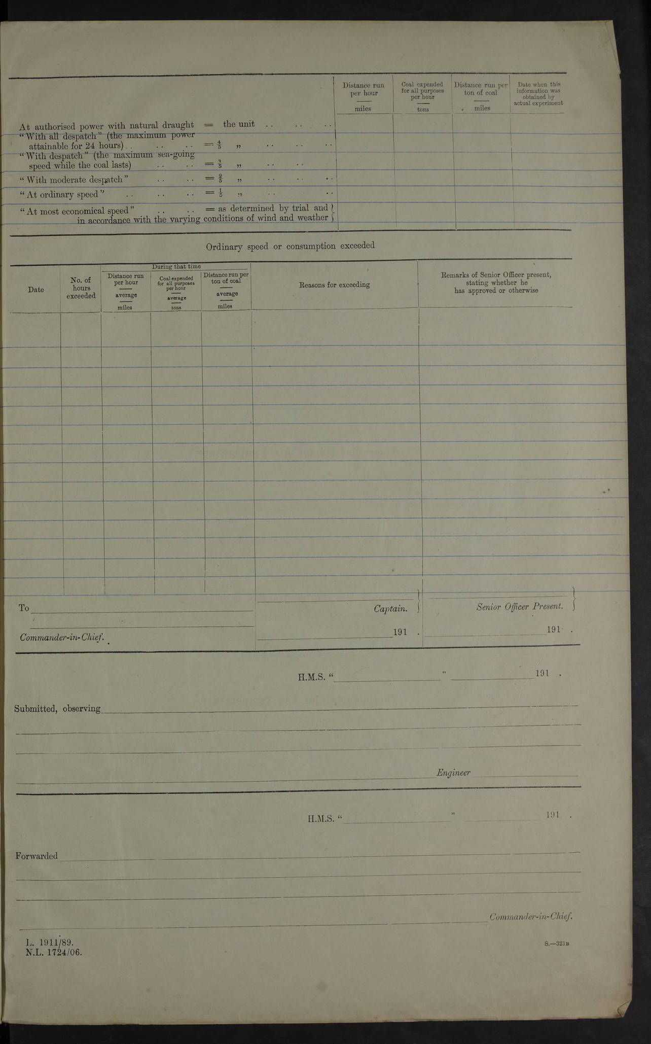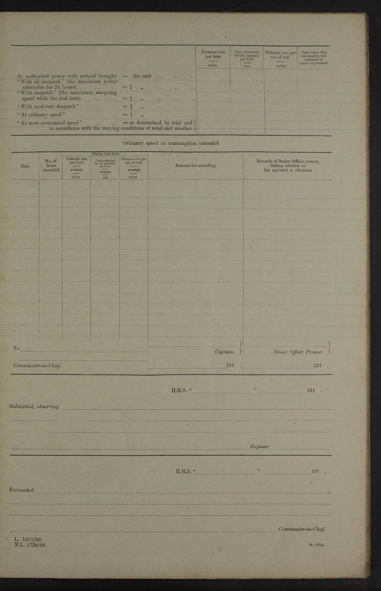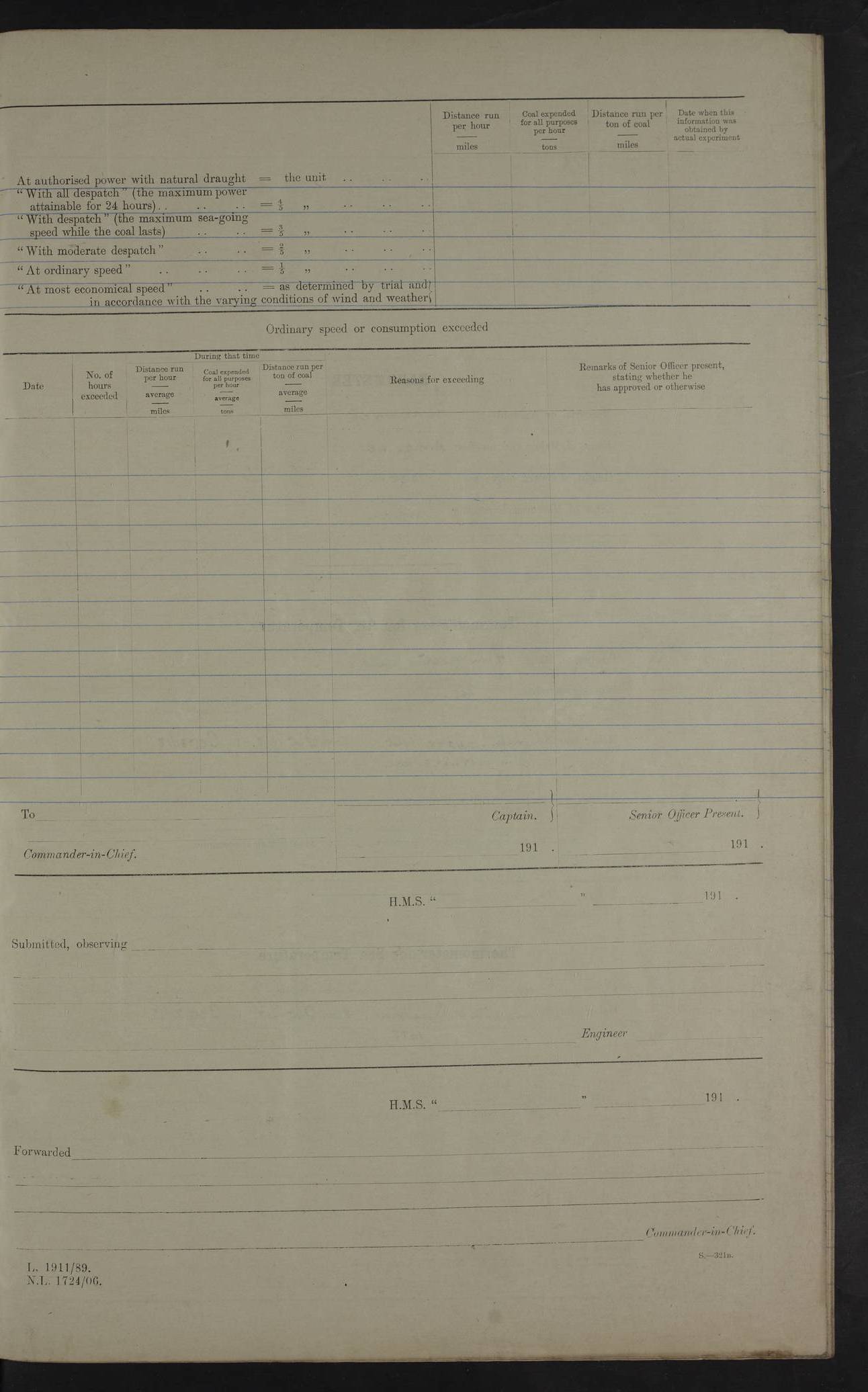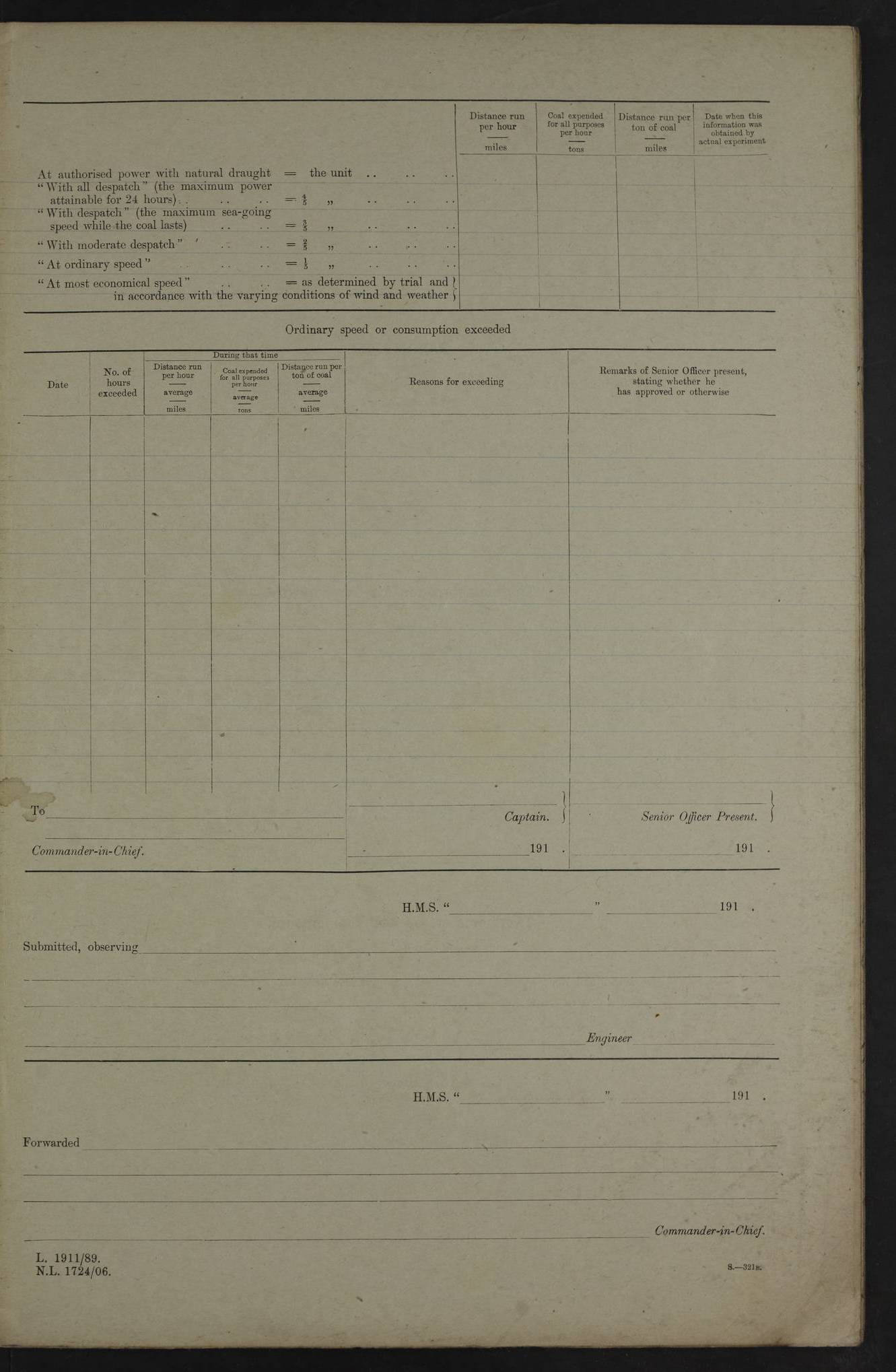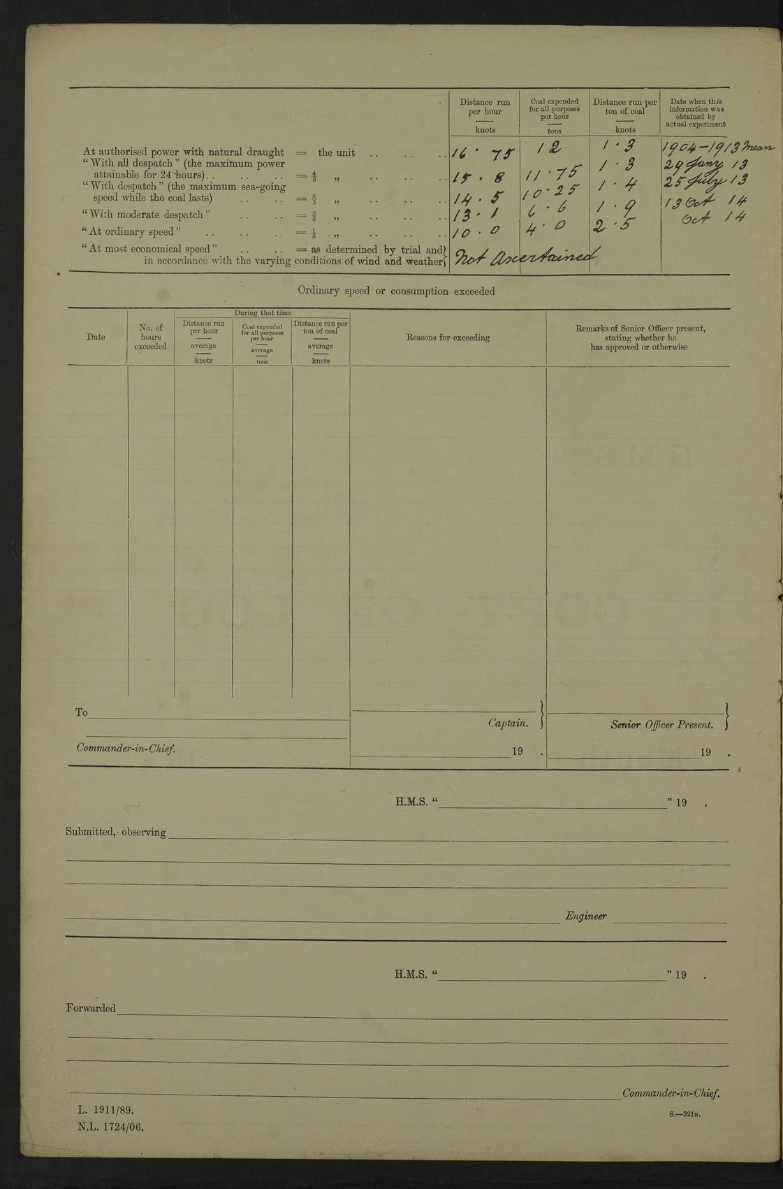 4f73cd06a2fc8ea903001489: (https://s3.amazonaws.com:443/oldweather/ADM53-43011/0072_0.jpg) 17 August 1914 Halifax Lat 44.63, Long -63.55 Number on sick list: 11 6.00am: Commenced coaling from Patent fuel sheds on jetty. 1.30pm: Finished coaling. pm: Washed down upper deck. 4f73cd06a2fc8ea90300148a: (https://s3.amazonaws.com:443/oldweather/ADM53-43011/0072_1.jpg) 18 August 1914 Halifax Lat 44.63, Long -63.55 Number on sick list: 10 4f73cd07a2fc8ea90300148b: (https://s3.amazonaws.com:443/oldweather/ADM53-43011/0073_0.jpg) 19 August 1914 Halifax Lat 44.63, Long -63.55 Number on sick list: 7 5.05am: Slipped from jetty and proceeded as requisite to anchorage in stream. 5.45am: Stopped. Let go Port anchor. am: Preparing for coaling. 9.00am: Collier Brinkwood made fast alongside (Starboard side). 10.10am: Commenced coaling. 9.40pm: Finished coaling. Received 1080 tons. 4f73cd07a2fc8ea90300148c: (https://s3.amazonaws.com:443/oldweather/ADM53-43011/0073_1.jpg) 20 August 1914 Halifax Lat 44.63, Long -63.55 Number on sick list: 7 am: Employed unrigging collier and gear etc. 7.15am: Collier left ship. 5.15pm: Hands to bathe. 4f73cd07a2fc8ea90300148d: (https://s3.amazonaws.com:443/oldweather/ADM53-43011/0074_0.jpg) 21 August 1914 Halifax Lat 44.63, Long -63.55 Number on sick list: 7 pm: Testing gun sights. 8.30pm: Exercised darken ship. 9.15pm: Opened deadlights etc. 4f73cd07a2fc8ea90300148e: (https://s3.amazonaws.com:443/oldweather/ADM53-43011/0074_1.jpg) 22 August 1914 Halifax Lat 44.63, Long -63.55 Number on sick list: 8 am: Aired night clothing. pm: Employed disembarking spare torpedo booms and other gear. pm: Tested lifebuoys. Found correct. 4f73cd08a2fc8ea90300148f: (https://s3.amazonaws.com:443/oldweather/ADM53-43011/0075_0.jpg) 23 August 1914 Halifax and at Sea Lat 44.63, Long -63.55 Number on sick list: 7 10.00am: Held Divine Service on board. am: Preparing for sea. 11.45am: Weighed and proceeded as requisite out of harbour. 12.50pm: Entered War Channel. 3.20pm: a/c S59ºW for rendezvous. 7.25pm: Observed HMS Suffolk 1 pt on starboard bow. HMS Suffolk was a Kent class armoured cruiser, launched at Portsmouth Dockyard in 1903, and sold in 1920. Details at http://en.wikipedia.org/wiki/HMS_Suffolk_(1903) . 8.00pm: Stopped at rendezvous. Communicated by boat with Suffolk. 9.30pm: Fog shut down. 9.00pm: Hands to night defence stations. 9.30pm: Fog shut down.9.45pm: Proceeded. 10.50pm: Fog cleared. 4f73cd08a2fc8ea903001490: (https://s3.amazonaws.com:443/oldweather/ADM53-43011/0075_1.jpg) 24 August 1914 At sea, Halifax to New York Lat 41.9, Long -66.4 Number on sick list: 9 5.30am: Dispersed from night defence. 10.20am: a/c to speak merchant steamer bearing WNW (SS Hurley of Montreal). 10.40am: a/c south. Stopped. Dropped target. 11.00am: Carried out aiming rifle practice. 12.10pm: Stopped. 1.20pm: Dropped second target. Carried out aiming rifle and sub calibre practice. 2.50pm: Fog shut down. pm: Hands at night defence stations. 10.45pm: Fog clearing. 4f73cd08a2fc8ea903001491: (https://s3.amazonaws.com:443/oldweather/ADM53-43011/0076_0.jpg) 25 August 1914 Patrolling off New York Lat 40.6, Long -70.0 Number on sick list: 8 5.40am: Dispersed from night defence. 6.10am: Observed sail N30ºW/ a/c N30ºW. Reduced to 60 revs. 6.50am: Resumed course. Abeam sail (Alicia B. Crosby). 9.36am: Sighted Nantucket Light N65ºW. 10.15am: Met Mason Lines Antilles. 10.25am: Nantucket Light Vessel abeam, 1.2 miles. 6.00pm: Sighted cruiser ahead. 6.10pm: Action. 6.25pm: Dispersed. 6.40pm: Stopped and signalled HMS Essex. HMS Essex was an armoured cruiser of the Kent class, launched in 1901 at Pembroke Dockyard and sold in 1921. Details at http://en.wikipedia.org/wiki/HMS_Essex_(1901) . 7.00pm: Proceeded as requisite. 7.25pm: Sighted steamer. a/c N60ºW, 60 revs. 7.35pm: Turned to east in company with SS Uranium. 8.00pm: Hands to night defence. 8.05pm: Stopped. Communicated by boat with Uranium. 9.23pm: Proceeded, course as requisite to northward to investigate searchlights. pm: Connected conning tower steaming gear. 4f73cd08a2fc8ea903001492: (https://s3.amazonaws.com:443/oldweather/ADM53-43011/0076_1.jpg) 26 August 1914 Patrolling off New York Lat 40.4, Long -73.6 Number on sick list: 11 5.16am: Fire Island Light abeam 7 miles. 7.00am: a/c N49ºW on sighting steamer to north. 8.25am: Sighted Ambrose Light Vessel. 1.00pm: Courses as requisite investigating shipping off Ambrose Light Vessel and Waveside. 2.15pm: Stopped, communicated by boat with SS Van der Duyn. 2.55pm: Proceeded as requisite. 5.26pm: In company with steamers New York and Commanchee. 6.17pm: Connected up fore bridge steering gear. 7.12pm: a/c to south to close steamer (St Louis). 7.25pm: Resumed course. 9.00pm: Hands to night defence. 4f73cd09a2fc8ea903001493: (https://s3.amazonaws.com:443/oldweather/ADM53-43011/0077_0.jpg) 27 August 1914 Patrolling off New York Lat 40.5, Long -72.3 Number on sick list: 10 5.45pm: Dispersed from night defence. 7.12am: a/c as requisite to close merchantman (Wilson Line Francisco). 7.55am: Resumed course. 9.55am: a/c to close Norwegian ship. 10.10am: Stopped, communicated with her by boat (SS Bjornstjerne Bjornsen). 10.50am: Proceeded N30ºE to close Circadian. 3.55pm: Fire Island Light Vessel abeam 2¾ miles. 4.12pm: Reduced to 36 revs. Passed SS Baltic. 5.35pm: Connected up conning tower steering gear. 6.40pm: Ambrose Light Vessel N33ºW, 7 miles. 7.00pm: Connected up fore bridge steering gear. 9.00pm: Hands to night defence stations. 4f73cd09a2fc8ea903001494: (https://s3.amazonaws.com:443/oldweather/ADM53-43011/0077_1.jpg) 28 August 1914 At sea, New York to Boston Lat 40.2, Long -70.8 Number on sick list: 9 5.45am: Dispersed from night defence. 8.40am: Sighted steamer (SS Ran) bearing S50ºE. 9.10am: Resumed course. am: Divisional drills. Preparing for target practice. 10.45am: Sighted steamer bearing N55ºE. 11.32am: Resumed course (SS Skjorldborg). 1.25pm: Stopped. Dropped target. 1.29pm: Proceeded, course as requi