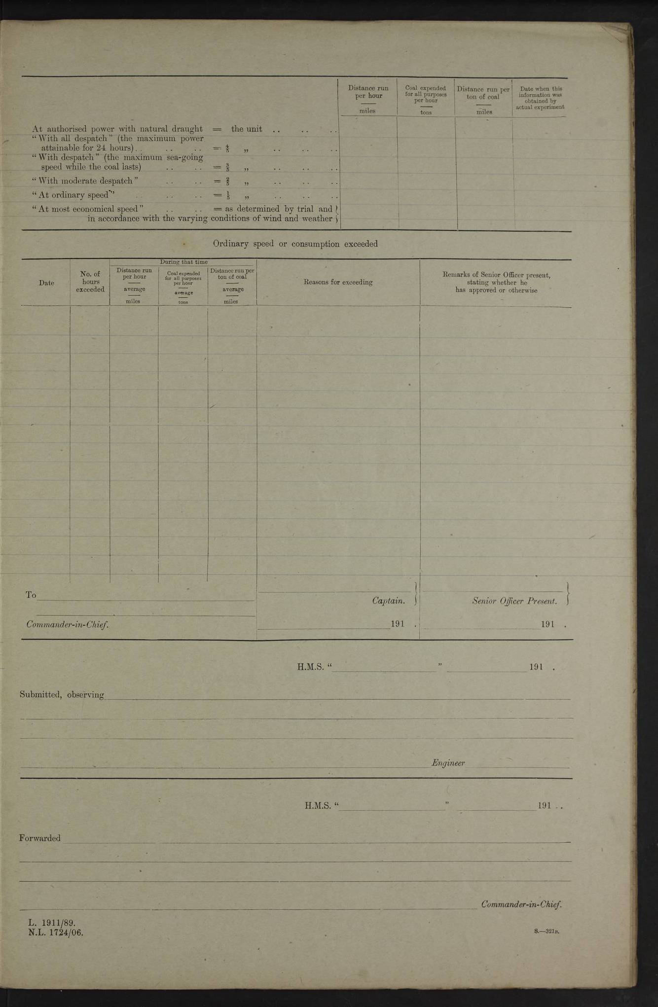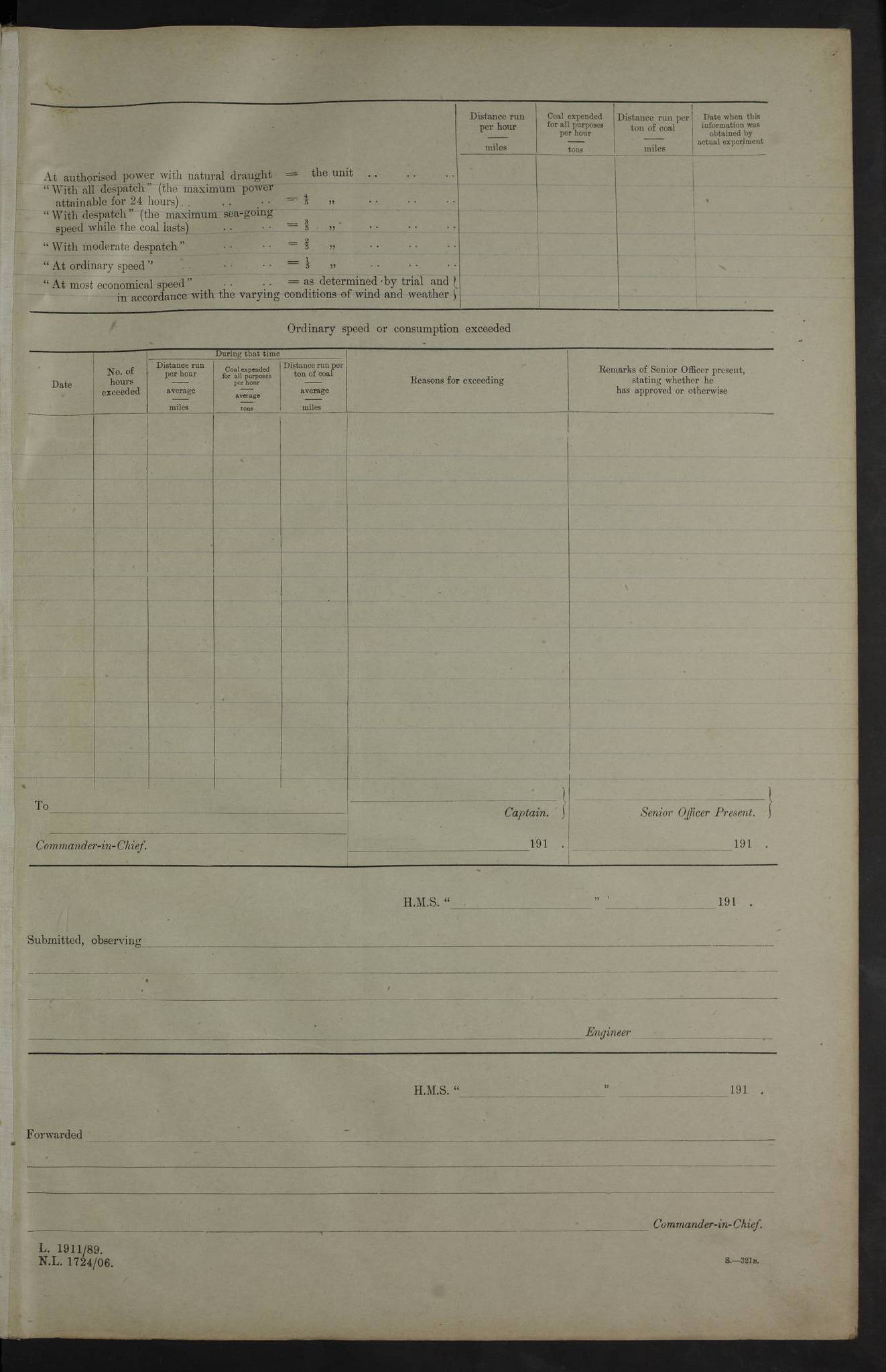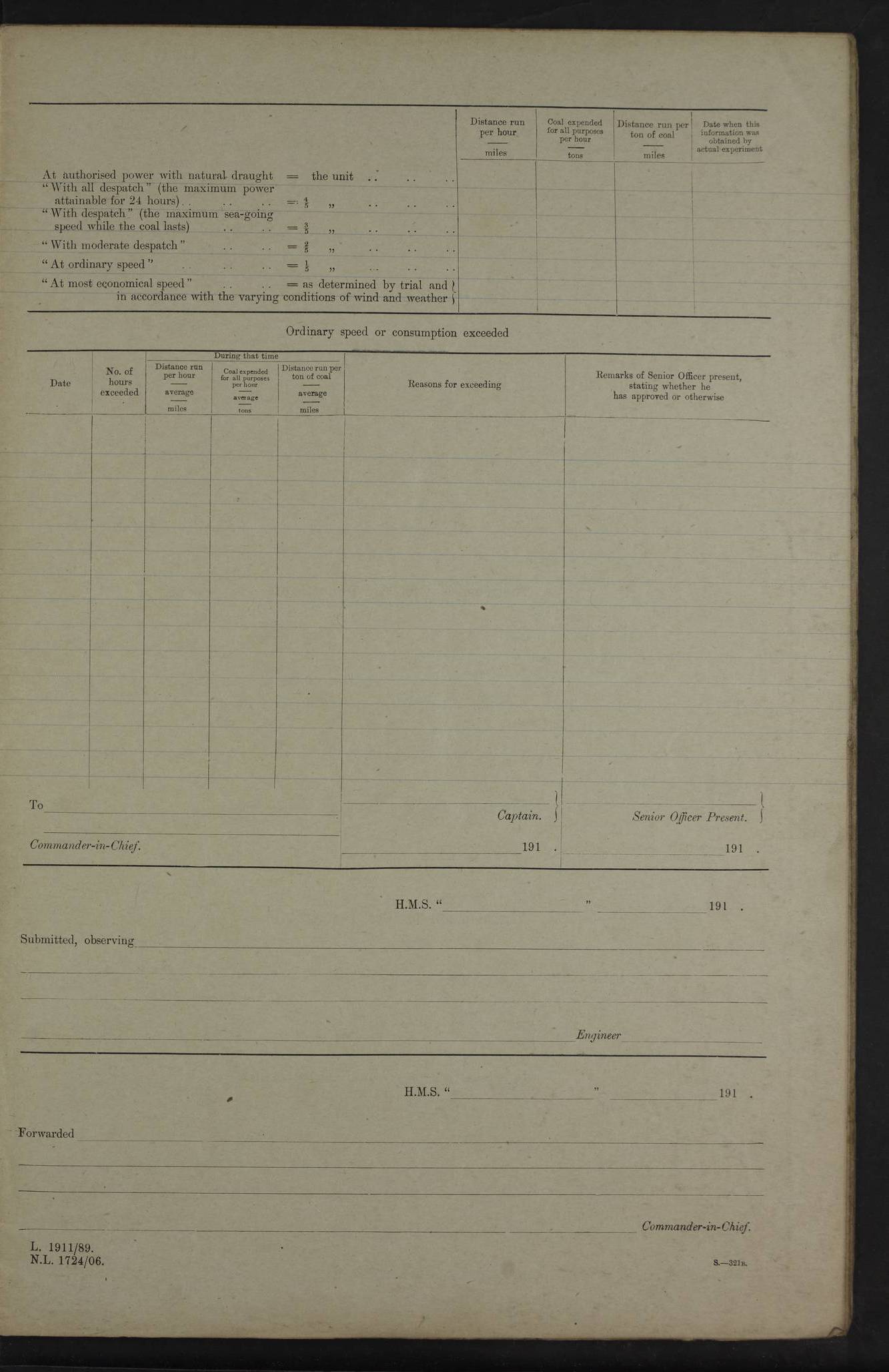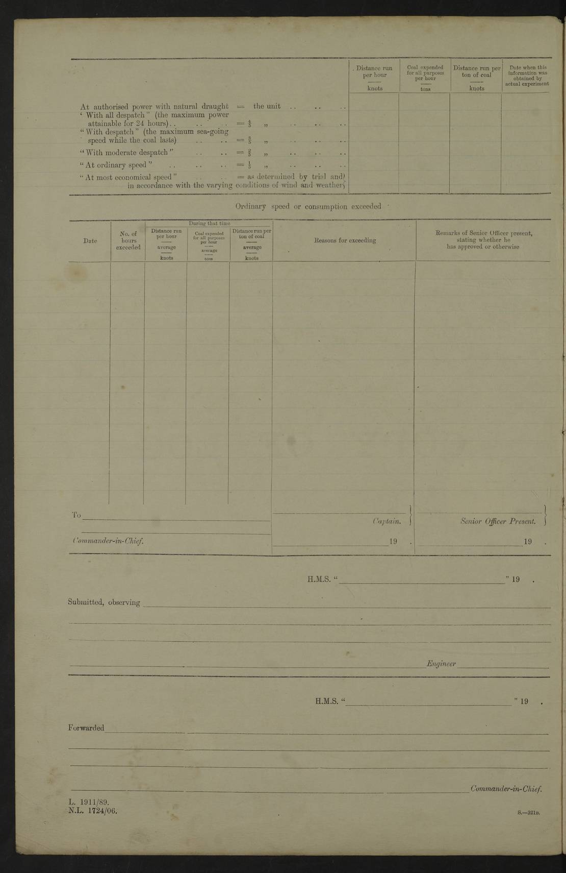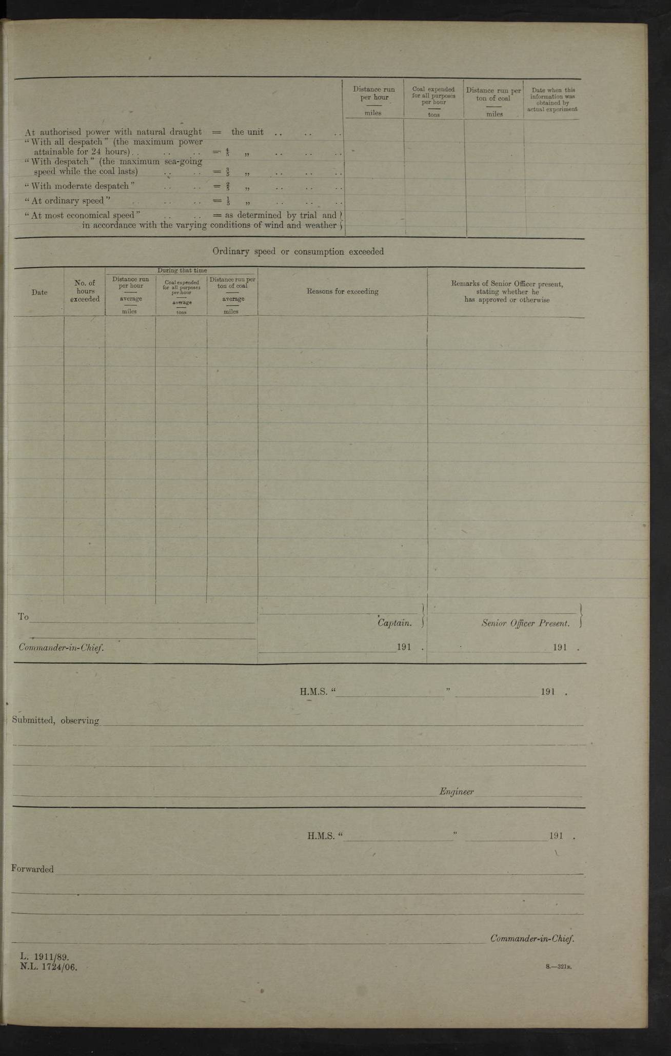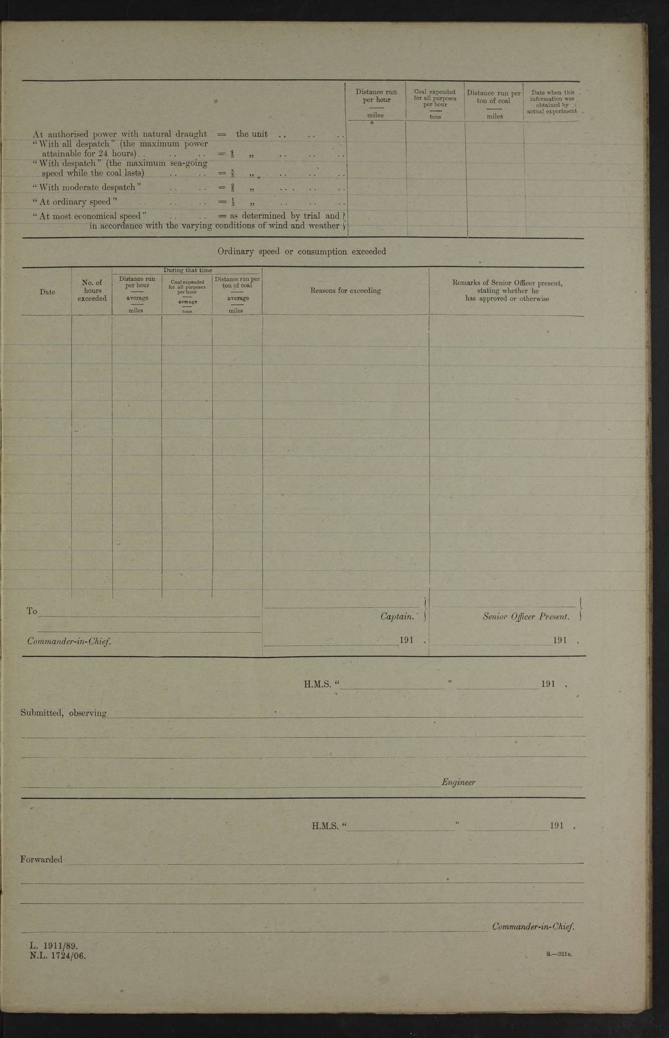4f73cd06a2fc8ea903001489: (https://s3.amazonaws.com:443/oldweather/ADM53-43011/0072_0.jpg) 17 August 1914 Halifax Lat 44.63, Long -63.55 Number on sick list: 11 6.00am: Commenced coaling from Patent fuel sheds on jetty. 1.30pm: Finished coaling. pm: Washed down upper deck. 4f73cd06a2fc8ea90300148a: (https://s3.amazonaws.com:443/oldweather/ADM53-43011/0072_1.jpg) 18 August 1914 Halifax Lat 44.63, Long -63.55 Number on sick list: 10 4f73cd07a2fc8ea90300148b: (https://s3.amazonaws.com:443/oldweather/ADM53-43011/0073_0.jpg) 19 August 1914 Halifax Lat 44.63, Long -63.55 Number on sick list: 7 5.05am: Slipped from jetty and proceeded as requisite to anchorage in stream. 5.45am: Stopped. Let go Port anchor. am: Preparing for coaling. 9.00am: Collier Brinkwood made fast alongside (Starboard side). 10.10am: Commenced coaling. 9.40pm: Finished coaling. Received 1080 tons. 4f73cd07a2fc8ea90300148c: (https://s3.amazonaws.com:443/oldweather/ADM53-43011/0073_1.jpg) 20 August 1914 Halifax Lat 44.63, Long -63.55 Number on sick list: 7 am: Employed unrigging collier and gear etc. 7.15am: Collier left ship. 5.15pm: Hands to bathe. 4f73cd07a2fc8ea90300148d: (https://s3.amazonaws.com:443/oldweather/ADM53-43011/0074_0.jpg) 21 August 1914 Halifax Lat 44.63, Long -63.55 Number on sick list: 7 pm: Testing gun sights. 8.30pm: Exercised darken ship. 9.15pm: Opened deadlights etc. 4f73cd07a2fc8ea90300148e: (https://s3.amazonaws.com:443/oldweather/ADM53-43011/0074_1.jpg) 22 August 1914 Halifax Lat 44.63, Long -63.55 Number on sick list: 8 am: Aired night clothing. pm: Employed disembarking spare torpedo booms and other gear. pm: Tested lifebuoys. Found correct. 4f73cd08a2fc8ea90300148f: (https://s3.amazonaws.com:443/oldweather/ADM53-43011/0075_0.jpg) 23 August 1914 Halifax and at Sea Lat 44.63, Long -63.55 Number on sick list: 7 10.00am: Held Divine Service on board. am: Preparing for sea. 11.45am: Weighed and proceeded as requisite out of harbour. 12.50pm: Entered War Channel. 3.20pm: a/c S59ºW for rendezvous. 7.25pm: Observed HMS Suffolk 1 pt on starboard bow. HMS Suffolk was a Kent class armoured cruiser, launched at Portsmouth Dockyard in 1903, and sold in 1920. Details at http://en.wikipedia.org/wiki/HMS_Suffolk_(1903) . 8.00pm: Stopped at rendezvous. Communicated by boat with Suffolk. 9.30pm: Fog shut down. 9.00pm: Hands to night defence stations. 9.30pm: Fog shut down.9.45pm: Proceeded. 10.50pm: Fog cleared. 4f73cd08a2fc8ea903001490: (https://s3.amazonaws.com:443/oldweather/ADM53-43011/0075_1.jpg) 24 August 1914 At sea, Halifax to New York Lat 41.9, Long -66.4 Number on sick list: 9 5.30am: Dispersed from night defence. 10.20am: a/c to speak merchant steamer bearing WNW (SS Hurley of Montreal). 10.40am: a/c south. Stopped. Dropped target. 11.00am: Carried out aiming rifle practice. 12.10pm: Stopped. 1.20pm: Dropped second target. Carried out aiming rifle and sub calibre practice. 2.50pm: Fog shut down. pm: Hands at night defence stations. 10.45pm: Fog clearing. 4f73cd08a2fc8ea903001491: (https://s3.amazonaws.com:443/oldweather/ADM53-43011/0076_0.jpg) 25 August 1914 Patrolling off New York Lat 40.6, Long -70.0 Number on sick list: 8 5.40am: Dispersed from night defence. 6.10am: Observed sail N30ºW/ a/c N30ºW. Reduced to 60 revs. 6.50am: Resumed course. Abeam sail (Alicia B. Crosby). 9.36am: Sighted Nantucket Light N65ºW. 10.15am: Met Mason Lines Antilles. 10.25am: Nantucket Light Vessel abeam, 1.2 miles. 6.00pm: Sighted cruiser ahead. 6.10pm: Action. 6.25pm: Dispersed. 6.40pm: Stopped and signalled HMS Essex. HMS Essex was an armoured cruiser of the Kent class, launched in 1901 at Pembroke Dockyard and sold in 1921. Details at http://en.wikipedia.org/wiki/HMS_Essex_(1901) . 7.00pm: Proceeded as requisite. 7.25pm: Sighted steamer. a/c N60ºW, 60 revs. 7.35pm: Turned to east in company with SS Uranium. 8.00pm: Hands to night defence. 8.05pm: Stopped. Communicated by boat with Uranium. 9.23pm: Proceeded, course as requisite to northward to investigate searchlights. pm: Connected conning tower steaming gear. 4f73cd08a2fc8ea903001492: (https://s3.amazonaws.com:443/oldweather/ADM53-43011/0076_1.jpg) 26 August 1914 Patrolling off New York Lat 40.4, Long -73.6 Number on sick list: 11 5.16am: Fire Island Light abeam 7 miles. 7.00am: a/c N49ºW on sighting steamer to north. 8.25am: Sighted Ambrose Light Vessel. 1.00pm: Courses as requisite investigating shipping off Ambrose Light Vessel and Waveside. 2.15pm: Stopped, communicated by boat with SS Van der Duyn. 2.55pm: Proceeded as requisite. 5.26pm: In company with steamers New York and Commanchee. 6.17pm: Connected up fore bridge steering gear. 7.12pm: a/c to south to close steamer (St Louis). 7.25pm: Resumed course. 9.00pm: Hands to night defence. 4f73cd09a2fc8ea903001493: (https://s3.amazonaws.com:443/oldweather/ADM53-43011/0077_0.jpg) 27 August 1914 Patrolling off New York Lat 40.5, Long -72.3 Number on sick list: 10 5.45pm: Dispersed from night defence. 7.12am: a/c as requisite to close merchantman (Wilson Line Francisco). 7.55am: Resumed course. 9.55am: a/c to close Norwegian ship. 10.10am: Stopped, communicated with her by boat (SS Bjornstjerne Bjornsen). 10.50am: Proceeded N30ºE to close Circadian. 3.55pm: Fire Island Light Vessel abeam 2¾ miles. 4.12pm: Reduced to 36 revs. Passed SS Baltic. 5.35pm: Connected up conning tower steering gear. 6.40pm: Ambrose Light Vessel N33ºW, 7 miles. 7.00pm: Connected up fore bridge steering gear. 9.00pm: Hands to night defence stations. 4f73cd09a2fc8ea903001494: (https://s3.amazonaws.com:443/oldweather/ADM53-43011/0077_1.jpg) 28 August 1914 At sea, New York to Boston Lat 40.2, Long -70.8 Number on sick list: 9 5.45am: Dispersed from night defence. 8.40am: Sighted steamer (SS Ran) bearing S50ºE. 9.10am: Resumed course. am: Divisional drills. Preparing for target practice. 10.45am: Sighted steamer bearing N55ºE. 11.32am: Resumed course (SS Skjorldborg). 1.25pm: Stopped. Dropped target. 1.29pm: Proceeded, course as requi