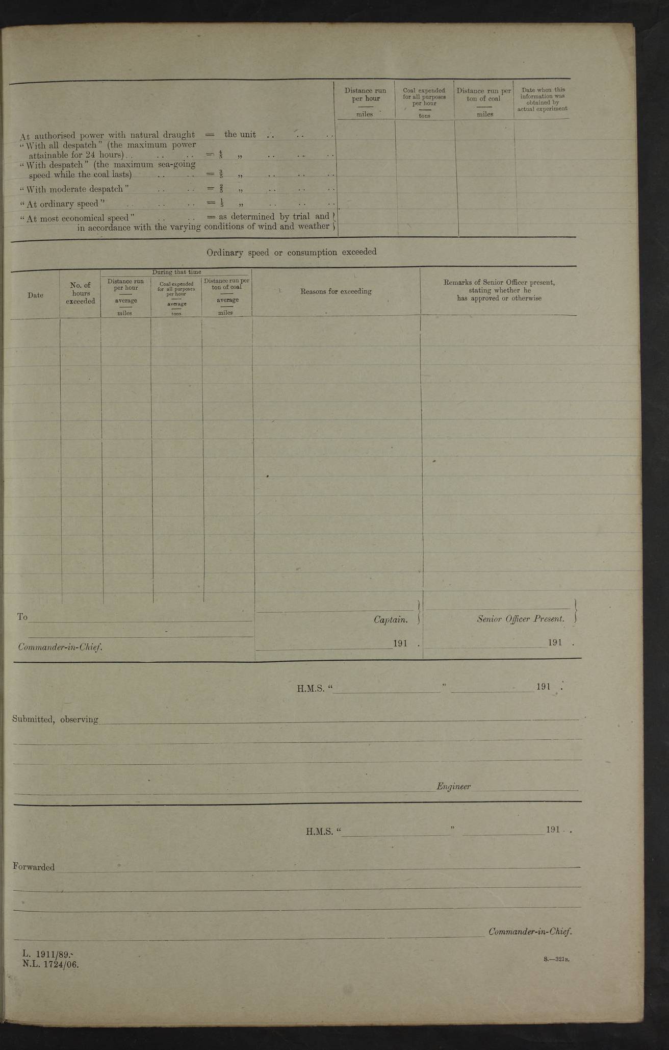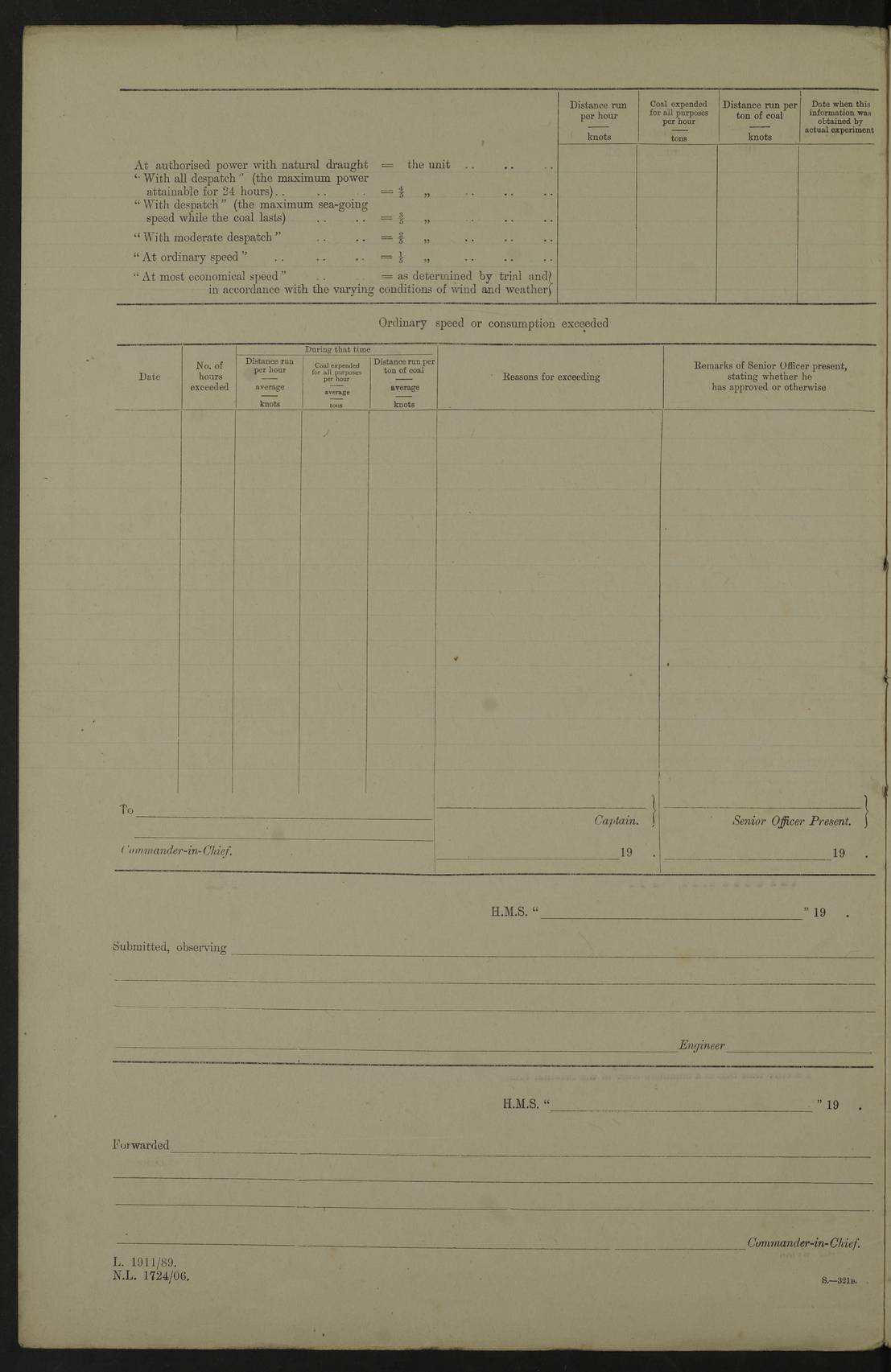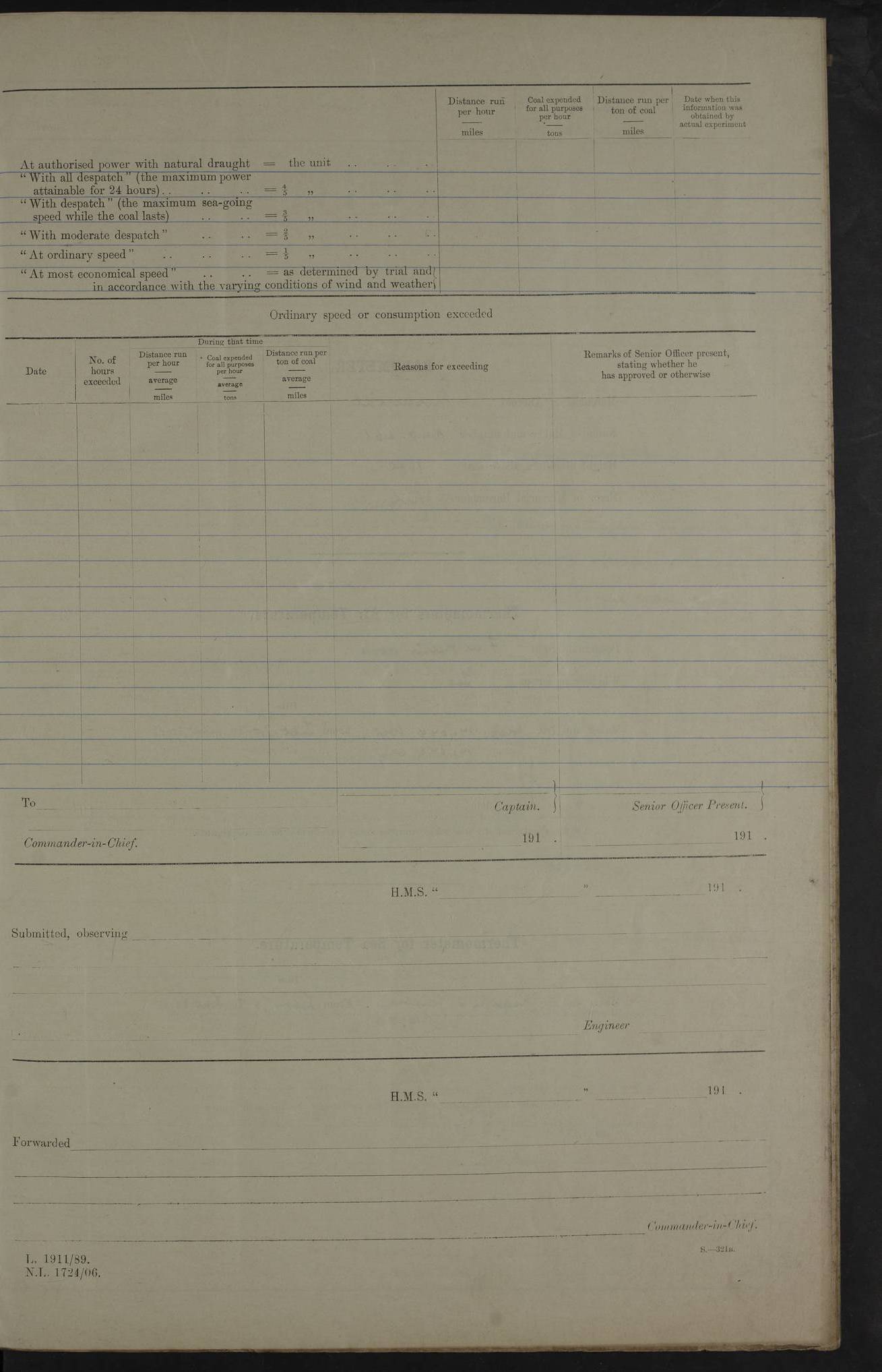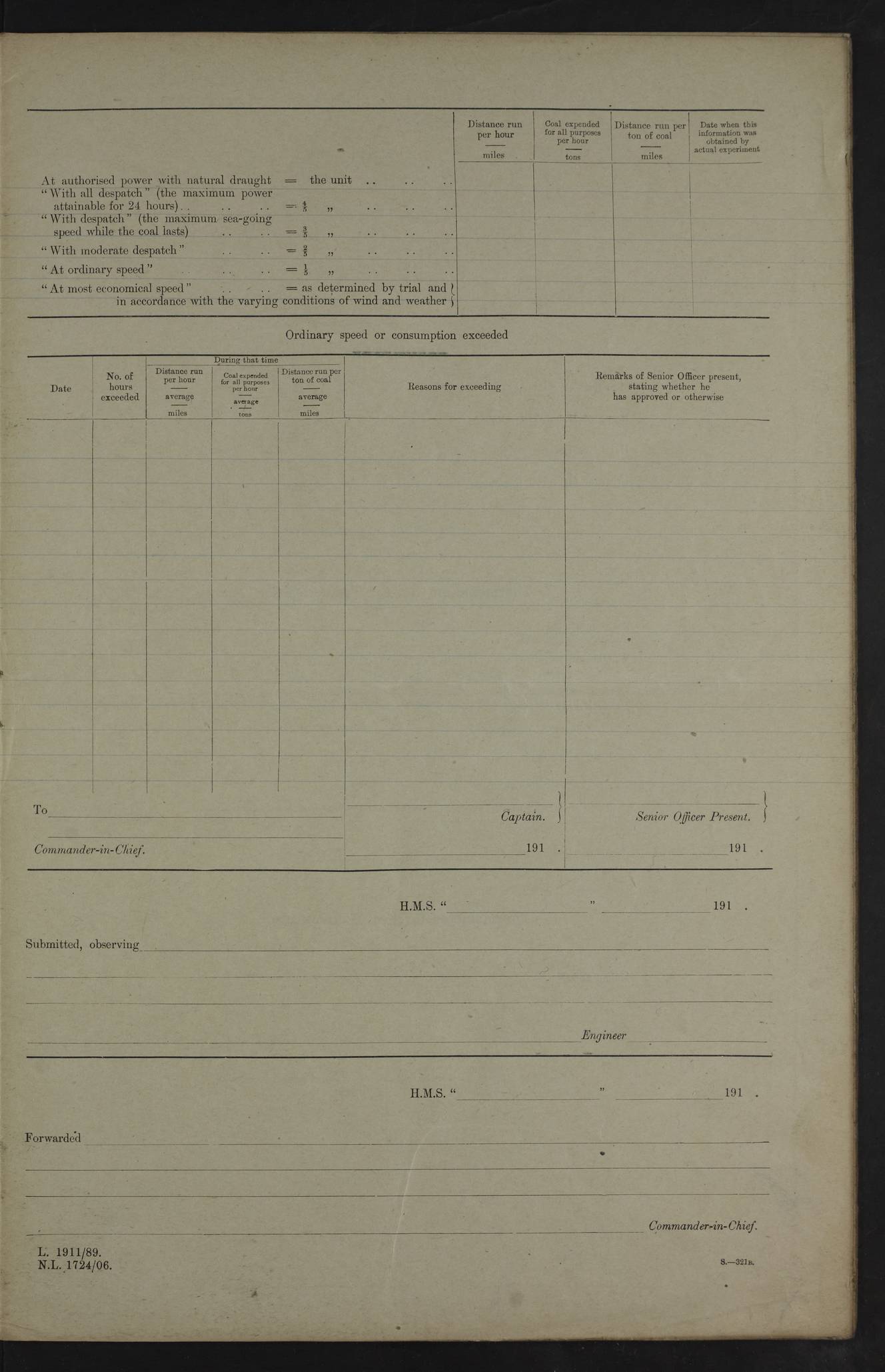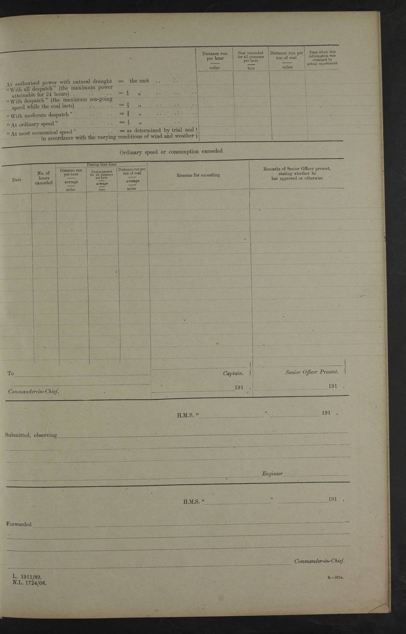 4f73cd06a2fc8ea903001489: (https://s3.amazonaws.com:443/oldweather/ADM53-43011/0072_0.jpg) 17 August 1914 Halifax Lat 44.63, Long -63.55 Number on sick list: 11 6.00am: Commenced coaling from Patent fuel sheds on jetty. 1.30pm: Finished coaling. pm: Washed down upper deck. 4f73cd06a2fc8ea90300148a: (https://s3.amazonaws.com:443/oldweather/ADM53-43011/0072_1.jpg) 18 August 1914 Halifax Lat 44.63, Long -63.55 Number on sick list: 10 4f73cd07a2fc8ea90300148b: (https://s3.amazonaws.com:443/oldweather/ADM53-43011/0073_0.jpg) 19 August 1914 Halifax Lat 44.63, Long -63.55 Number on sick list: 7 5.05am: Slipped from jetty and proceeded as requisite to anchorage in stream. 5.45am: Stopped. Let go Port anchor. am: Preparing for coaling. 9.00am: Collier Brinkwood made fast alongside (Starboard side). 10.10am: Commenced coaling. 9.40pm: Finished coaling. Received 1080 tons. 4f73cd07a2fc8ea90300148c: (https://s3.amazonaws.com:443/oldweather/ADM53-43011/0073_1.jpg) 20 August 1914 Halifax Lat 44.63, Long -63.55 Number on sick list: 7 am: Employed unrigging collier and gear etc. 7.15am: Collier left ship. 5.15pm: Hands to bathe. 4f73cd07a2fc8ea90300148d: (https://s3.amazonaws.com:443/oldweather/ADM53-43011/0074_0.jpg) 21 August 1914 Halifax Lat 44.63, Long -63.55 Number on sick list: 7 pm: Testing gun sights. 8.30pm: Exercised darken ship. 9.15pm: Opened deadlights etc. 4f73cd07a2fc8ea90300148e: (https://s3.amazonaws.com:443/oldweather/ADM53-43011/0074_1.jpg) 22 August 1914 Halifax Lat 44.63, Long -63.55 Number on sick list: 8 am: Aired night clothing. pm: Employed disembarking spare torpedo booms and other gear. pm: Tested lifebuoys. Found correct. 4f73cd08a2fc8ea90300148f: (https://s3.amazonaws.com:443/oldweather/ADM53-43011/0075_0.jpg) 23 August 1914 Halifax and at Sea Lat 44.63, Long -63.55 Number on sick list: 7 10.00am: Held Divine Service on board. am: Preparing for sea. 11.45am: Weighed and proceeded as requisite out of harbour. 12.50pm: Entered War Channel. 3.20pm: a/c S59ºW for rendezvous. 7.25pm: Observed HMS Suffolk 1 pt on starboard bow. HMS Suffolk was a Kent class armoured cruiser, launched at Portsmouth Dockyard in 1903, and sold in 1920. Details at http://en.wikipedia.org/wiki/HMS_Suffolk_(1903) . 8.00pm: Stopped at rendezvous. Communicated by boat with Suffolk. 9.30pm: Fog shut down. 9.00pm: Hands to night defence stations. 9.30pm: Fog shut down.9.45pm: Proceeded. 10.50pm: Fog cleared. 4f73cd08a2fc8ea903001490: (https://s3.amazonaws.com:443/oldweather/ADM53-43011/0075_1.jpg) 24 August 1914 At sea, Halifax to New York Lat 41.9, Long -66.4 Number on sick list: 9 5.30am: Dispersed from night defence. 10.20am: a/c to speak merchant steamer bearing WNW (SS Hurley of Montreal). 10.40am: a/c south. Stopped. Dropped target. 11.00am: Carried out aiming rifle practice. 12.10pm: Stopped. 1.20pm: Dropped second target. Carried out aiming rifle and sub calibre practice. 2.50pm: Fog shut down. pm: Hands at night defence stations. 10.45pm: Fog clearing. 4f73cd08a2fc8ea903001491: (https://s3.amazonaws.com:443/oldweather/ADM53-43011/0076_0.jpg) 25 August 1914 Patrolling off New York Lat 40.6, Long -70.0 Number on sick list: 8 5.40am: Dispersed from night defence. 6.10am: Observed sail N30ºW/ a/c N30ºW. Reduced to 60 revs. 6.50am: Resumed course. Abeam sail (Alicia B. Crosby). 9.36am: Sighted Nantucket Light N65ºW. 10.15am: Met Mason Lines Antilles. 10.25am: Nantucket Light Vessel abeam, 1.2 miles. 6.00pm: Sighted cruiser ahead. 6.10pm: Action. 6.25pm: Dispersed. 6.40pm: Stopped and signalled HMS Essex. HMS Essex was an armoured cruiser of the Kent class, launched in 1901 at Pembroke Dockyard and sold in 1921. Details at http://en.wikipedia.org/wiki/HMS_Essex_(1901) . 7.00pm: Proceeded as requisite. 7.25pm: Sighted steamer. a/c N60ºW, 60 revs. 7.35pm: Turned to east in company with SS Uranium. 8.00pm: Hands to night defence. 8.05pm: Stopped. Communicated by boat with Uranium. 9.23pm: Proceeded, course as requisite to northward to investigate searchlights. pm: Connected conning tower steaming gear. 4f73cd08a2fc8ea903001492: (https://s3.amazonaws.com:443/oldweather/ADM53-43011/0076_1.jpg) 26 August 1914 Patrolling off New York Lat 40.4, Long -73.6 Number on sick list: 11 5.16am: Fire Island Light abeam 7 miles. 7.00am: a/c N49ºW on sighting steamer to north. 8.25am: Sighted Ambrose Light Vessel. 1.00pm: Courses as requisite investigating shipping off Ambrose Light Vessel and Waveside. 2.15pm: Stopped, communicated by boat with SS Van der Duyn. 2.55pm: Proceeded as requisite. 5.26pm: In company with steamers New York and Commanchee. 6.17pm: Connected up fore bridge steering gear. 7.12pm: a/c to south to close steamer (St Louis). 7.25pm: Resumed course. 9.00pm: Hands to night defence. 4f73cd09a2fc8ea903001493: (https://s3.amazonaws.com:443/oldweather/ADM53-43011/0077_0.jpg) 27 August 1914 Patrolling off New York Lat 40.5, Long -72.3 Number on sick list: 10 5.45pm: Dispersed from night defence. 7.12am: a/c as requisite to close merchantman (Wilson Line Francisco). 7.55am: Resumed course. 9.55am: a/c to close Norwegian ship. 10.10am: Stopped, communicated with her by boat (SS Bjornstjerne Bjornsen). 10.50am: Proceeded N30ºE to close Circadian. 3.55pm: Fire Island Light Vessel abeam 2¾ miles. 4.12pm: Reduced to 36 revs. Passed SS Baltic. 5.35pm: Connected up conning tower steering gear. 6.40pm: Ambrose Light Vessel N33ºW, 7 miles. 7.00pm: Connected up fore bridge steering gear. 9.00pm: Hands to night defence stations. 4f73cd09a2fc8ea903001494: (https://s3.amazonaws.com:443/oldweather/ADM53-43011/0077_1.jpg) 28 August 1914 At sea, New York to Boston Lat 40.2, Long -70.8 Number on sick list: 9 5.45am: Dispersed from night defence. 8.40am: Sighted steamer (SS Ran) bearing S50ºE. 9.10am: Resumed course. am: Divisional drills. Preparing for target practice. 10.45am: Sighted steamer bearing N55ºE. 11.32am: Resumed course (SS Skjorldborg). 1.25pm: Stopped. Dropped target. 1.29pm: Proceeded, course as requi