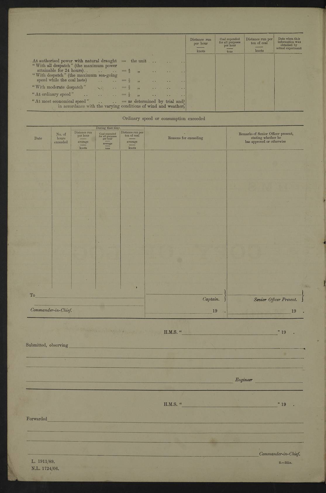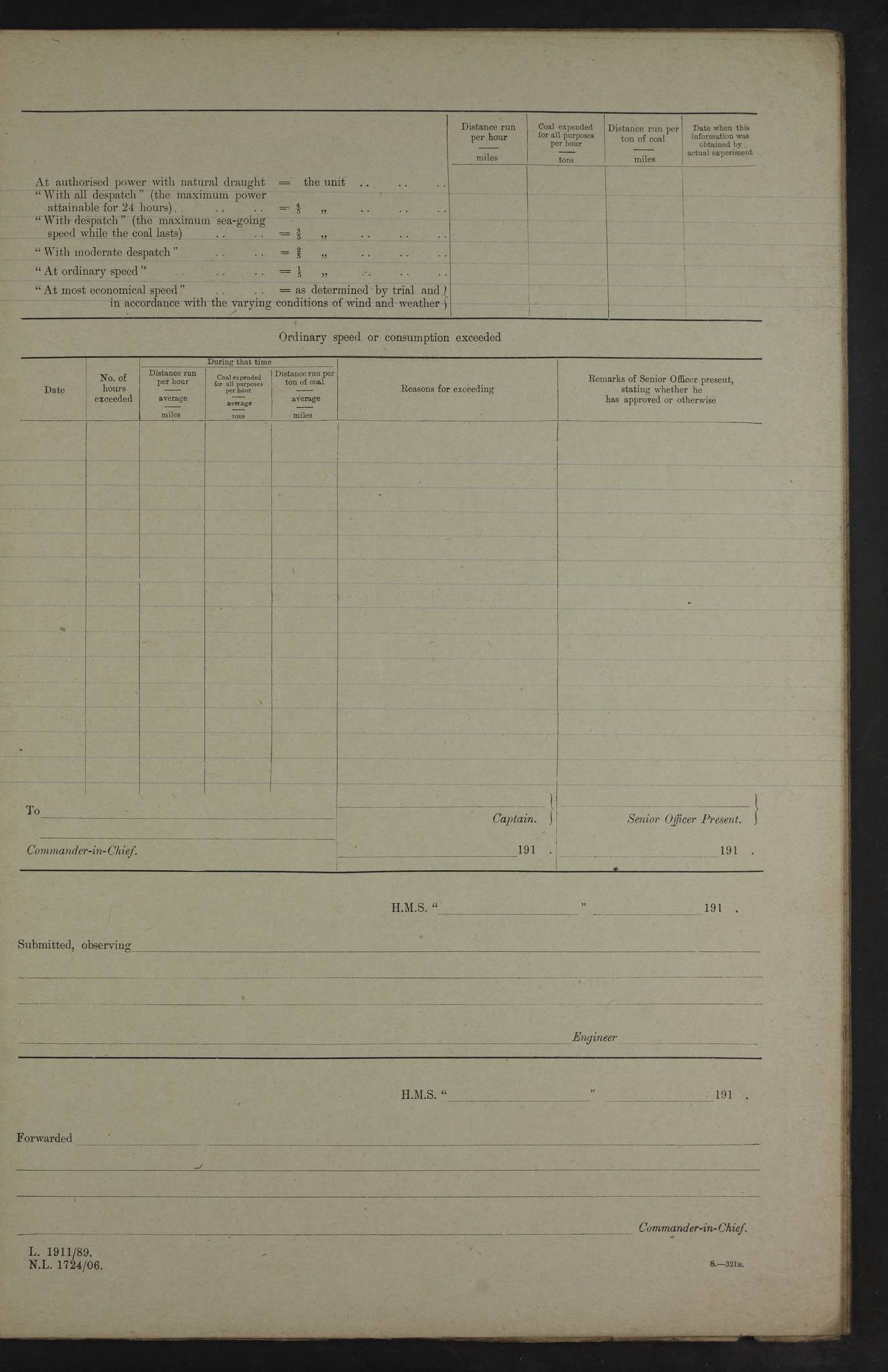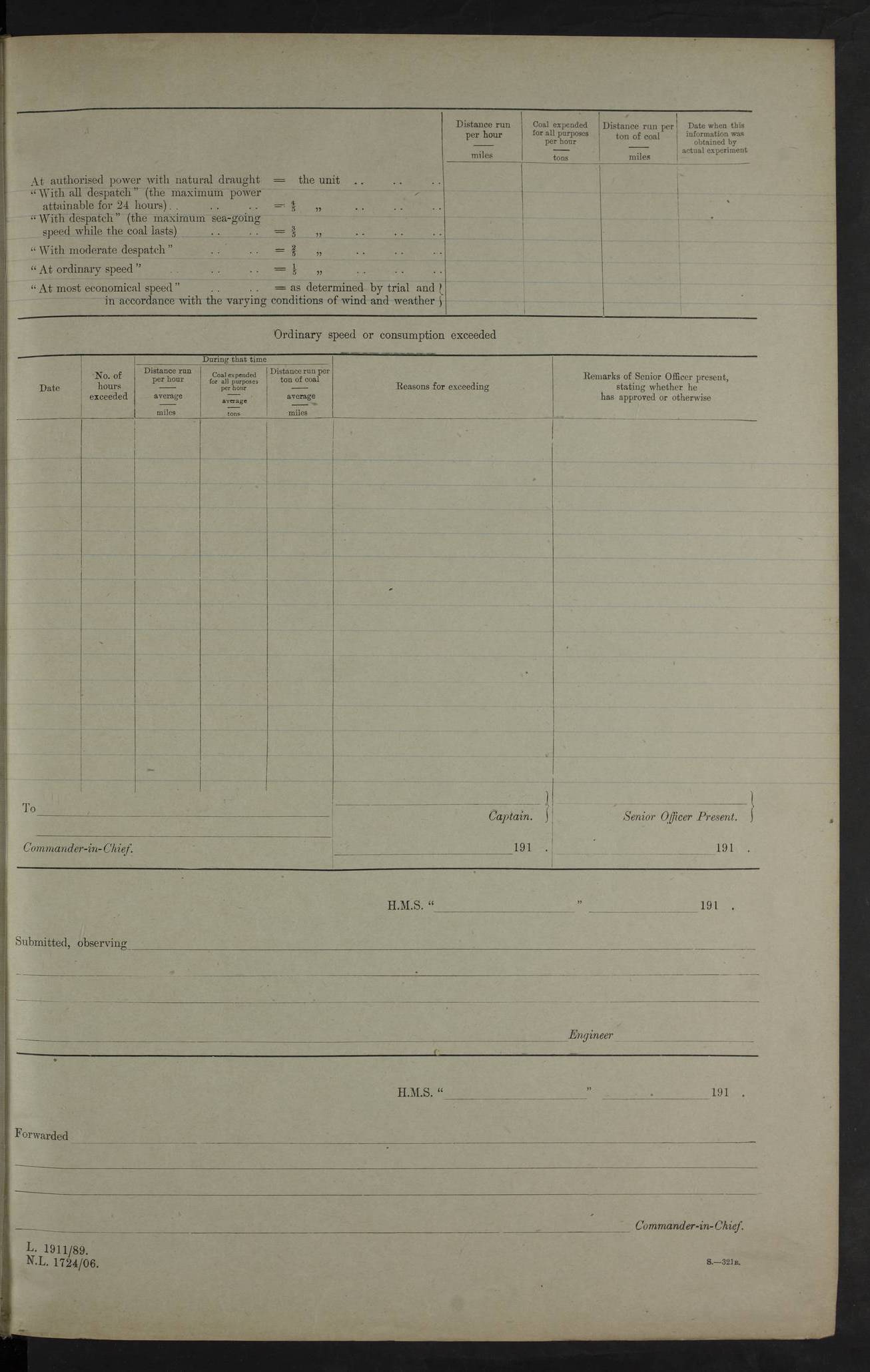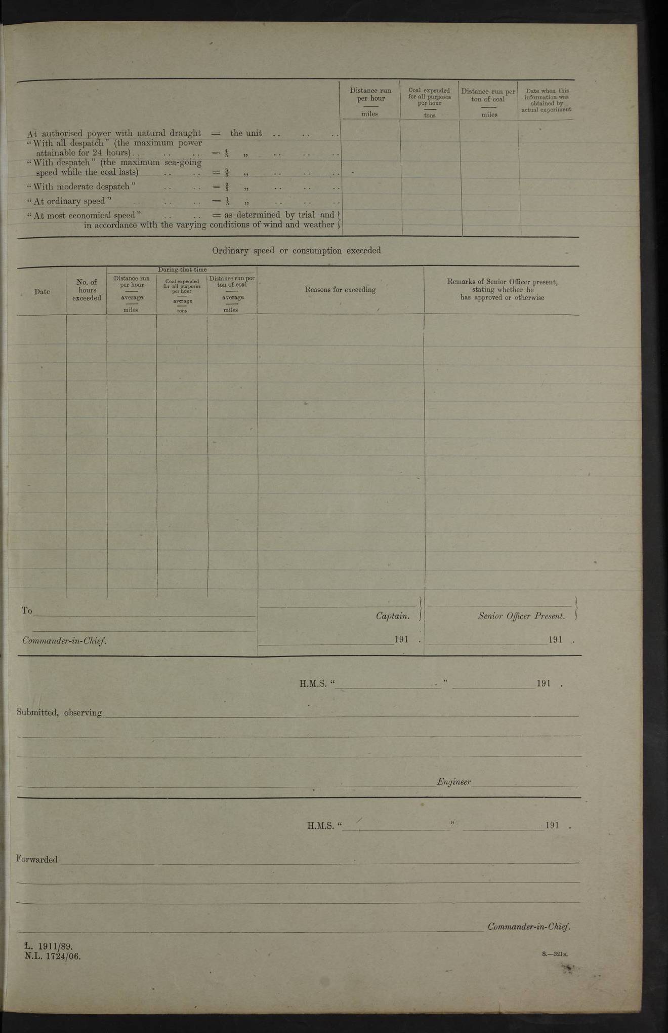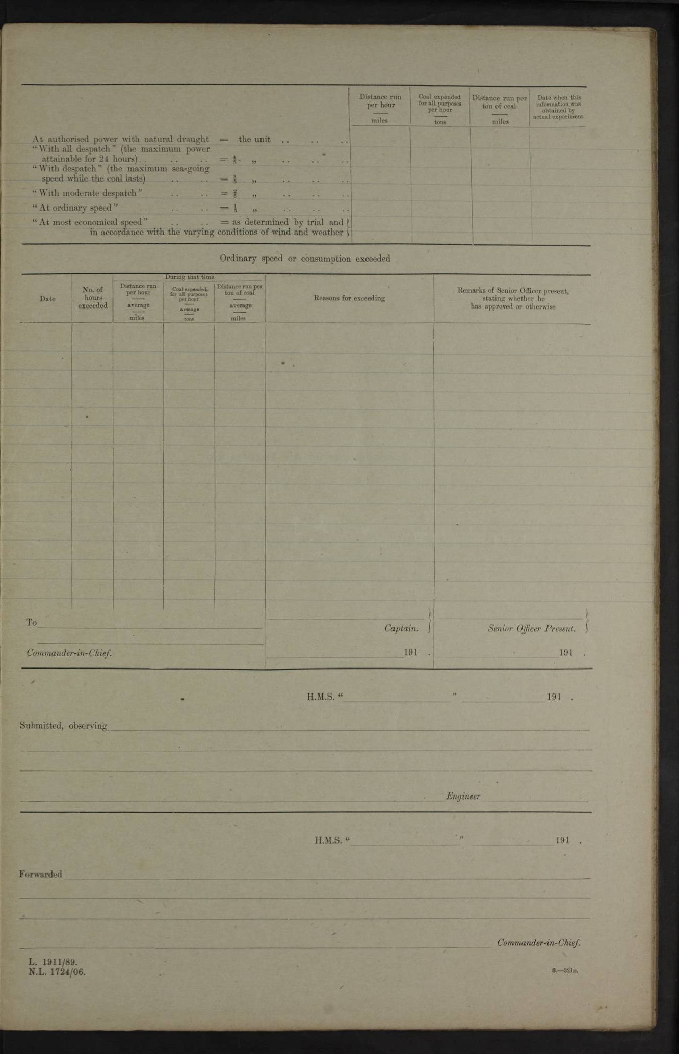 4f73cd06a2fc8ea903001489: (https://s3.amazonaws.com:443/oldweather/ADM53-43011/0072_0.jpg) 17 August 1914 Halifax Lat 44.63, Long -63.55 Number on sick list: 11 6.00am: Commenced coaling from Patent fuel sheds on jetty. 1.30pm: Finished coaling. pm: Washed down upper deck. 4f73cd06a2fc8ea90300148a: (https://s3.amazonaws.com:443/oldweather/ADM53-43011/0072_1.jpg) 18 August 1914 Halifax Lat 44.63, Long -63.55 Number on sick list: 10 4f73cd07a2fc8ea90300148b: (https://s3.amazonaws.com:443/oldweather/ADM53-43011/0073_0.jpg) 19 August 1914 Halifax Lat 44.63, Long -63.55 Number on sick list: 7 5.05am: Slipped from jetty and proceeded as requisite to anchorage in stream. 5.45am: Stopped. Let go Port anchor. am: Preparing for coaling. 9.00am: Collier Brinkwood made fast alongside (Starboard side). 10.10am: Commenced coaling. 9.40pm: Finished coaling. Received 1080 tons. 4f73cd07a2fc8ea90300148c: (https://s3.amazonaws.com:443/oldweather/ADM53-43011/0073_1.jpg) 20 August 1914 Halifax Lat 44.63, Long -63.55 Number on sick list: 7 am: Employed unrigging collier and gear etc. 7.15am: Collier left ship. 5.15pm: Hands to bathe. 4f73cd07a2fc8ea90300148d: (https://s3.amazonaws.com:443/oldweather/ADM53-43011/0074_0.jpg) 21 August 1914 Halifax Lat 44.63, Long -63.55 Number on sick list: 7 pm: Testing gun sights. 8.30pm: Exercised darken ship. 9.15pm: Opened deadlights etc. 4f73cd07a2fc8ea90300148e: (https://s3.amazonaws.com:443/oldweather/ADM53-43011/0074_1.jpg) 22 August 1914 Halifax Lat 44.63, Long -63.55 Number on sick list: 8 am: Aired night clothing. pm: Employed disembarking spare torpedo booms and other gear. pm: Tested lifebuoys. Found correct. 4f73cd08a2fc8ea90300148f: (https://s3.amazonaws.com:443/oldweather/ADM53-43011/0075_0.jpg) 23 August 1914 Halifax and at Sea Lat 44.63, Long -63.55 Number on sick list: 7 10.00am: Held Divine Service on board. am: Preparing for sea. 11.45am: Weighed and proceeded as requisite out of harbour. 12.50pm: Entered War Channel. 3.20pm: a/c S59ºW for rendezvous. 7.25pm: Observed HMS Suffolk 1 pt on starboard bow. HMS Suffolk was a Kent class armoured cruiser, launched at Portsmouth Dockyard in 1903, and sold in 1920. Details at http://en.wikipedia.org/wiki/HMS_Suffolk_(1903) . 8.00pm: Stopped at rendezvous. Communicated by boat with Suffolk. 9.30pm: Fog shut down. 9.00pm: Hands to night defence stations. 9.30pm: Fog shut down.9.45pm: Proceeded. 10.50pm: Fog cleared. 4f73cd08a2fc8ea903001490: (https://s3.amazonaws.com:443/oldweather/ADM53-43011/0075_1.jpg) 24 August 1914 At sea, Halifax to New York Lat 41.9, Long -66.4 Number on sick list: 9 5.30am: Dispersed from night defence. 10.20am: a/c to speak merchant steamer bearing WNW (SS Hurley of Montreal). 10.40am: a/c south. Stopped. Dropped target. 11.00am: Carried out aiming rifle practice. 12.10pm: Stopped. 1.20pm: Dropped second target. Carried out aiming rifle and sub calibre practice. 2.50pm: Fog shut down. pm: Hands at night defence stations. 10.45pm: Fog clearing. 4f73cd08a2fc8ea903001491: (https://s3.amazonaws.com:443/oldweather/ADM53-43011/0076_0.jpg) 25 August 1914 Patrolling off New York Lat 40.6, Long -70.0 Number on sick list: 8 5.40am: Dispersed from night defence. 6.10am: Observed sail N30ºW/ a/c N30ºW. Reduced to 60 revs. 6.50am: Resumed course. Abeam sail (Alicia B. Crosby). 9.36am: Sighted Nantucket Light N65ºW. 10.15am: Met Mason Lines Antilles. 10.25am: Nantucket Light Vessel abeam, 1.2 miles. 6.00pm: Sighted cruiser ahead. 6.10pm: Action. 6.25pm: Dispersed. 6.40pm: Stopped and signalled HMS Essex. HMS Essex was an armoured cruiser of the Kent class, launched in 1901 at Pembroke Dockyard and sold in 1921. Details at http://en.wikipedia.org/wiki/HMS_Essex_(1901) . 7.00pm: Proceeded as requisite. 7.25pm: Sighted steamer. a/c N60ºW, 60 revs. 7.35pm: Turned to east in company with SS Uranium. 8.00pm: Hands to night defence. 8.05pm: Stopped. Communicated by boat with Uranium. 9.23pm: Proceeded, course as requisite to northward to investigate searchlights. pm: Connected conning tower steaming gear. 4f73cd08a2fc8ea903001492: (https://s3.amazonaws.com:443/oldweather/ADM53-43011/0076_1.jpg) 26 August 1914 Patrolling off New York Lat 40.4, Long -73.6 Number on sick list: 11 5.16am: Fire Island Light abeam 7 miles. 7.00am: a/c N49ºW on sighting steamer to north. 8.25am: Sighted Ambrose Light Vessel. 1.00pm: Courses as requisite investigating shipping off Ambrose Light Vessel and Waveside. 2.15pm: Stopped, communicated by boat with SS Van der Duyn. 2.55pm: Proceeded as requisite. 5.26pm: In company with steamers New York and Commanchee. 6.17pm: Connected up fore bridge steering gear. 7.12pm: a/c to south to close steamer (St Louis). 7.25pm: Resumed course. 9.00pm: Hands to night defence. 4f73cd09a2fc8ea903001493: (https://s3.amazonaws.com:443/oldweather/ADM53-43011/0077_0.jpg) 27 August 1914 Patrolling off New York Lat 40.5, Long -72.3 Number on sick list: 10 5.45pm: Dispersed from night defence. 7.12am: a/c as requisite to close merchantman (Wilson Line Francisco). 7.55am: Resumed course. 9.55am: a/c to close Norwegian ship. 10.10am: Stopped, communicated with her by boat (SS Bjornstjerne Bjornsen). 10.50am: Proceeded N30ºE to close Circadian. 3.55pm: Fire Island Light Vessel abeam 2¾ miles. 4.12pm: Reduced to 36 revs. Passed SS Baltic. 5.35pm: Connected up conning tower steering gear. 6.40pm: Ambrose Light Vessel N33ºW, 7 miles. 7.00pm: Connected up fore bridge steering gear. 9.00pm: Hands to night defence stations. 4f73cd09a2fc8ea903001494: (https://s3.amazonaws.com:443/oldweather/ADM53-43011/0077_1.jpg) 28 August 1914 At sea, New York to Boston Lat 40.2, Long -70.8 Number on sick list: 9 5.45am: Dispersed from night defence. 8.40am: Sighted steamer (SS Ran) bearing S50ºE. 9.10am: Resumed course. am: Divisional drills. Preparing for target practice. 10.45am: Sighted steamer bearing N55ºE. 11.32am: Resumed course (SS Skjorldborg). 1.25pm: Stopped. Dropped target. 1.29pm: Proceeded, course as requi