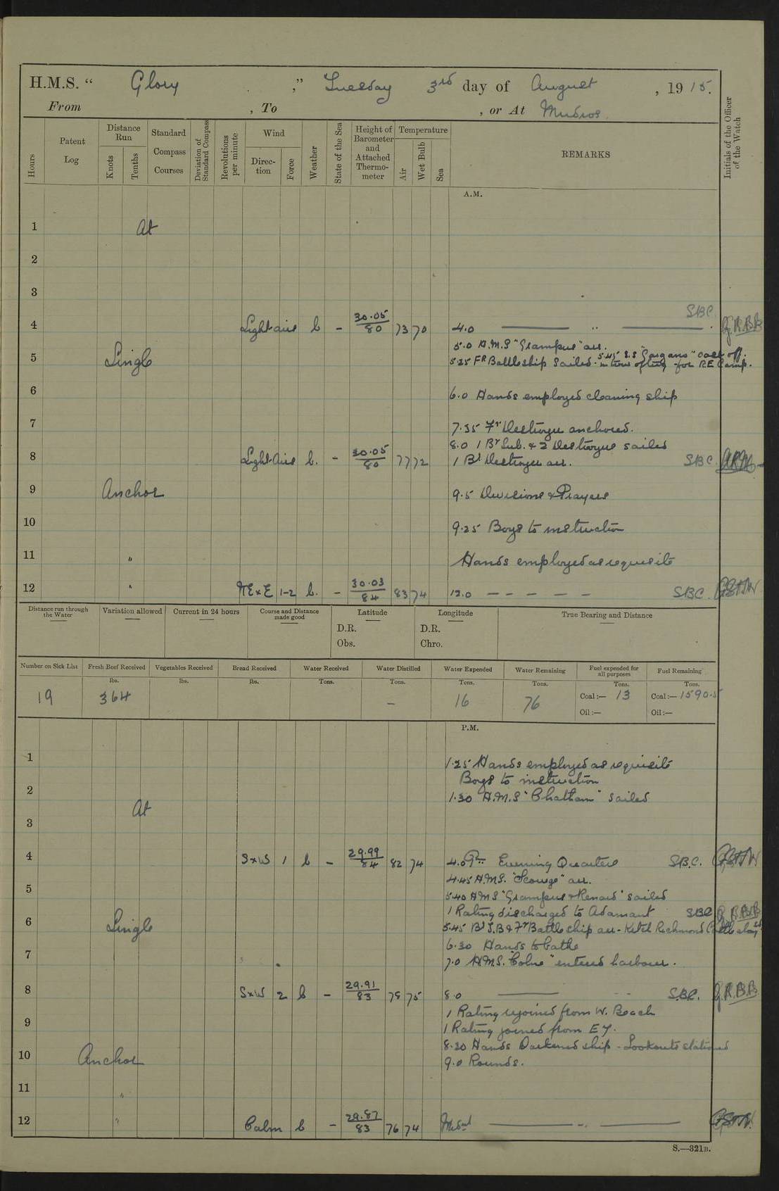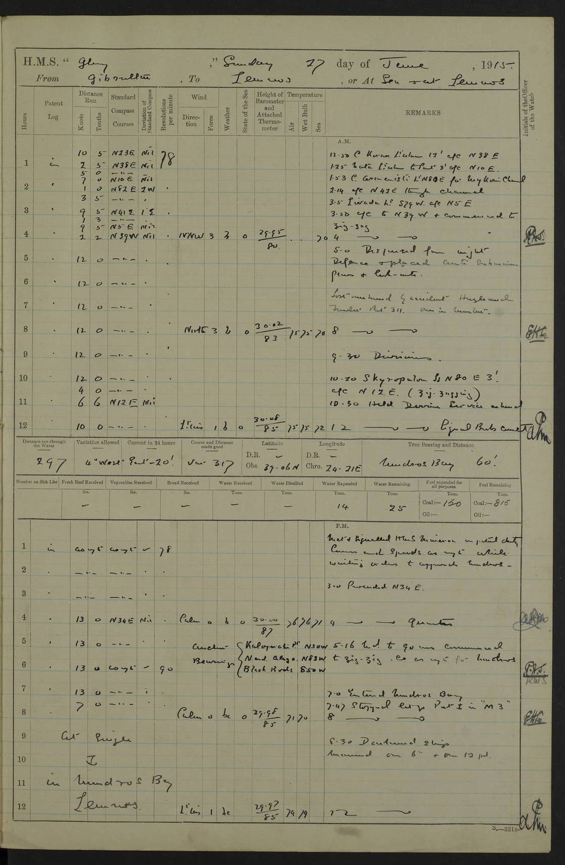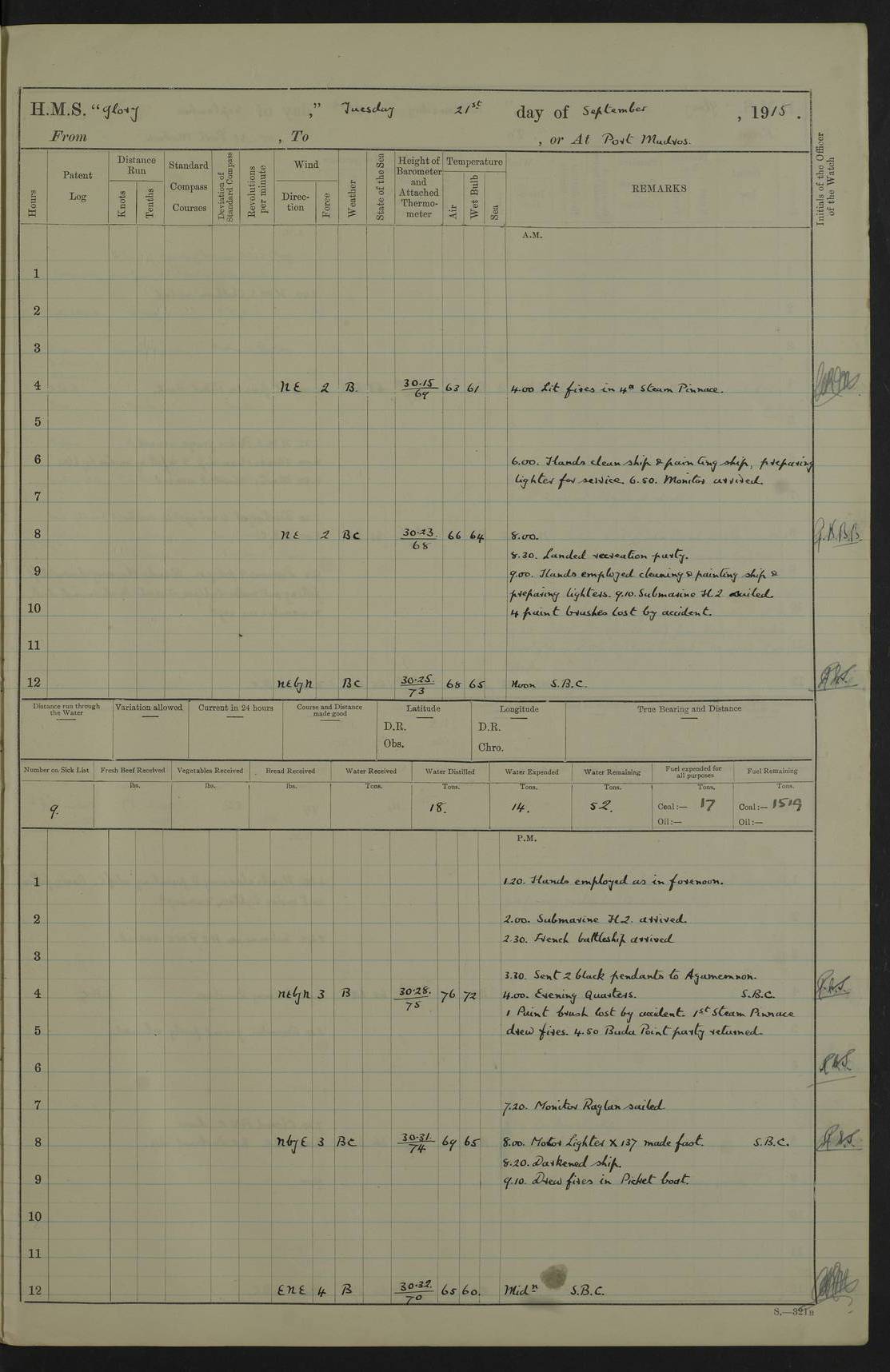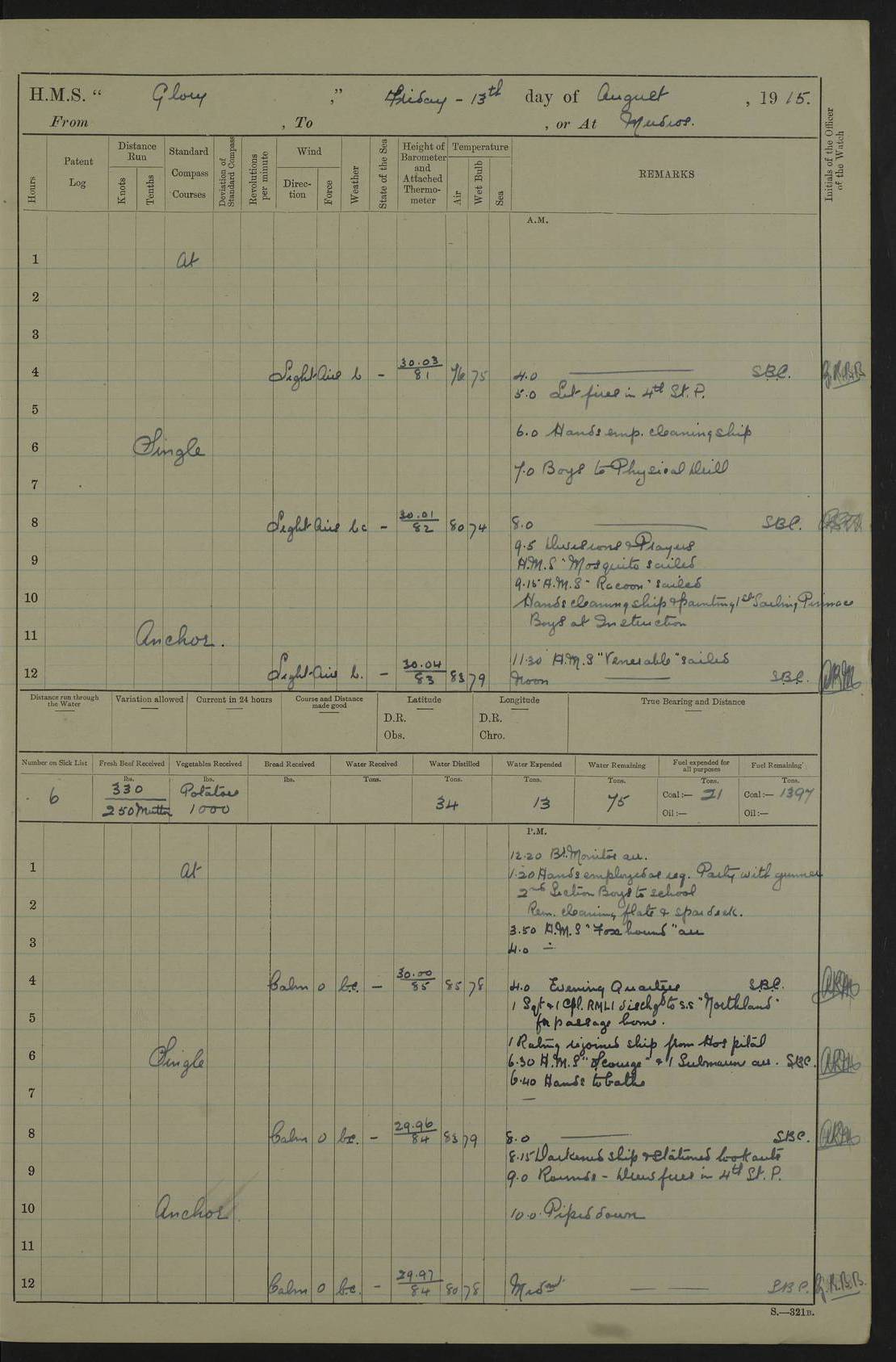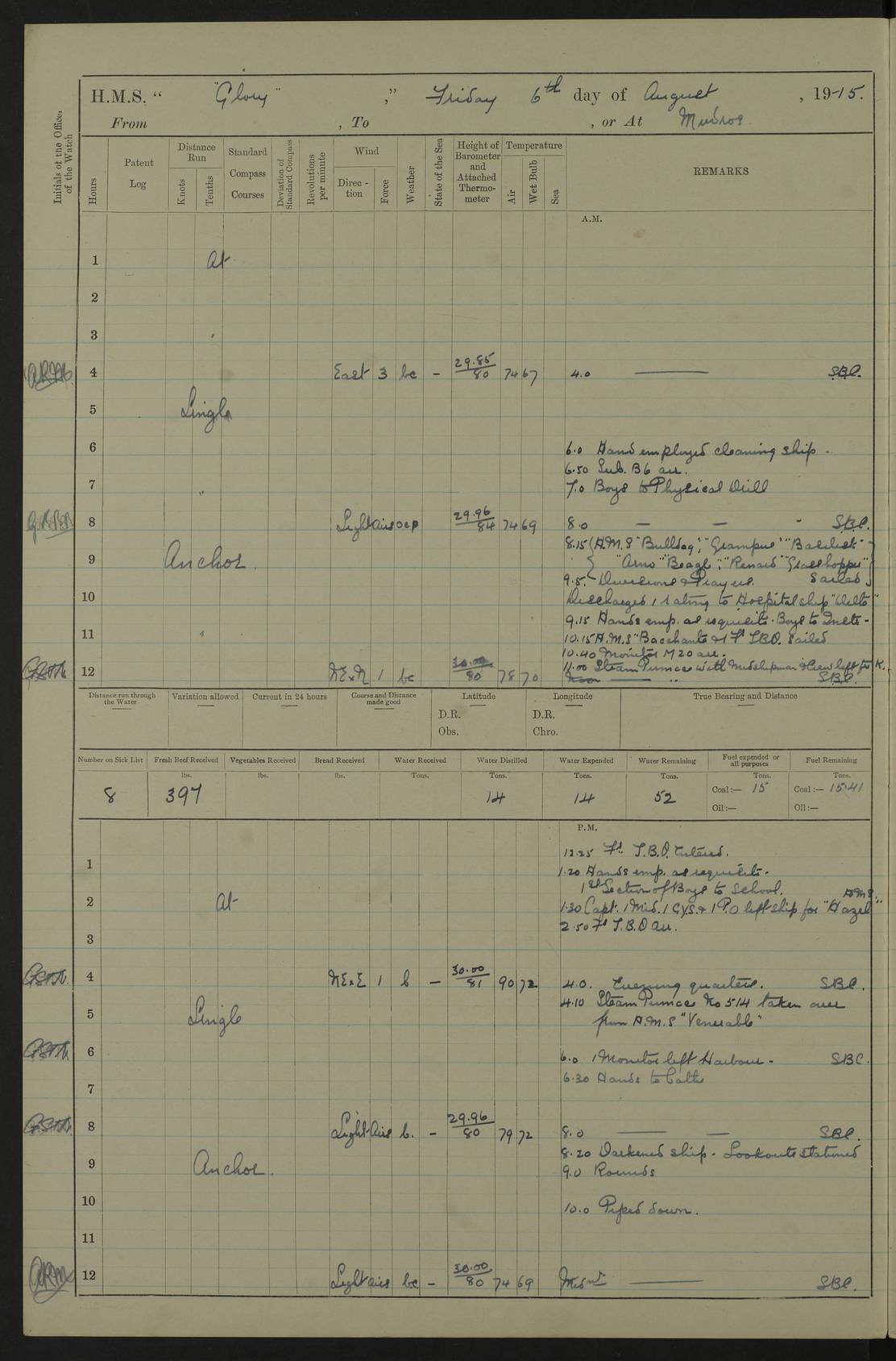 22 June 1915 At sea, Gibraltar to Lemnos Lat 36.1, Long -1.3 4.15am: Sighted land on starboard bow. 10.20am: Stopped port engine for repairs. 11.20am: proceeded with port engine. pm: a/c due to change in deviation. 10.00pm: Cape Tenez Light abeam, 18 miles. 4f73cd61a2fc8ea9030015f6: (https://s3.amazonaws.com:443/oldweather/ADM53-43015/0012_1.jpg) 23 June 1915 At sea, Gibraltar to Lemnos Lat 37.5, Long 4.8 Number on sick list: 4 5.00am: Secured from night defence stations. Placed anti-submarine guns. pm: Life saving appliances served out to men stationed in ? ?at abandon ship. 4f73cd61a2fc8ea9030015f7: (https://s3.amazonaws.com:443/oldweather/ADM53-43015/0013_0.jpg) 24 June 1915 At sea, Gibraltar to Lemnos Lat 37.4, Long 10.8 Position in log clearly bears no resemblance to the location of the ship. Position above is approximate and is based sighting of Zembra Island at 11.55am. 5.00am: Dispersed from night defence stations. Manned anti-submarine guns. am: Sighted two French torpedo boats. am: Torpedo boats passed to ~ No 362, 363. am: Sighted land on starboard beam. 11.55am: Zembra Island abeam, 25 miles. 2.00pm: Sighted Pantellaria S34ºE. 4.45pm: Pantellaria Light House abeam 12 miles. 4f73cd61a2fc8ea9030015f8: (https://s3.amazonaws.com:443/oldweather/ADM53-43015/0013_1.jpg) 25 June 1915 At sea, Gibraltar to Lemnos Lat 35.5, Long 16.7 2.10am: Gozo Light abeam 17 miles. 5.00am: Dispersed from night defence stations. Manned anti-submarine guns. 4f73cd61a2fc8ea9030015f9: (https://s3.amazonaws.com:443/oldweather/ADM53-43015/0014_0.jpg) 26 June 1915 At sea, Gibraltar to Lemnos Lat 35.5, Long 22.6 Number on sick list: 5 5.00am: Dispersed from night defence stations. Manned anti-submarine guns. am: Aired night clothing. am: marines at maxim practice on quarter deck. 2.00pm: Observed land on either bow. 3.00pm: Sighted French patrol destroyer. 4.15pm: Sighted French patrol destroyer. 9.40pm: Milo Peak N63ºW. 10.26pm: Polino Light abeam to port 5.5 miles. 4f73cd62a2fc8ea9030015fa: (https://s3.amazonaws.com:443/oldweather/ADM53-43015/0014_1.jpg) 27 June 1915 At sea and at Lemnos Lat 39.1, Long 24.4 From 0.50 to 3.05am sighting of multiple light houses. 3.50am: a/c to N39ºW and commenced to zig-zag. 5.00am: Dispersed from night defence stations and placed anti-submarine guns and look-outs. am: Lost overboard by accident Hazlewood fender, pat. 311, one in number. 10.30am: Held Divine Service onboard. pm: Met and signalled HMS Minerva on patrol duty. pm: Courses and speeds as requisite while waiting orders to approach Mudros. 3.00pm: Proceeded. 5.16pm: Increased to 90 revs, commenced to zig-zag. Course as requisite for Mudros. 7.00pm: Entered Mudros Bay. 7.47pm: Stopped. Let go port anchor in ‘M3’. 8.30pm: Darkened ship. pm: Manned one 6” and one 12 pdr. 4f73cd62a2fc8ea9030015fb: (https://s3.amazonaws.com:443/oldweather/ADM53-43015/0015_0.jpg) 28 June 1915 Mudros Bay, Lemnos Lat 39.89, Long 25.24 5,00am: HMS Vengeance entered harbour. HMS Vengeance was a pre-dreadnought of the Canopus class, launched in 1899 at Vickers, Barrow, and sold for scrapping in 1921. Details at http://en.wikipedia.org/wiki/HMS_Vengeance_(1899) . am/pm/: hands preparing for coaling and about ship’s work. pm: Collier Wabana secured alongside. 4f73cd62a2fc8ea9030015fc: (https://s3.amazonaws.com:443/oldweather/ADM53-43015/0015_1.jpg) 29 June 1915 Mudros Bay, Lemnos Lat 39.89, Long 25.24 5.15am: Commenced coaling. 2.00pm: Finished coaling. Collier left. 4f73cd62a2fc8ea9030015fd: (https://s3.amazonaws.com:443/oldweather/ADM53-43015/0016_0.jpg) 30 June 1915 Mudros Bay, Lemnos Lat 39.89, Long 25.24 am: Parties away sanding, and with fire engines onshore. am: Boats away disembarking troops. am: French Flagship Patrie sailed. The Patrie was a French pre-dreadnought, launched at La Seyne shipyard in 1903, and stricken in 1921. Details at http://en.wikipedia.org/wiki/French_battleship_Patrie . 6.30pm: Hands to bathe. 4f73cd63a2fc8ea9030015fe: (https://s3.amazonaws.com:443/oldweather/ADM53-43015/0016_1.jpg) 4f73cd63a2fc8ea9030015ff: (https://s3.amazonaws.com:443/oldweather/ADM53-43015/0017_0.jpg) 4f73cd63a2fc8ea903001600: (https://s3.amazonaws.com:443/oldweather/ADM53-43015/0017_1.jpg) 4f73cd63a2fc8ea903001601: (https://s3.amazonaws.com:443/oldweather/ADM53-43015/0018_0.jpg) 4f73cd64a2fc8ea903001602: (https://s3.amazonaws.com:443/oldweather/ADM53-43015/0018_1.jpg) LOGS FOR JULY 1915 From July to October 1915, HMS Glory spent her time at Port Mudros. Certain activities typically took place daily and are not generally noted in the pages below. These activities include: Lighting fires in the picket boat around 4am and drawing the fires in the late evening; Divisions at around 9–9.30am and Evening Quarters at 4pm; Darken ship at around 8.30pm; Daily ‘cleaning ship’, with variations thereof; SBC (for ‘Signal Books Correct’) at the watch changes. 4f73cd64a2fc8ea903001603: (https://s3.amazonaws.com:443/oldweather/ADM53-43016/0000_0.jpg) 4f73cd64a2fc8ea903001604: (https://s3.amazonaws.com:443/oldweather/ADM53-43016/0000_1.jpg) 4f73cd65a2fc8ea903001605: (https://s3.amazonaws.com:443/oldweather/ADM53-43016/0001_0.jpg) 4f73cd65a2fc8ea903001606: (https://s3.amazonaws.com:443/oldweather/ADM53-43016/0001_1.jpg) 1 July 1915 Port Mudros Lat 39.89, Long 25.24 6.30am: Landed working parties preparing boom defence ships. am: Discharged Acting Commander Rayne to Hector. Hector was a kite balloon ship. No further details readily available. 5.00pm: Tug T.10 made fast astern. 7.15pm: HMS Venerable went out. 7.30pm: HMS Chatham went out. HMS Chatham was a ‘Town’ cruiser and lead ship of her class. She was launched in 1911 at Chatham Dockyard and sold in 1926. Details at http://en.wikipedia.org/wiki/HMS_Chatham_(1911) . 4f73cd65a2fc8ea903001607: (https://s3.amazonaws.com:443/oldweather/ADM53-43016/0002_0.jpg) 2 July 1915 Port Mudros Lat 39.89, Long 25.24 5.35am: Landed working parties preparing boom defence ships. am/pm: Boom defence par